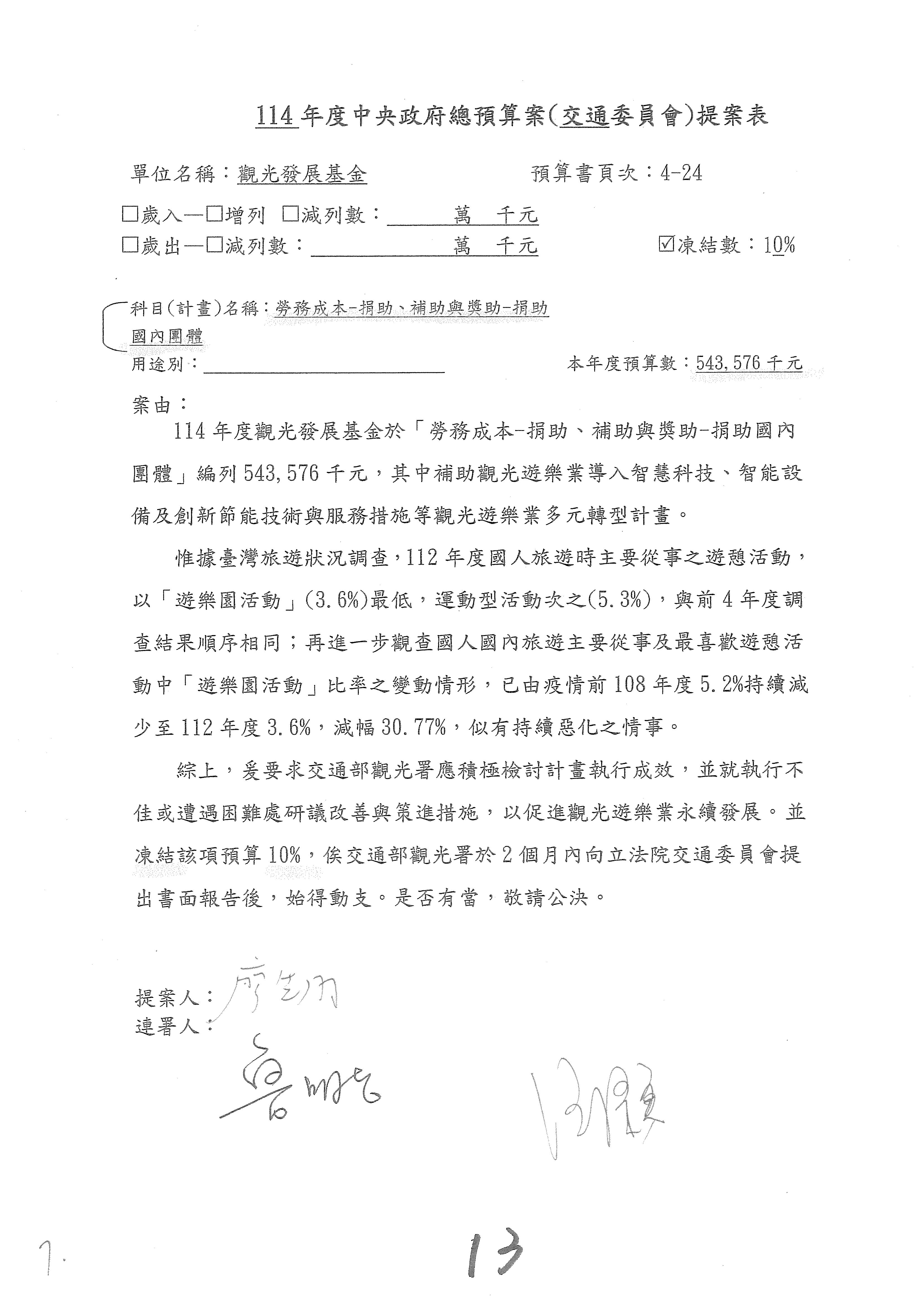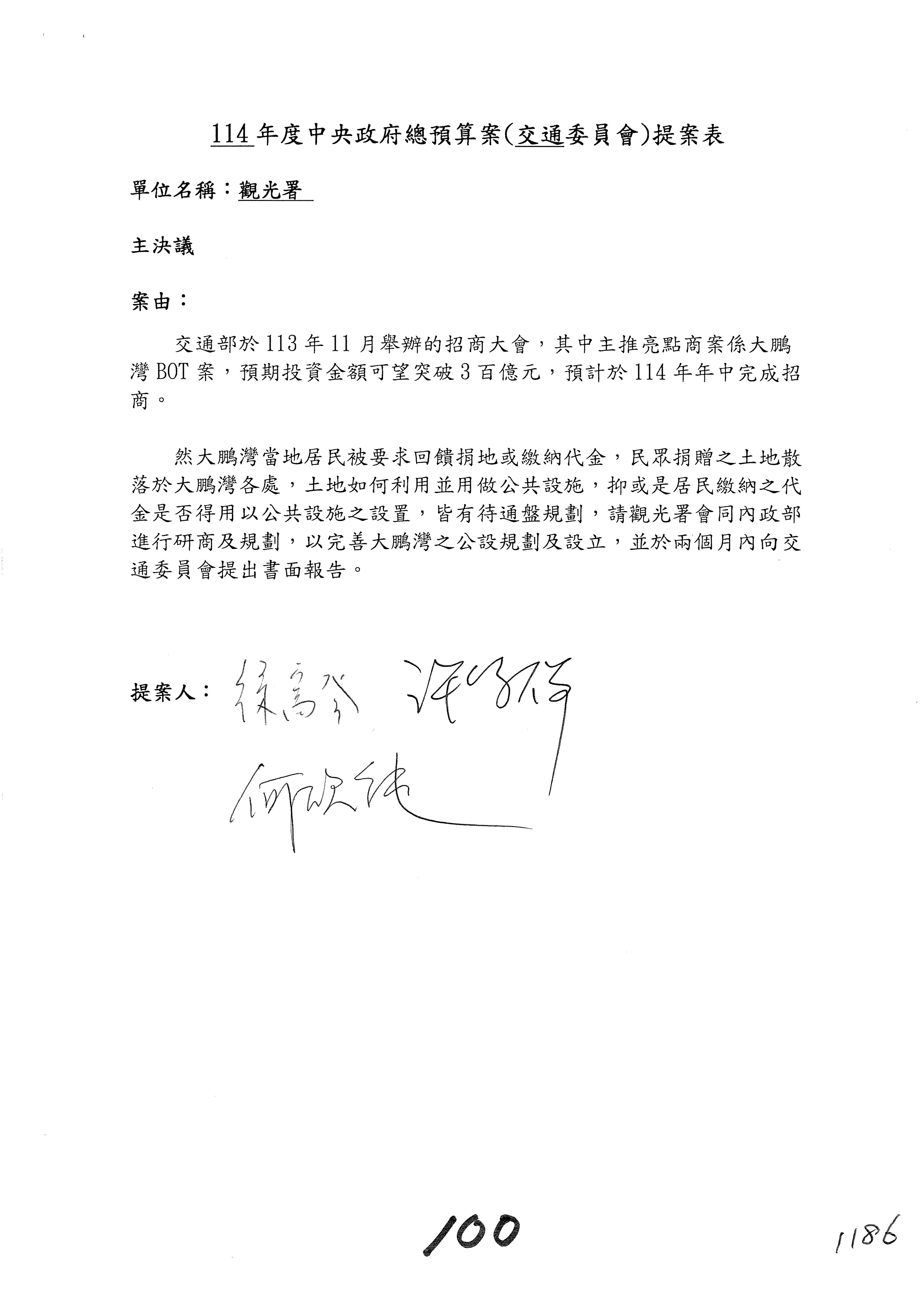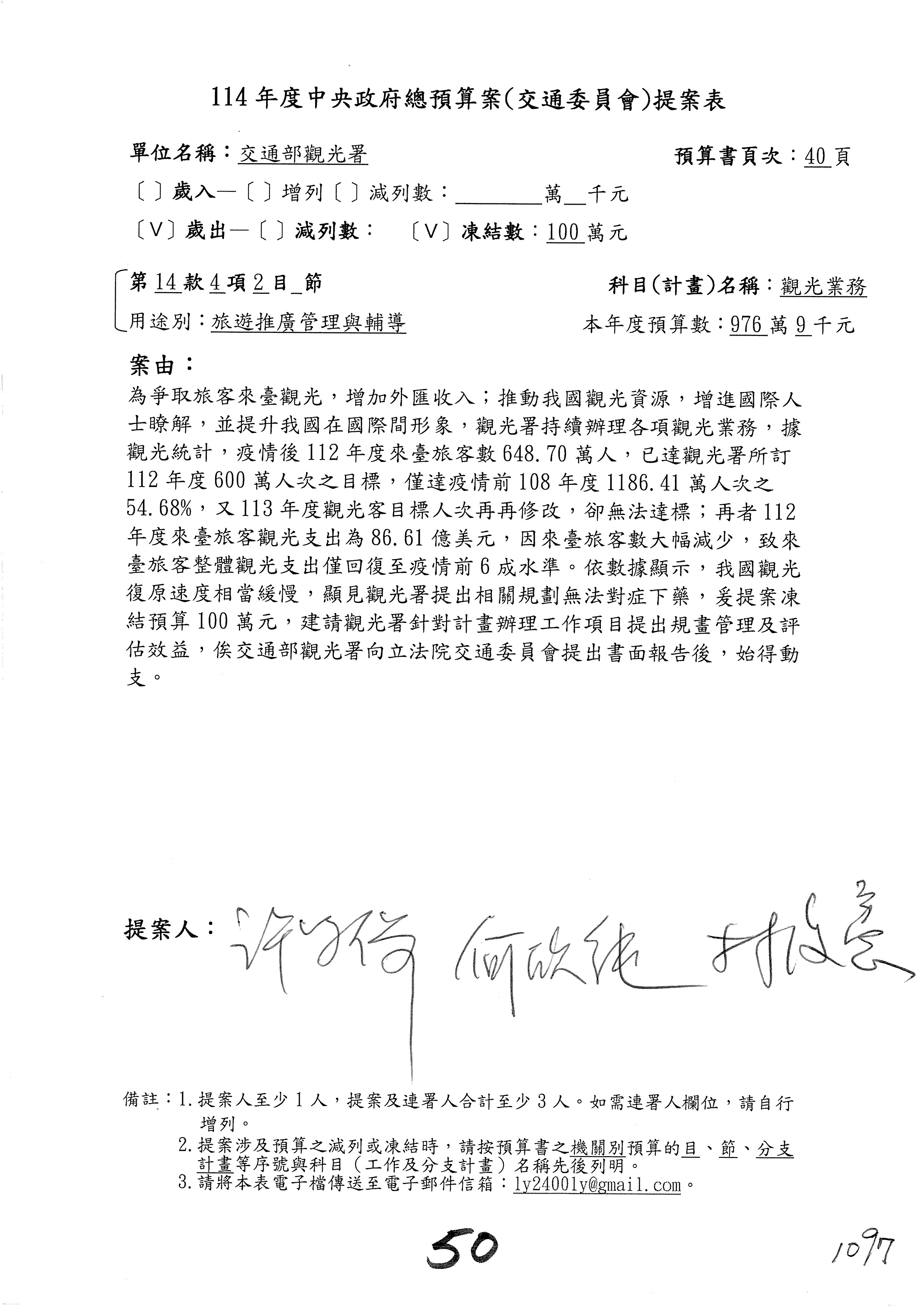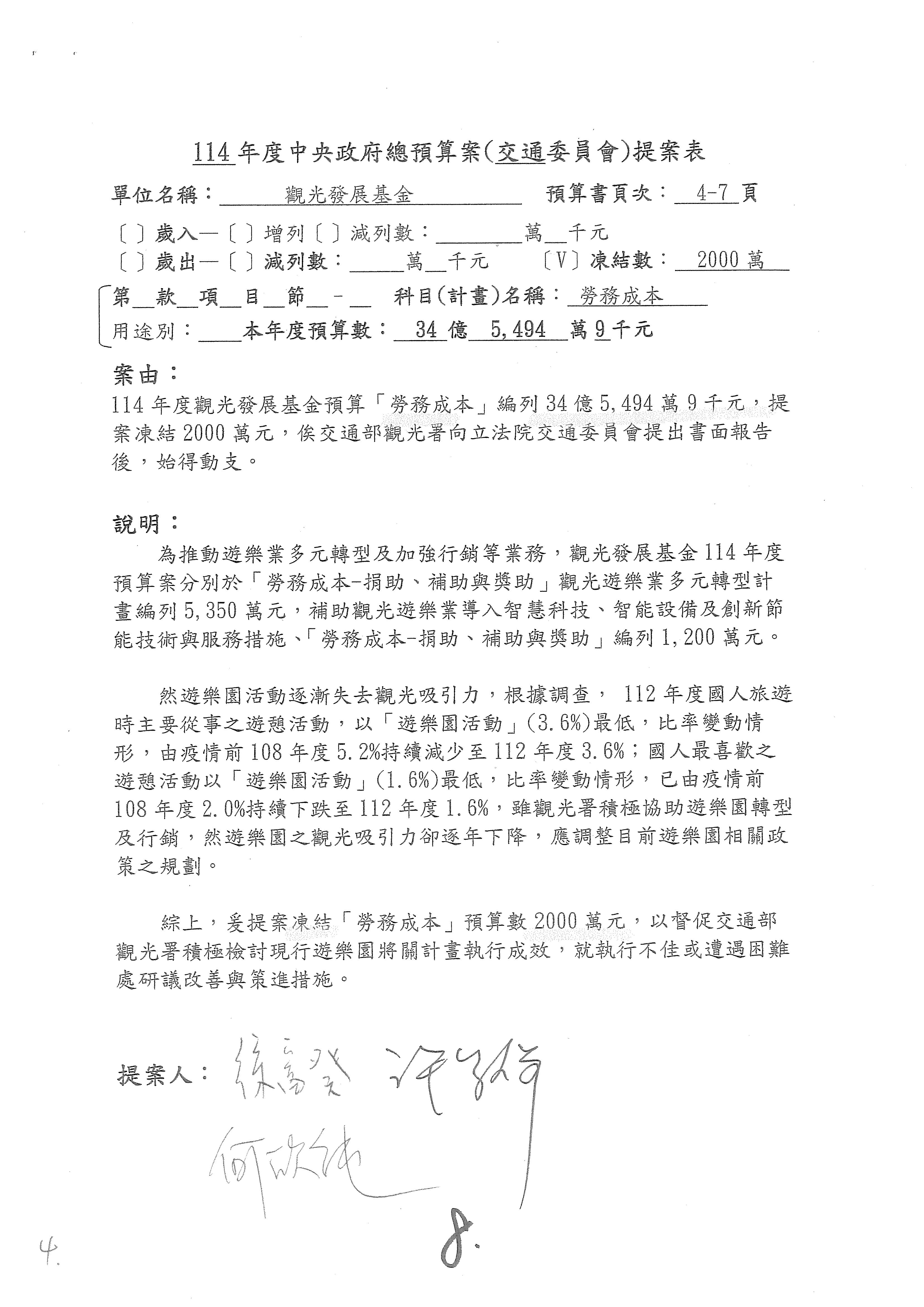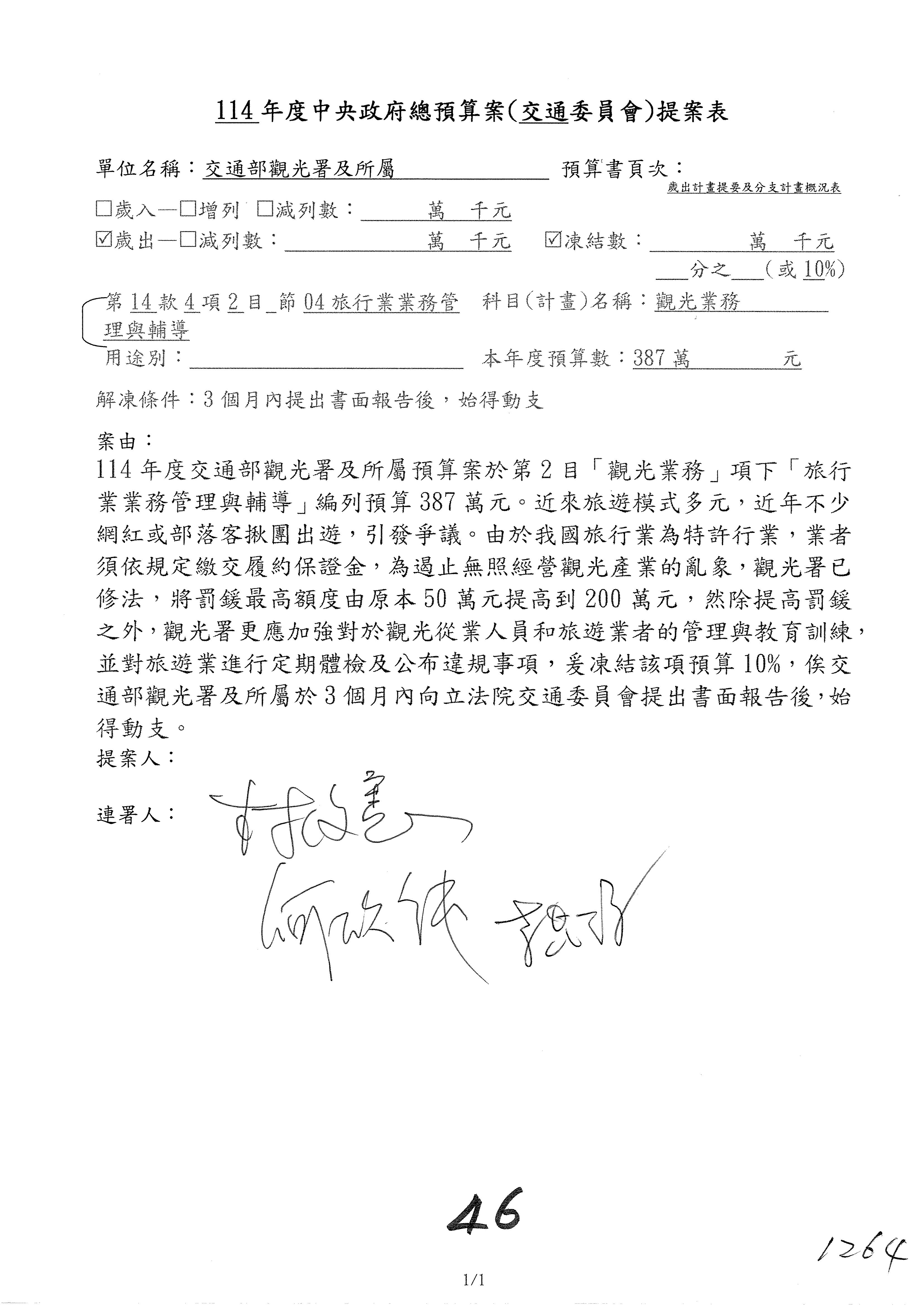 接下來處理交通部觀光發展基金114年度附屬單位預算,請各位參照建議併案及預算表。開始處理第1案。第1案林國成委員已經改主決議,沒問題吧?