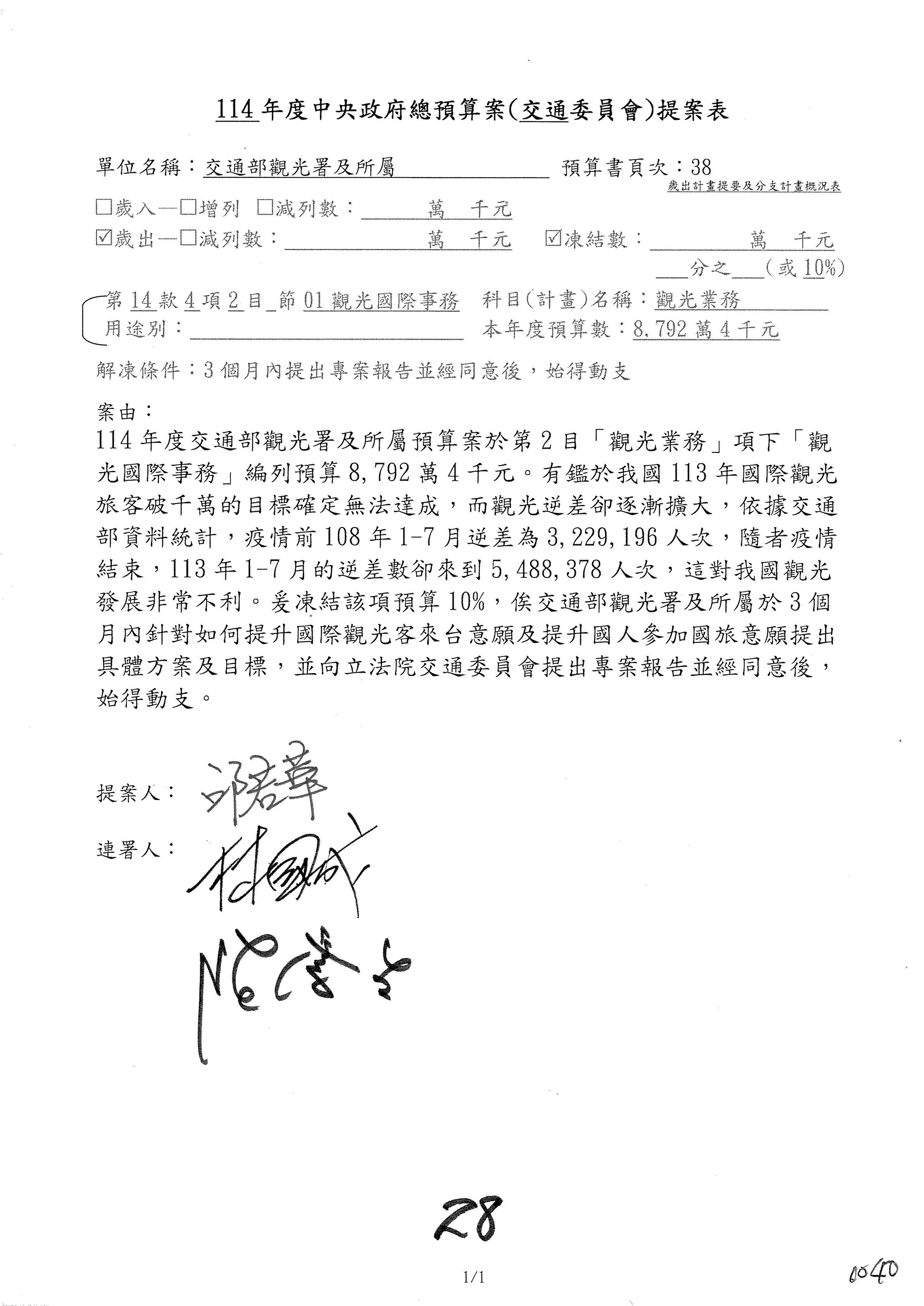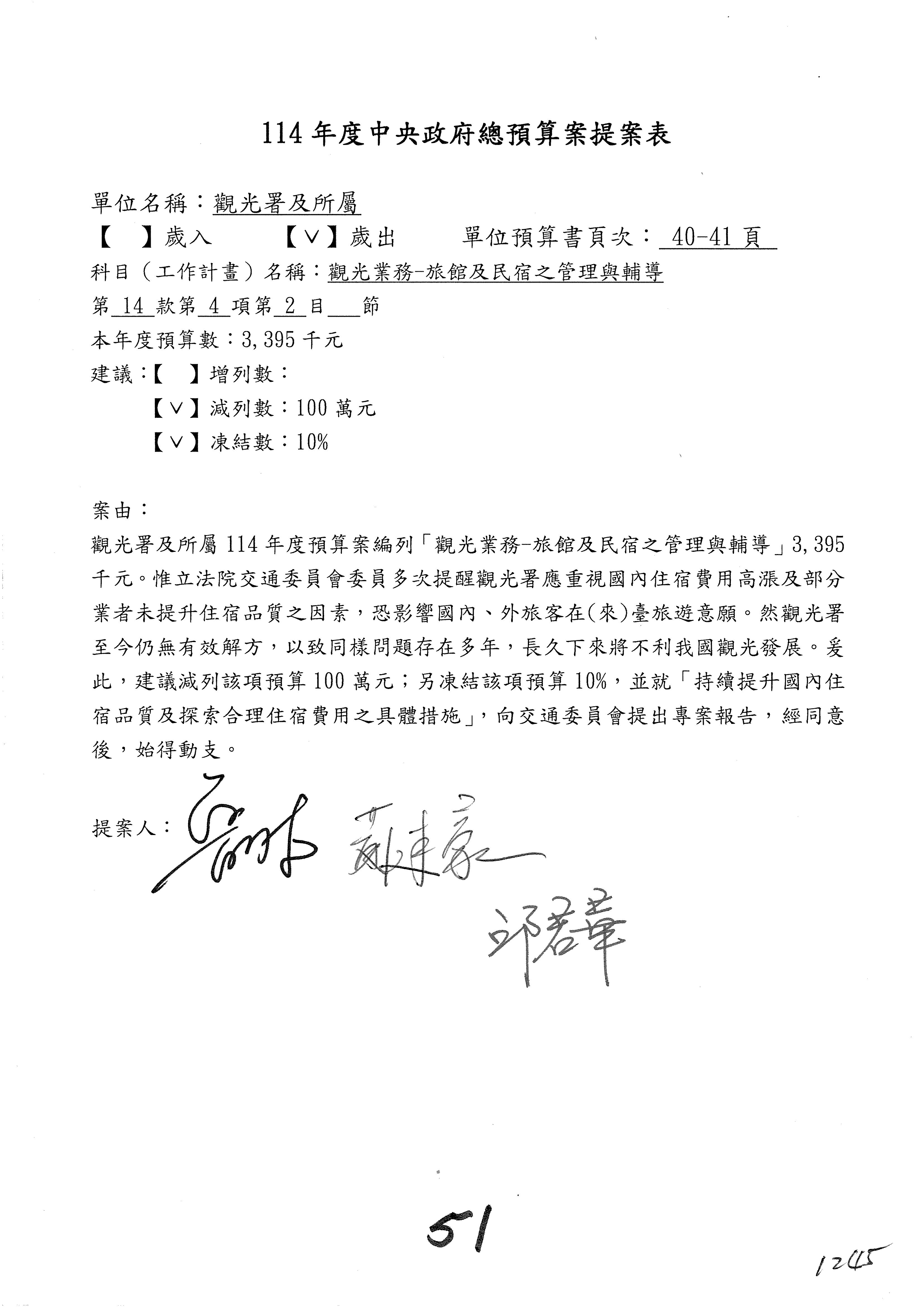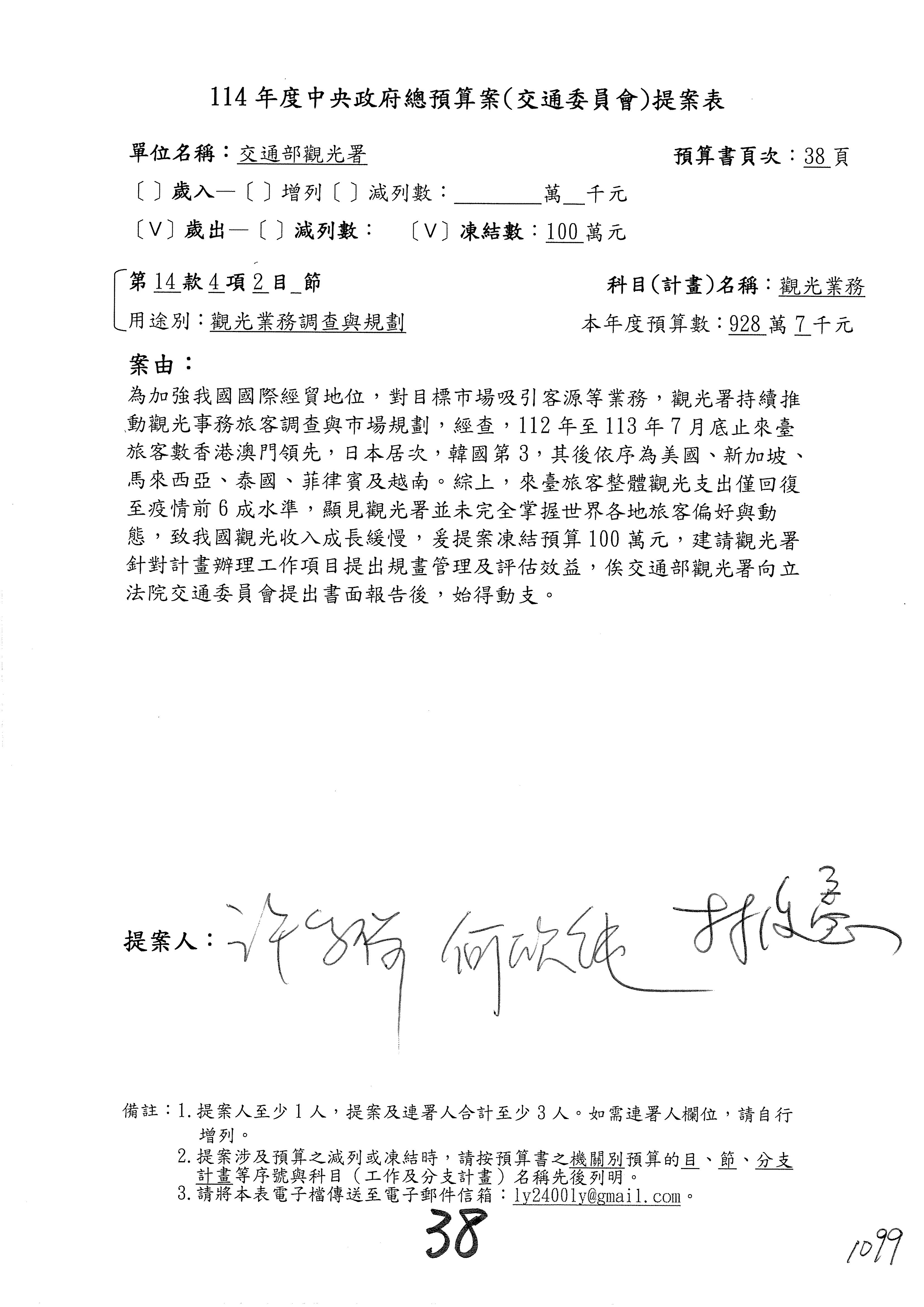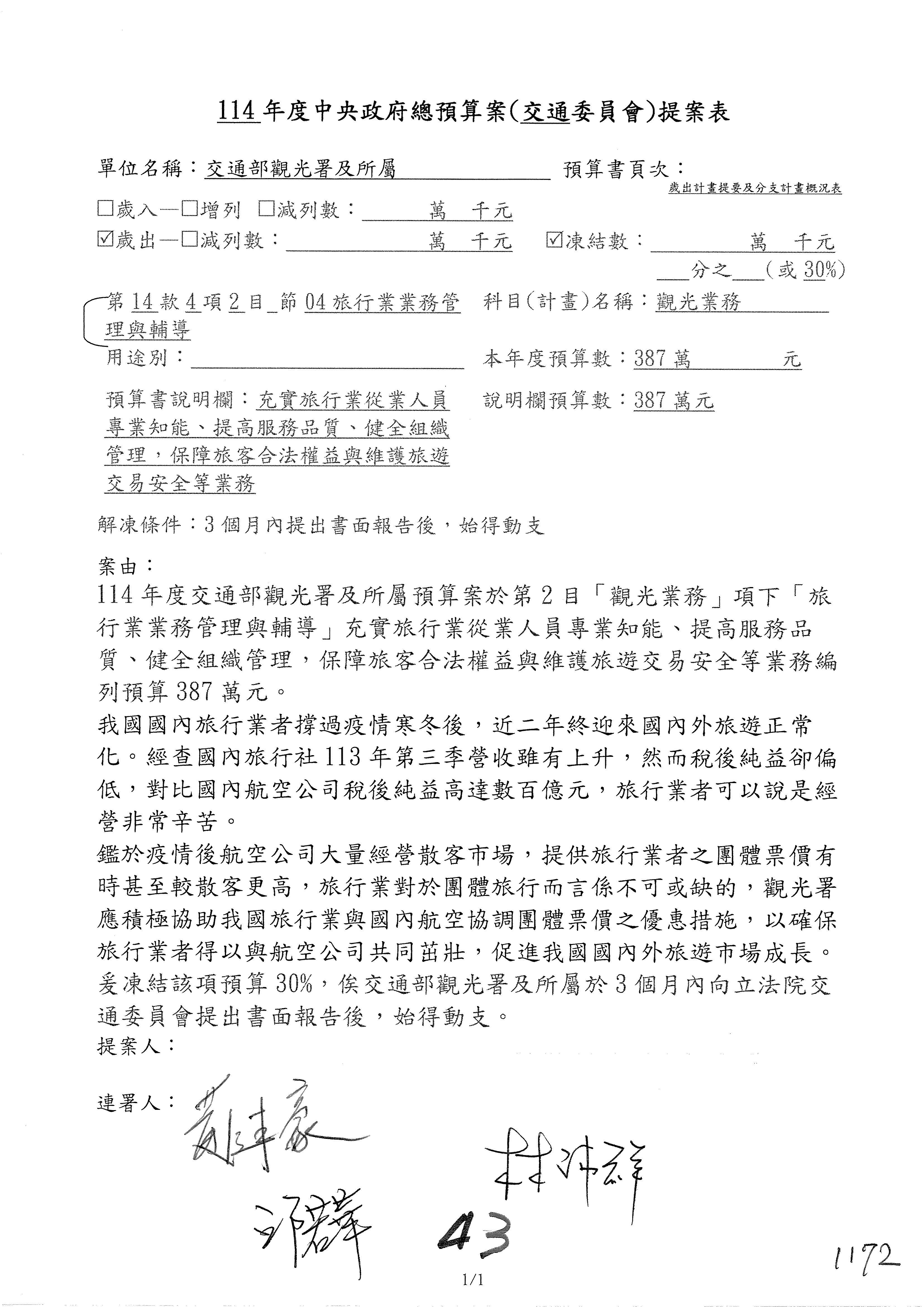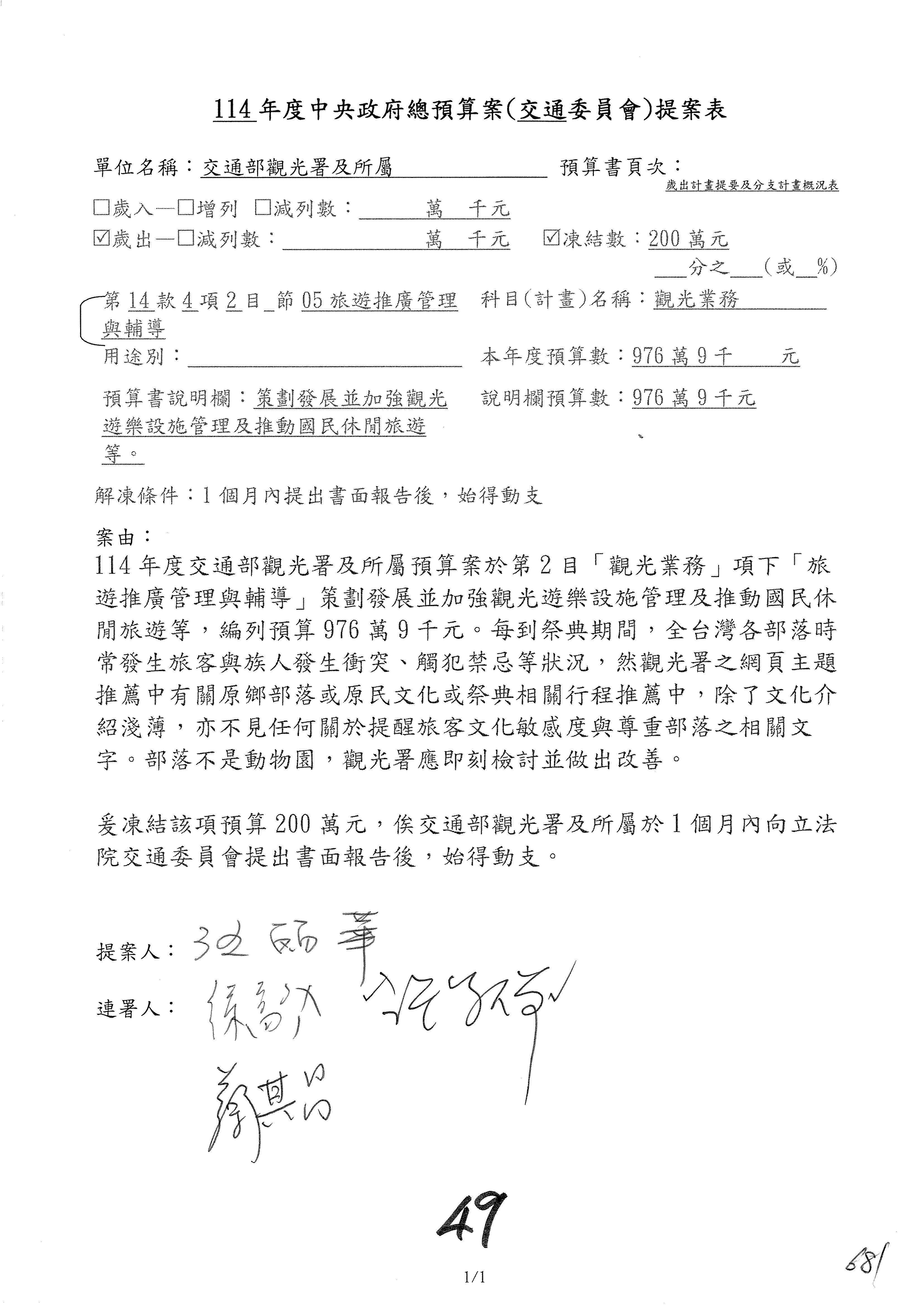 接下來處理交通部觀光發展基金114年度附屬單位預算,請各位參照建議併案及預算表。開始處理第1案。第1案林國成委員已經改主決議,沒問題吧?
