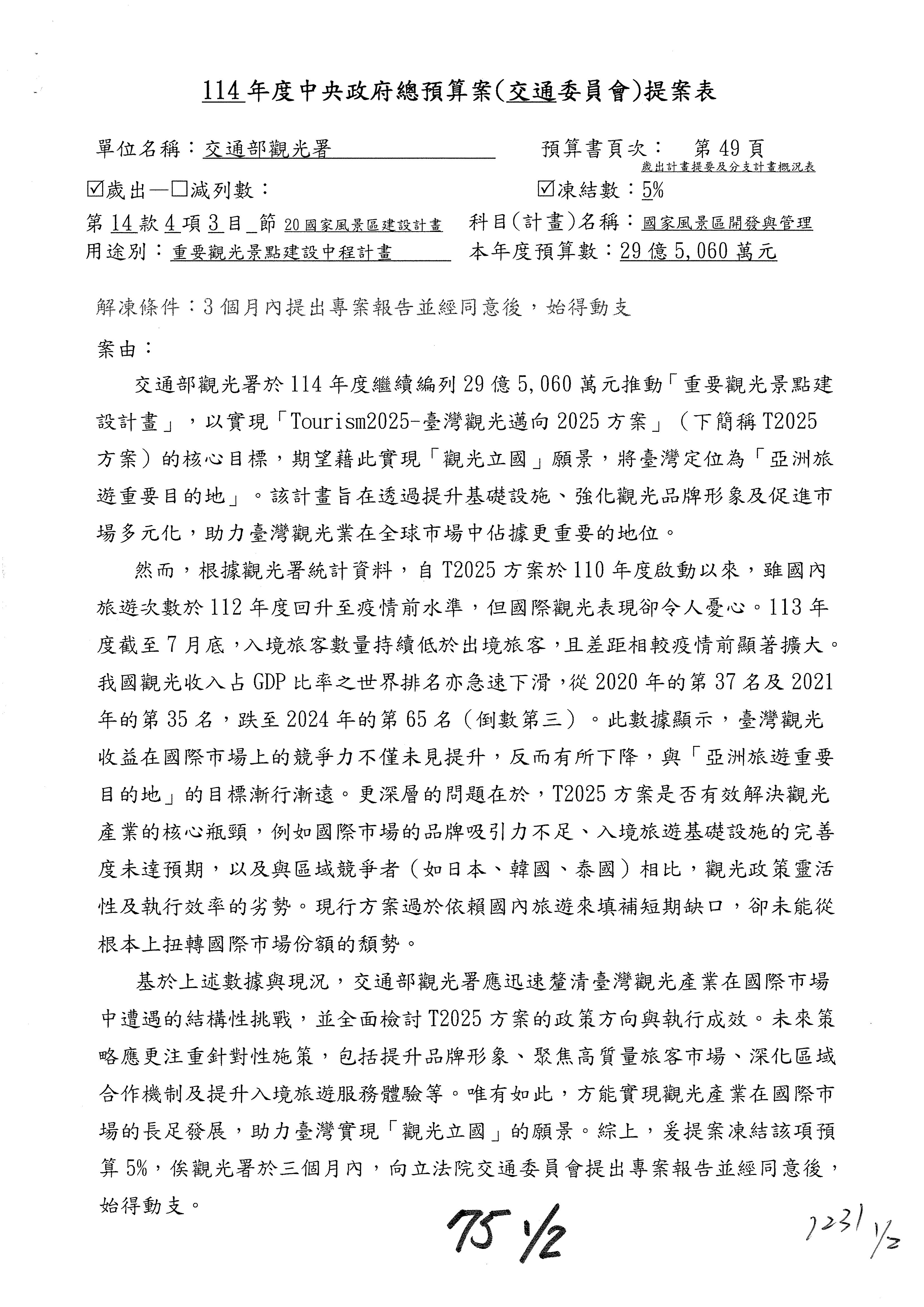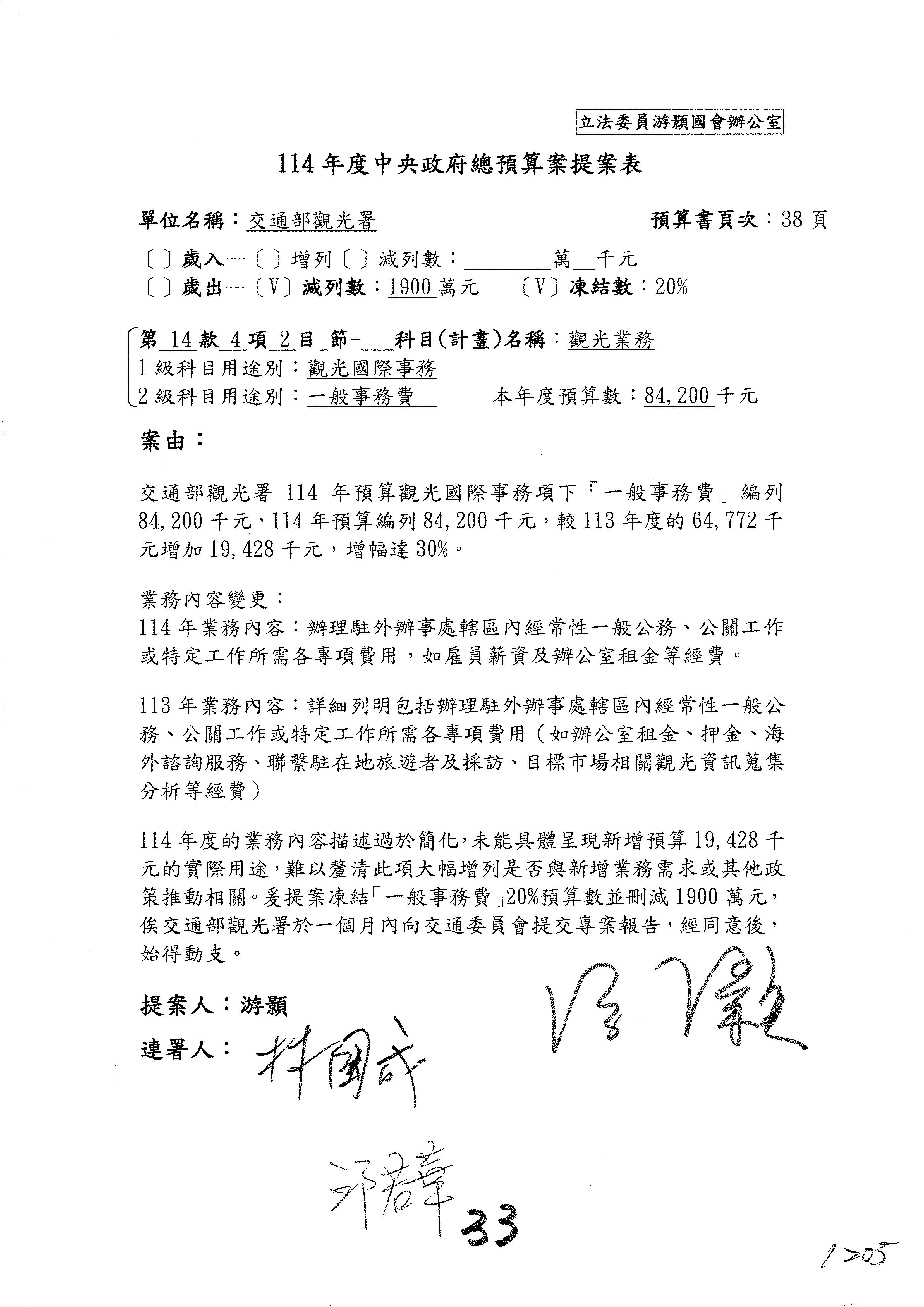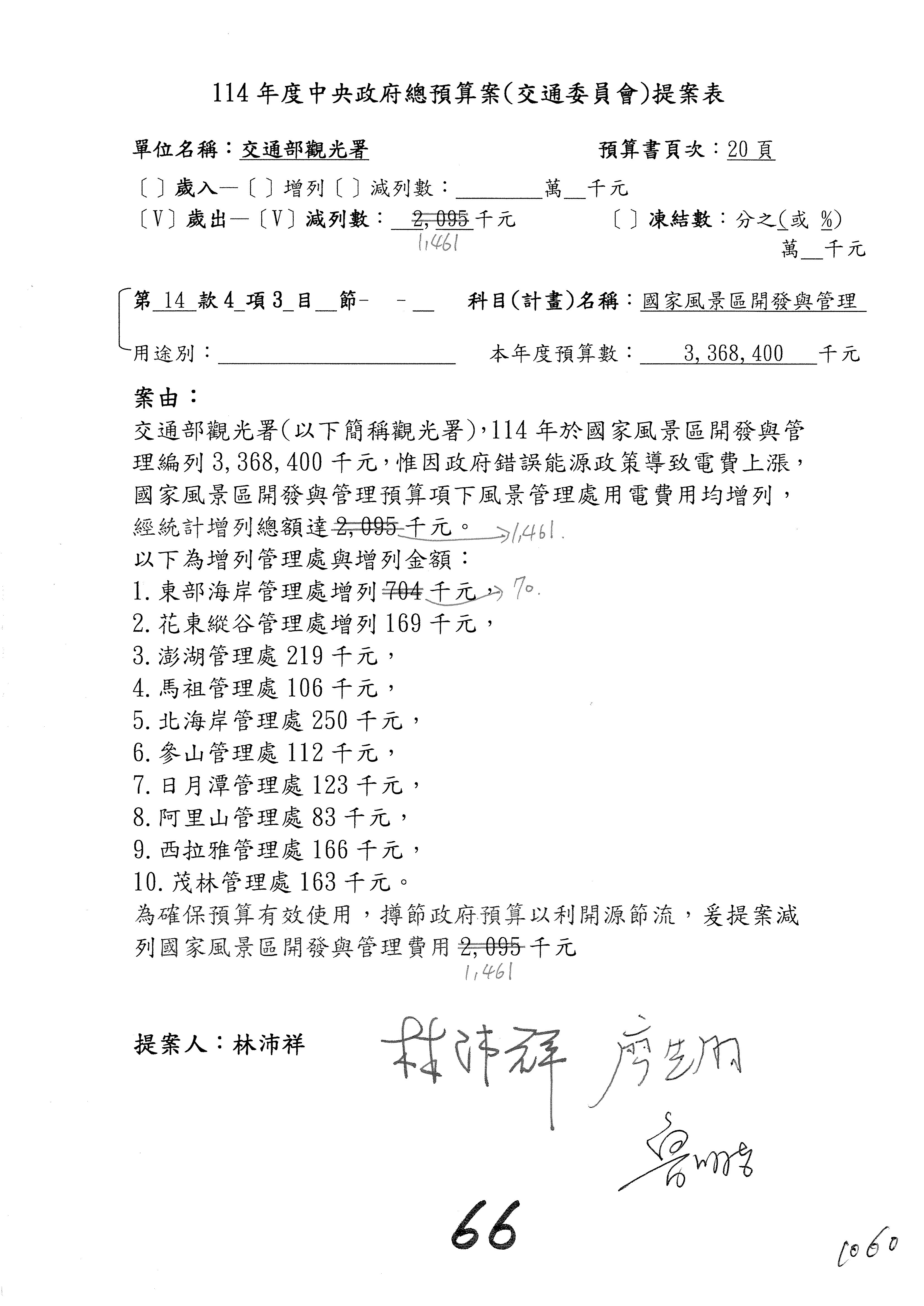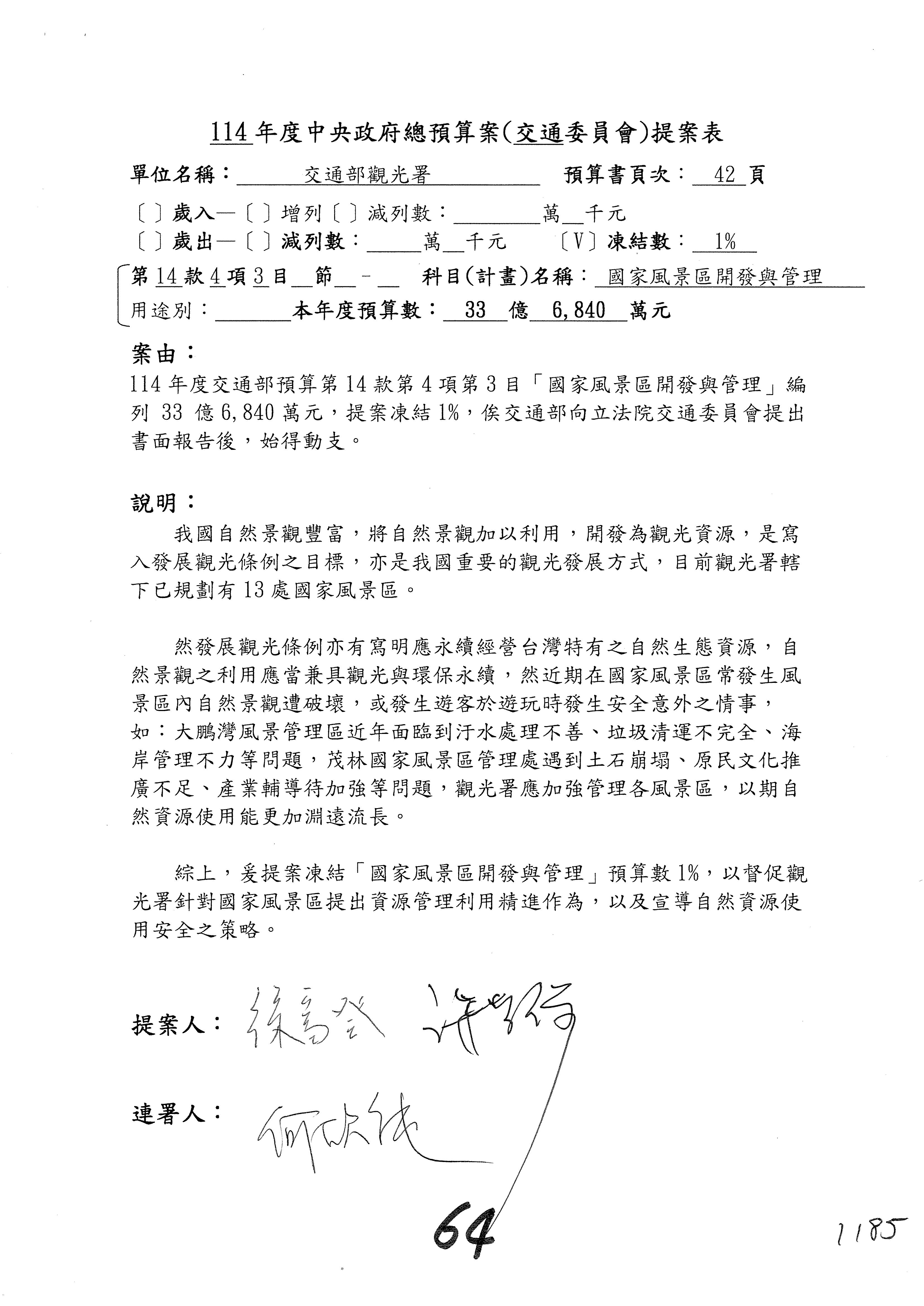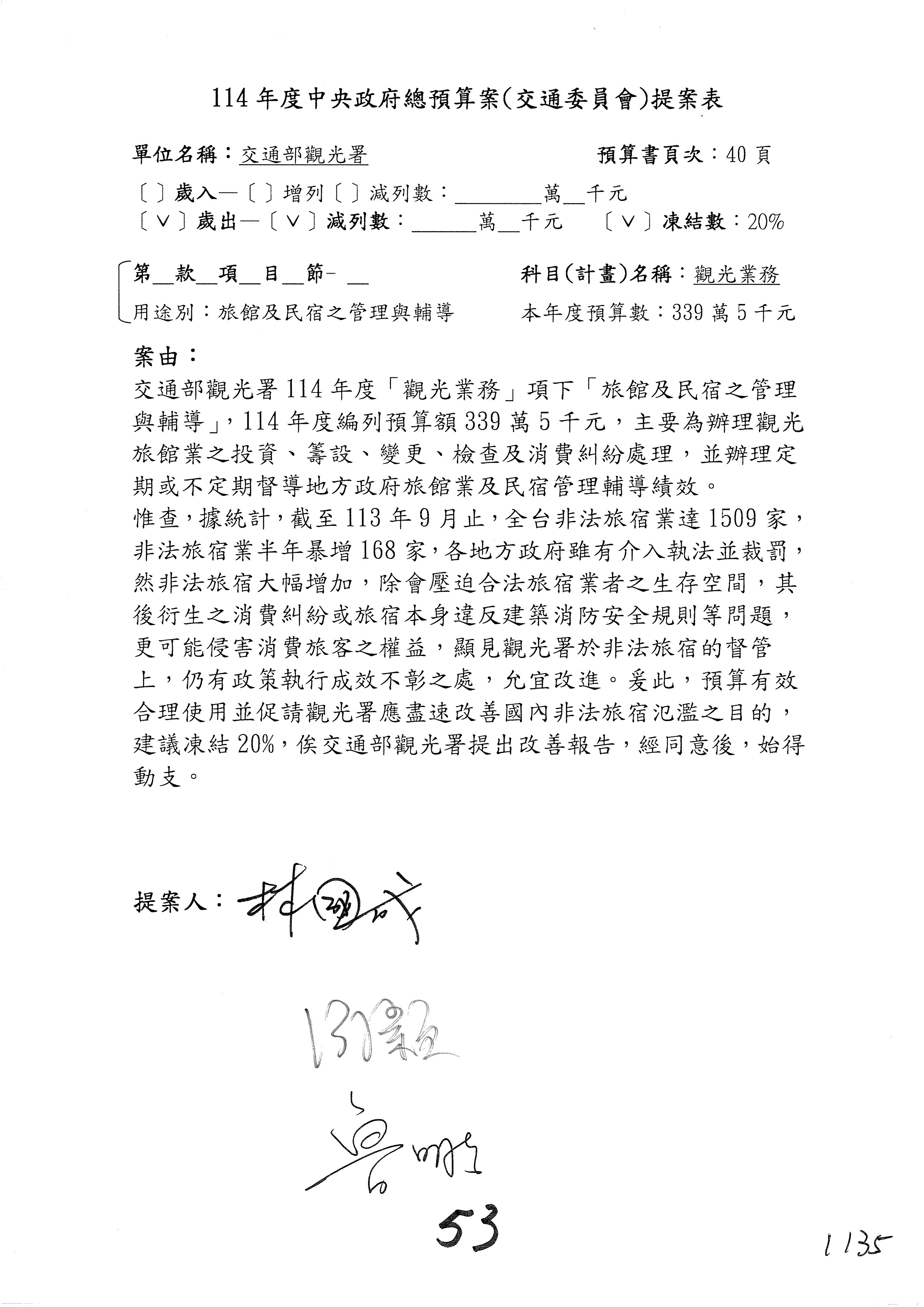 接下來處理交通部觀光發展基金114年度附屬單位預算,請各位參照建議併案及預算表。開始處理第1案。第1案林國成委員已經改主決議,沒問題吧?