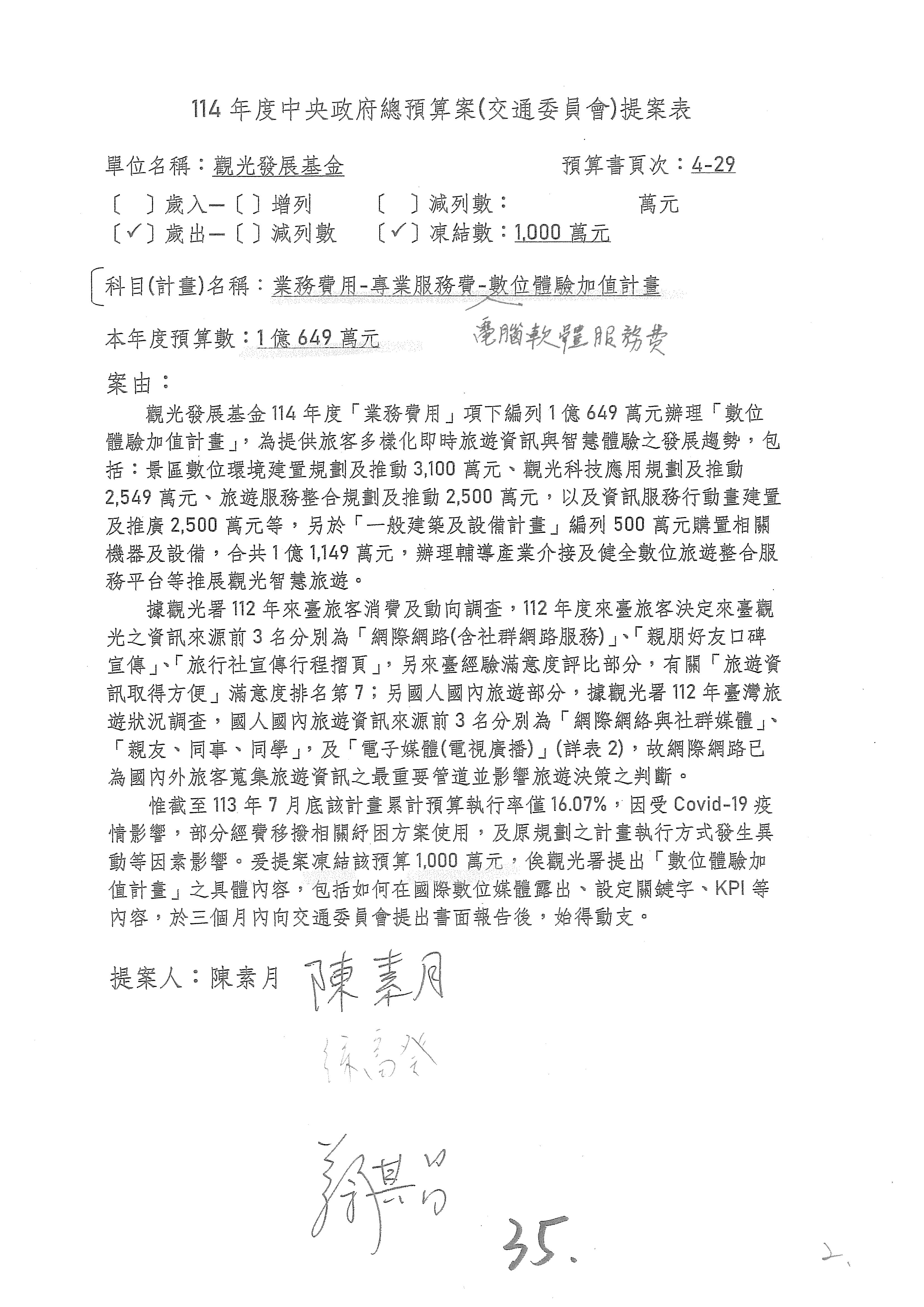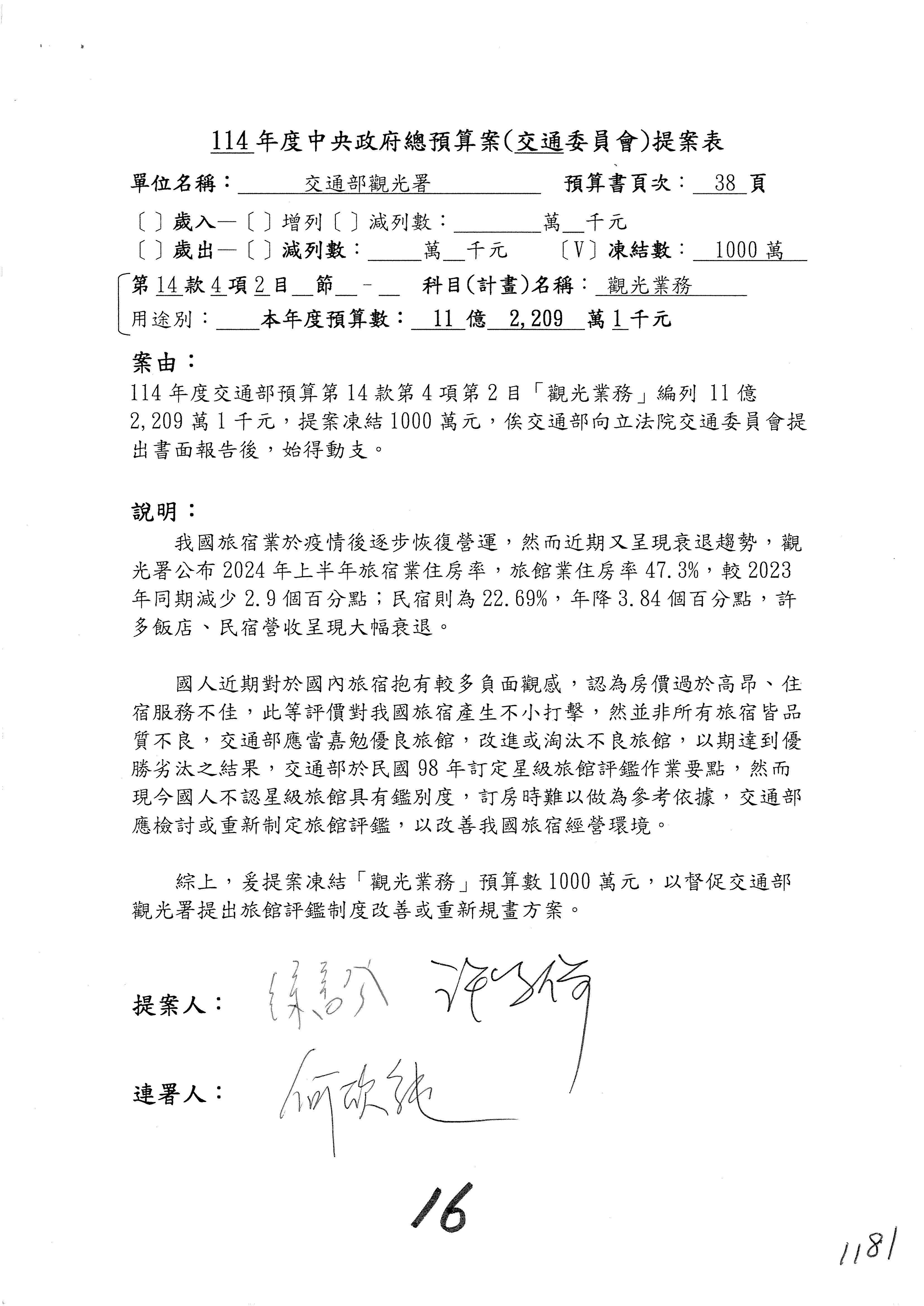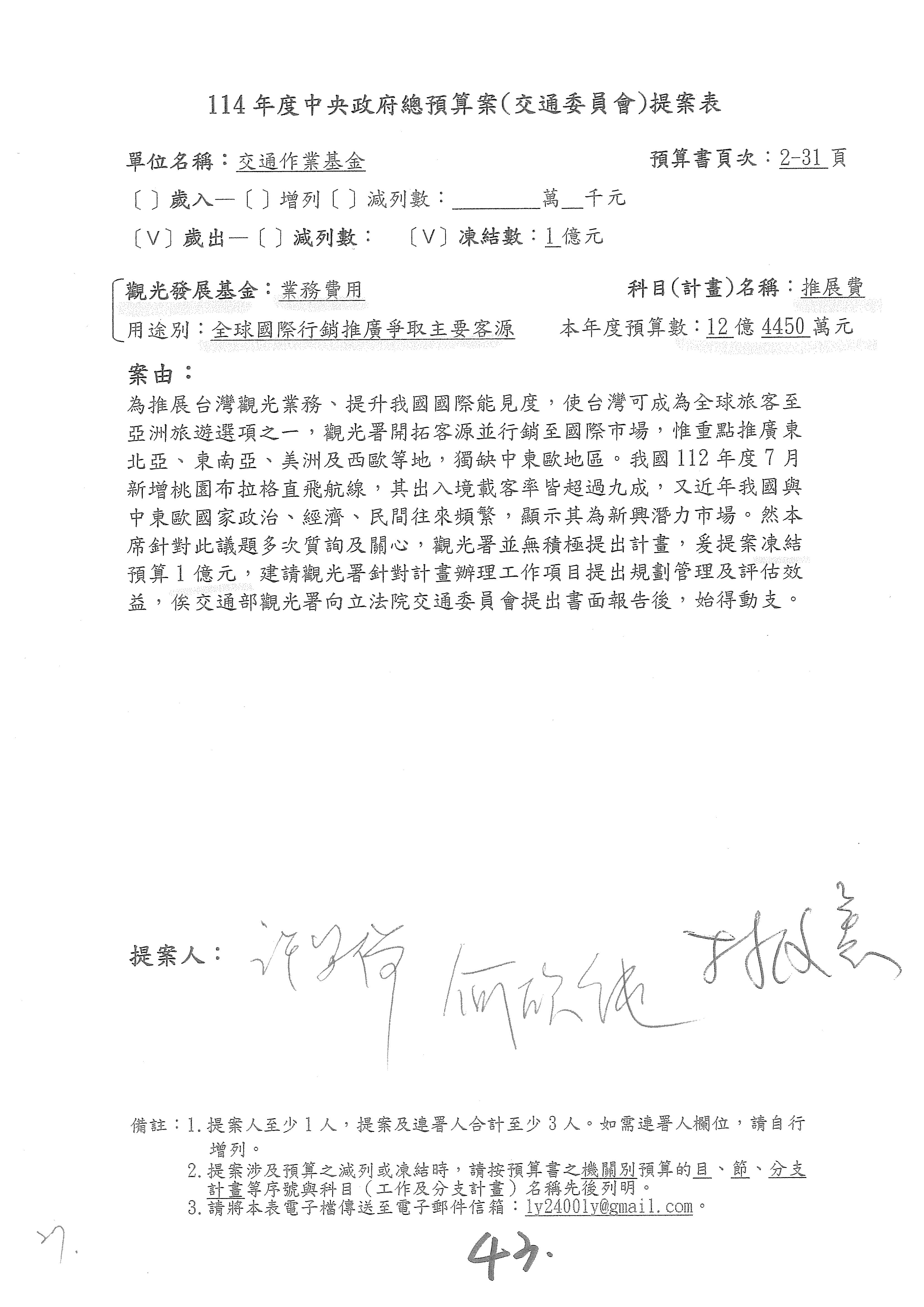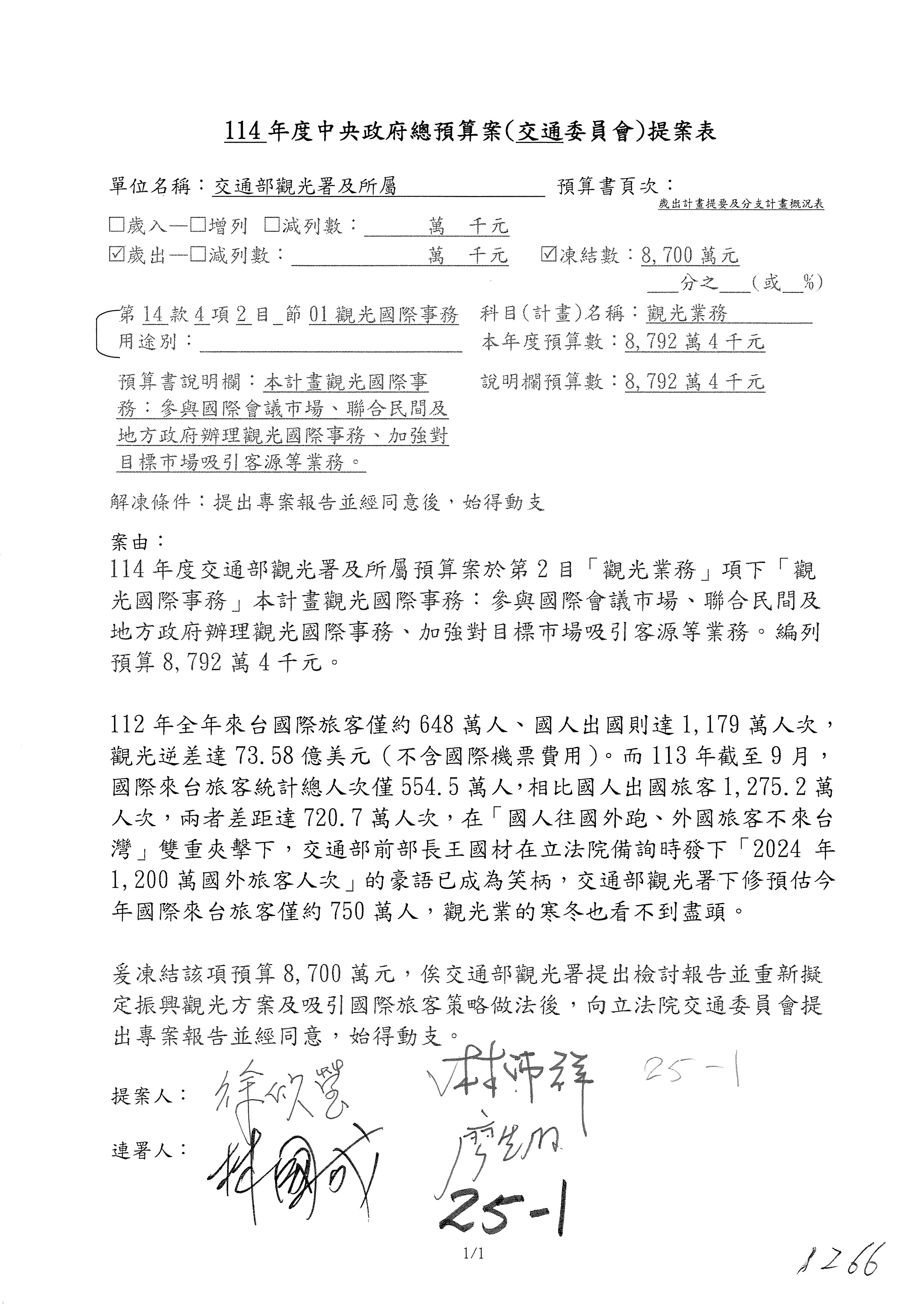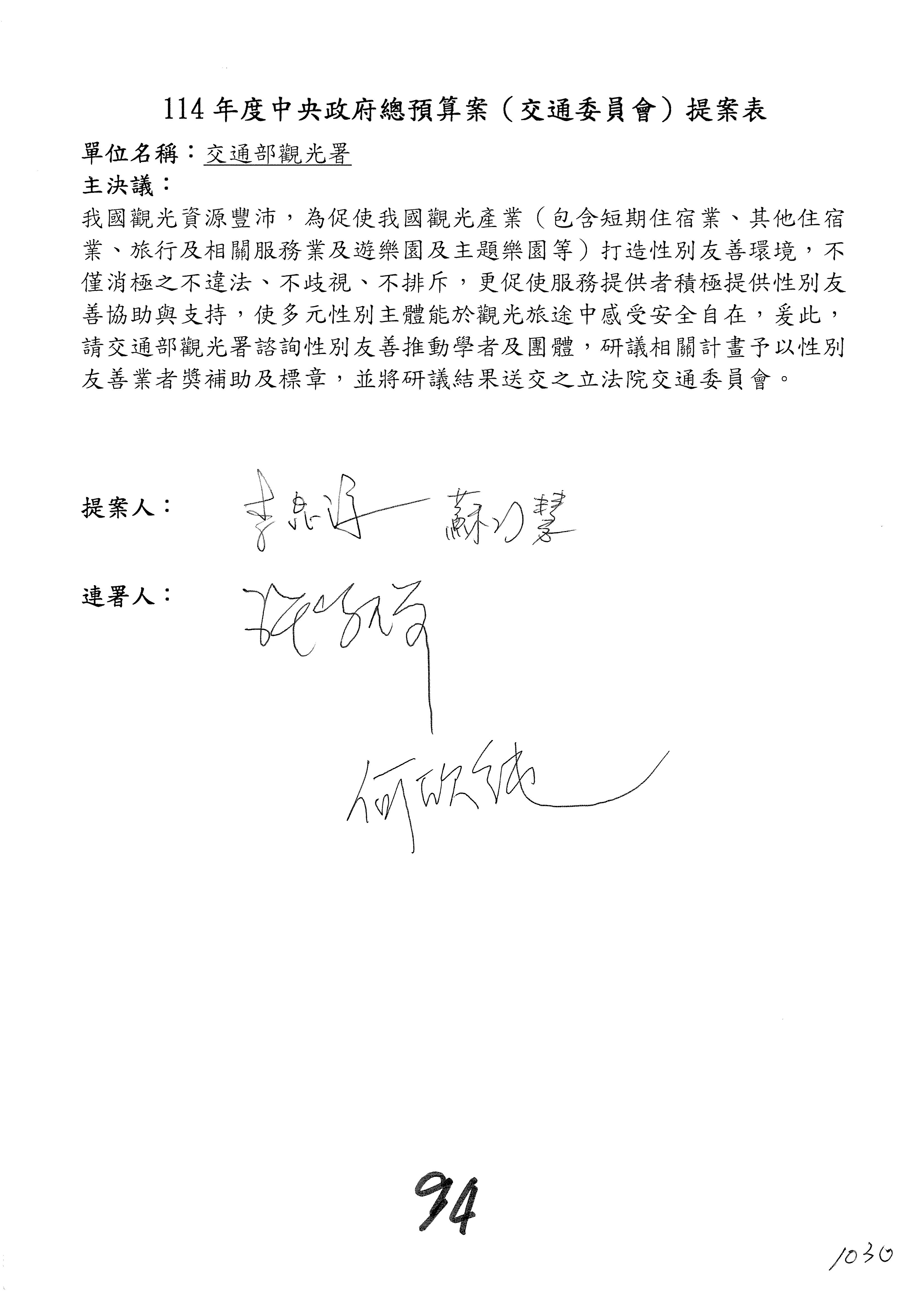 接下來處理交通部觀光發展基金114年度附屬單位預算,請各位參照建議併案及預算表。開始處理第1案。第1案林國成委員已經改主決議,沒問題吧?