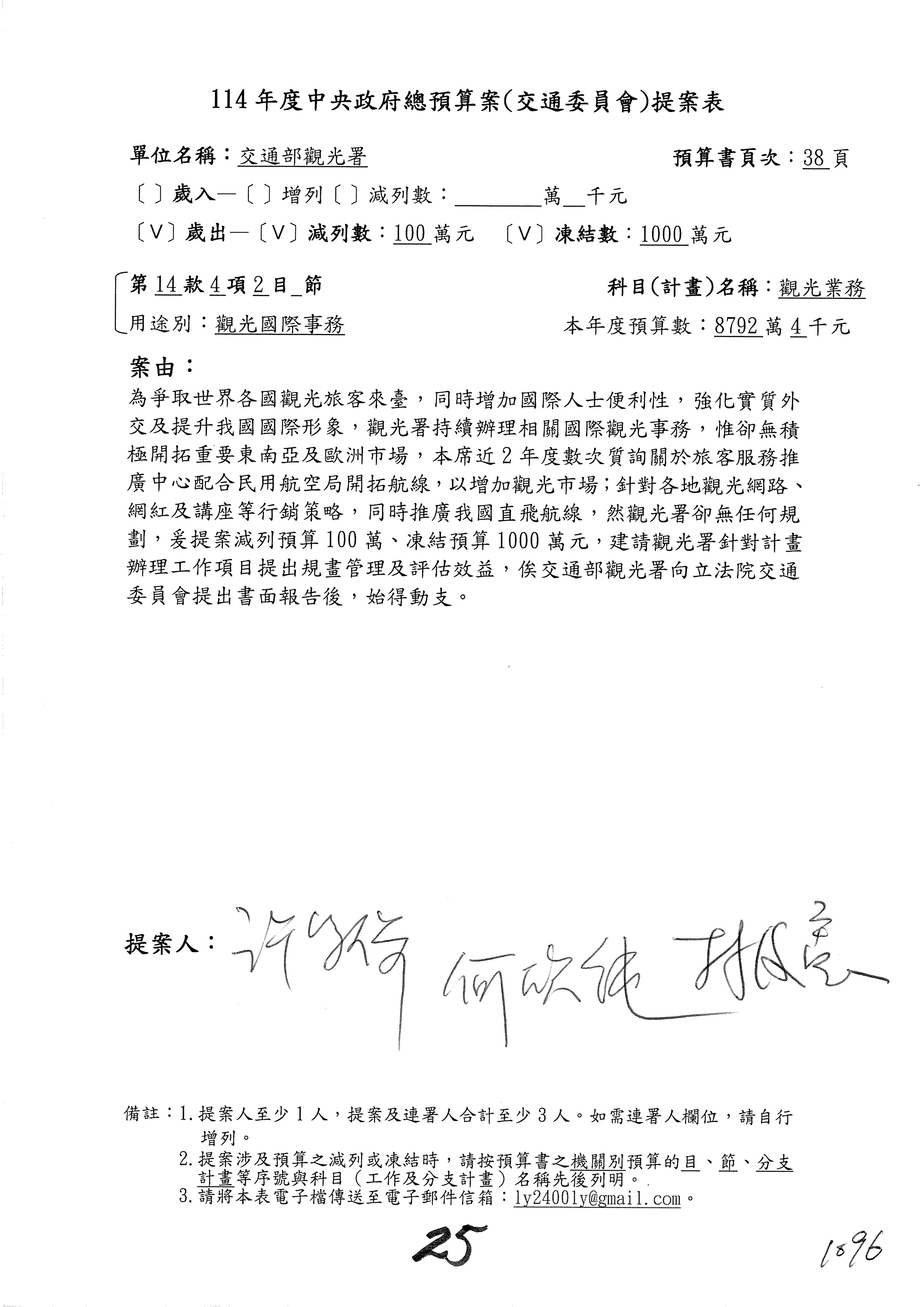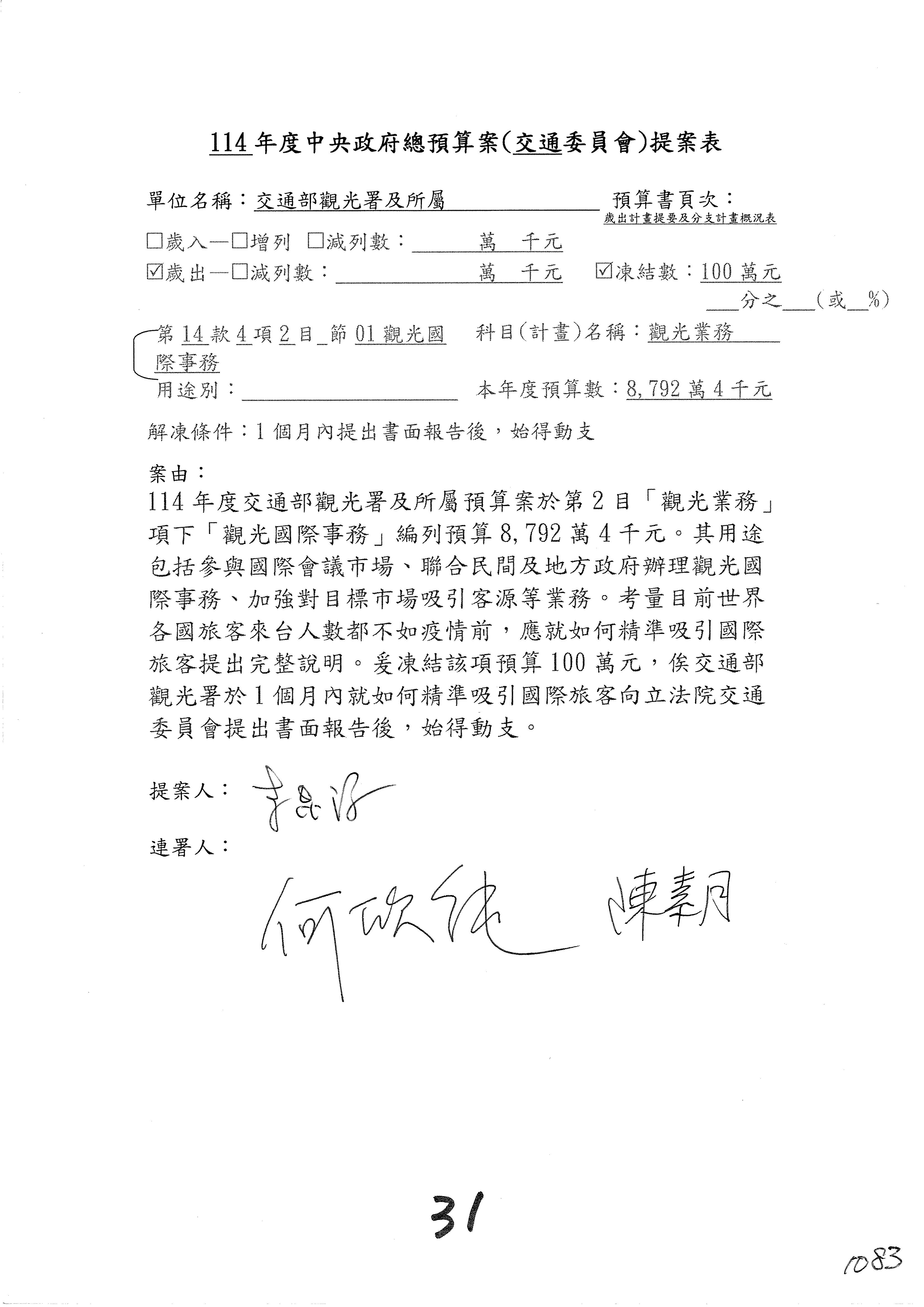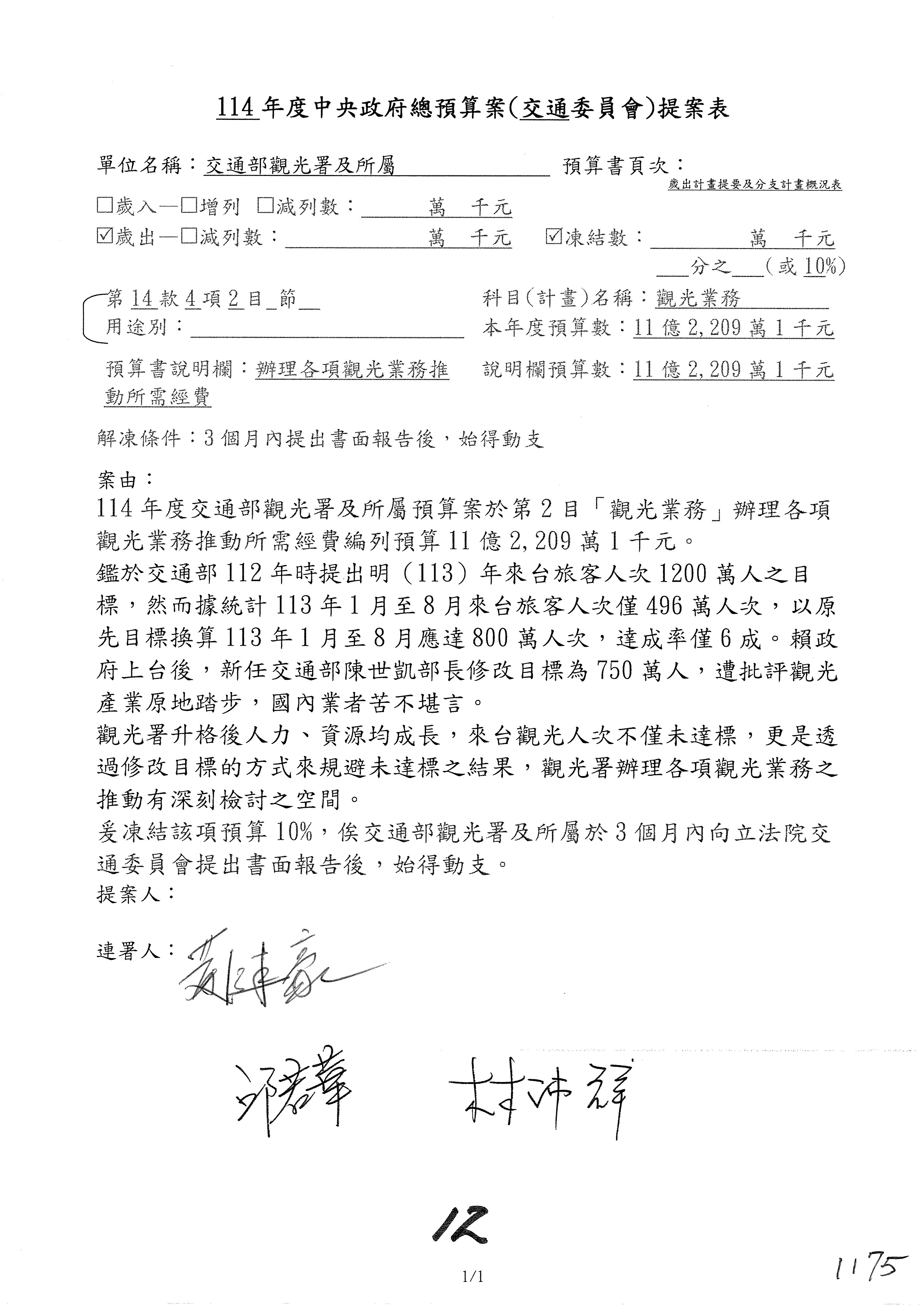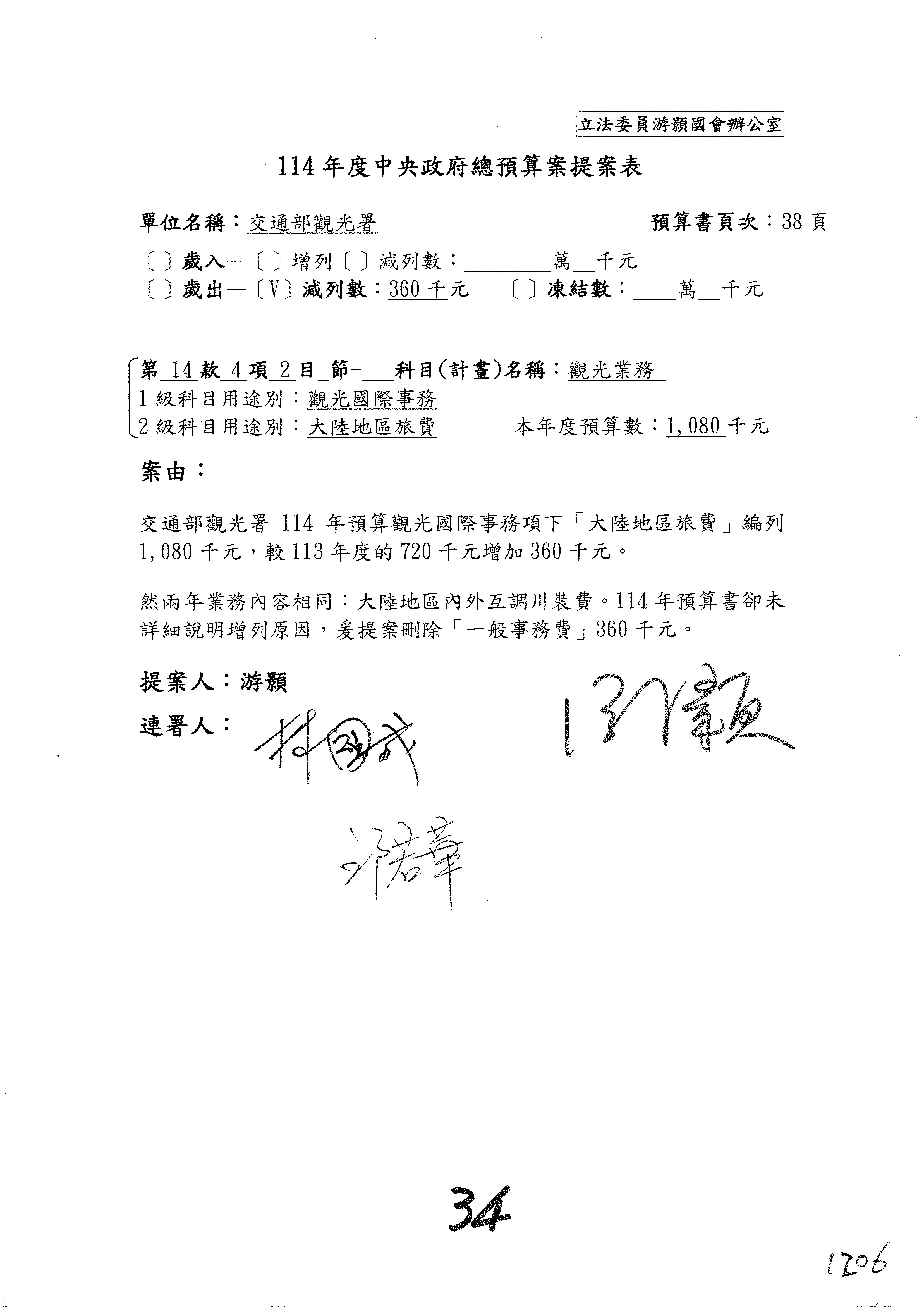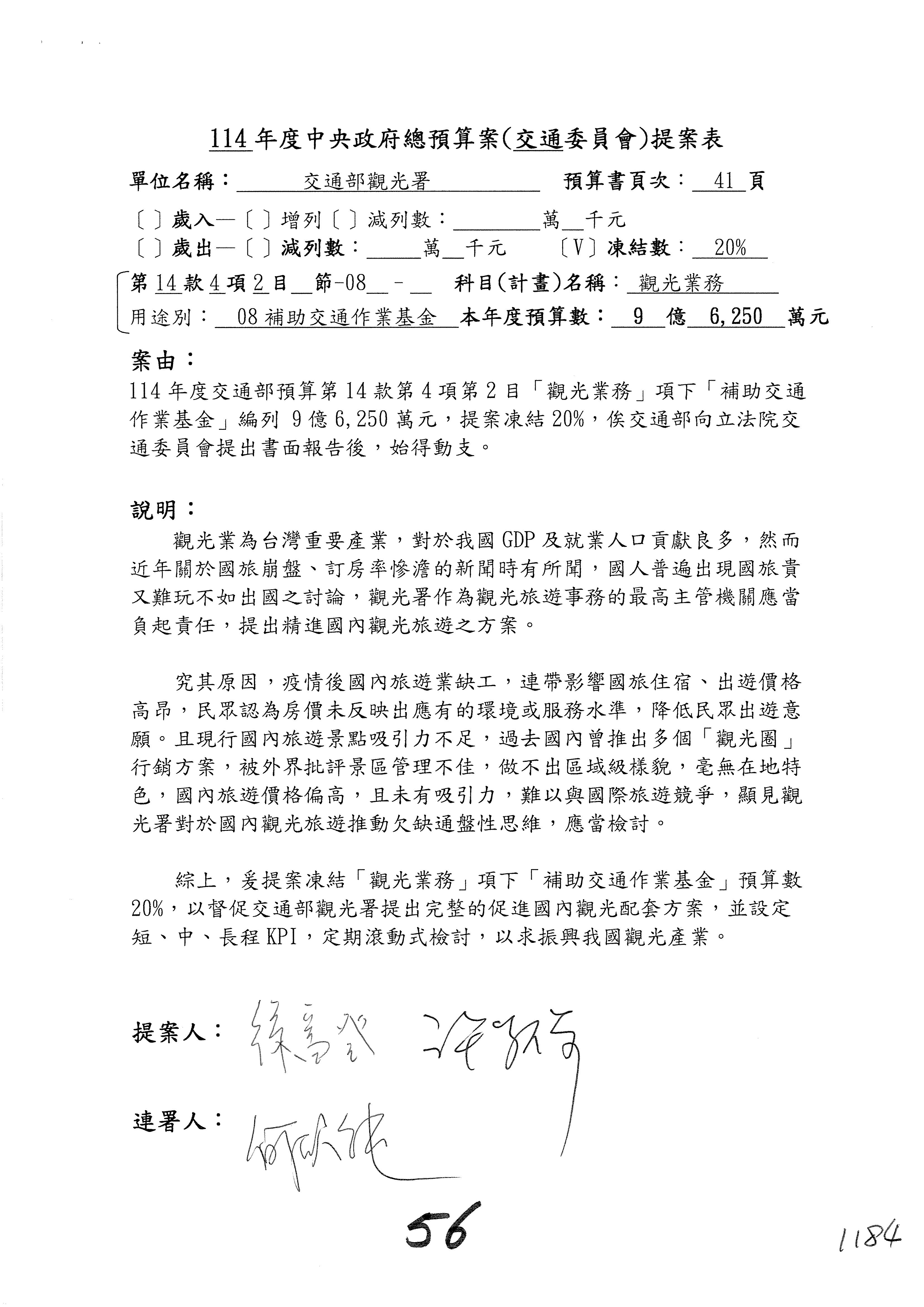 接下來處理交通部觀光發展基金114年度附屬單位預算,請各位參照建議併案及預算表。開始處理第1案。第1案林國成委員已經改主決議,沒問題吧?