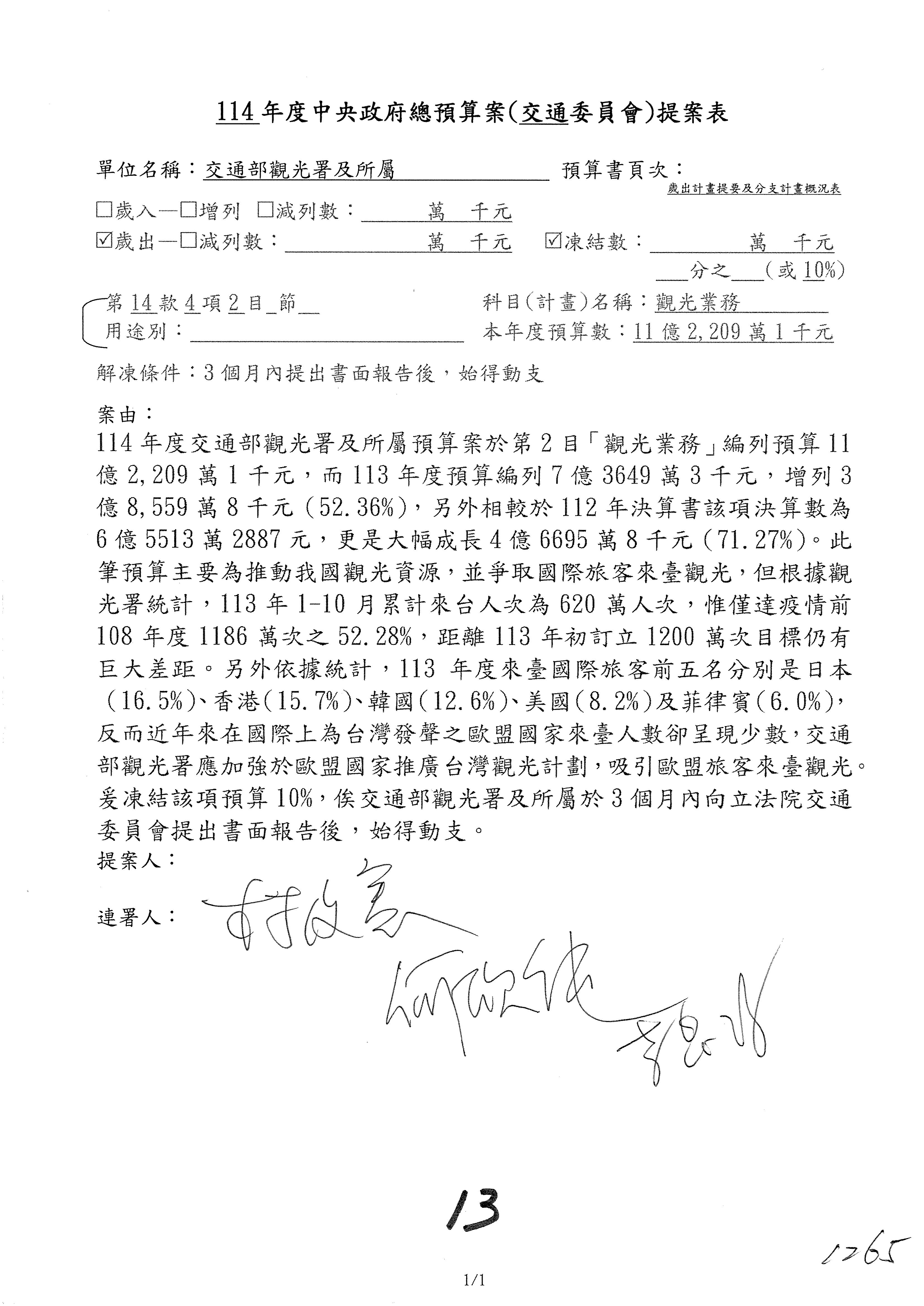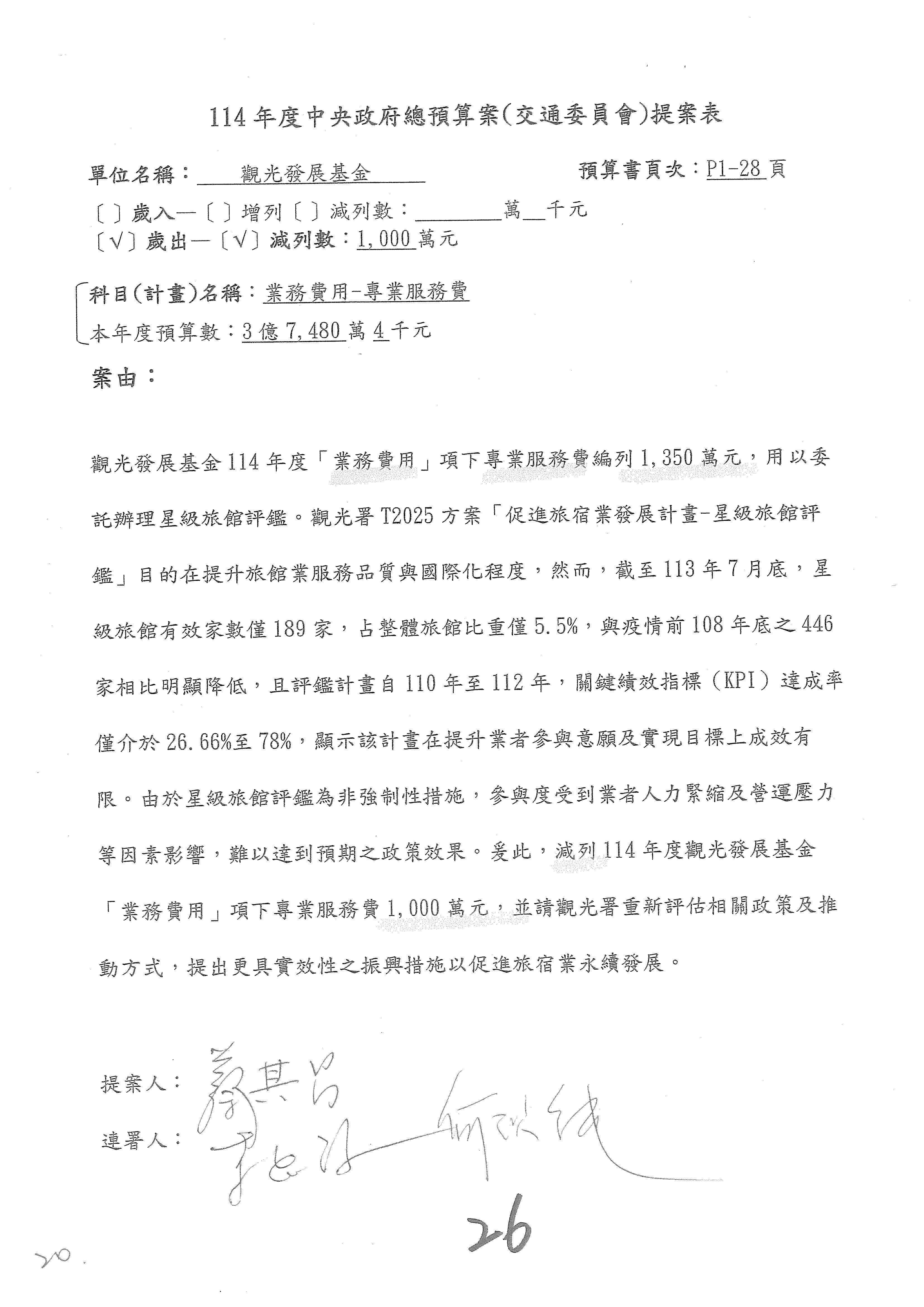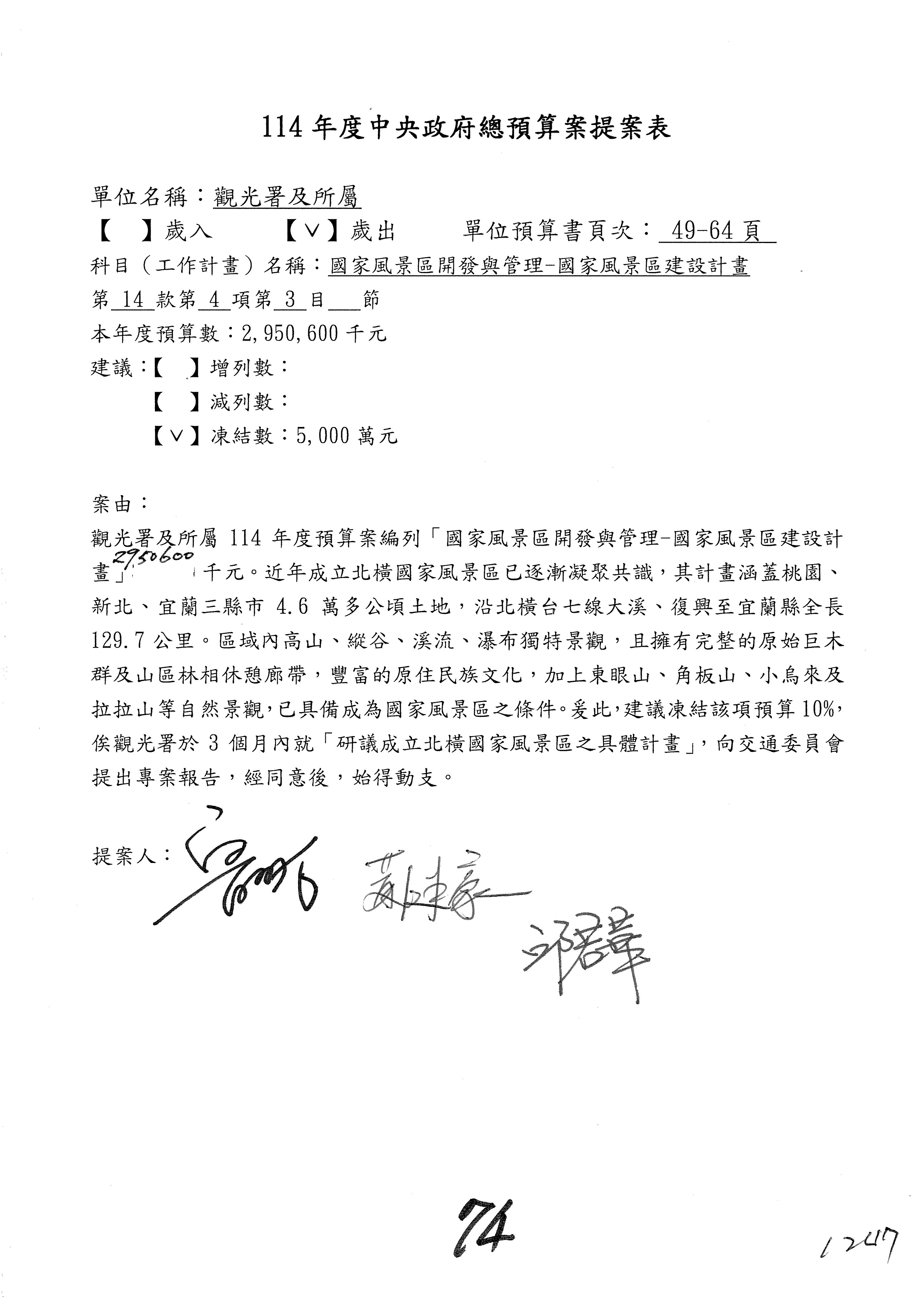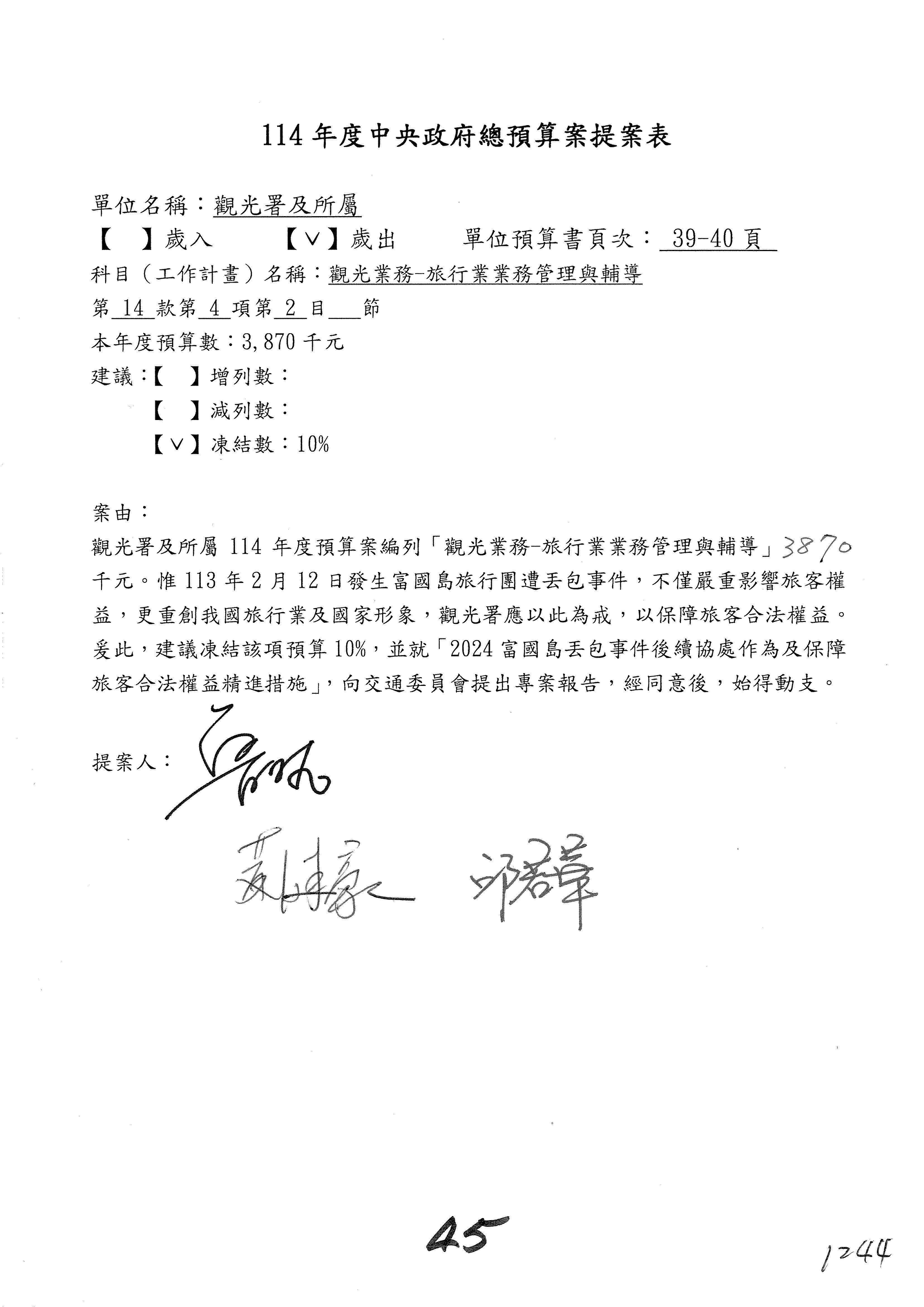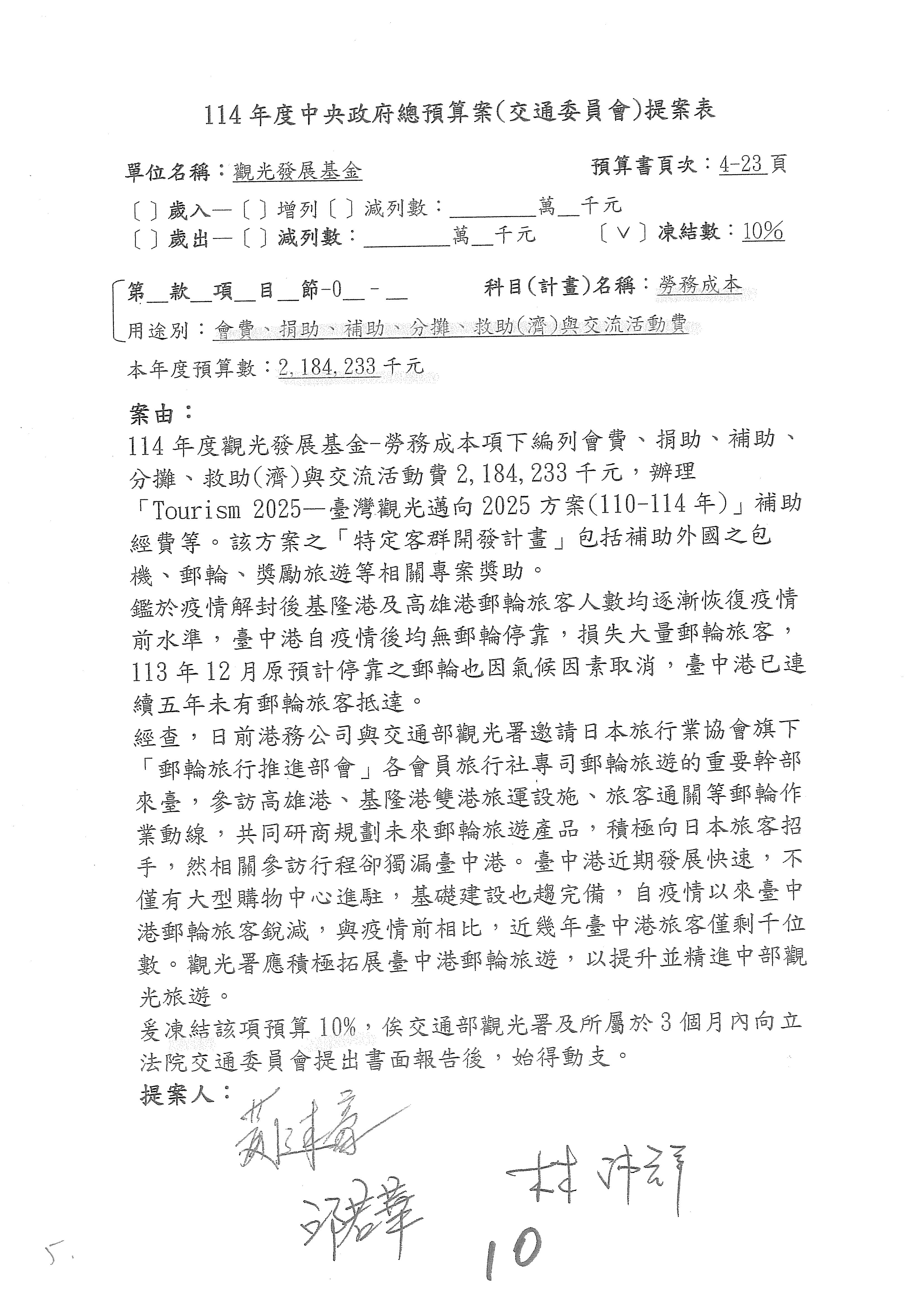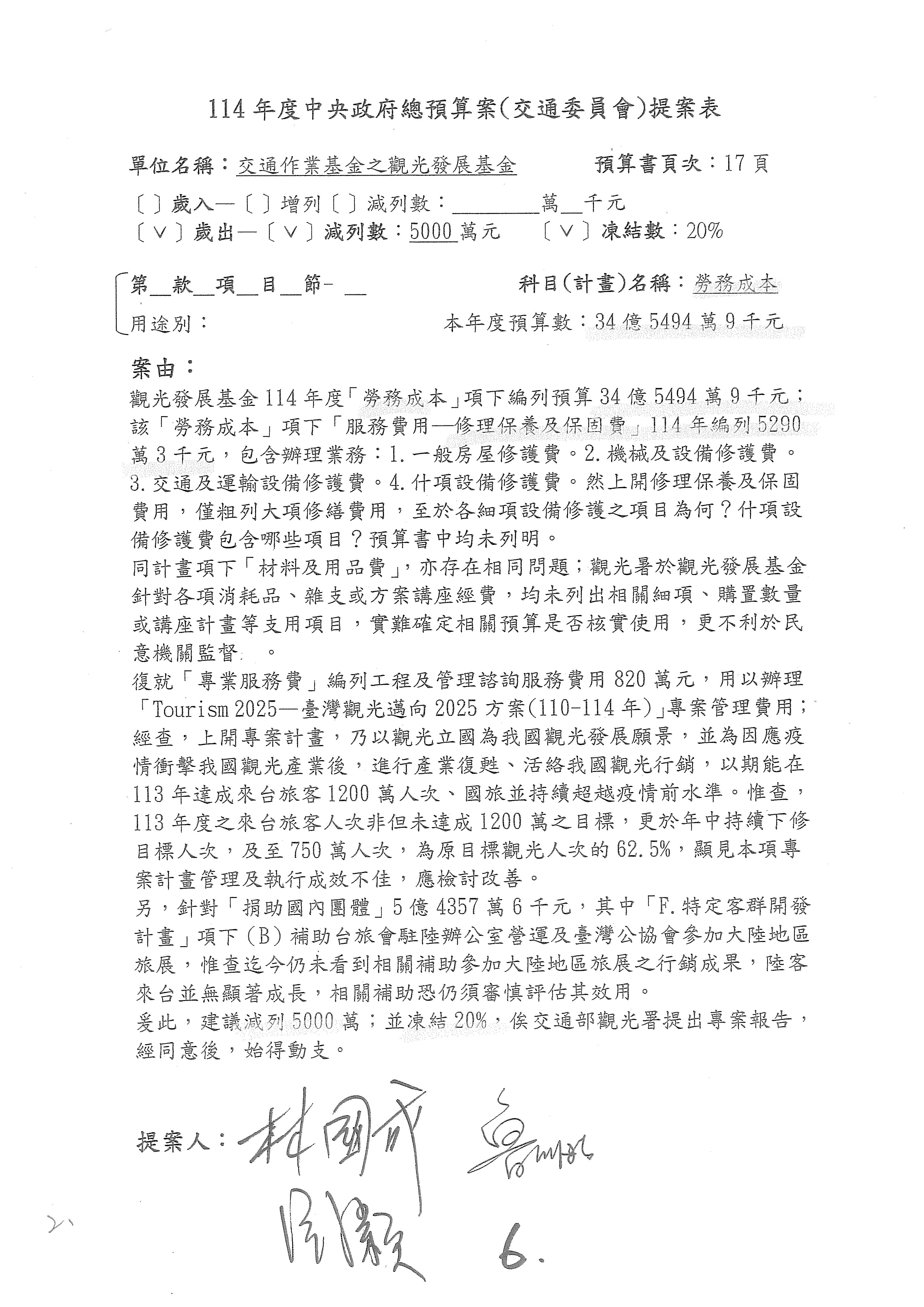 接下來處理交通部觀光發展基金114年度附屬單位預算,請各位參照建議併案及預算表。開始處理第1案。第1案林國成委員已經改主決議,沒問題吧?
