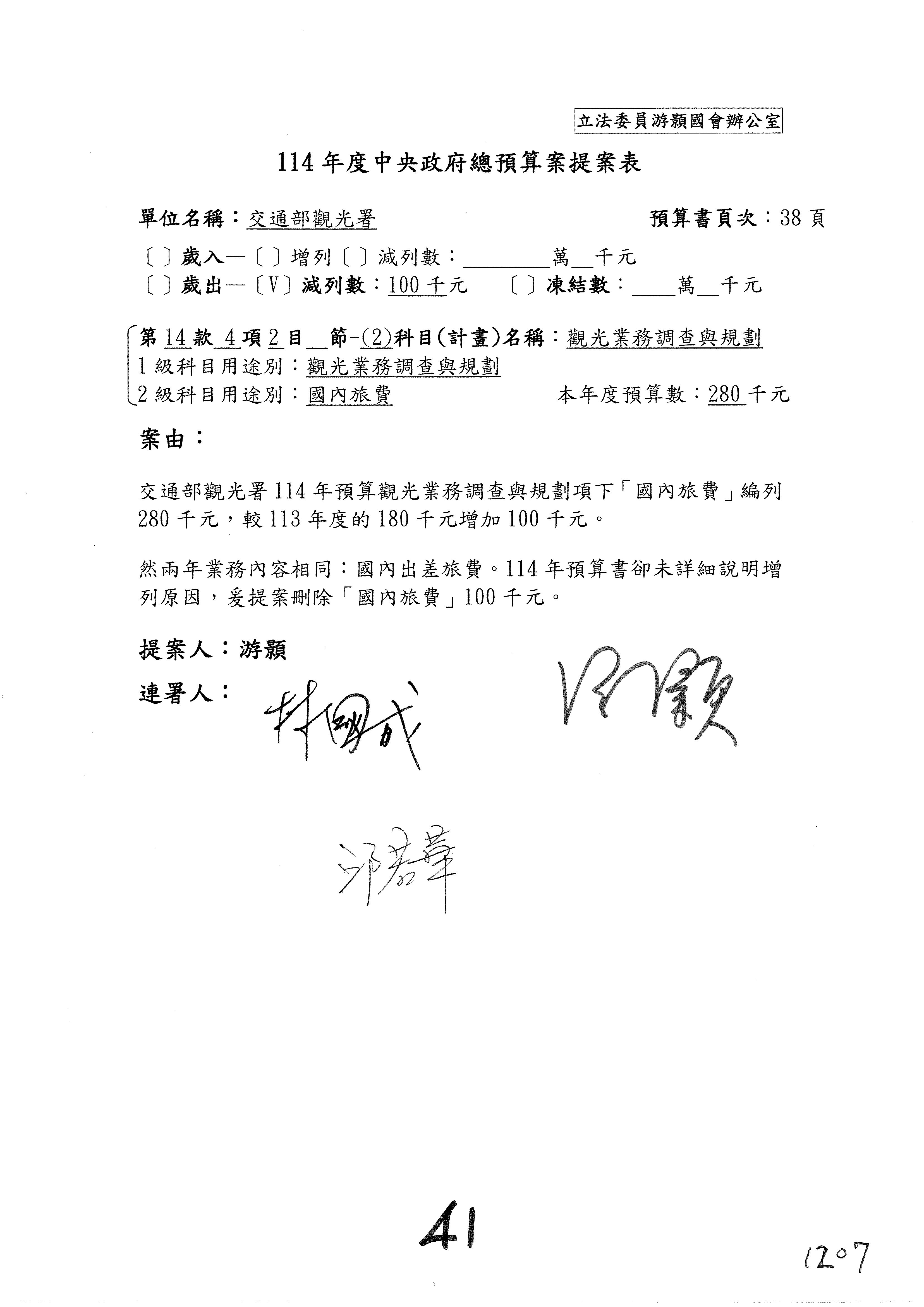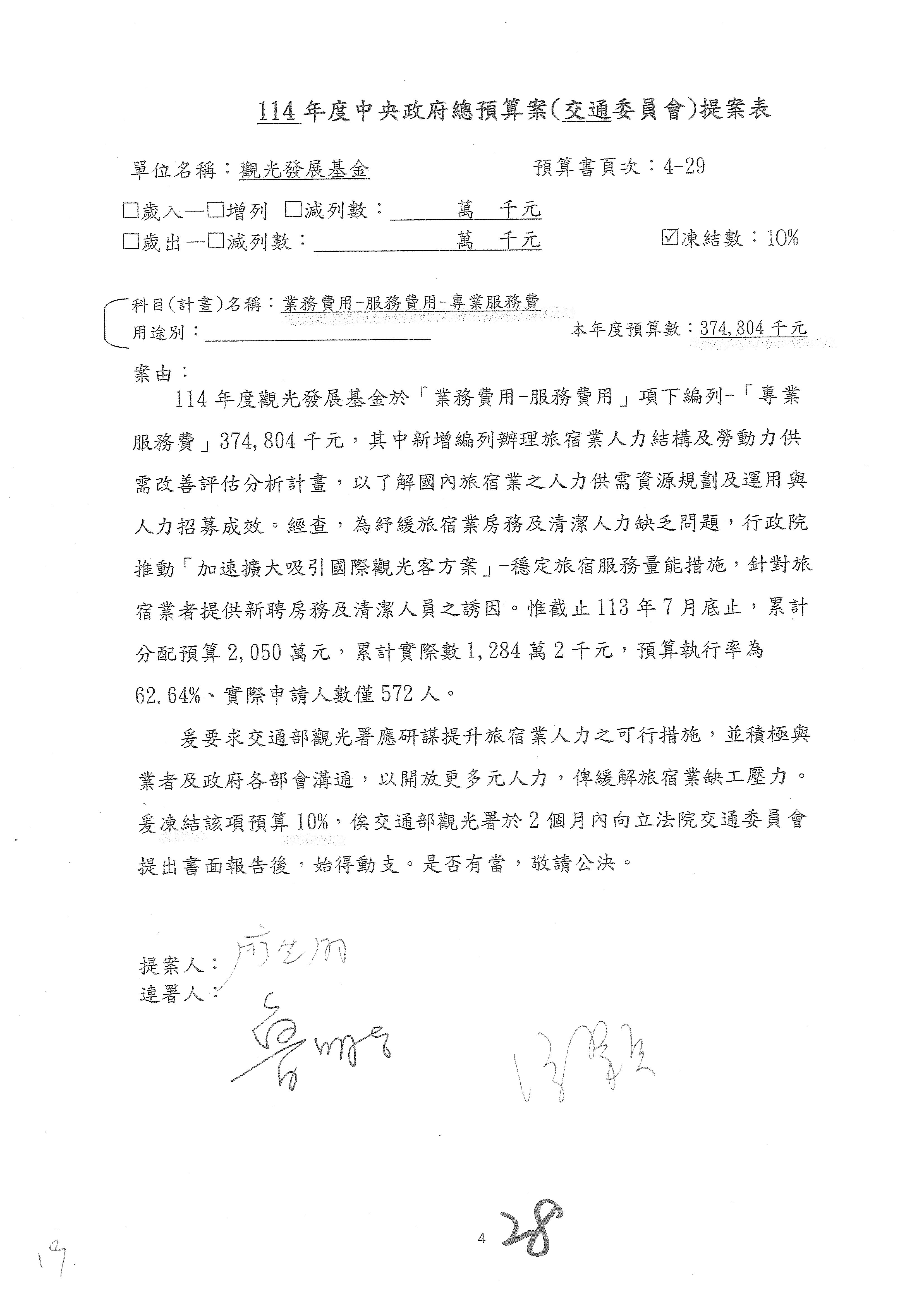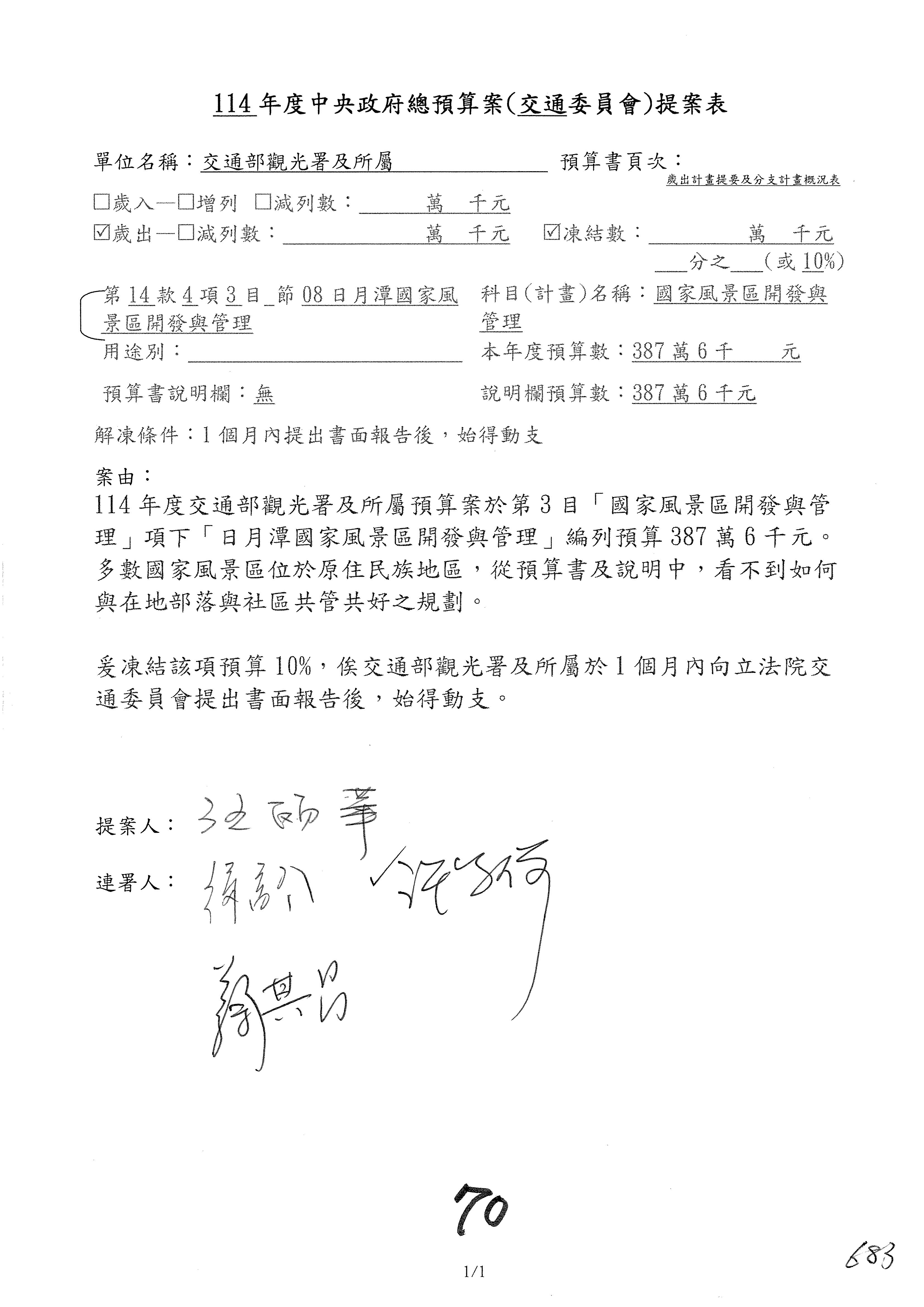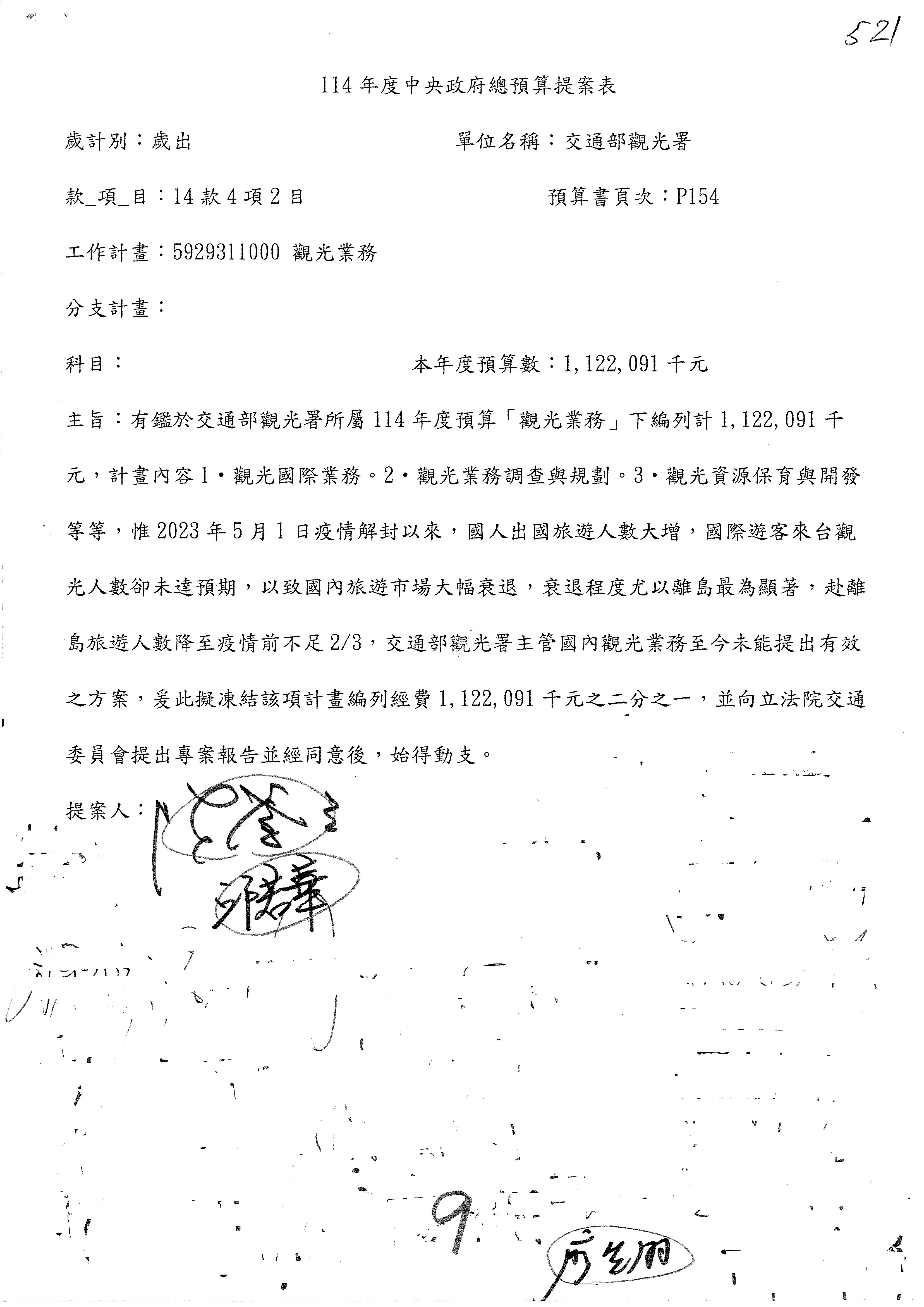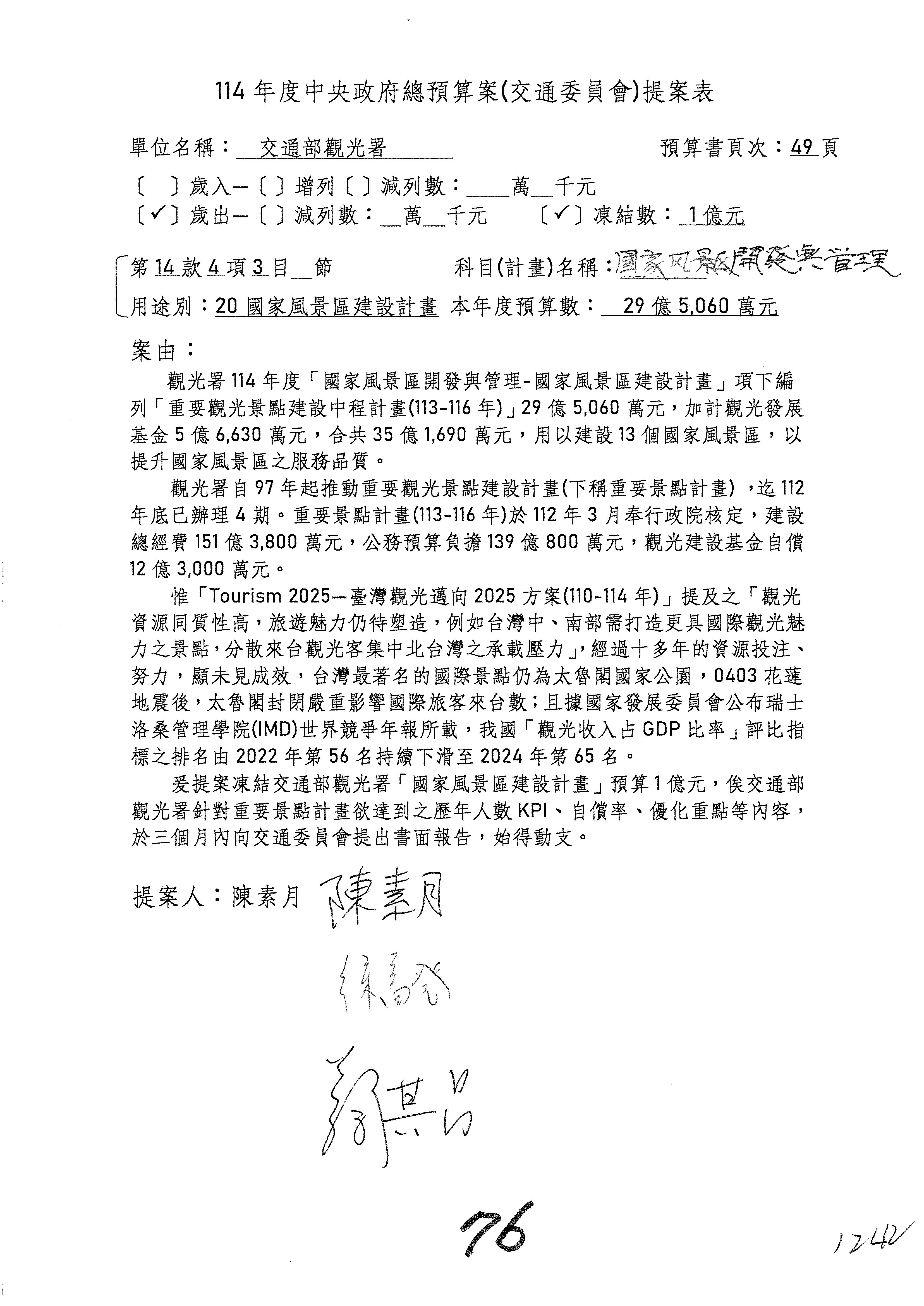接下來處理交通部觀光發展基金114年度附屬單位預算,請各位參照建議併案及預算表。開始處理第1案。第1案林國成委員已經改主決議,沒問題吧?