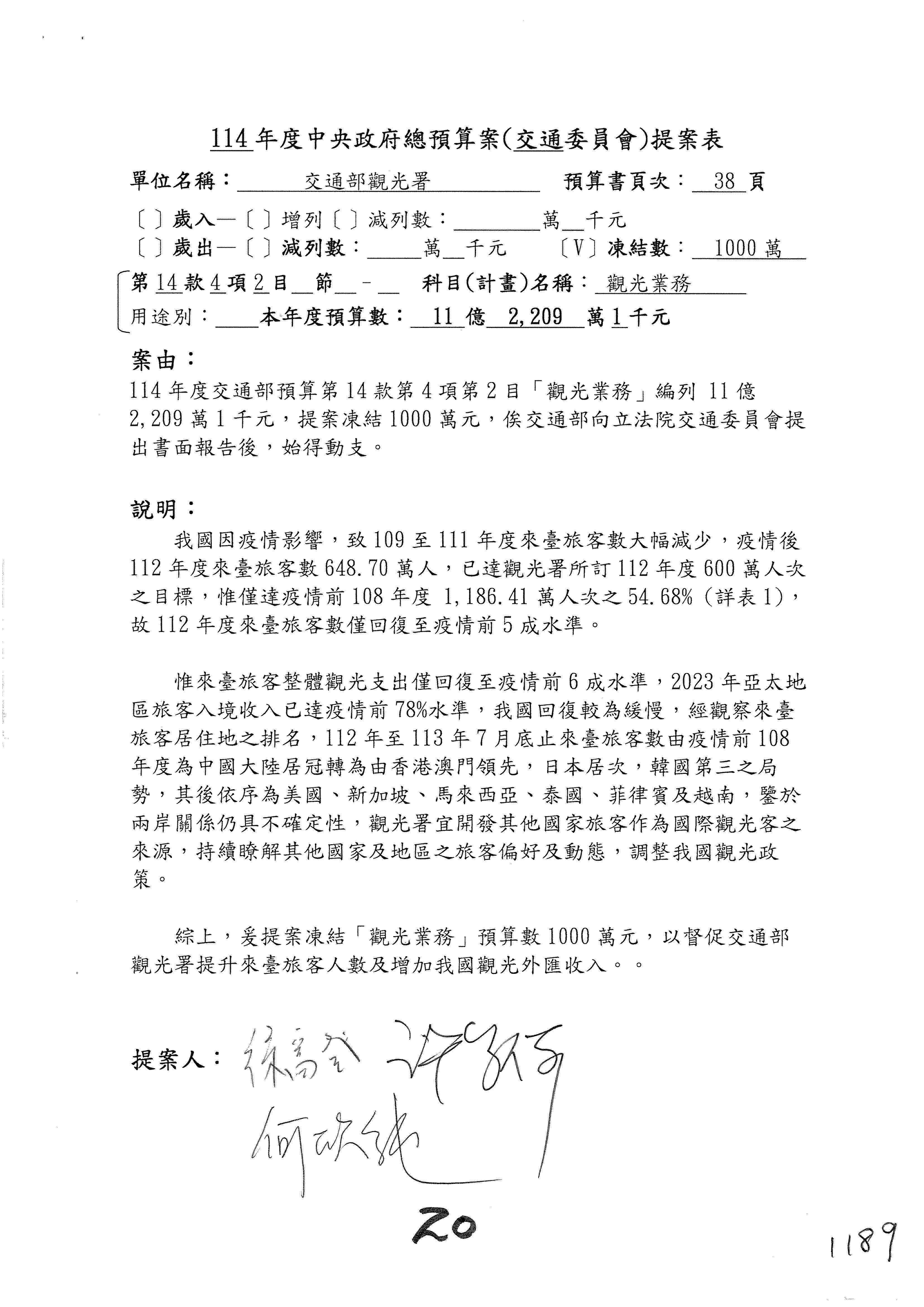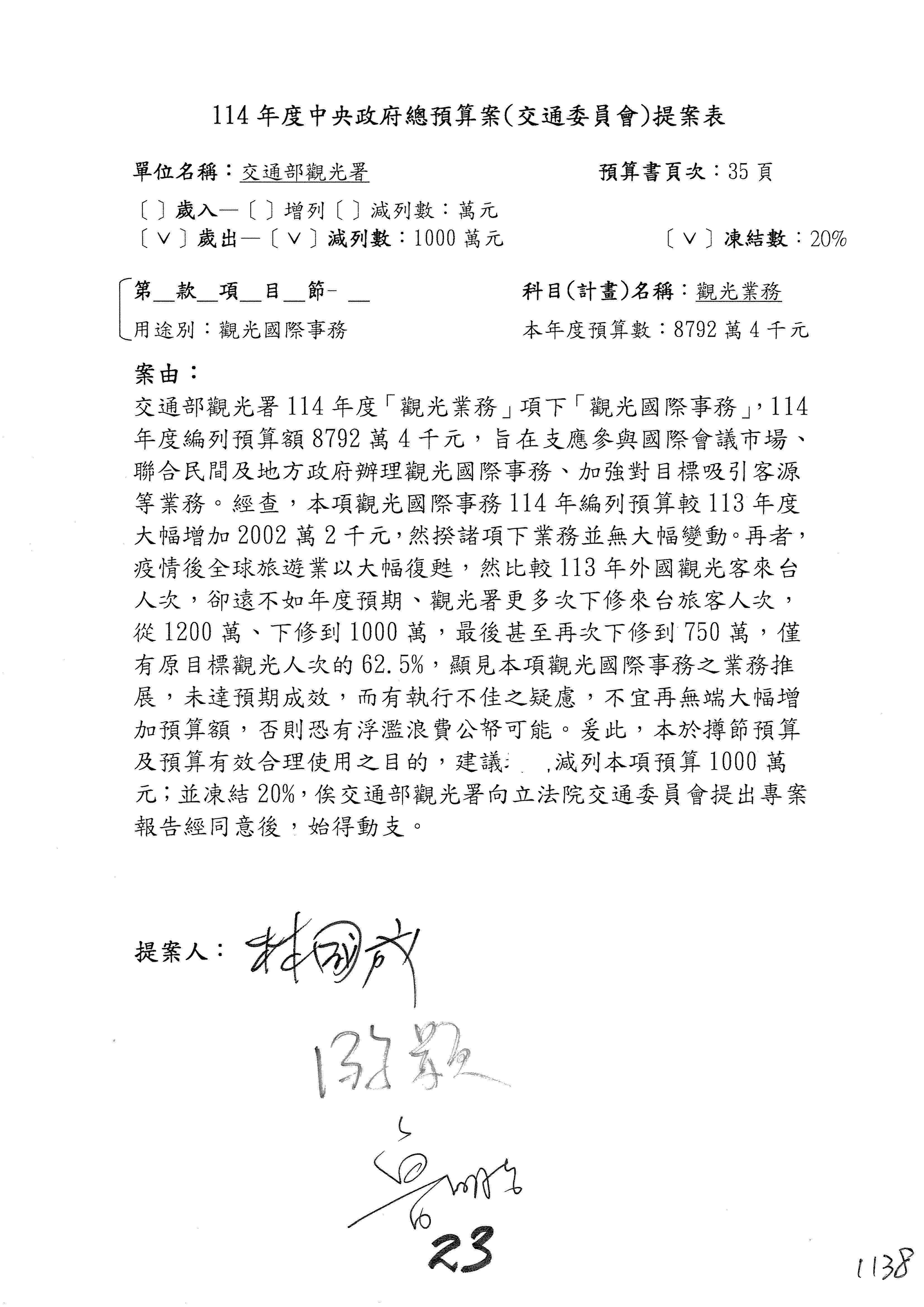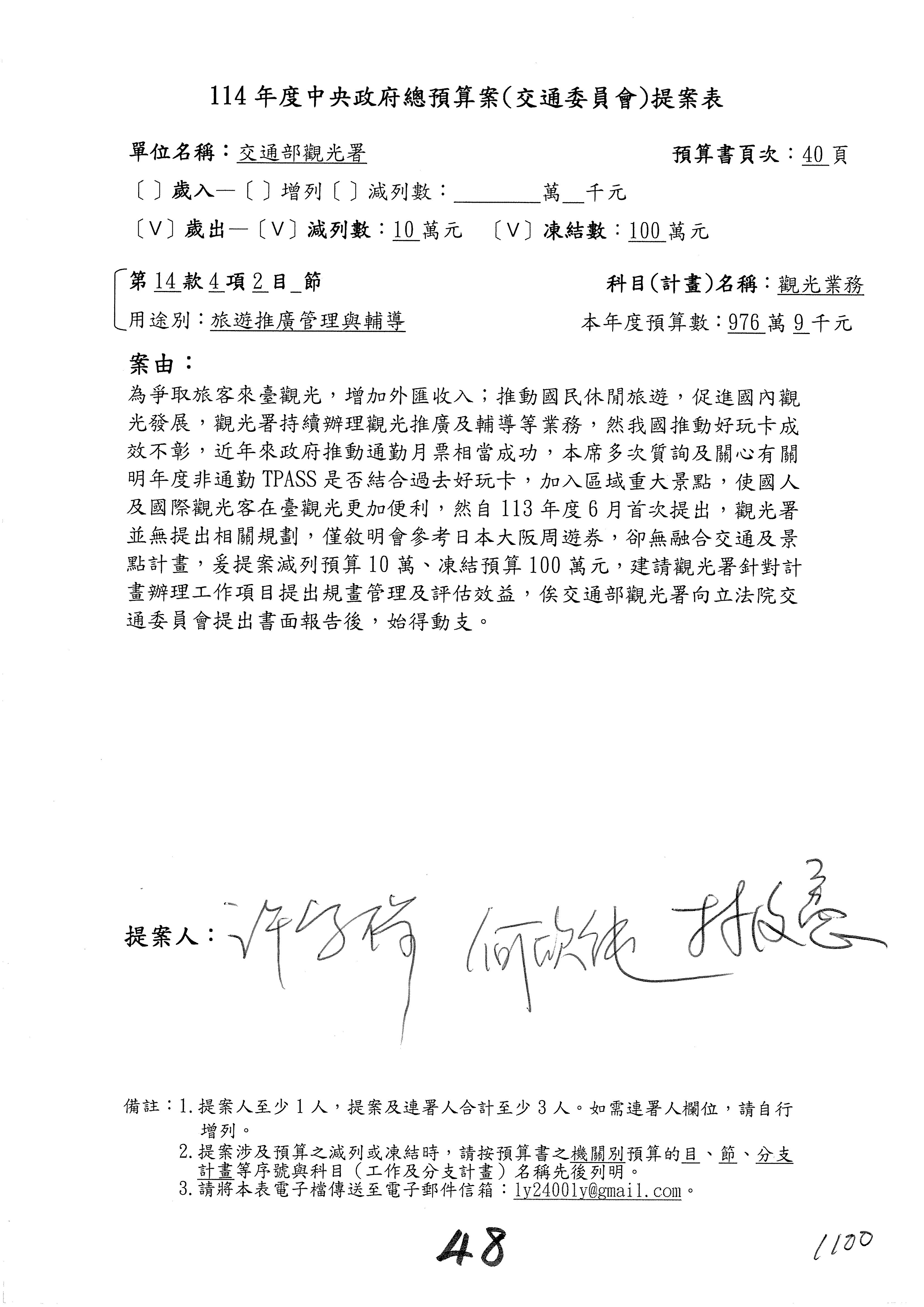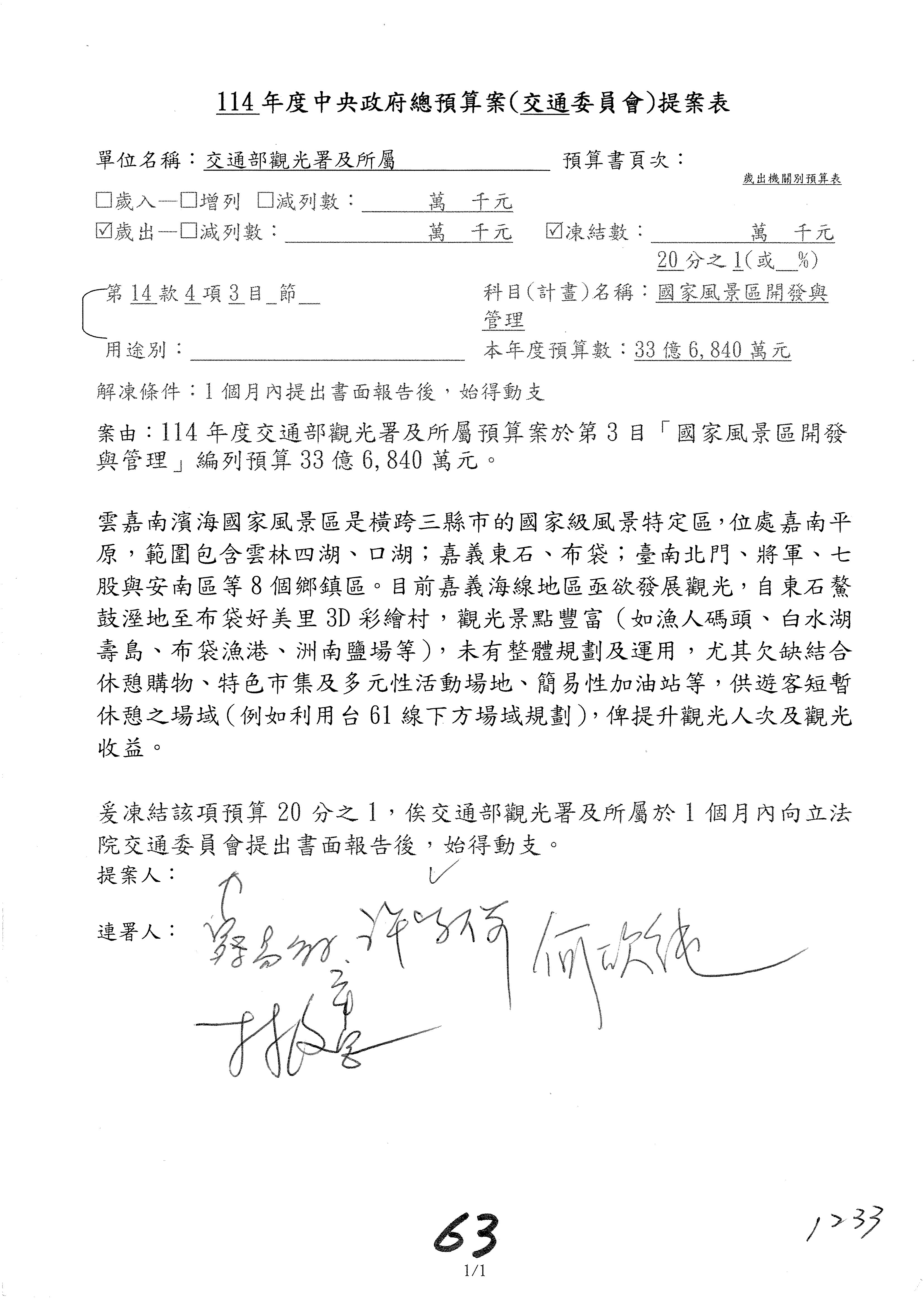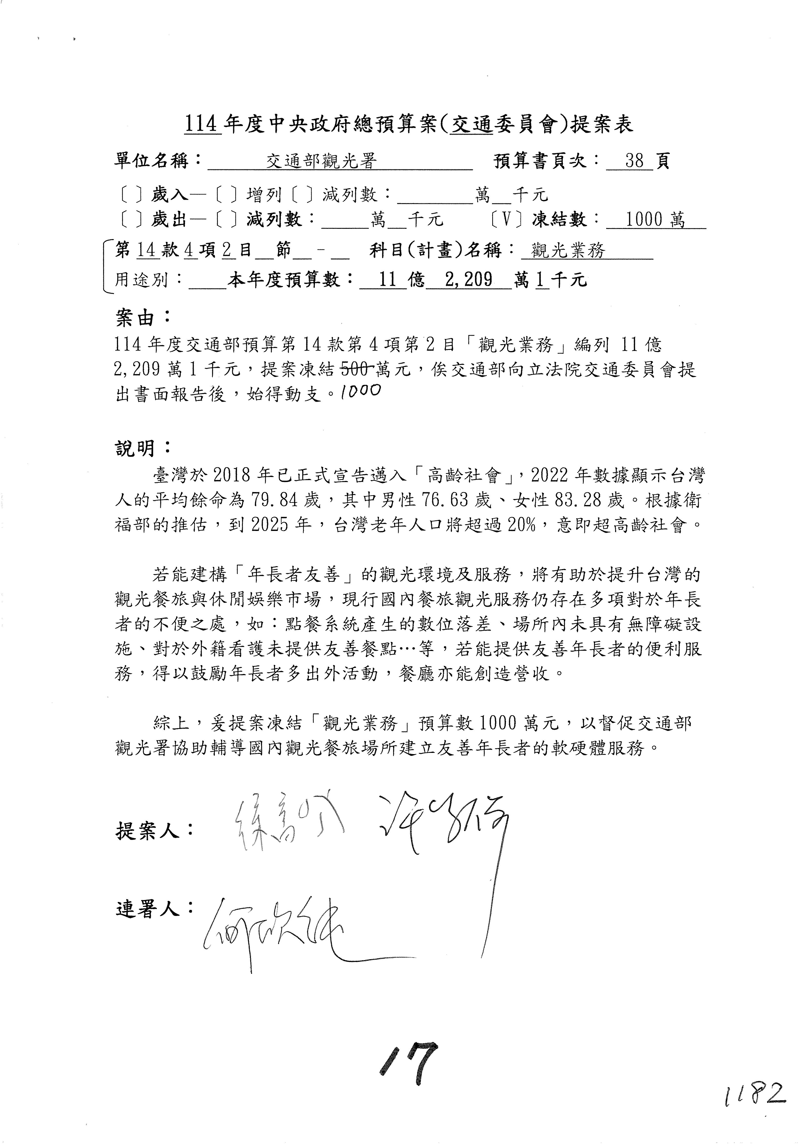 接下來處理交通部觀光發展基金114年度附屬單位預算,請各位參照建議併案及預算表。開始處理第1案。第1案林國成委員已經改主決議,沒問題吧?