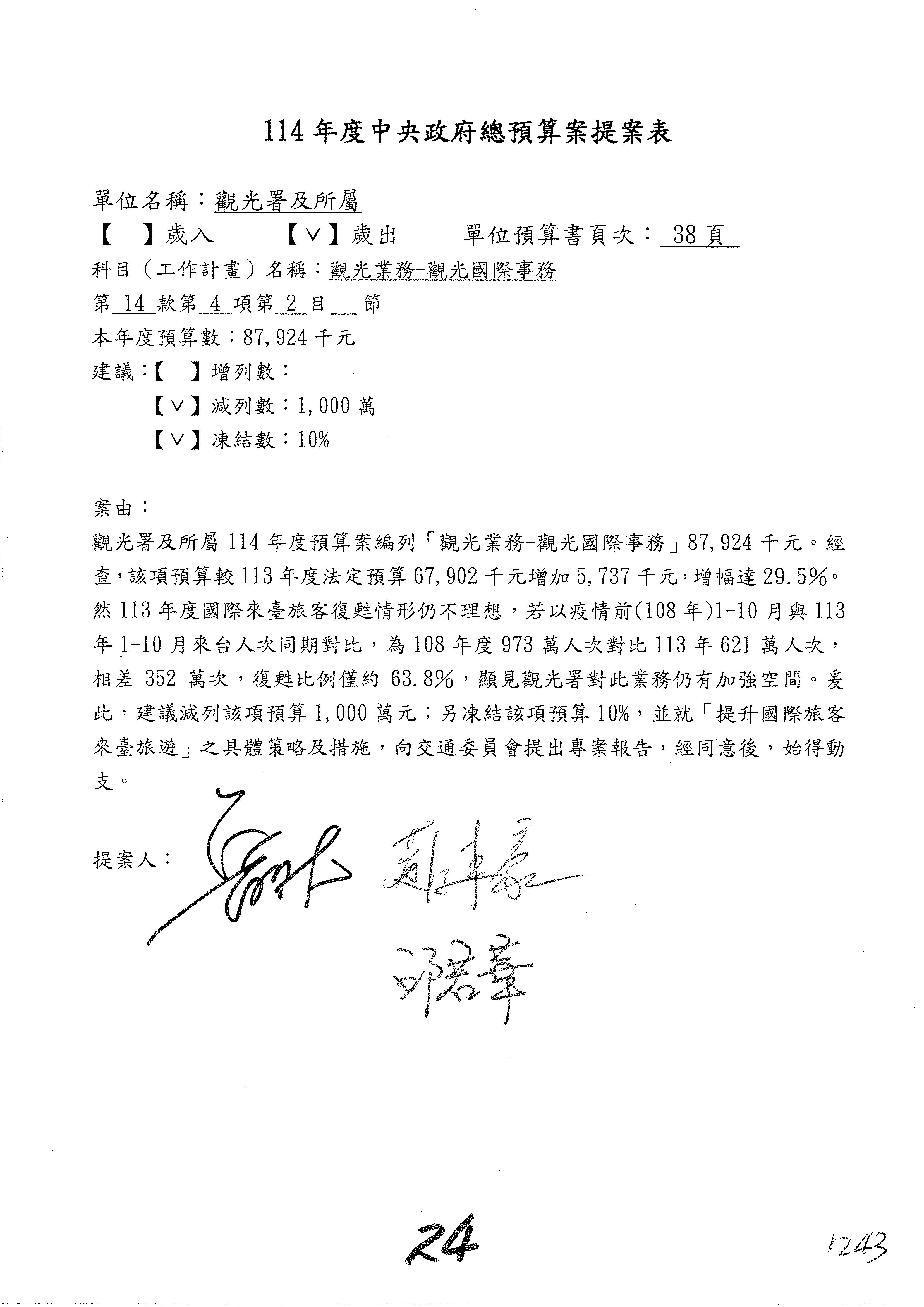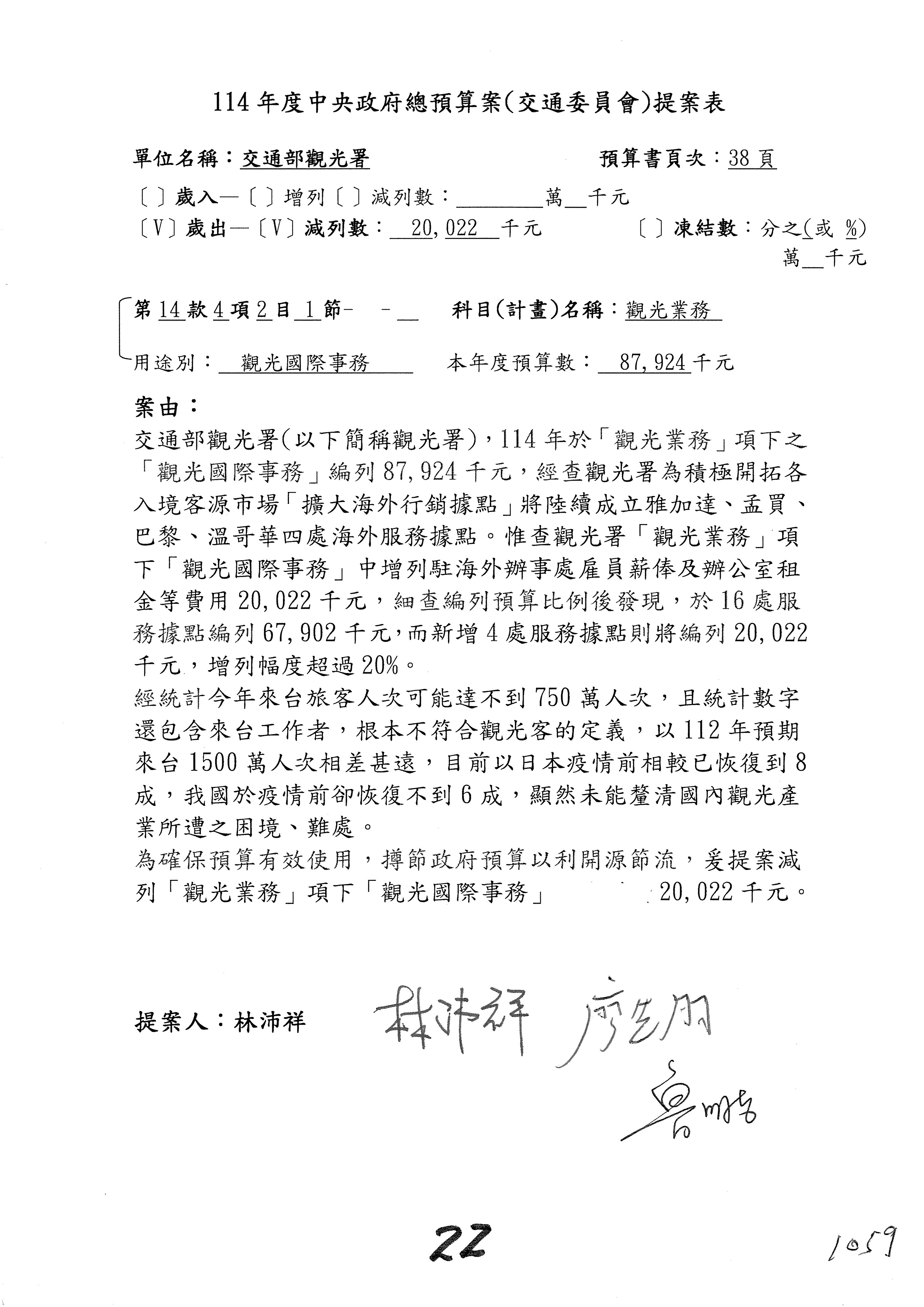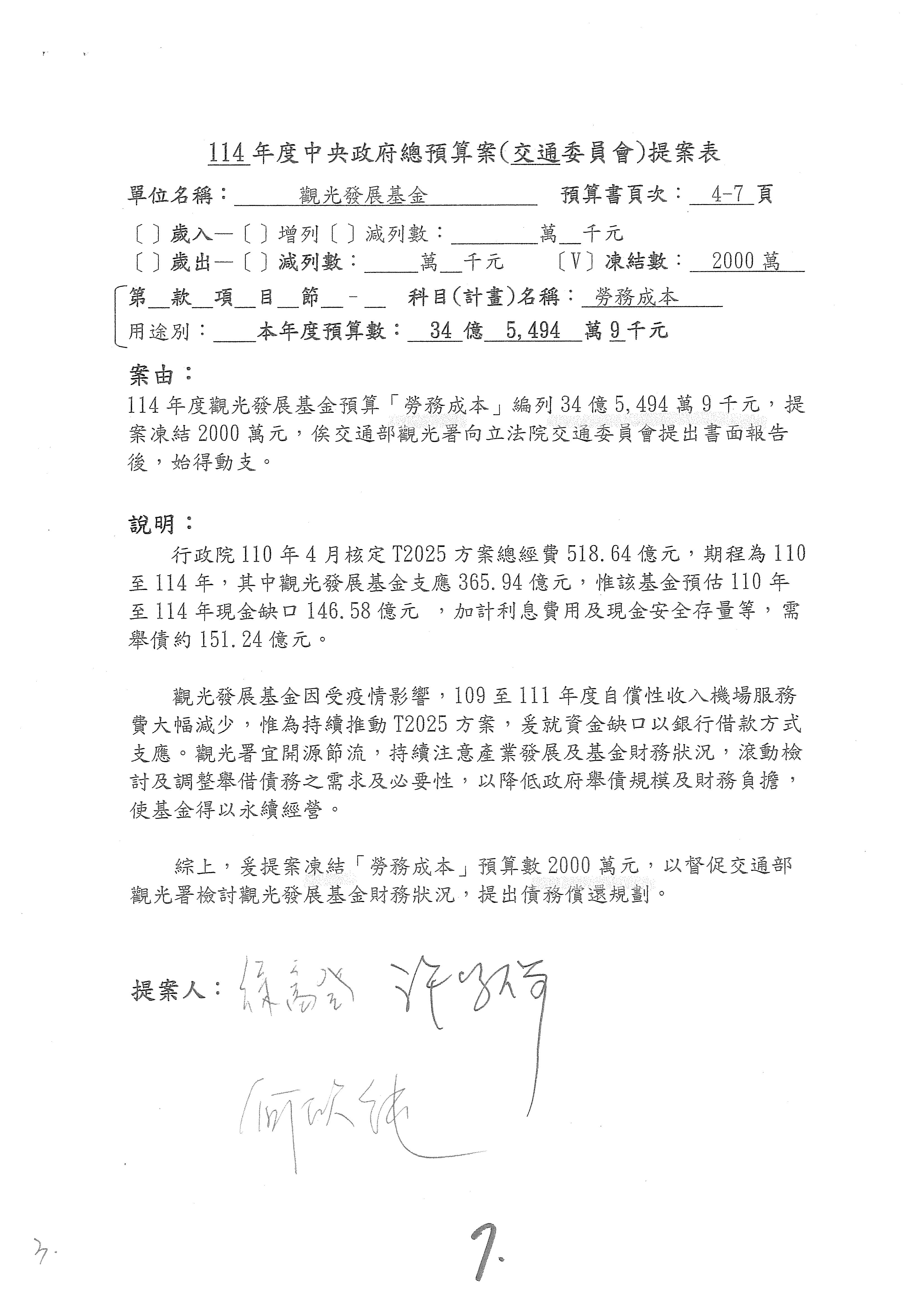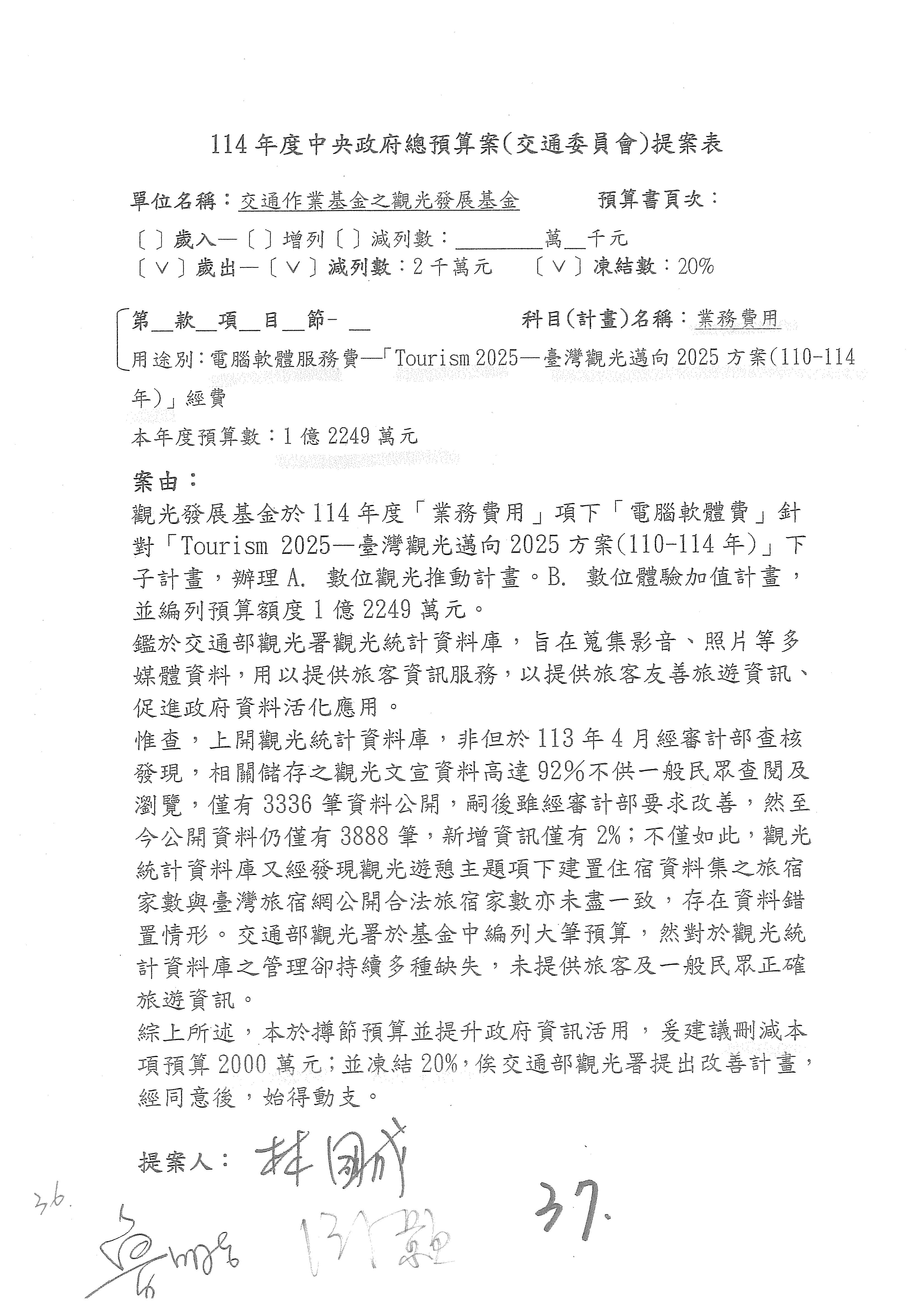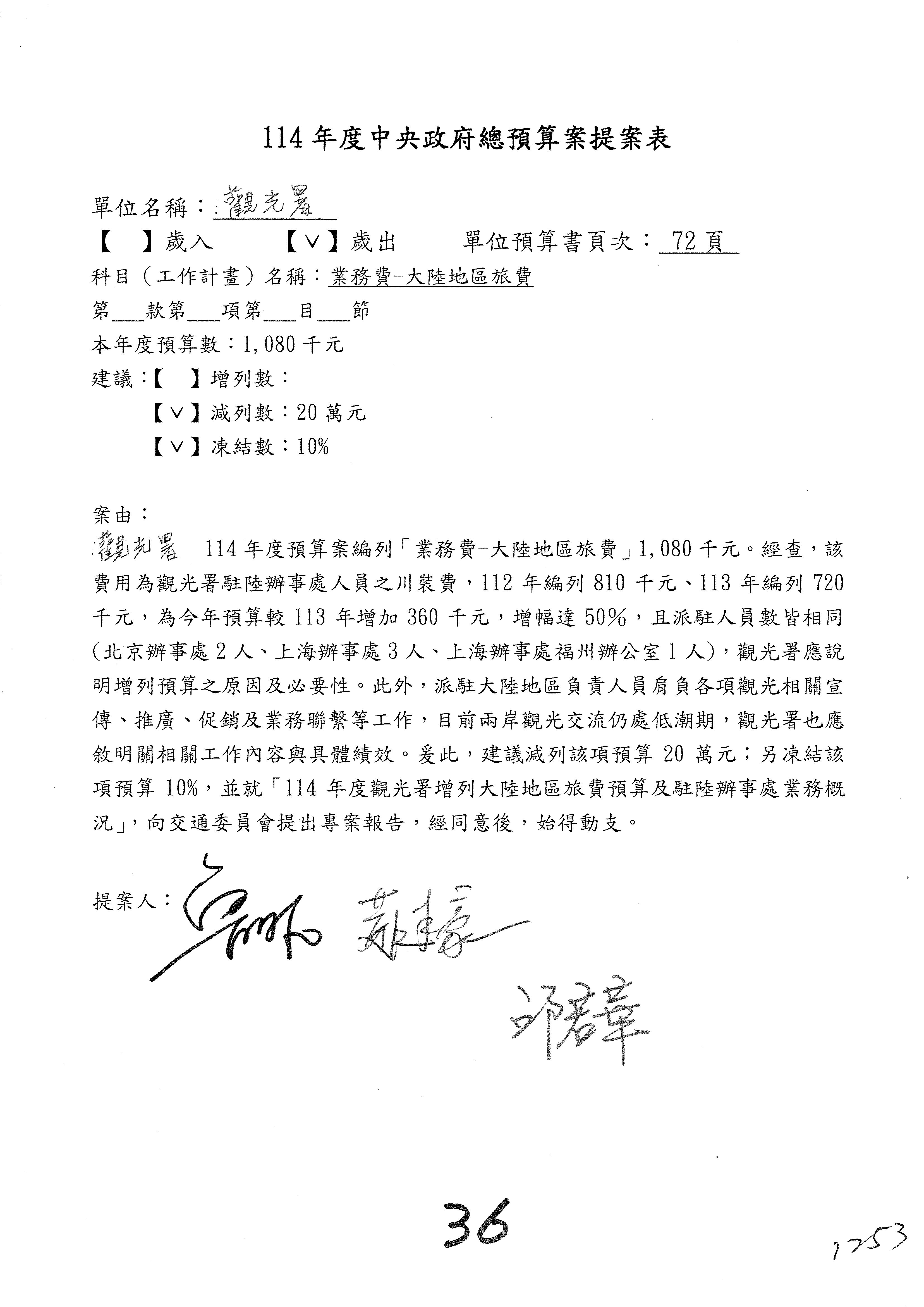 接下來處理交通部觀光發展基金114年度附屬單位預算,請各位參照建議併案及預算表。開始處理第1案。第1案林國成委員已經改主決議,沒問題吧?