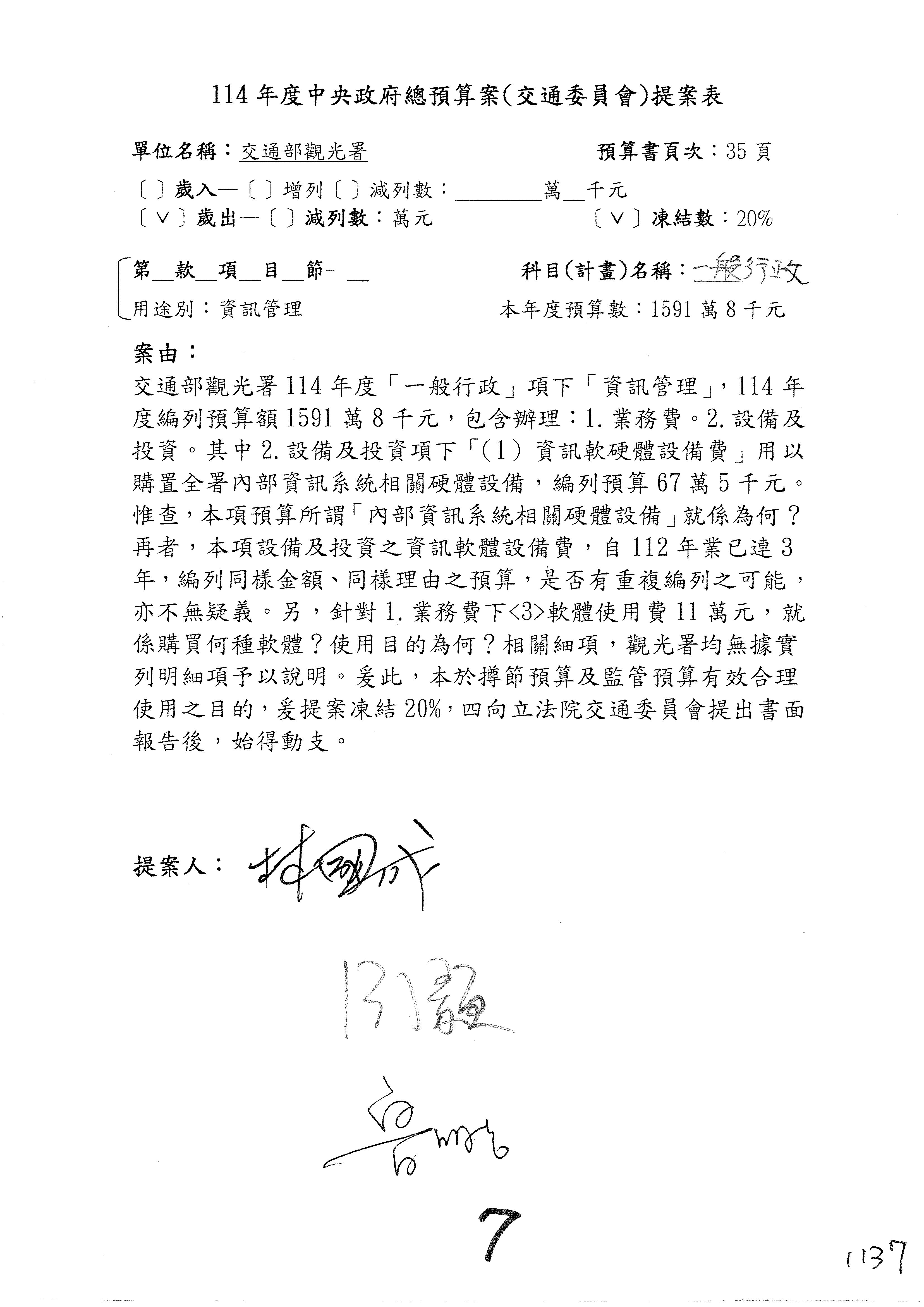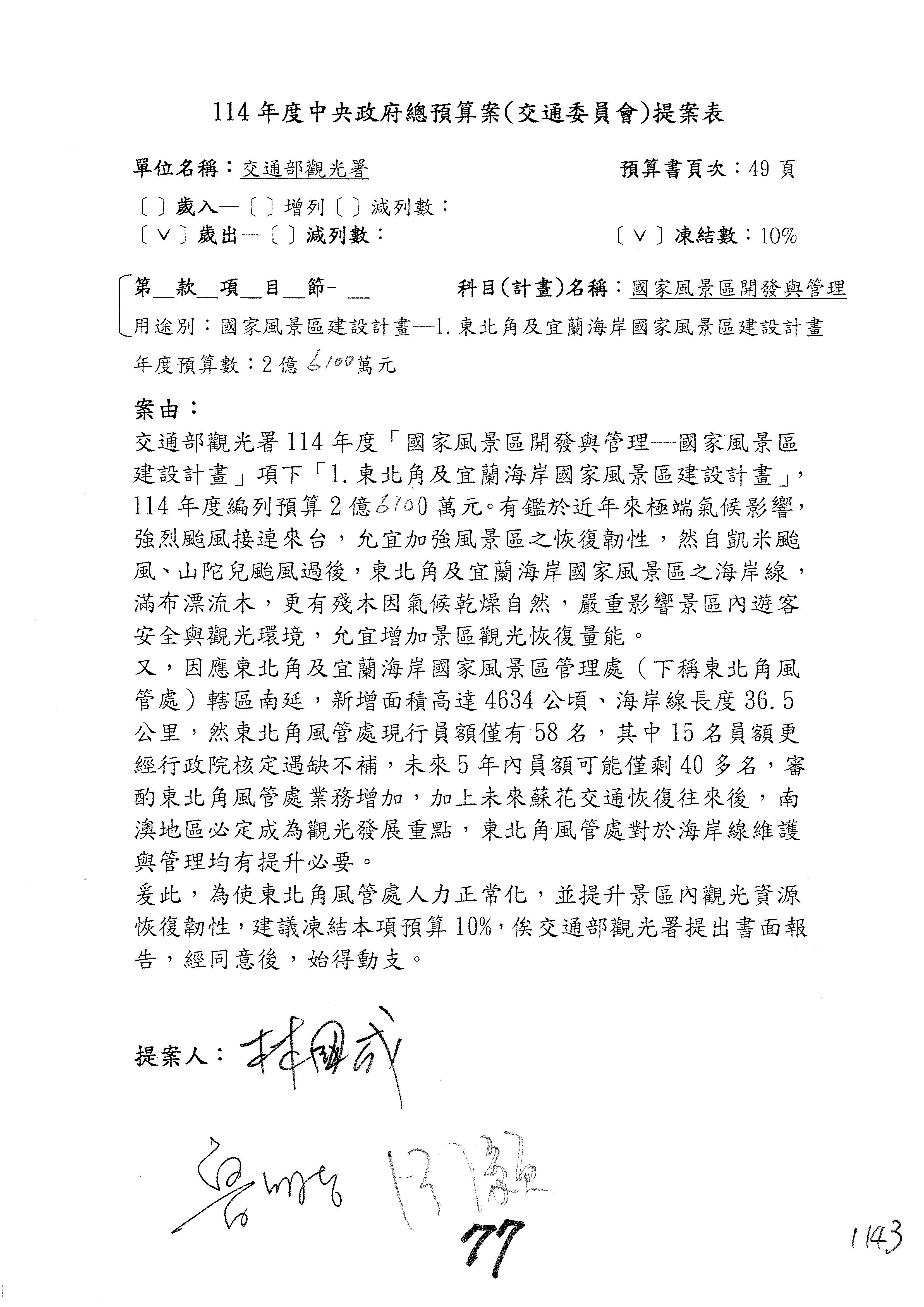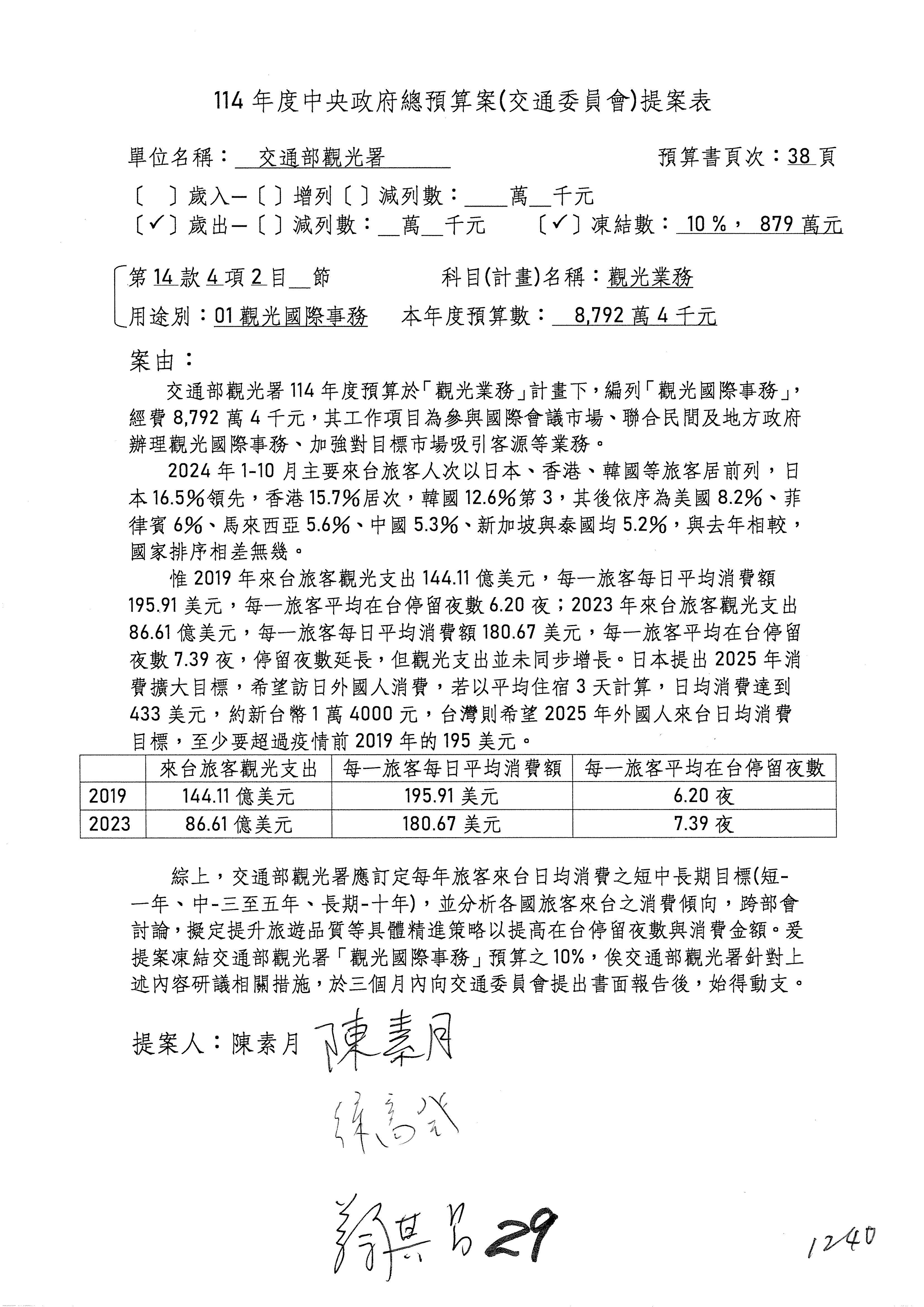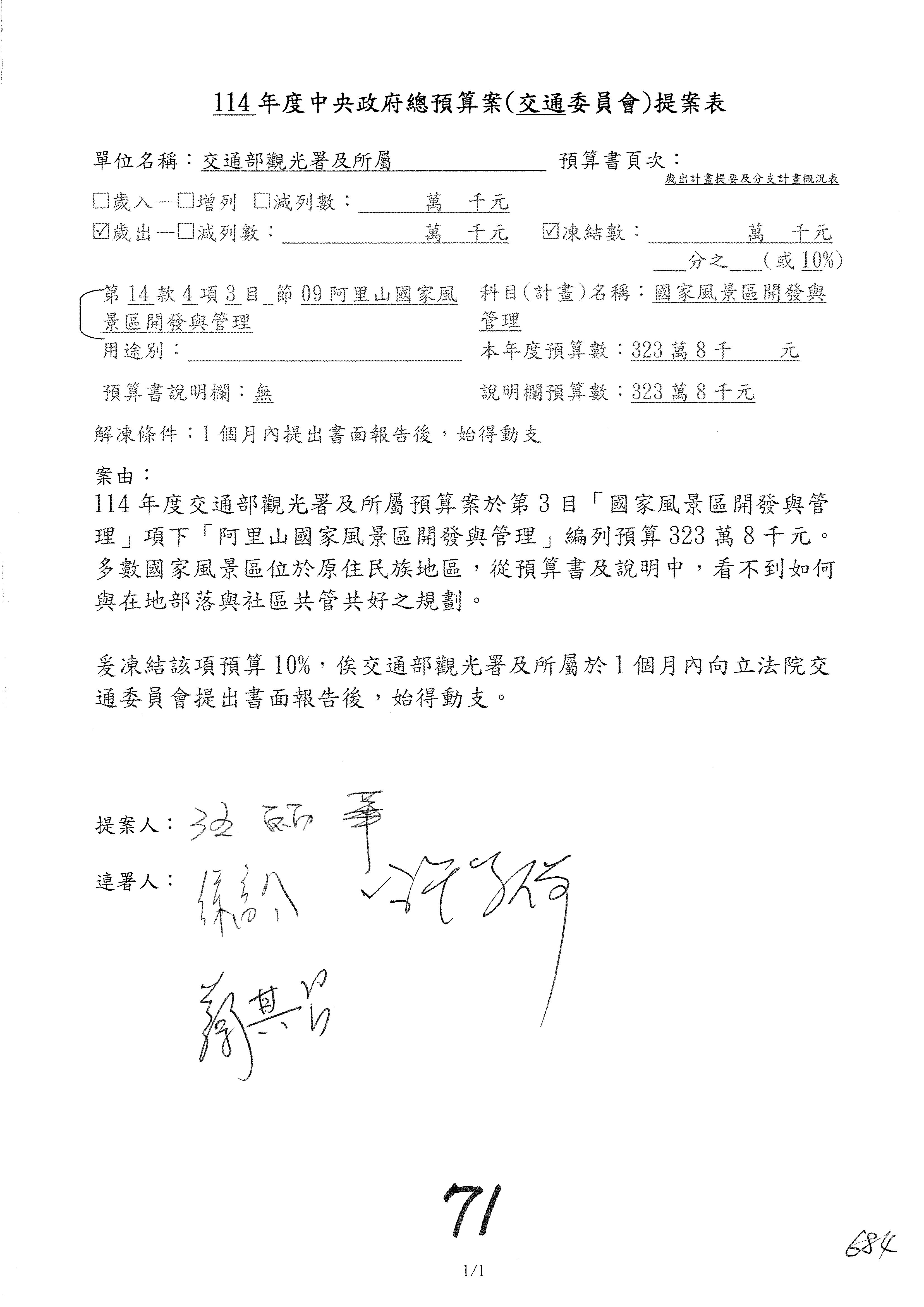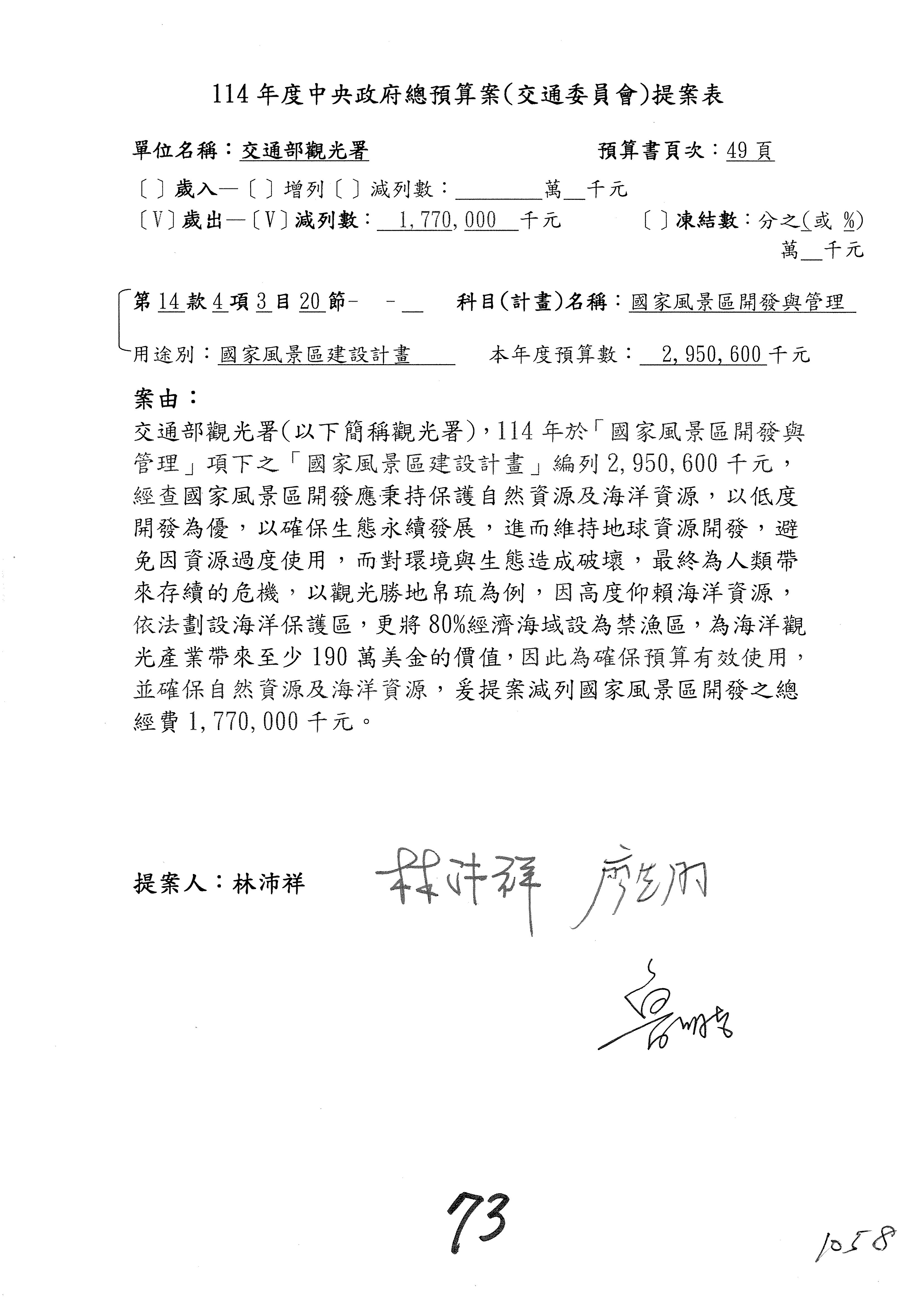 接下來處理交通部觀光發展基金114年度附屬單位預算,請各位參照建議併案及預算表。開始處理第1案。第1案林國成委員已經改主決議,沒問題吧?