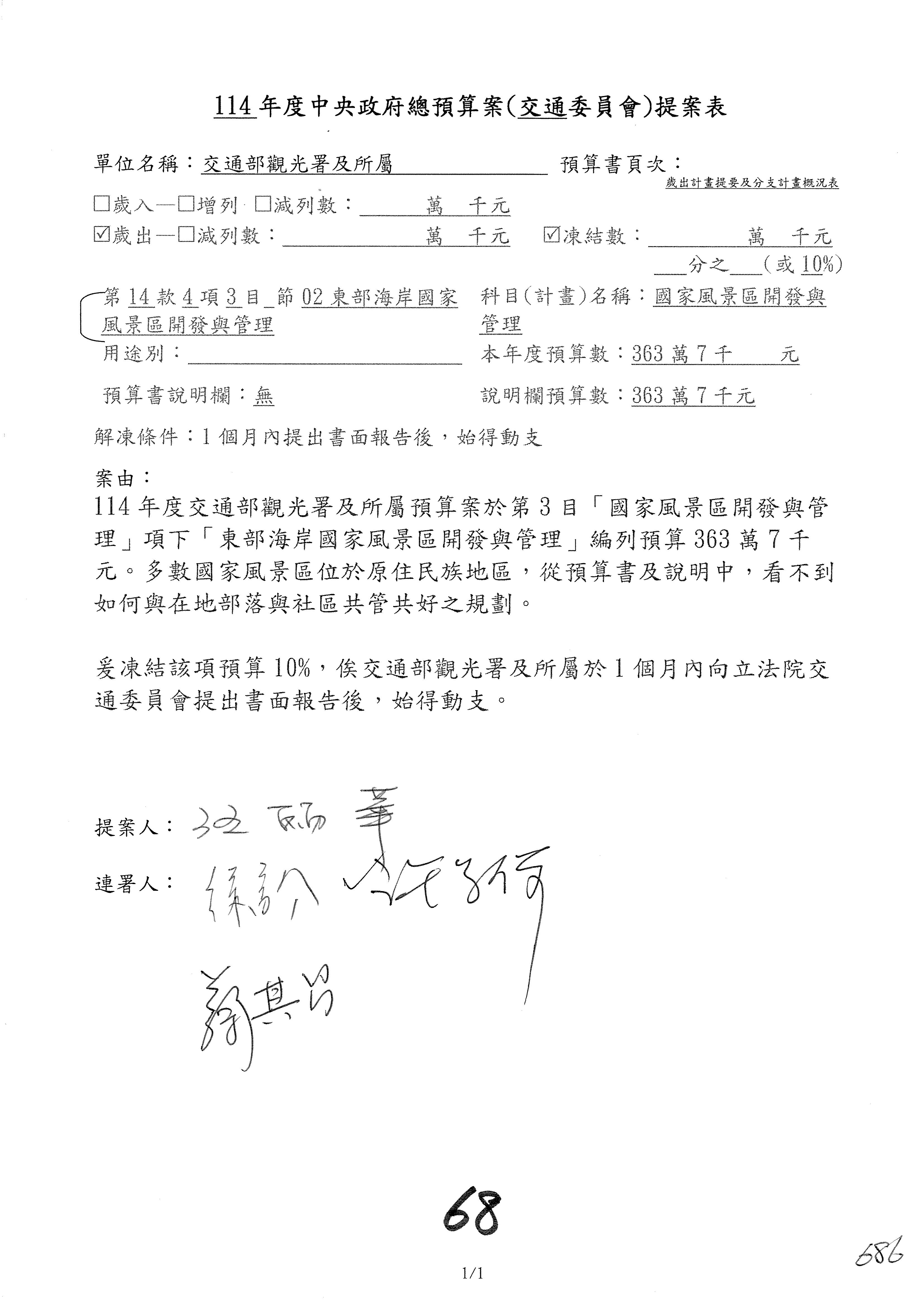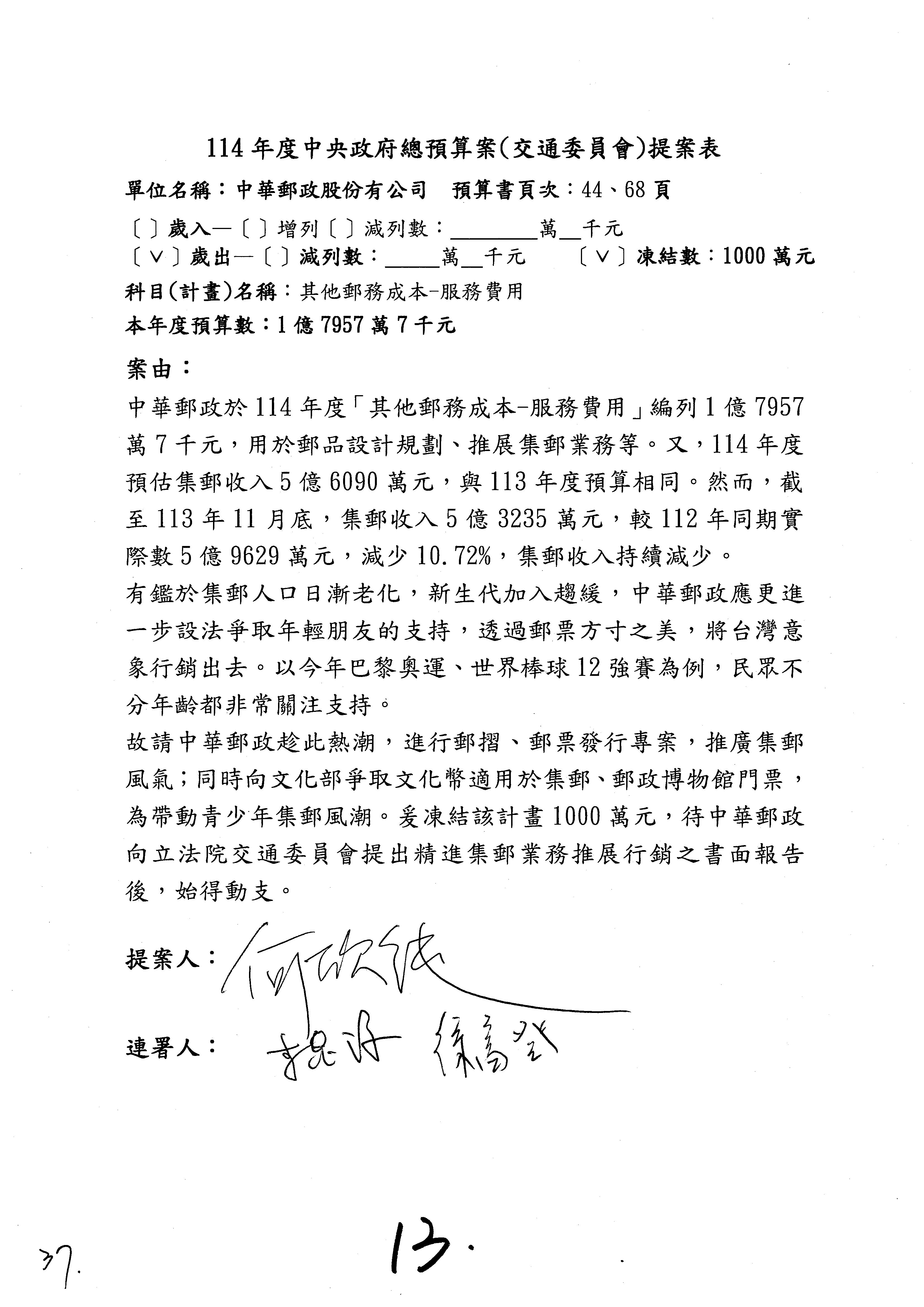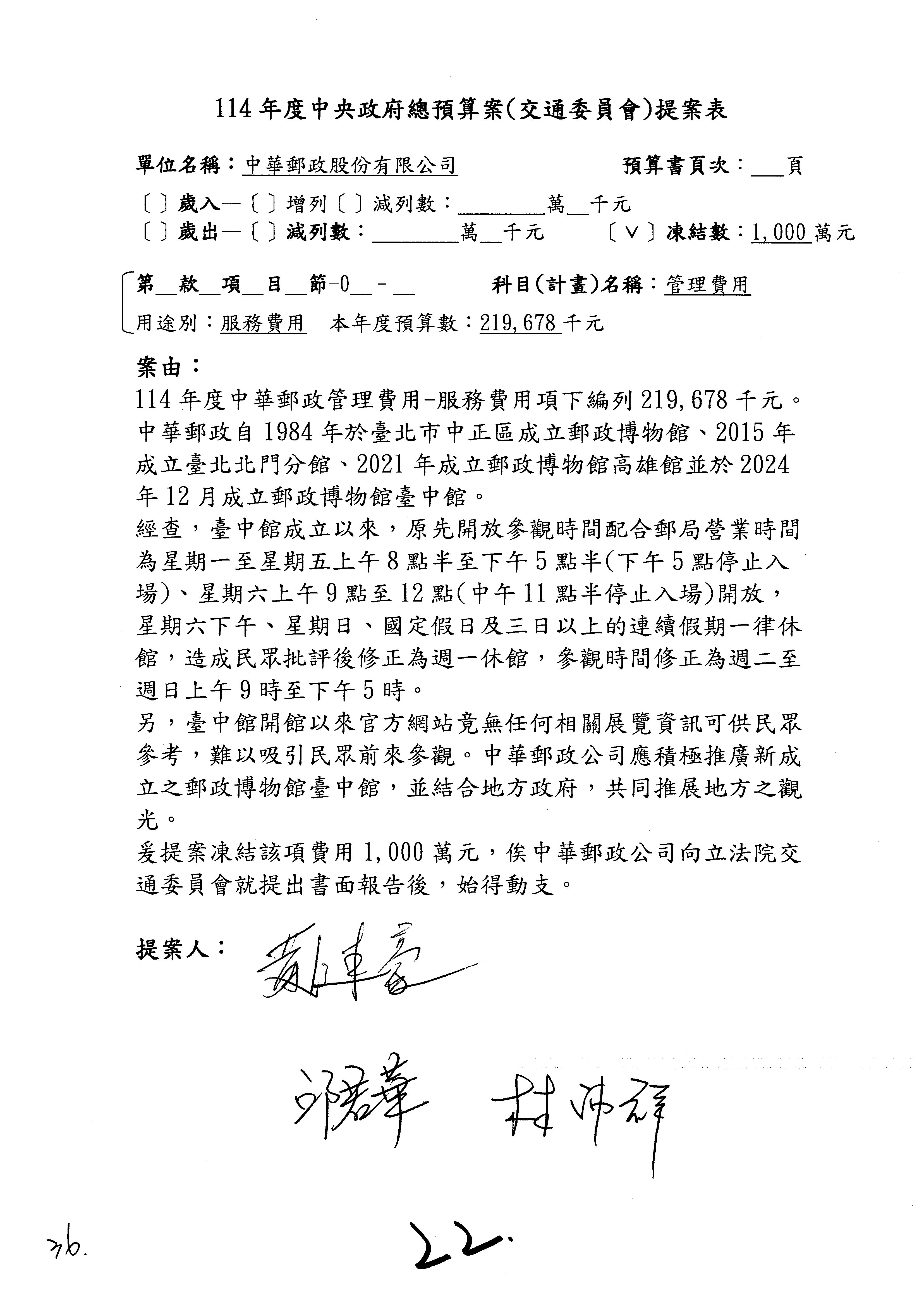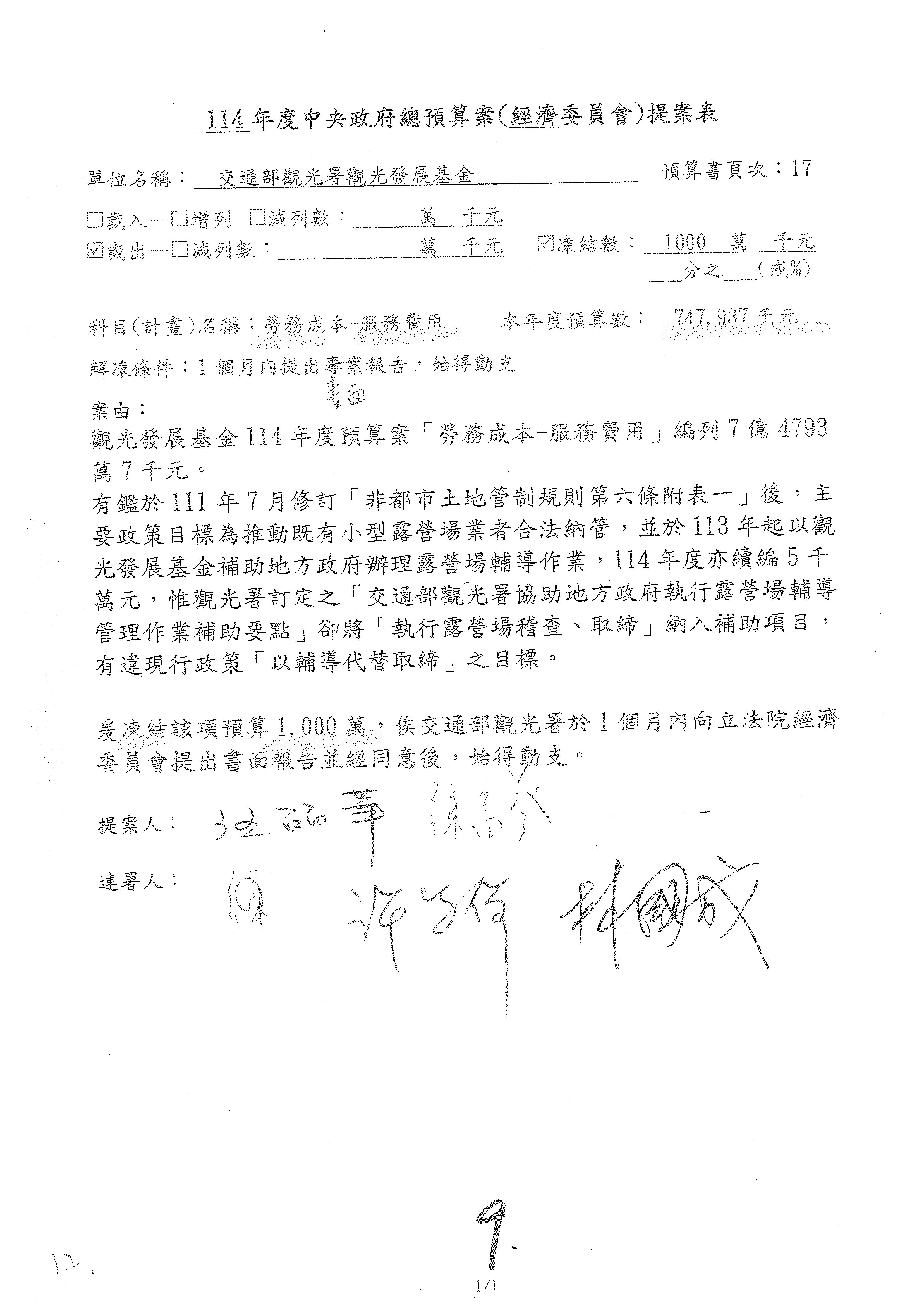 徐委員富癸:本席改凍結1,000萬元。