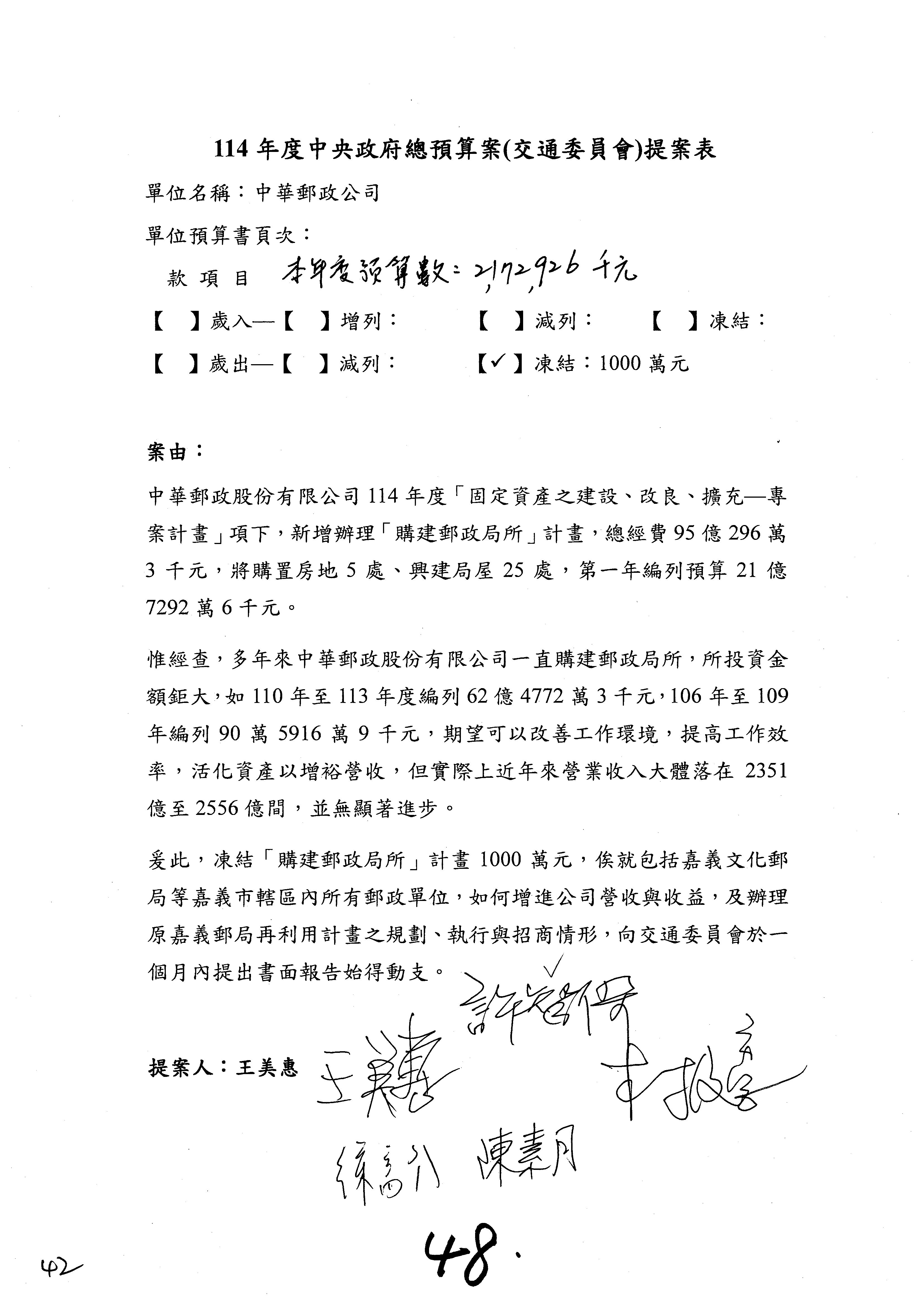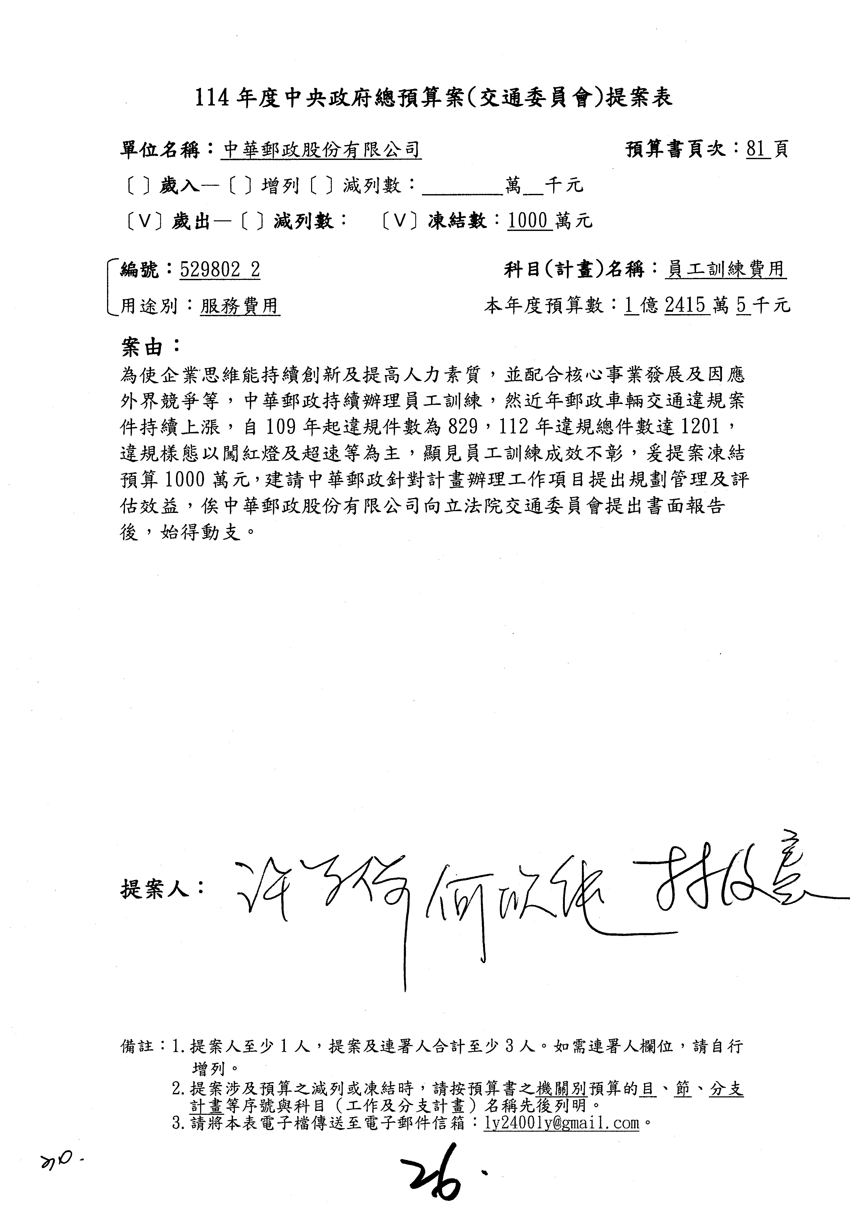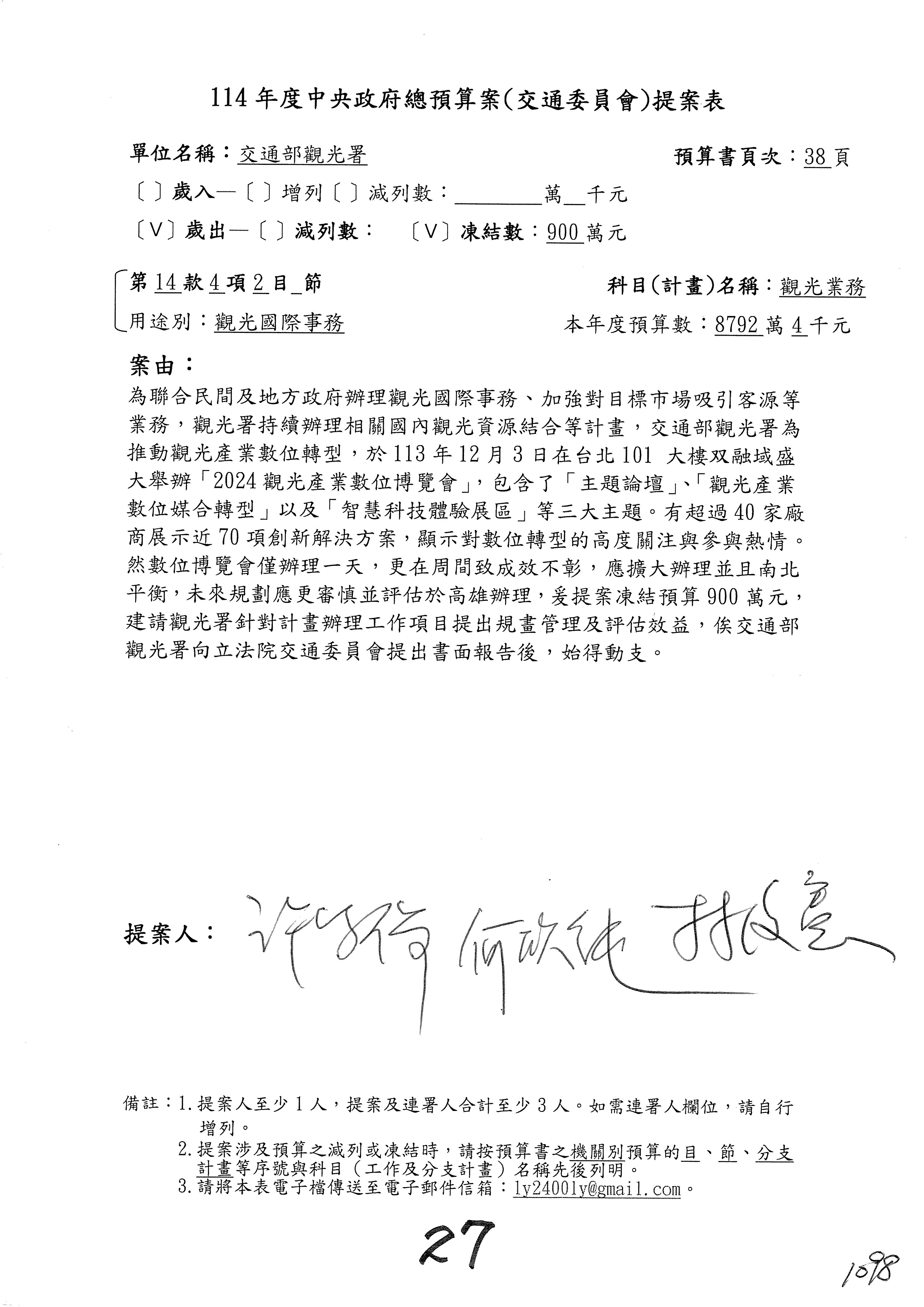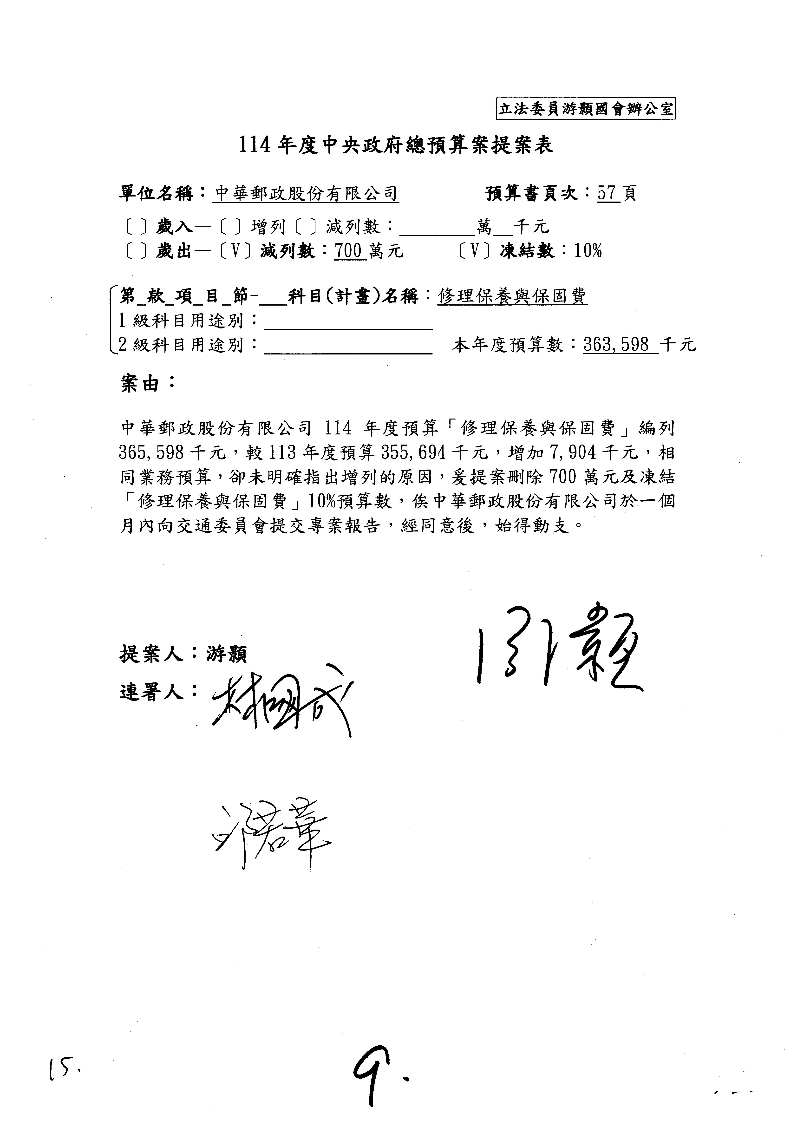 徐委員富癸:本席改凍結1,000萬元。