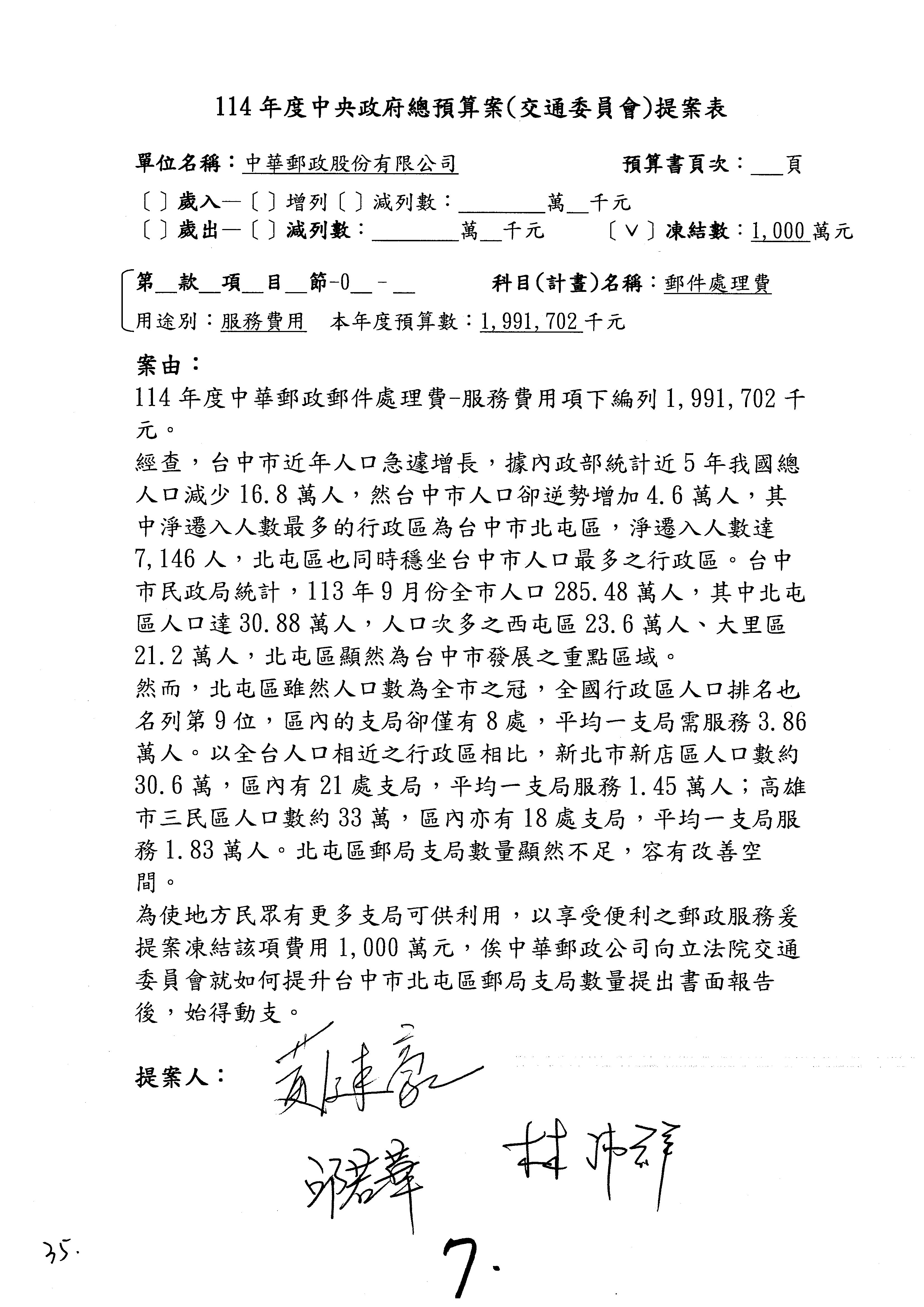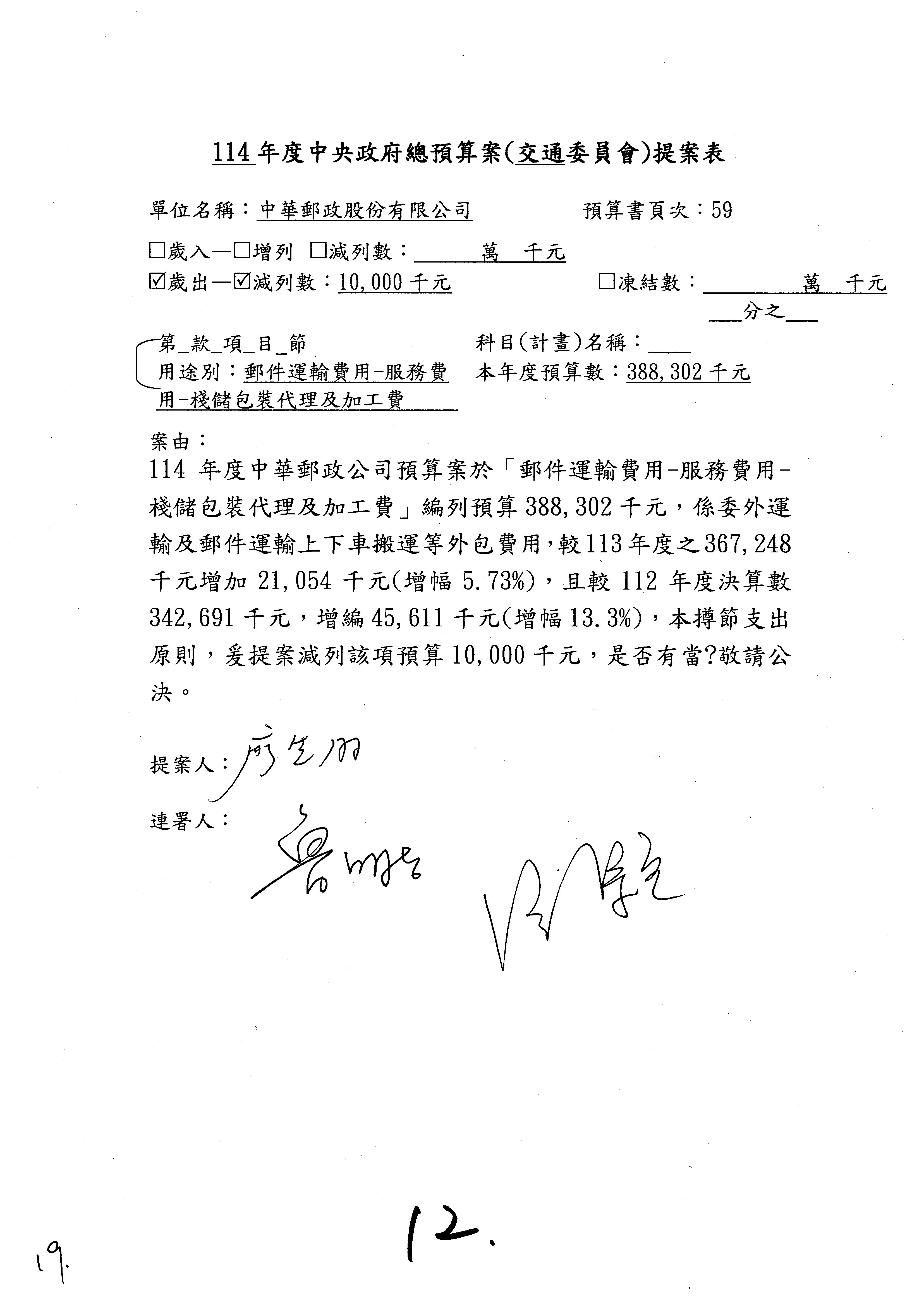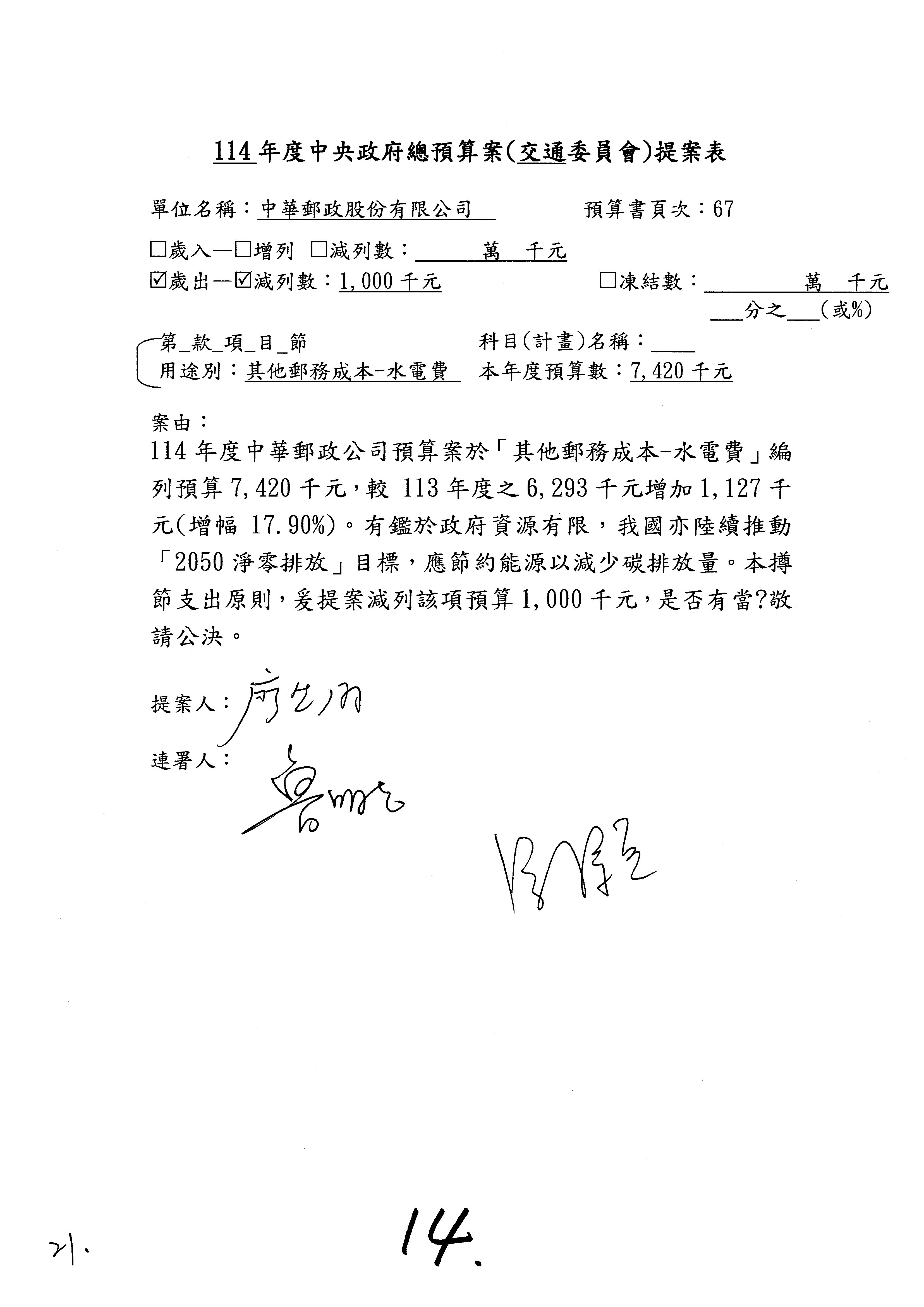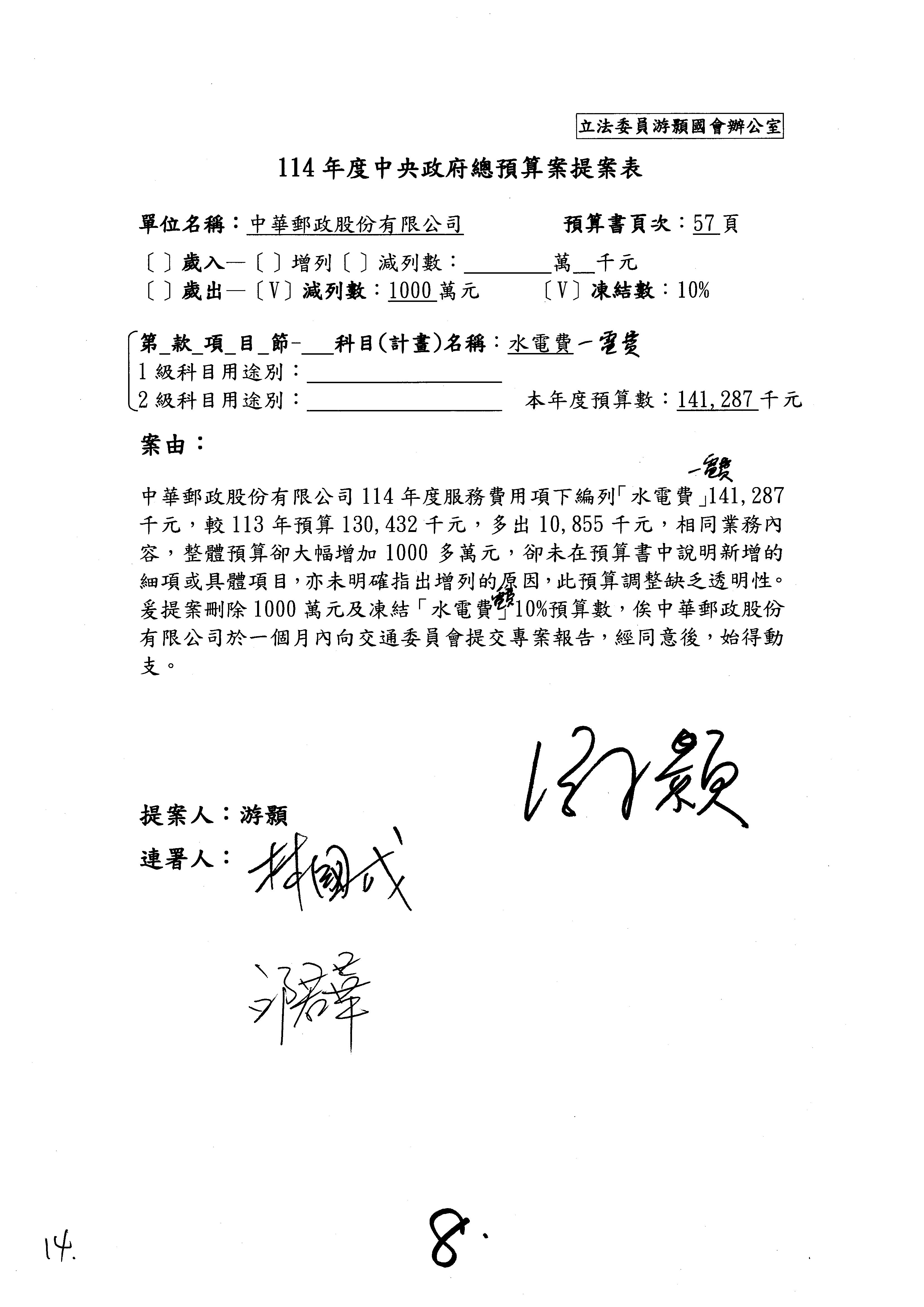 徐委員富癸:本席改凍結1,000萬元。