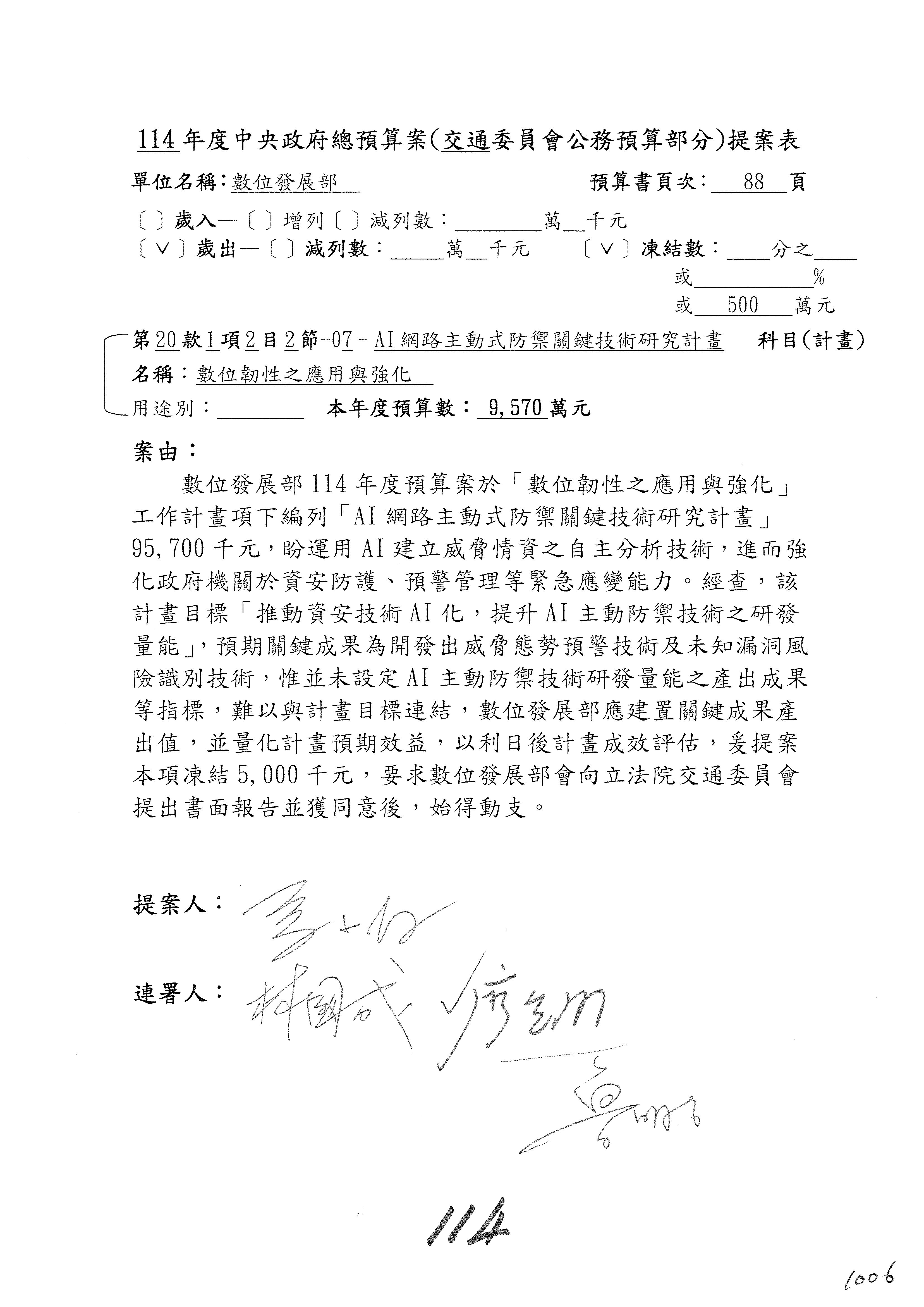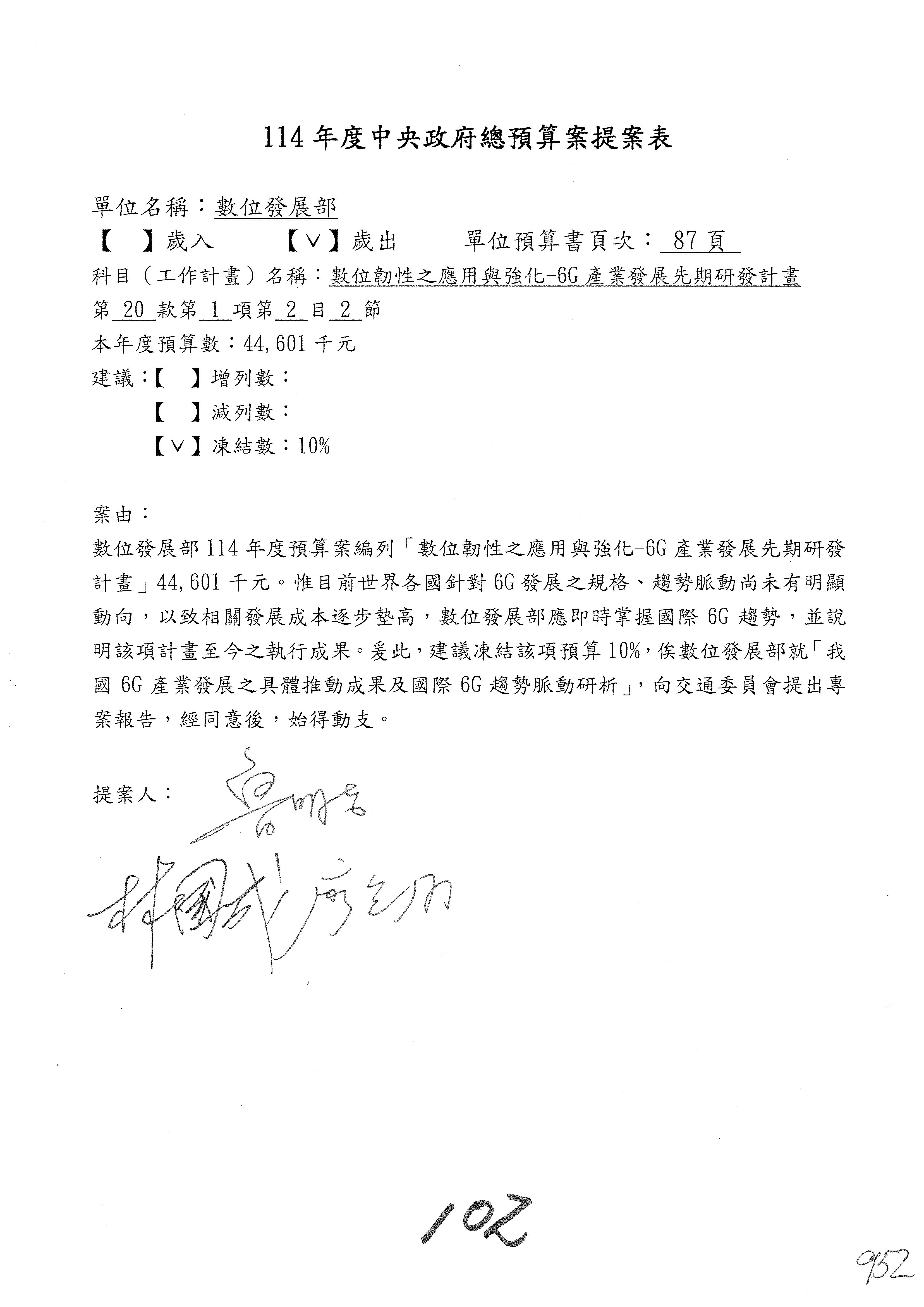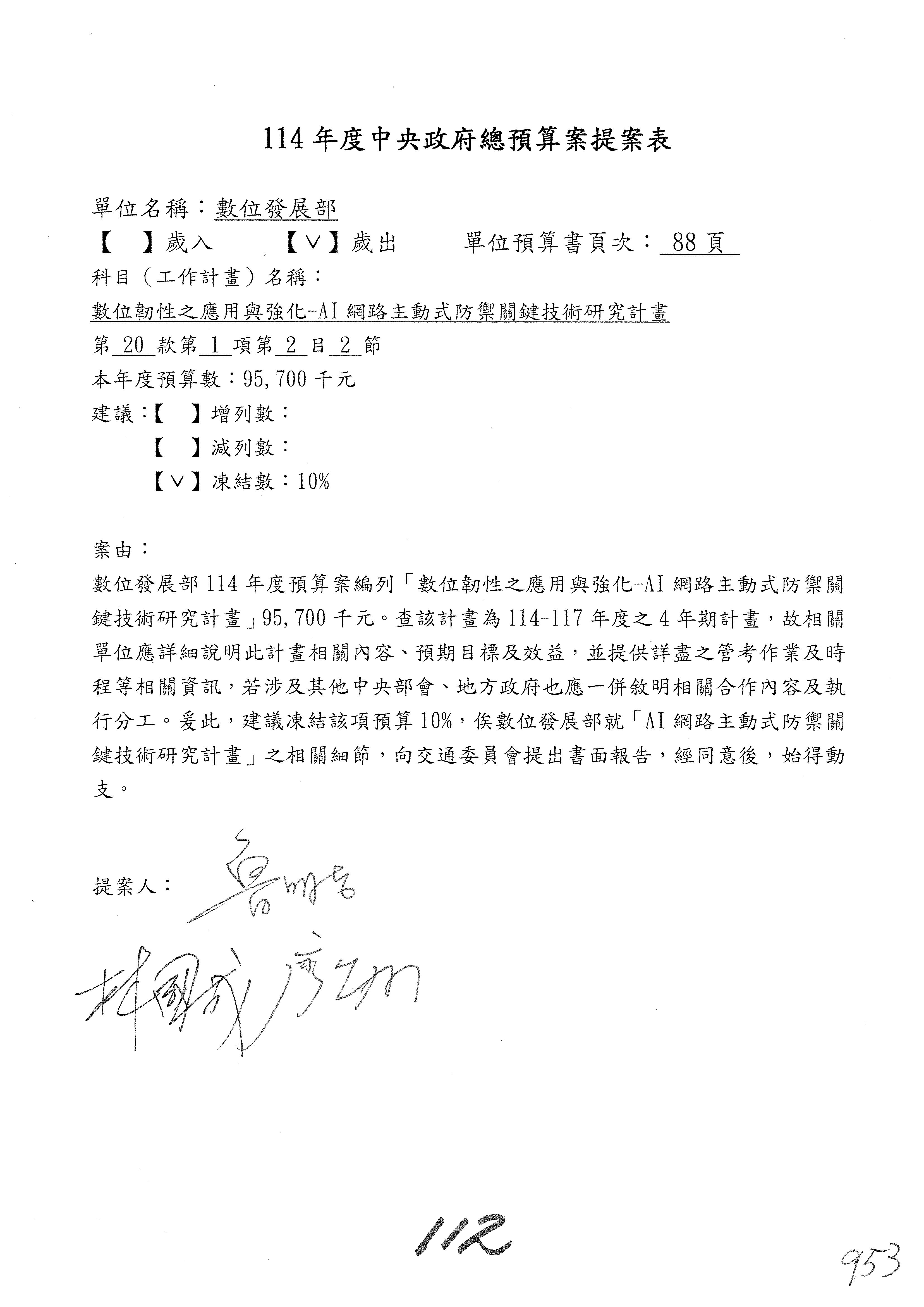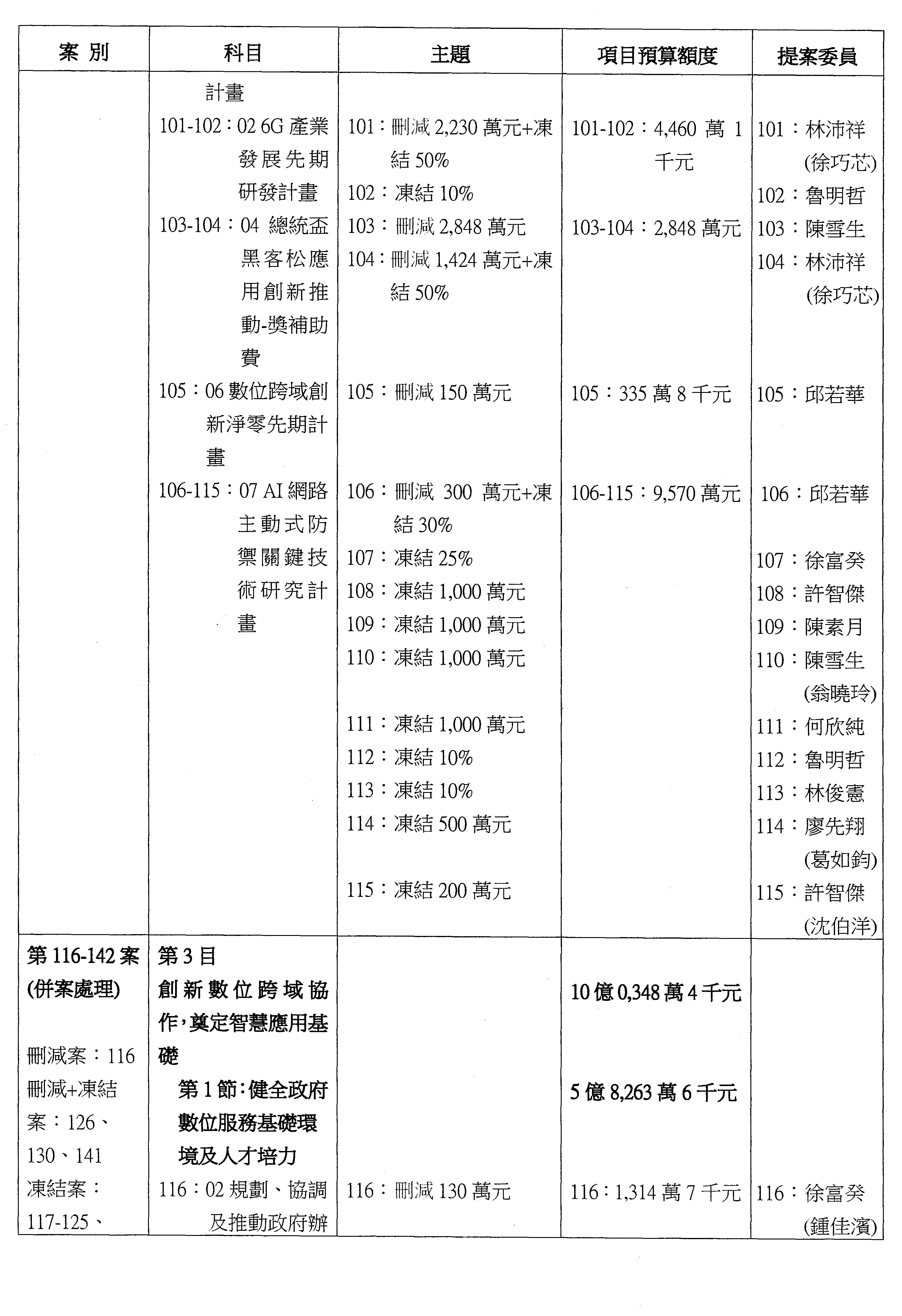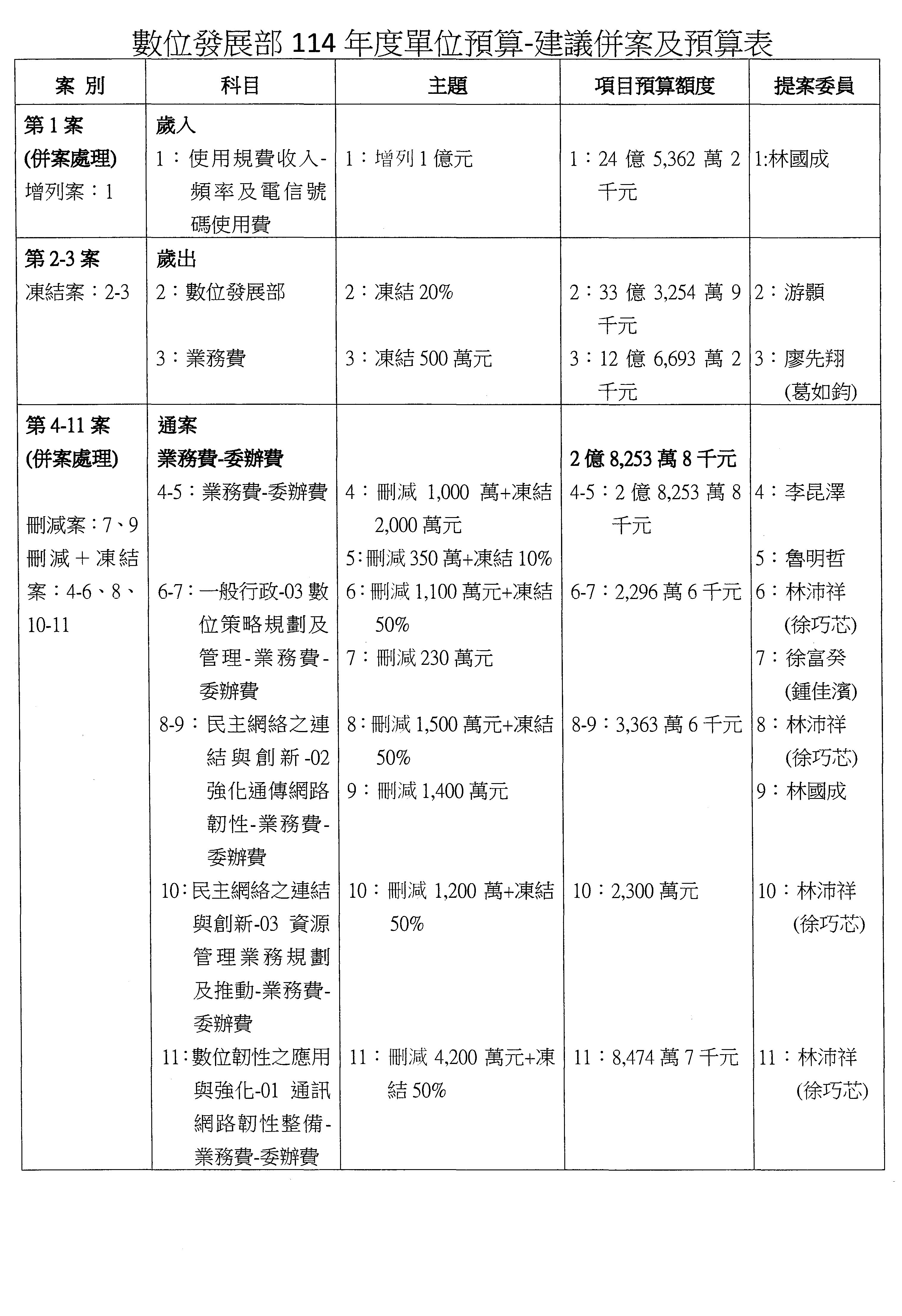 謝謝各位委員,現在請拿出最大本的,這應該算是今天最厚的,也請各位翻開數位發展部114年度單位預算─建議併案及預算表,待會審理預算按照這個併案審理的順序來審理。