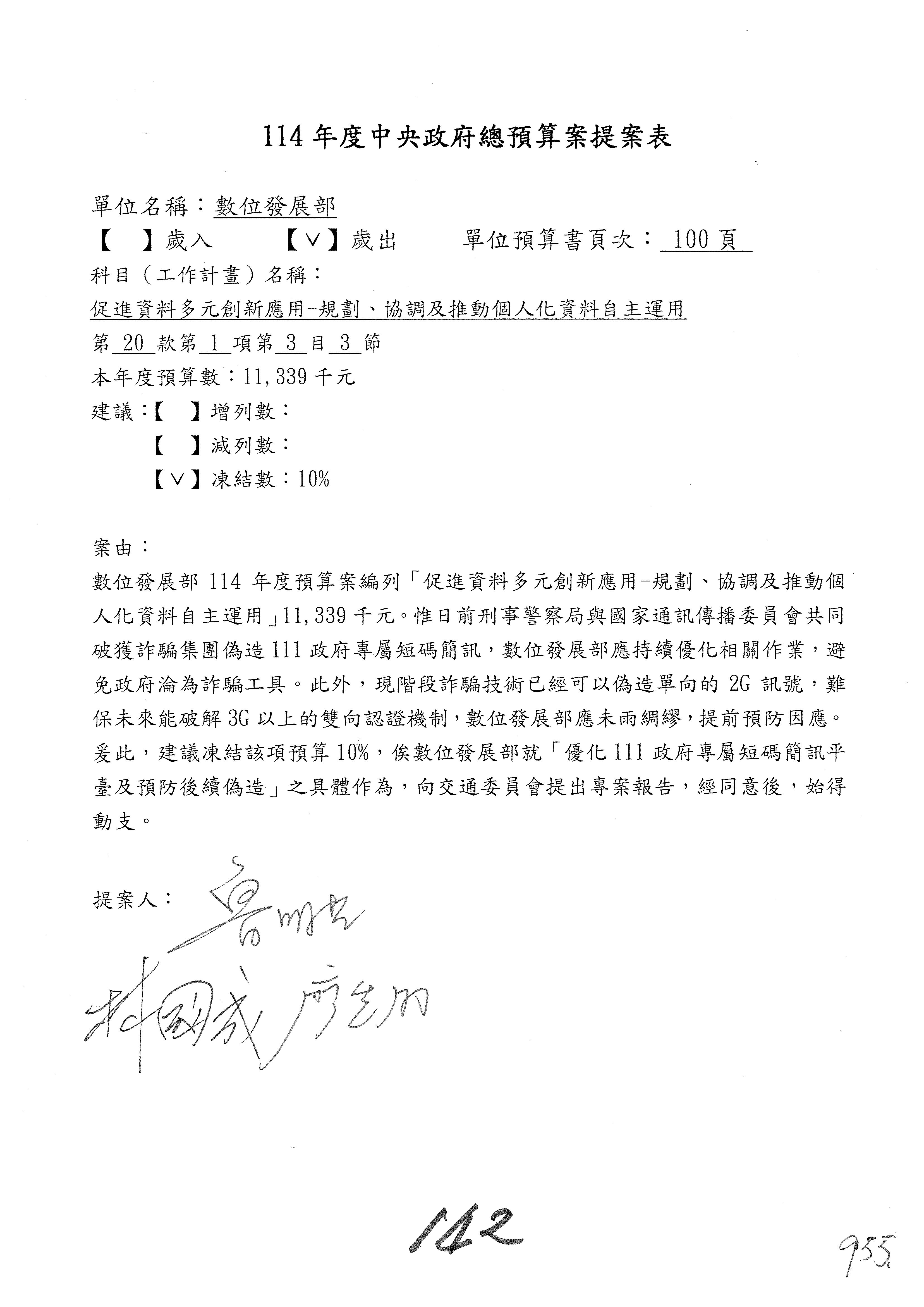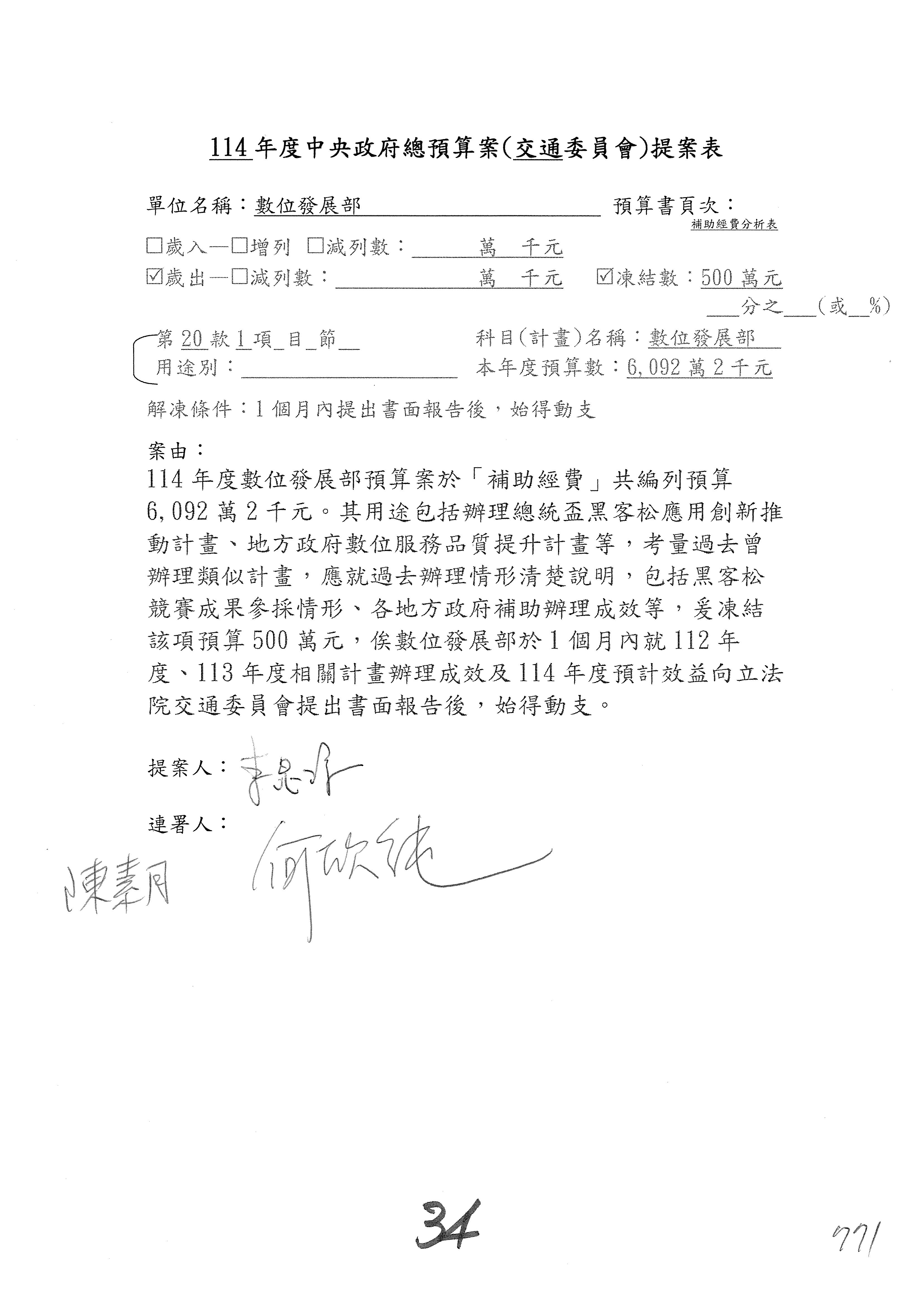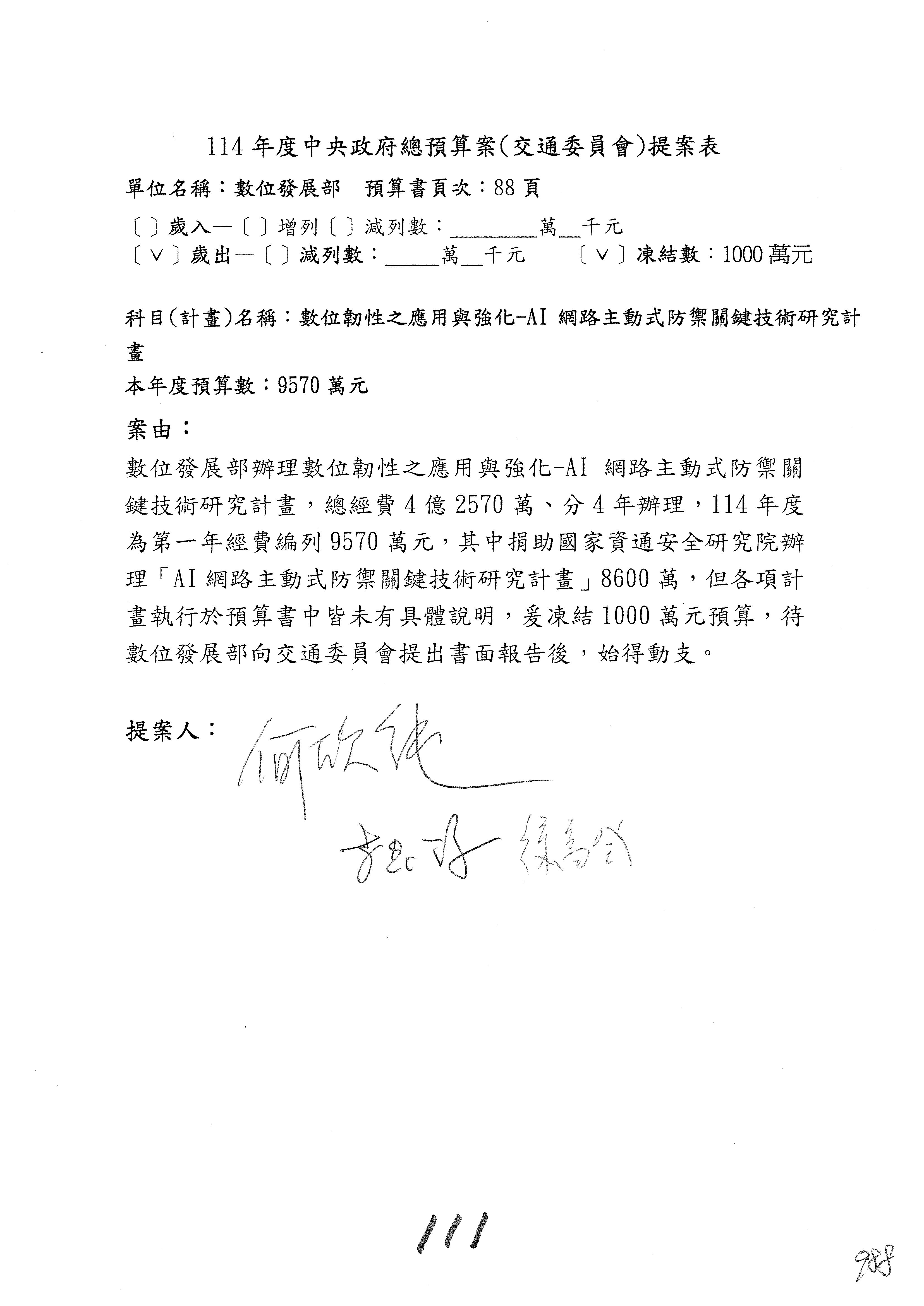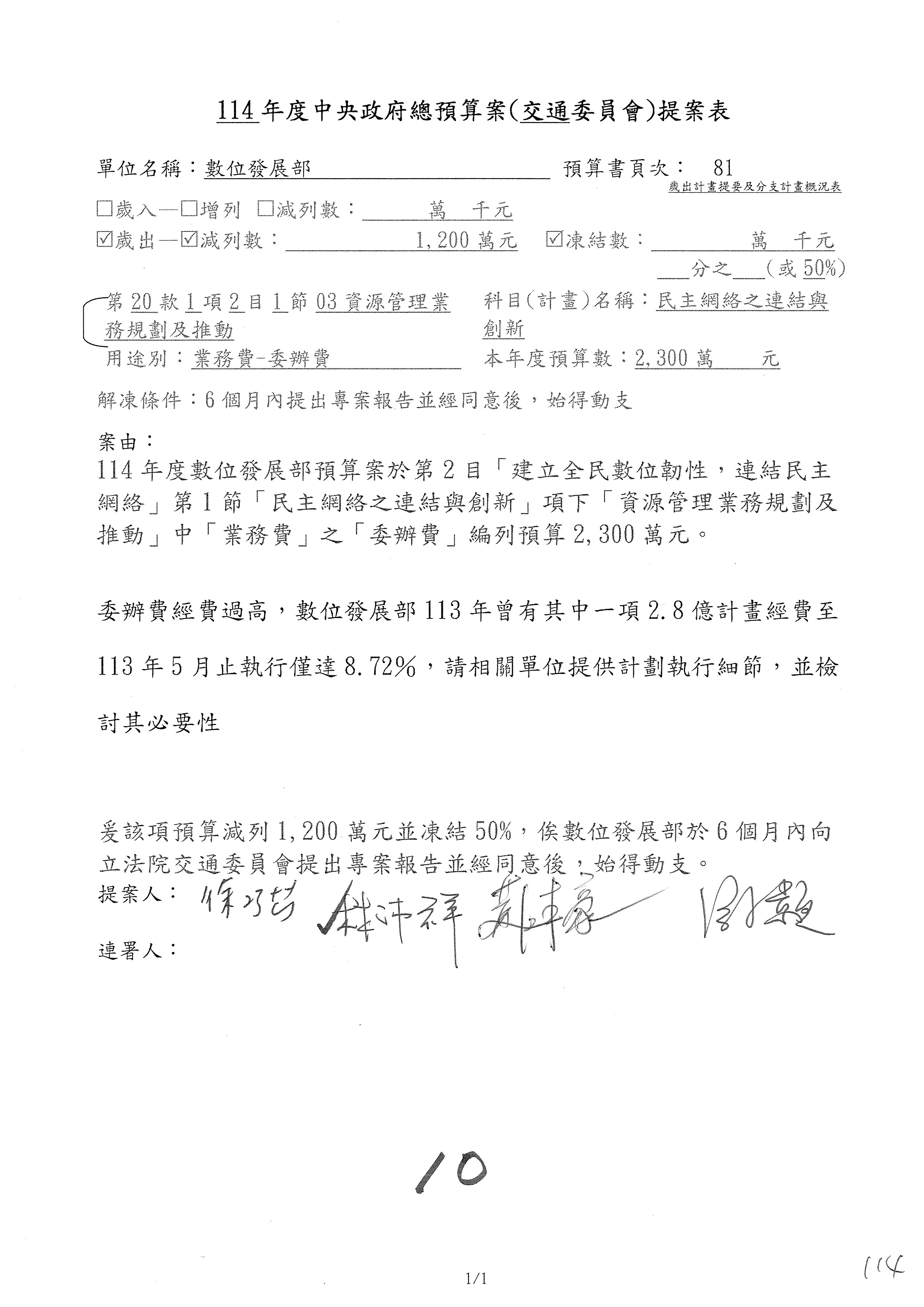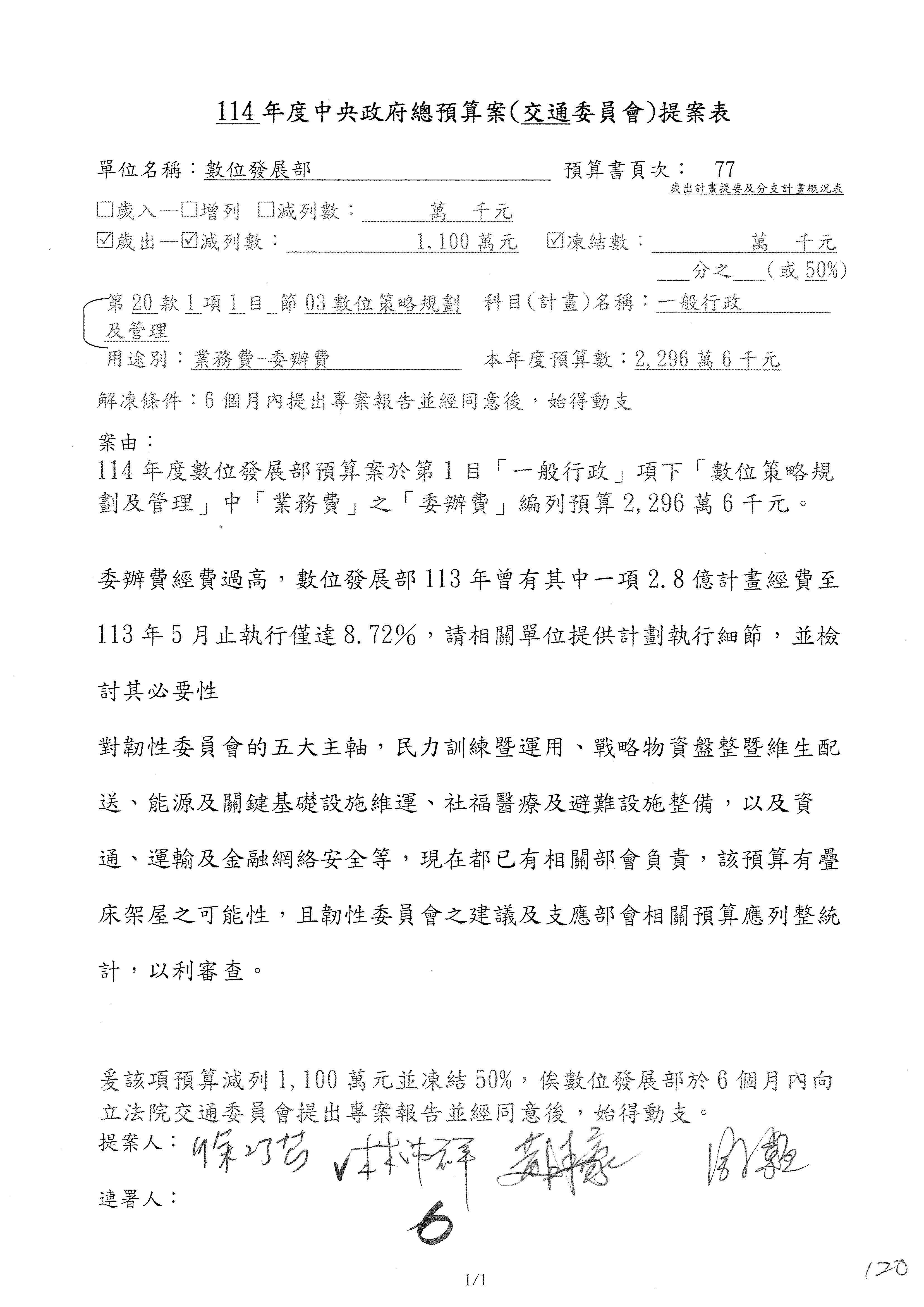 謝謝各位委員,現在請拿出最大本的,這應該算是今天最厚的,也請各位翻開數位發展部114年度單位預算─建議併案及預算表,待會審理預算按照這個併案審理的順序來審理。