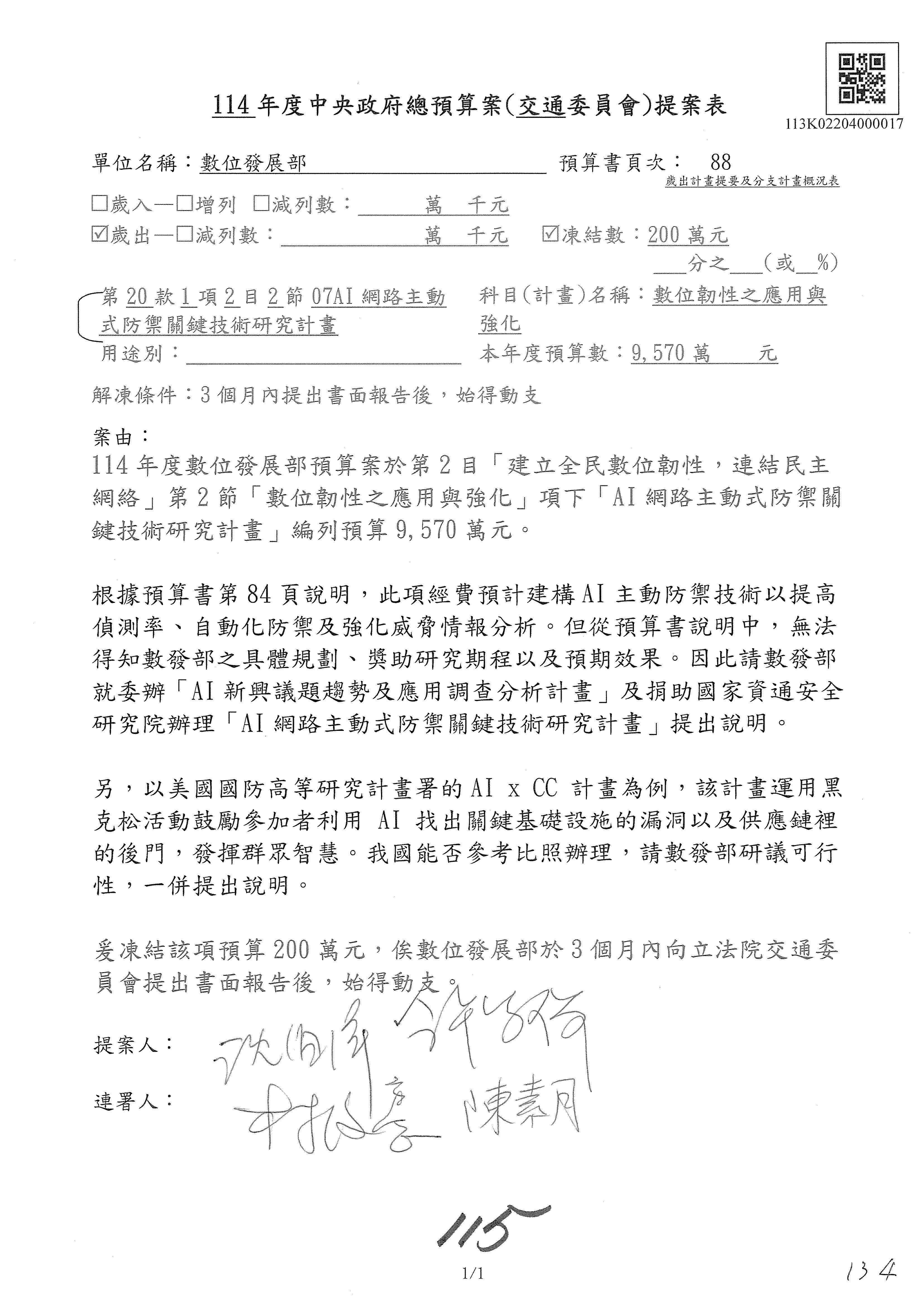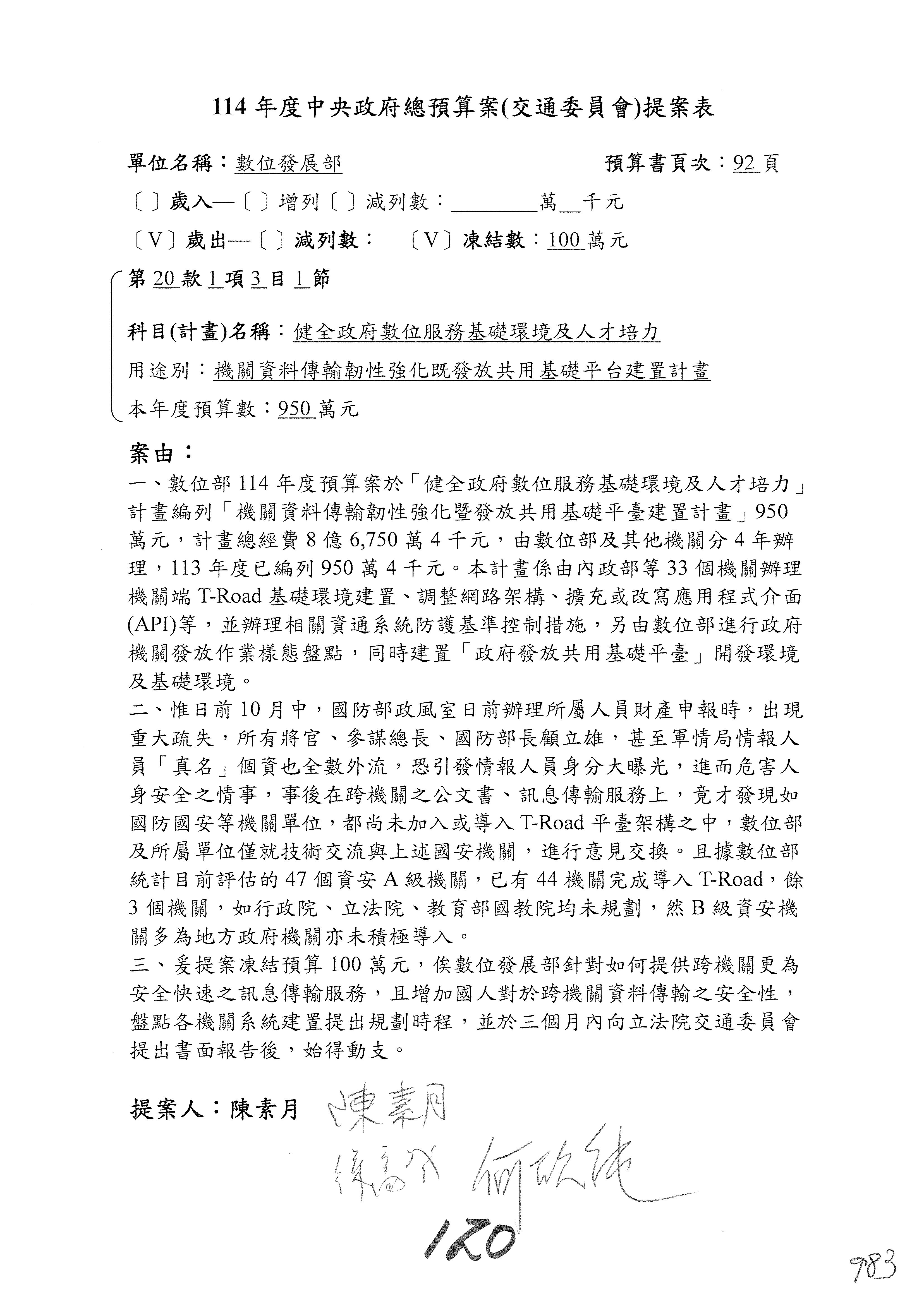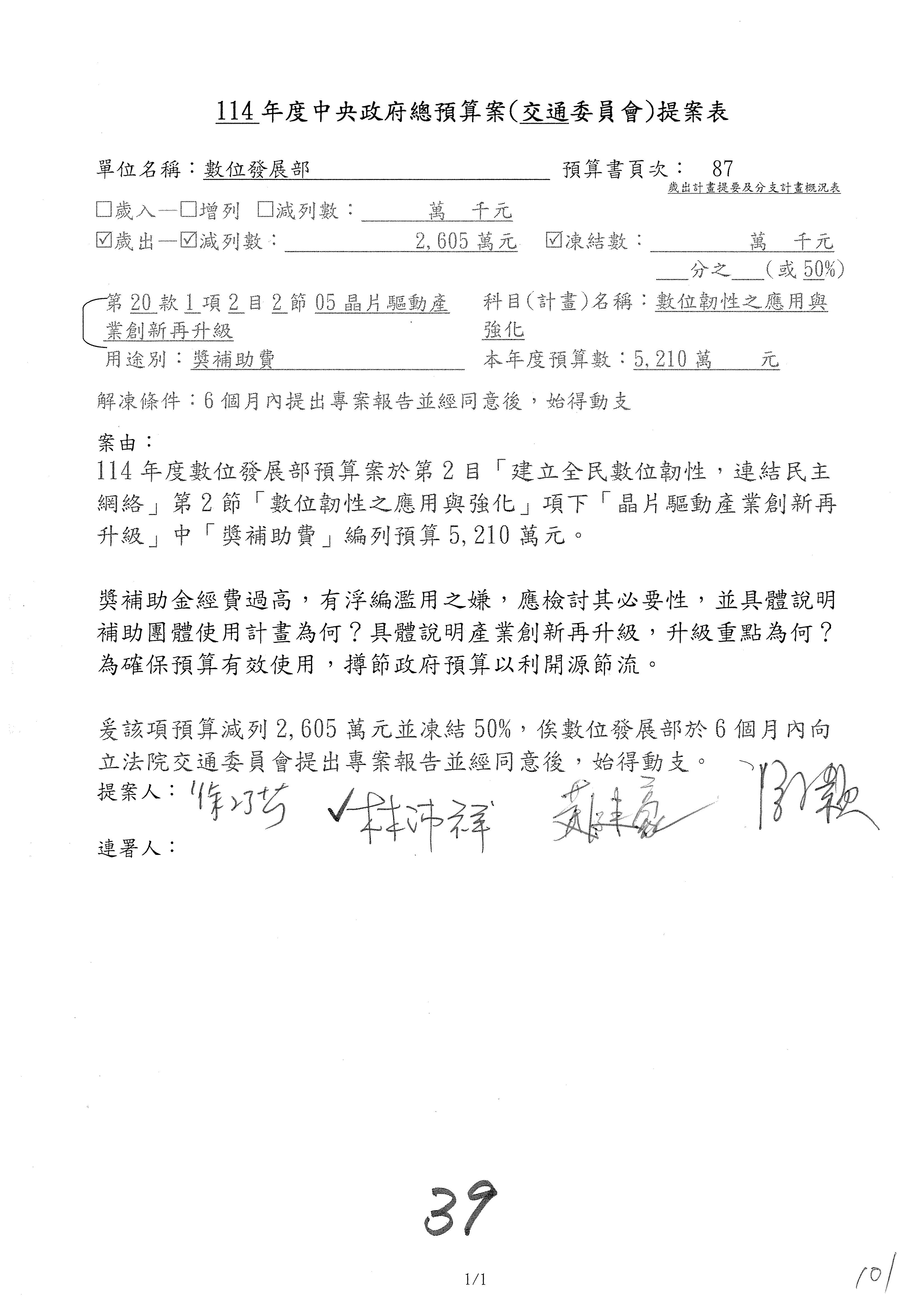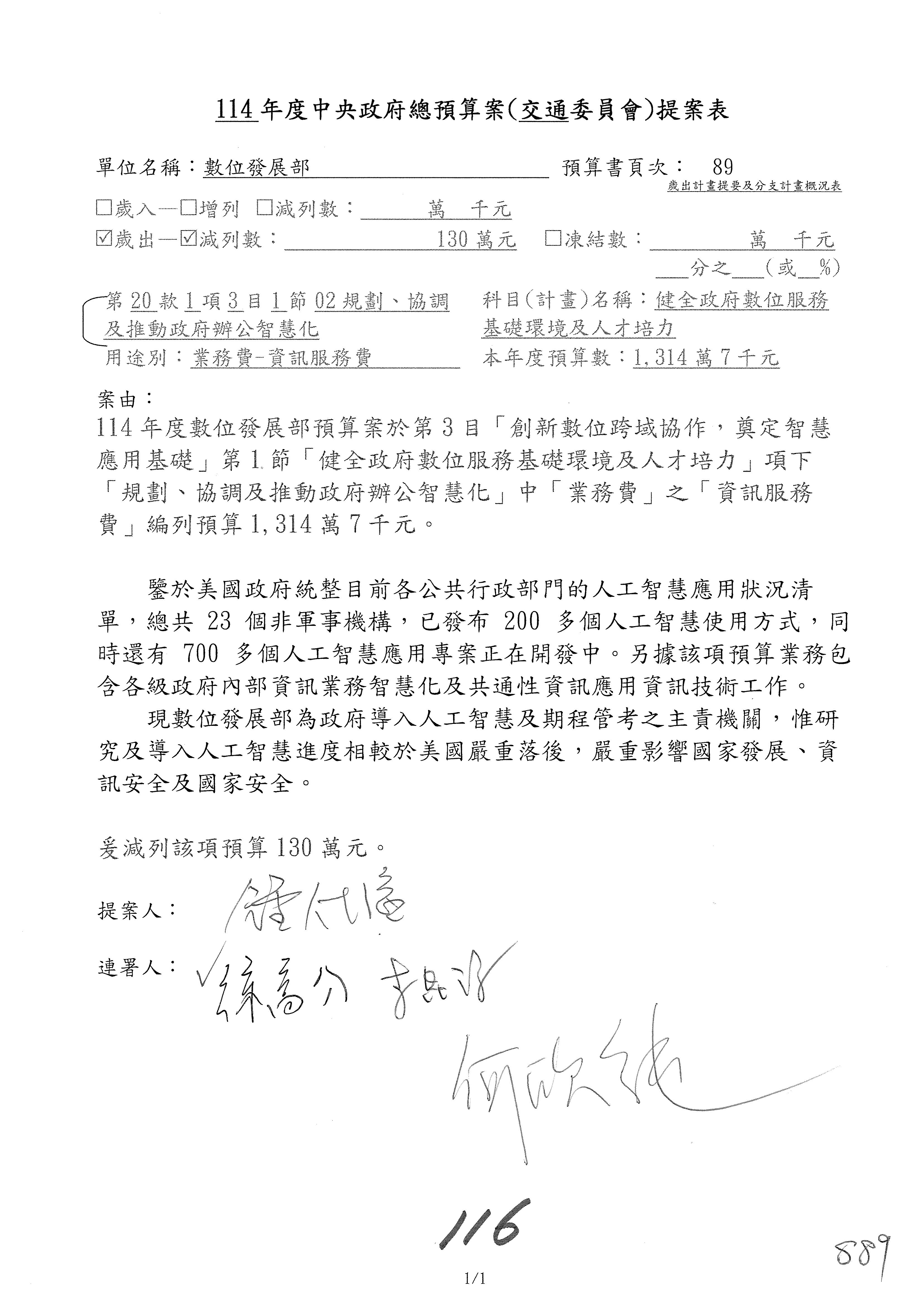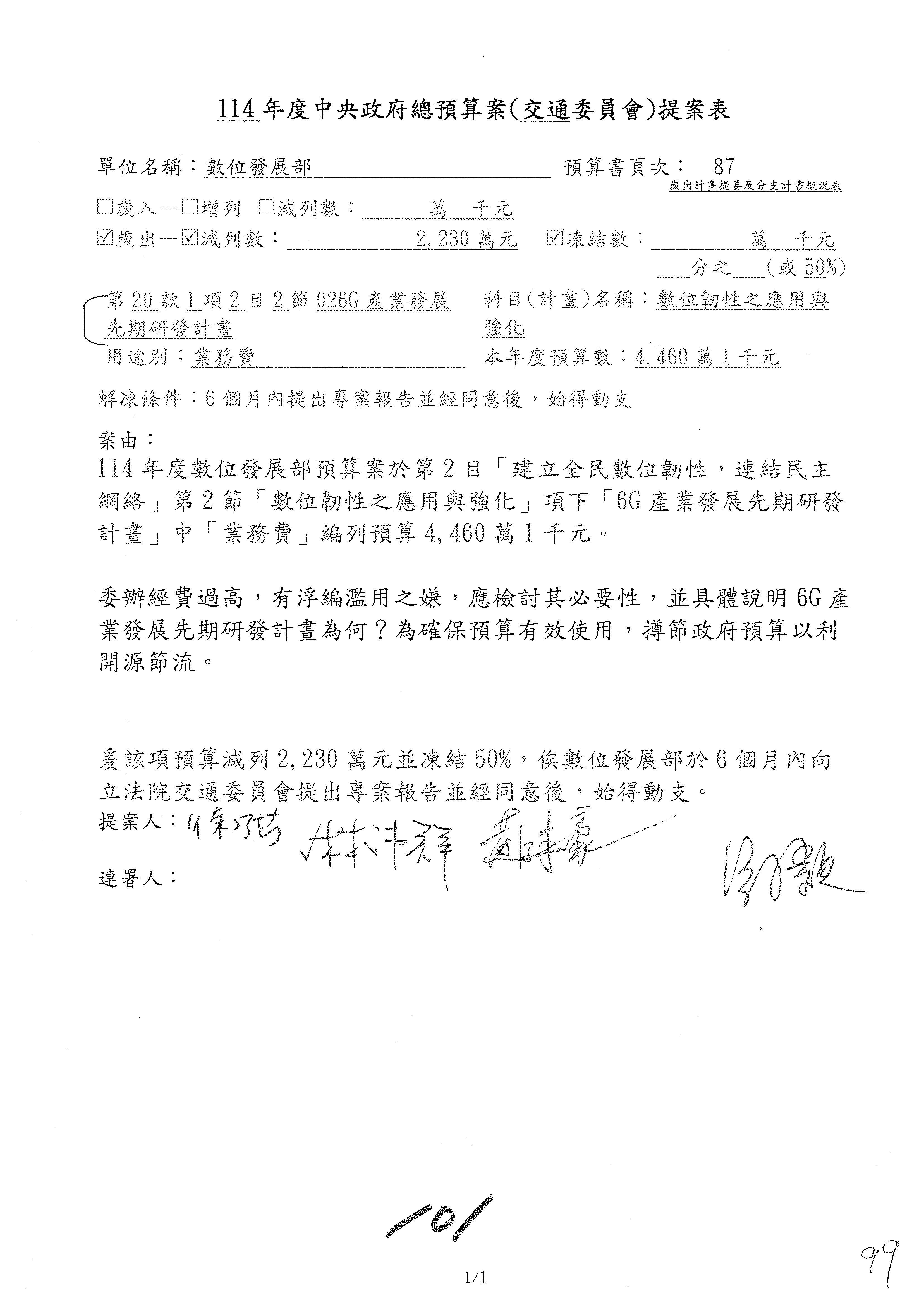 謝謝各位委員,現在請拿出最大本的,這應該算是今天最厚的,也請各位翻開數位發展部114年度單位預算─建議併案及預算表,待會審理預算按照這個併案審理的順序來審理。