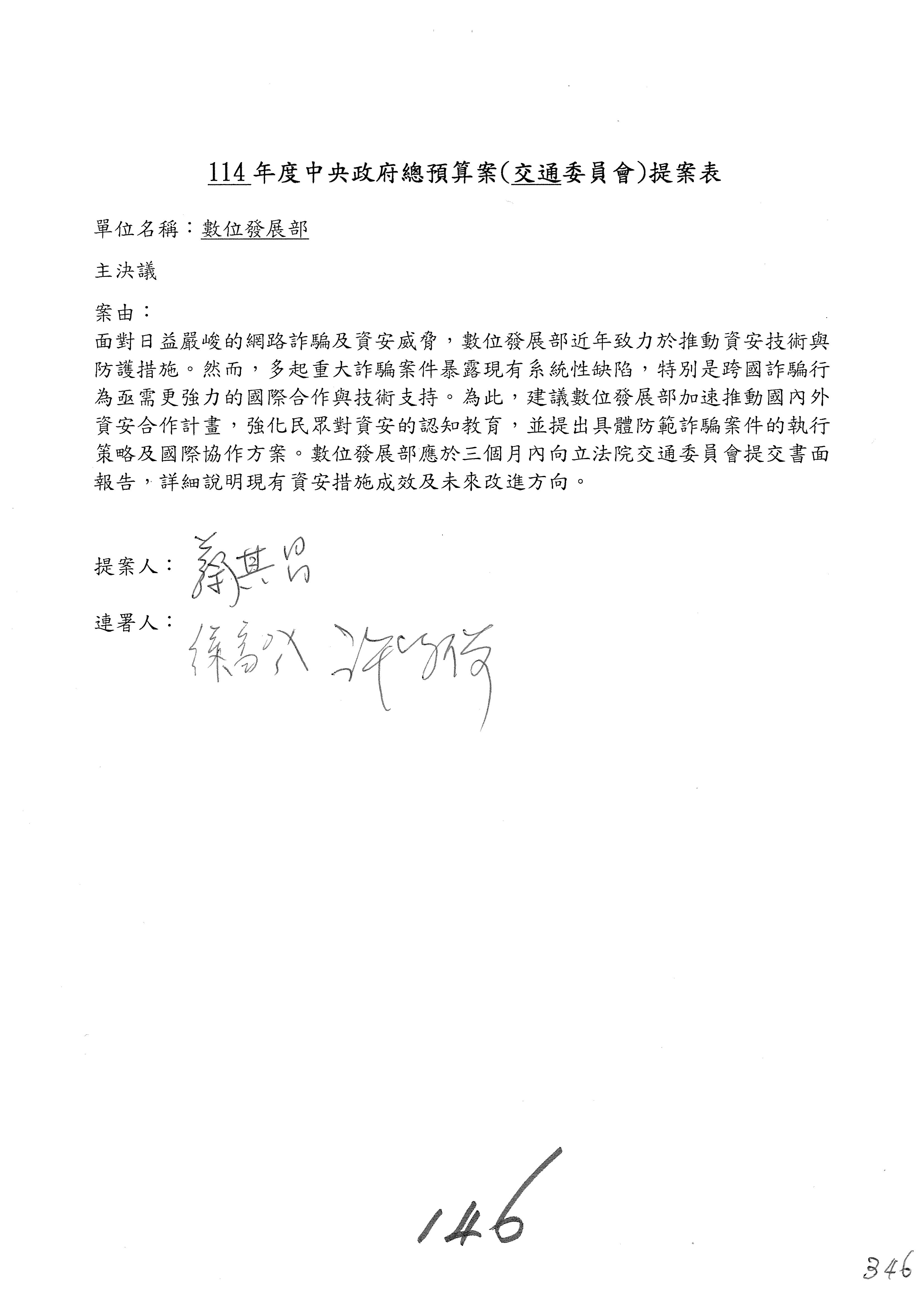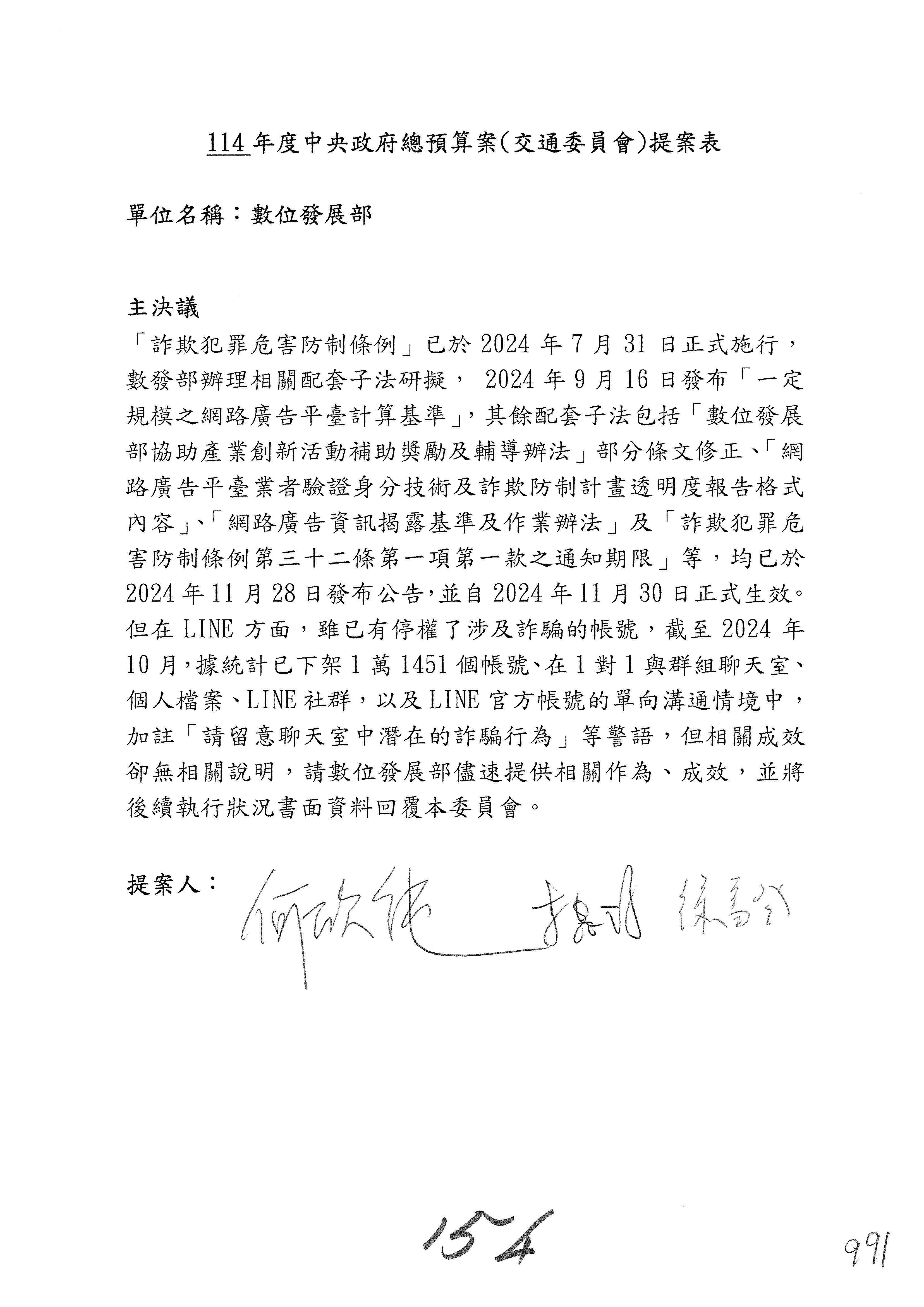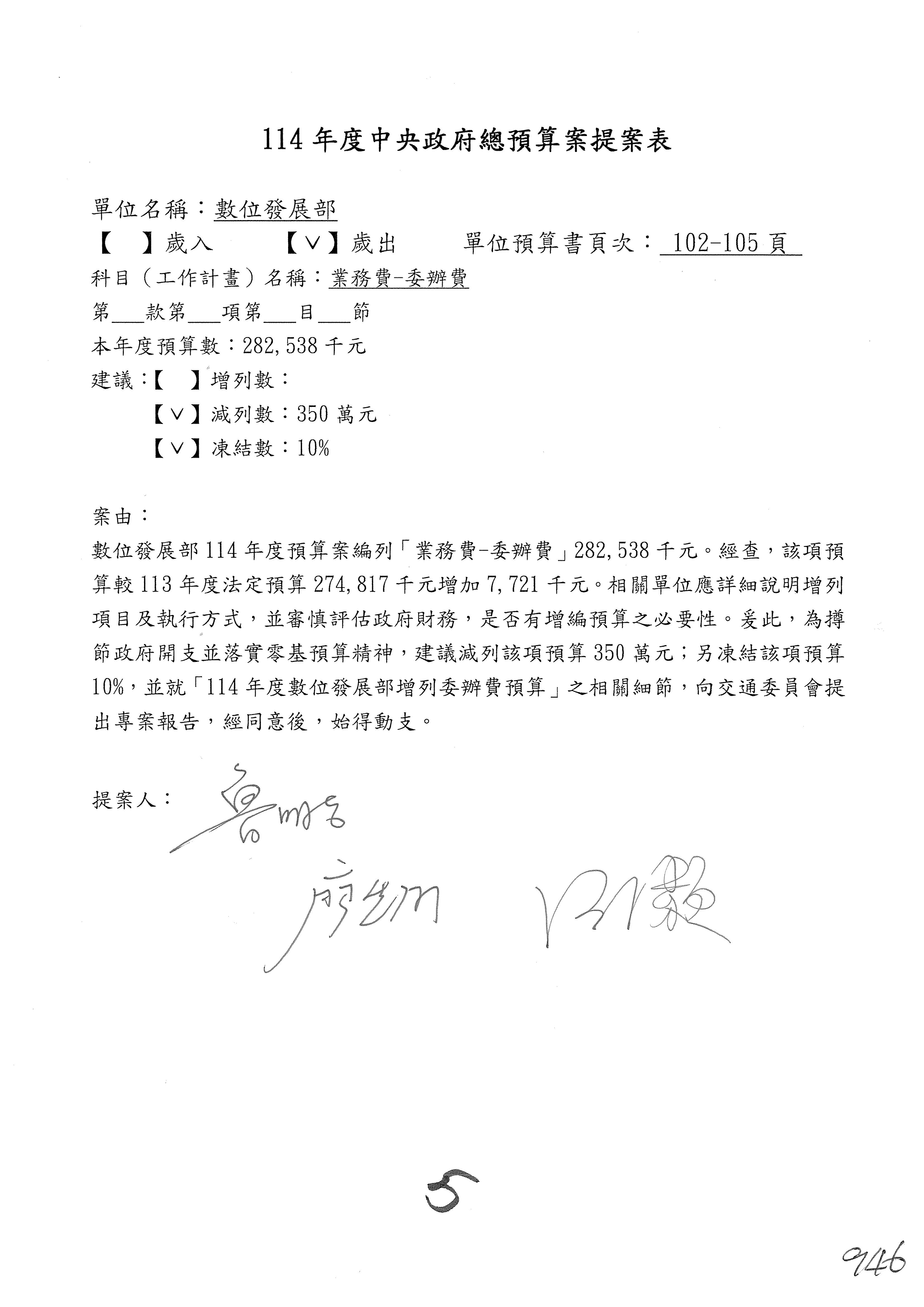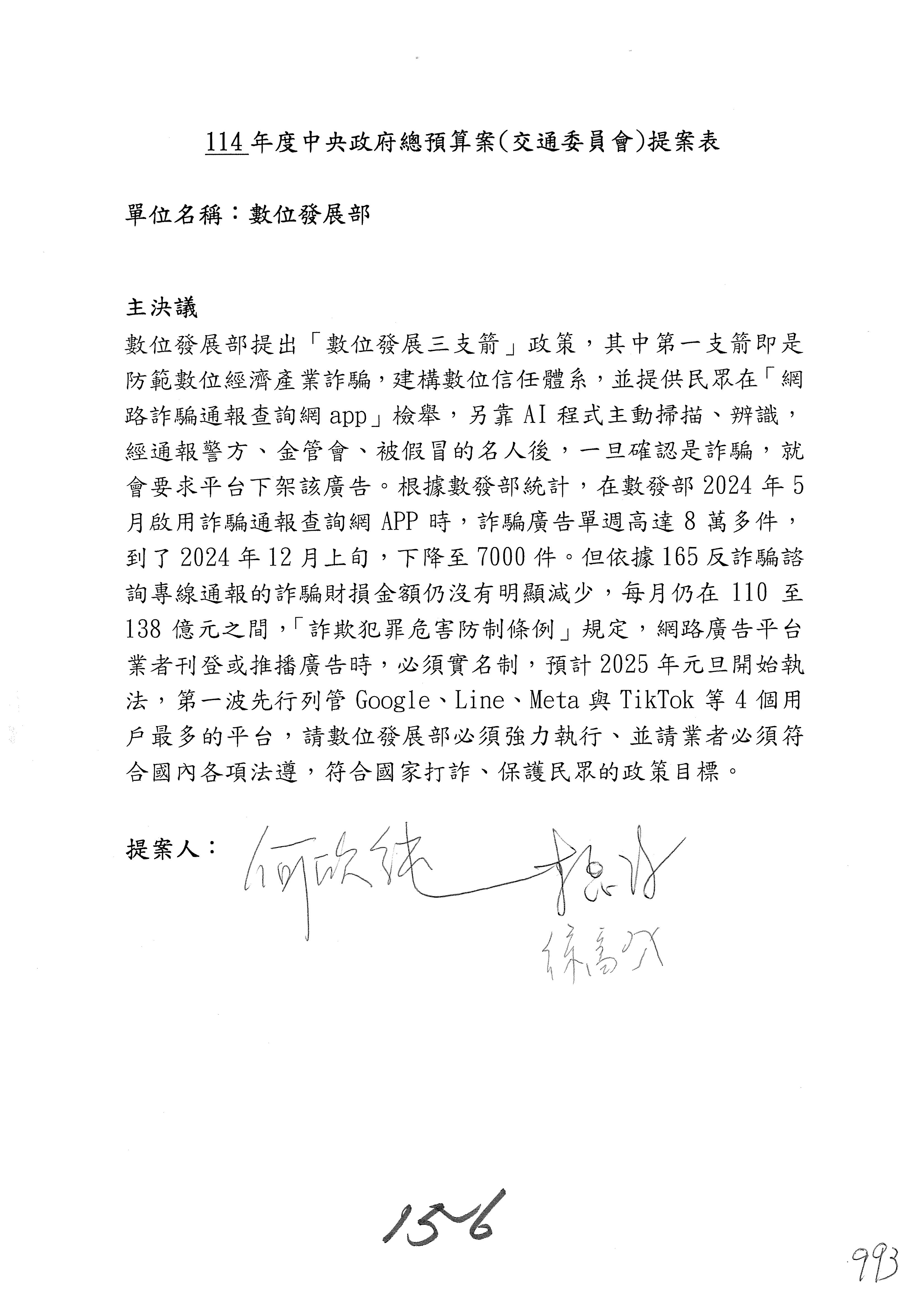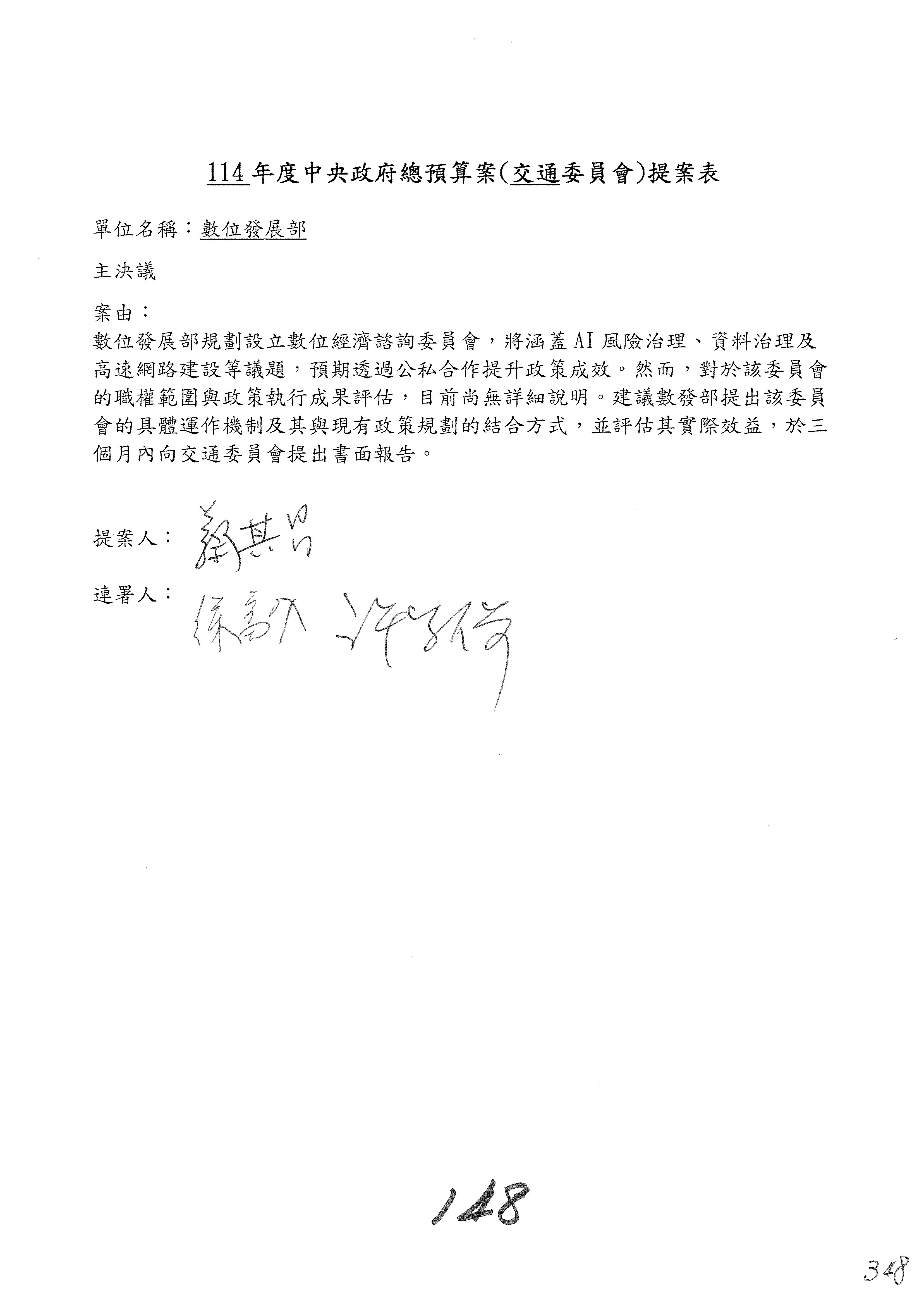 謝謝各位委員,現在請拿出最大本的,這應該算是今天最厚的,也請各位翻開數位發展部114年度單位預算─建議併案及預算表,待會審理預算按照這個併案審理的順序來審理。