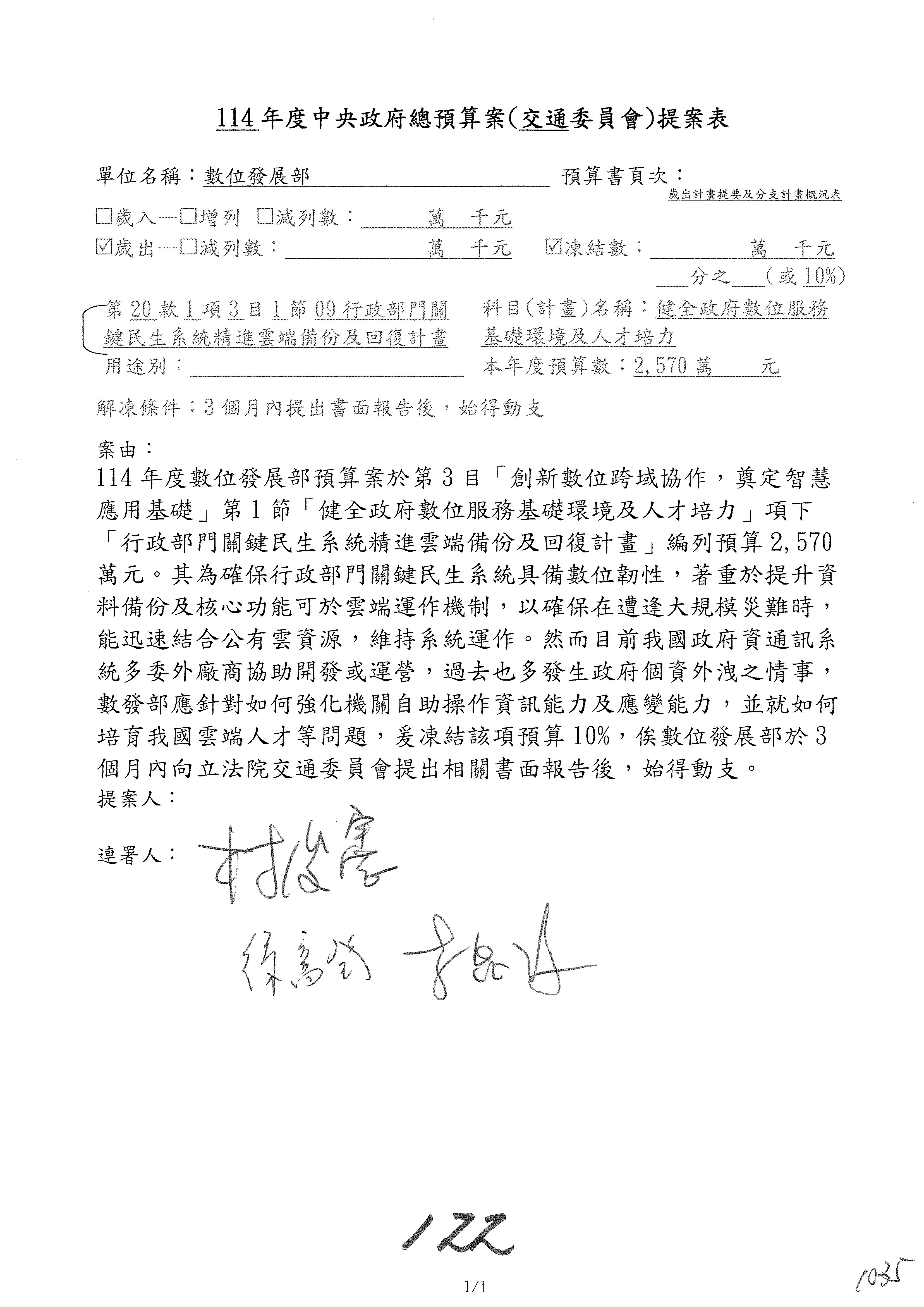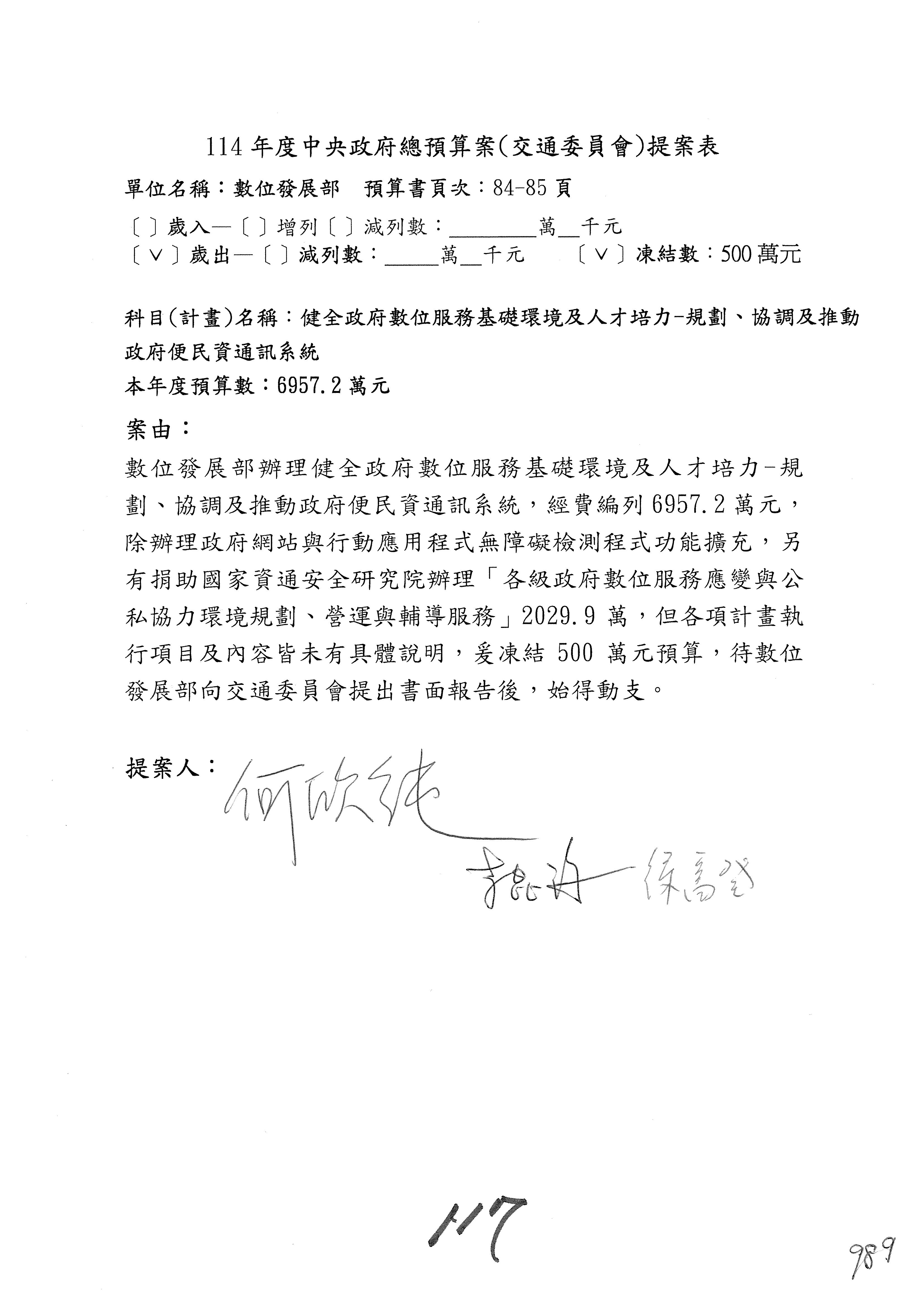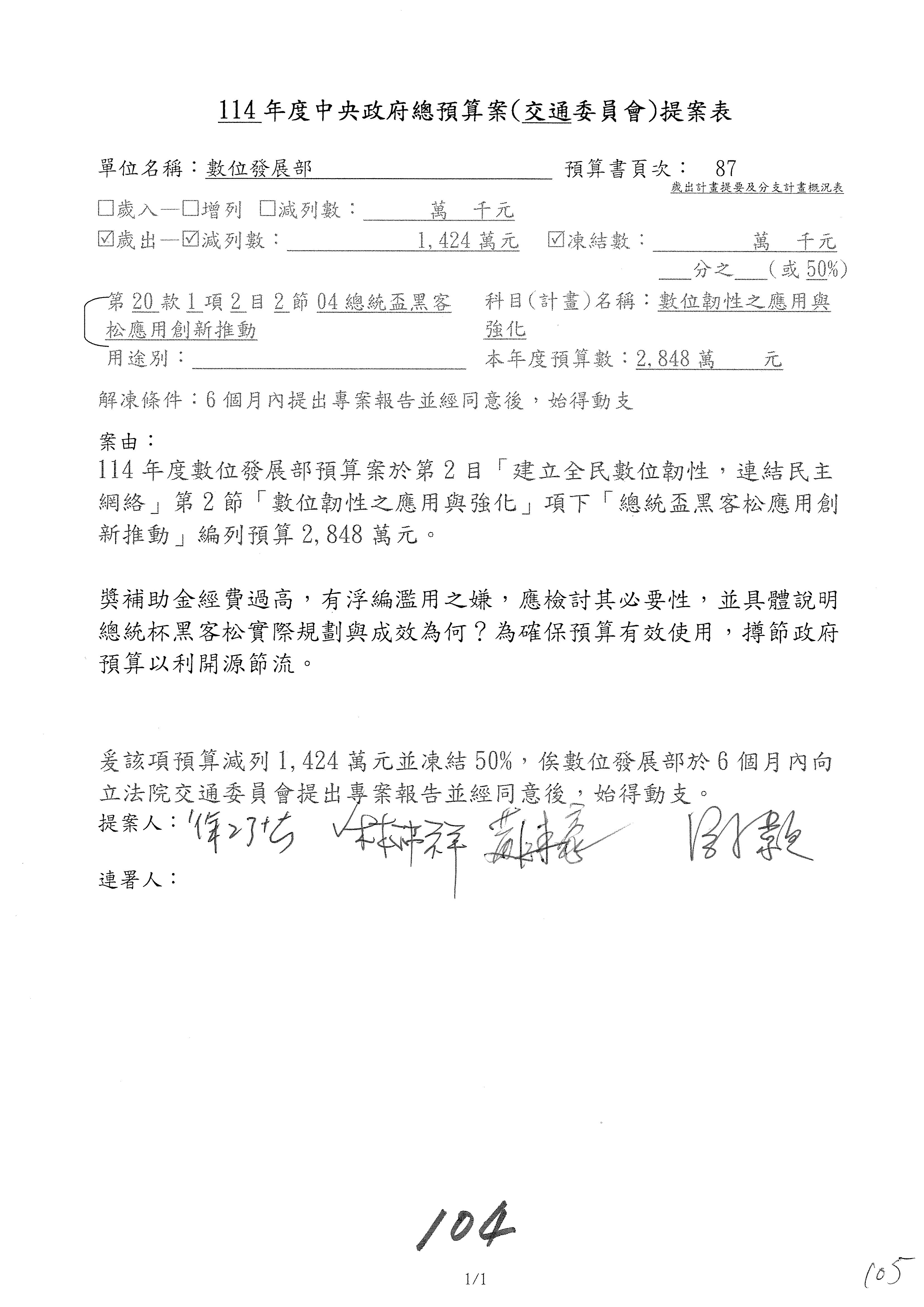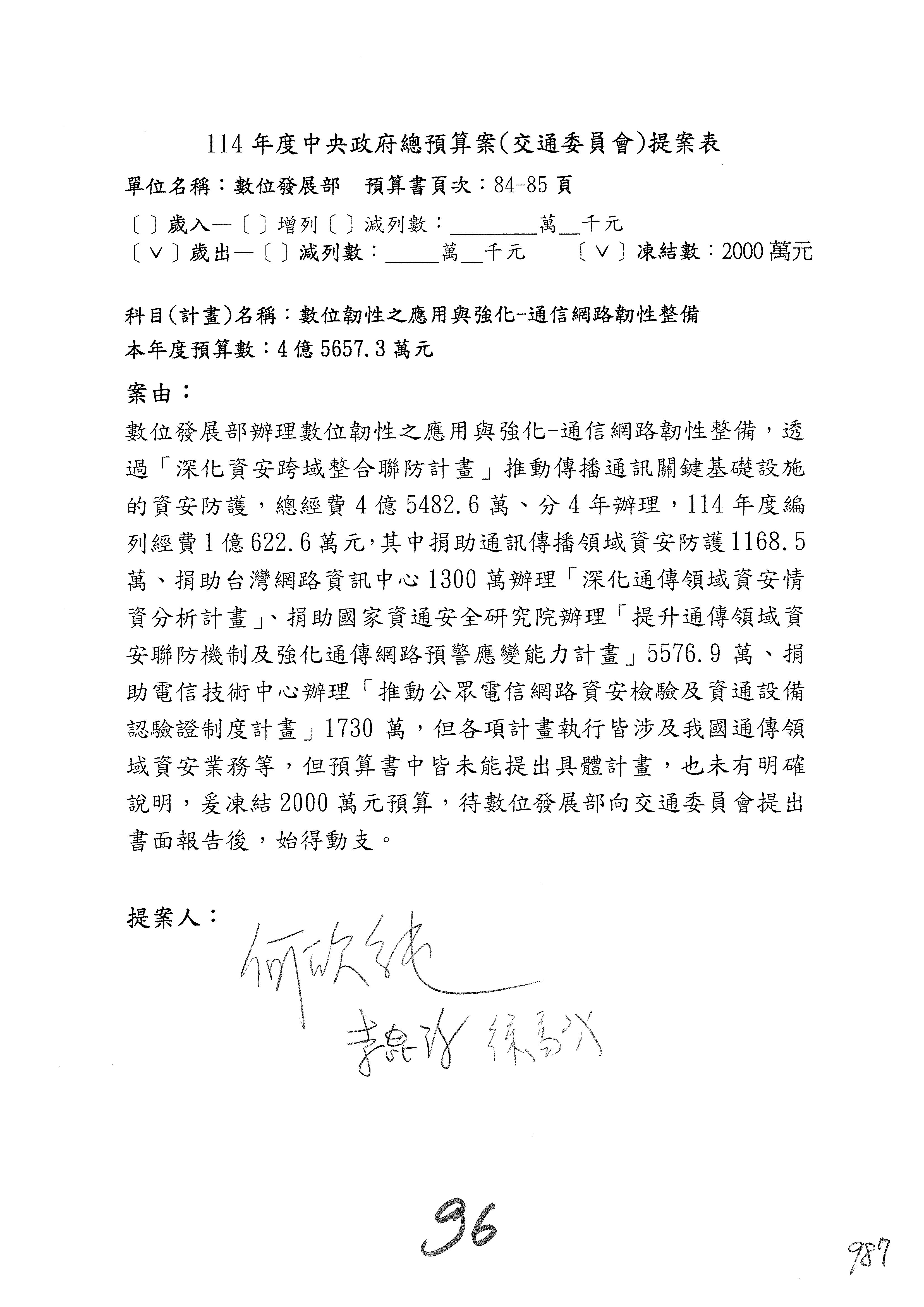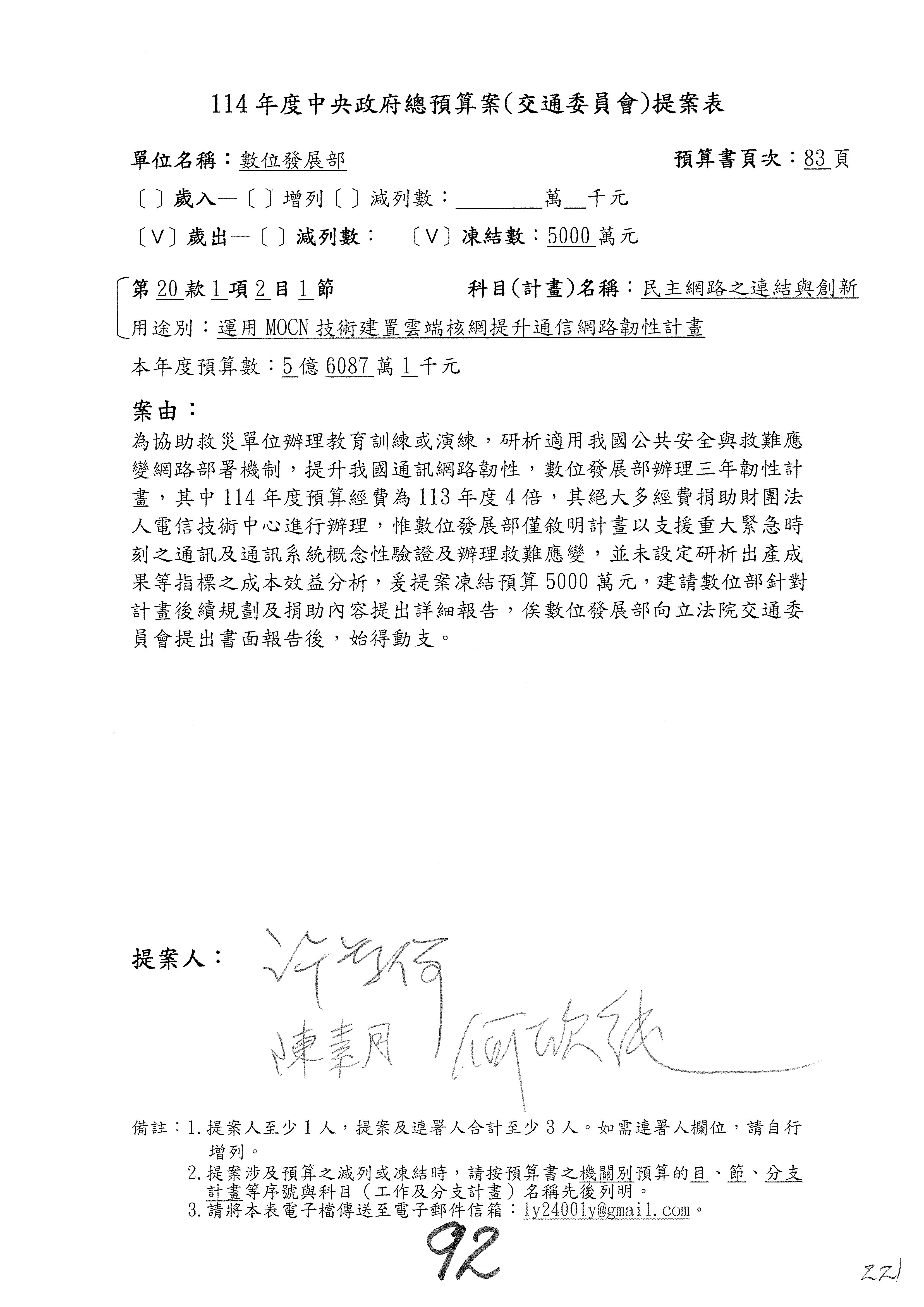 謝謝各位委員,現在請拿出最大本的,這應該算是今天最厚的,也請各位翻開數位發展部114年度單位預算─建議併案及預算表,待會審理預算按照這個併案審理的順序來審理。