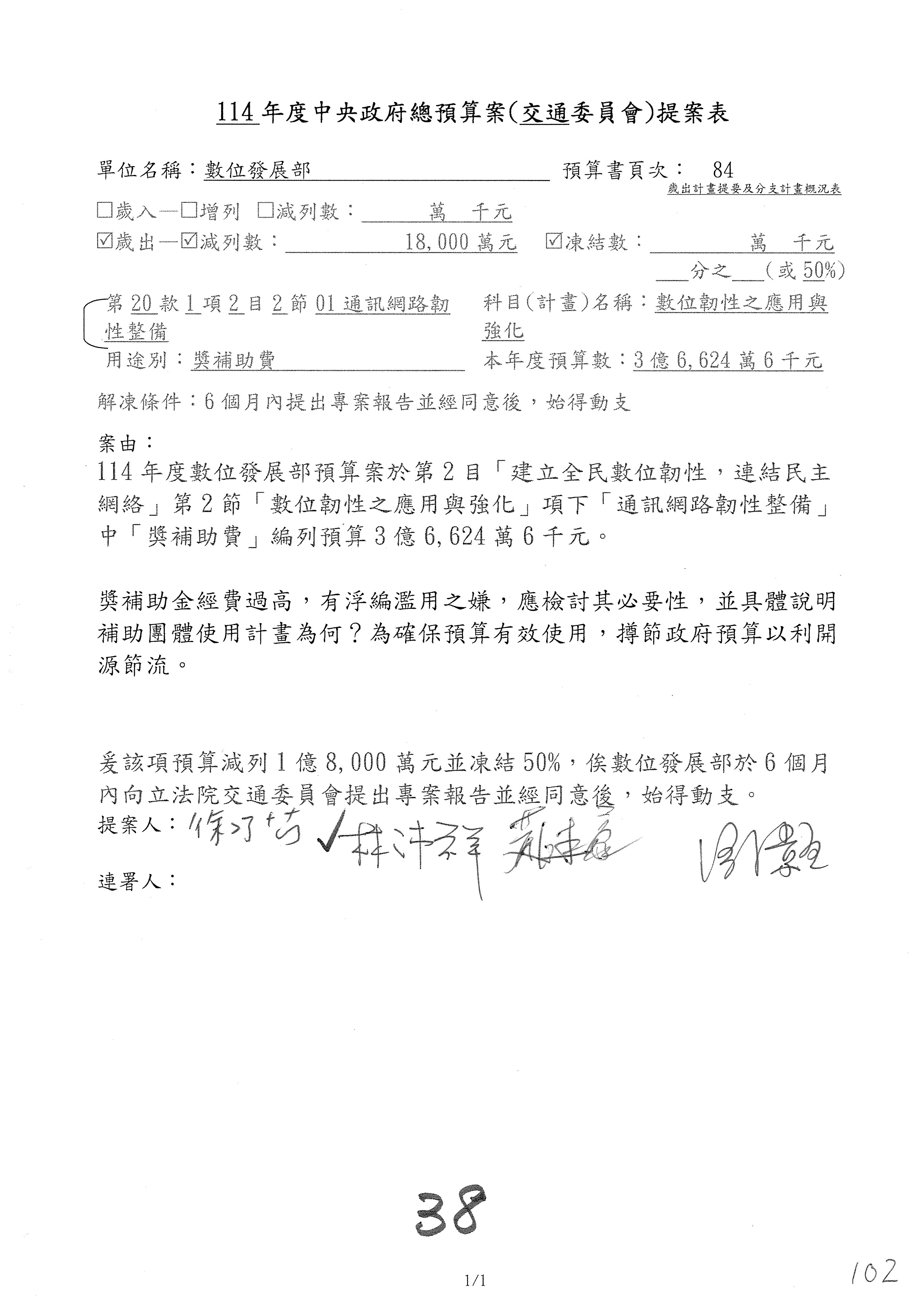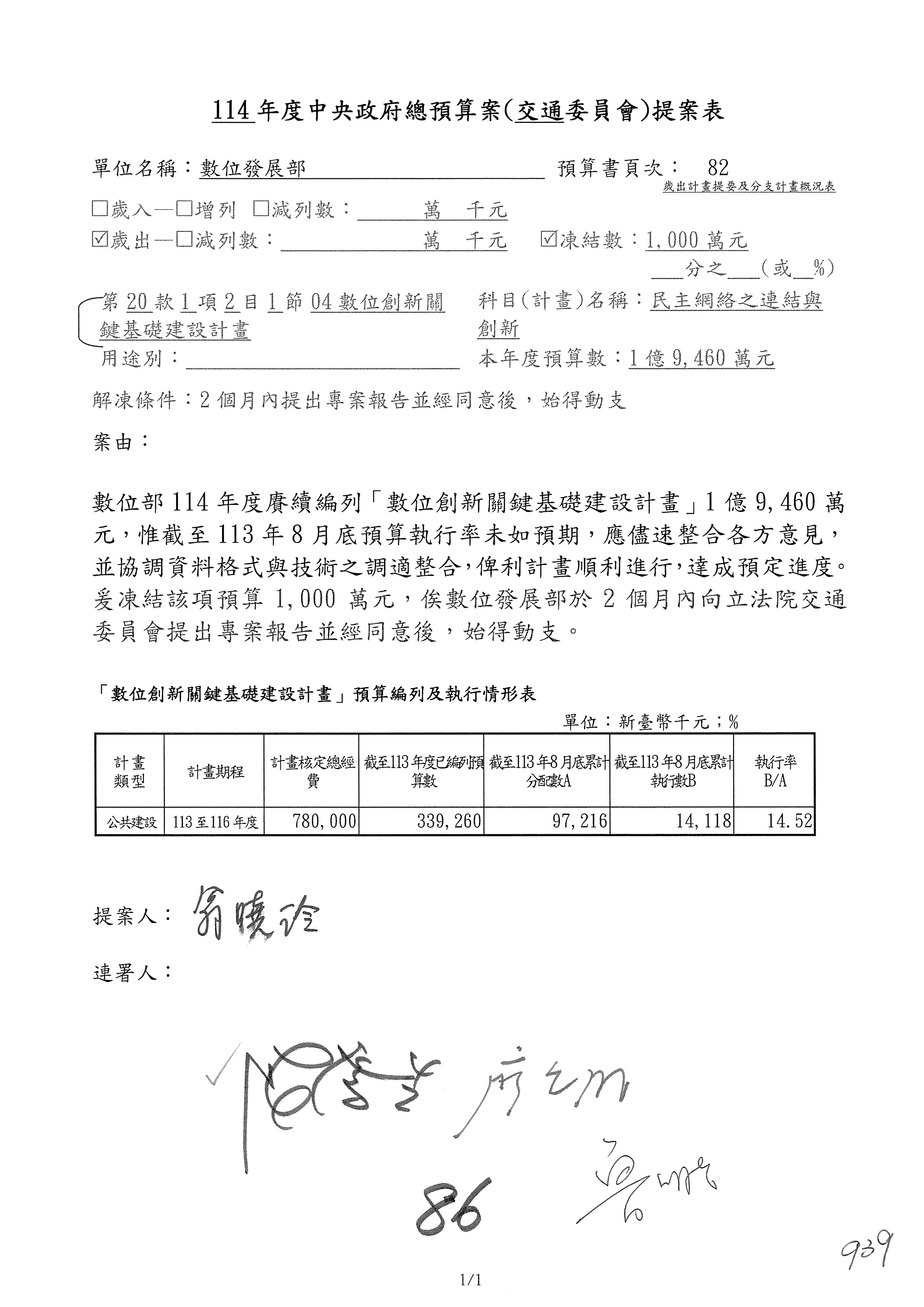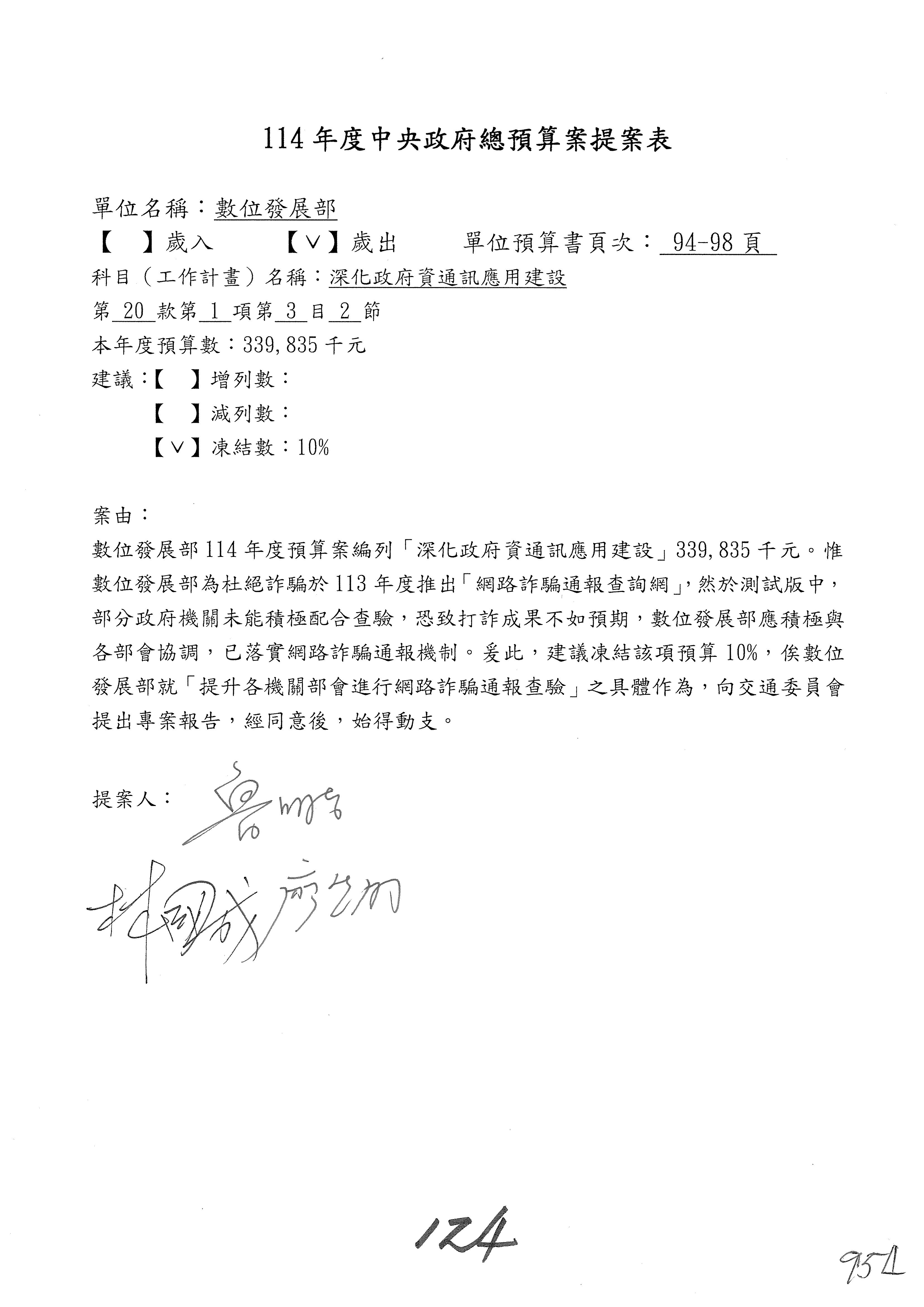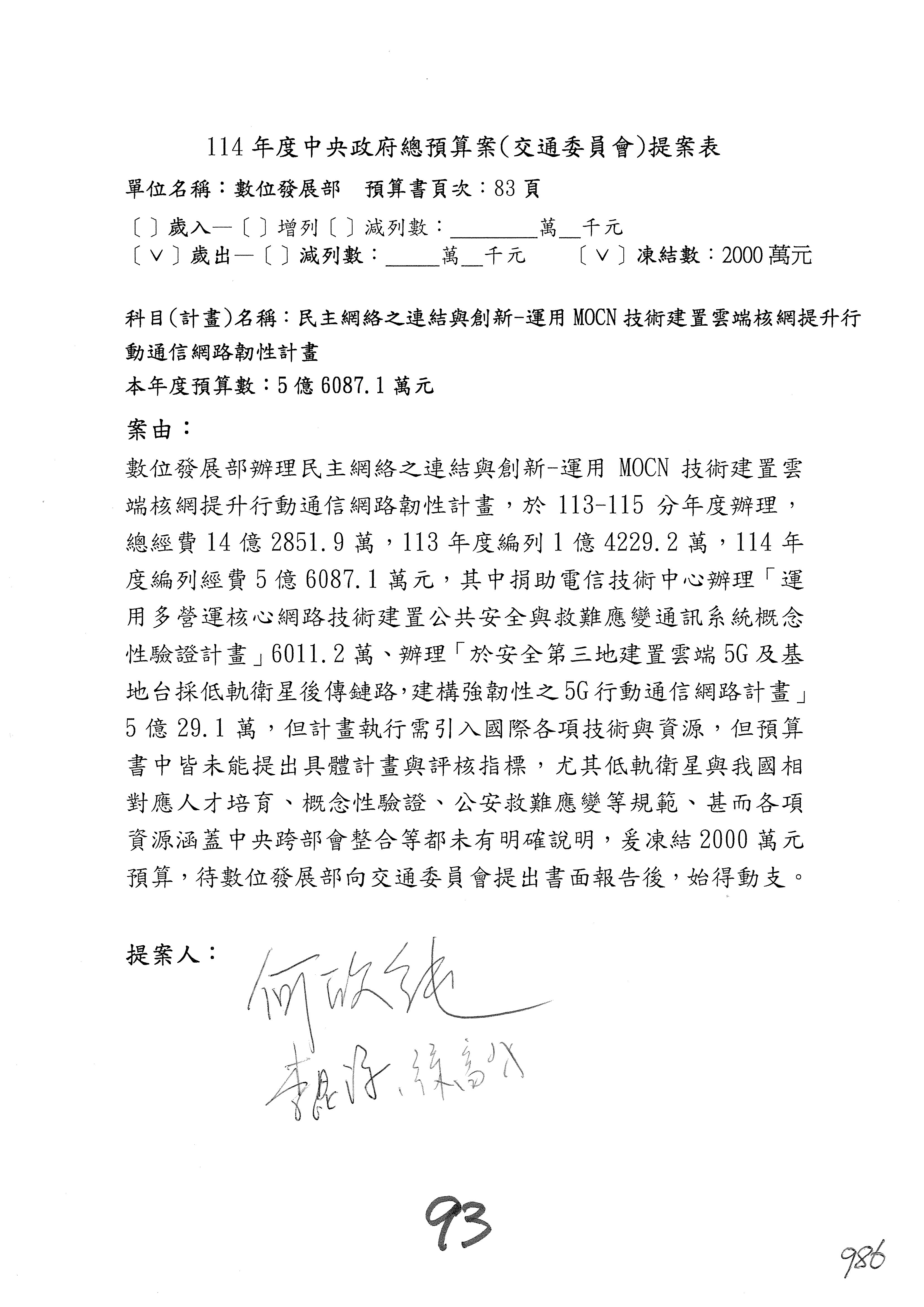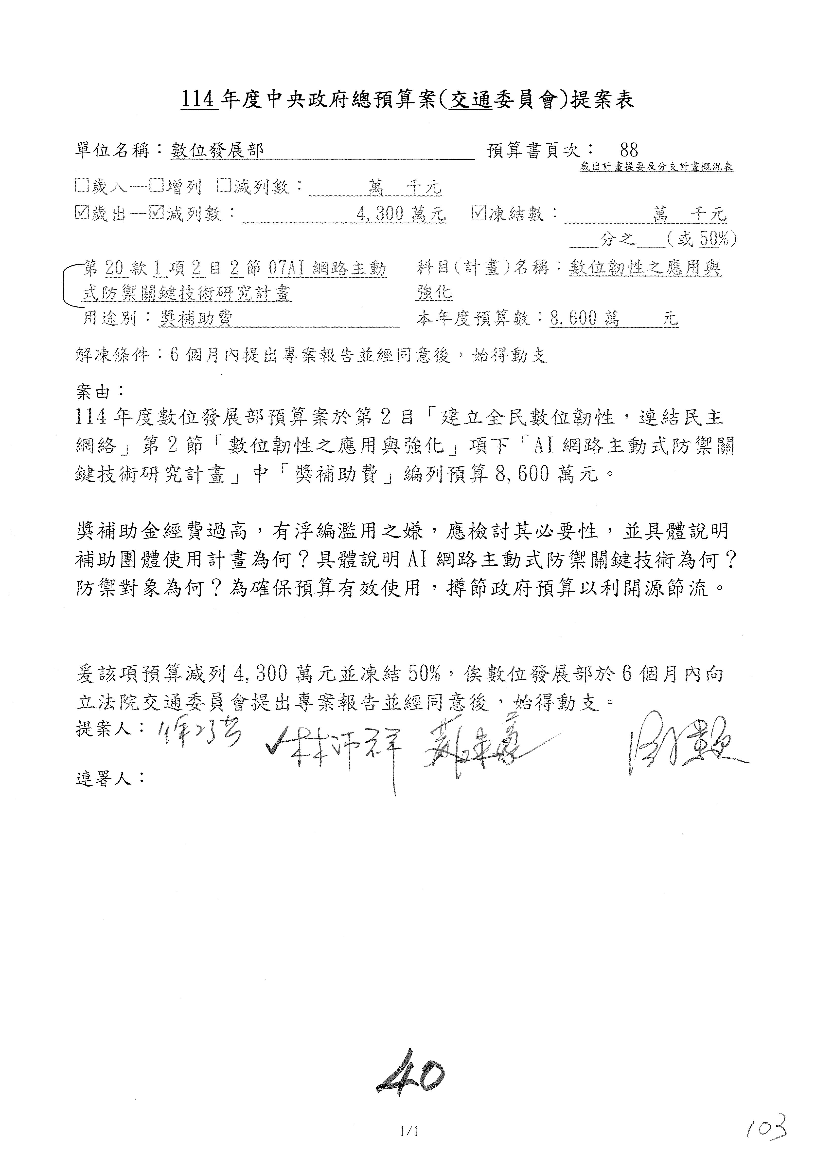謝謝各位委員,現在請拿出最大本的,這應該算是今天最厚的,也請各位翻開數位發展部114年度單位預算─建議併案及預算表,待會審理預算按照這個併案審理的順序來審理。