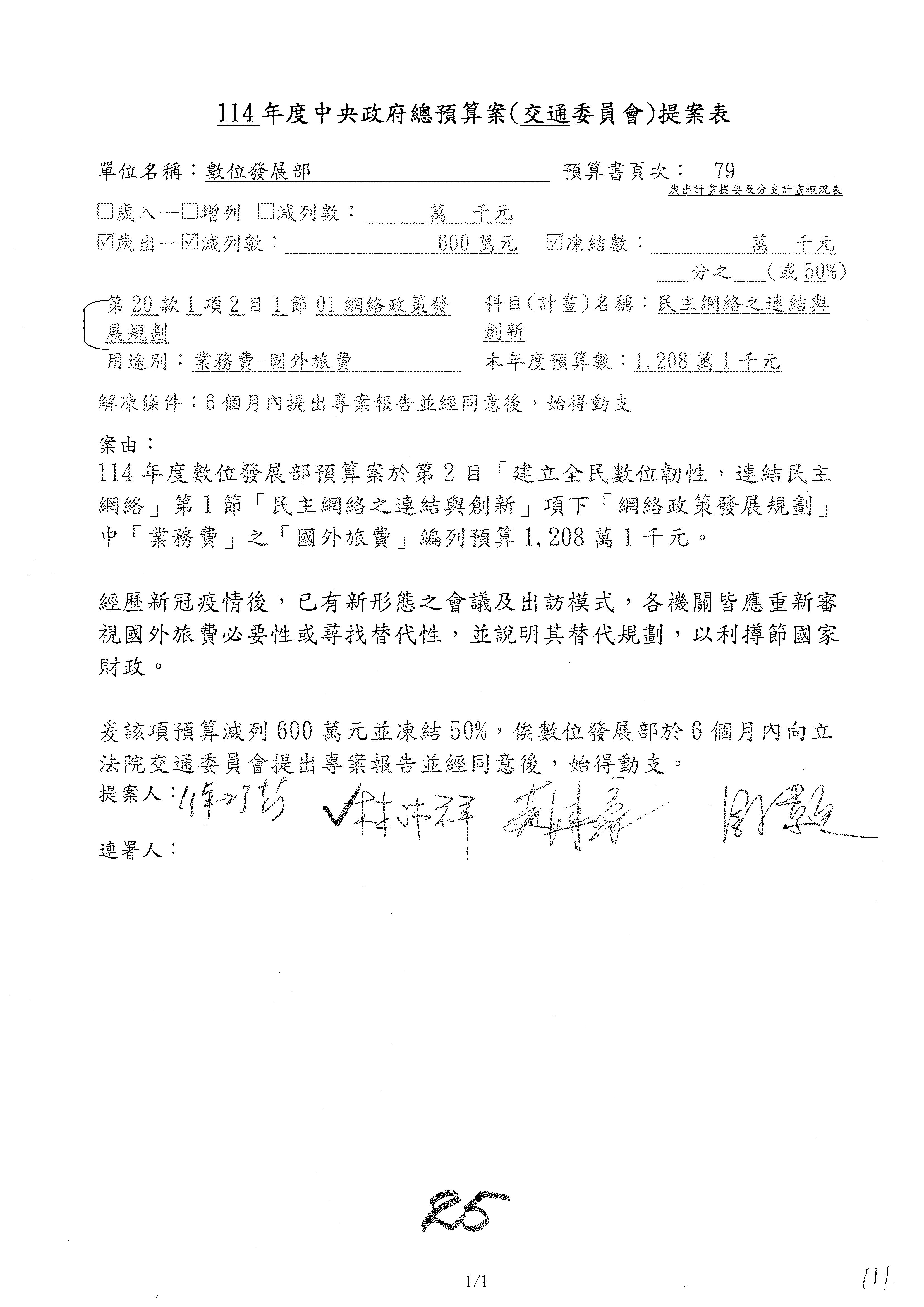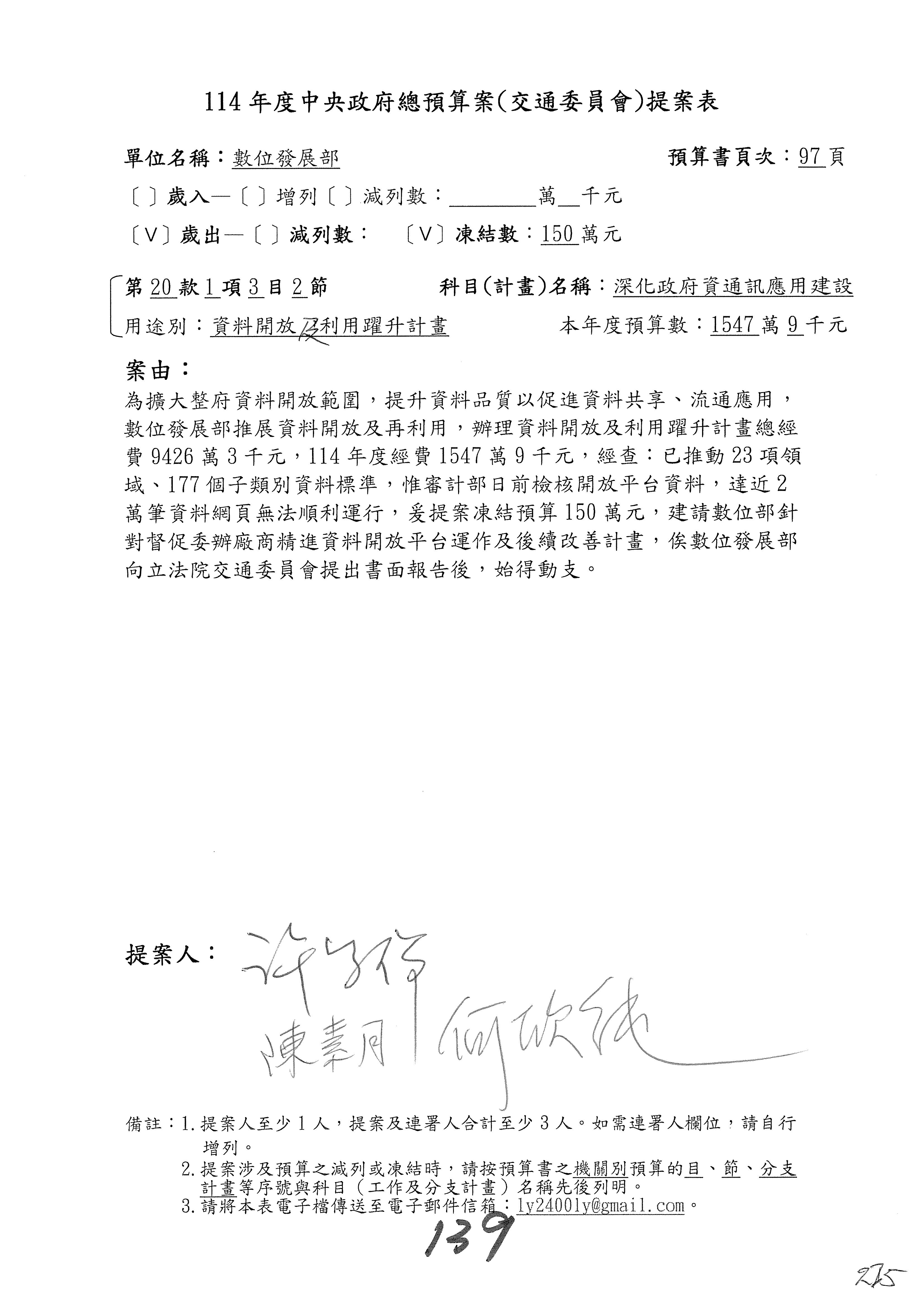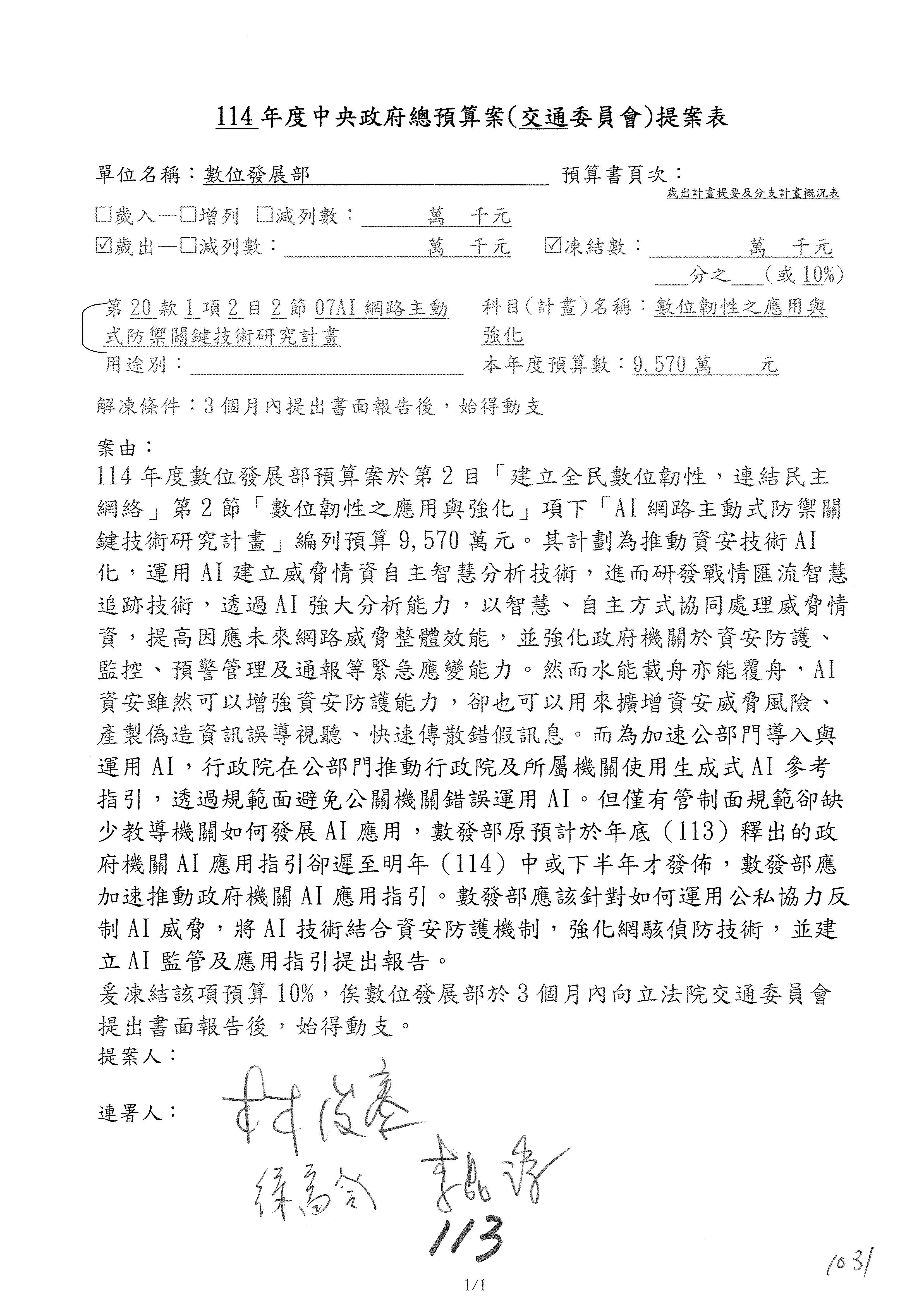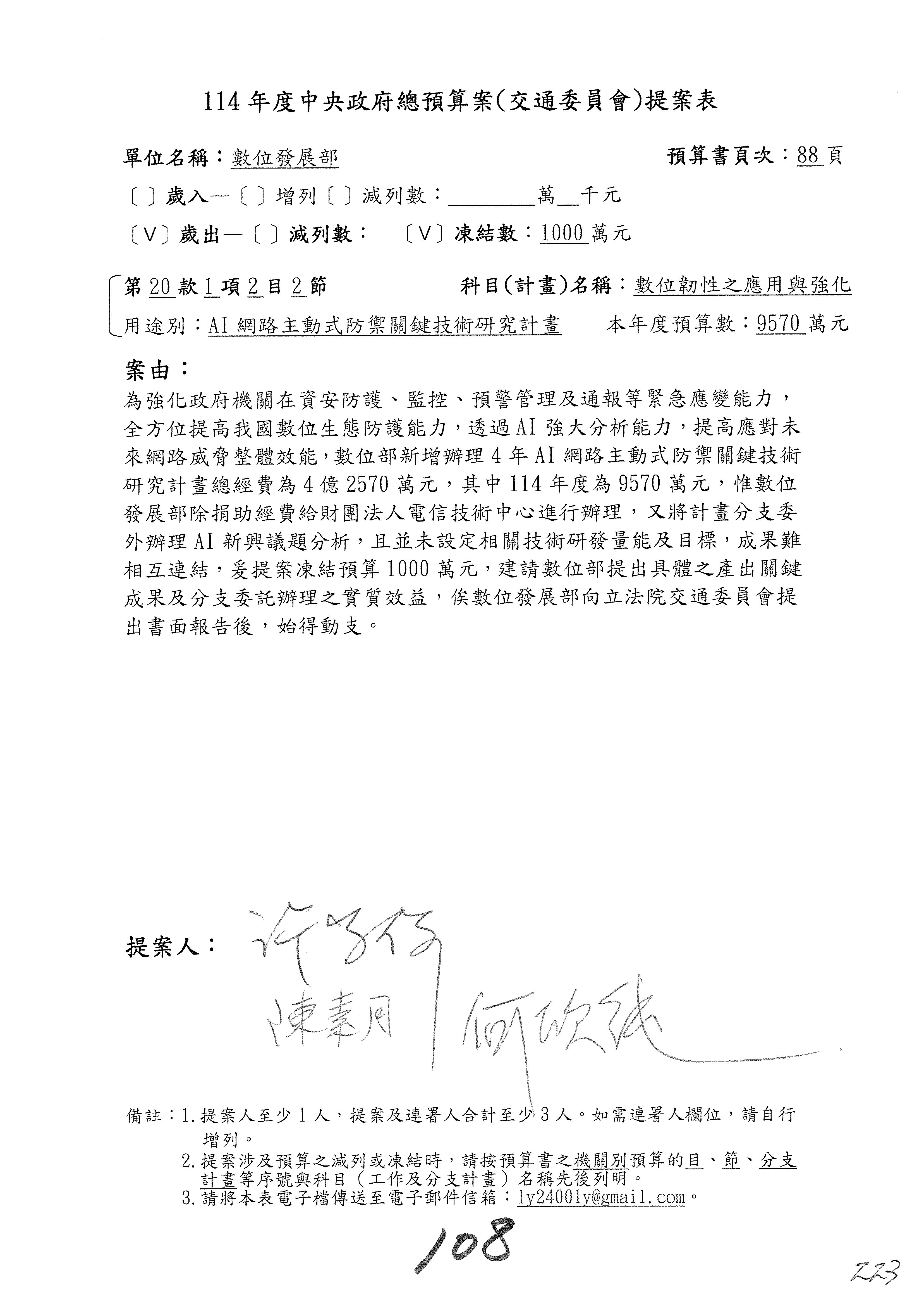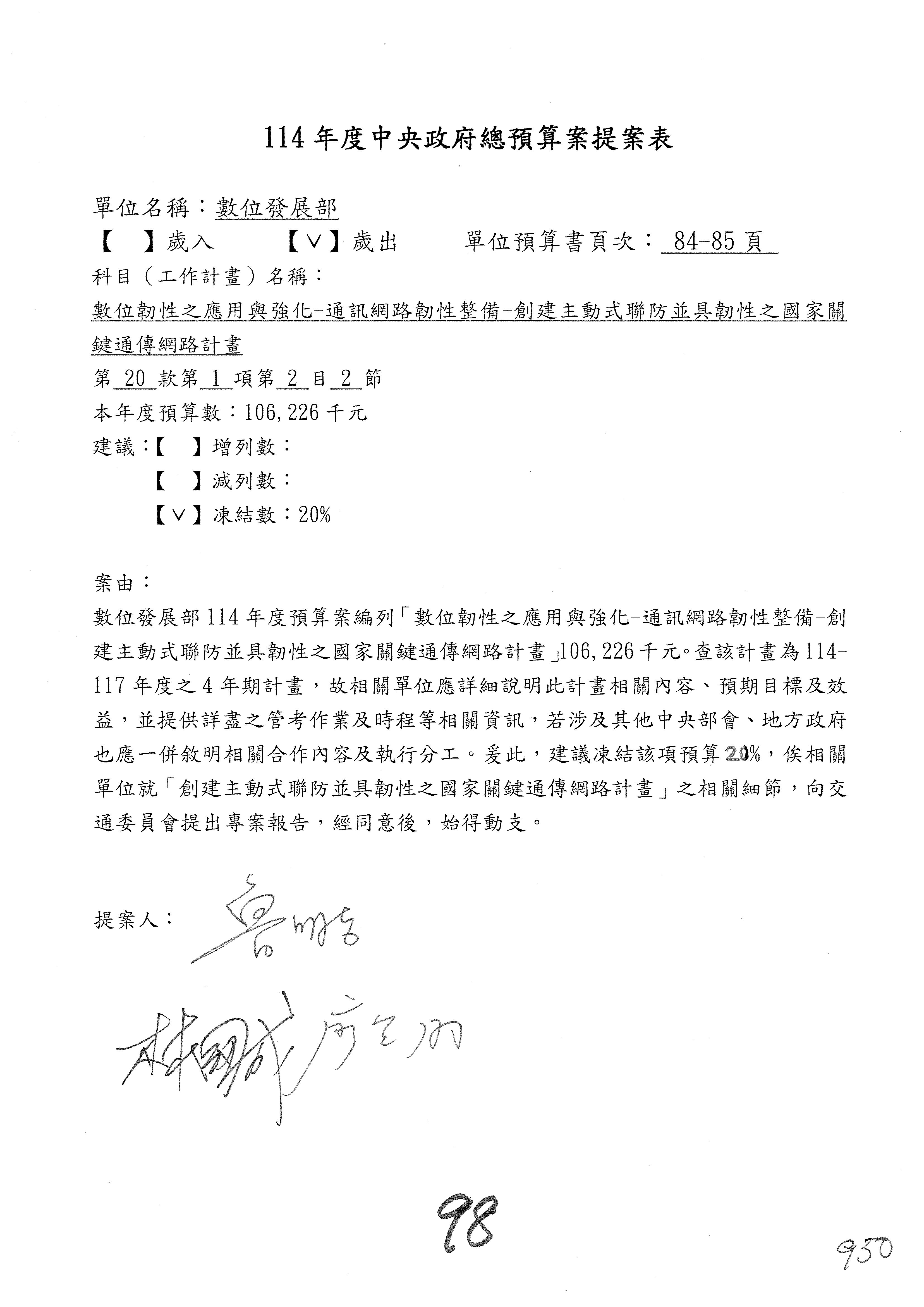 謝謝各位委員,現在請拿出最大本的,這應該算是今天最厚的,也請各位翻開數位發展部114年度單位預算─建議併案及預算表,待會審理預算按照這個併案審理的順序來審理。