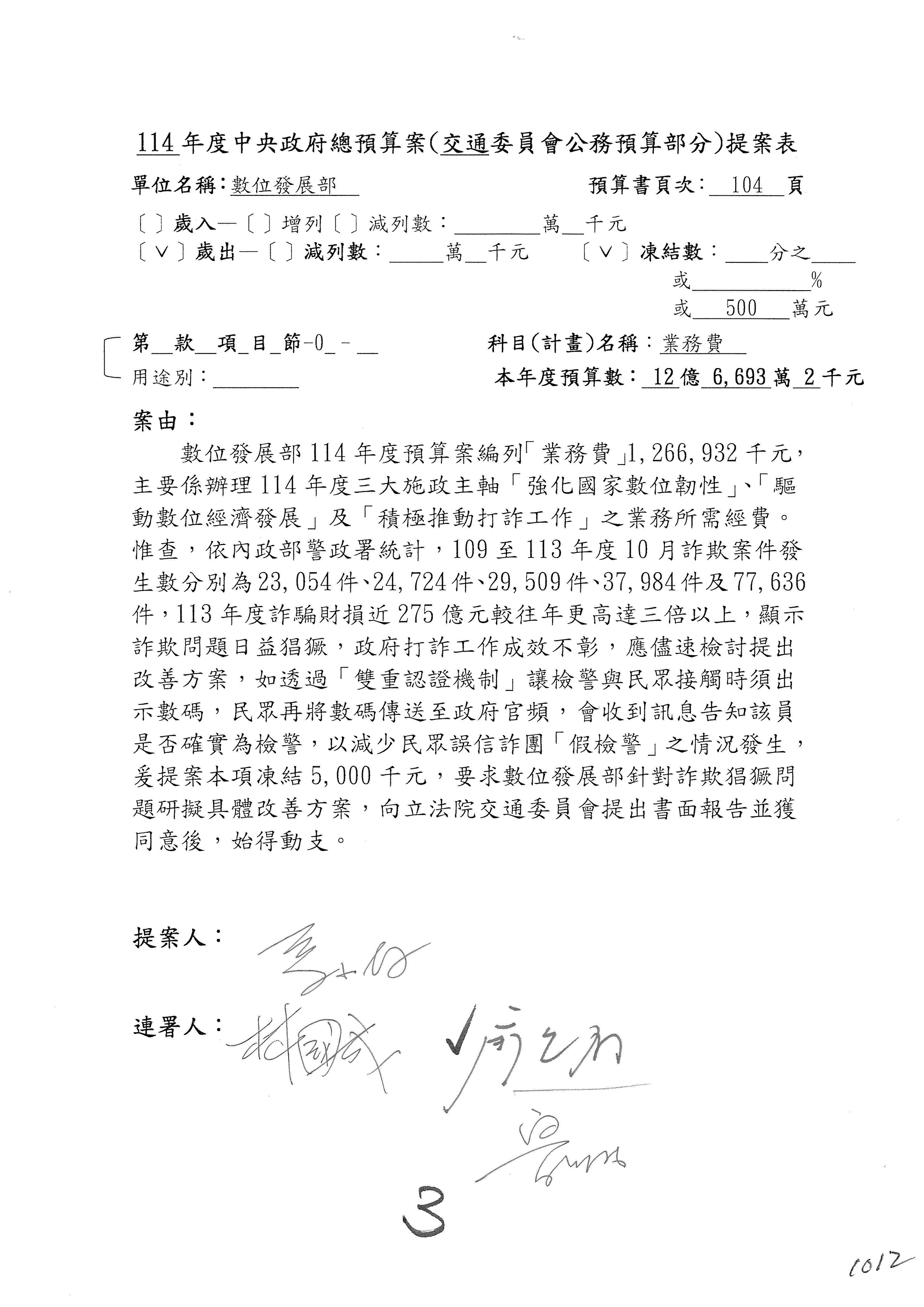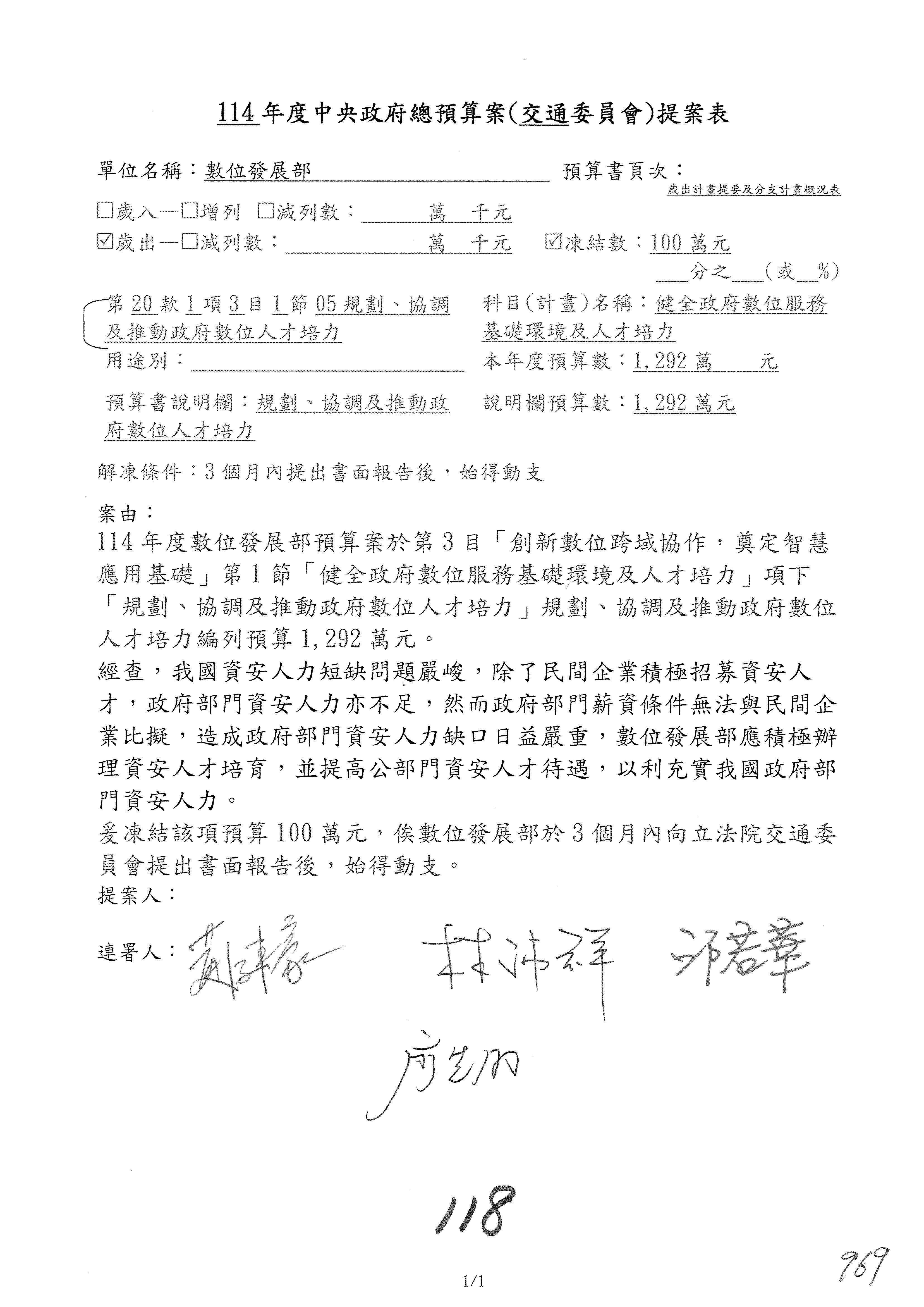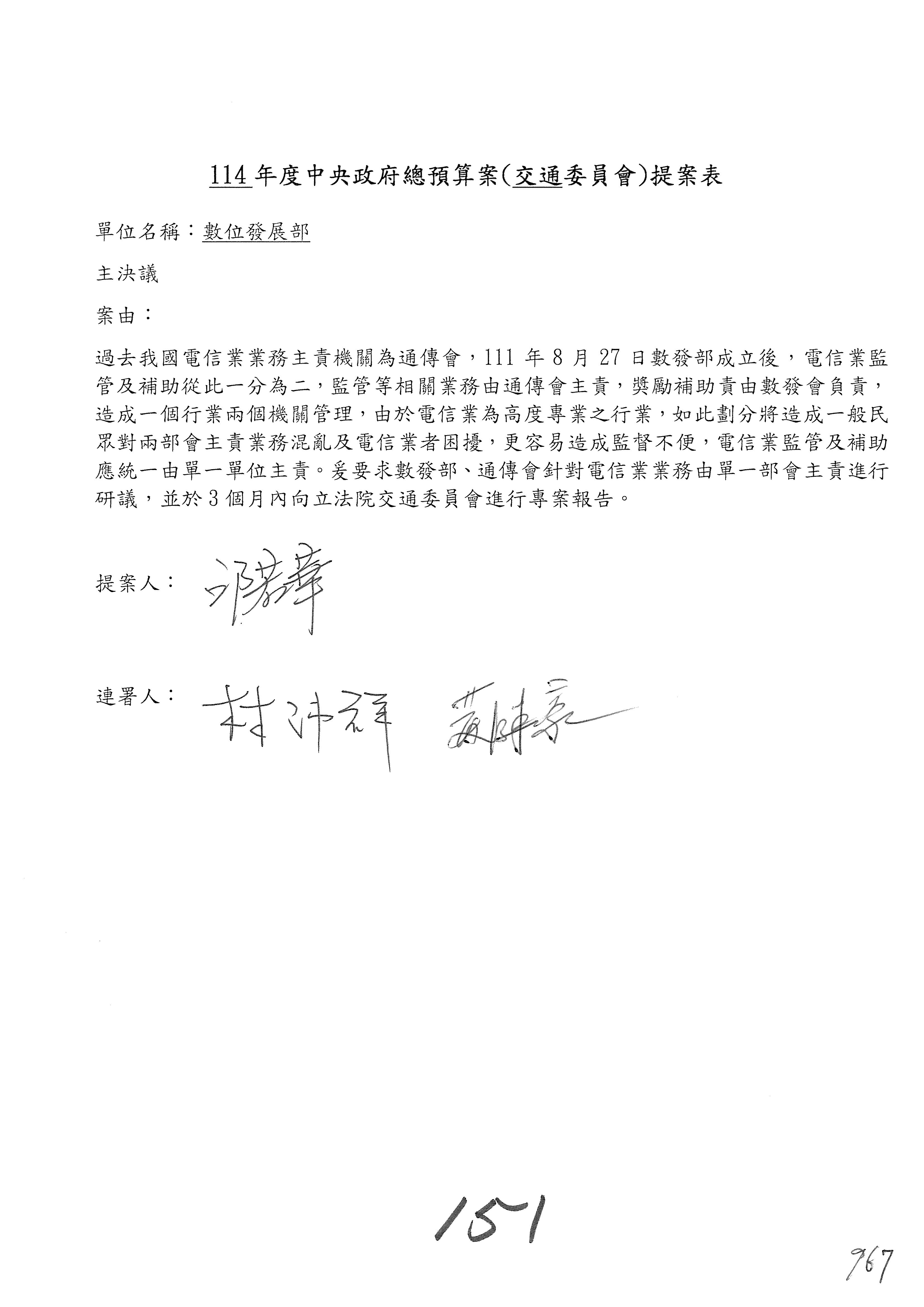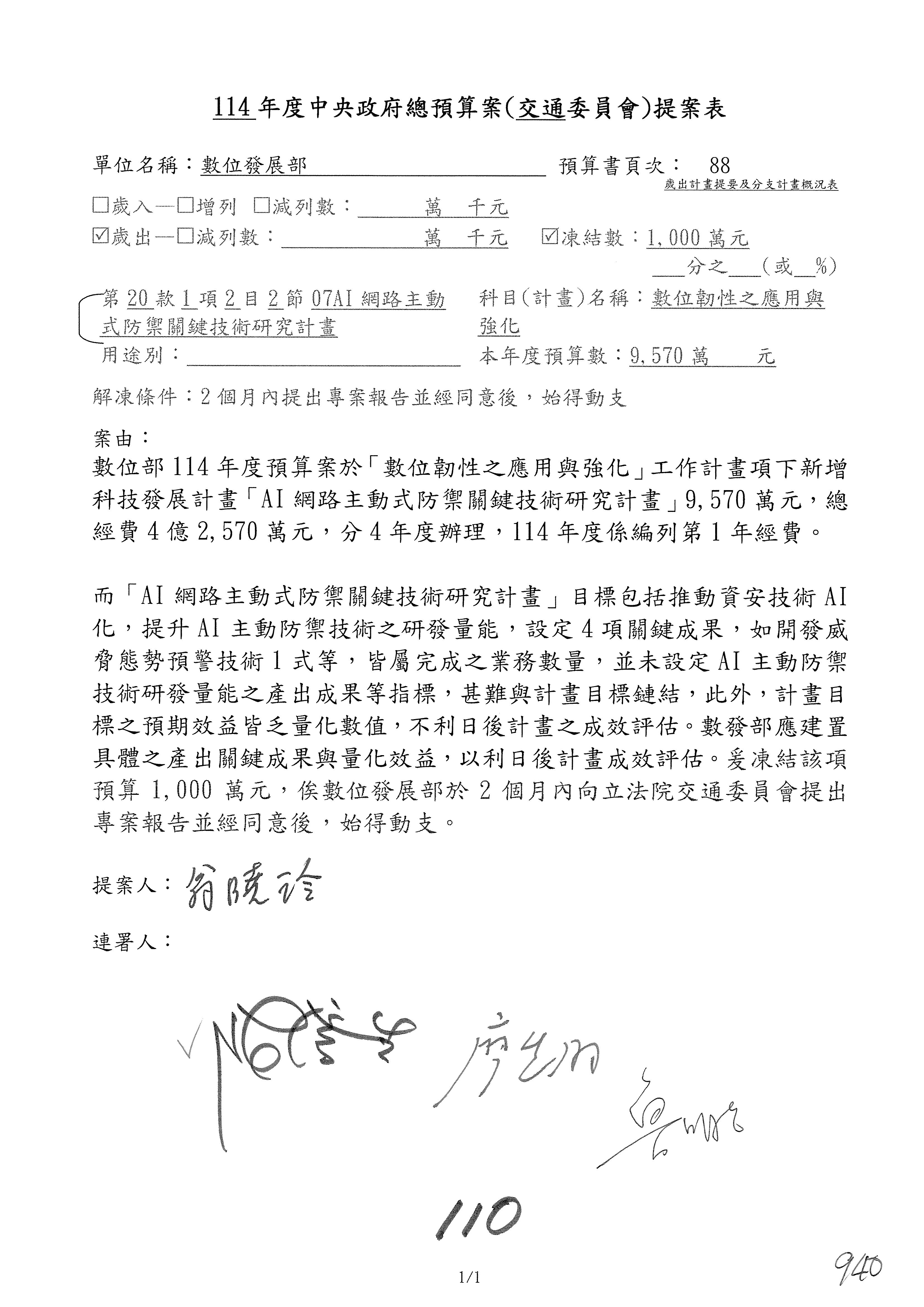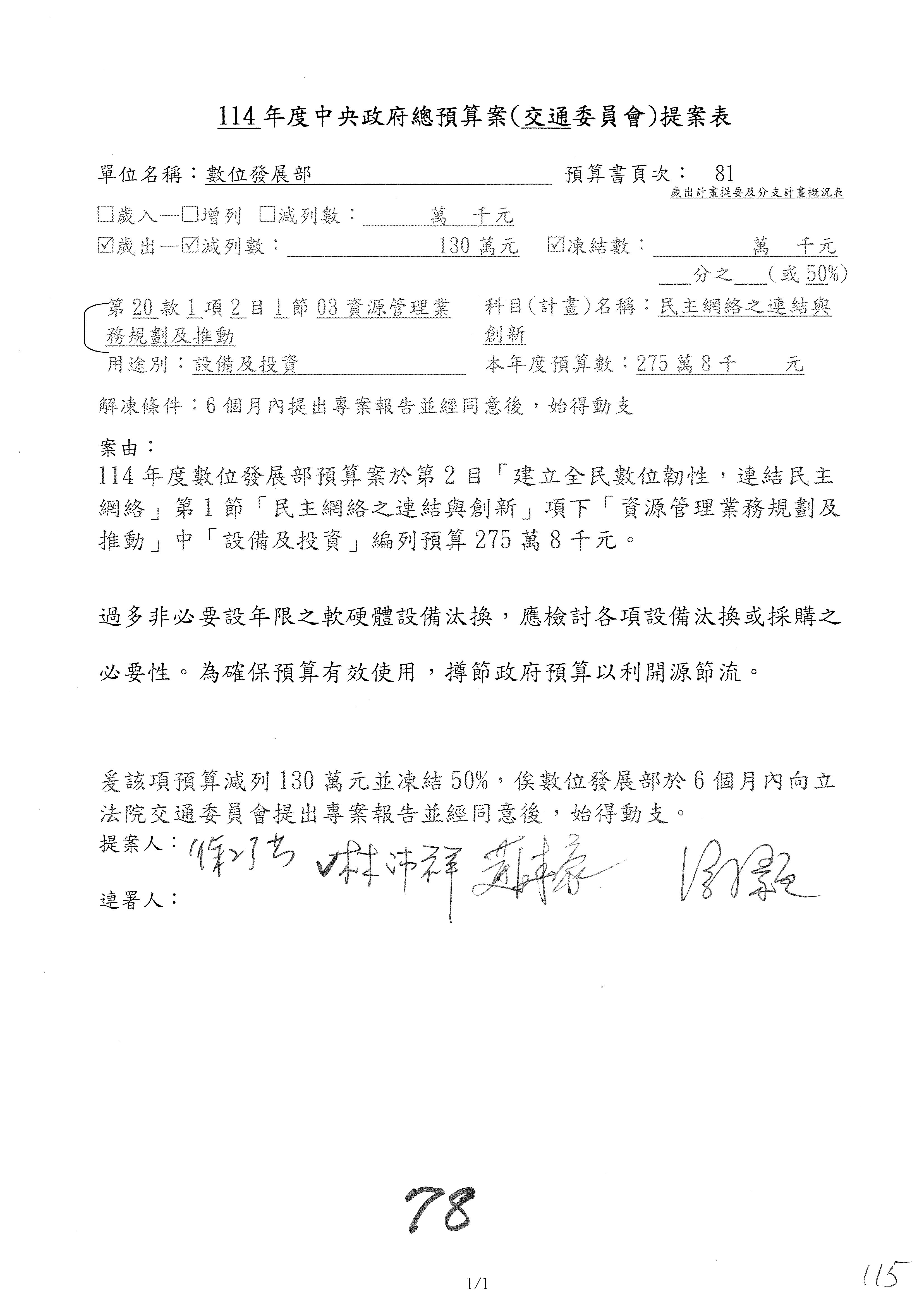 謝謝各位委員,現在請拿出最大本的,這應該算是今天最厚的,也請各位翻開數位發展部114年度單位預算─建議併案及預算表,待會審理預算按照這個併案審理的順序來審理。