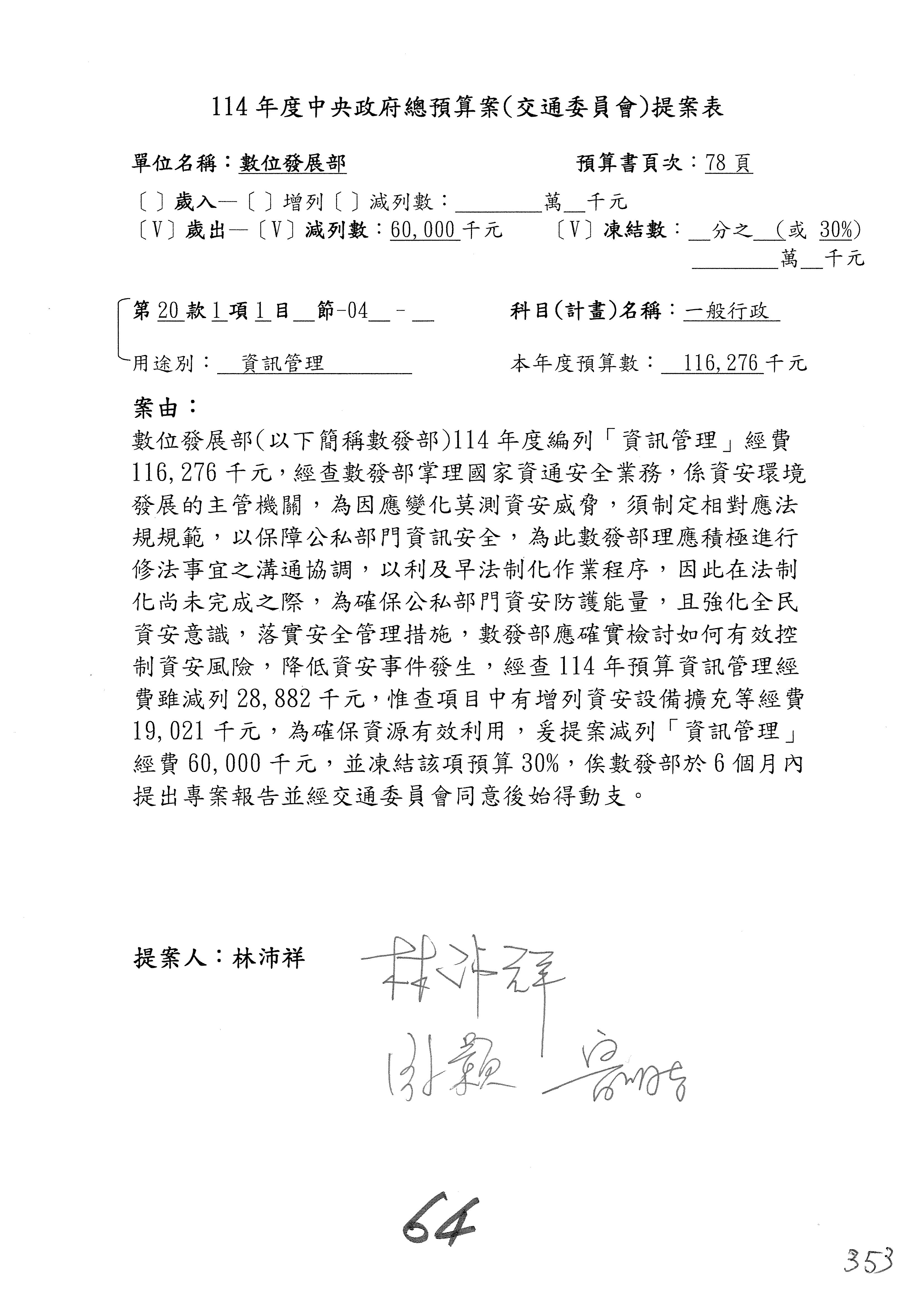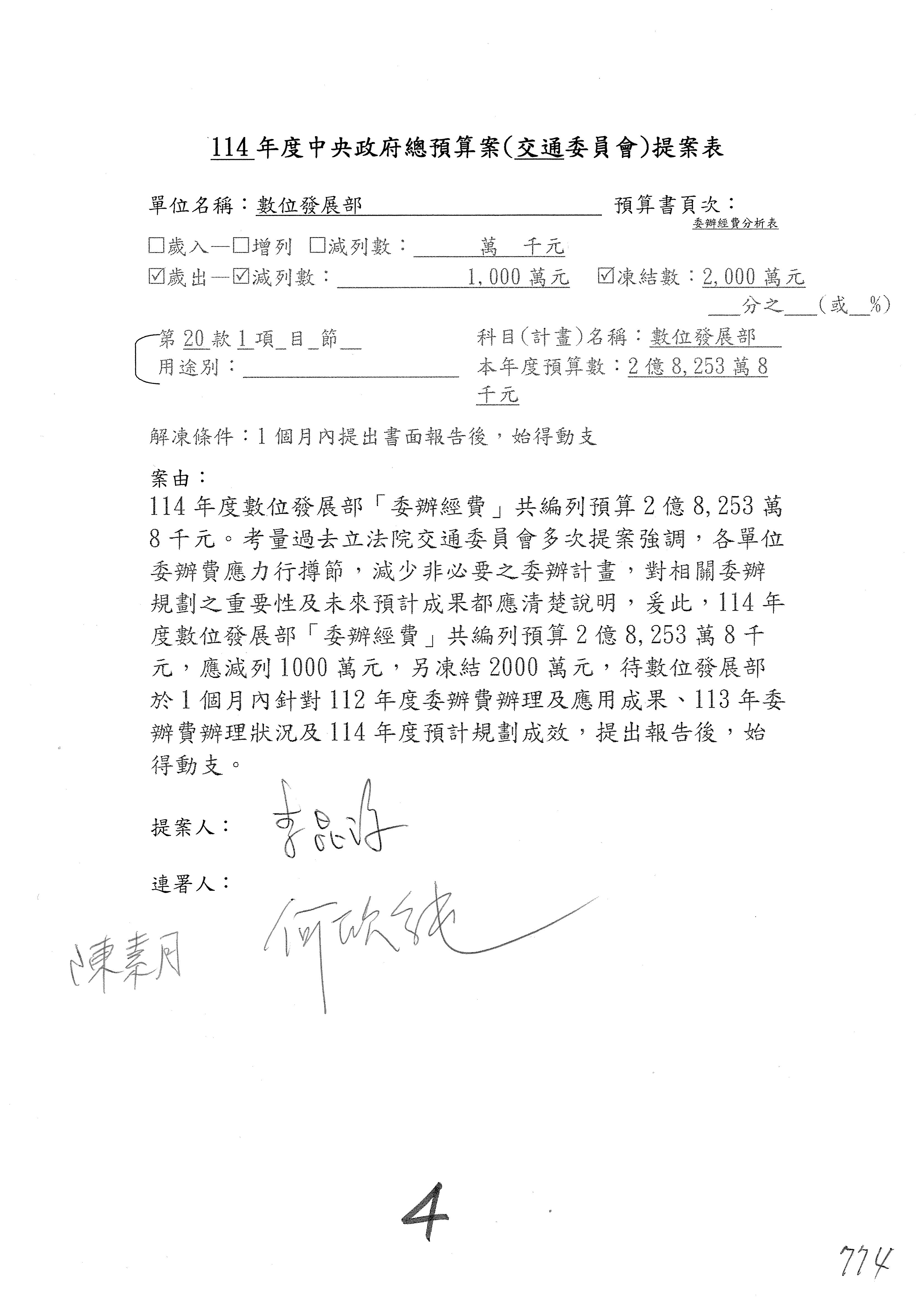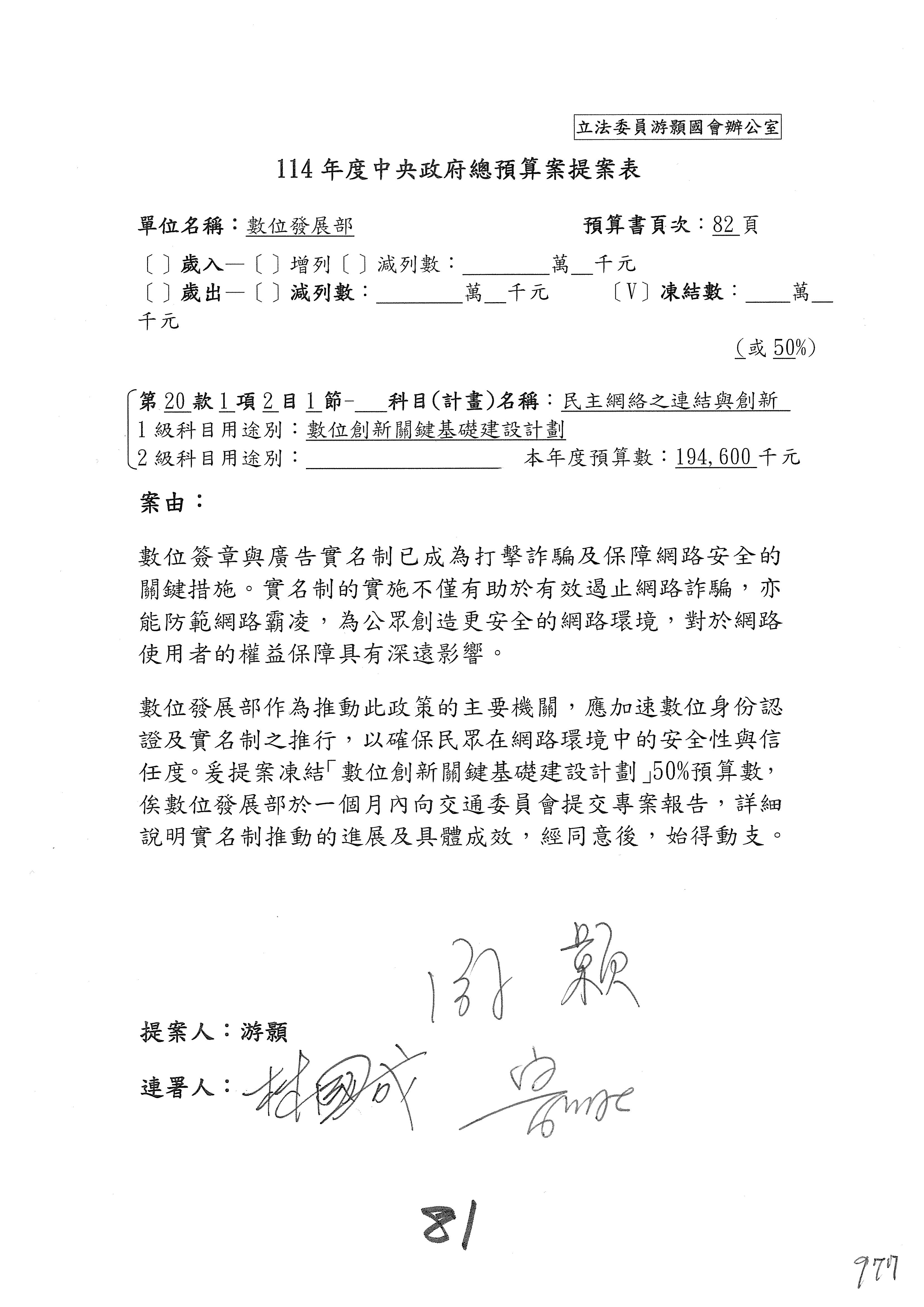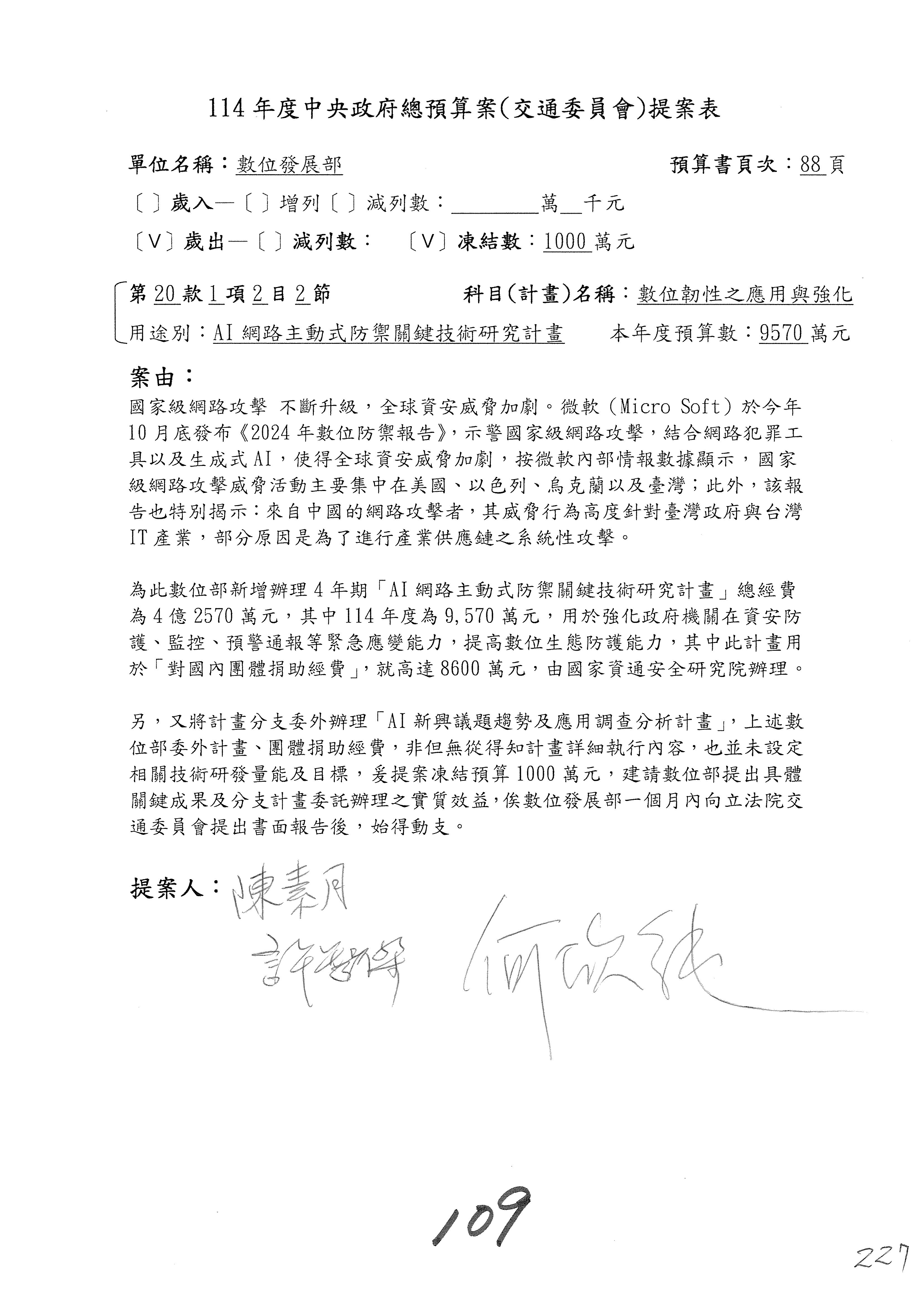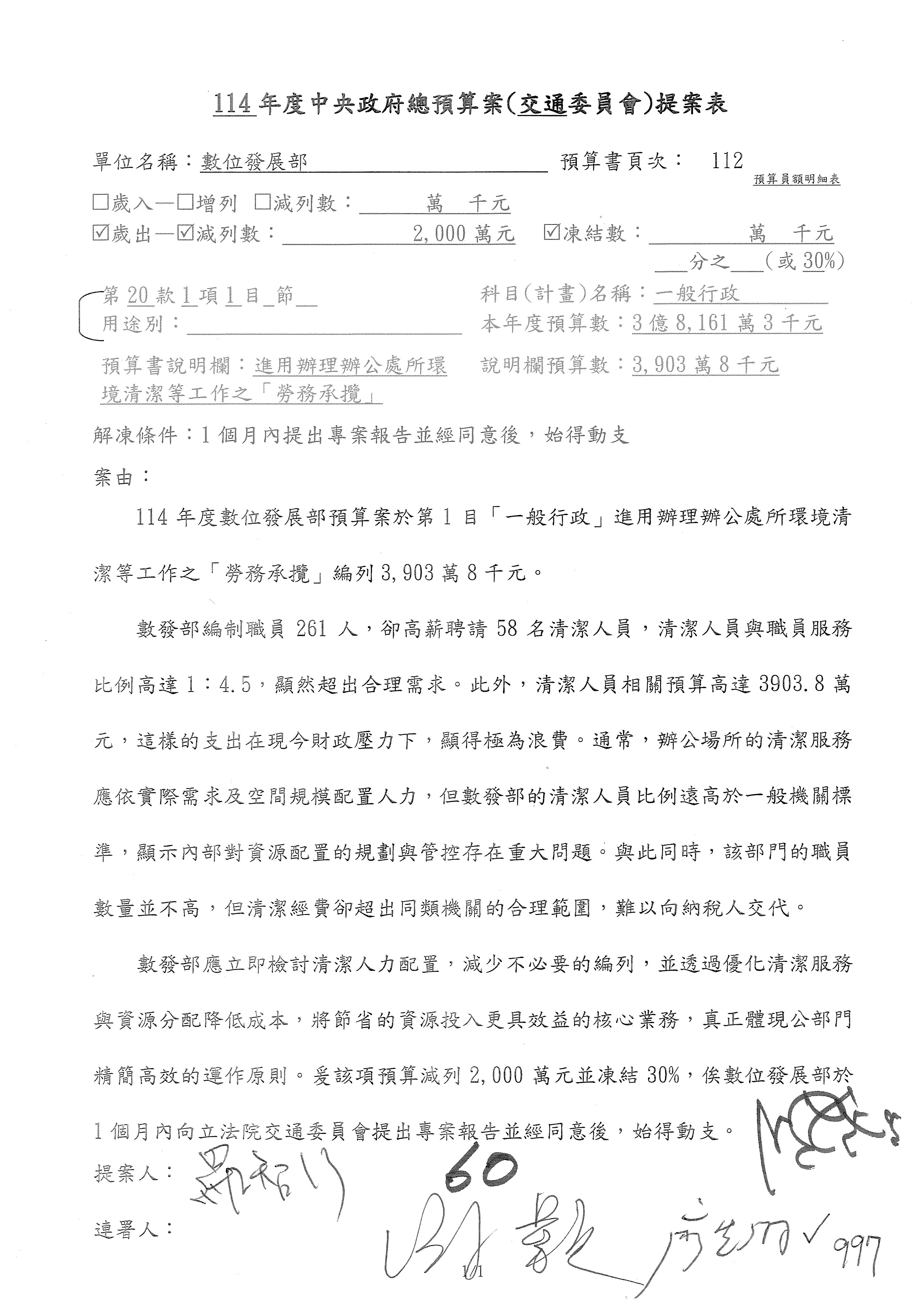 謝謝各位委員,現在請拿出最大本的,這應該算是今天最厚的,也請各位翻開數位發展部114年度單位預算─建議併案及預算表,待會審理預算按照這個併案審理的順序來審理。