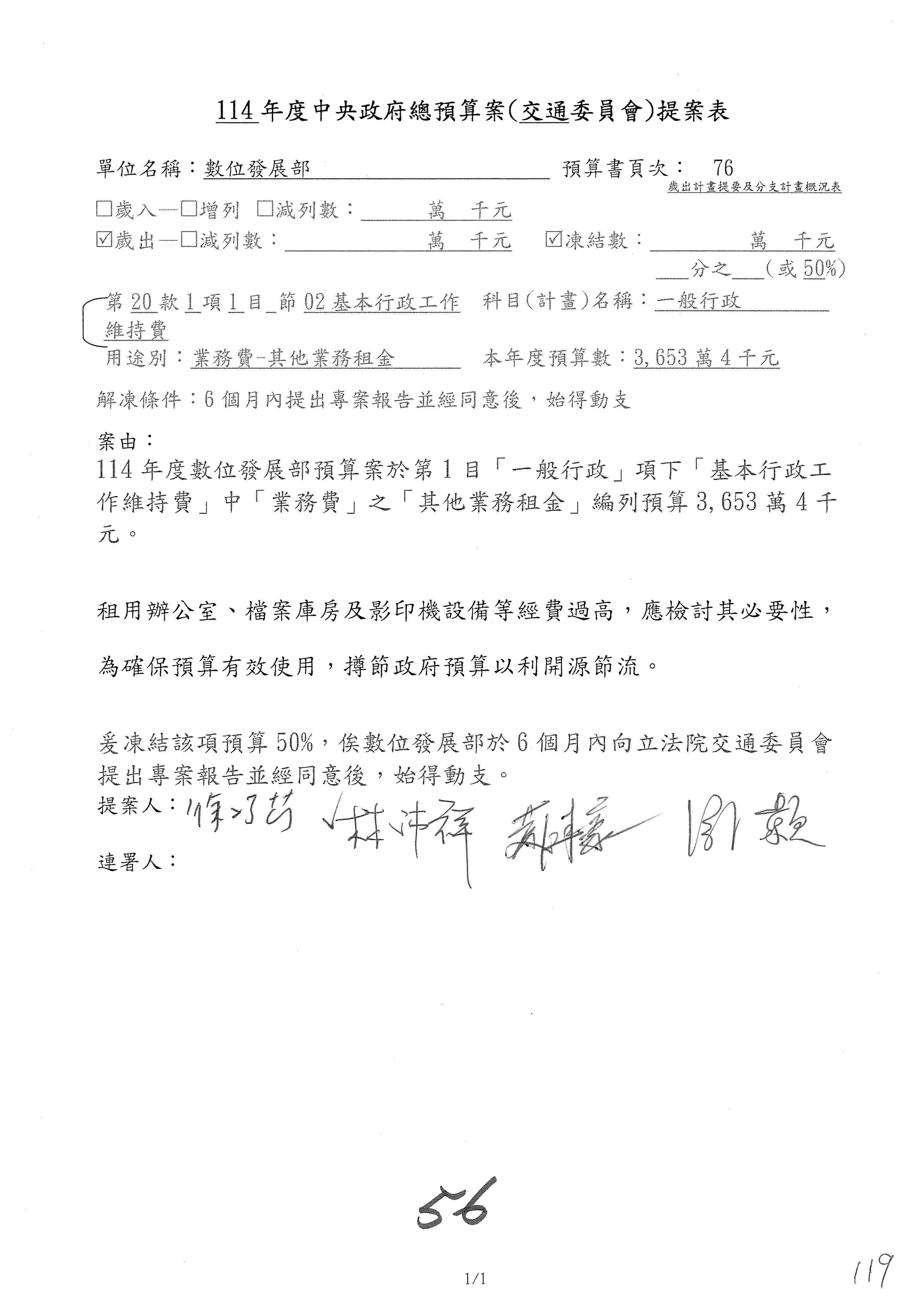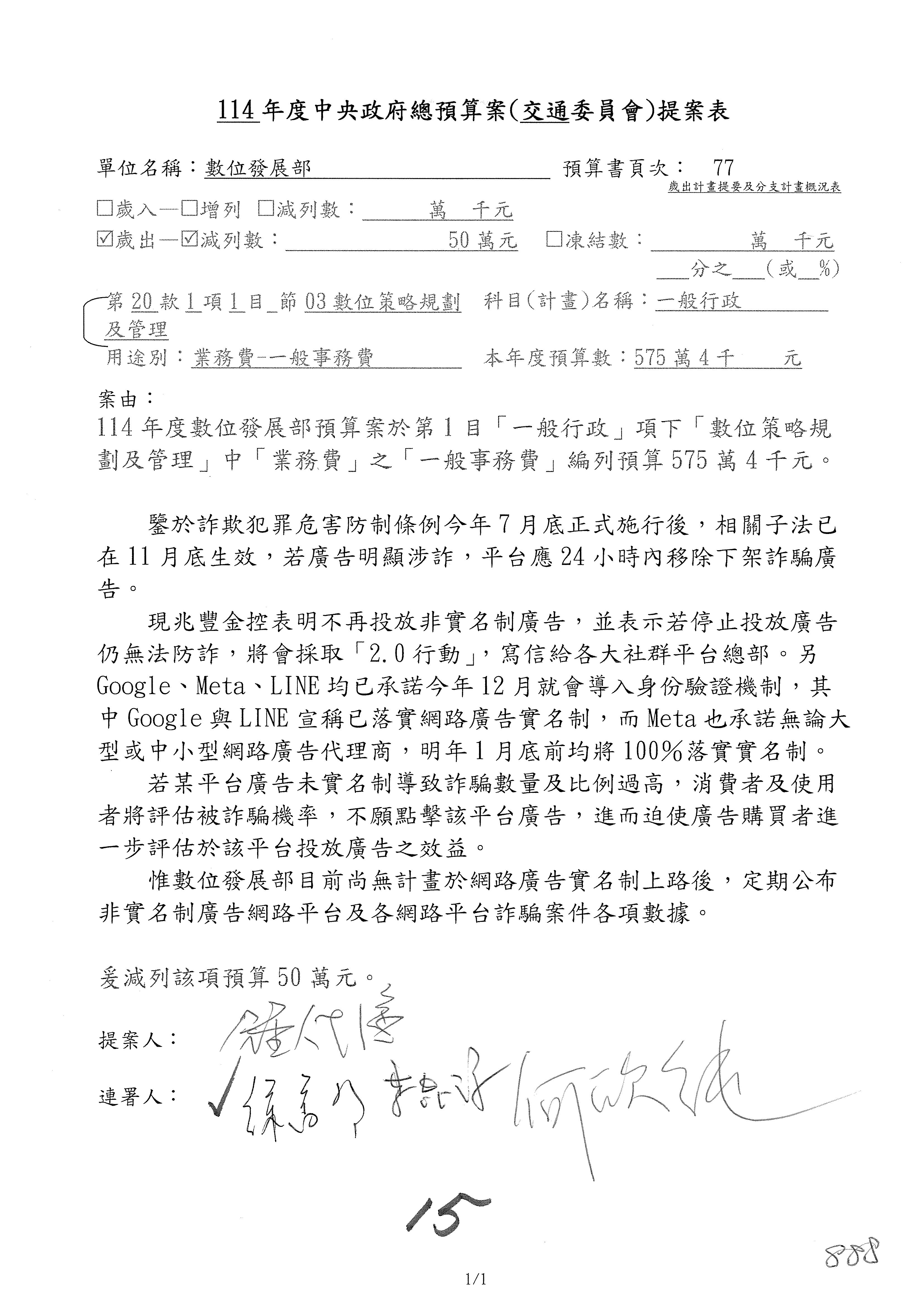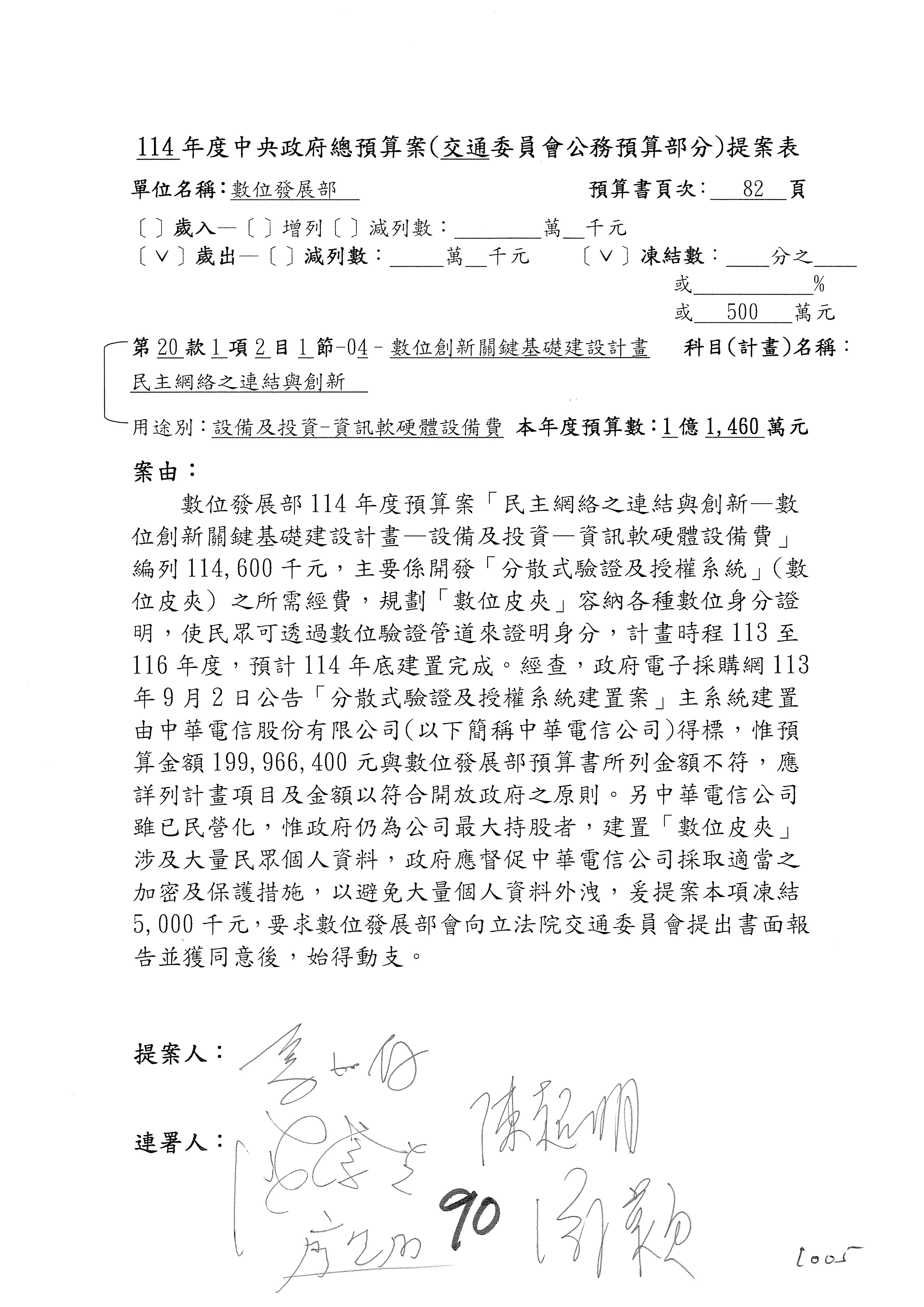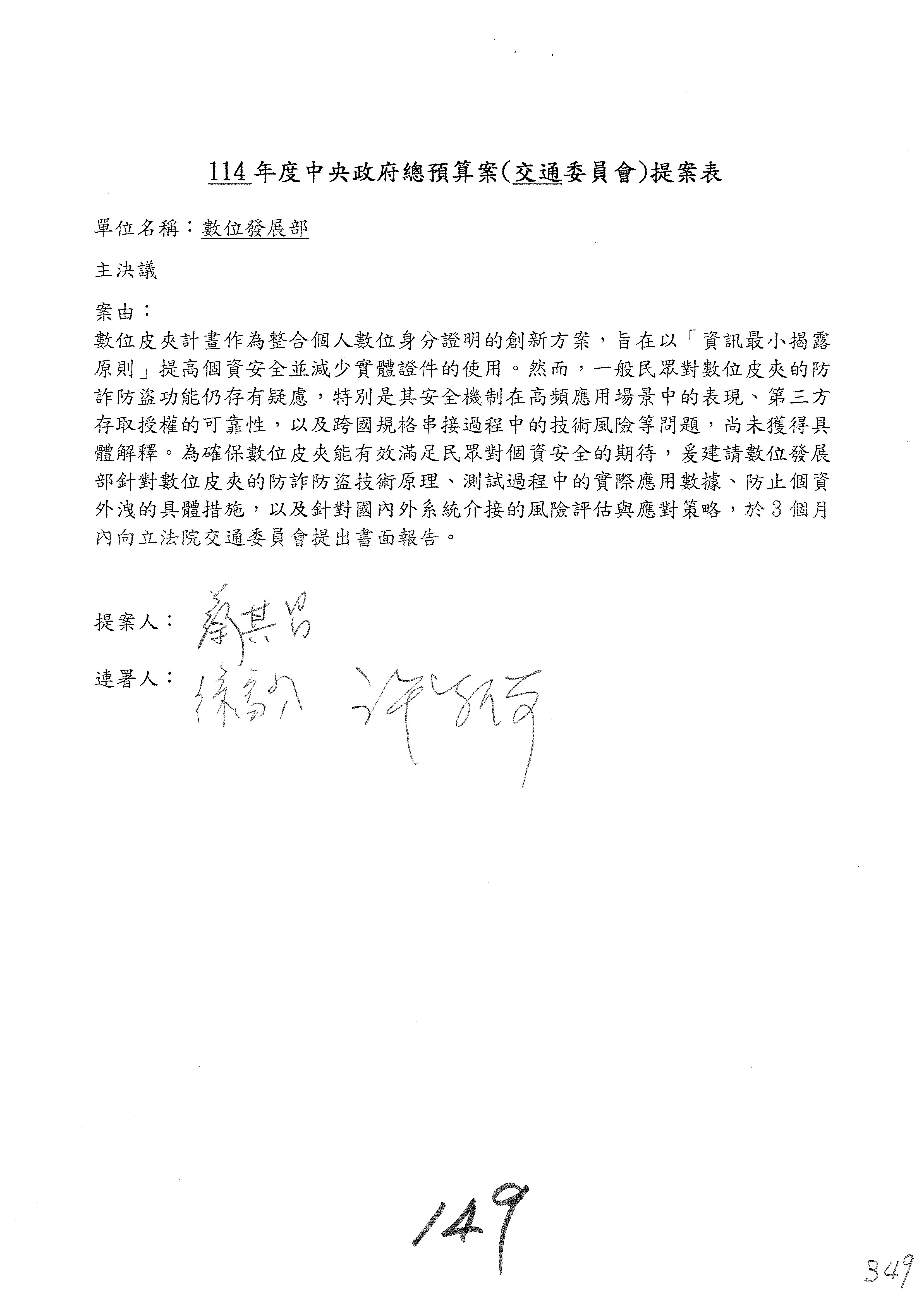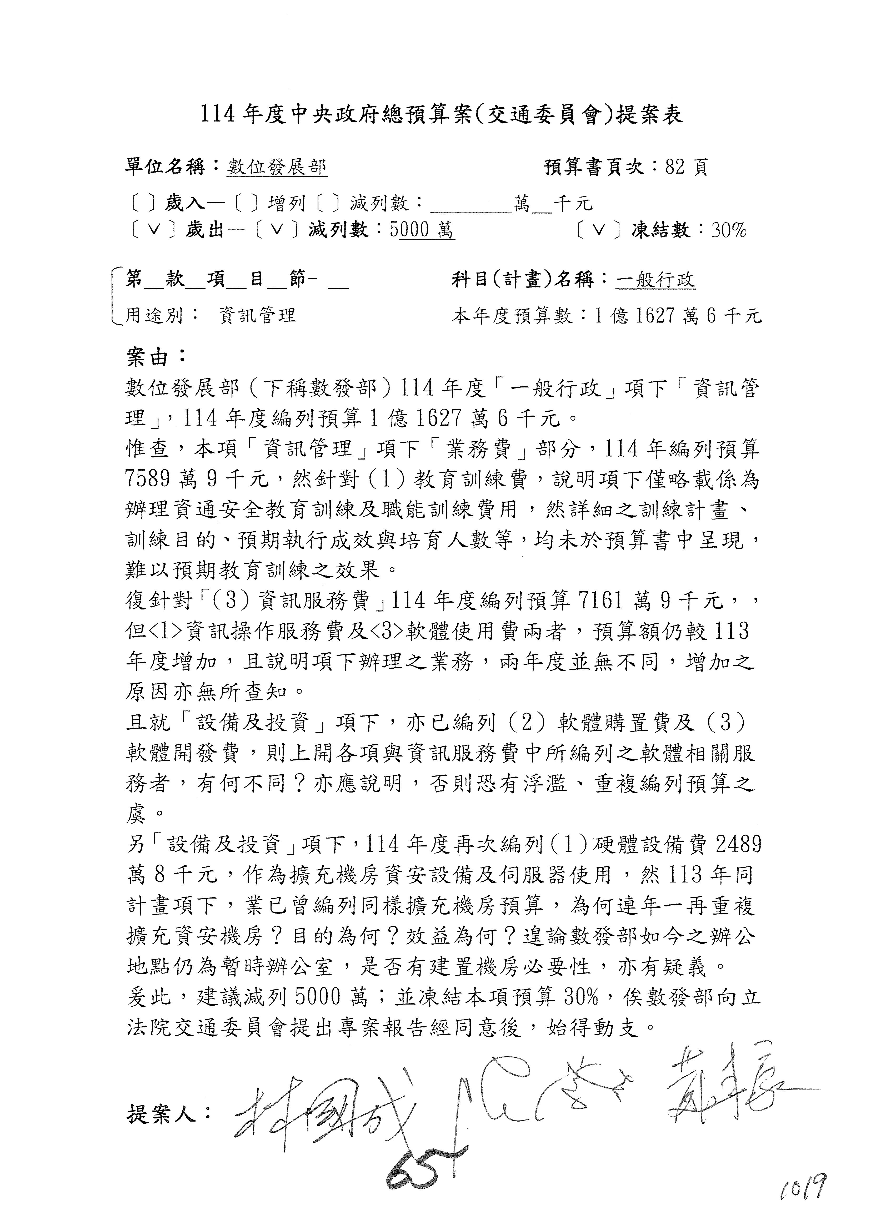 謝謝各位委員,現在請拿出最大本的,這應該算是今天最厚的,也請各位翻開數位發展部114年度單位預算─建議併案及預算表,待會審理預算按照這個併案審理的順序來審理。