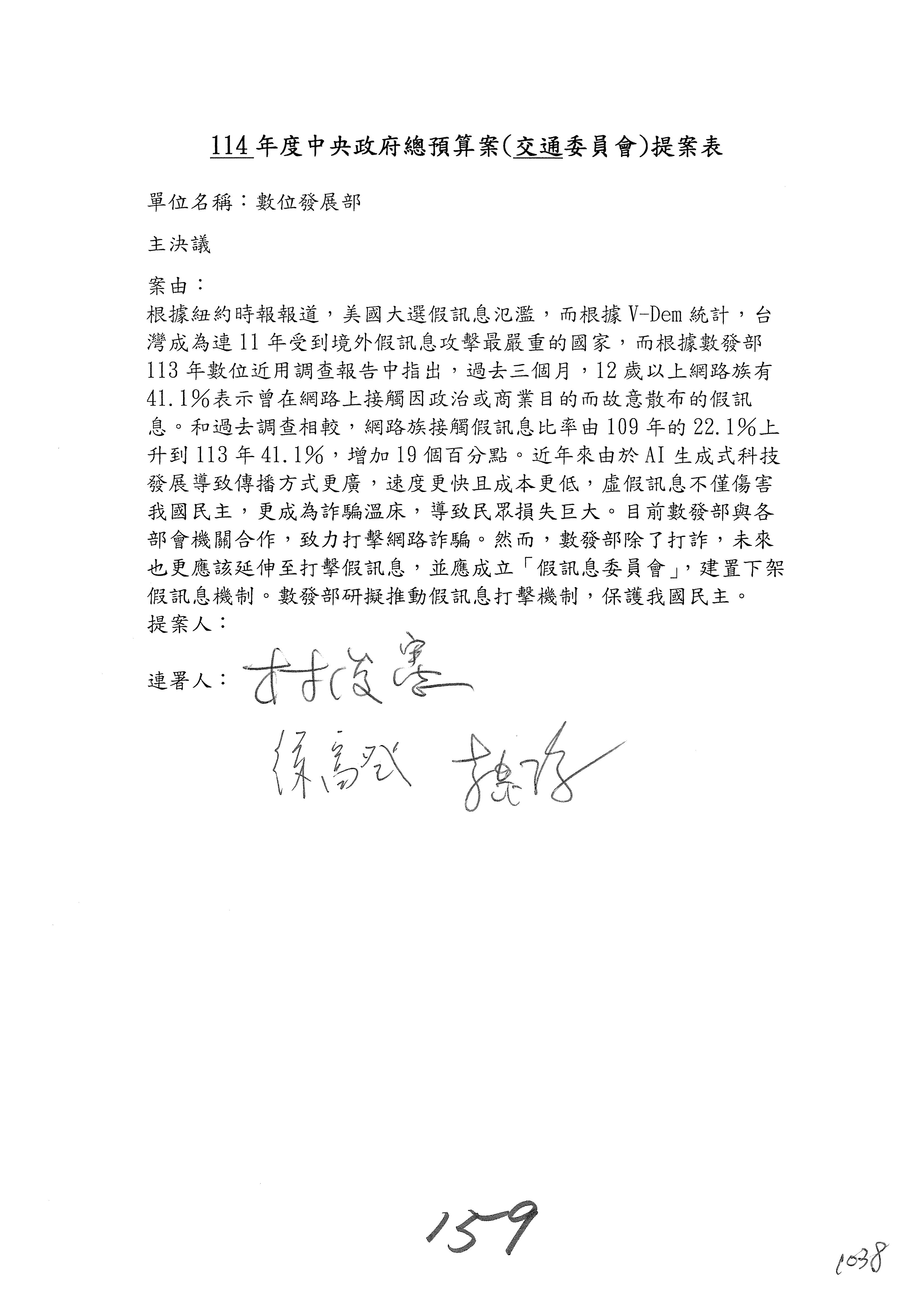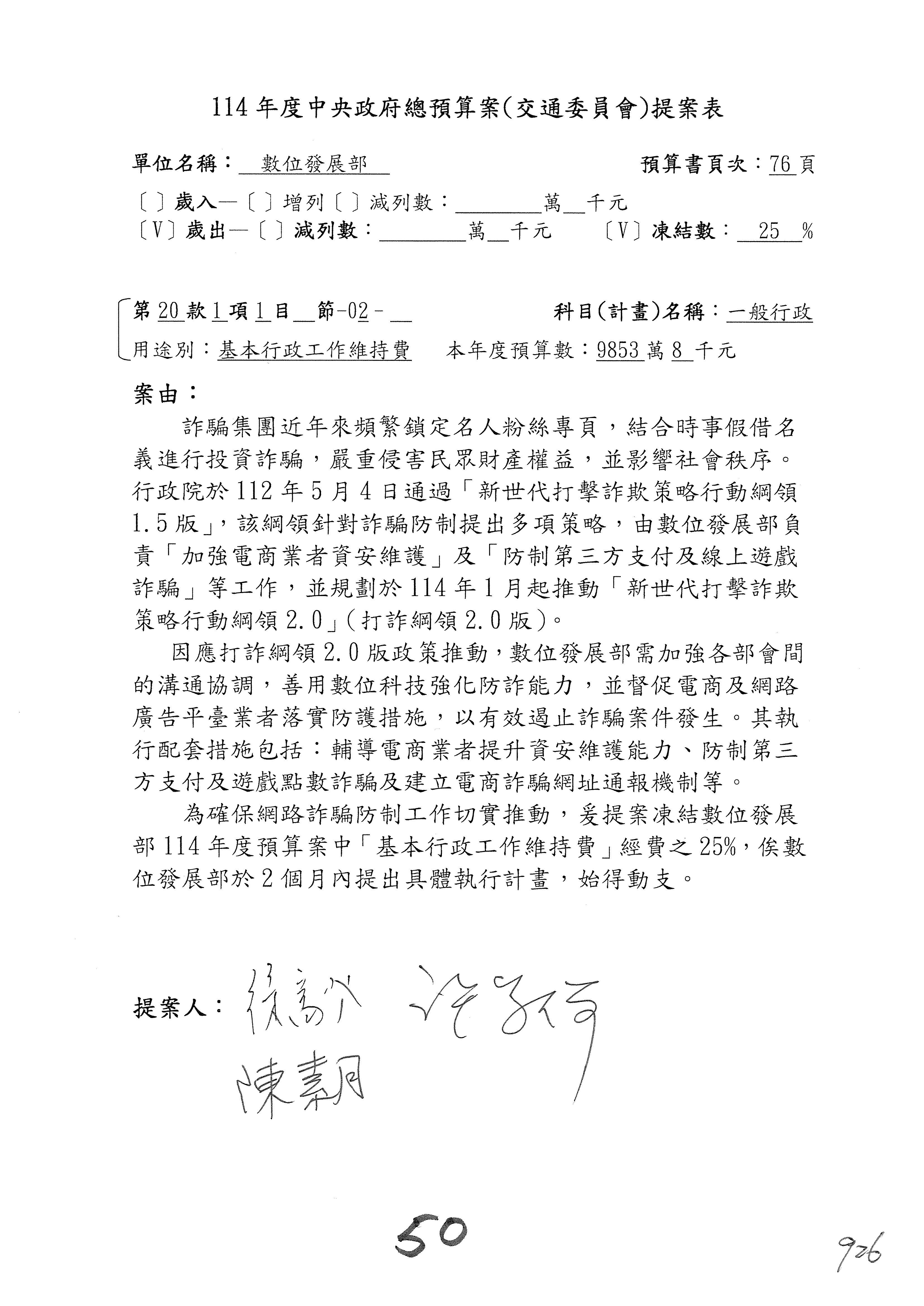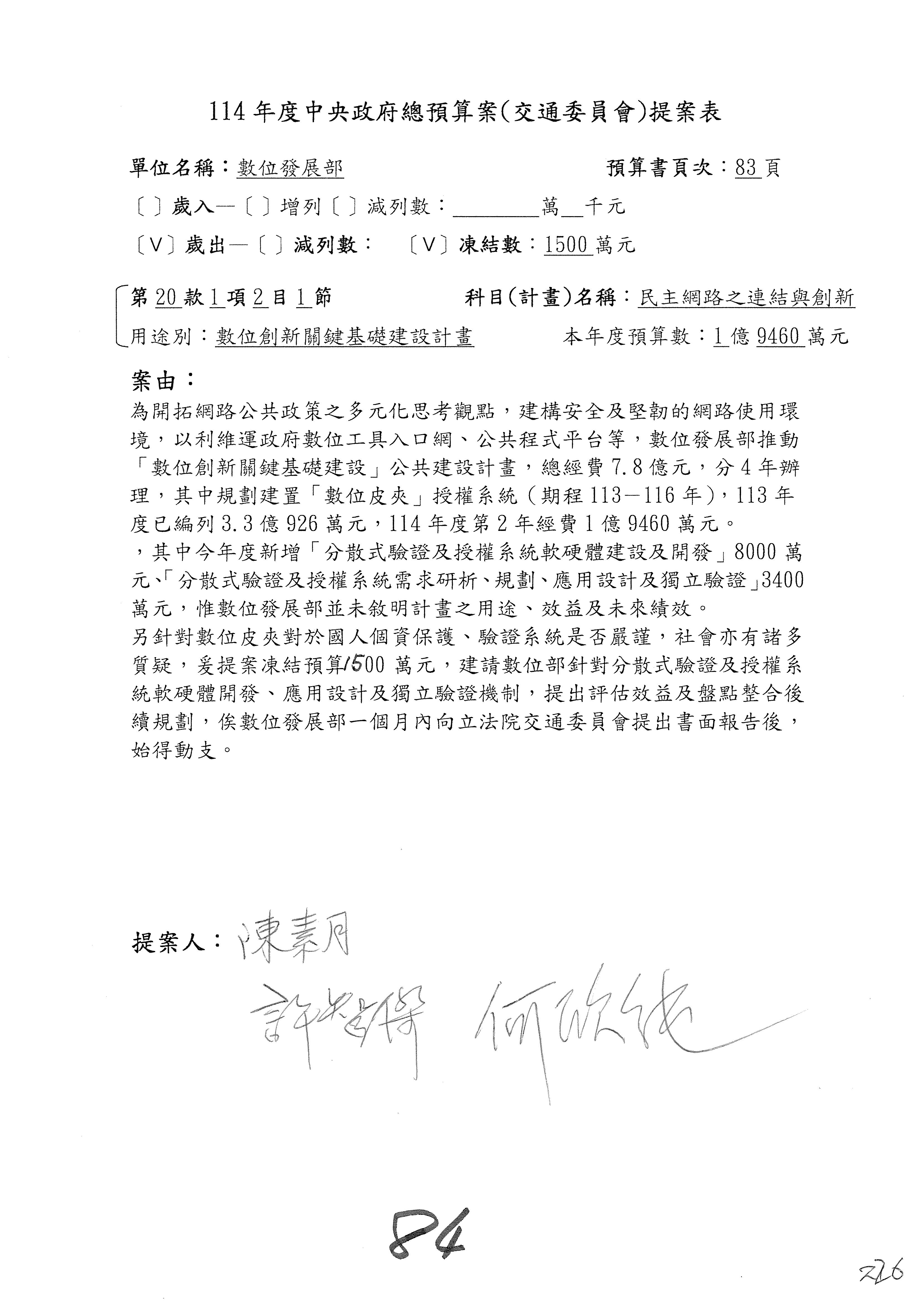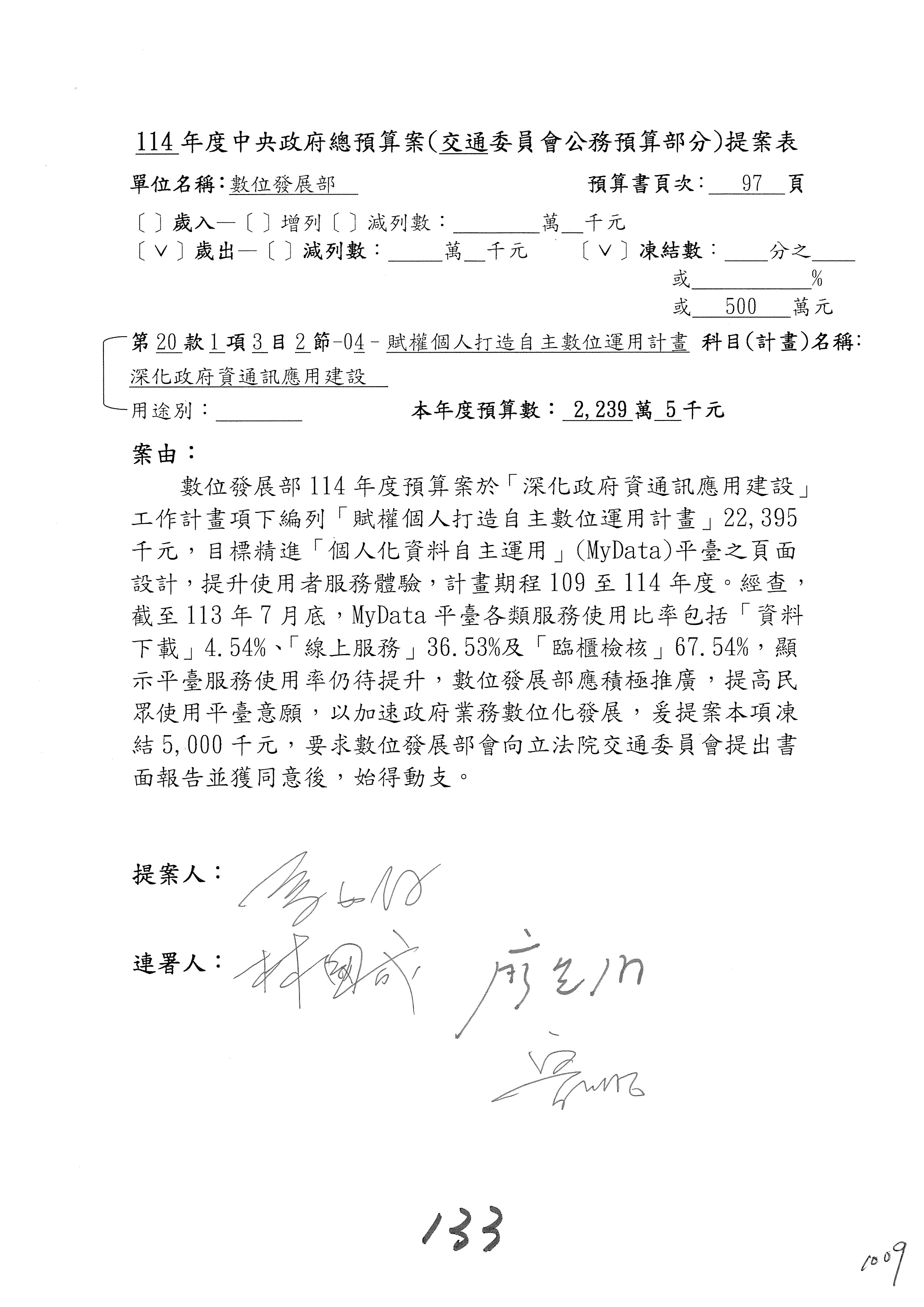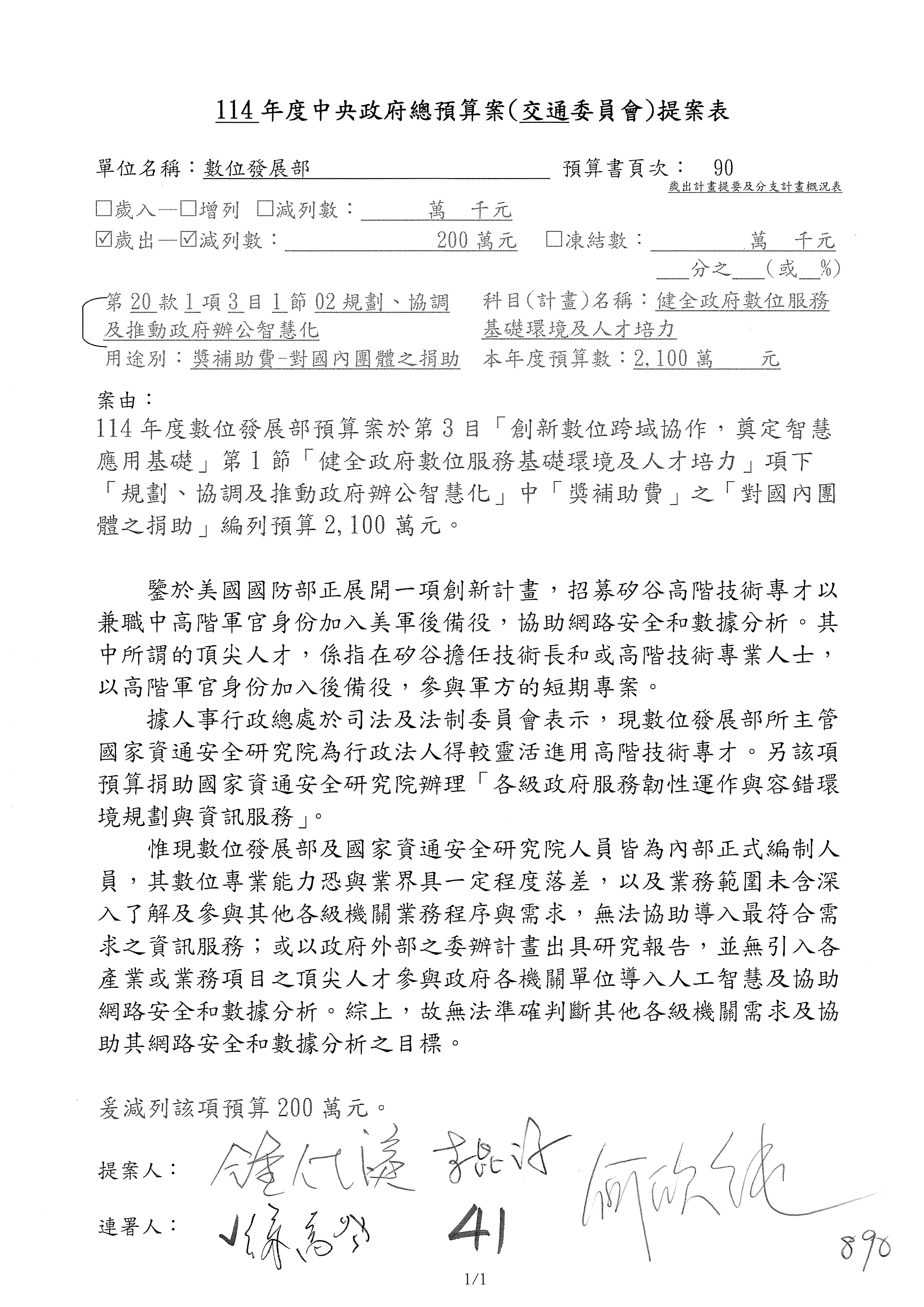 謝謝各位委員,現在請拿出最大本的,這應該算是今天最厚的,也請各位翻開數位發展部114年度單位預算─建議併案及預算表,待會審理預算按照這個併案審理的順序來審理。