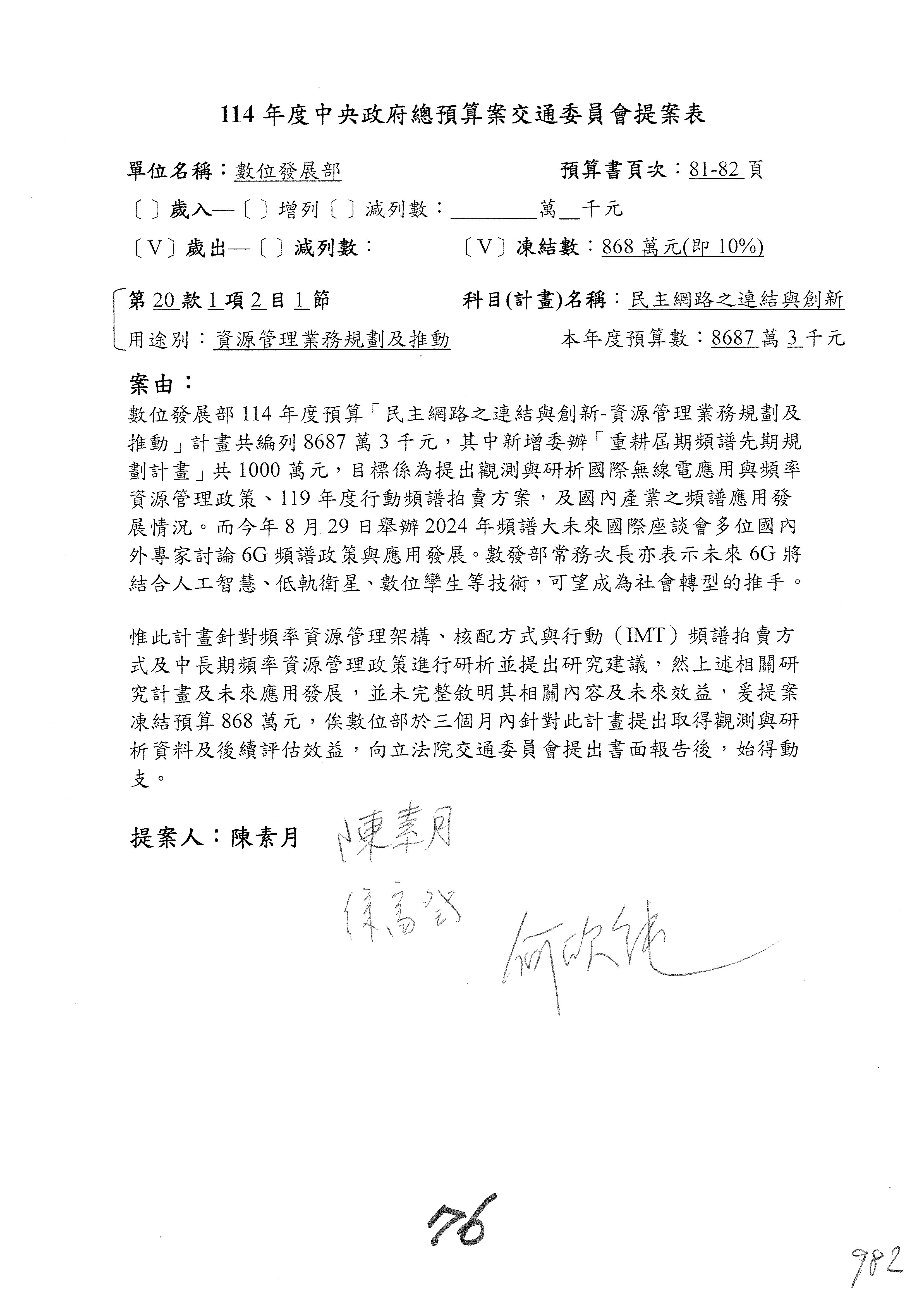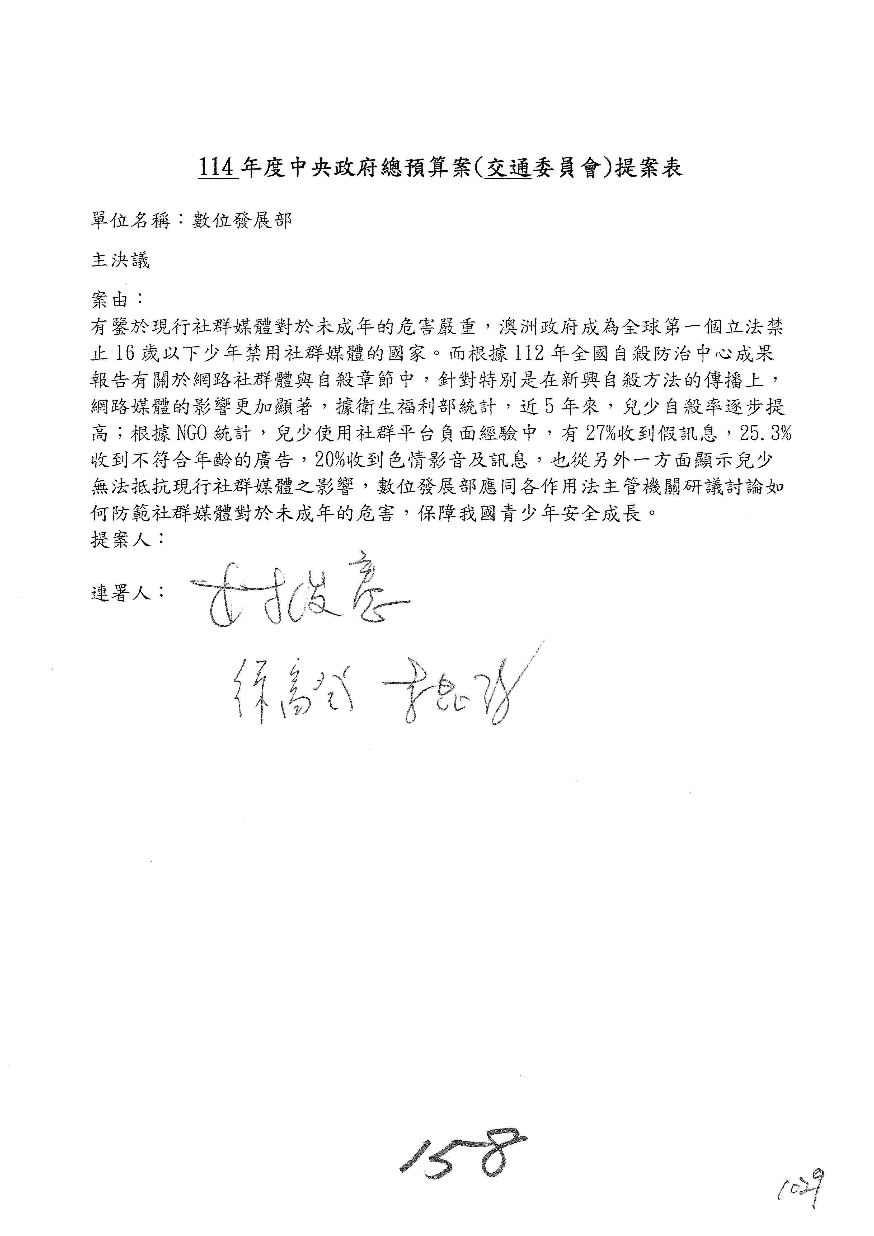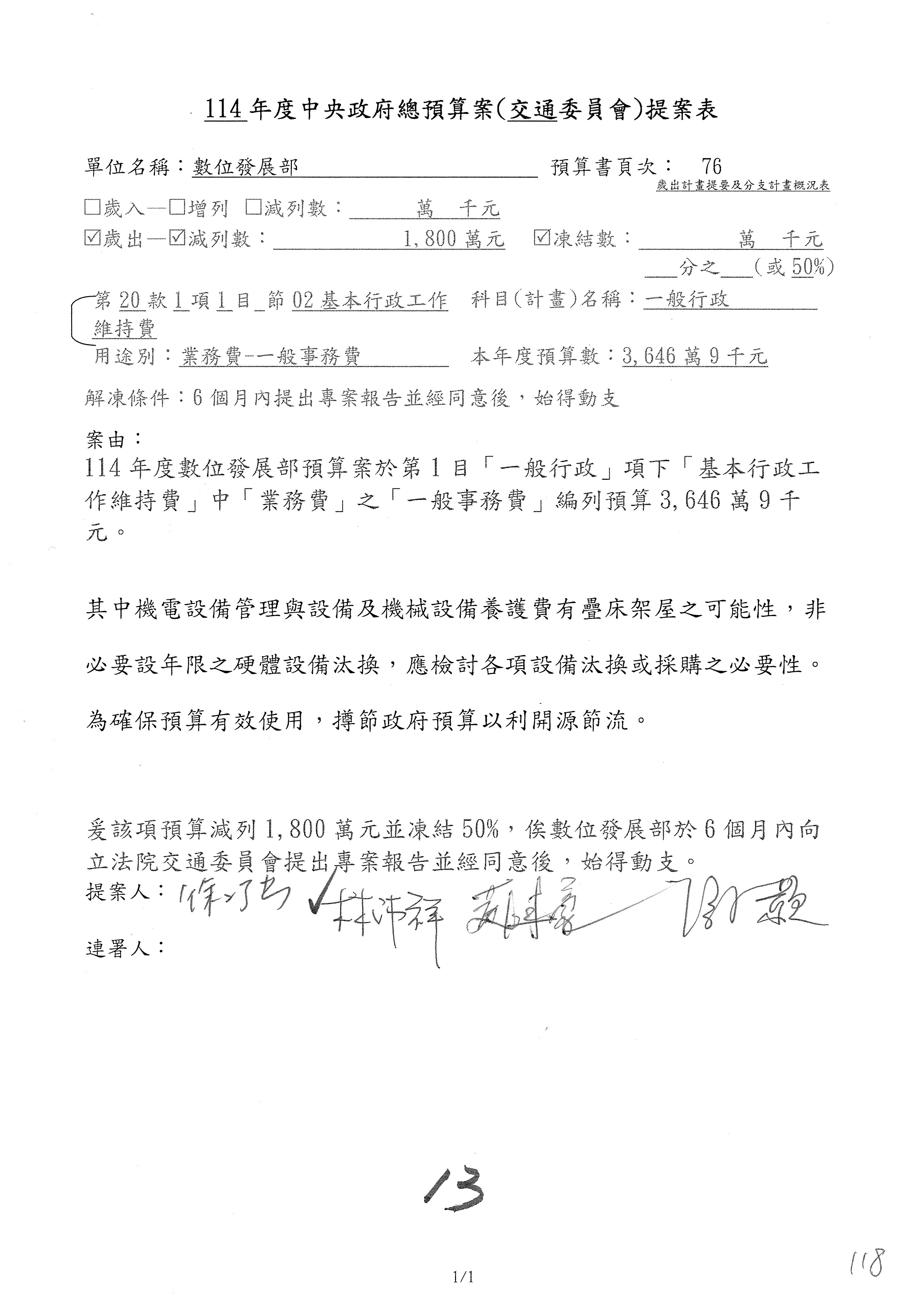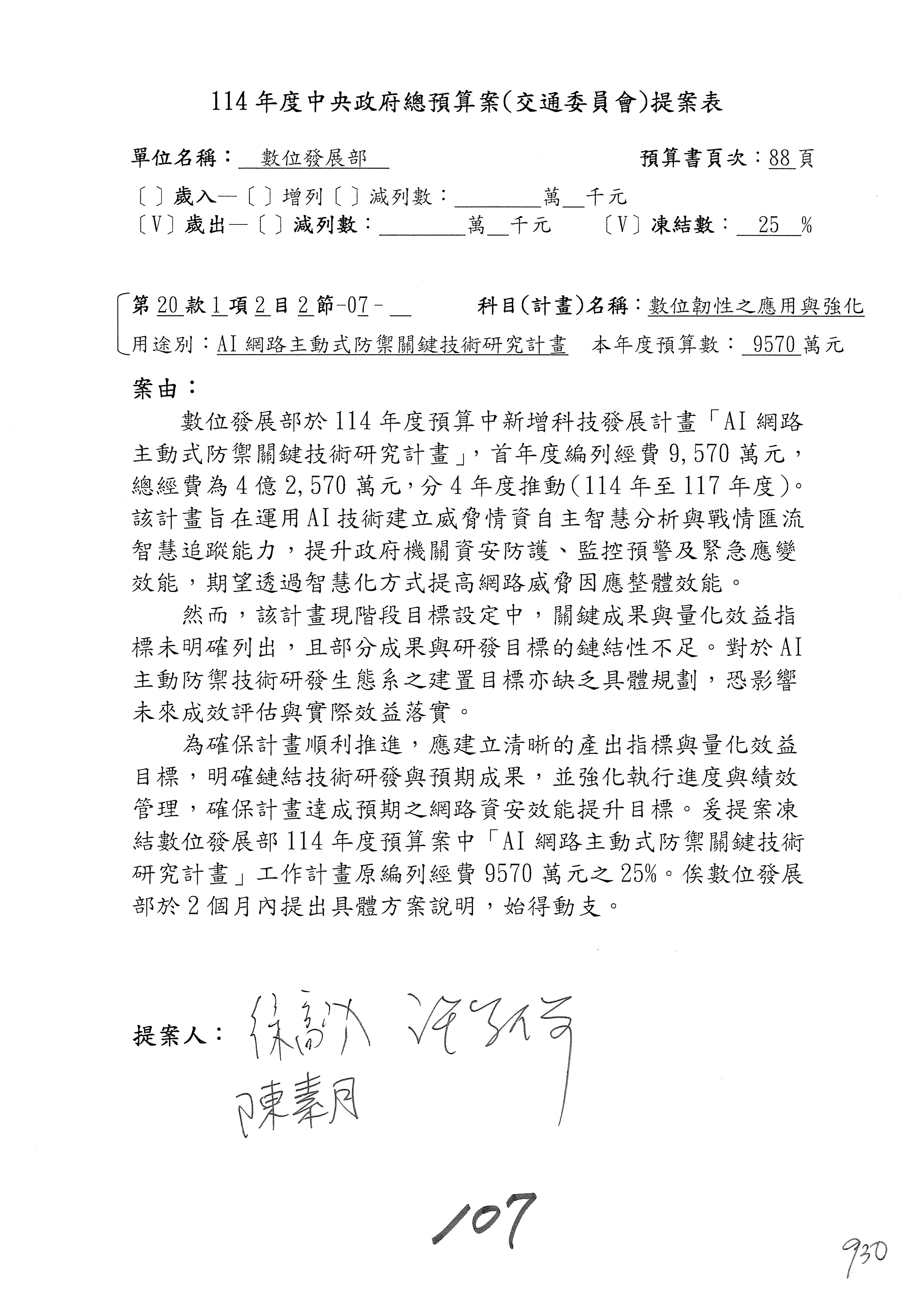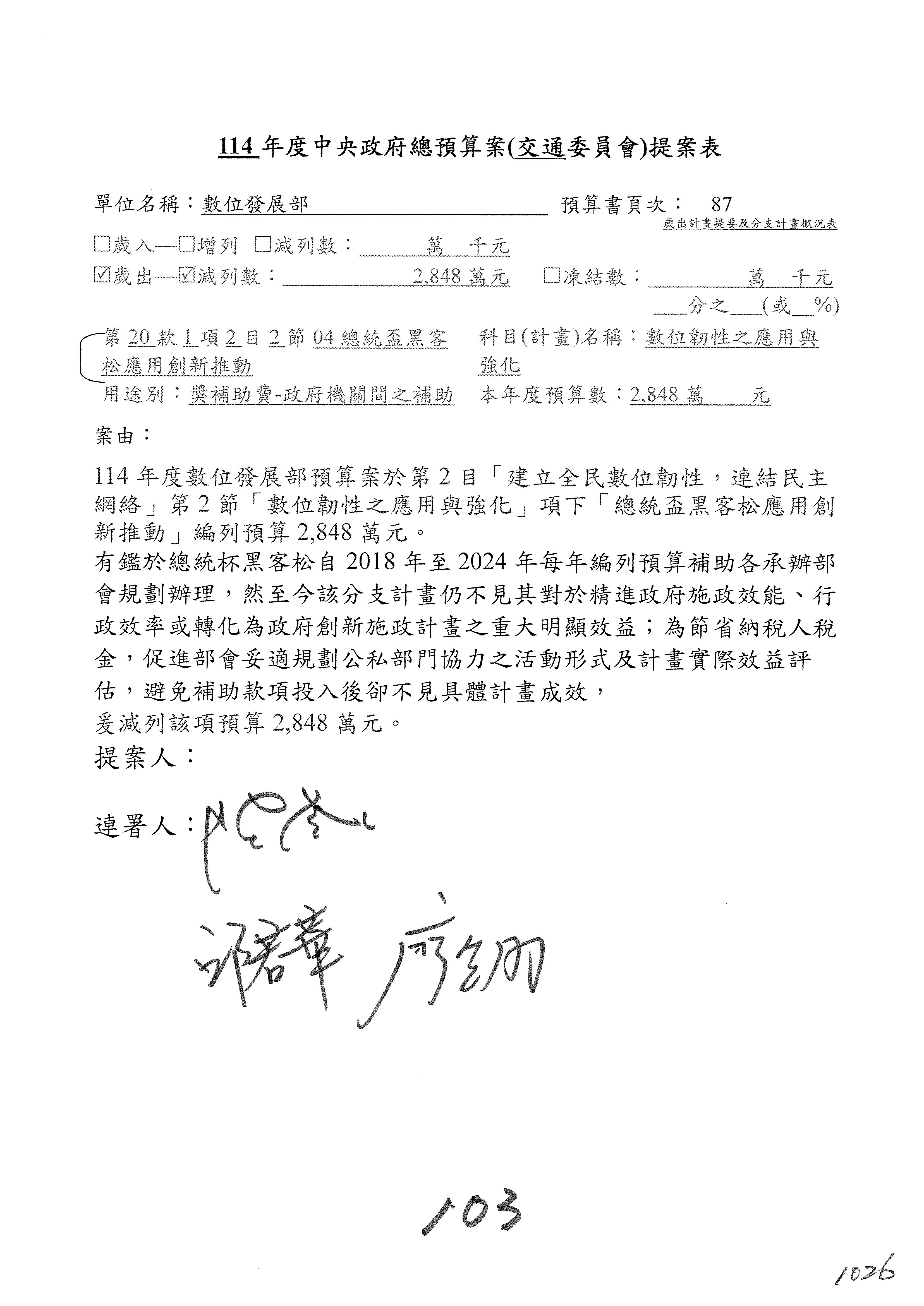 謝謝各位委員,現在請拿出最大本的,這應該算是今天最厚的,也請各位翻開數位發展部114年度單位預算─建議併案及預算表,待會審理預算按照這個併案審理的順序來審理。