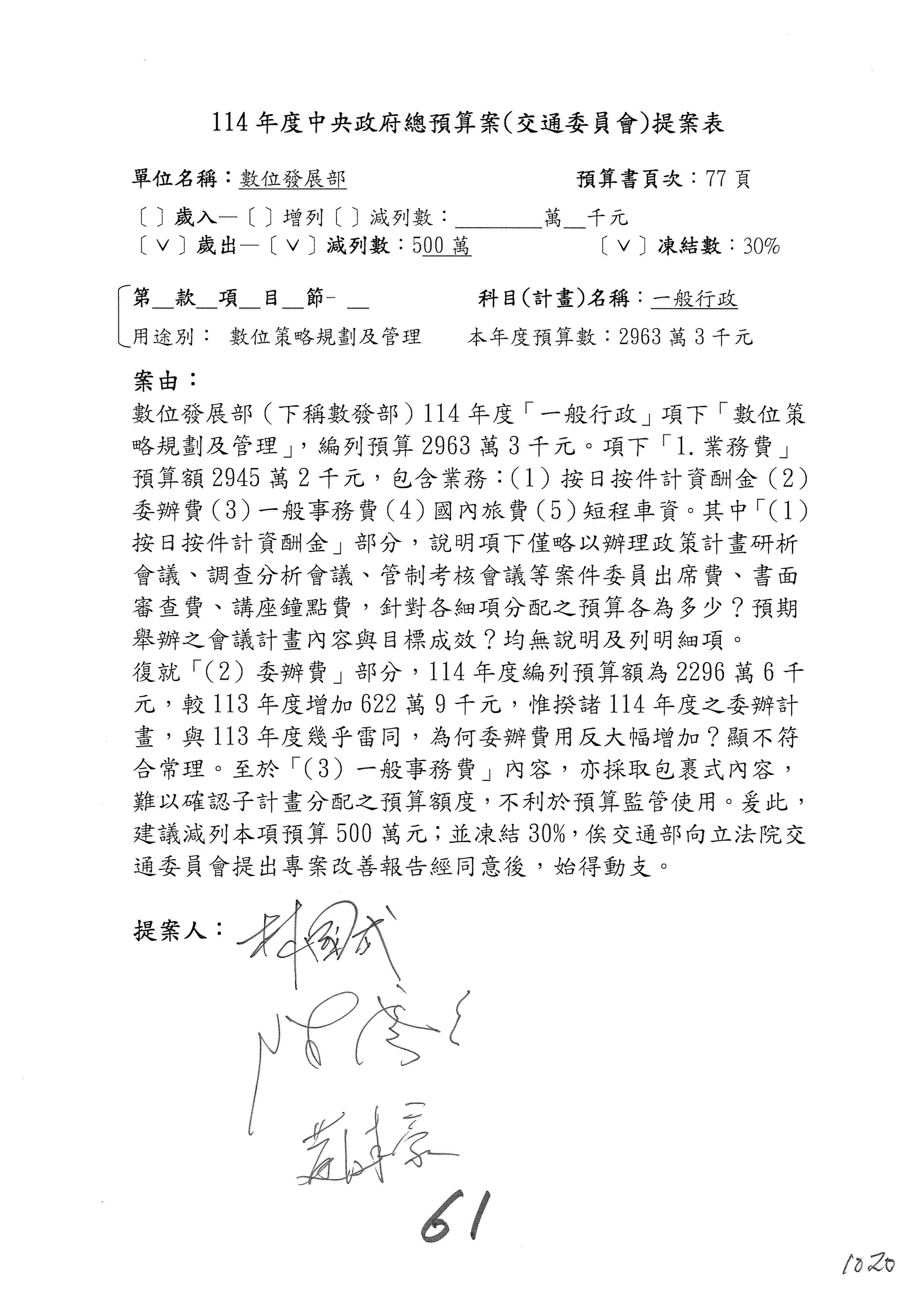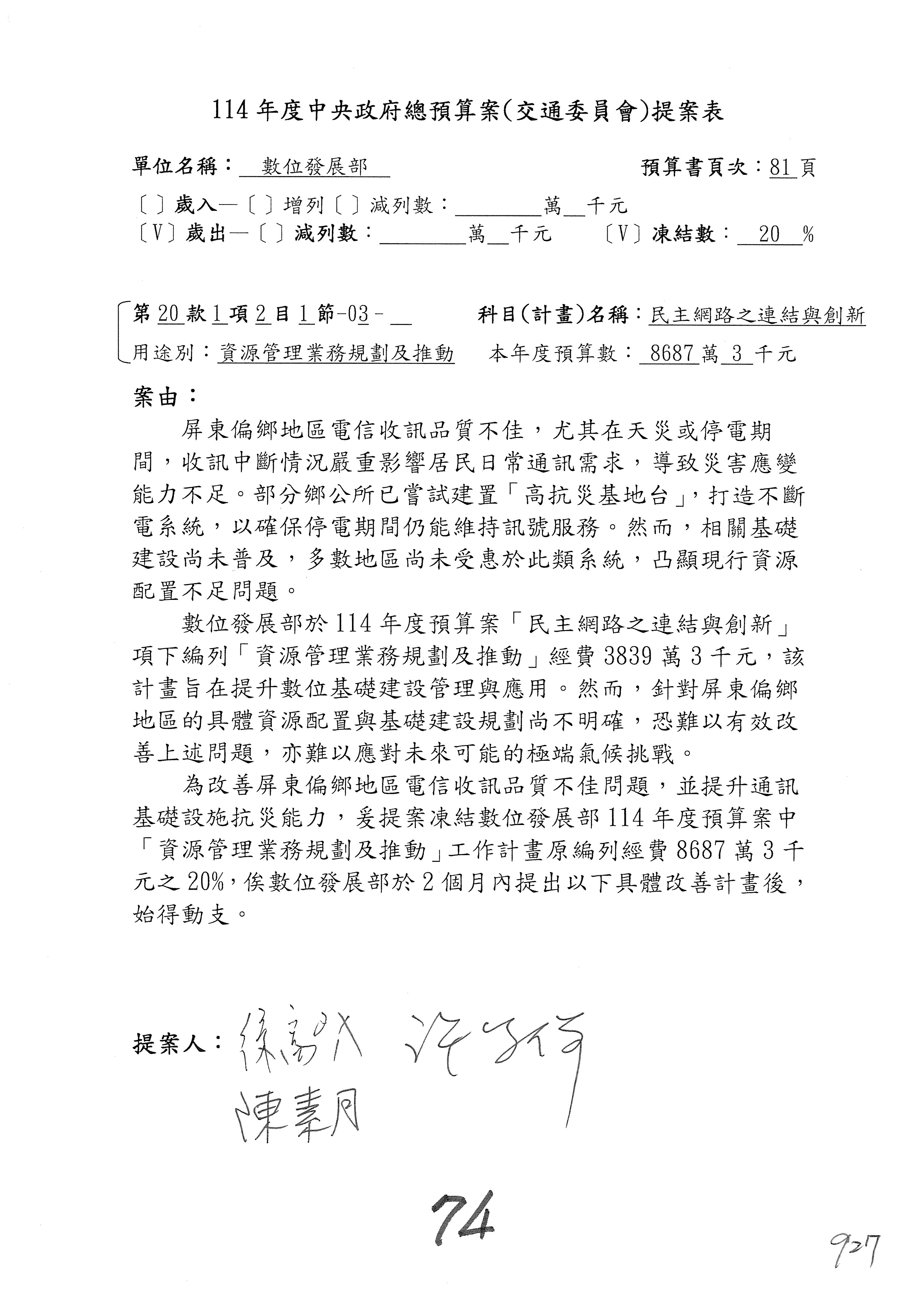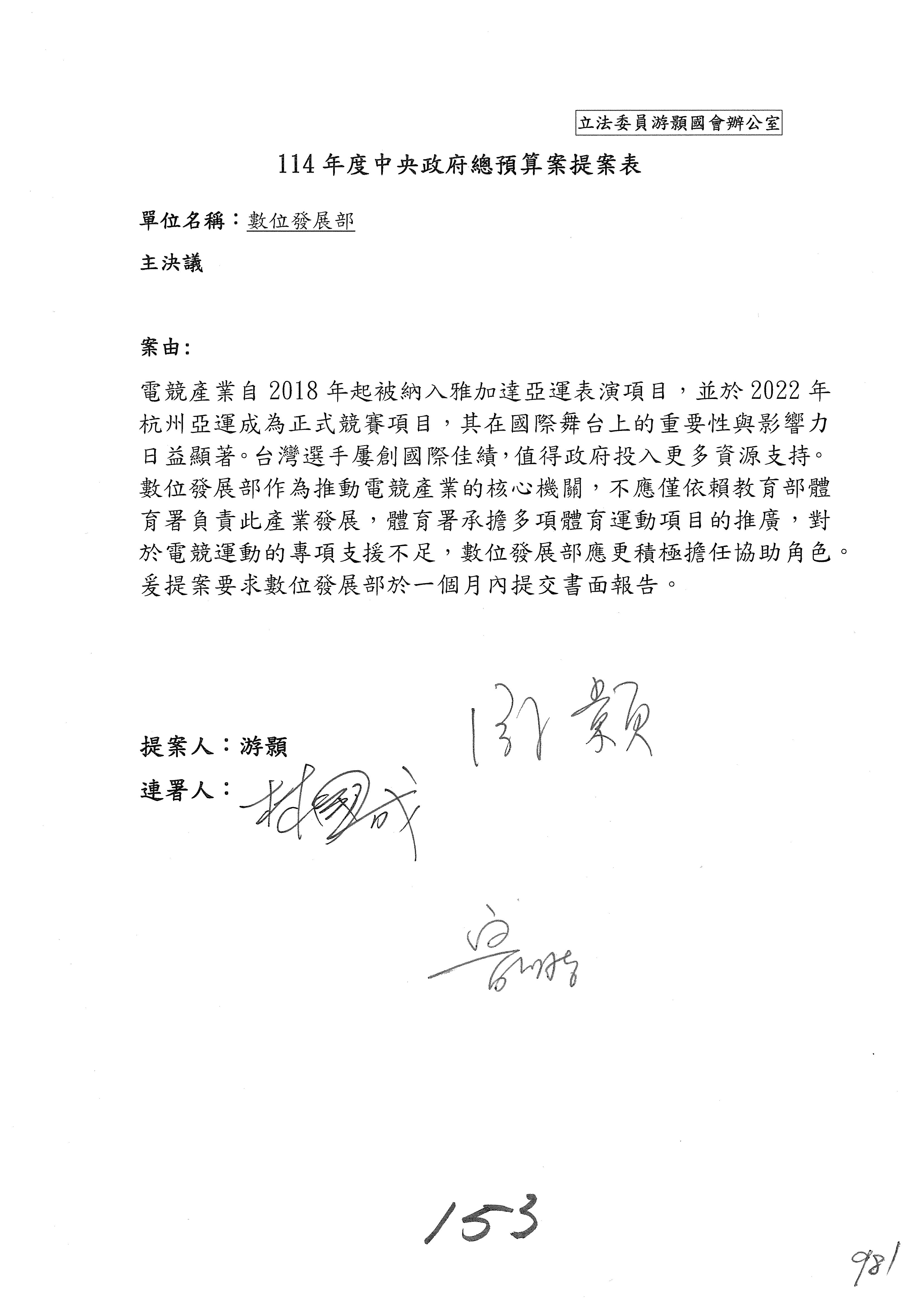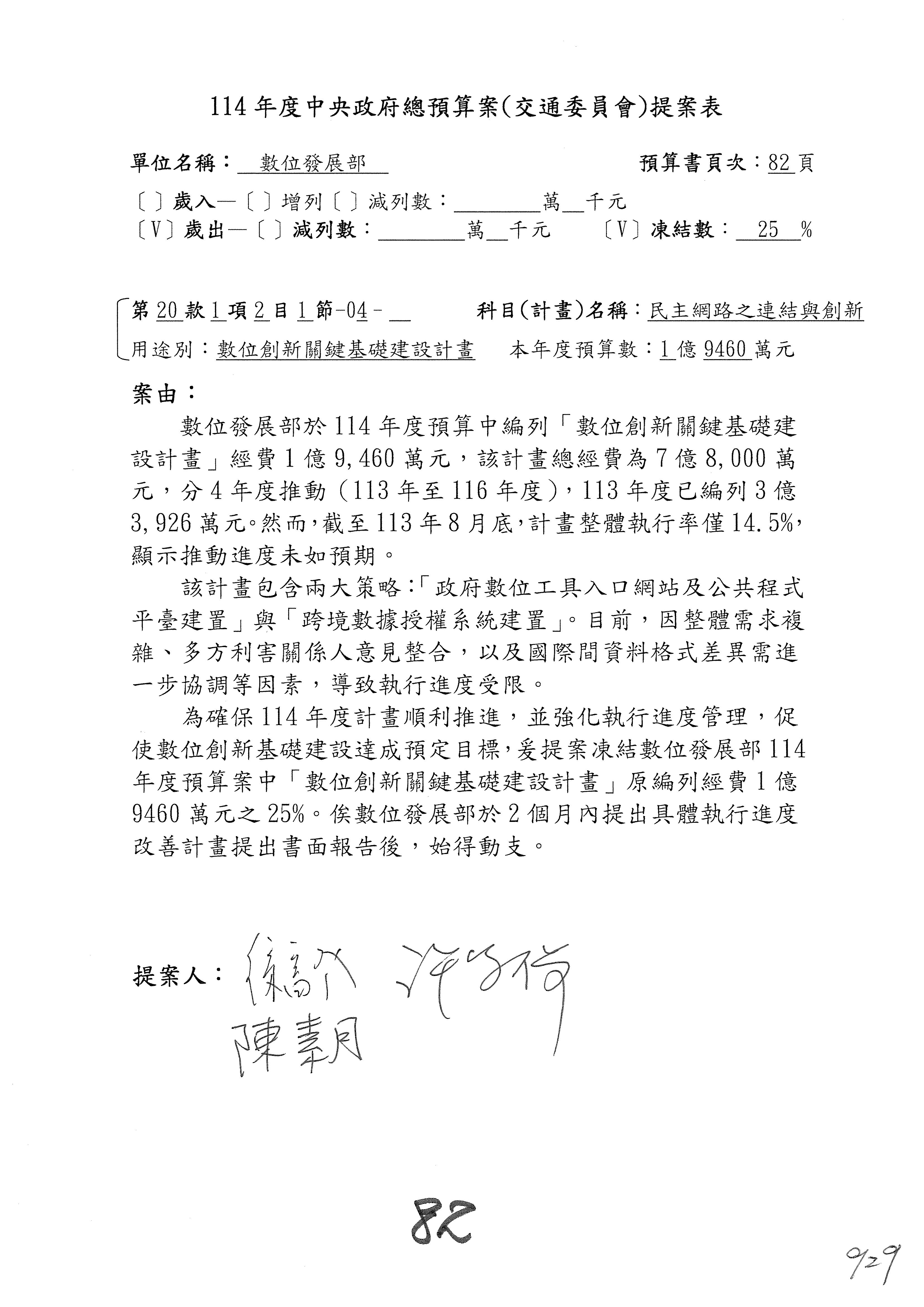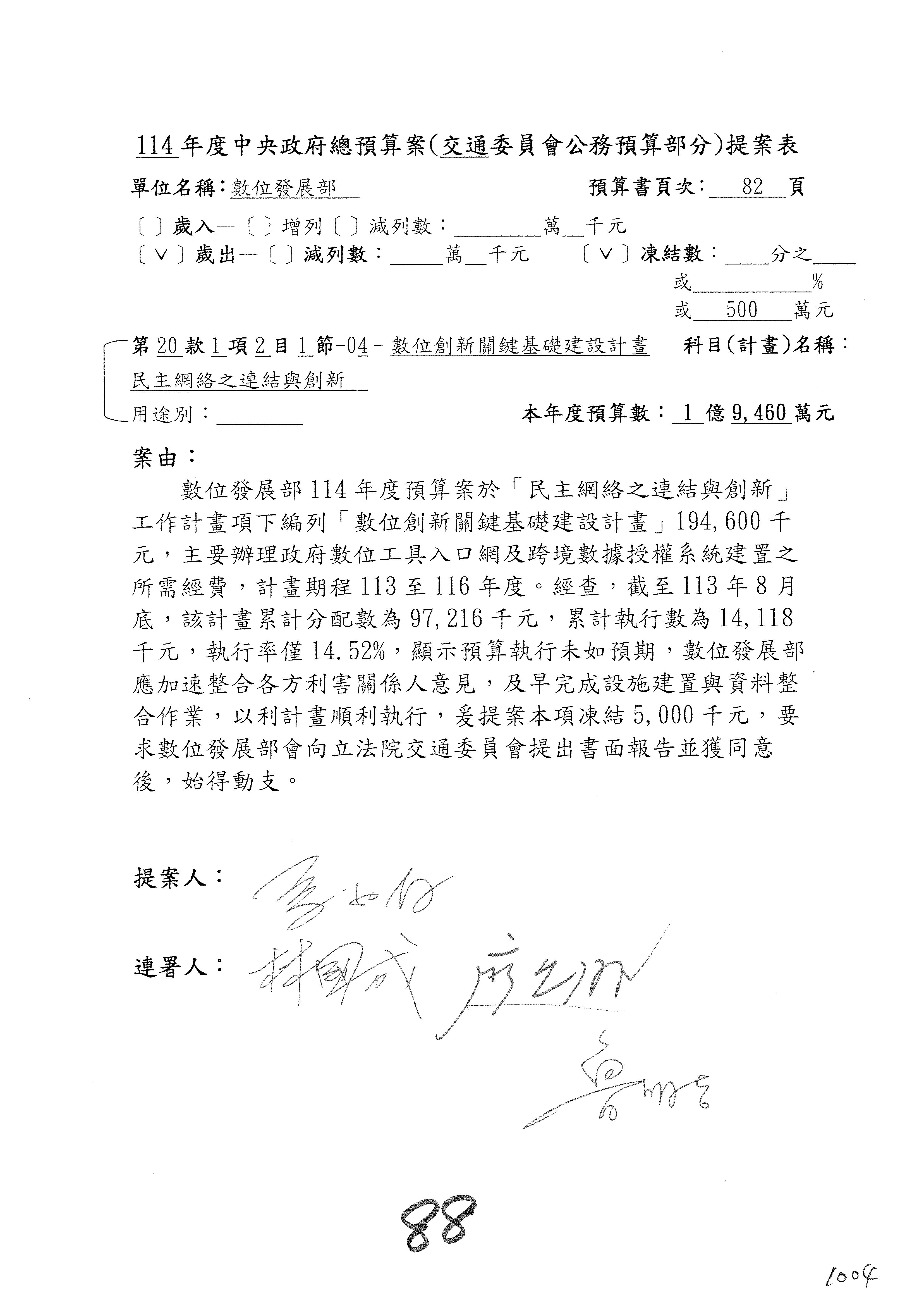謝謝各位委員,現在請拿出最大本的,這應該算是今天最厚的,也請各位翻開數位發展部114年度單位預算─建議併案及預算表,待會審理預算按照這個併案審理的順序來審理。
