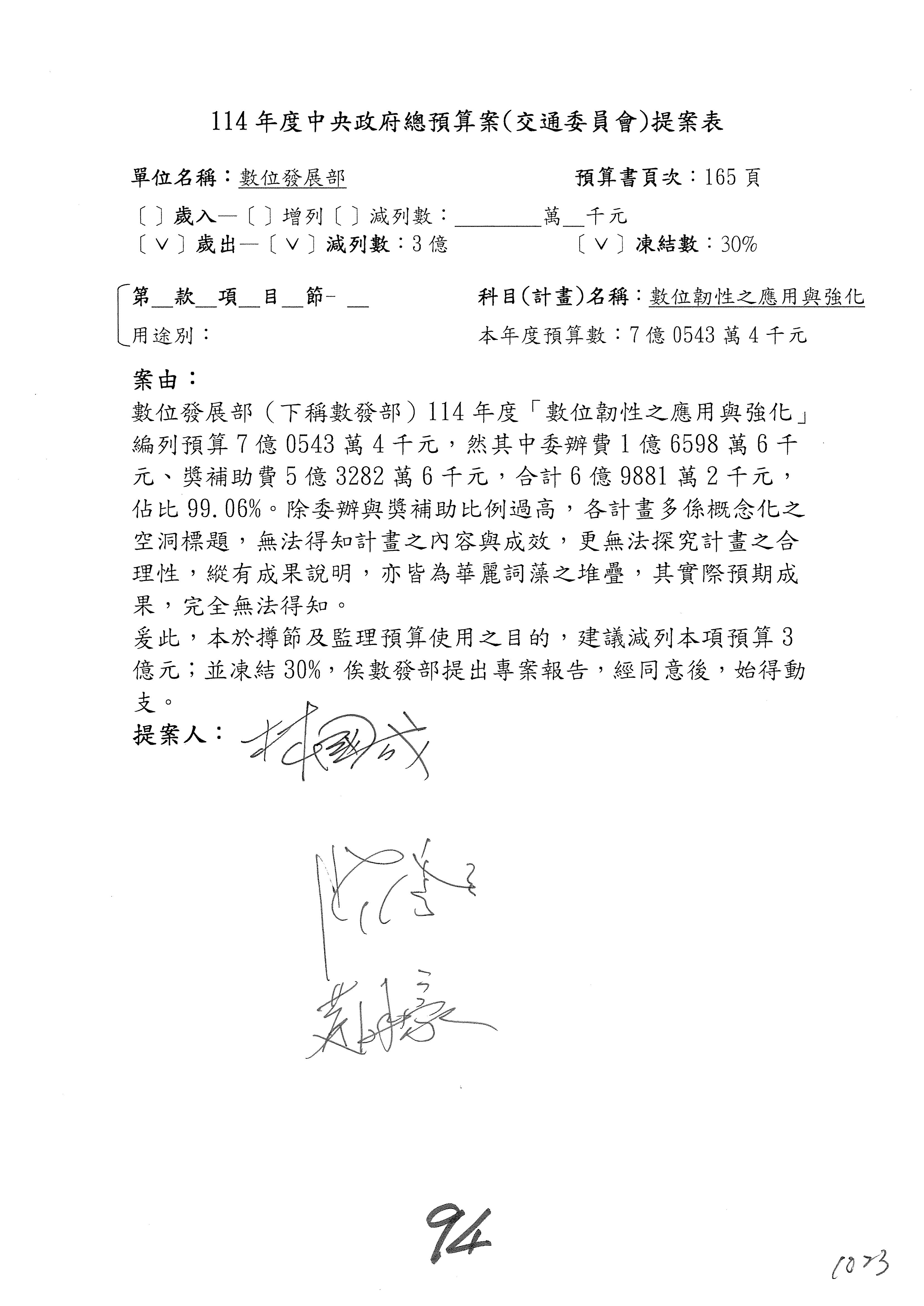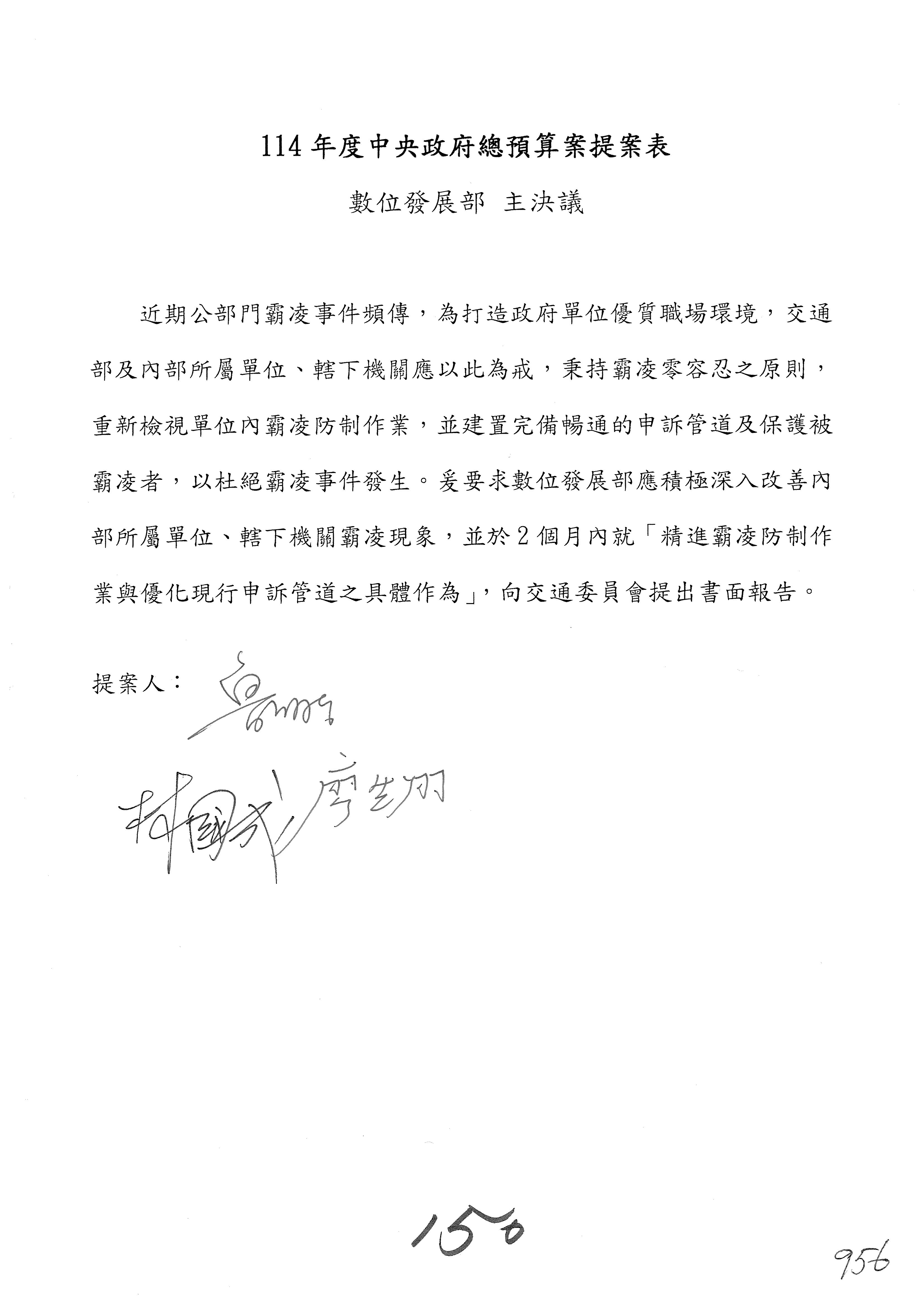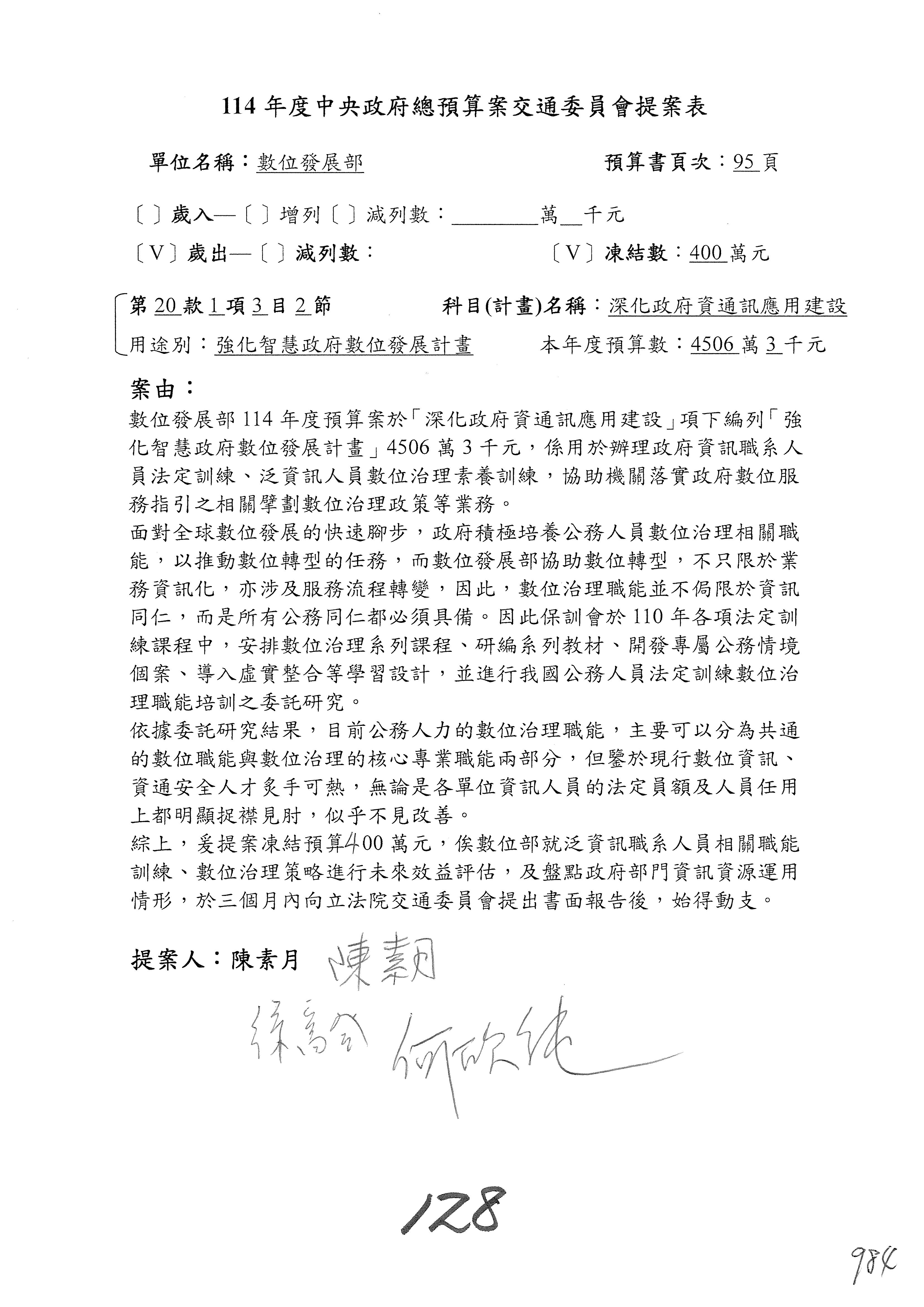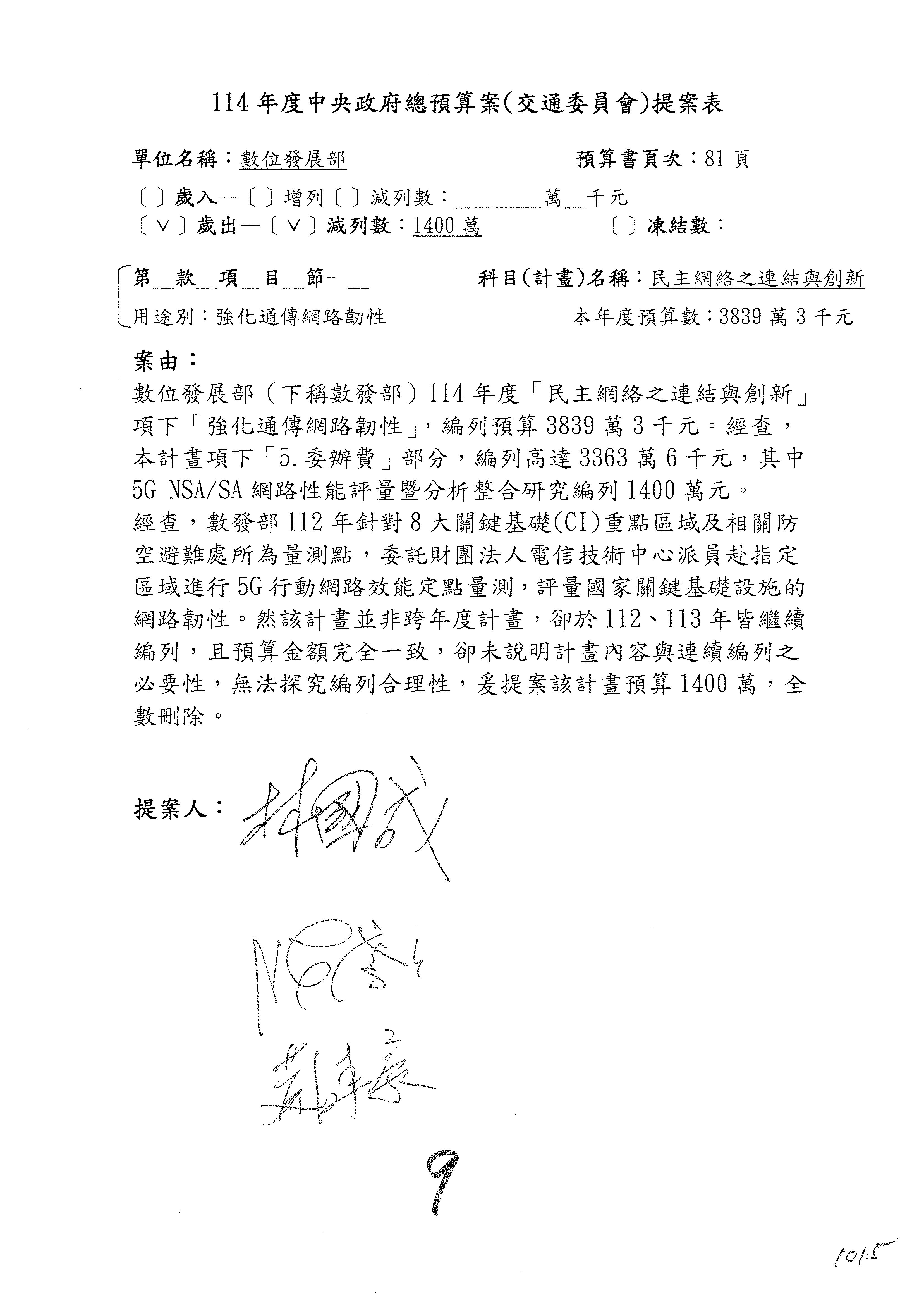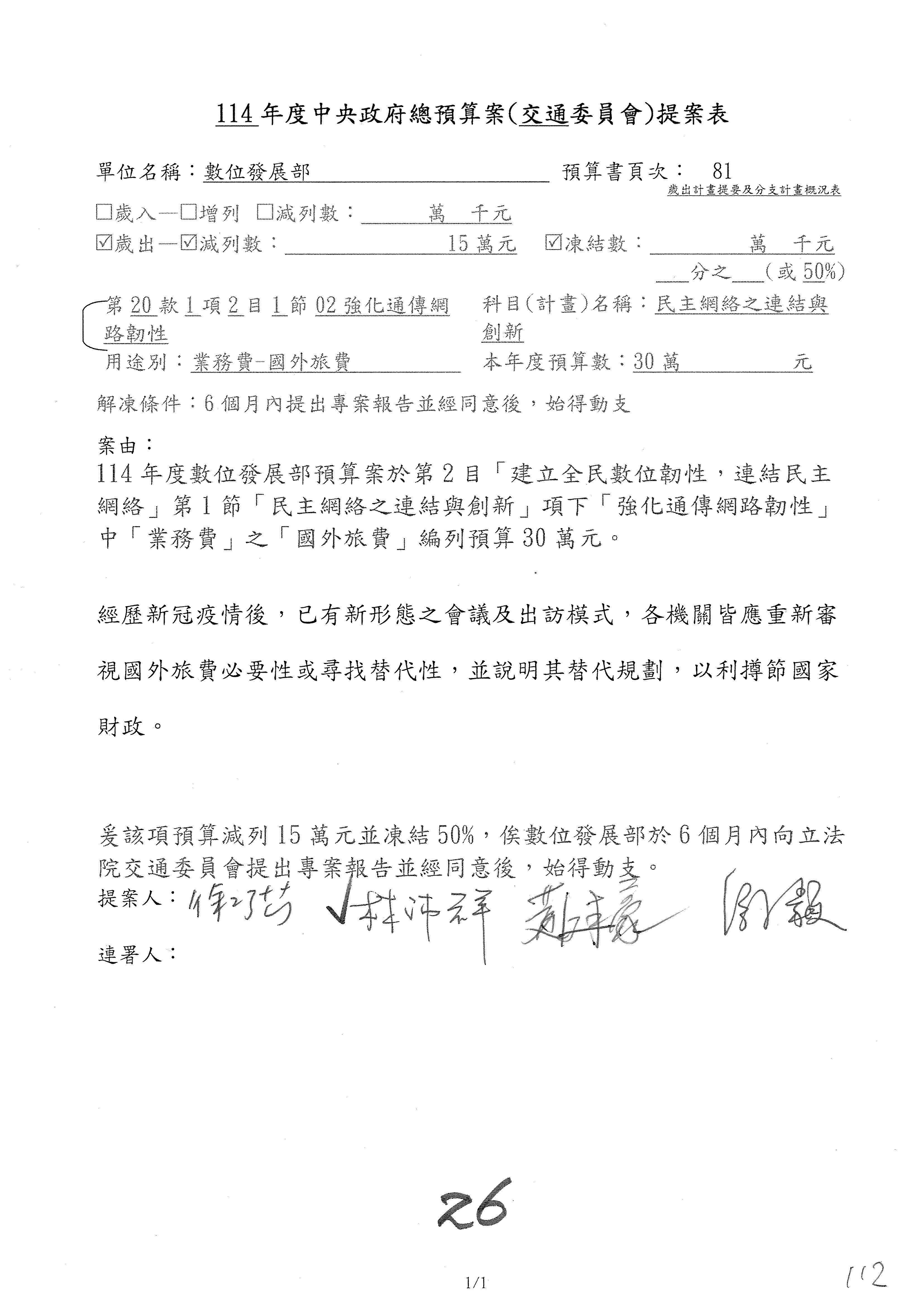 謝謝各位委員,現在請拿出最大本的,這應該算是今天最厚的,也請各位翻開數位發展部114年度單位預算─建議併案及預算表,待會審理預算按照這個併案審理的順序來審理。