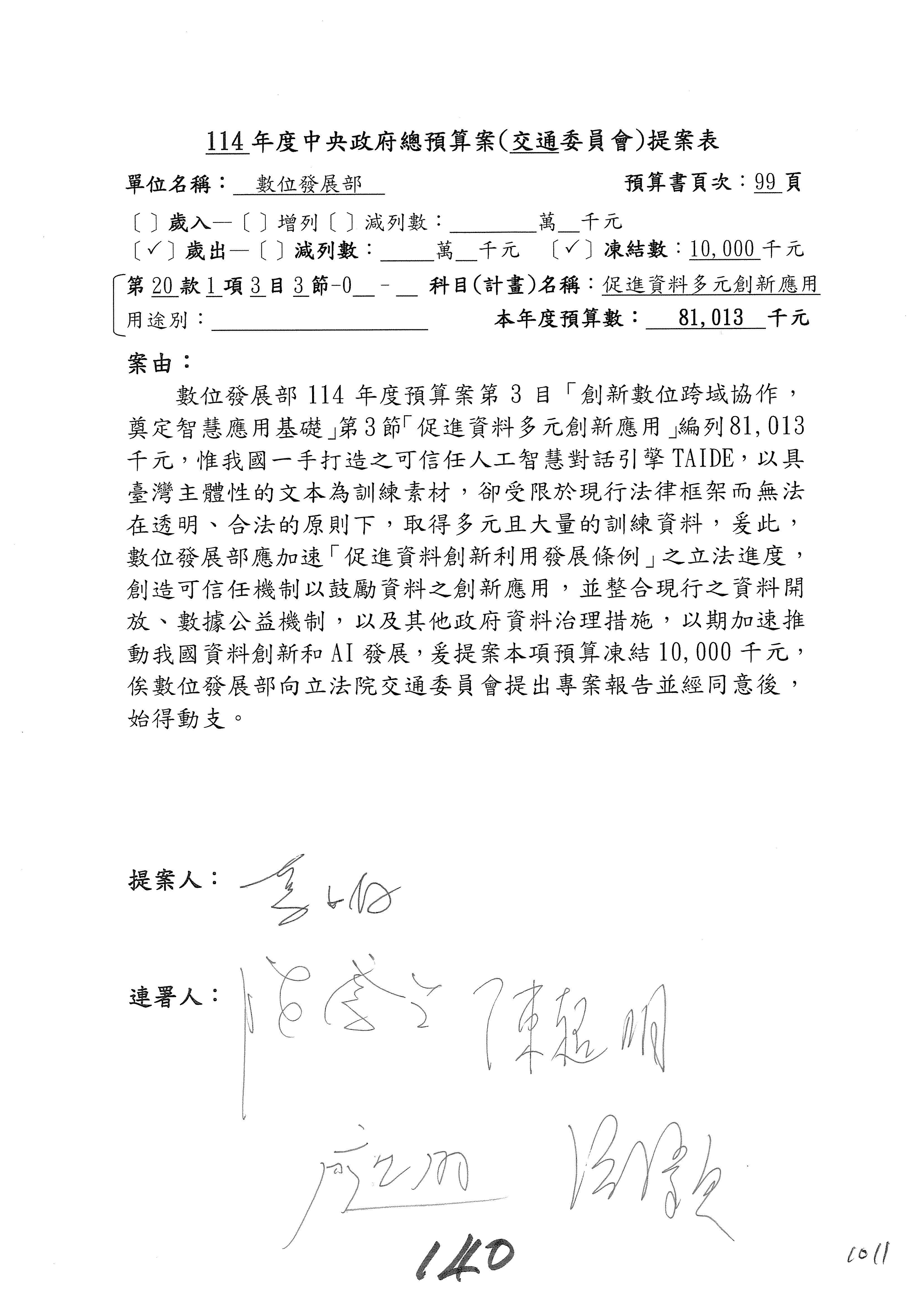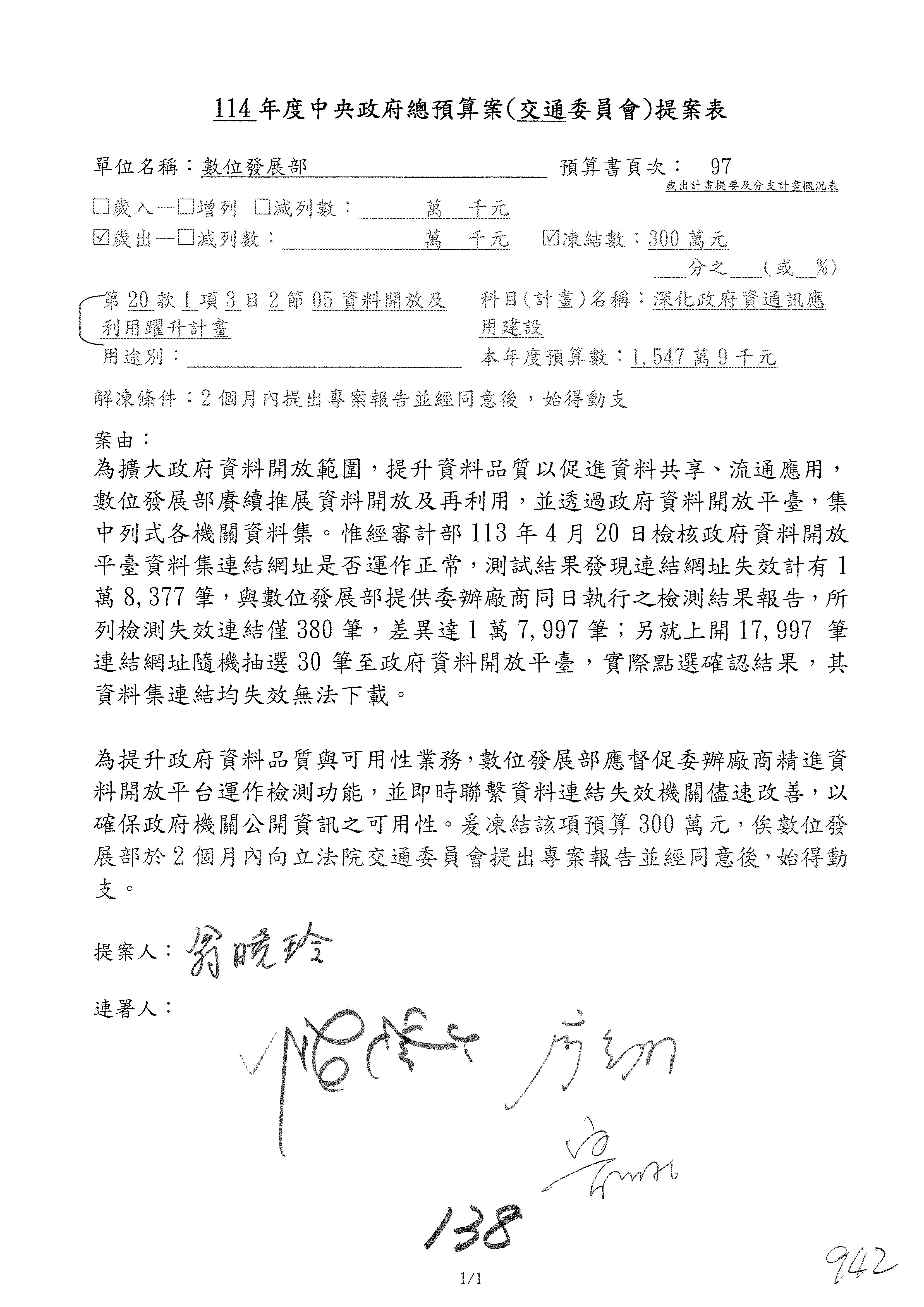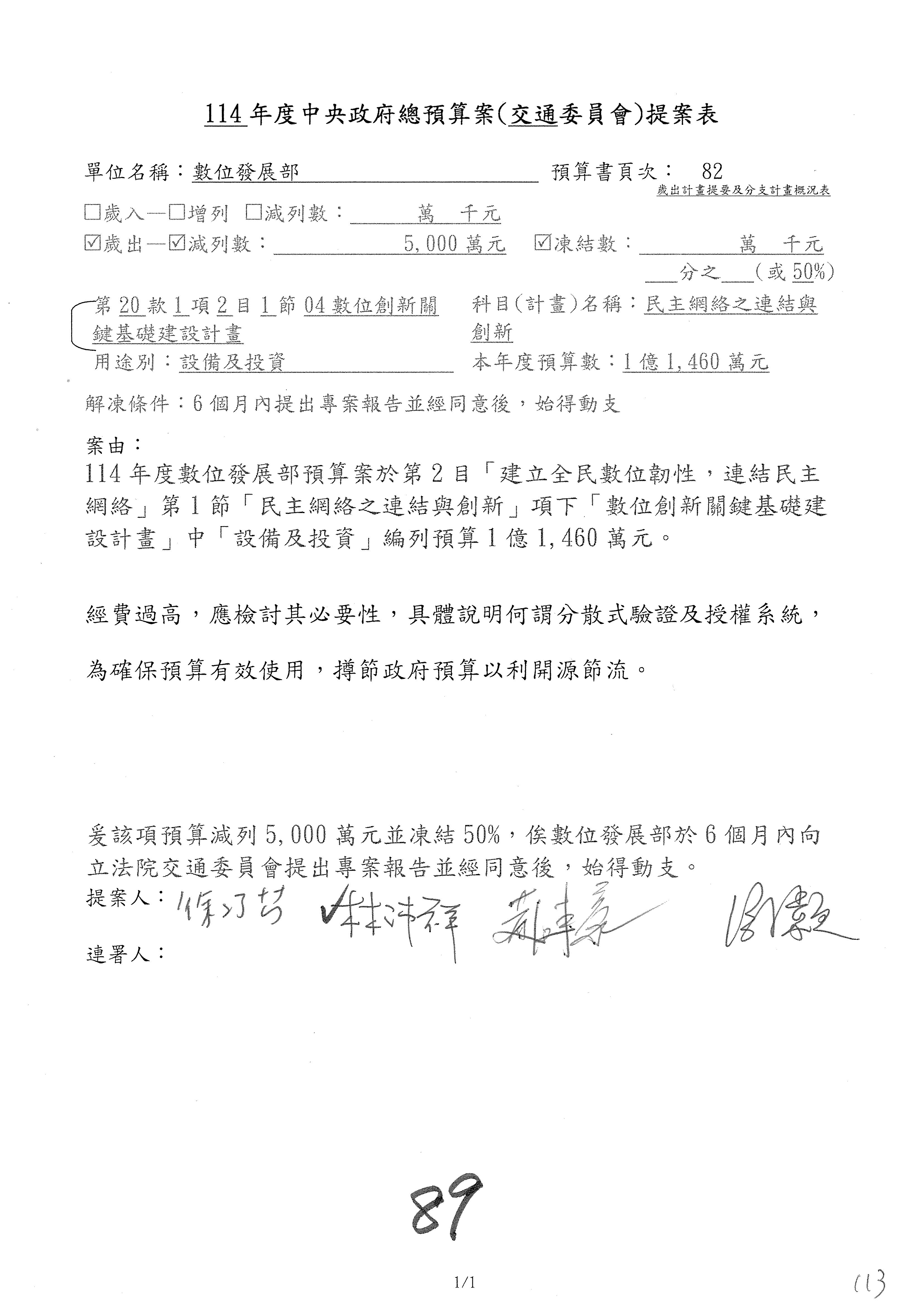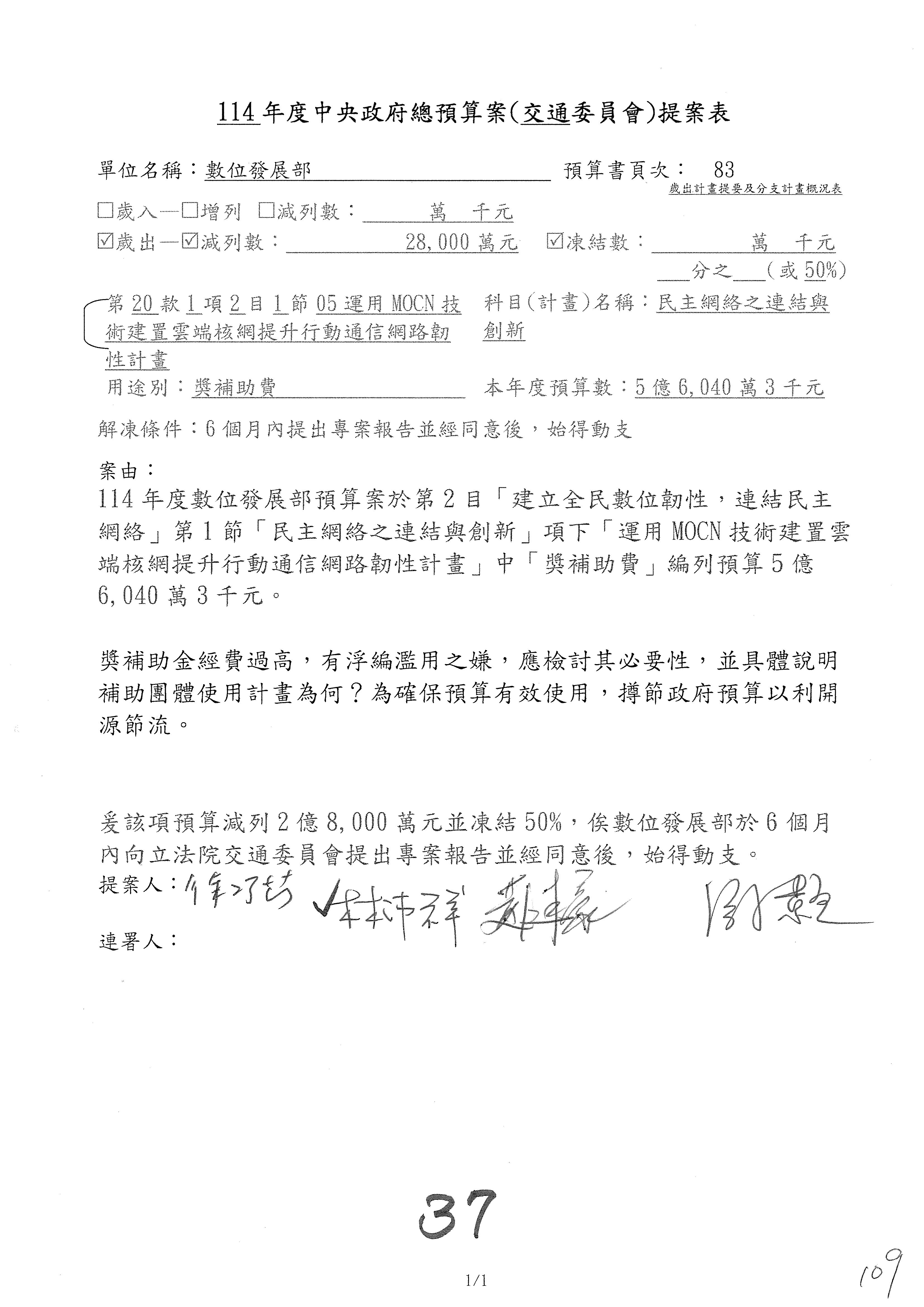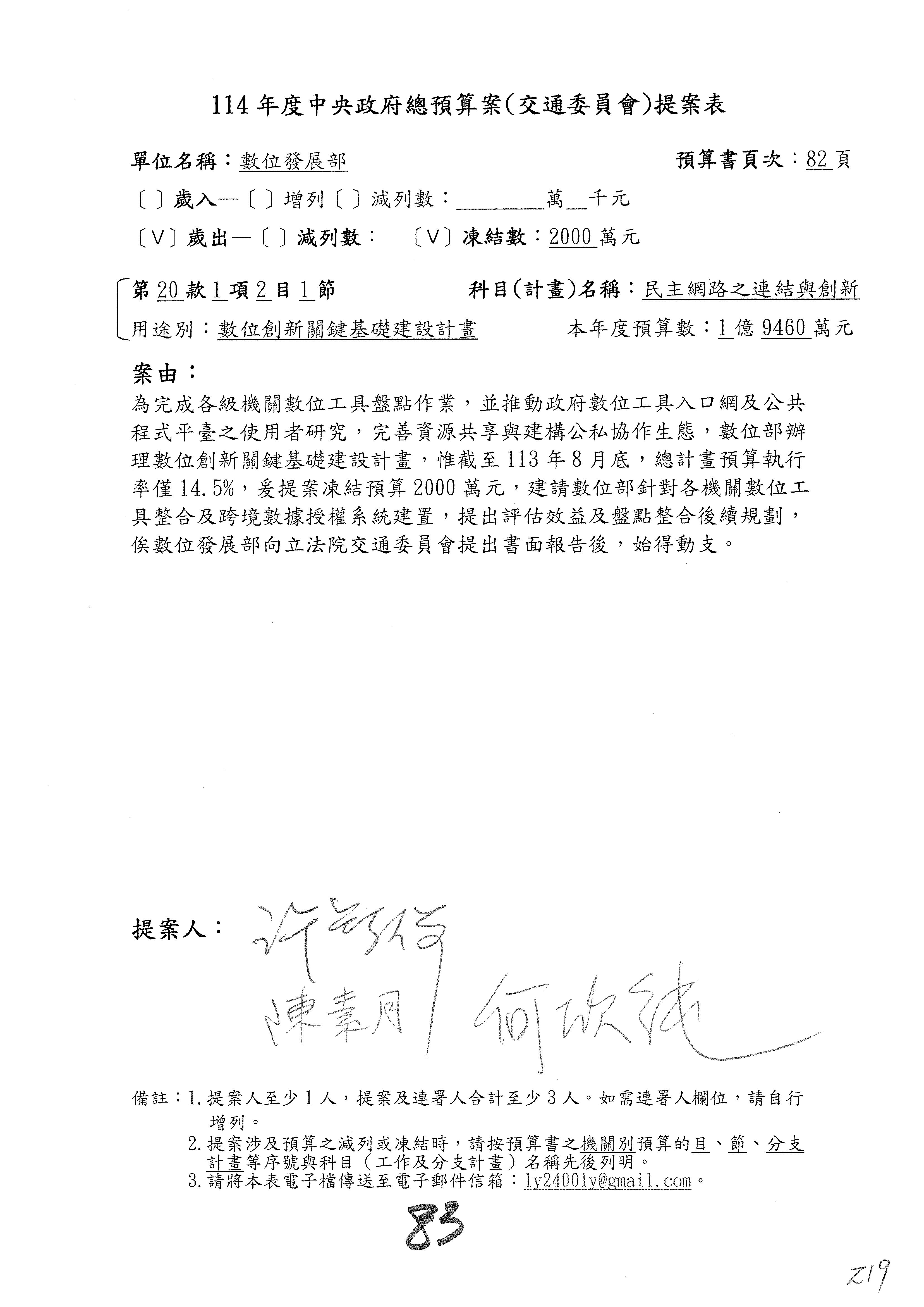 謝謝各位委員,現在請拿出最大本的,這應該算是今天最厚的,也請各位翻開數位發展部114年度單位預算─建議併案及預算表,待會審理預算按照這個併案審理的順序來審理。