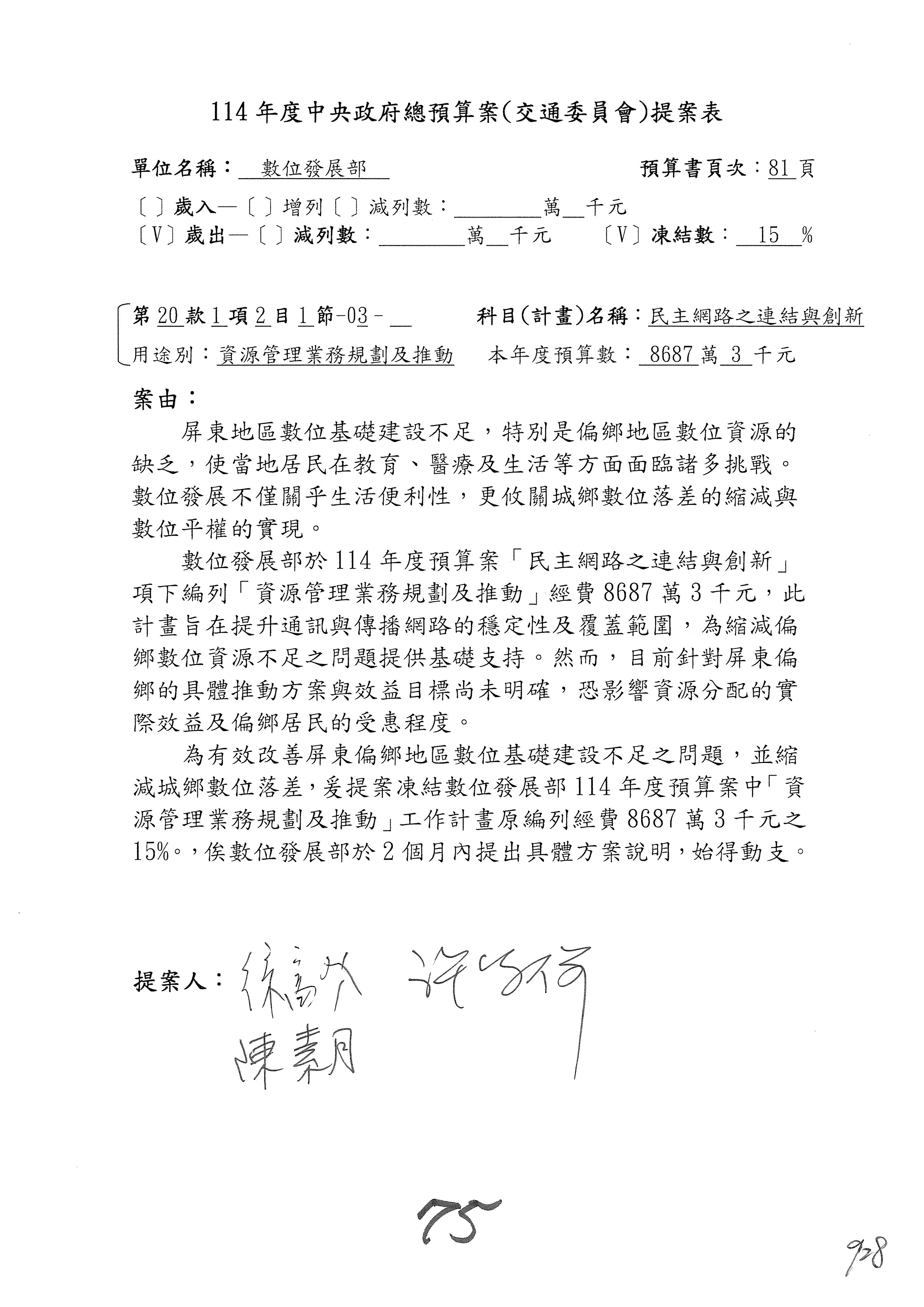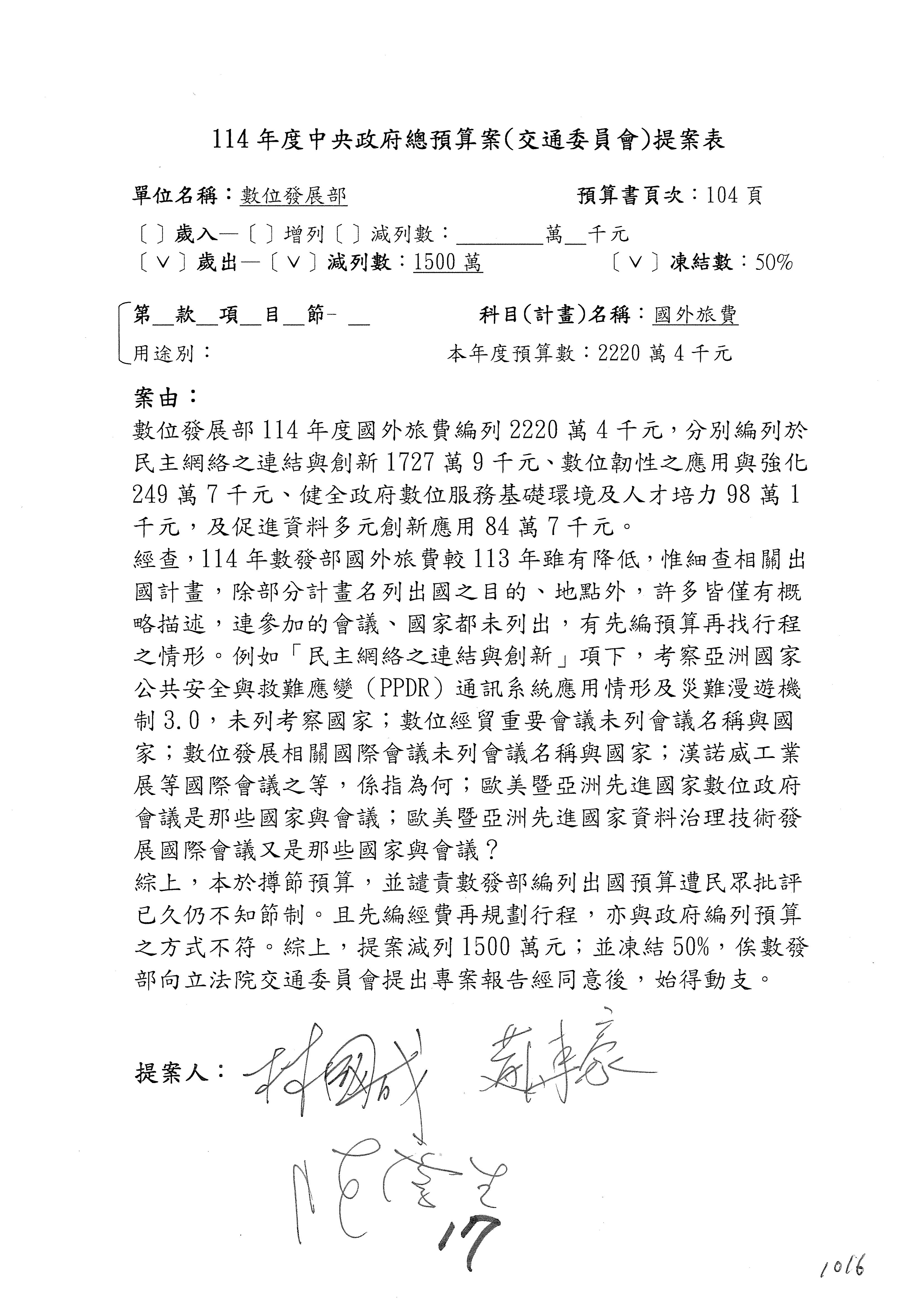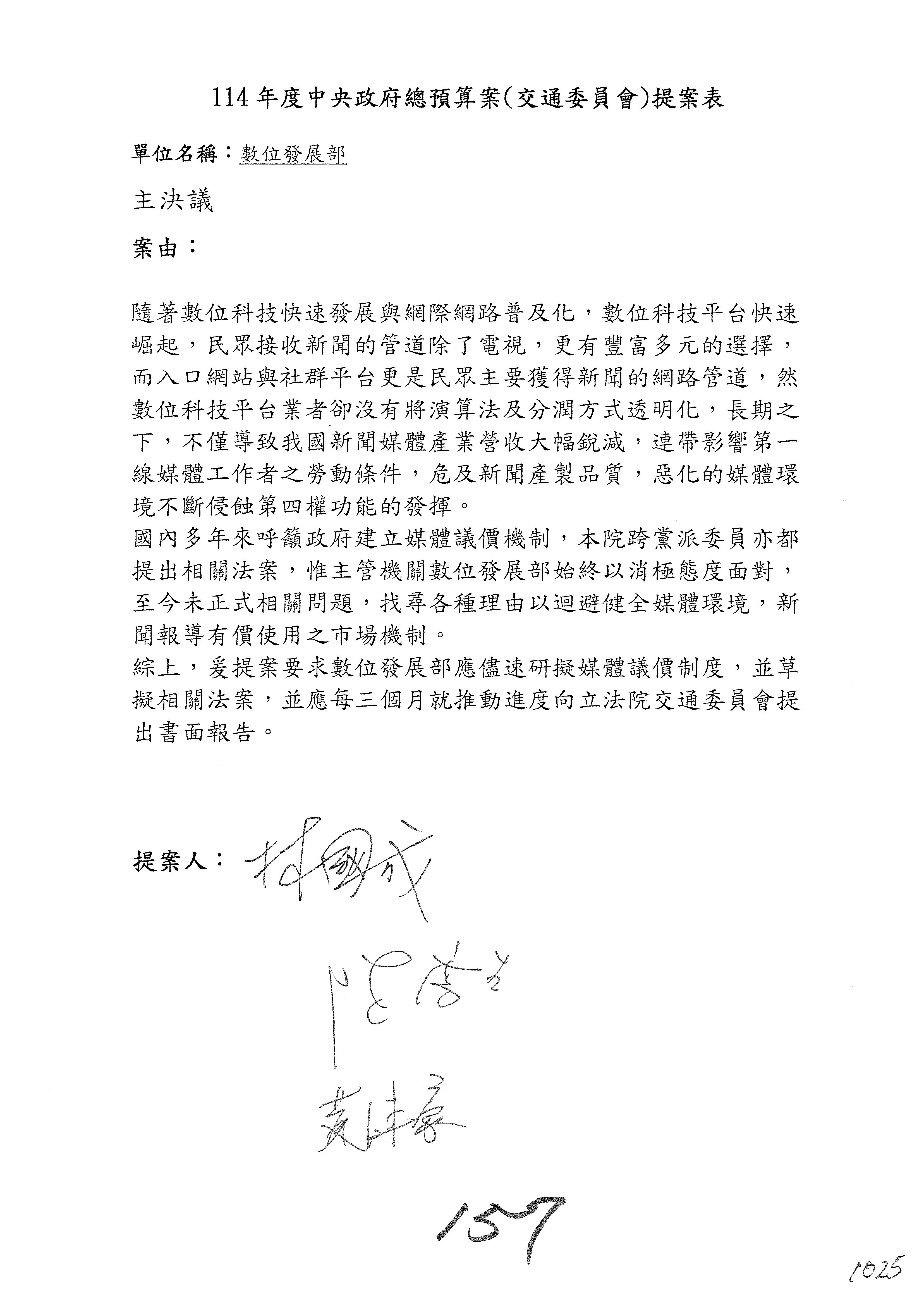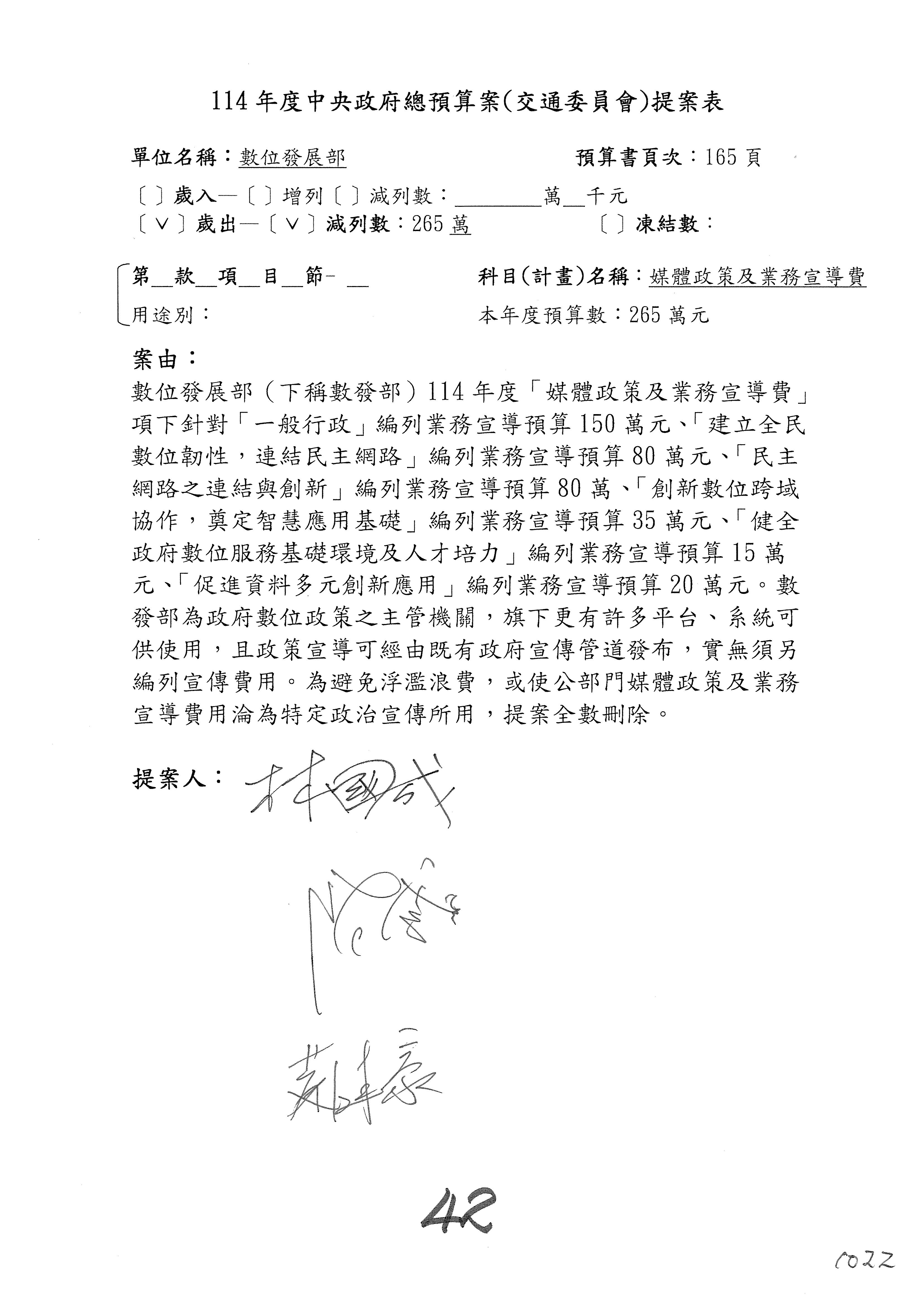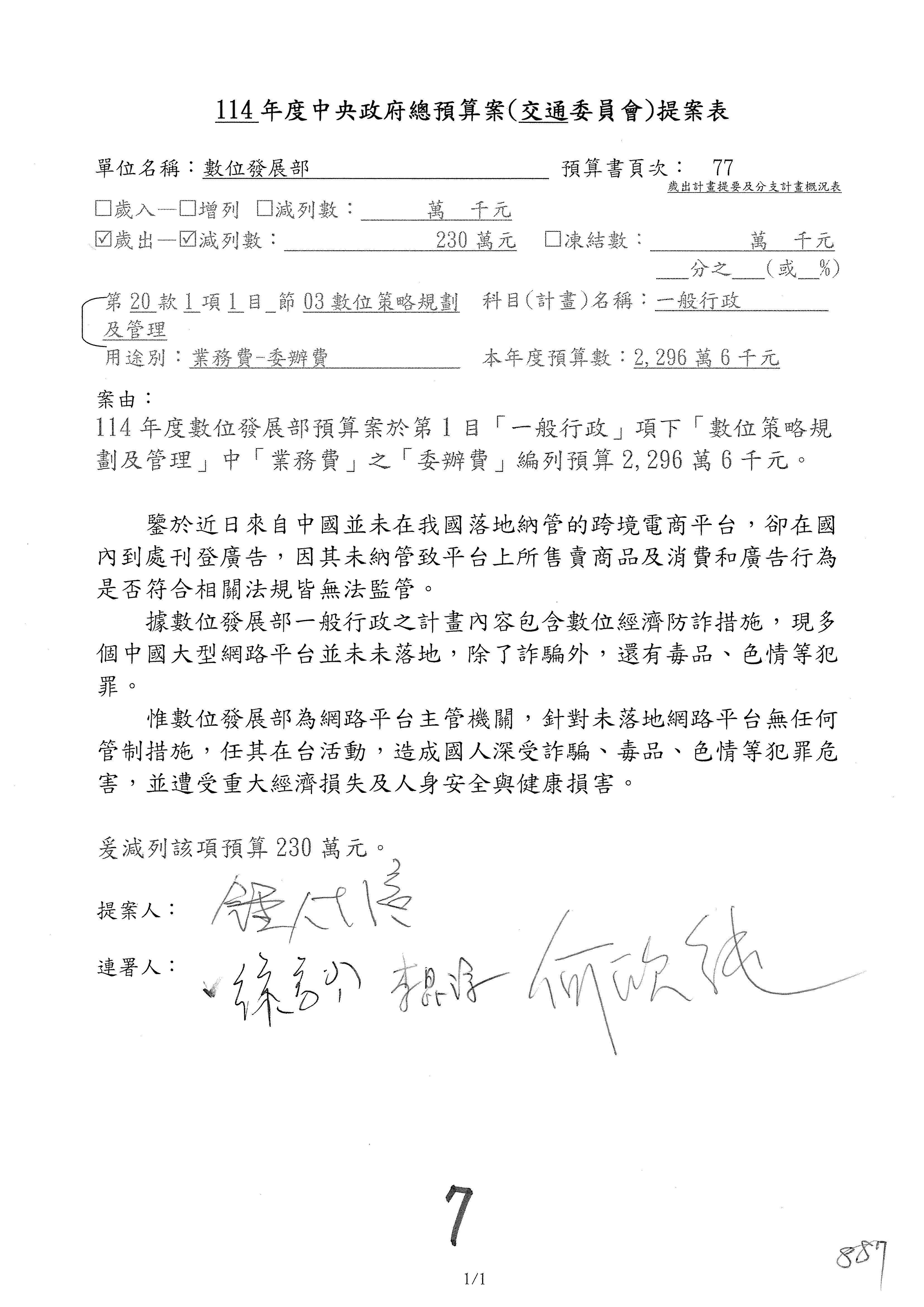 謝謝各位委員,現在請拿出最大本的,這應該算是今天最厚的,也請各位翻開數位發展部114年度單位預算─建議併案及預算表,待會審理預算按照這個併案審理的順序來審理。