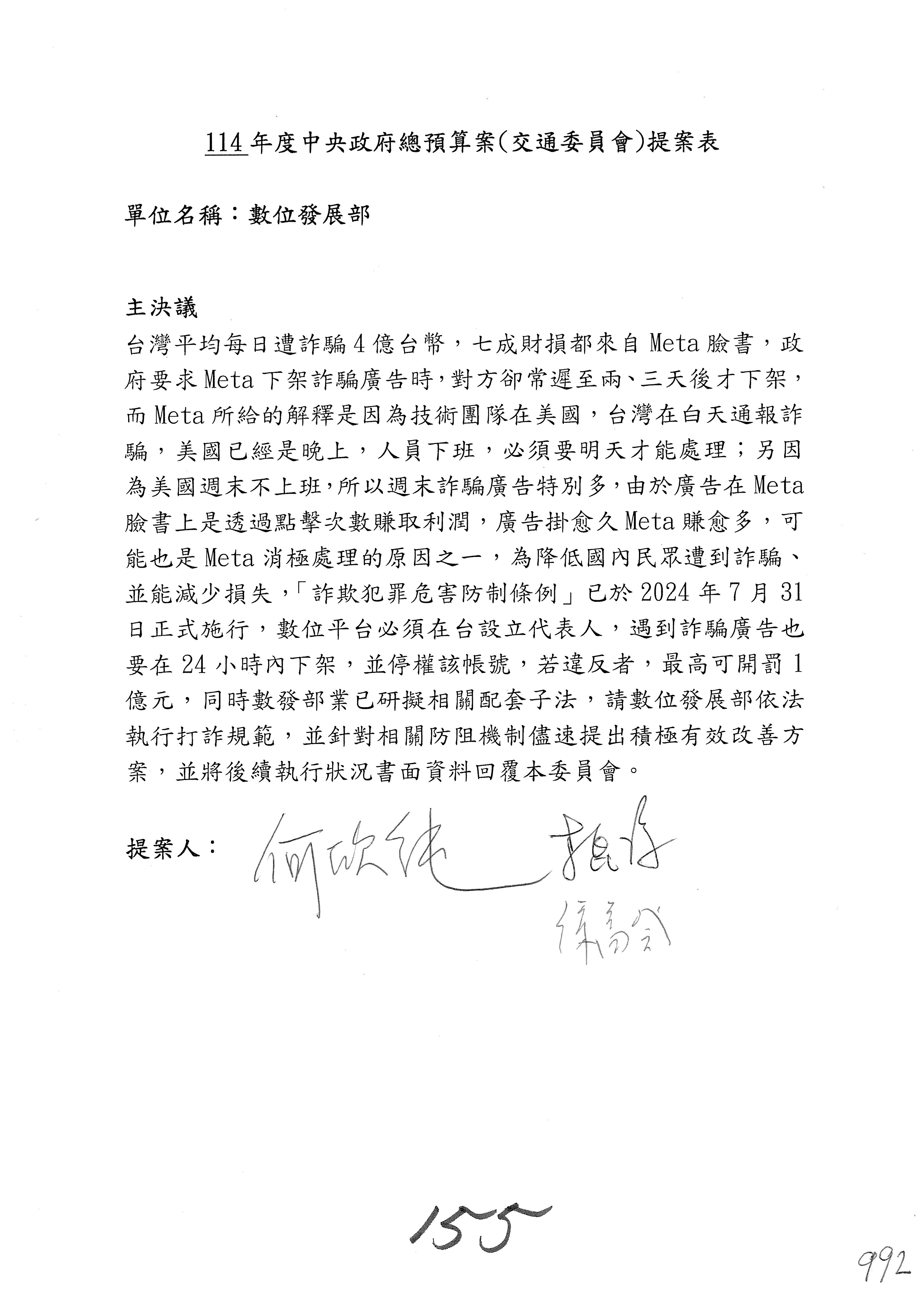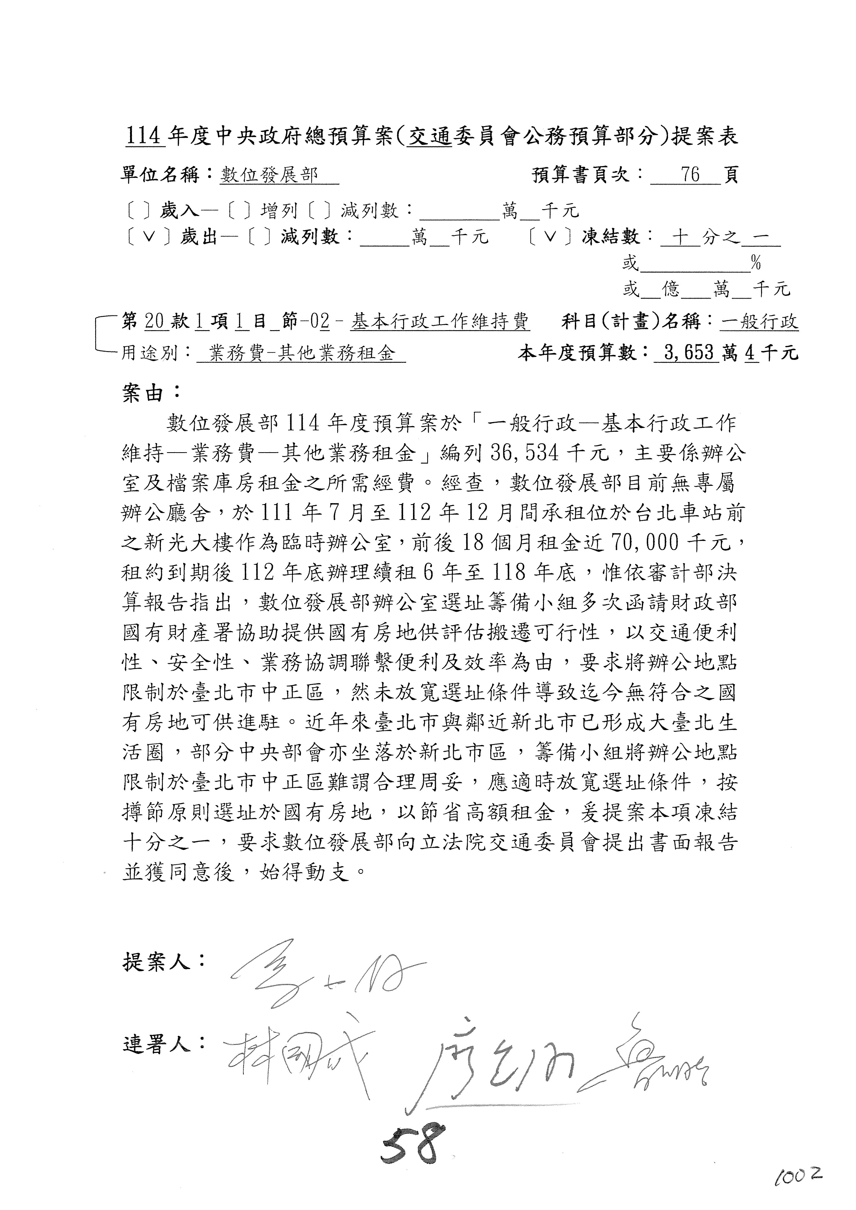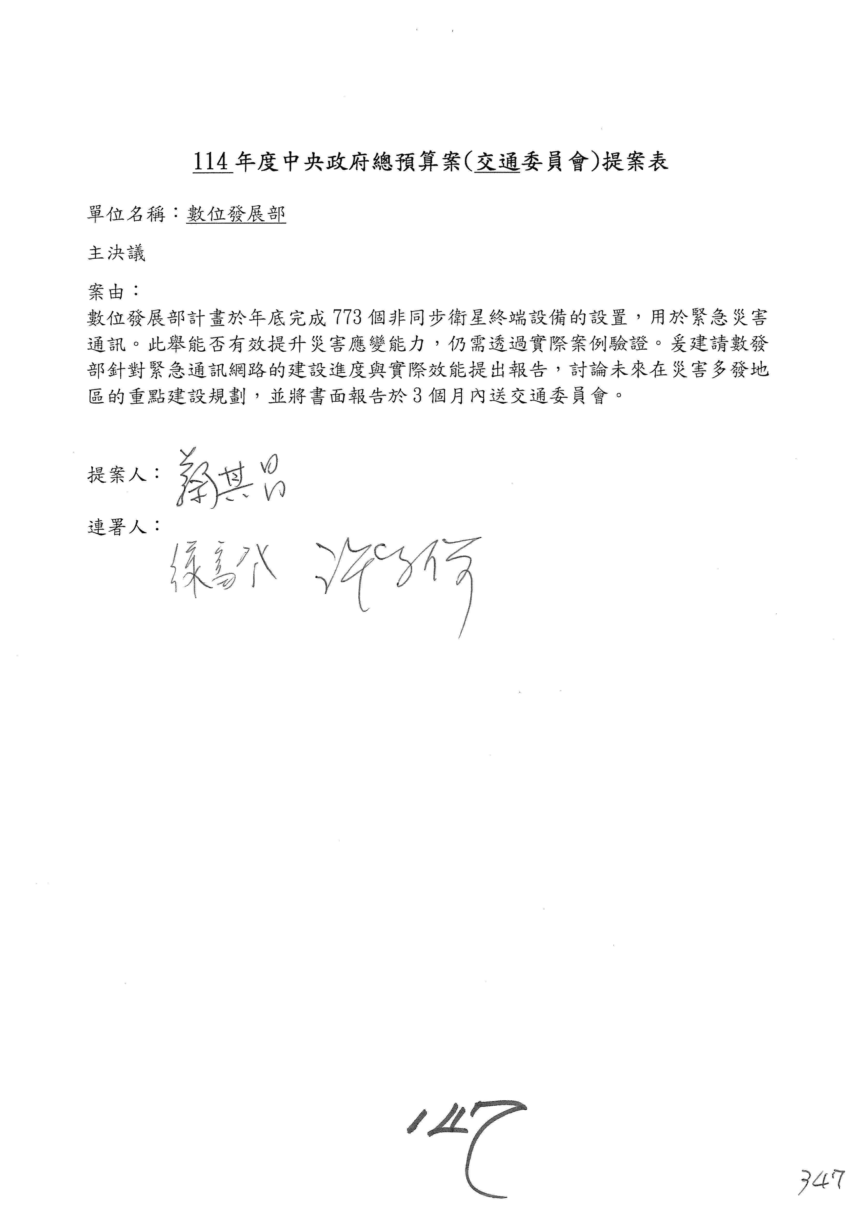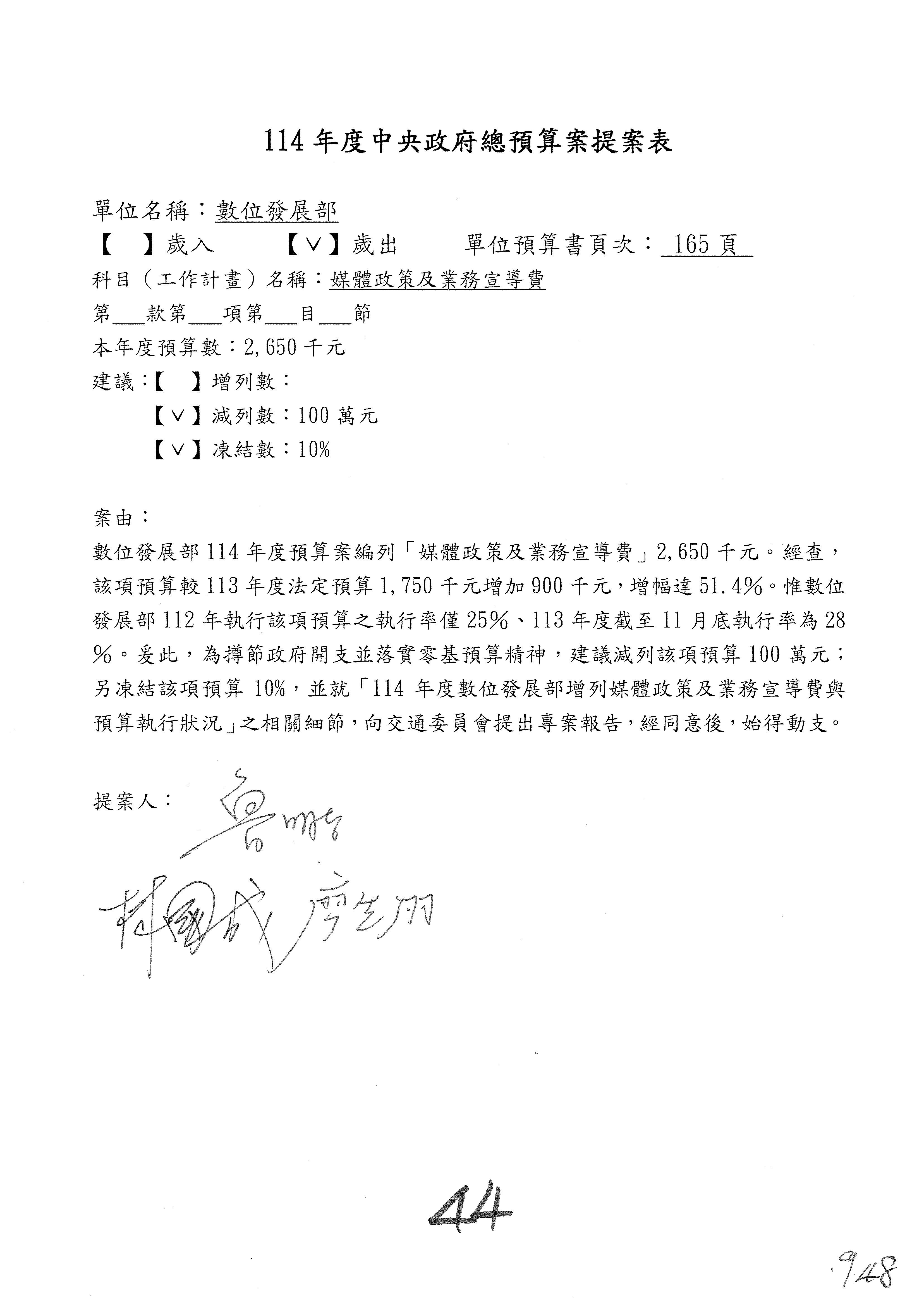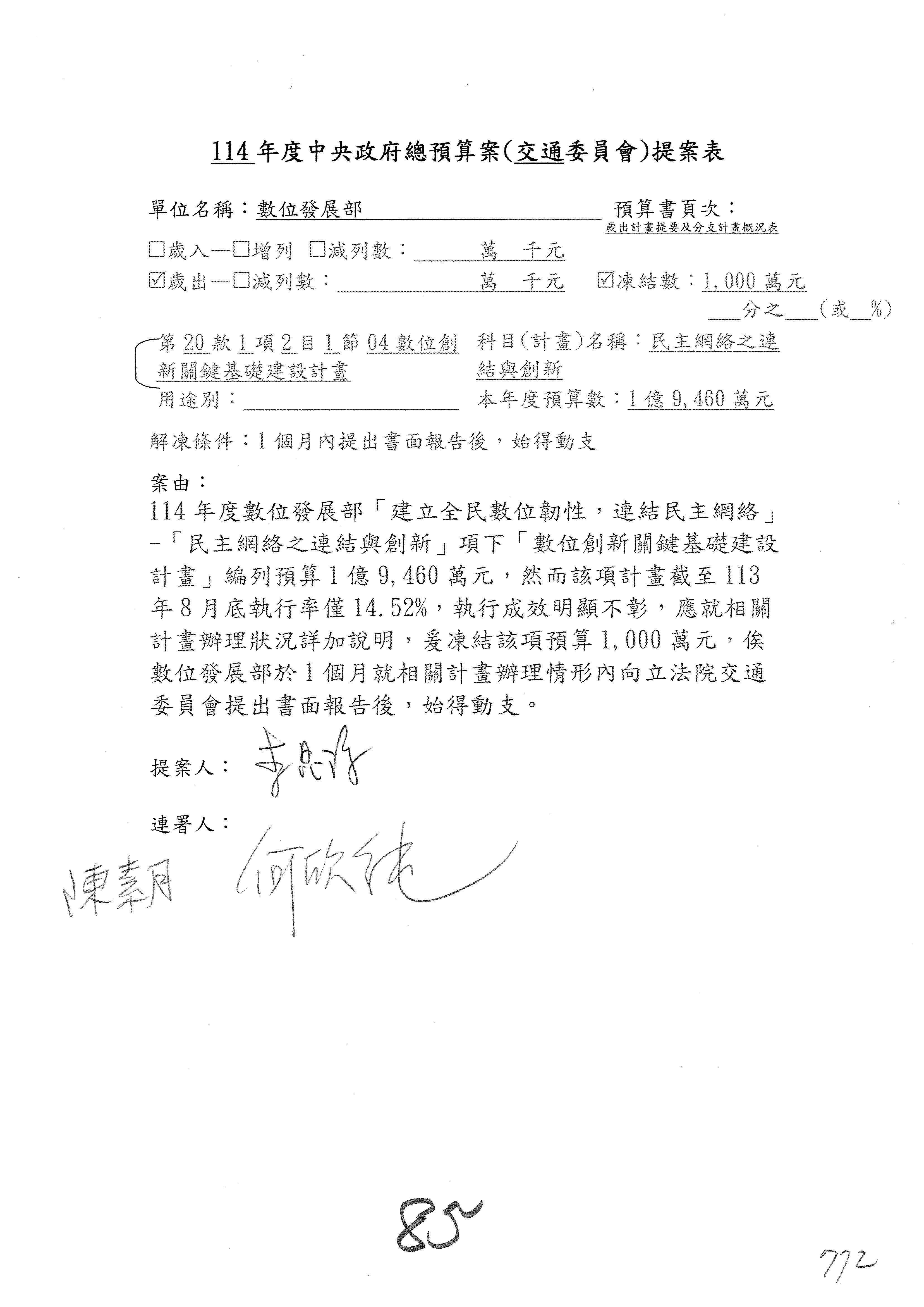 謝謝各位委員,現在請拿出最大本的,這應該算是今天最厚的,也請各位翻開數位發展部114年度單位預算─建議併案及預算表,待會審理預算按照這個併案審理的順序來審理。
