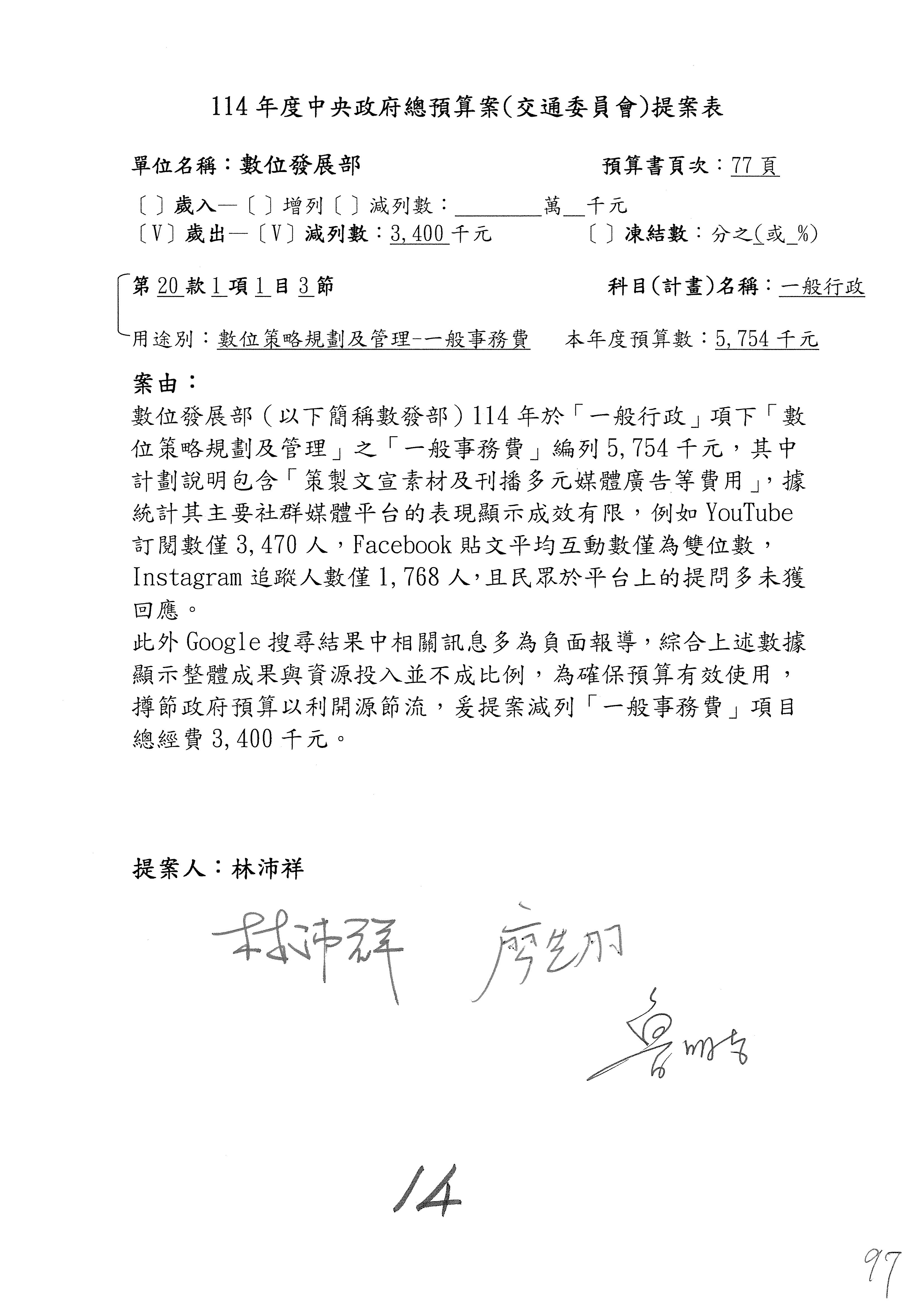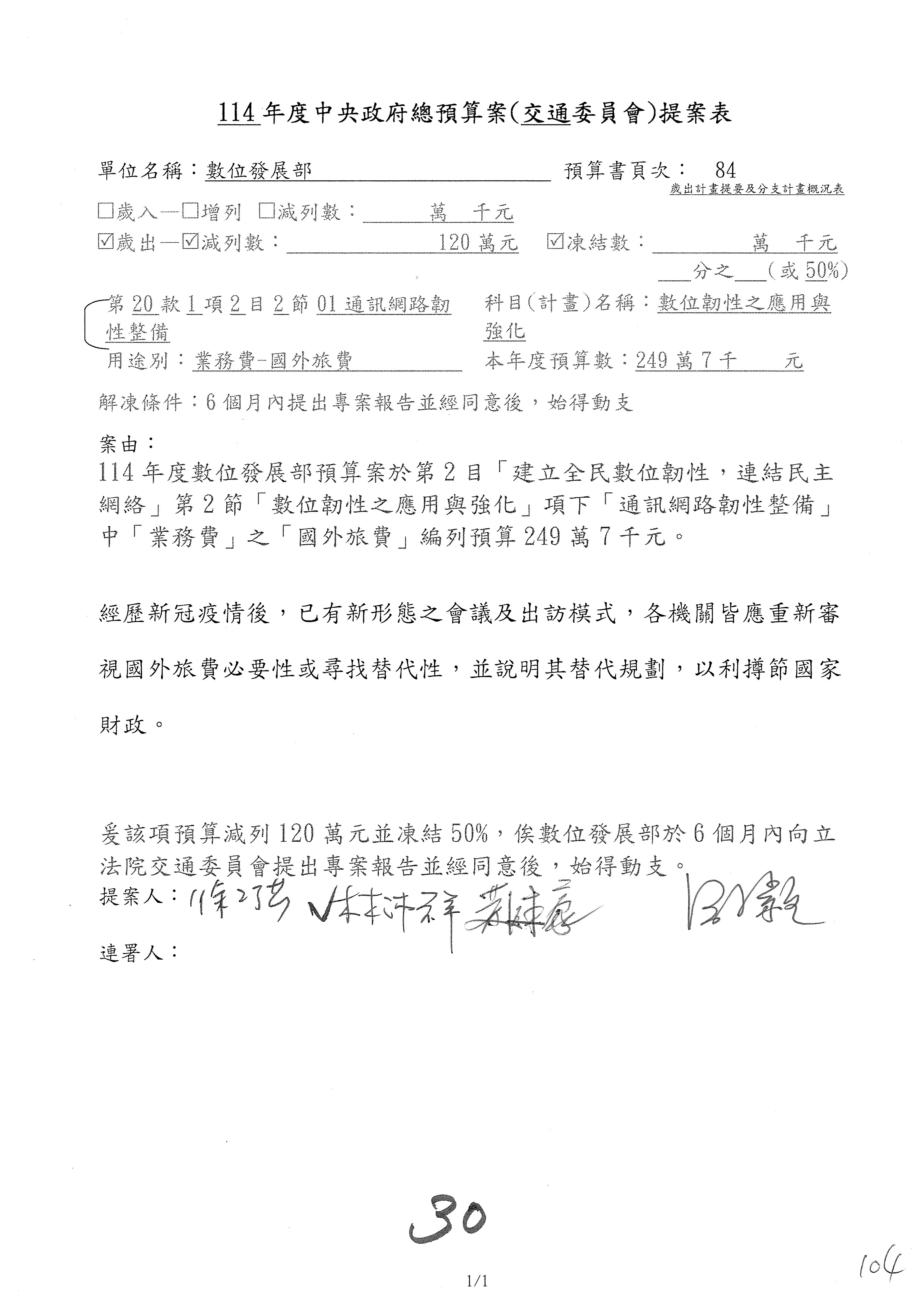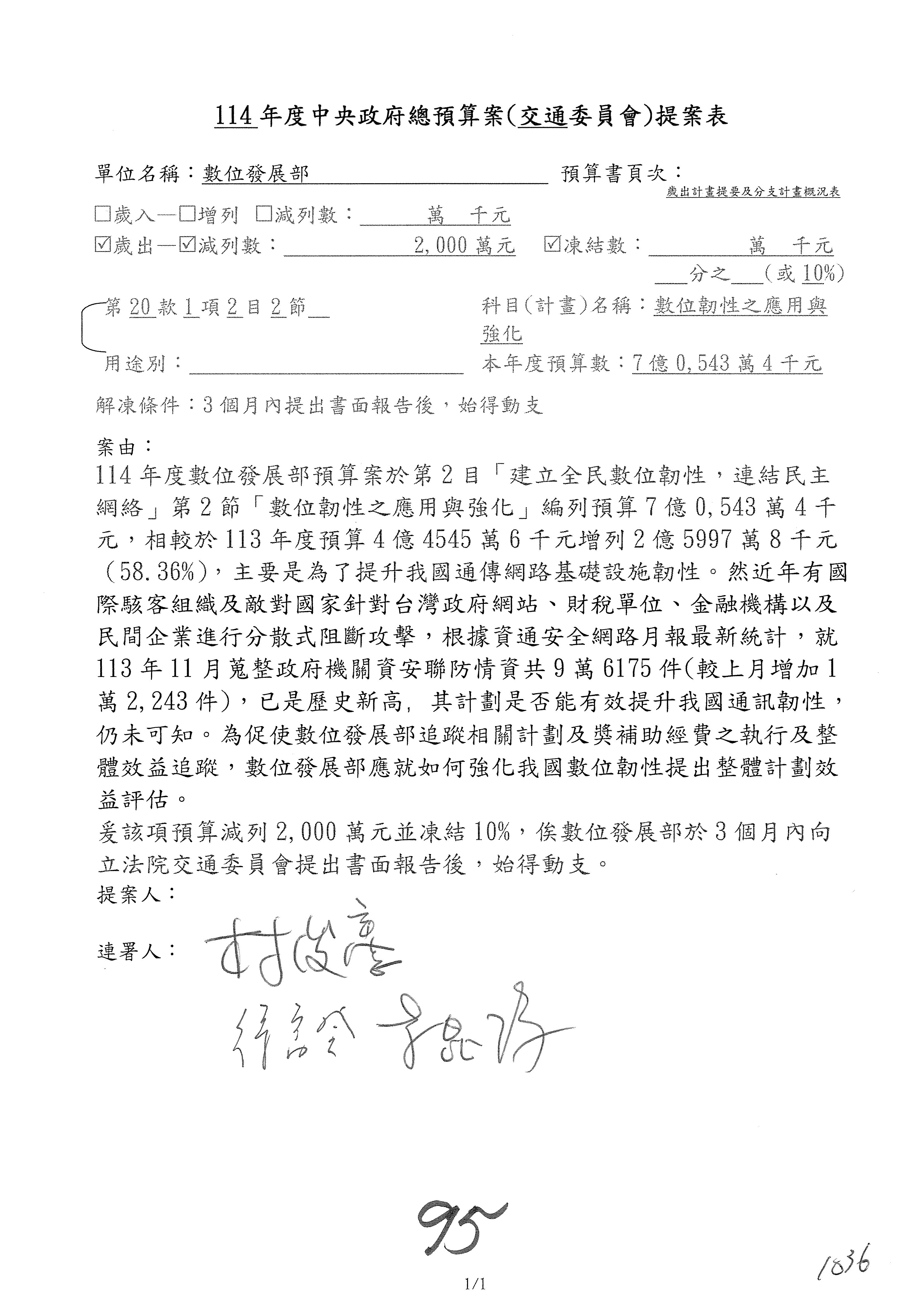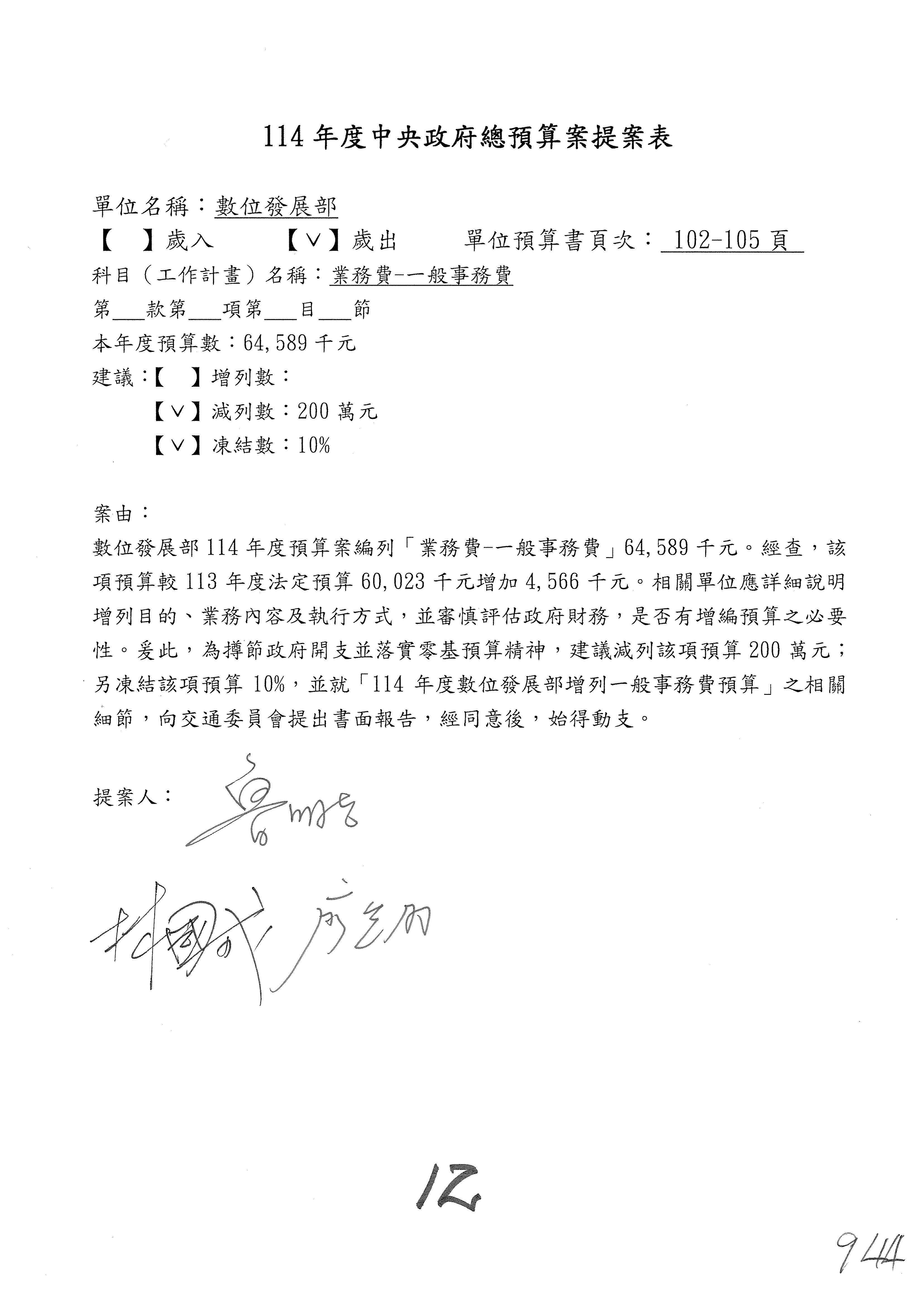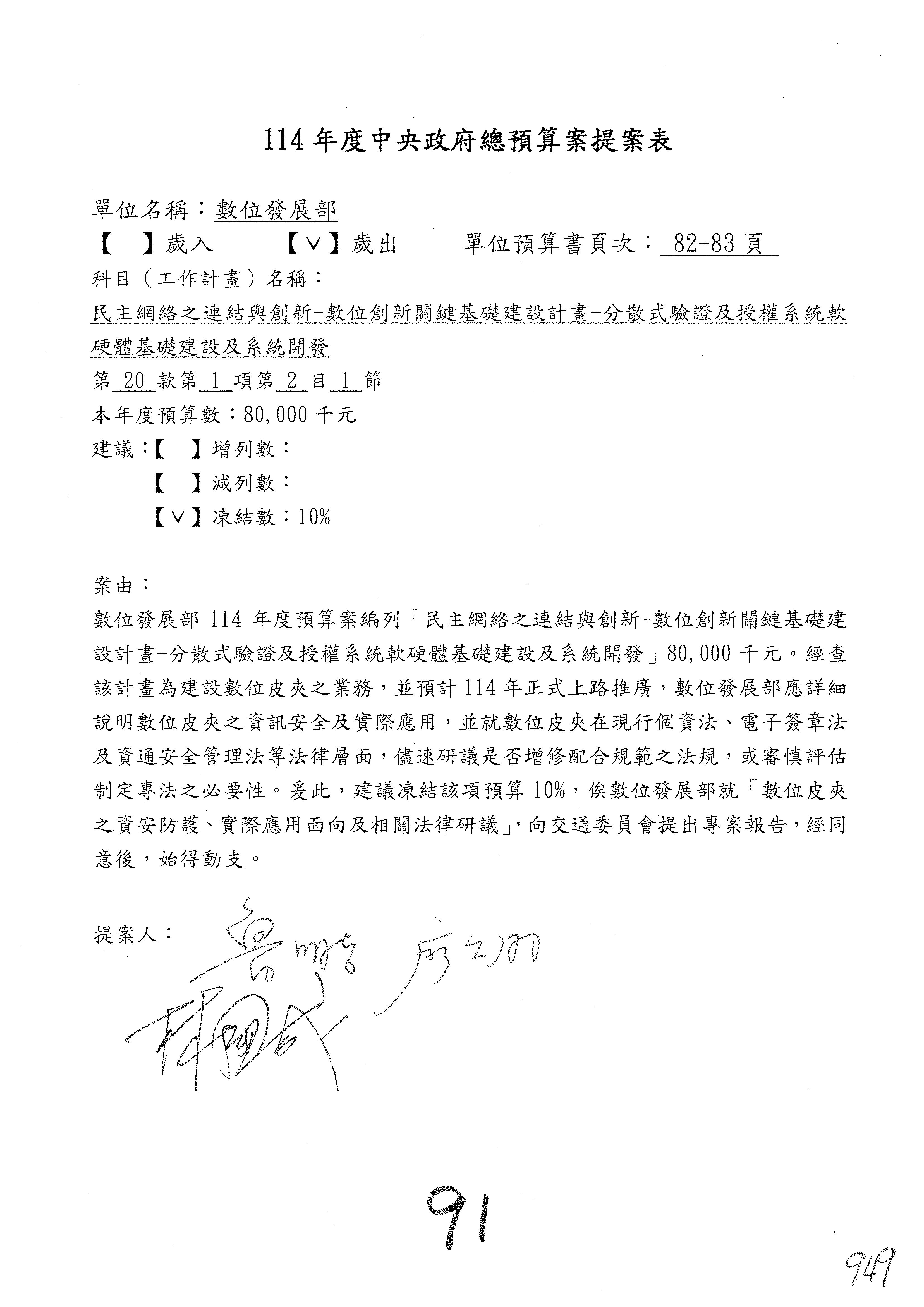 謝謝各位委員,現在請拿出最大本的,這應該算是今天最厚的,也請各位翻開數位發展部114年度單位預算─建議併案及預算表,待會審理預算按照這個併案審理的順序來審理。