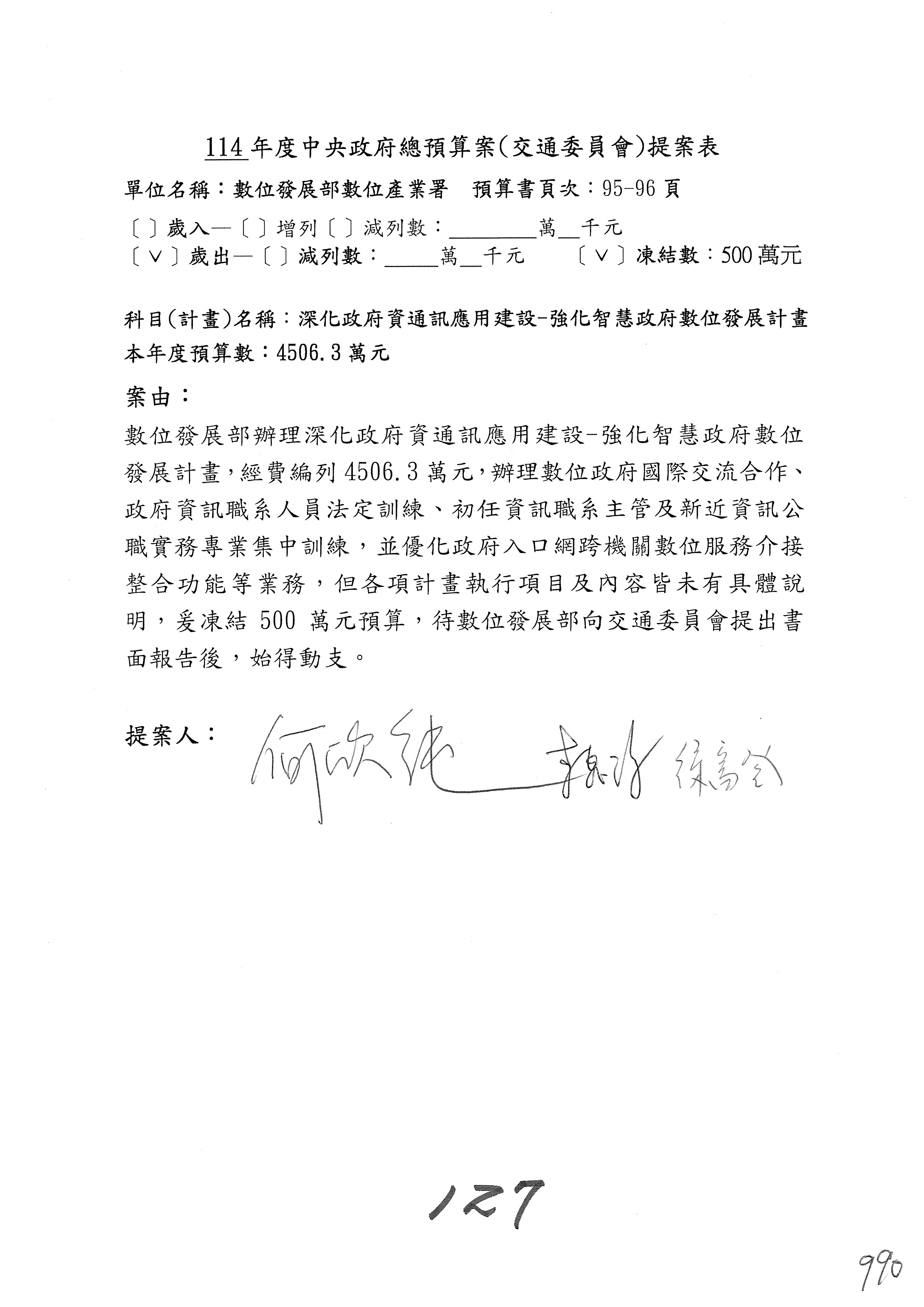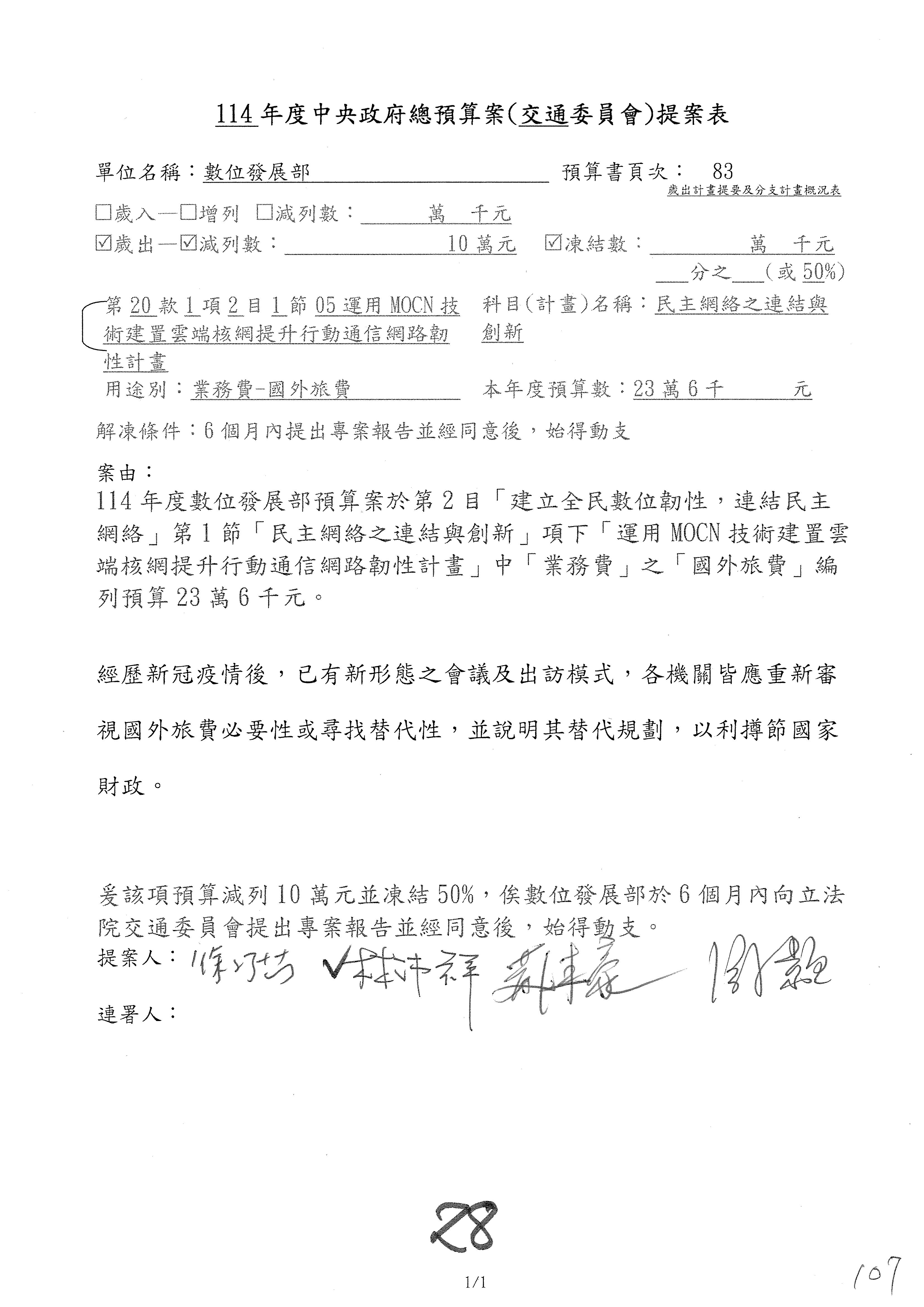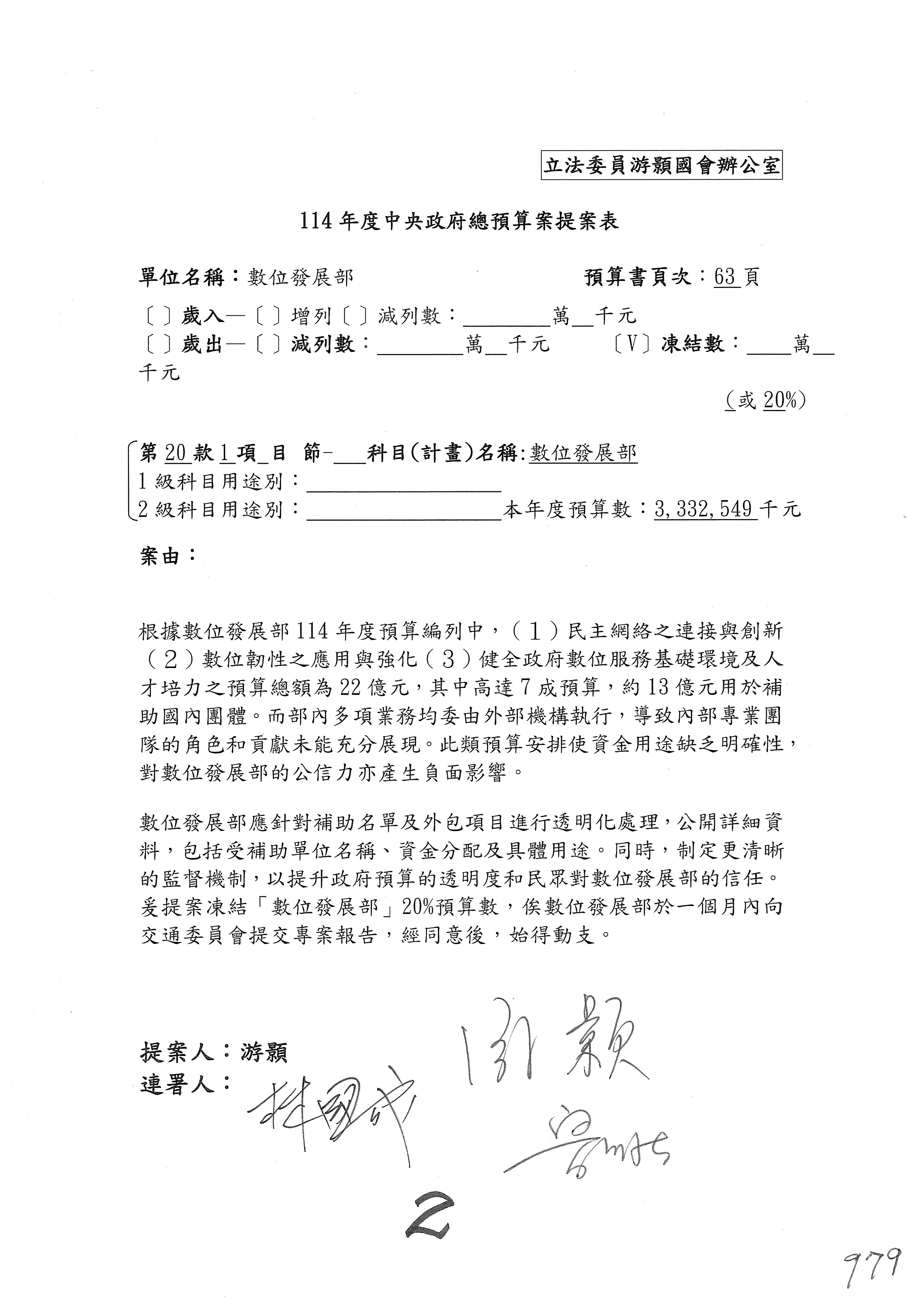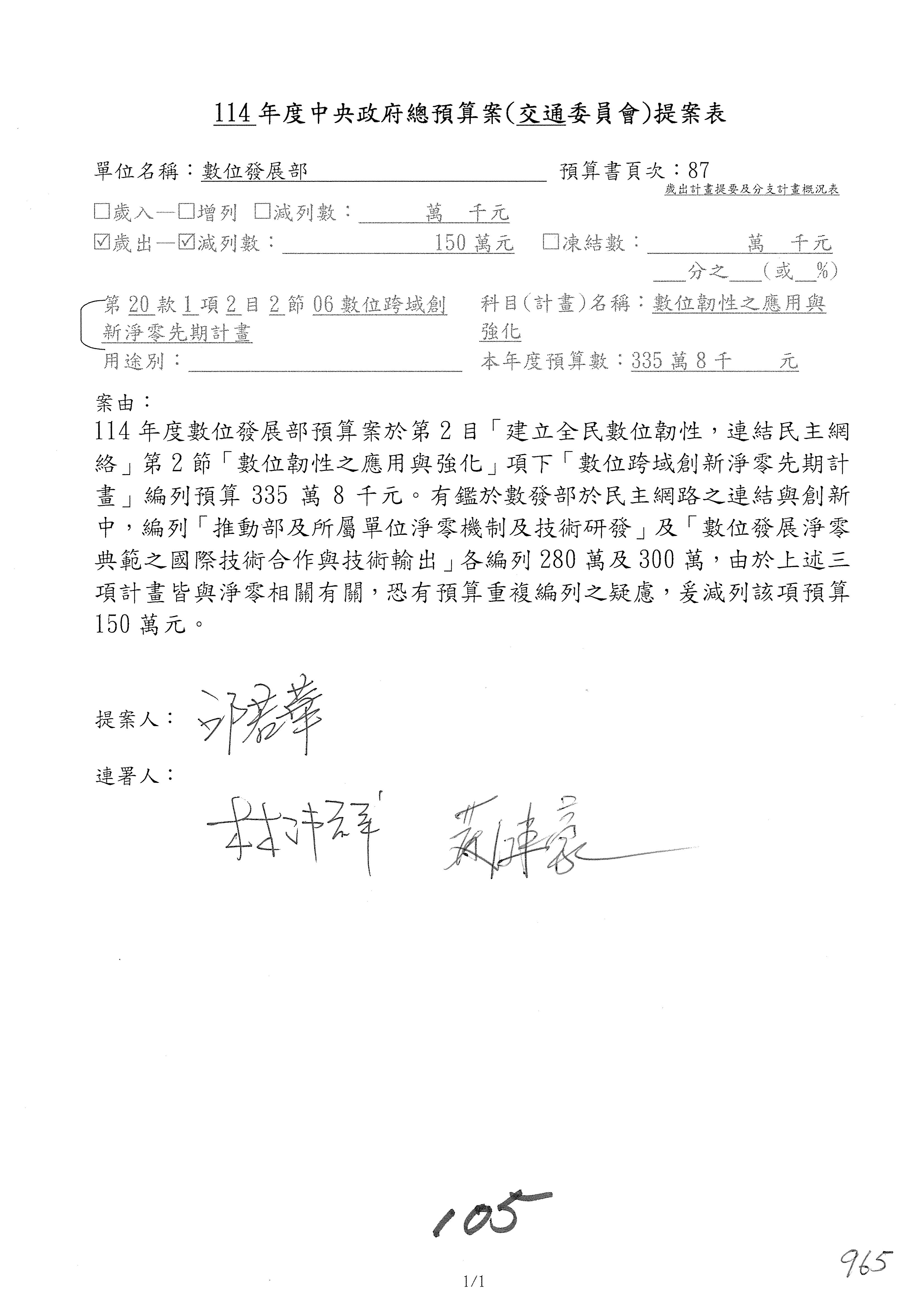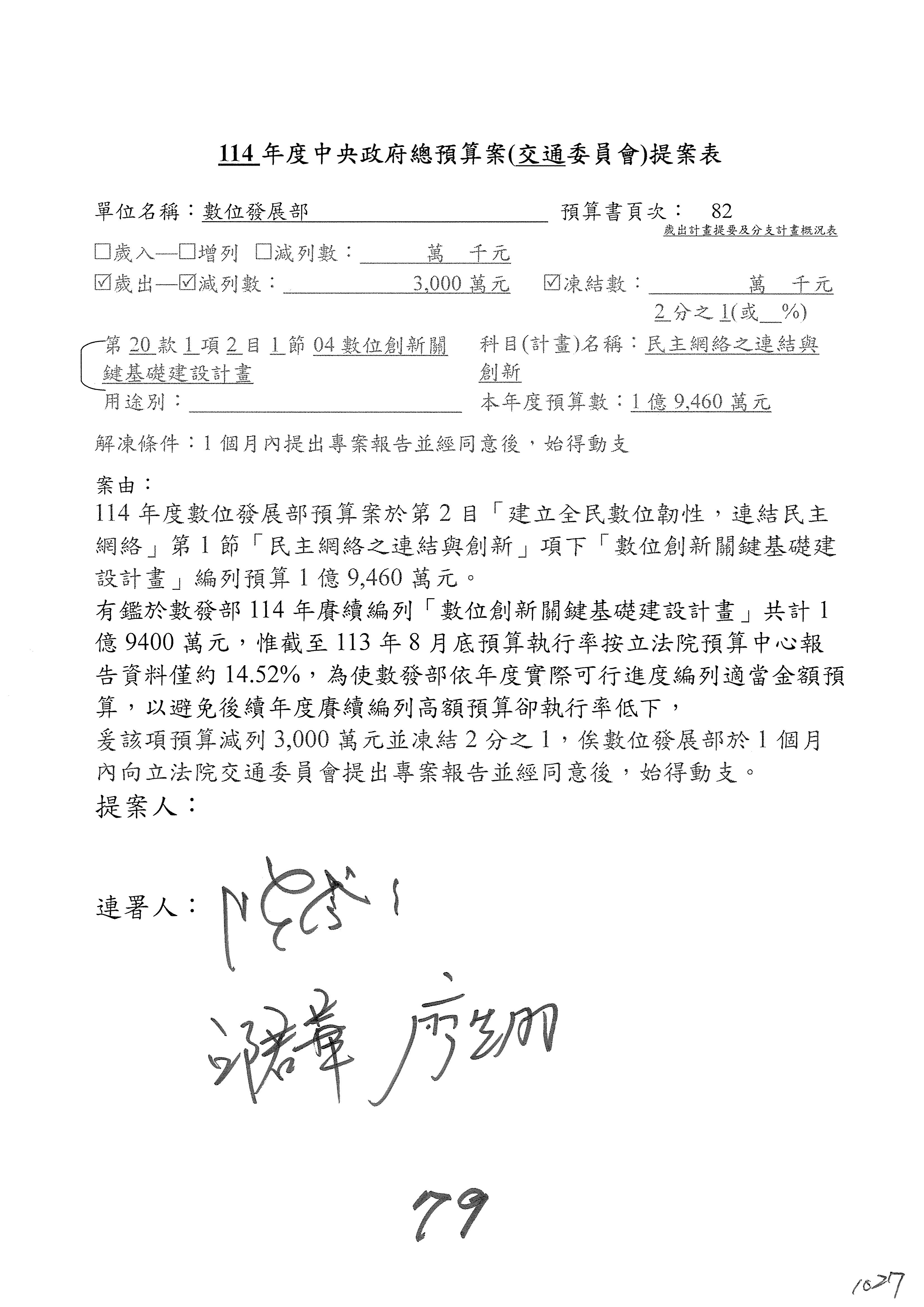 謝謝各位委員,現在請拿出最大本的,這應該算是今天最厚的,也請各位翻開數位發展部114年度單位預算─建議併案及預算表,待會審理預算按照這個併案審理的順序來審理。