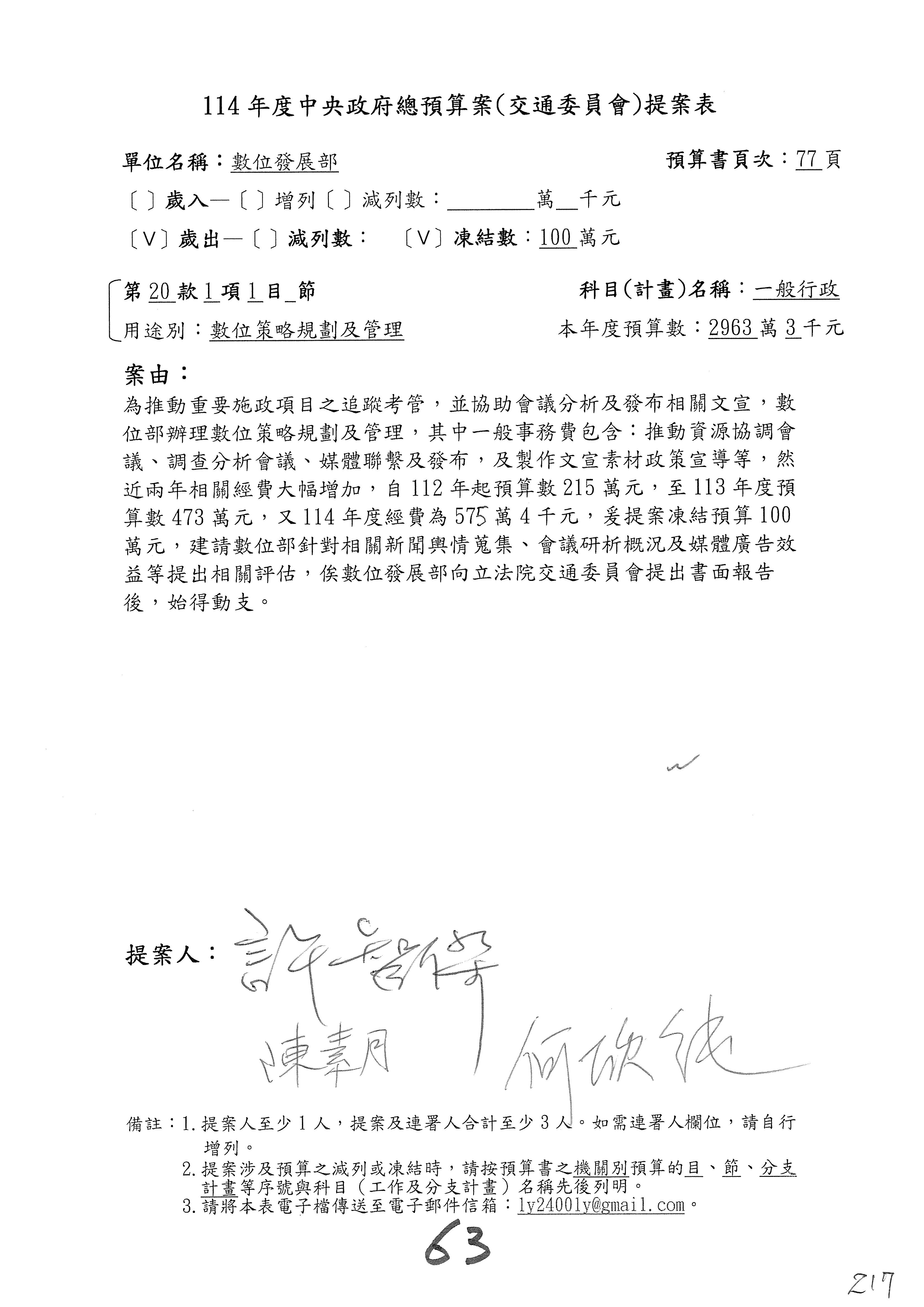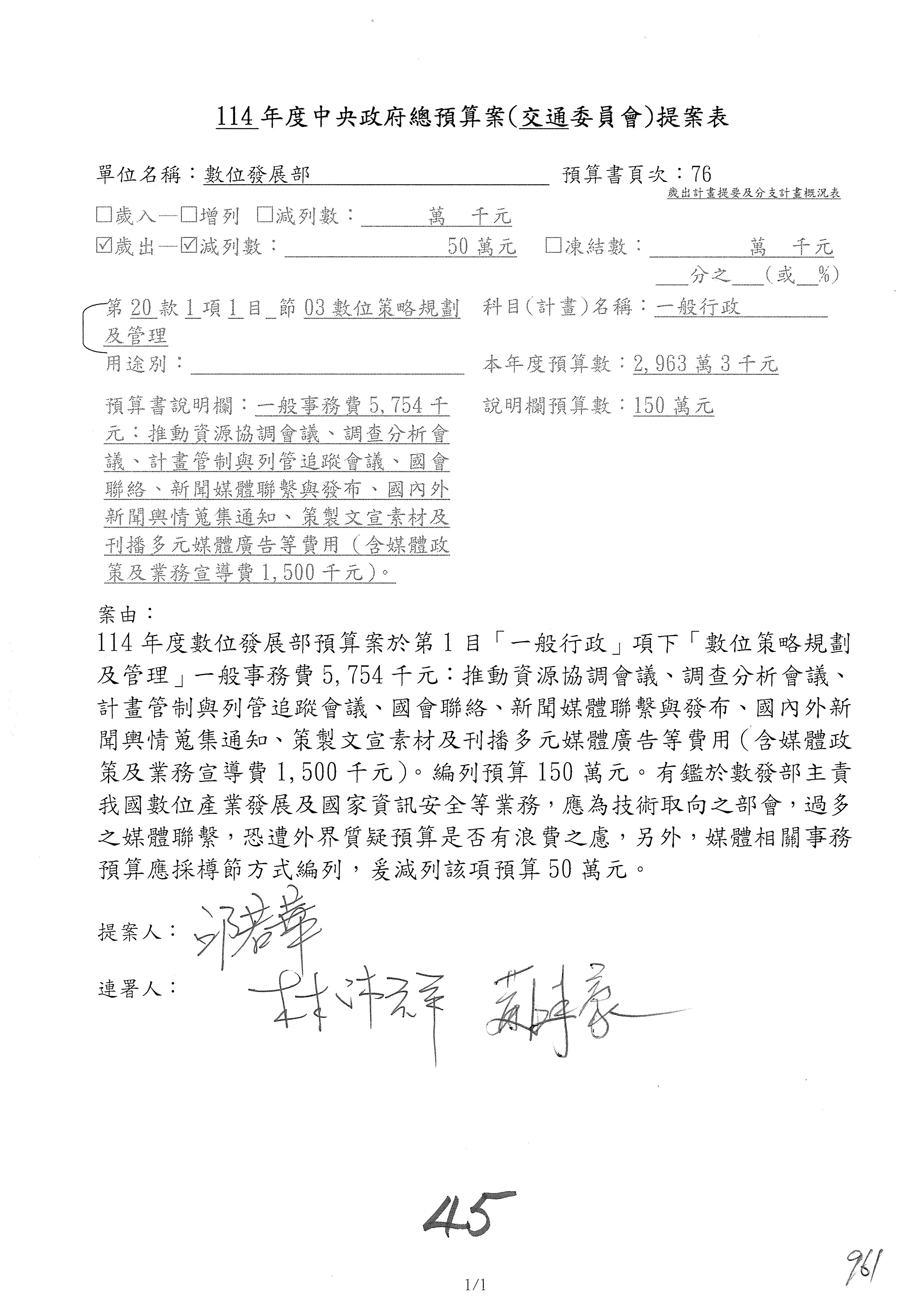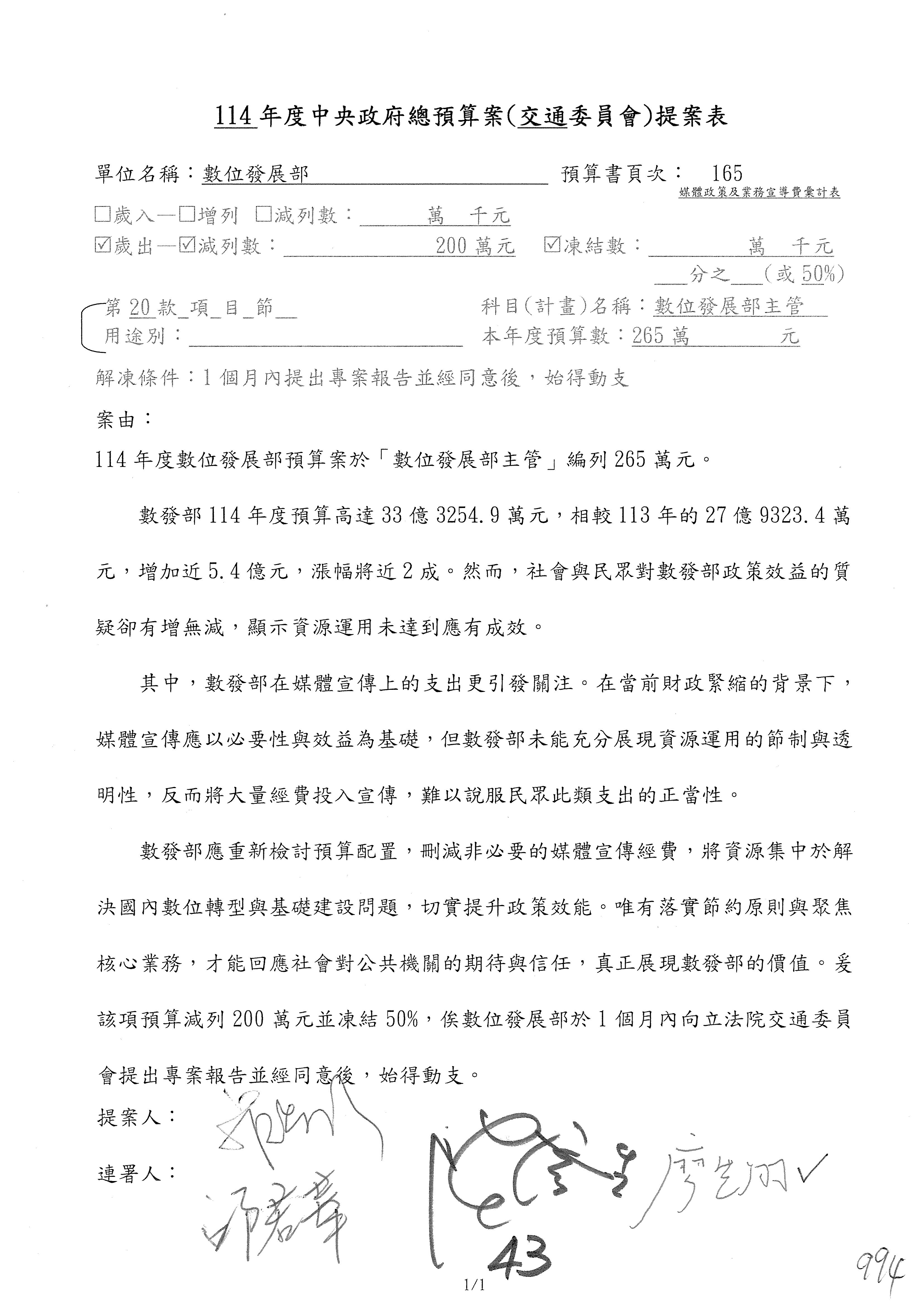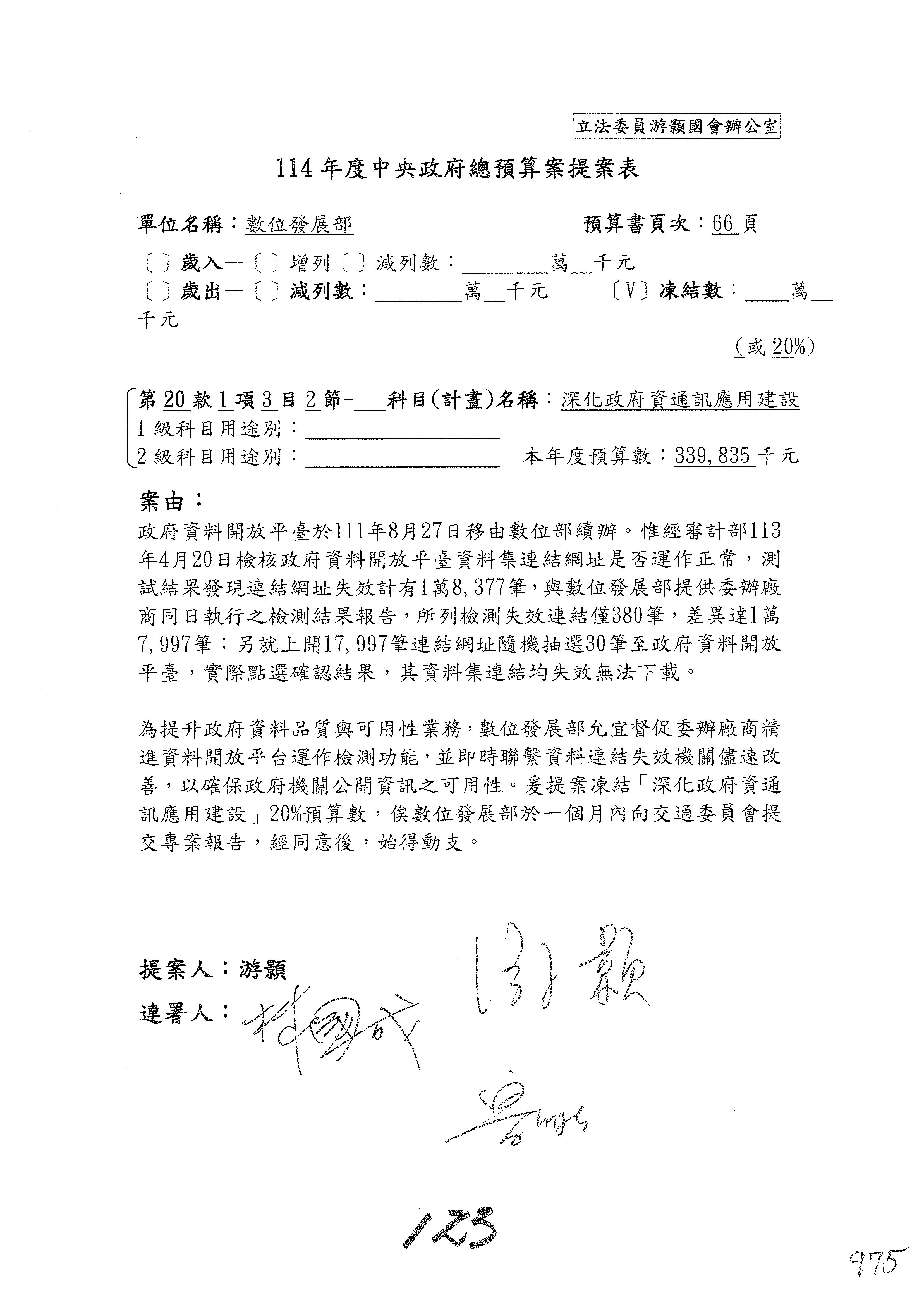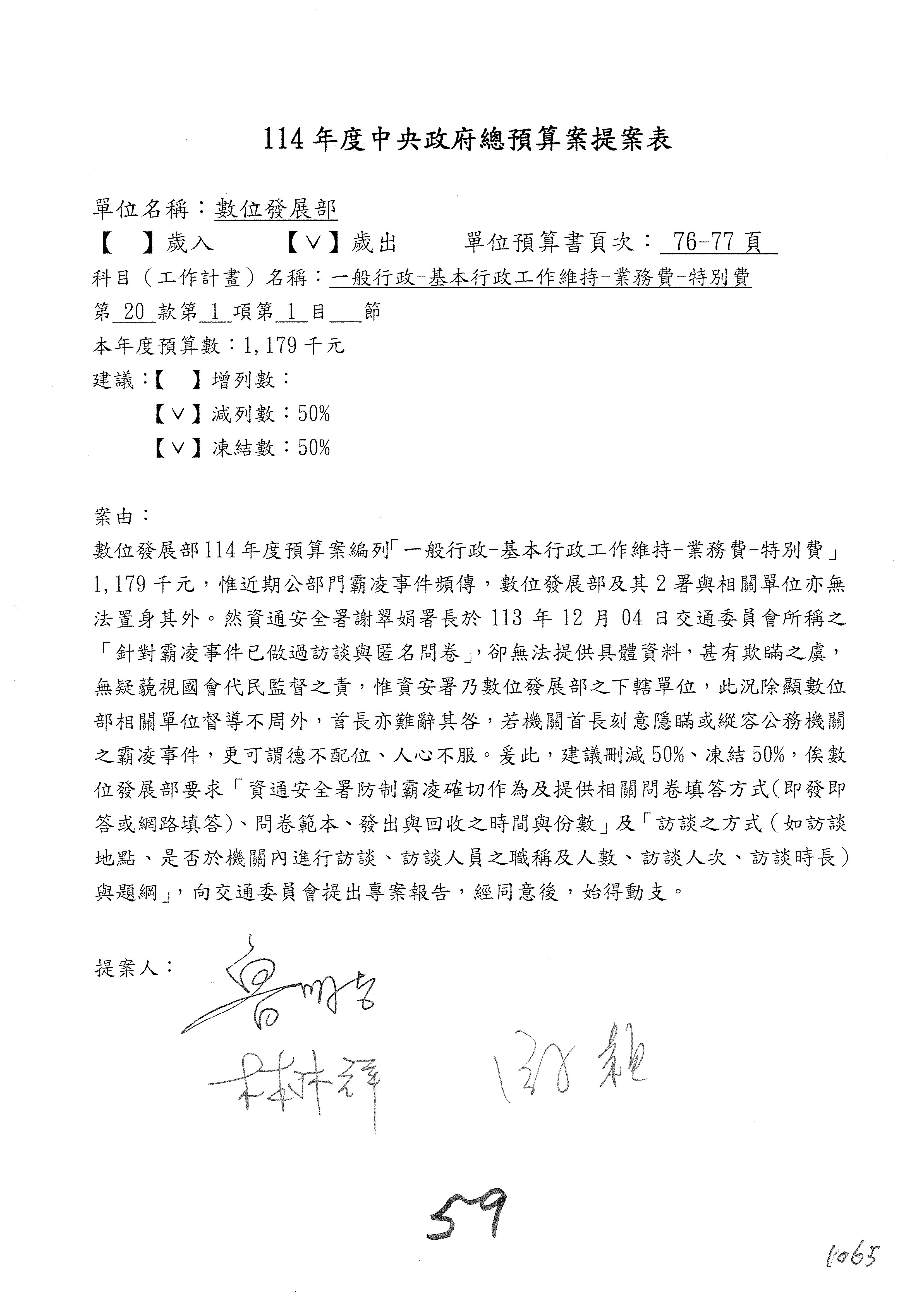 謝謝各位委員,現在請拿出最大本的,這應該算是今天最厚的,也請各位翻開數位發展部114年度單位預算─建議併案及預算表,待會審理預算按照這個併案審理的順序來審理。
