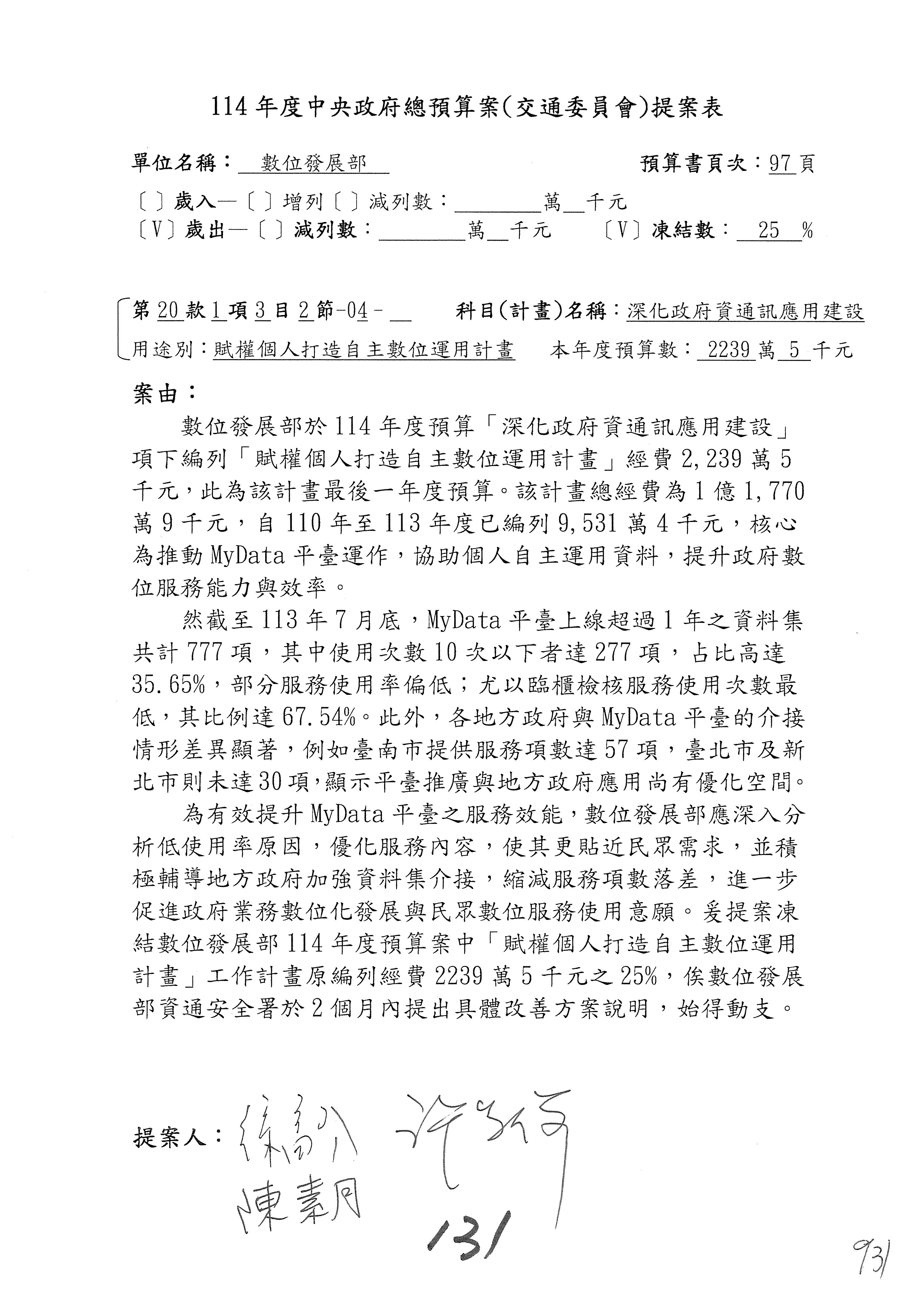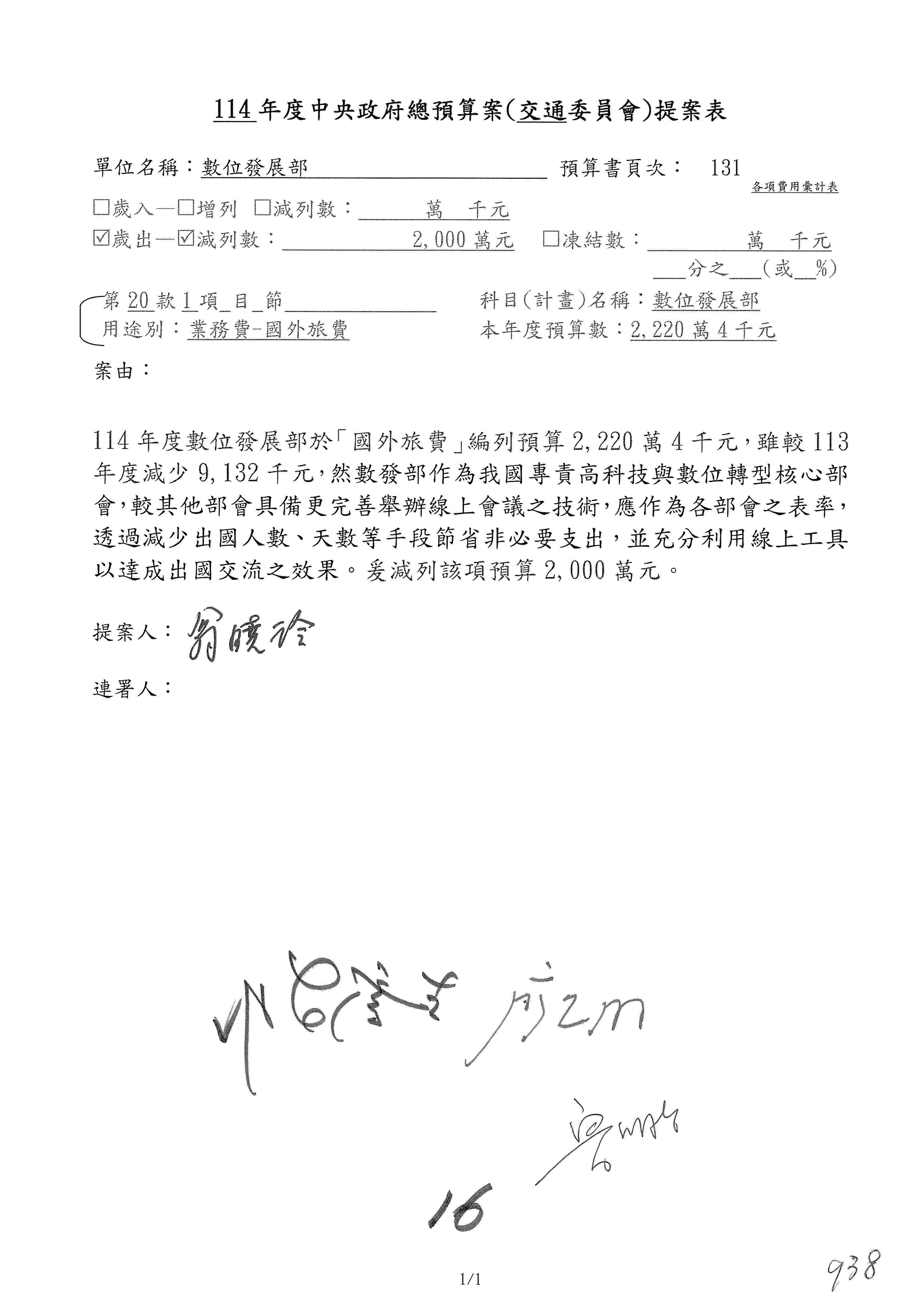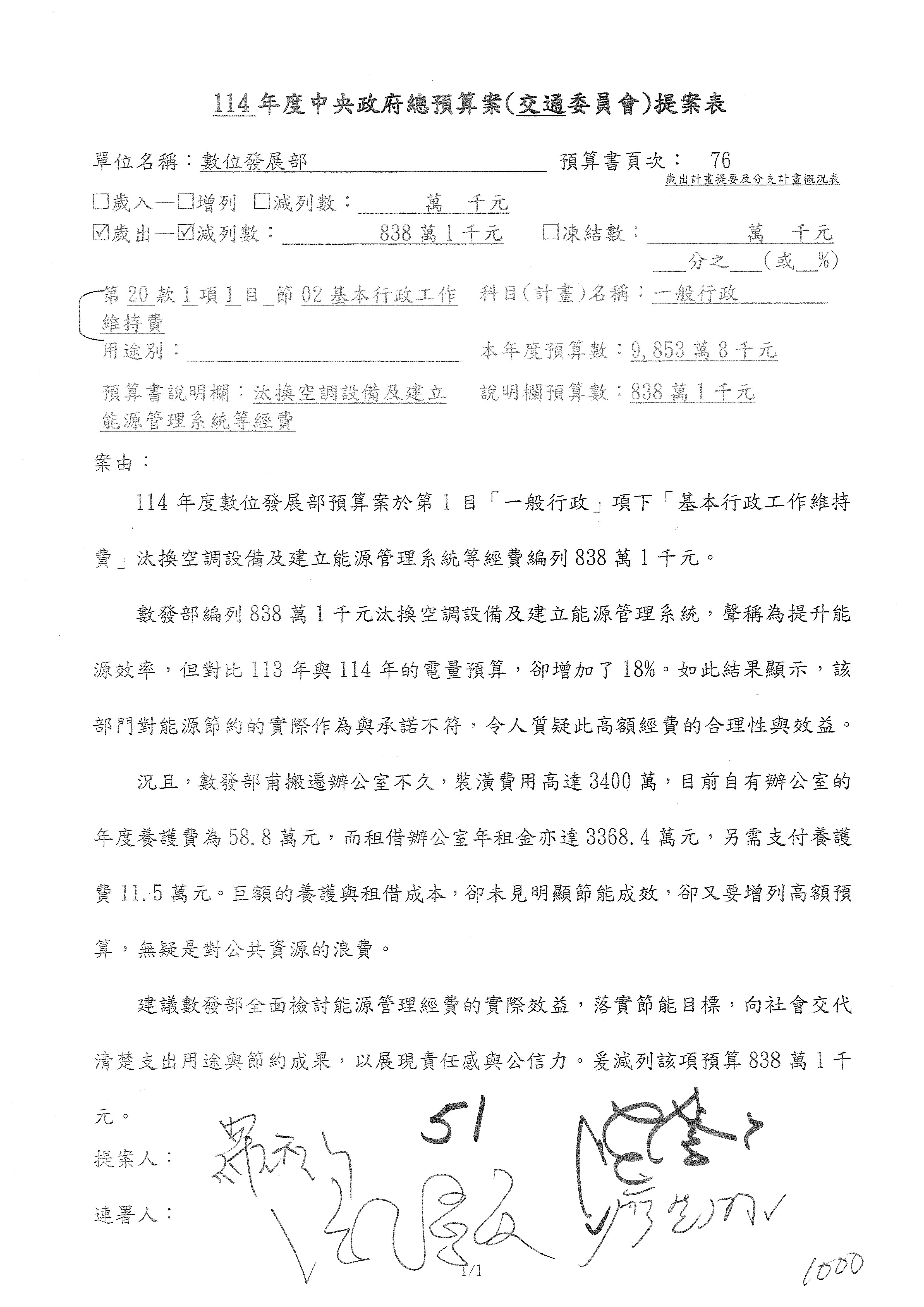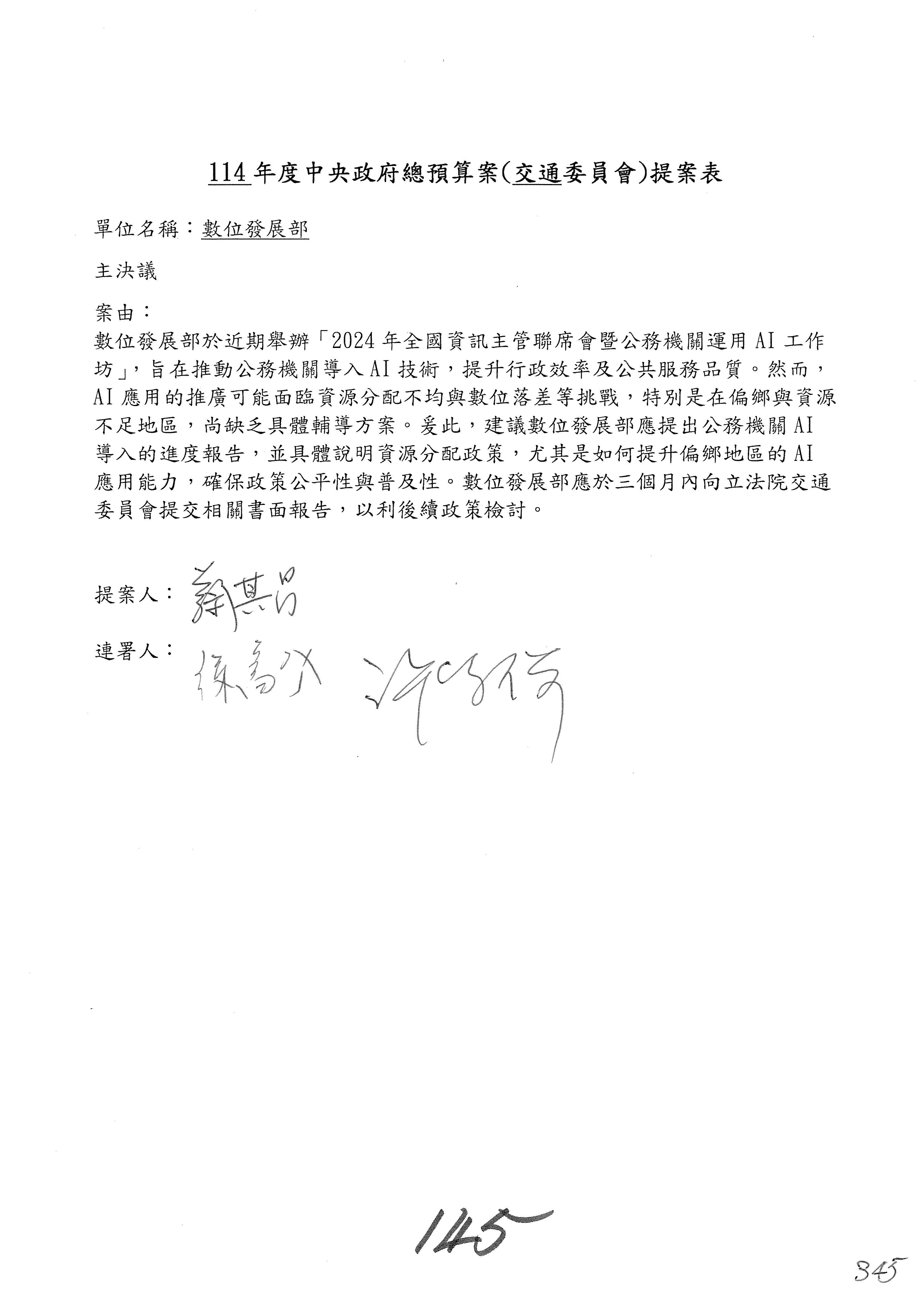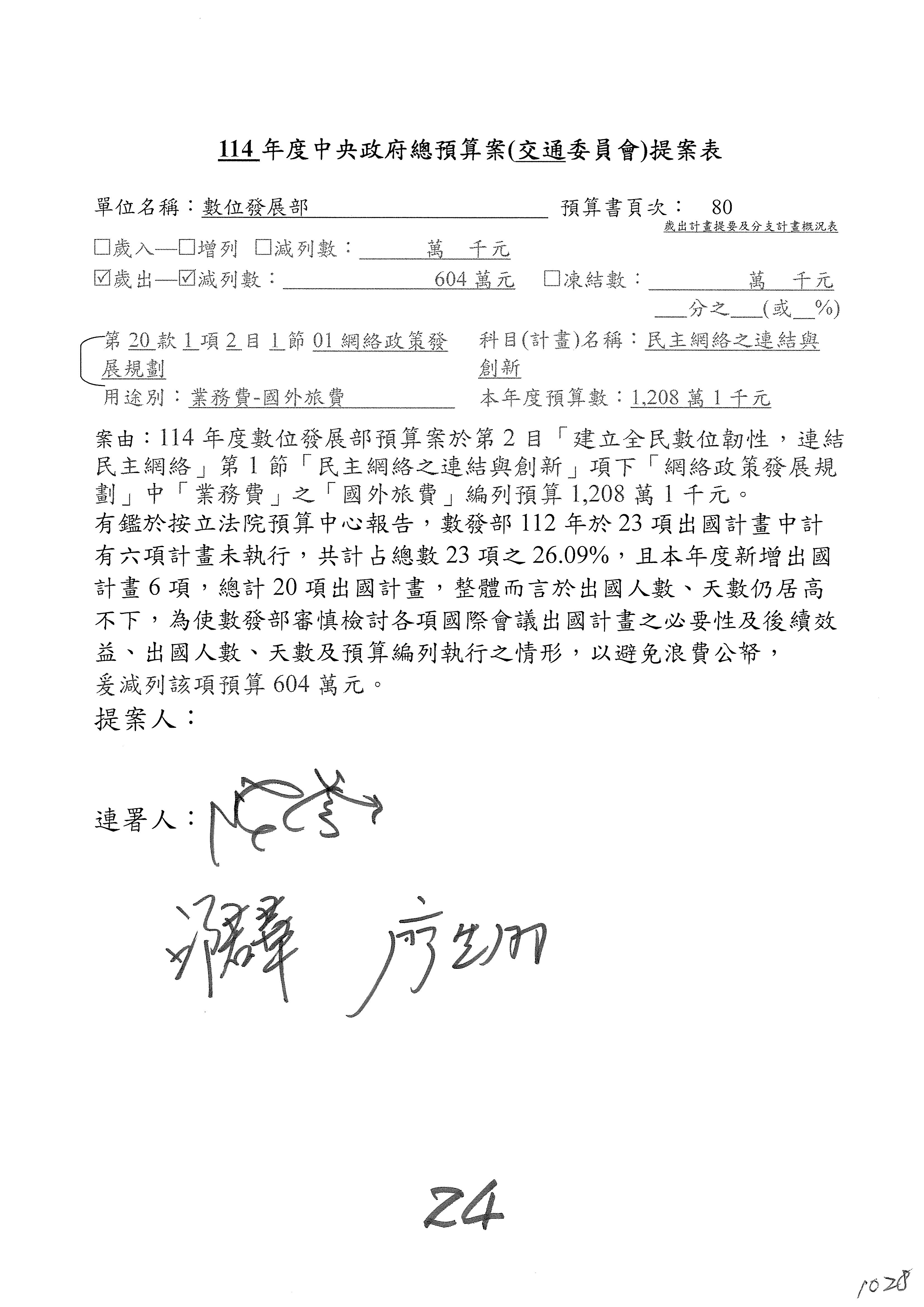 謝謝各位委員,現在請拿出最大本的,這應該算是今天最厚的,也請各位翻開數位發展部114年度單位預算─建議併案及預算表,待會審理預算按照這個併案審理的順序來審理。