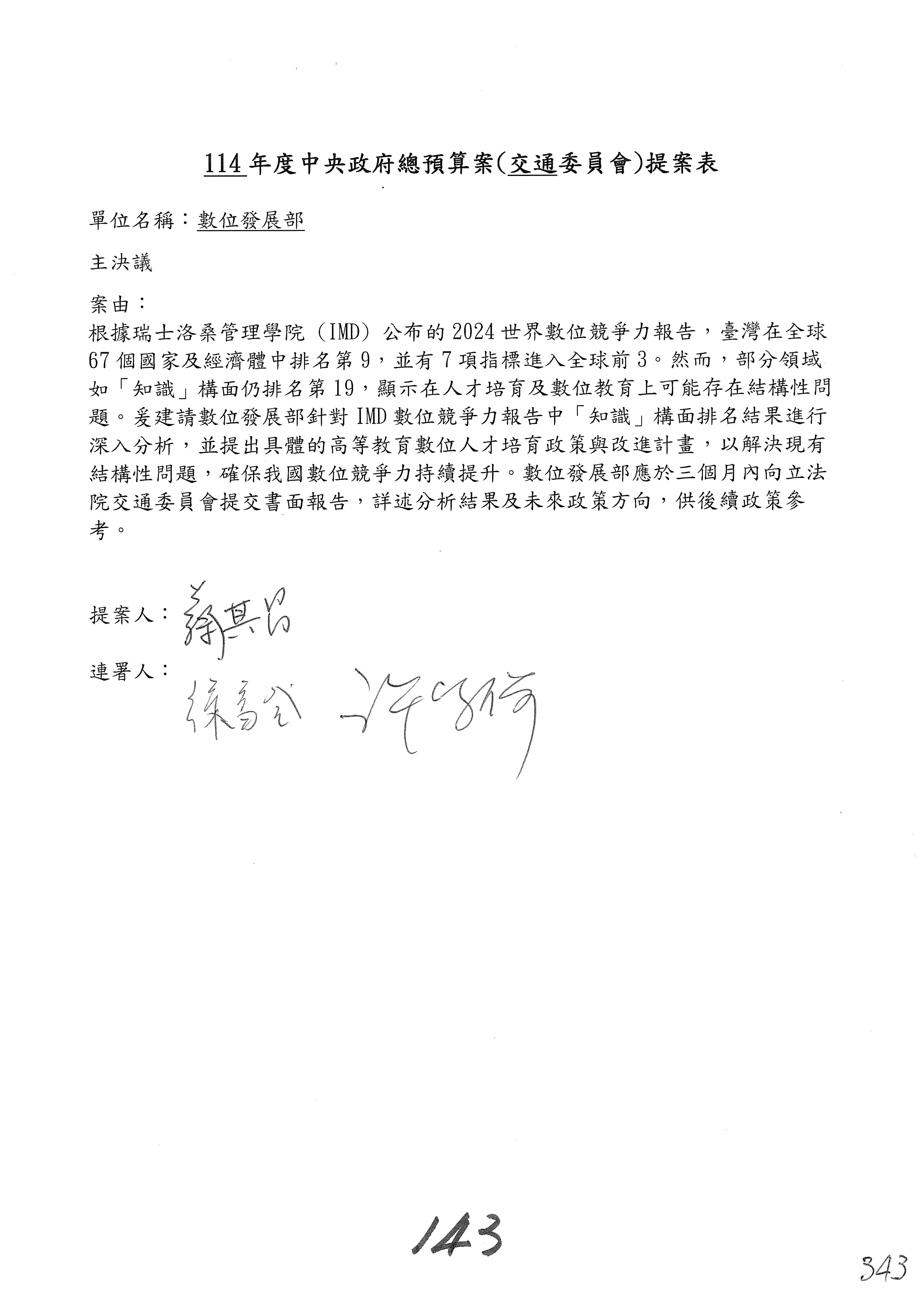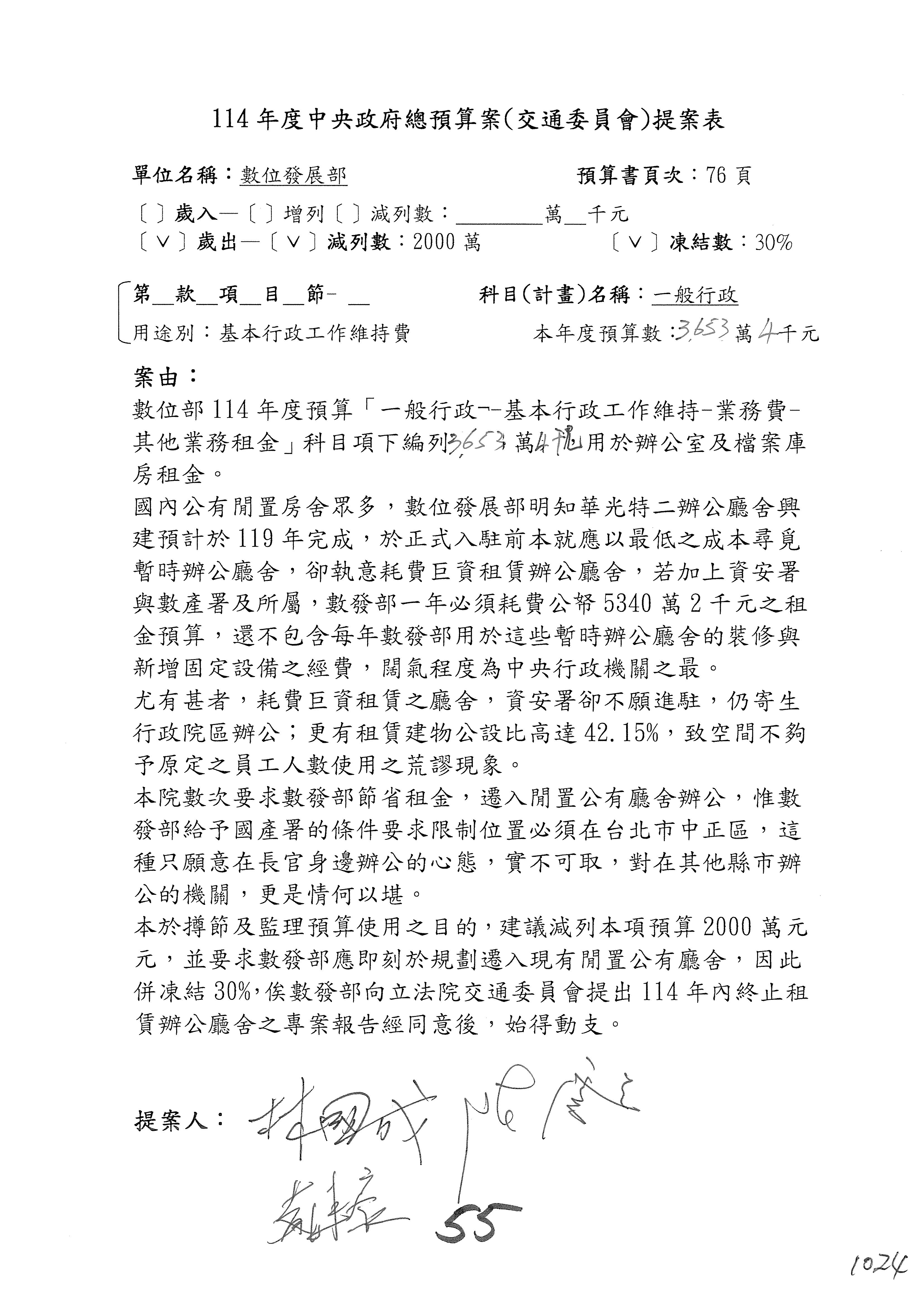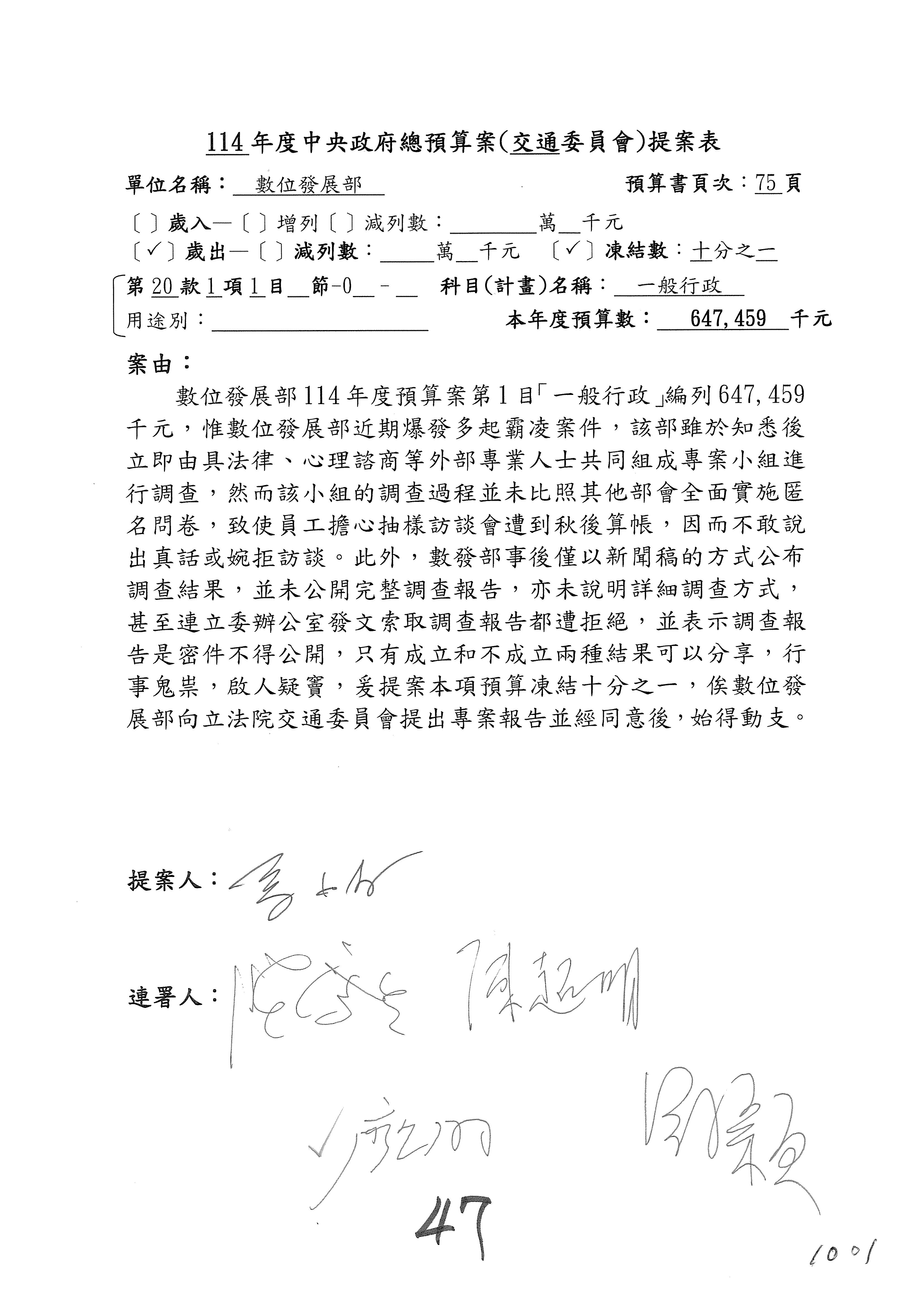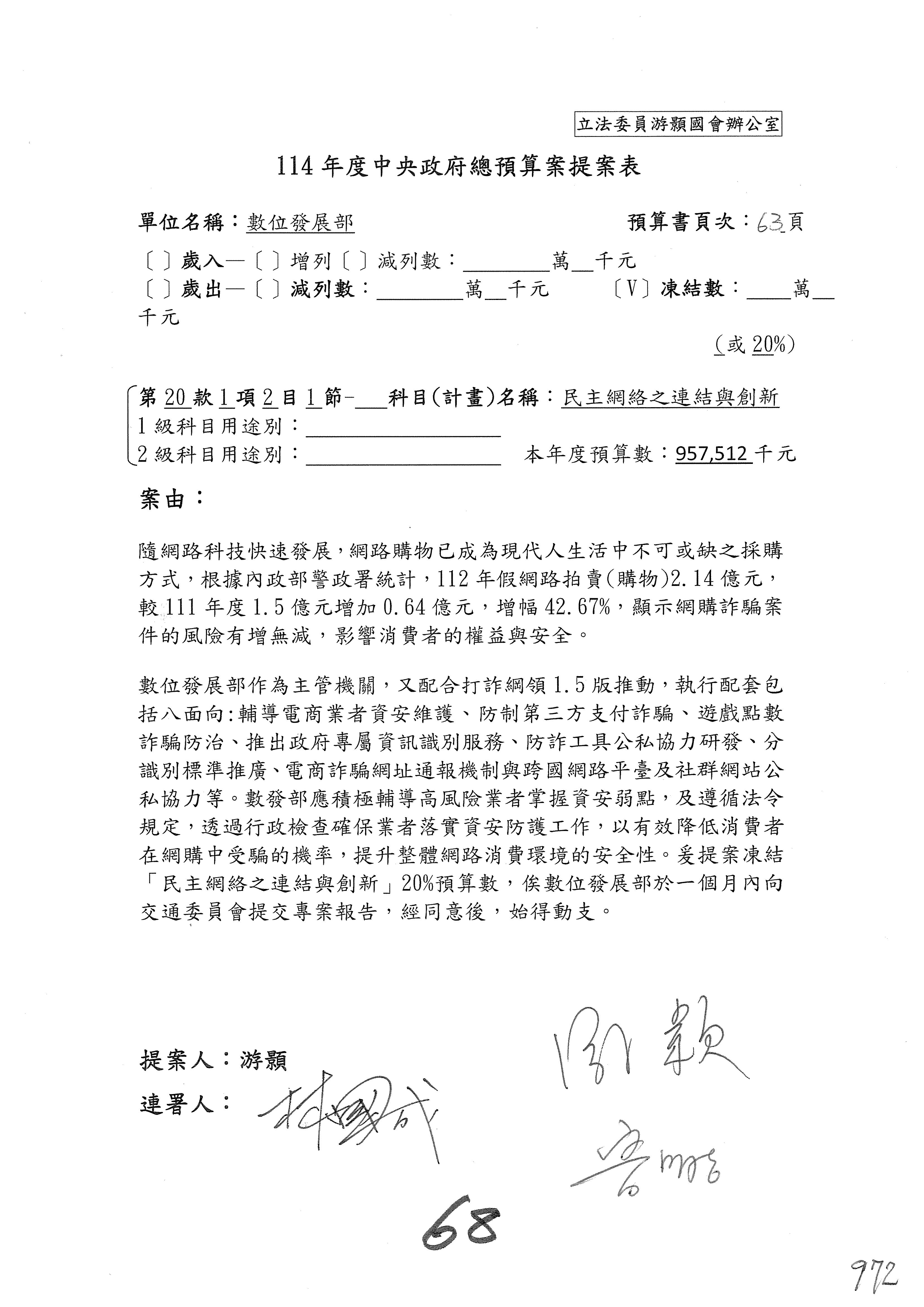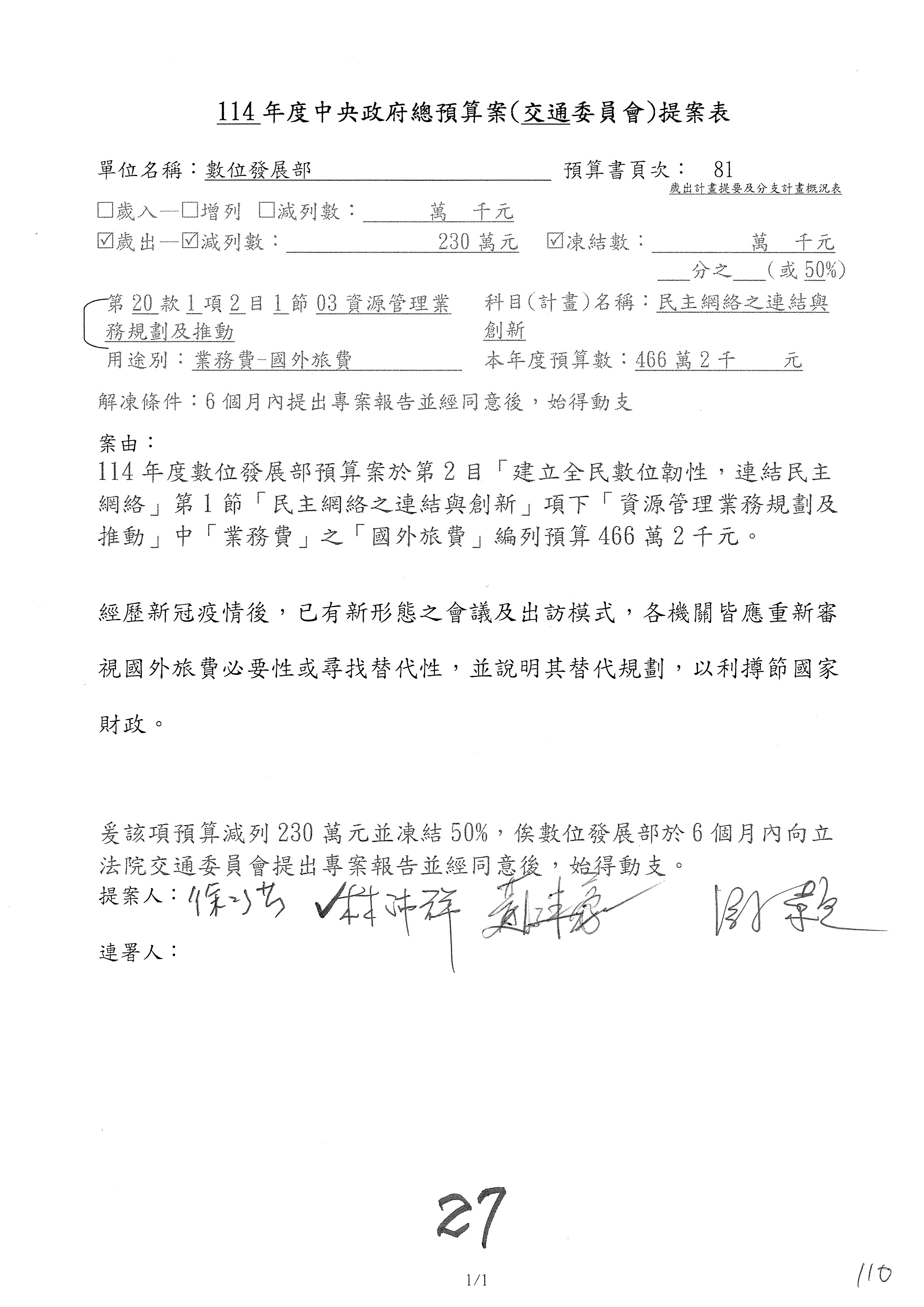 謝謝各位委員,現在請拿出最大本的,這應該算是今天最厚的,也請各位翻開數位發展部114年度單位預算─建議併案及預算表,待會審理預算按照這個併案審理的順序來審理。