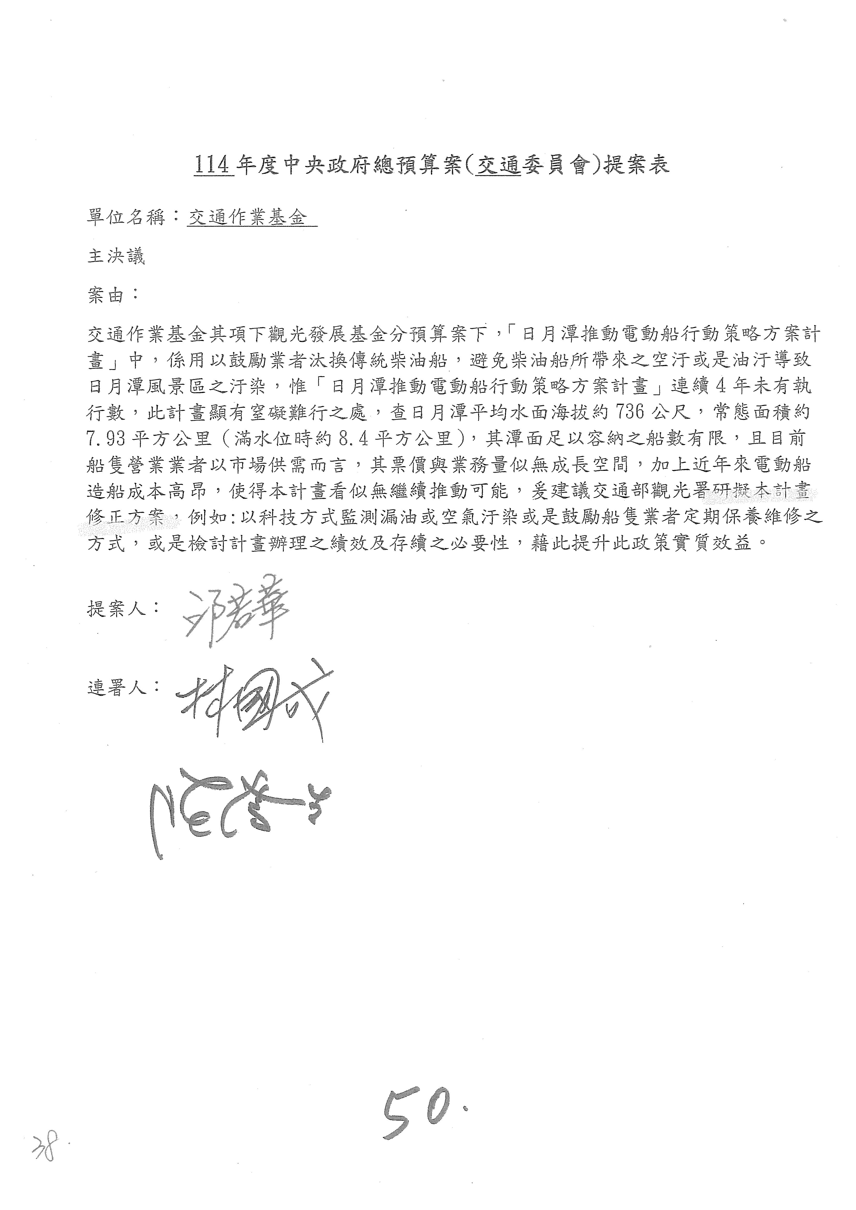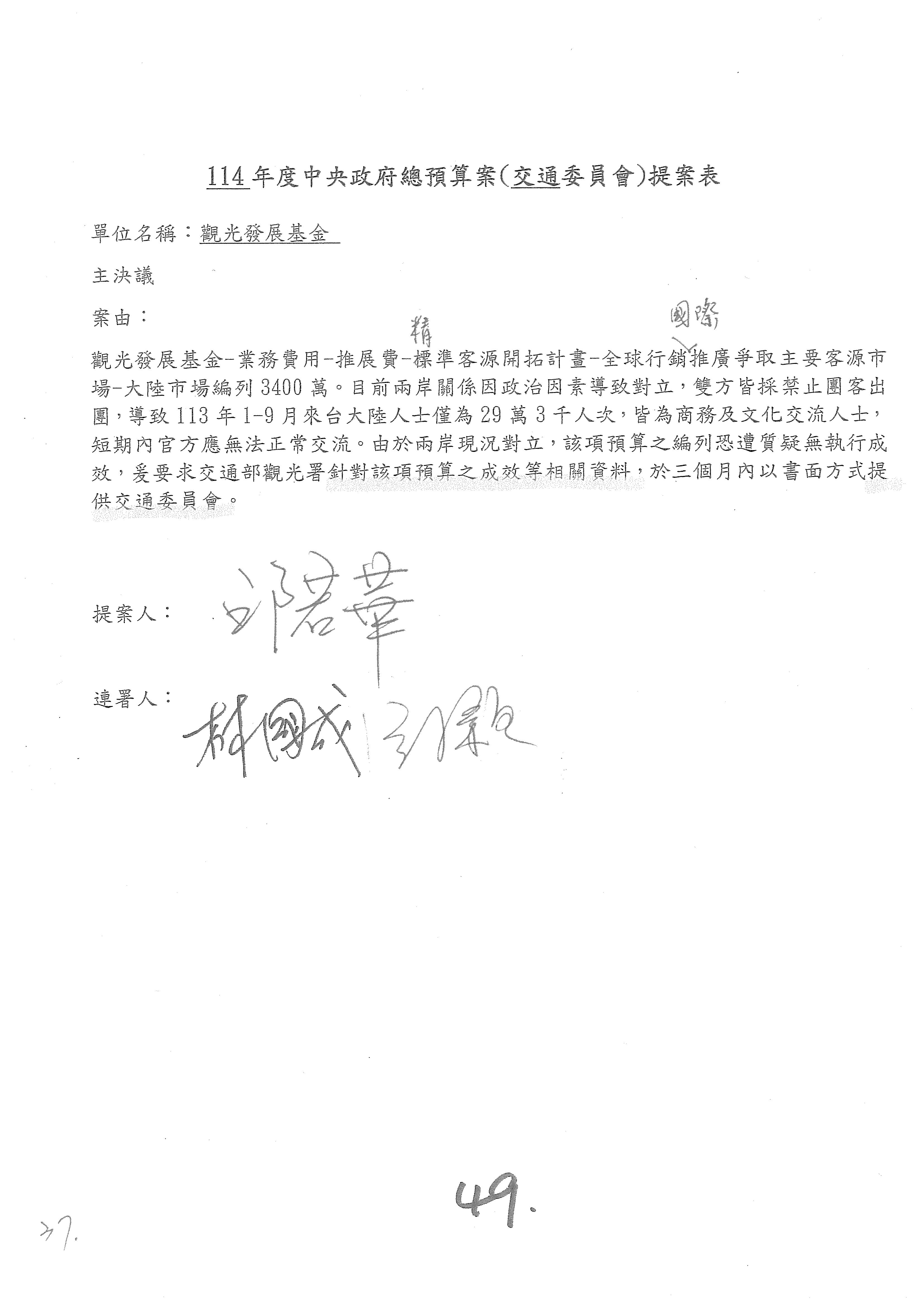 我們先確認一下,這樣才能稍微精確一點,提案的邱若華委員也在現場。因為助理有特別說明,剛剛審議的觀光發展基金,你提案的第46案撤案,直接改成第49案的主決議,沒問題吧?