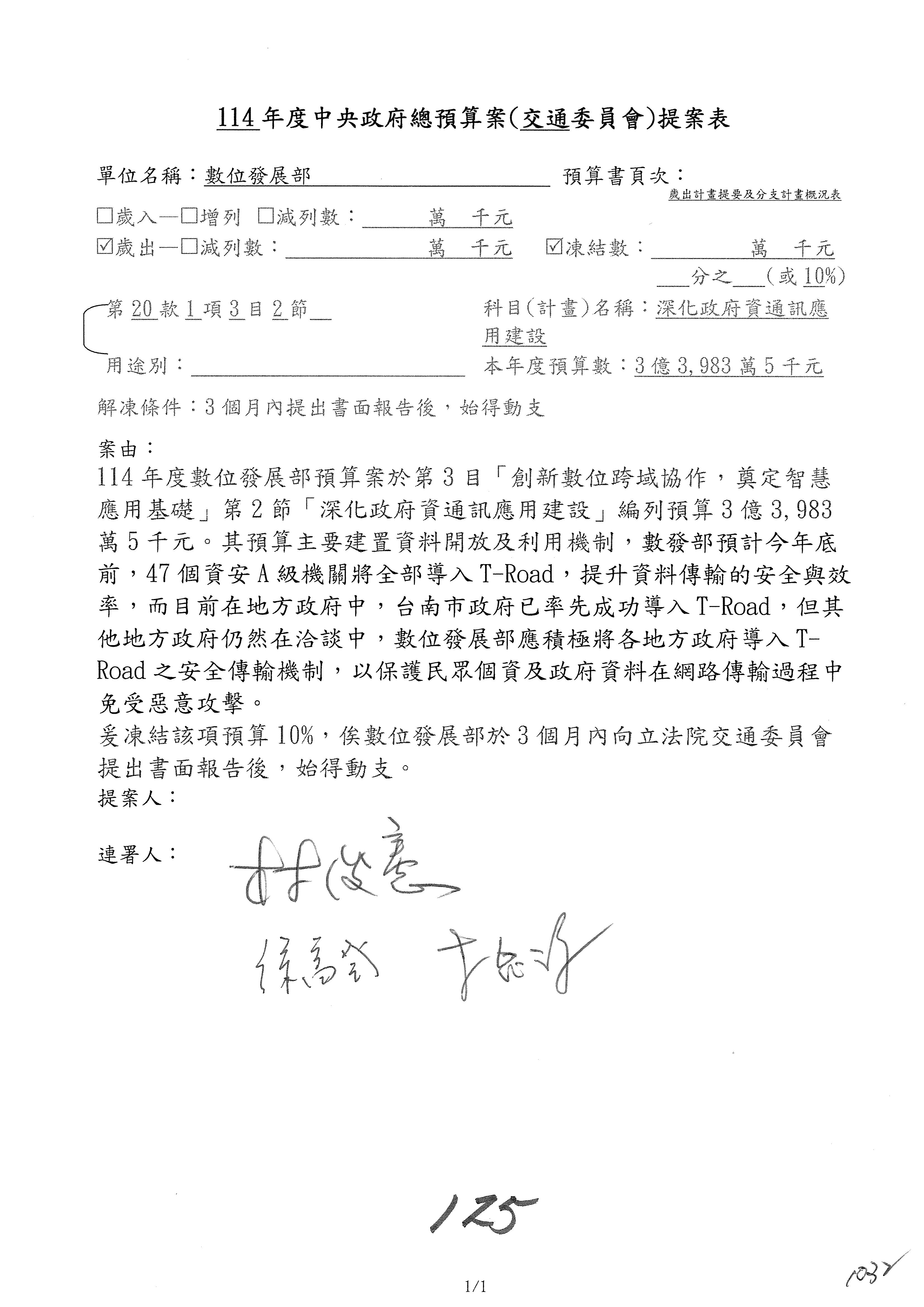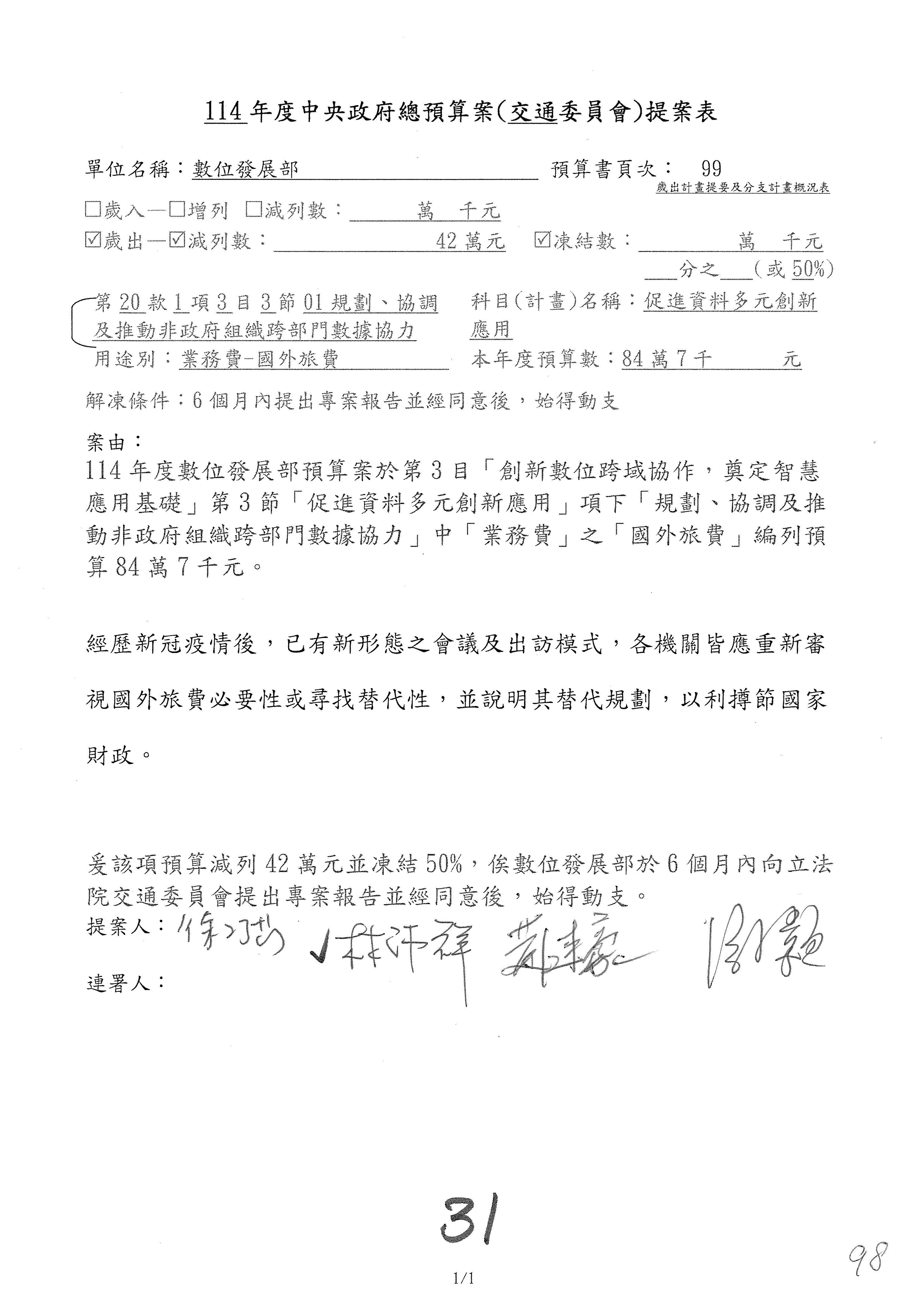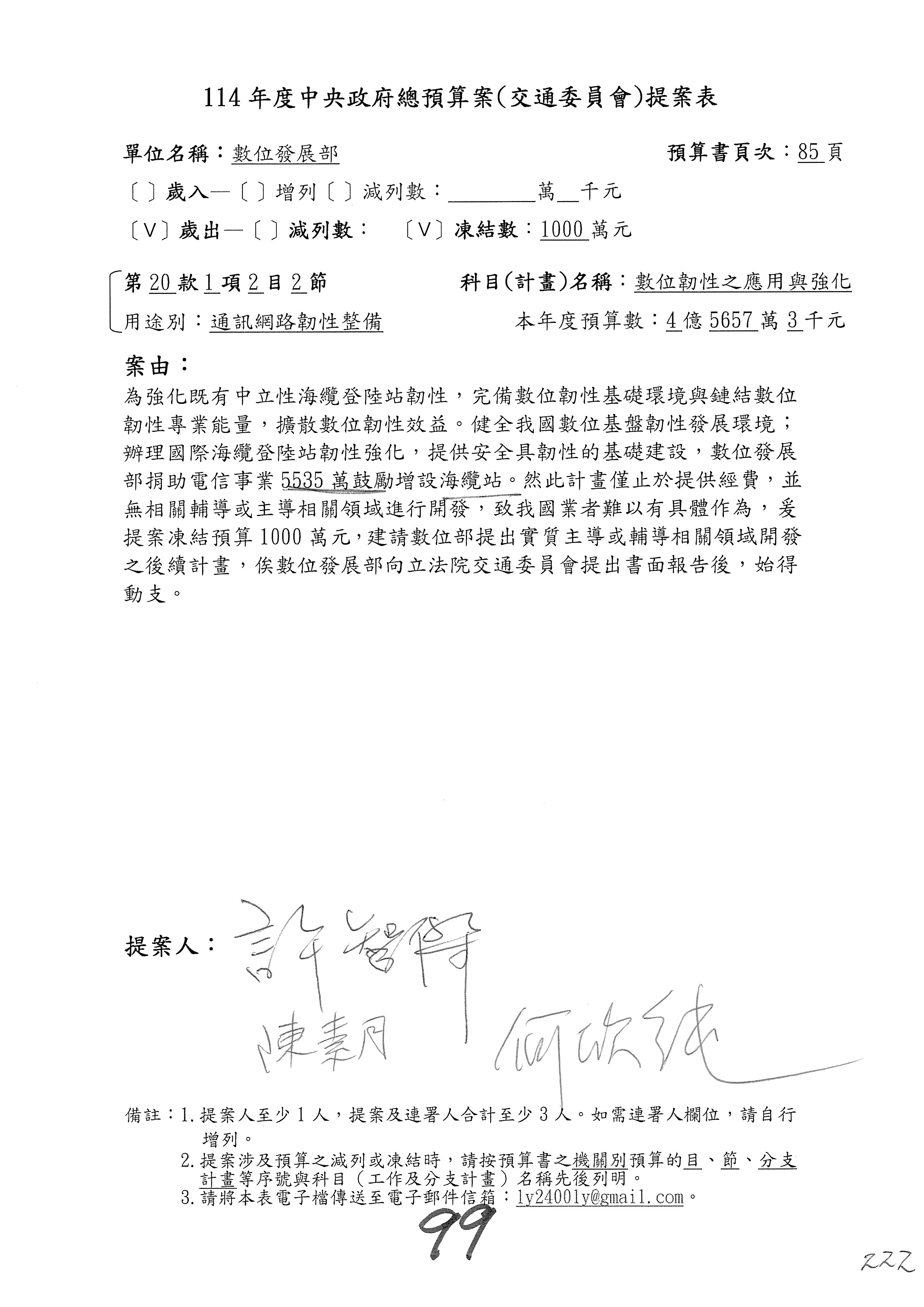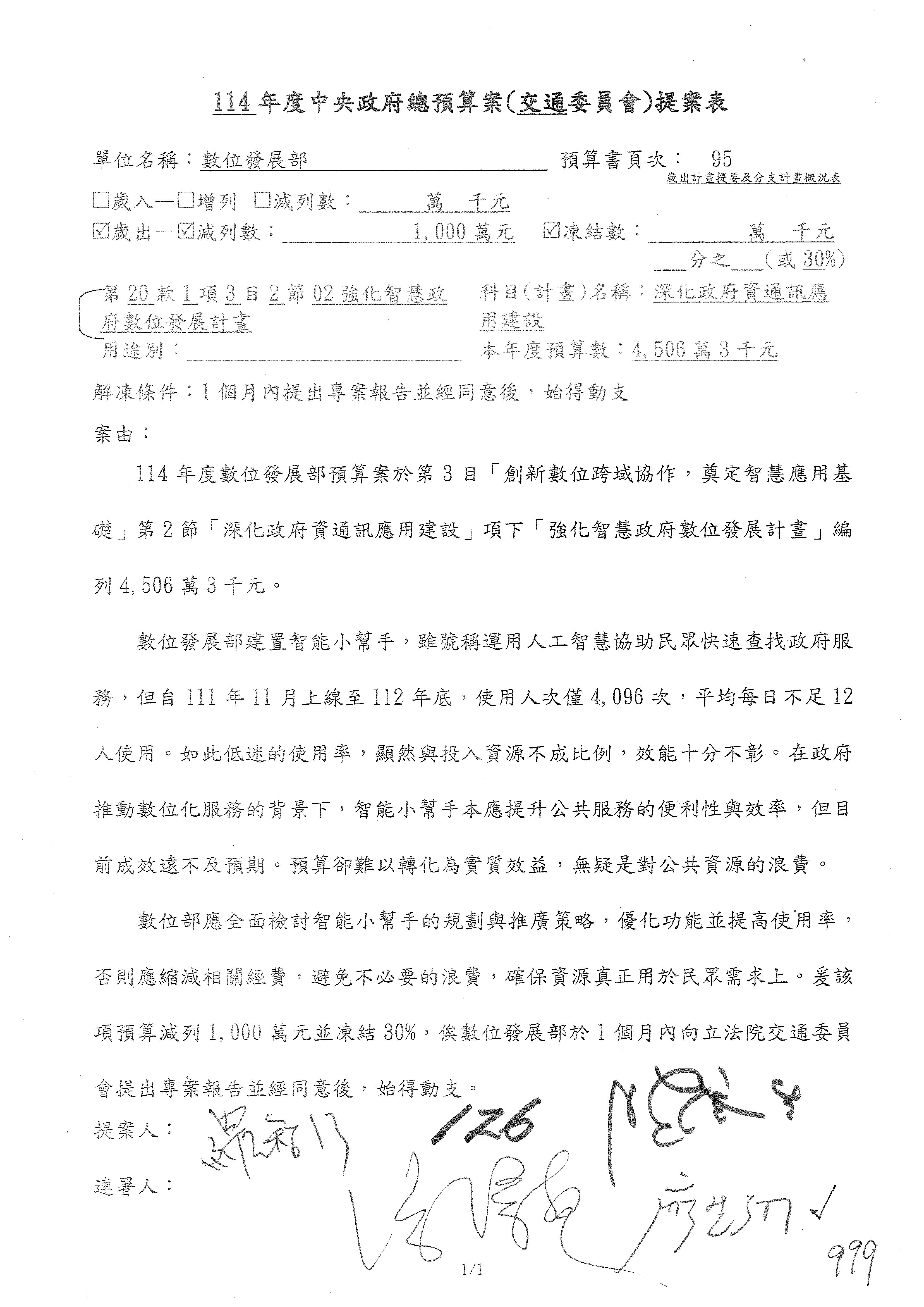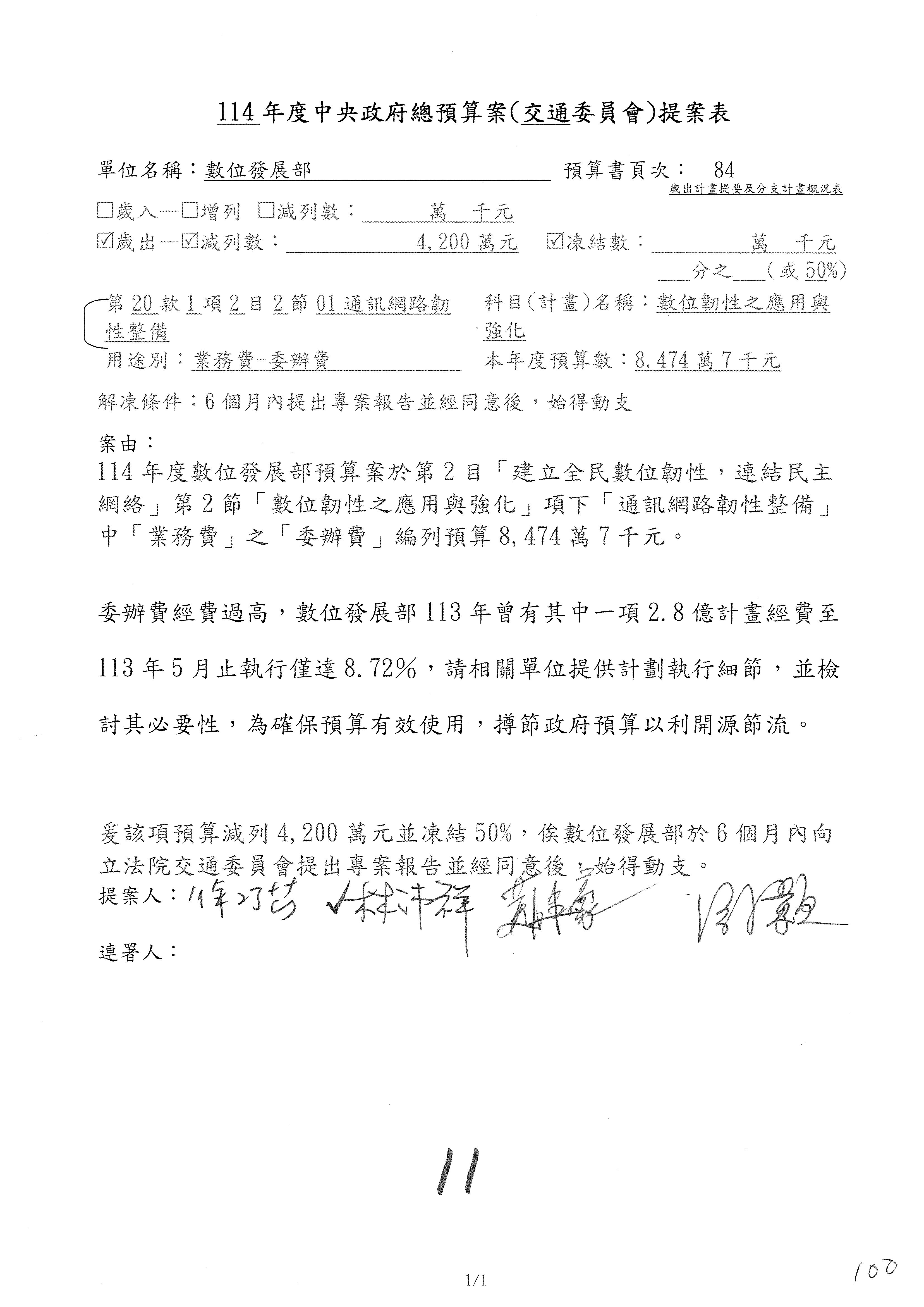 林委員國成:這個部分原本我想說增列1億,經過溝通他們所有的作法,我在這裡是有要求,數位部也原則性同意,三個月以內向立法院交通委員會提出書面報告,我也同意不增列,這點特別跟召集人說明跟報告。