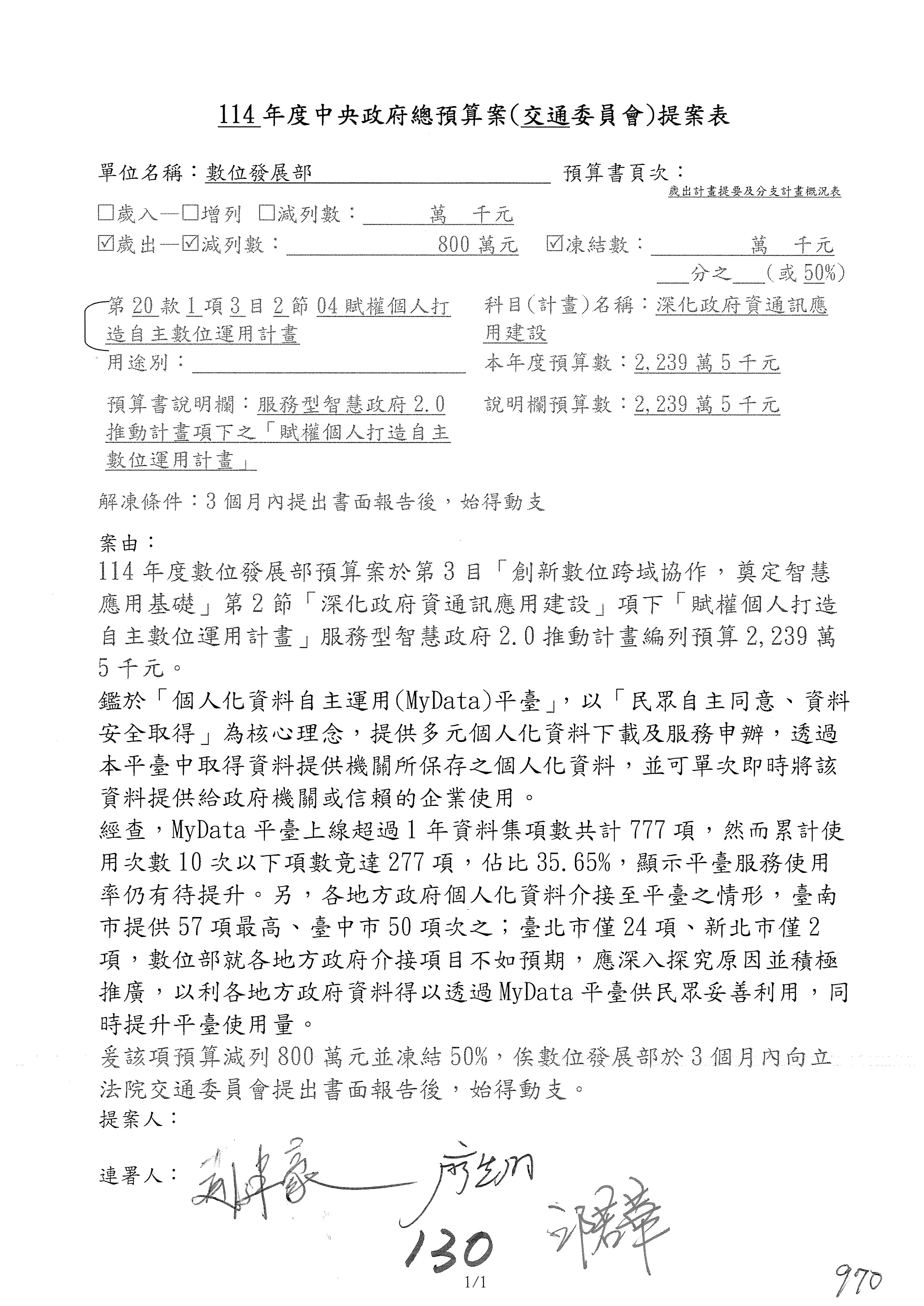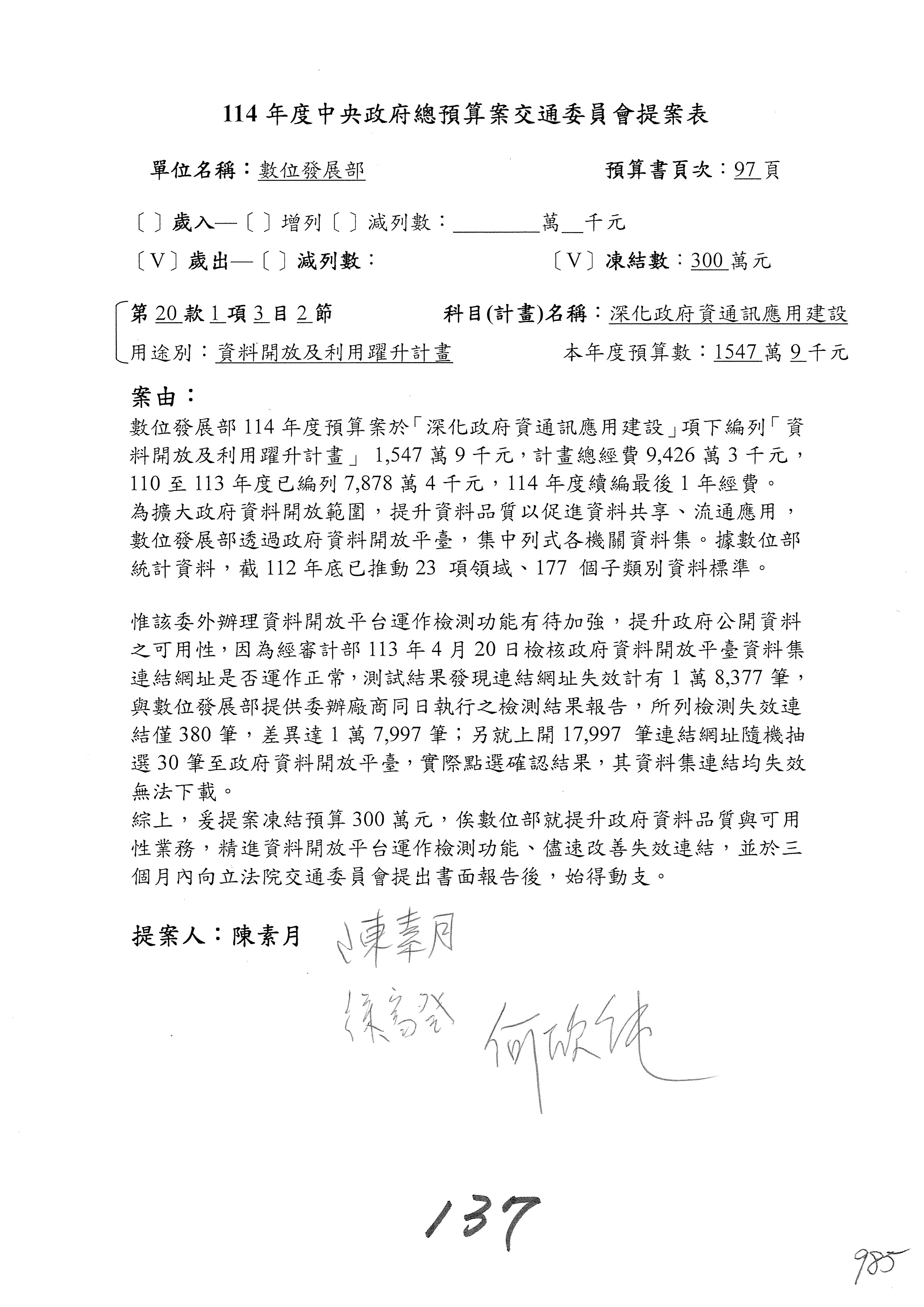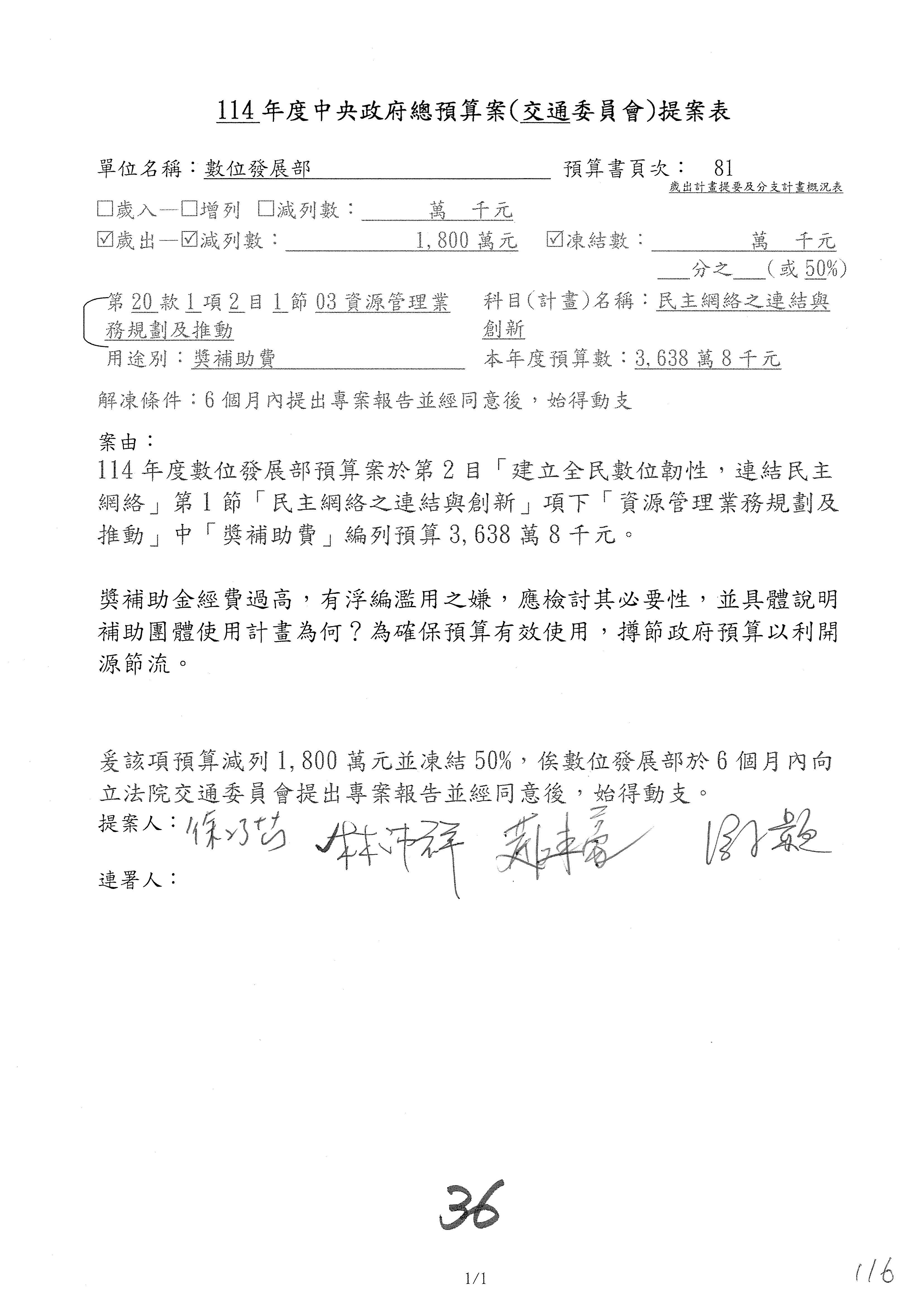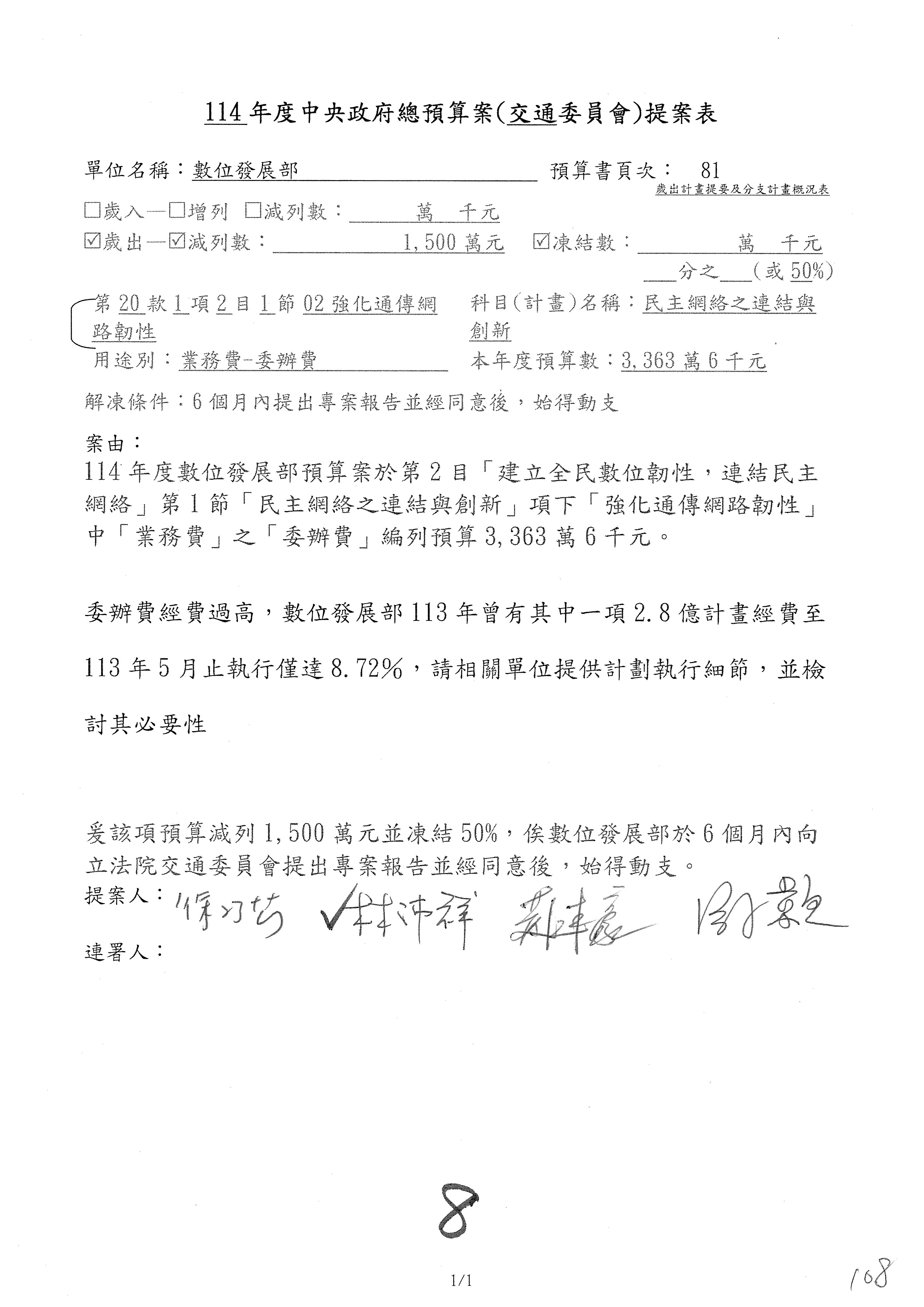 林委員國成:這個部分原本我想說增列1億,經過溝通他們所有的作法,我在這裡是有要求,數位部也原則性同意,三個月以內向立法院交通委員會提出書面報告,我也同意不增列,這點特別跟召集人說明跟報告。