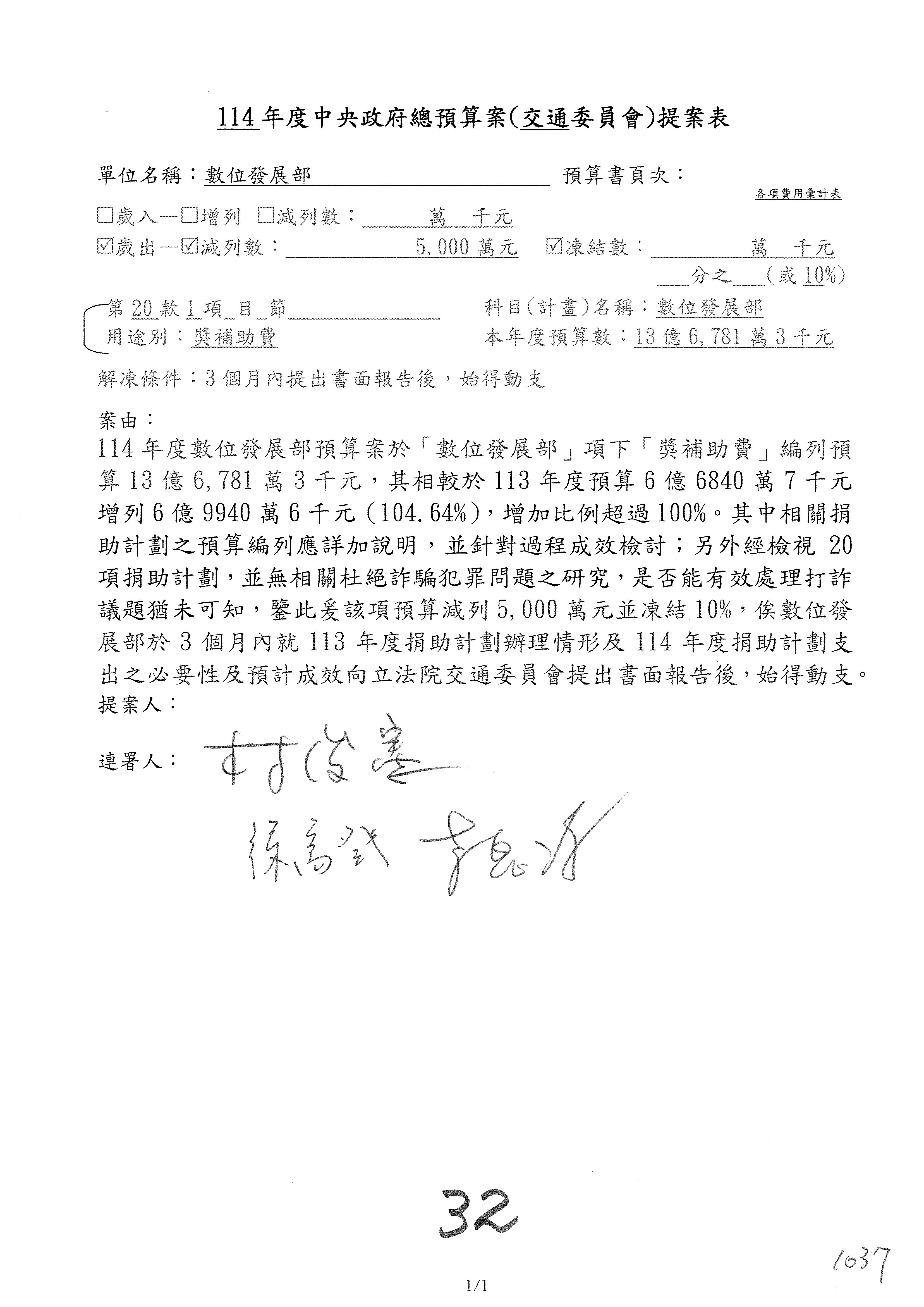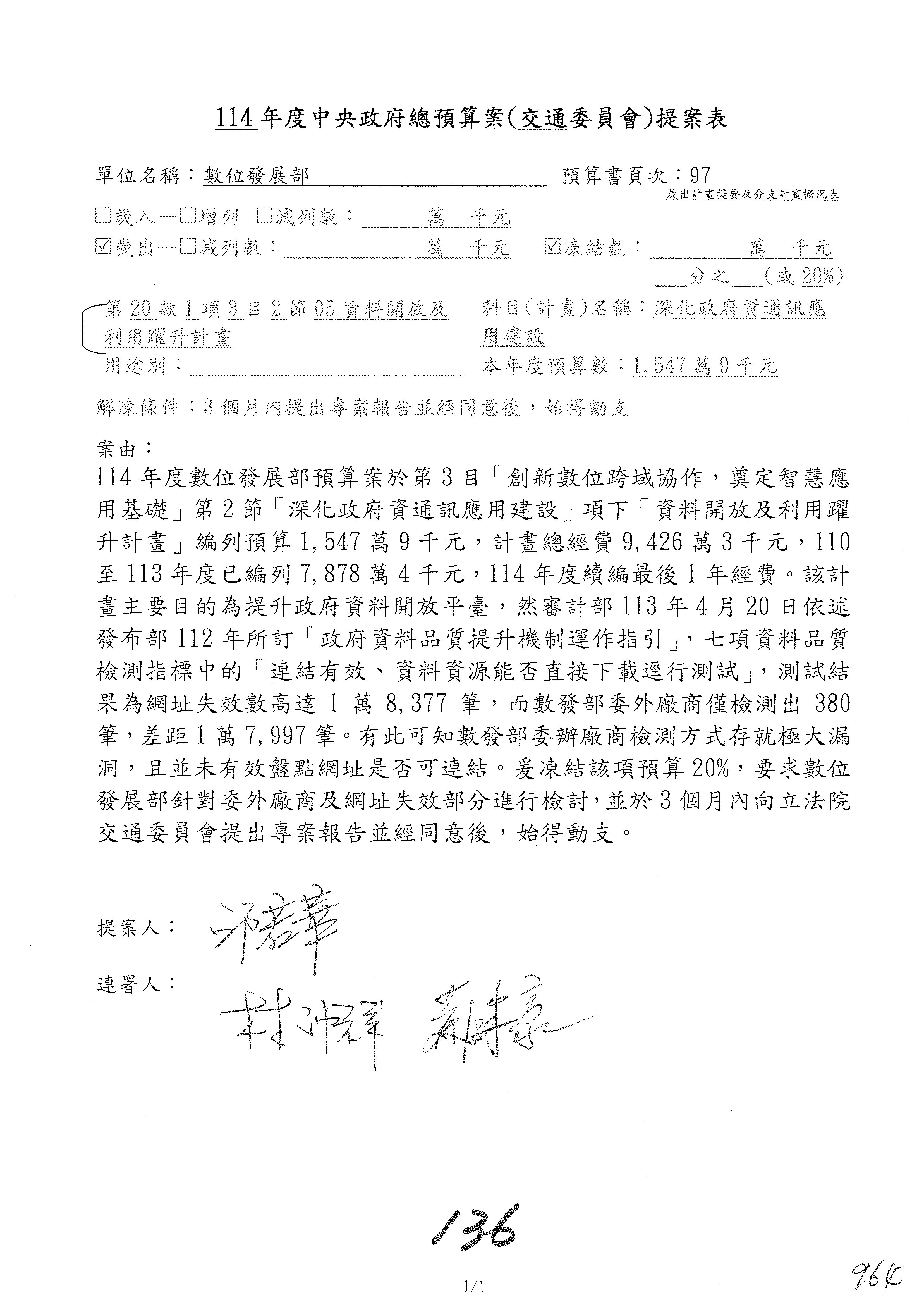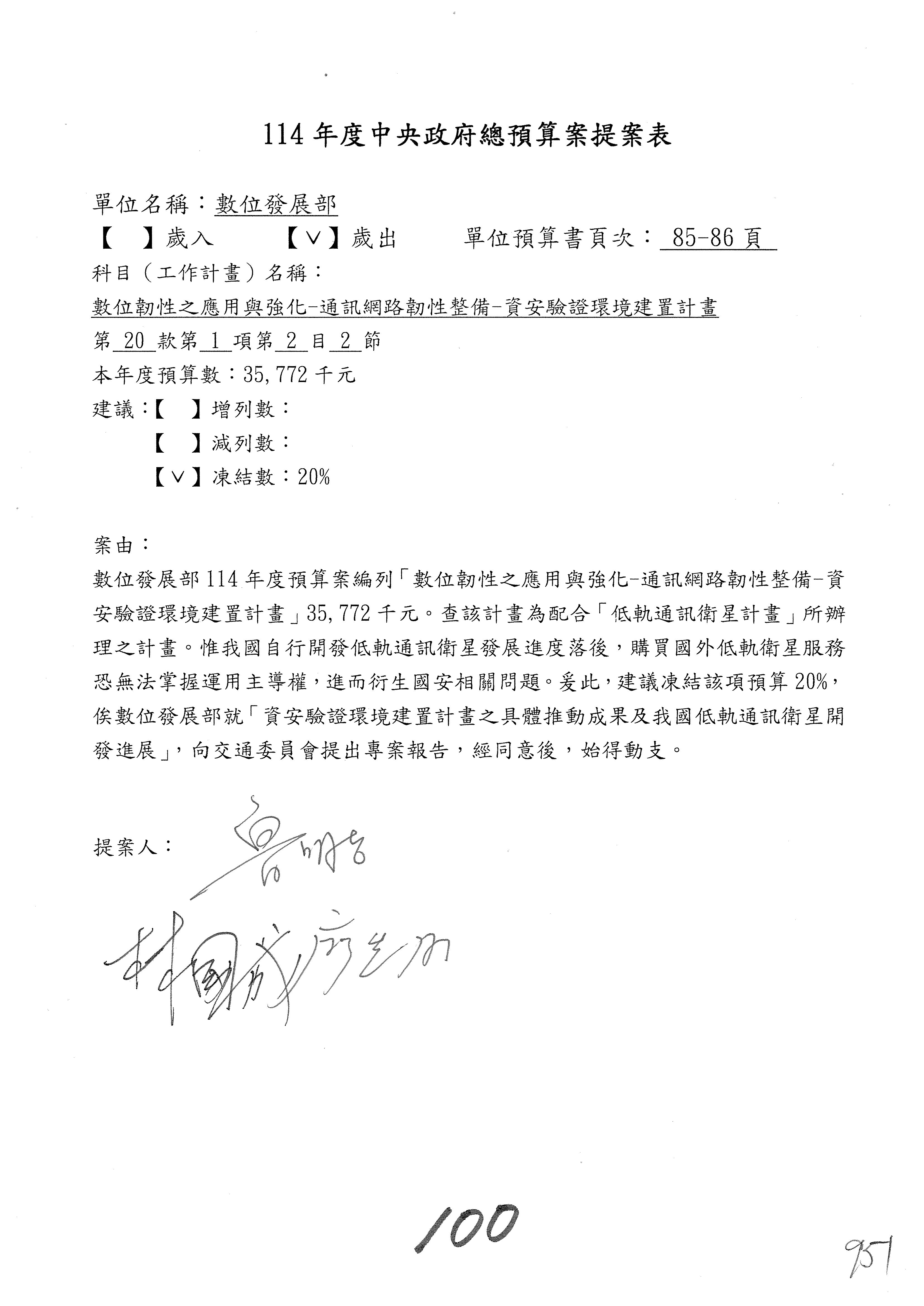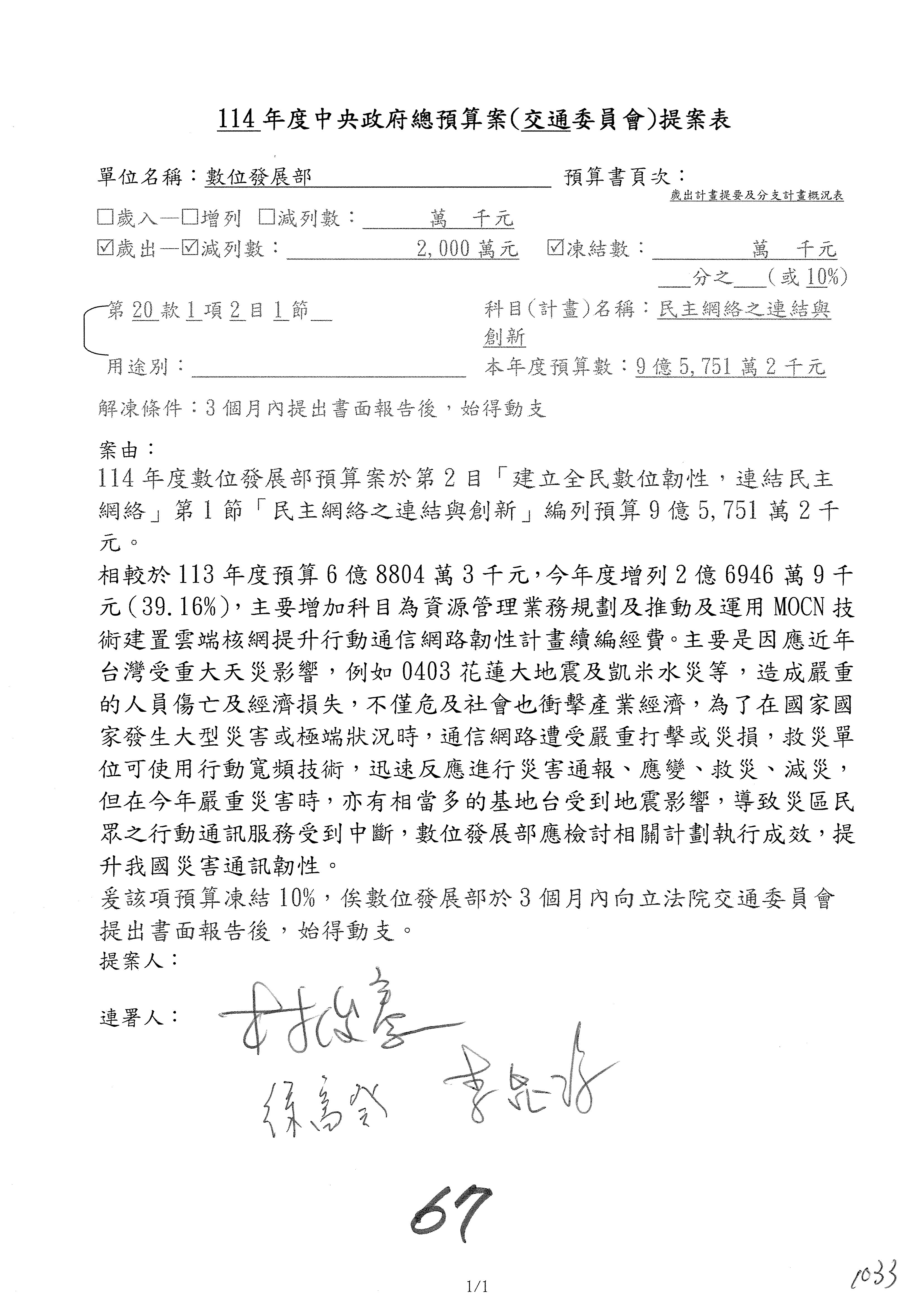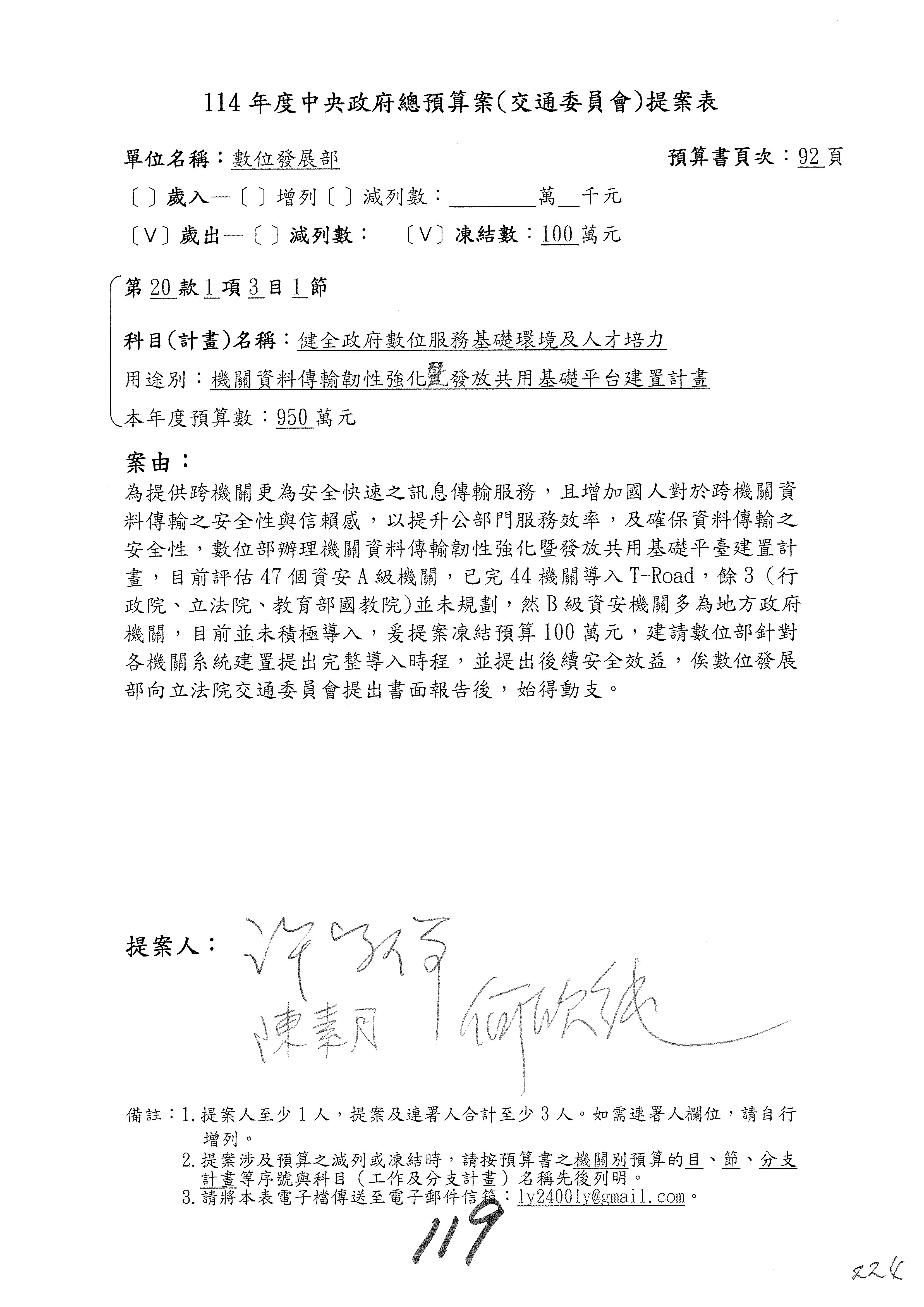 林委員國成:這個部分原本我想說增列1億,經過溝通他們所有的作法,我在這裡是有要求,數位部也原則性同意,三個月以內向立法院交通委員會提出書面報告,我也同意不增列,這點特別跟召集人說明跟報告。