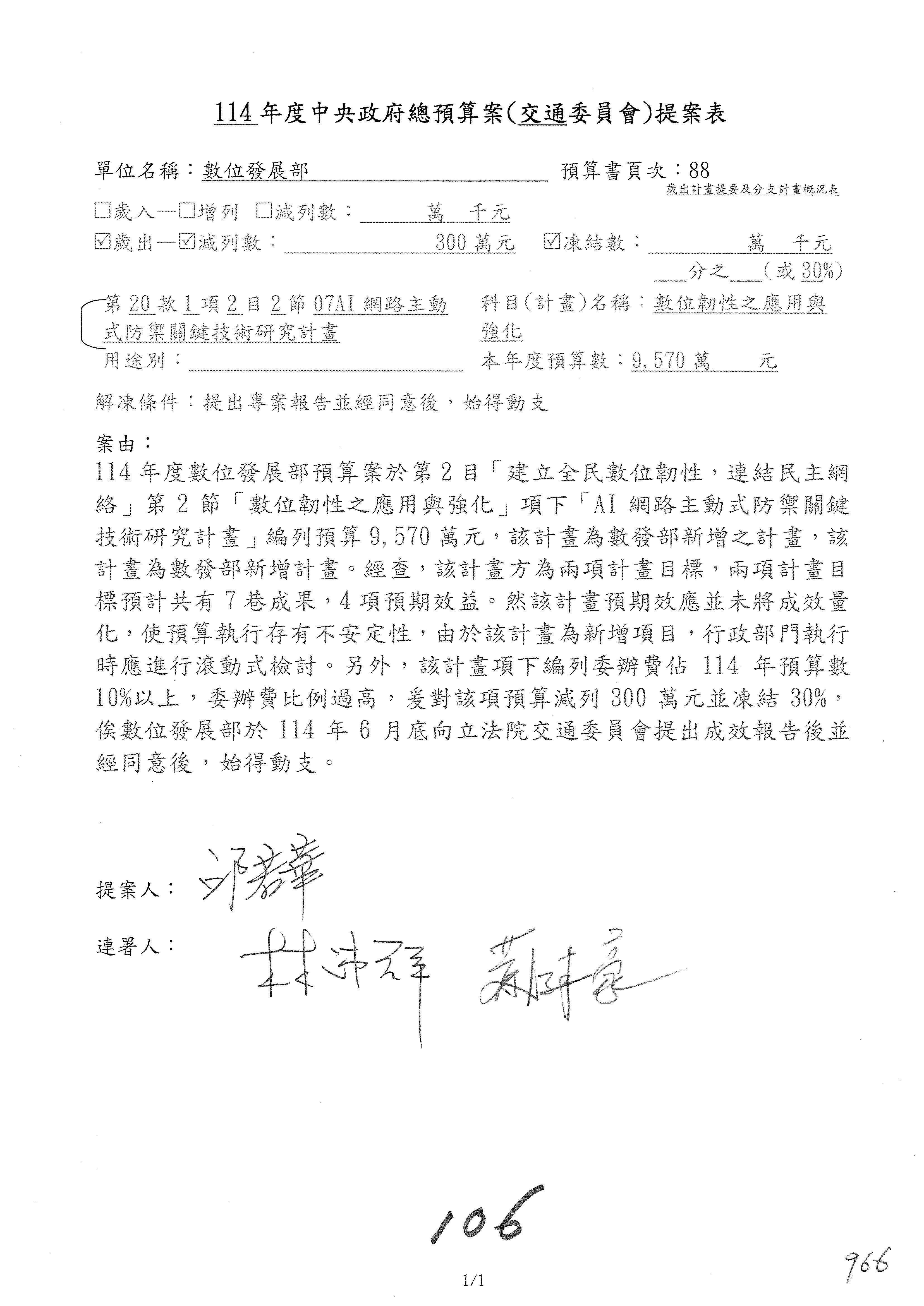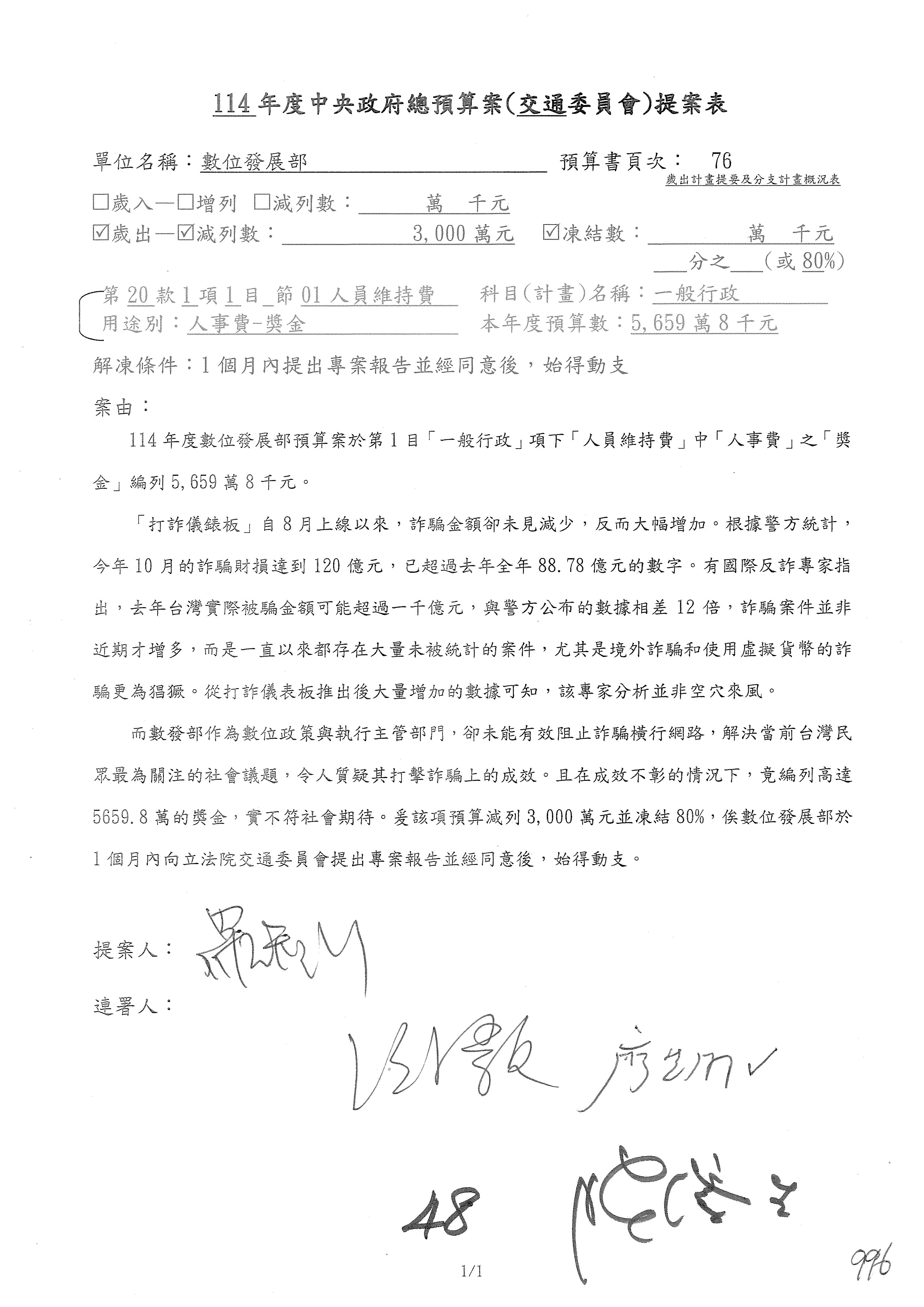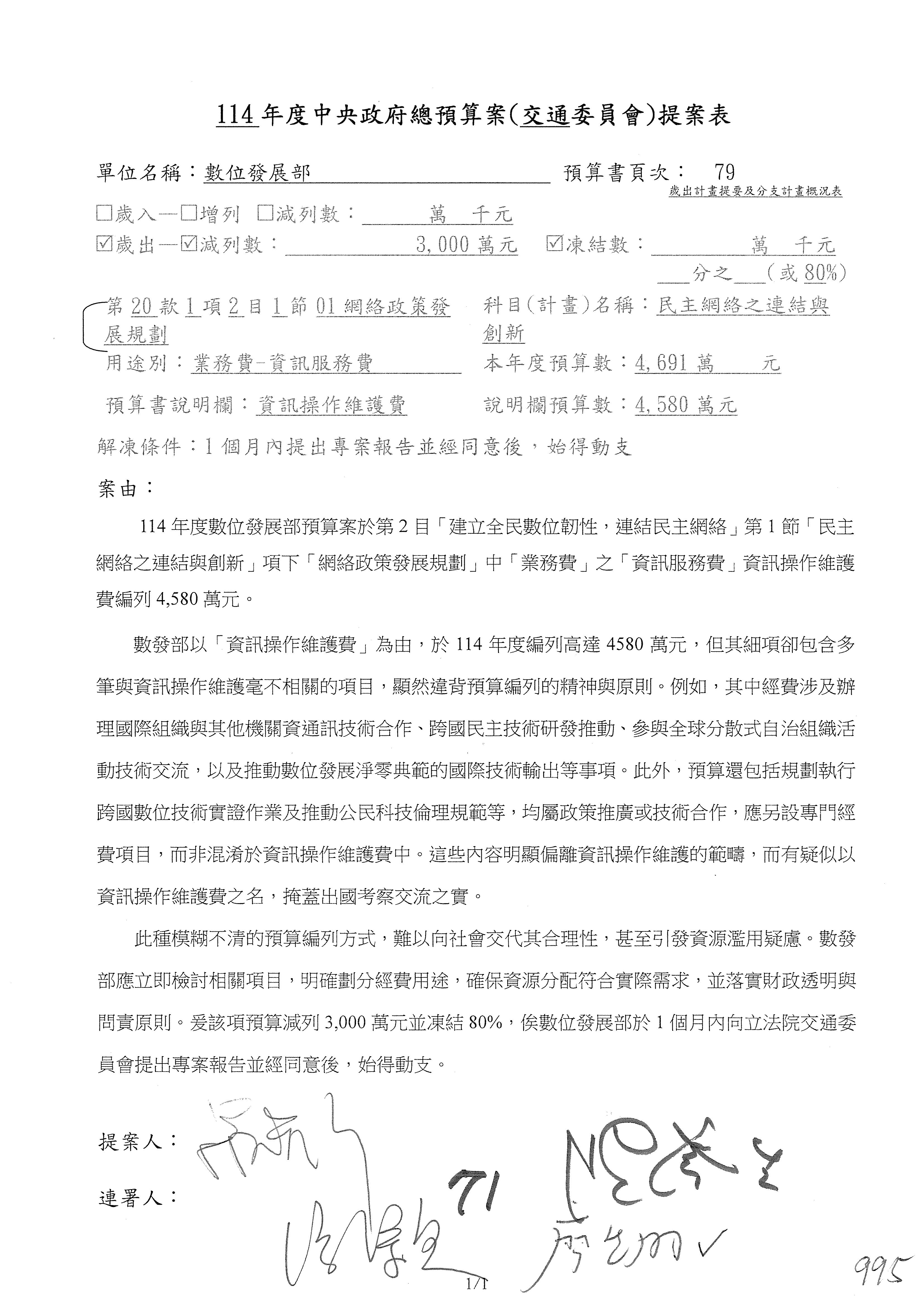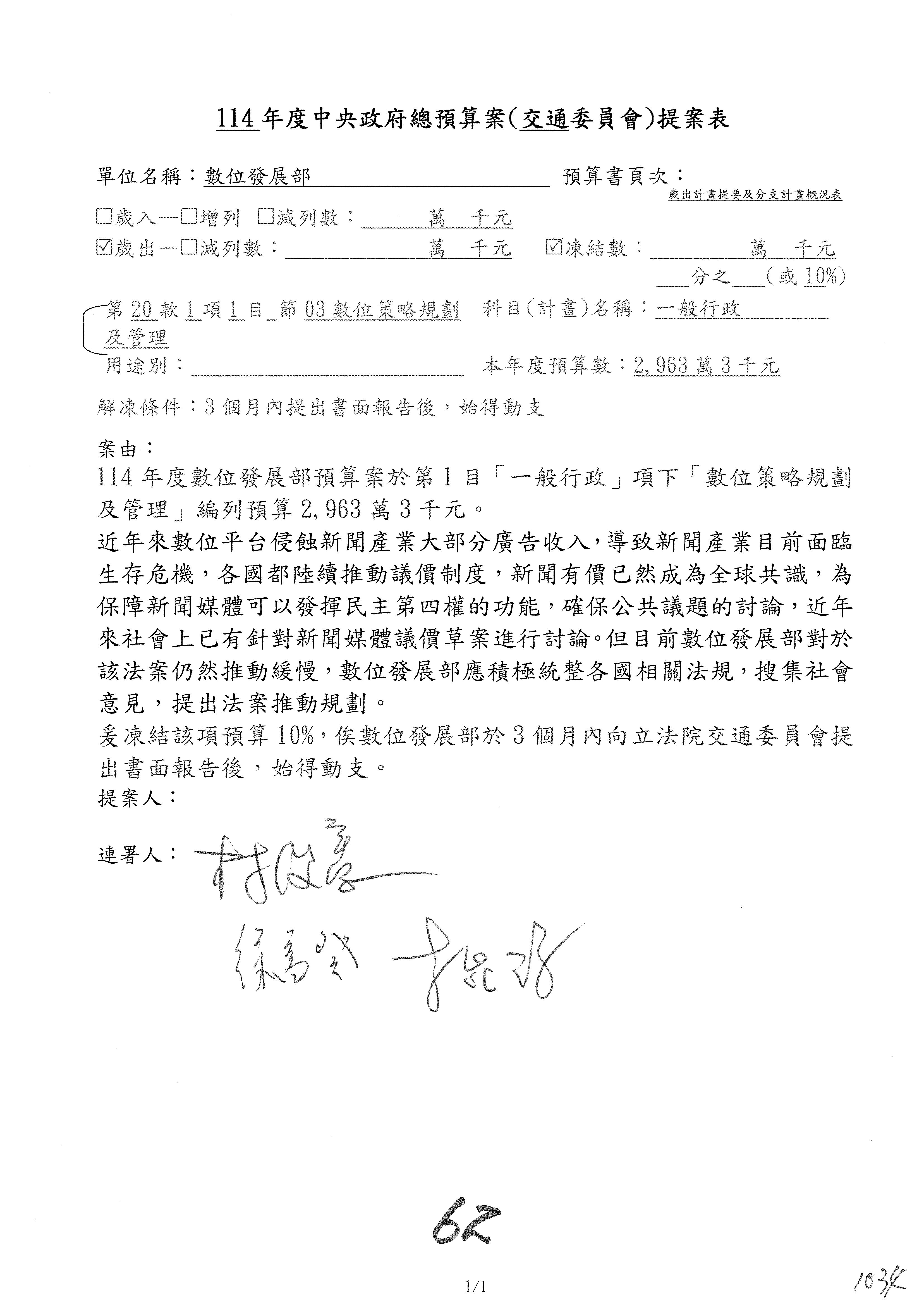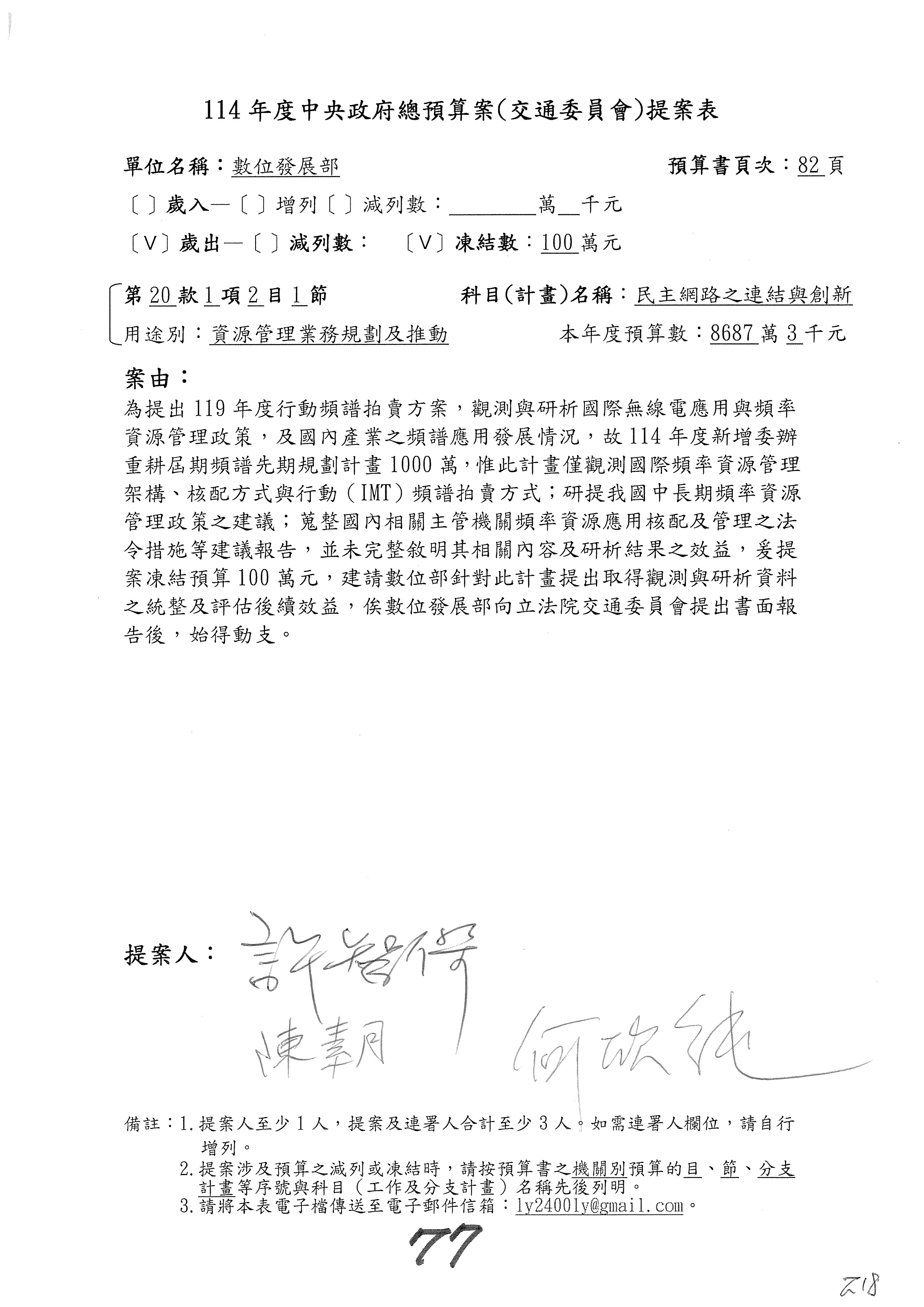 林委員國成:這個部分原本我想說增列1億,經過溝通他們所有的作法,我在這裡是有要求,數位部也原則性同意,三個月以內向立法院交通委員會提出書面報告,我也同意不增列,這點特別跟召集人說明跟報告。