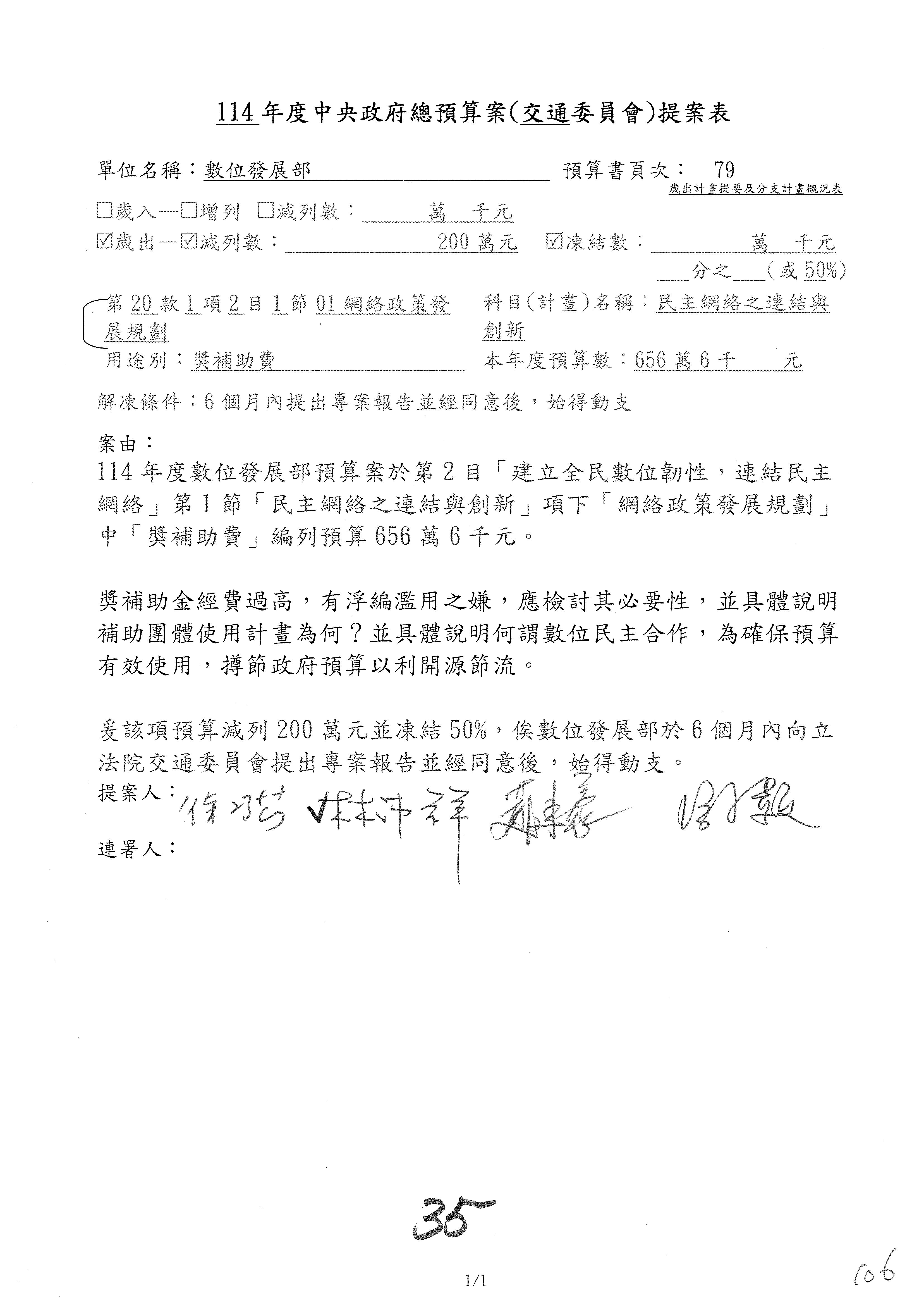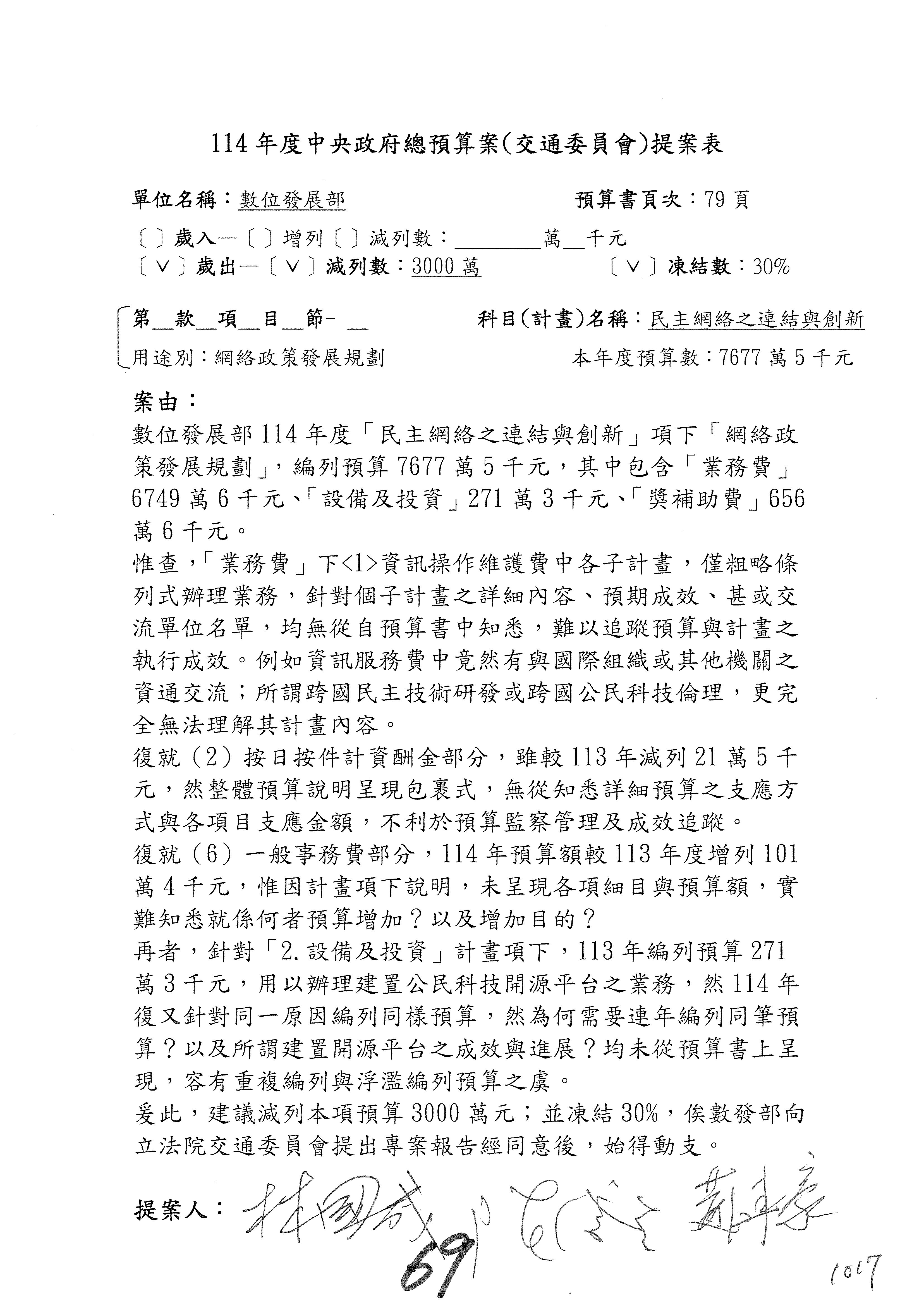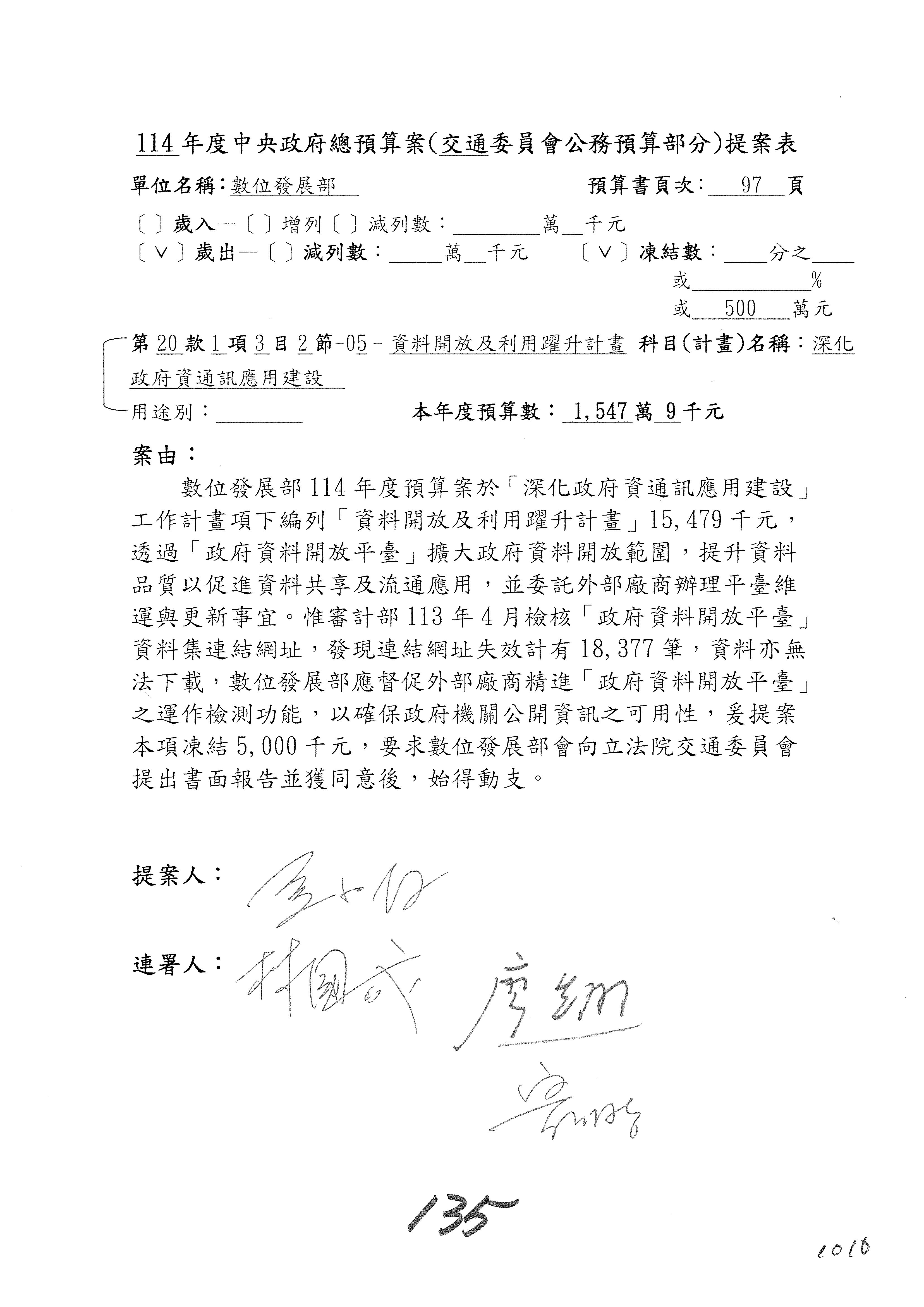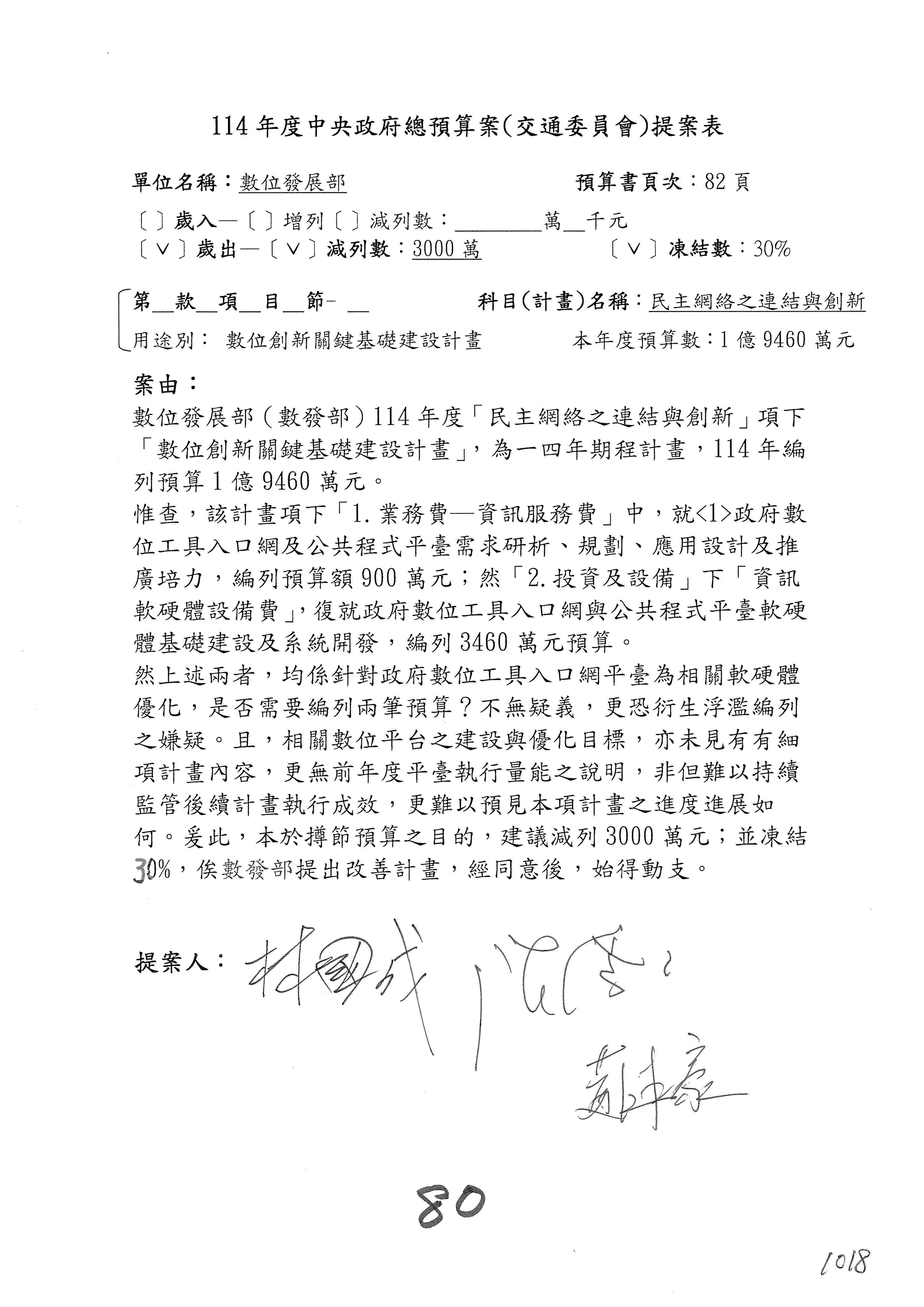 林委員國成:這個部分原本我想說增列1億,經過溝通他們所有的作法,我在這裡是有要求,數位部也原則性同意,三個月以內向立法院交通委員會提出書面報告,我也同意不增列,這點特別跟召集人說明跟報告。