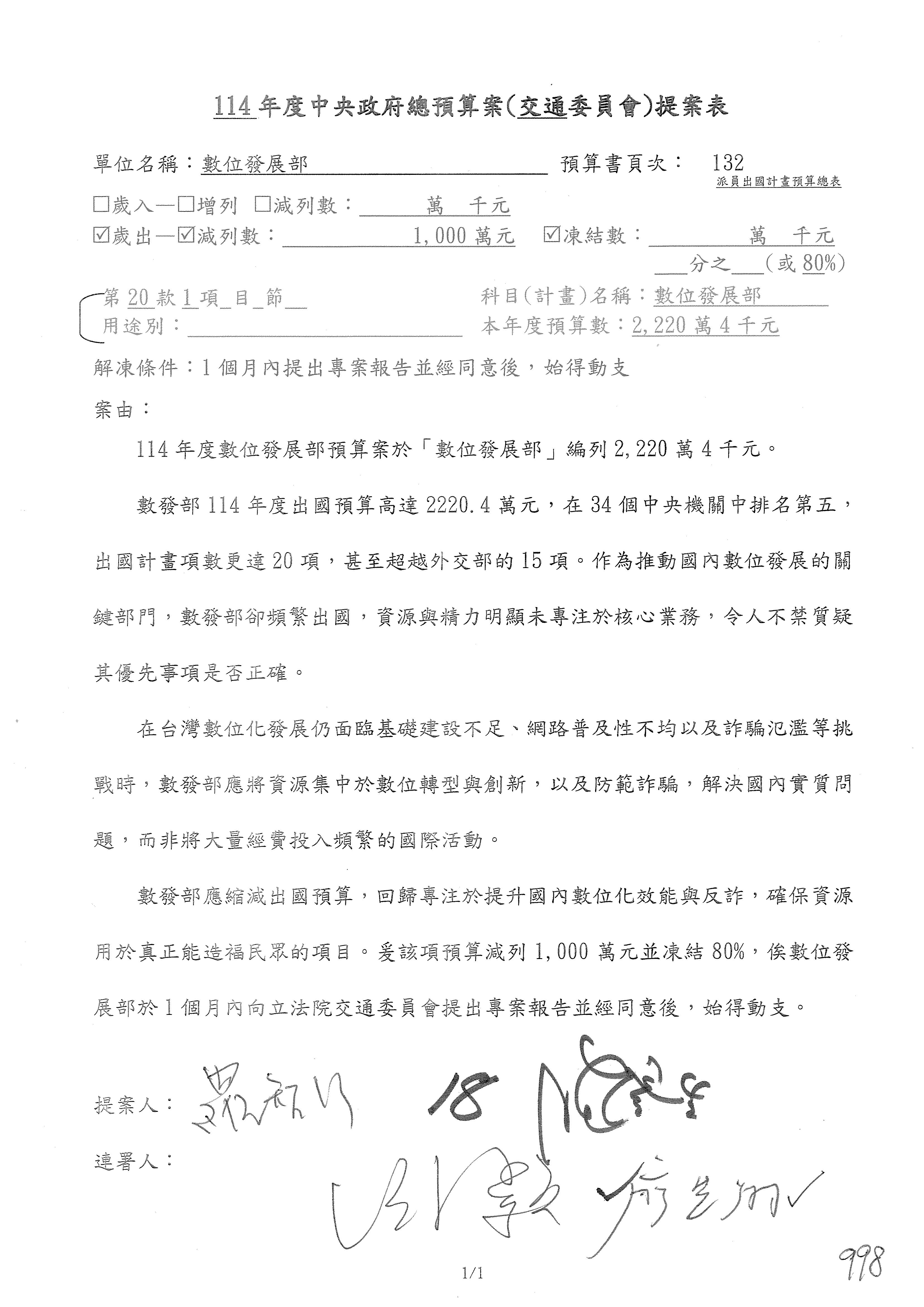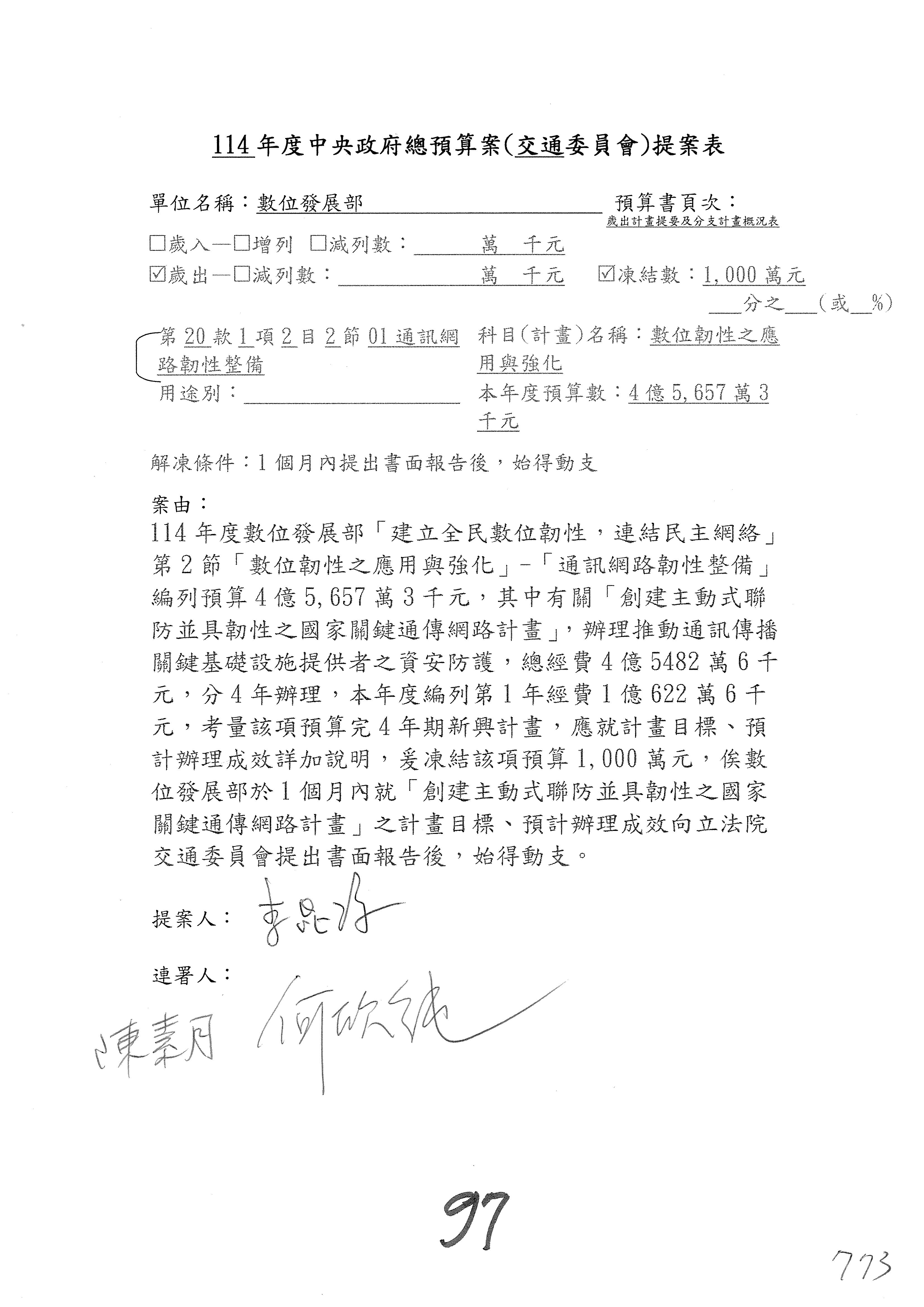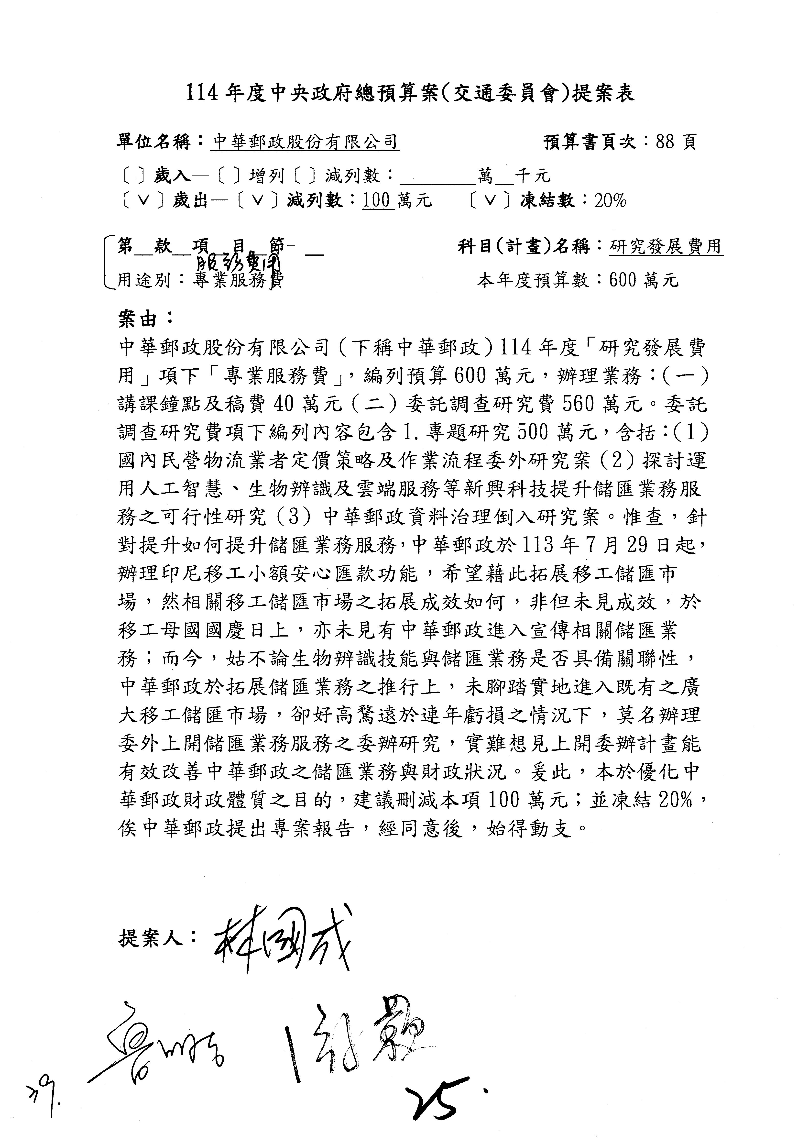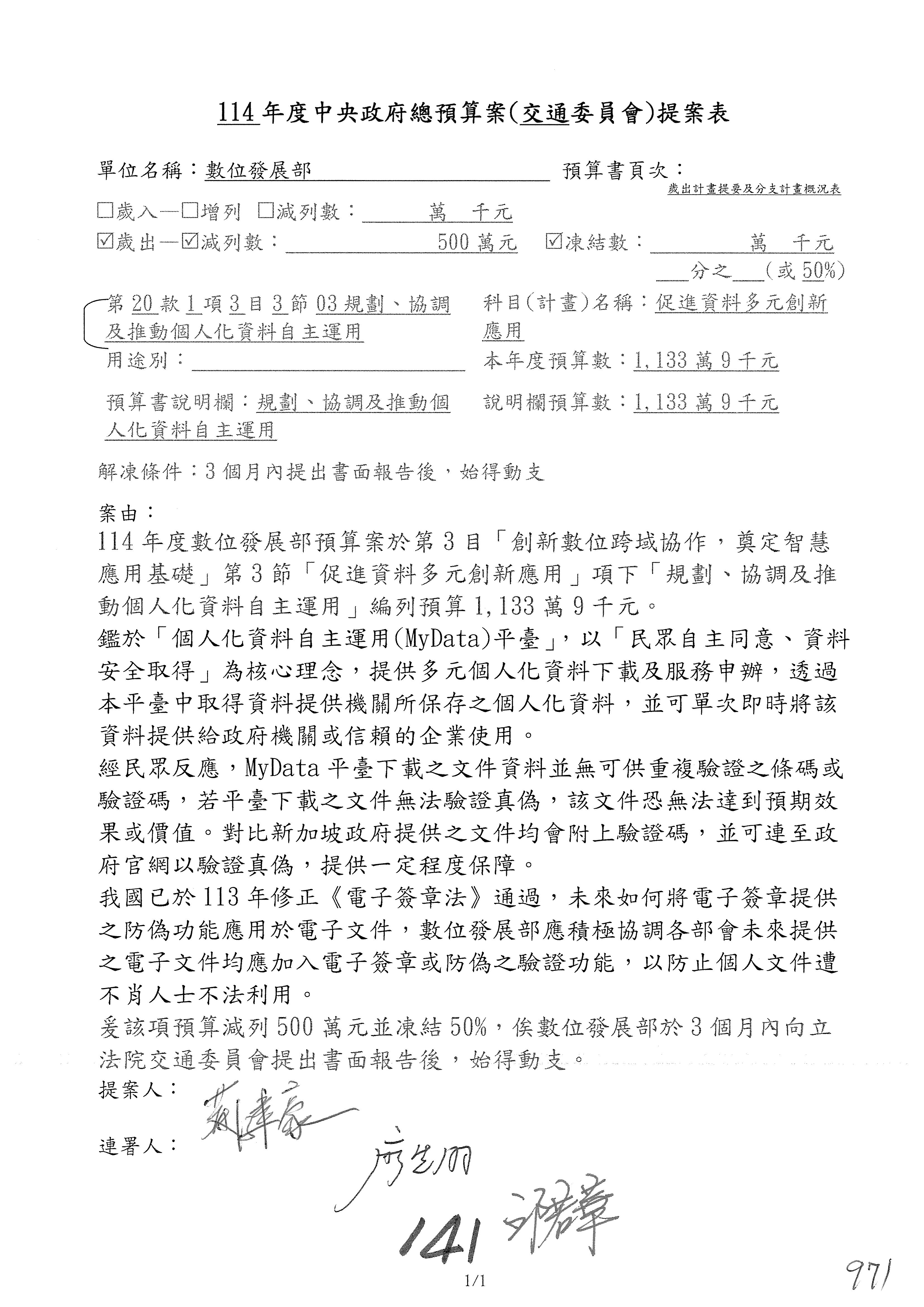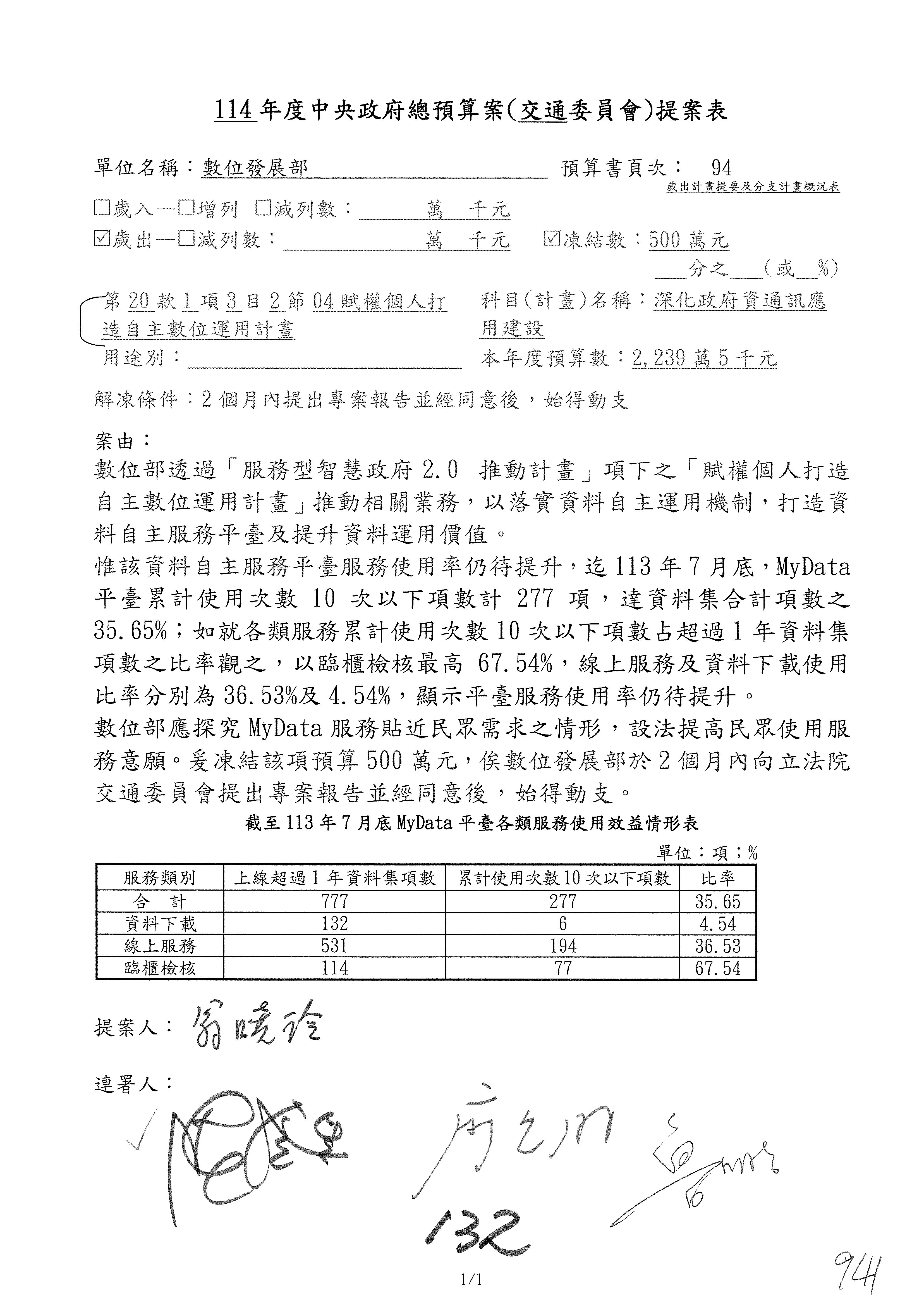 林委員國成:這個部分原本我想說增列1億,經過溝通他們所有的作法,我在這裡是有要求,數位部也原則性同意,三個月以內向立法院交通委員會提出書面報告,我也同意不增列,這點特別跟召集人說明跟報告。
