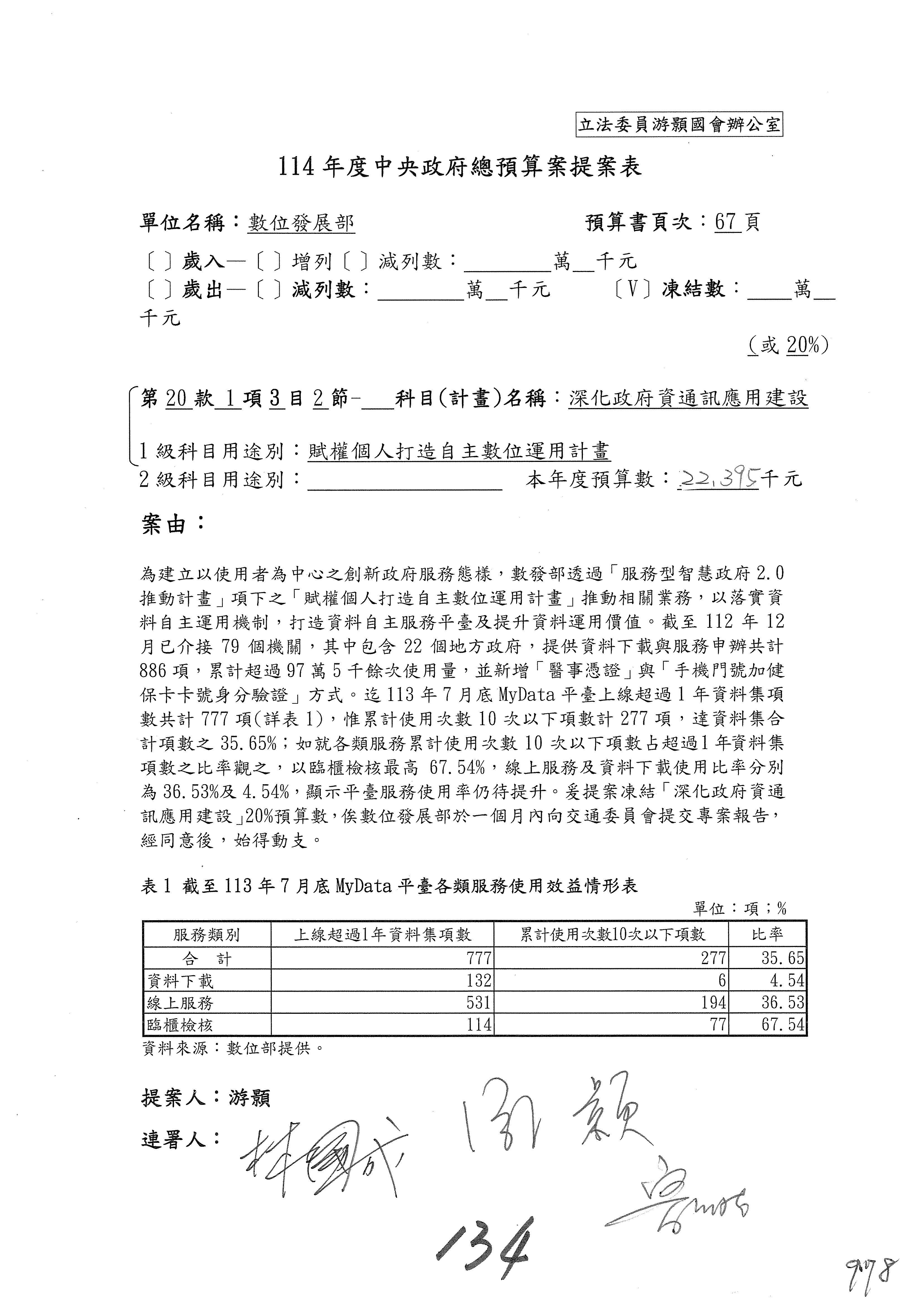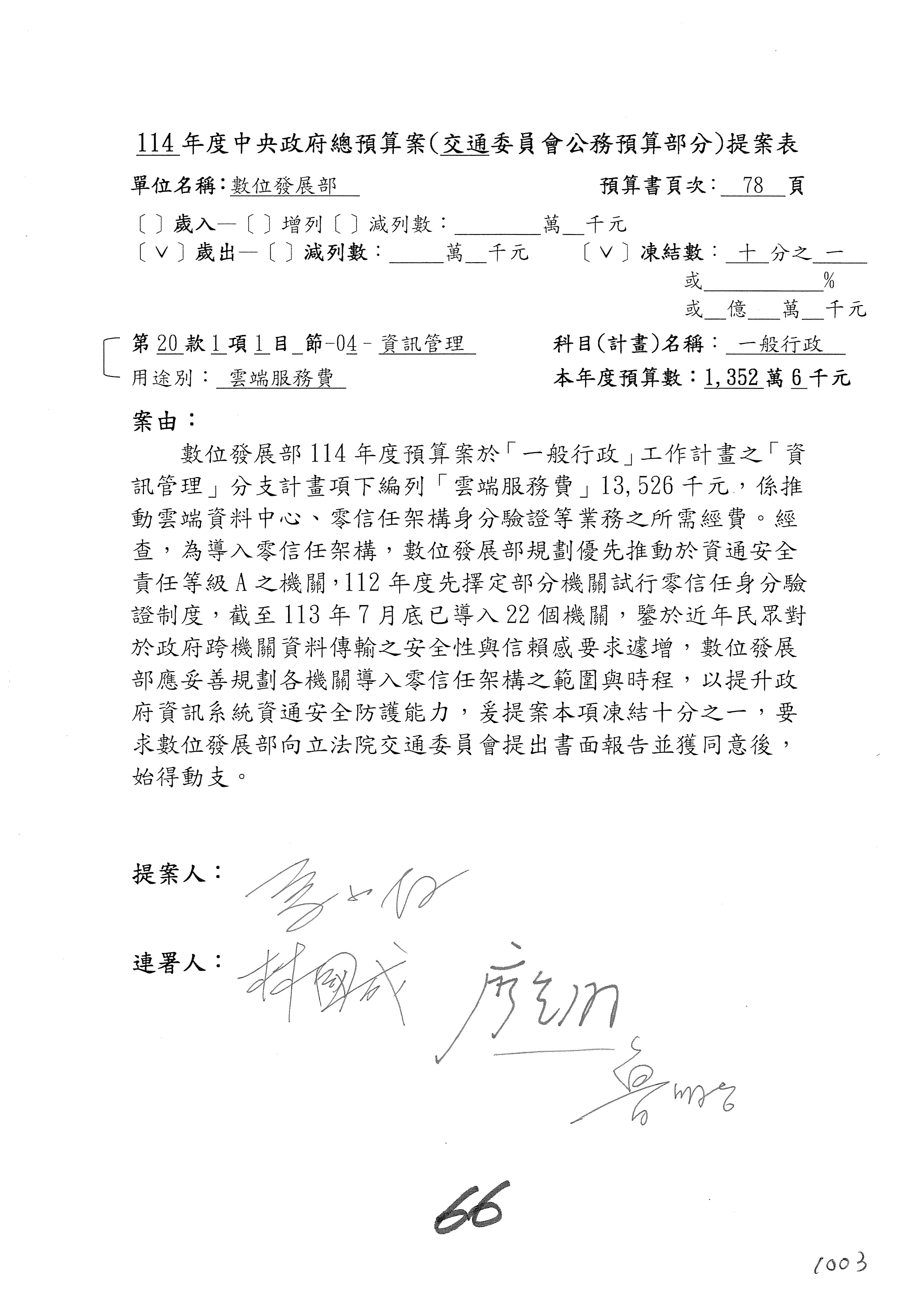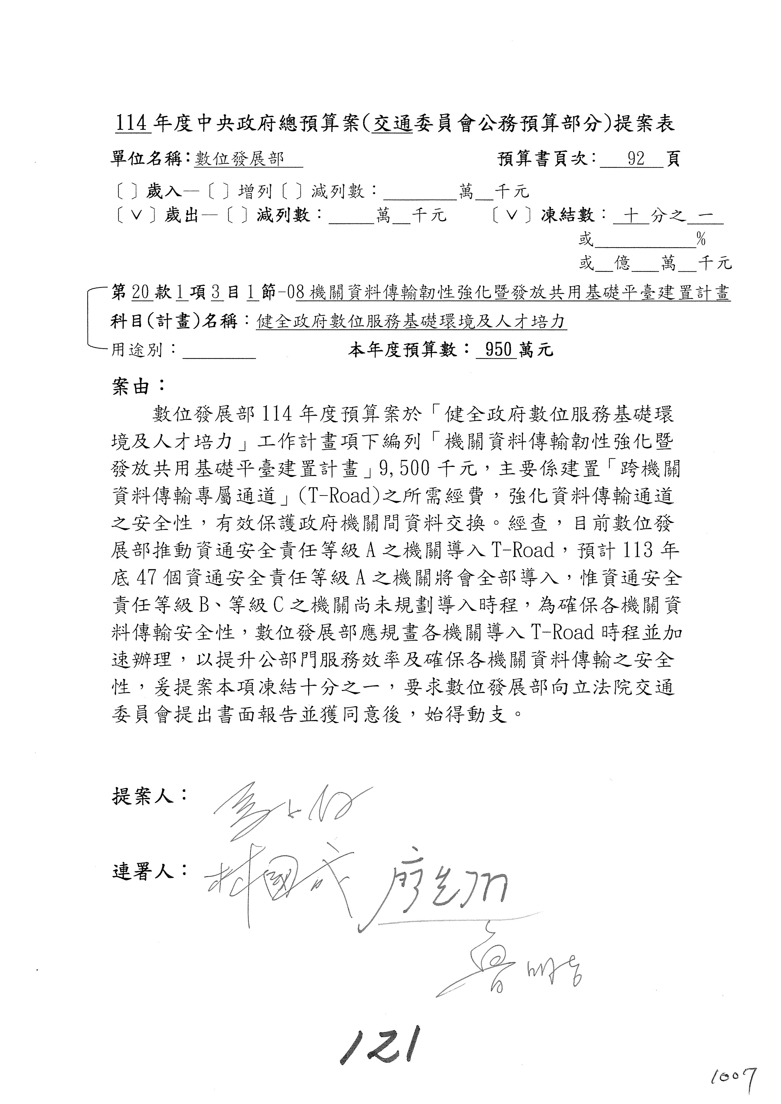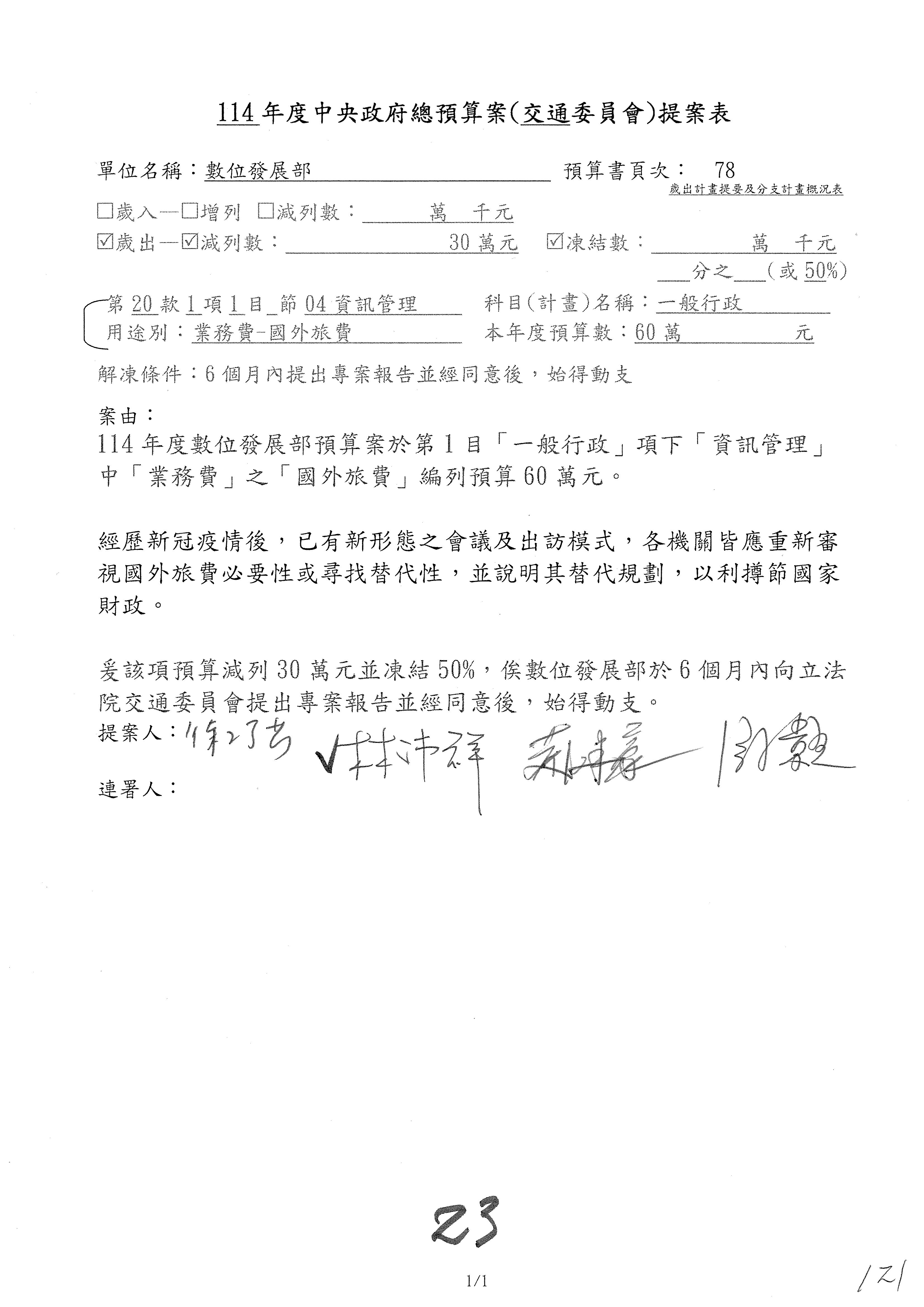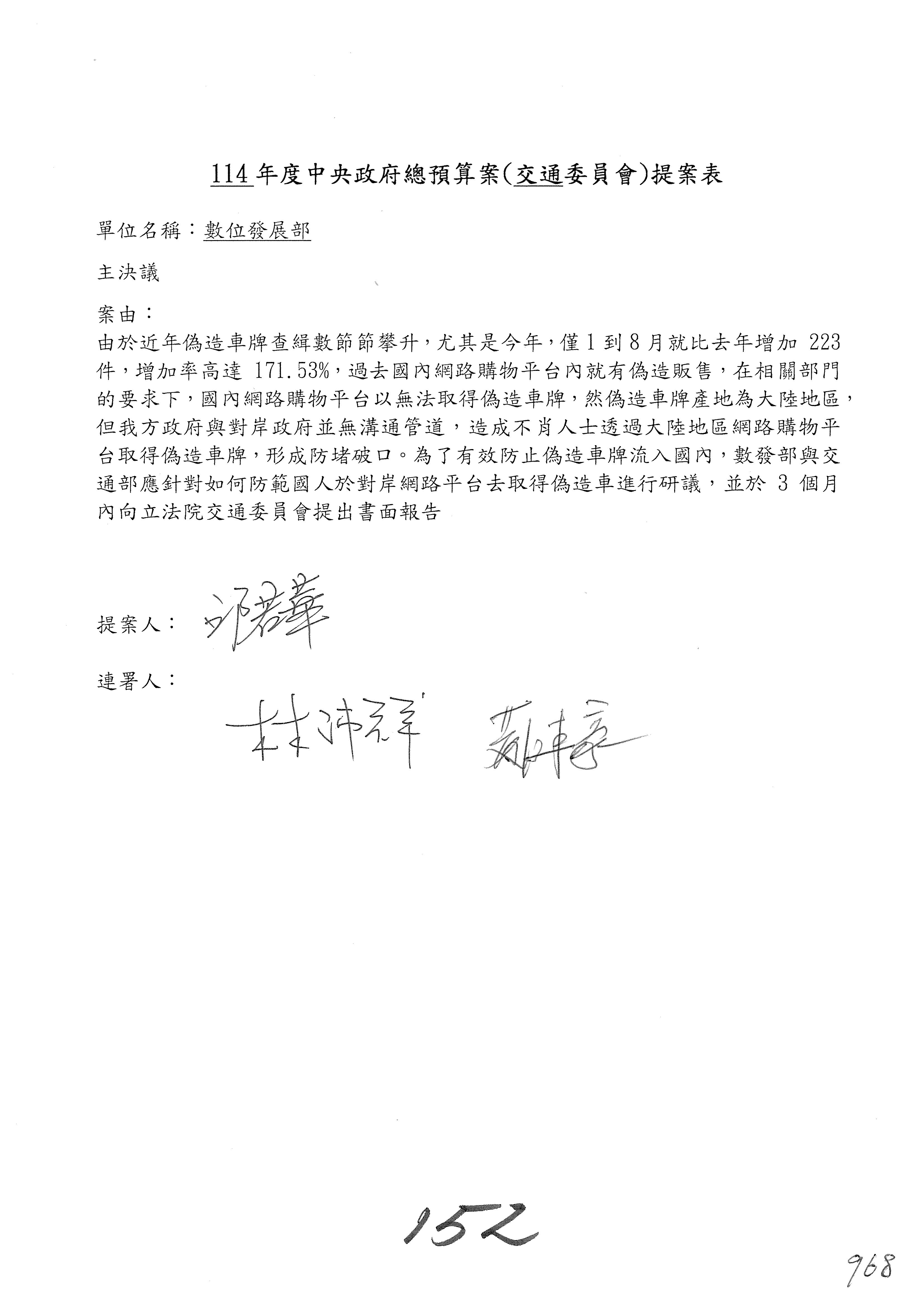 林委員國成:這個部分原本我想說增列1億,經過溝通他們所有的作法,我在這裡是有要求,數位部也原則性同意,三個月以內向立法院交通委員會提出書面報告,我也同意不增列,這點特別跟召集人說明跟報告。