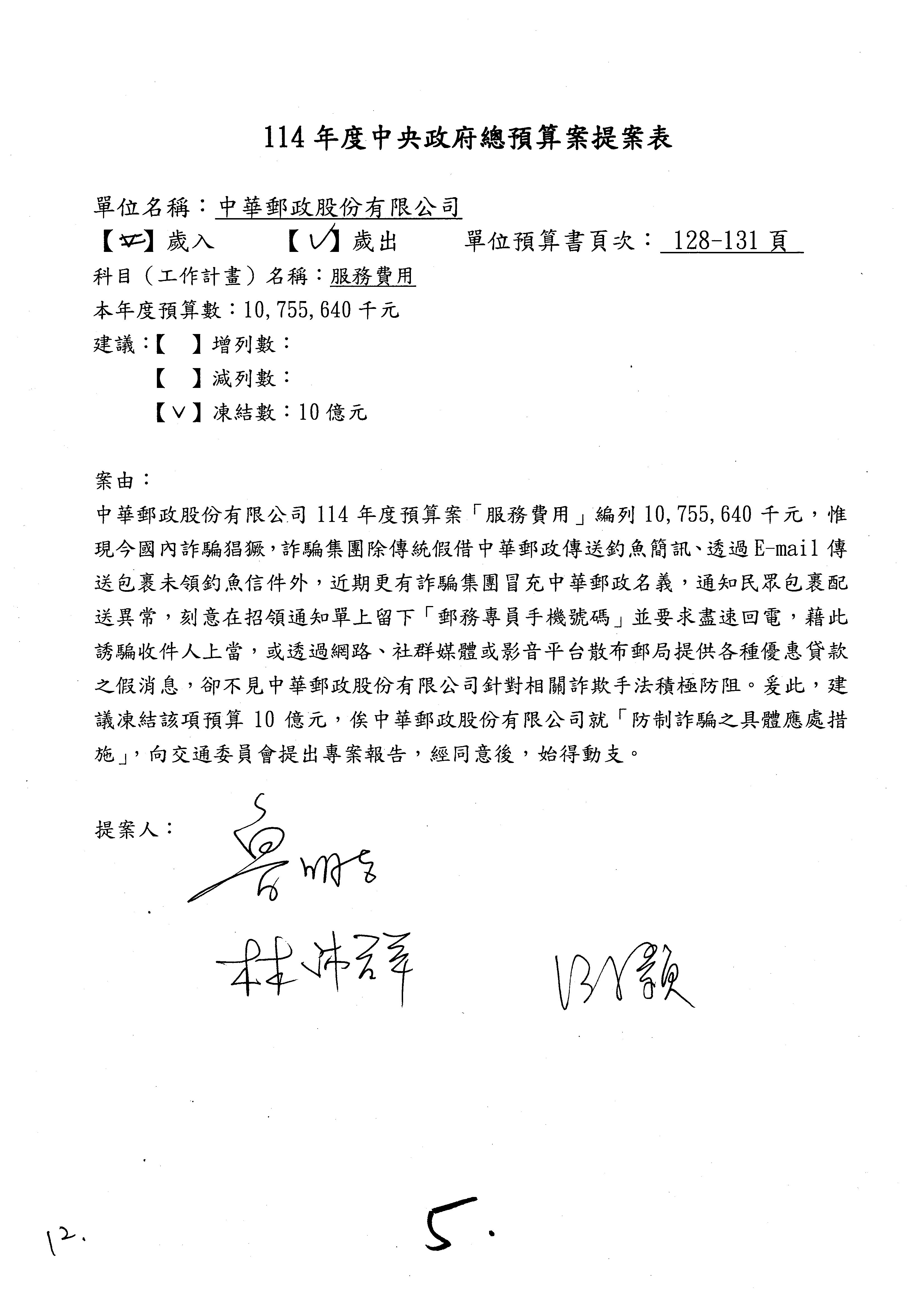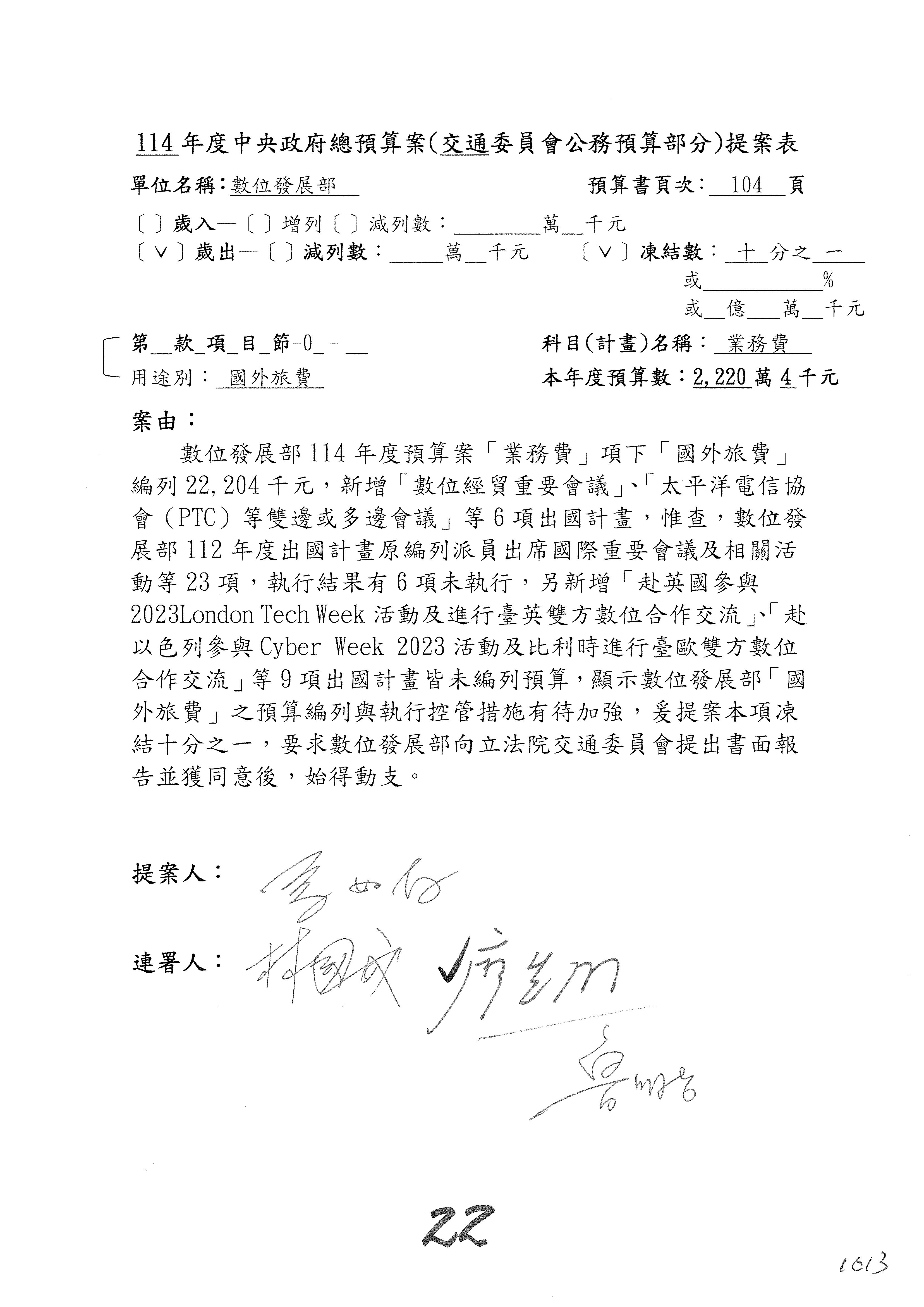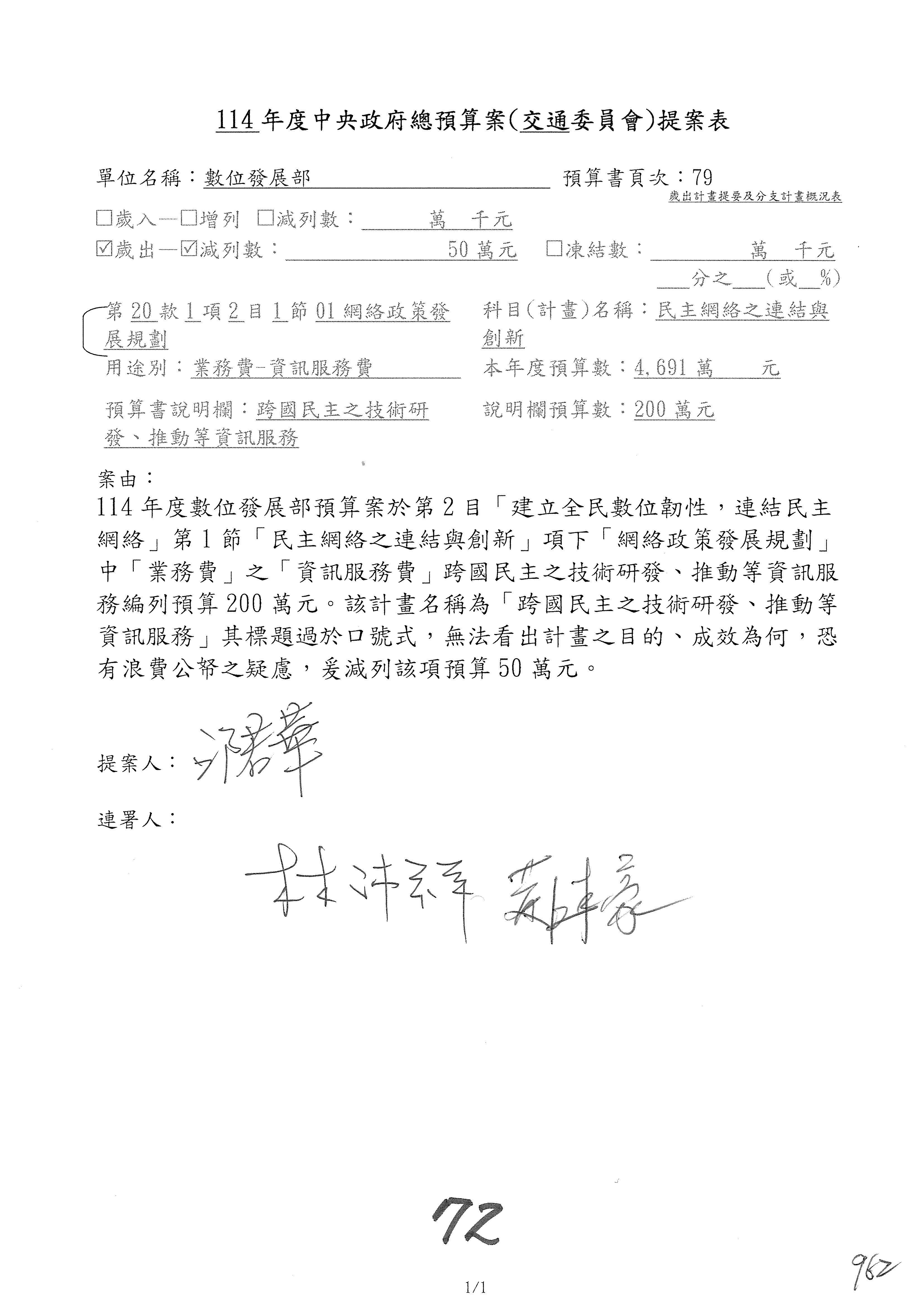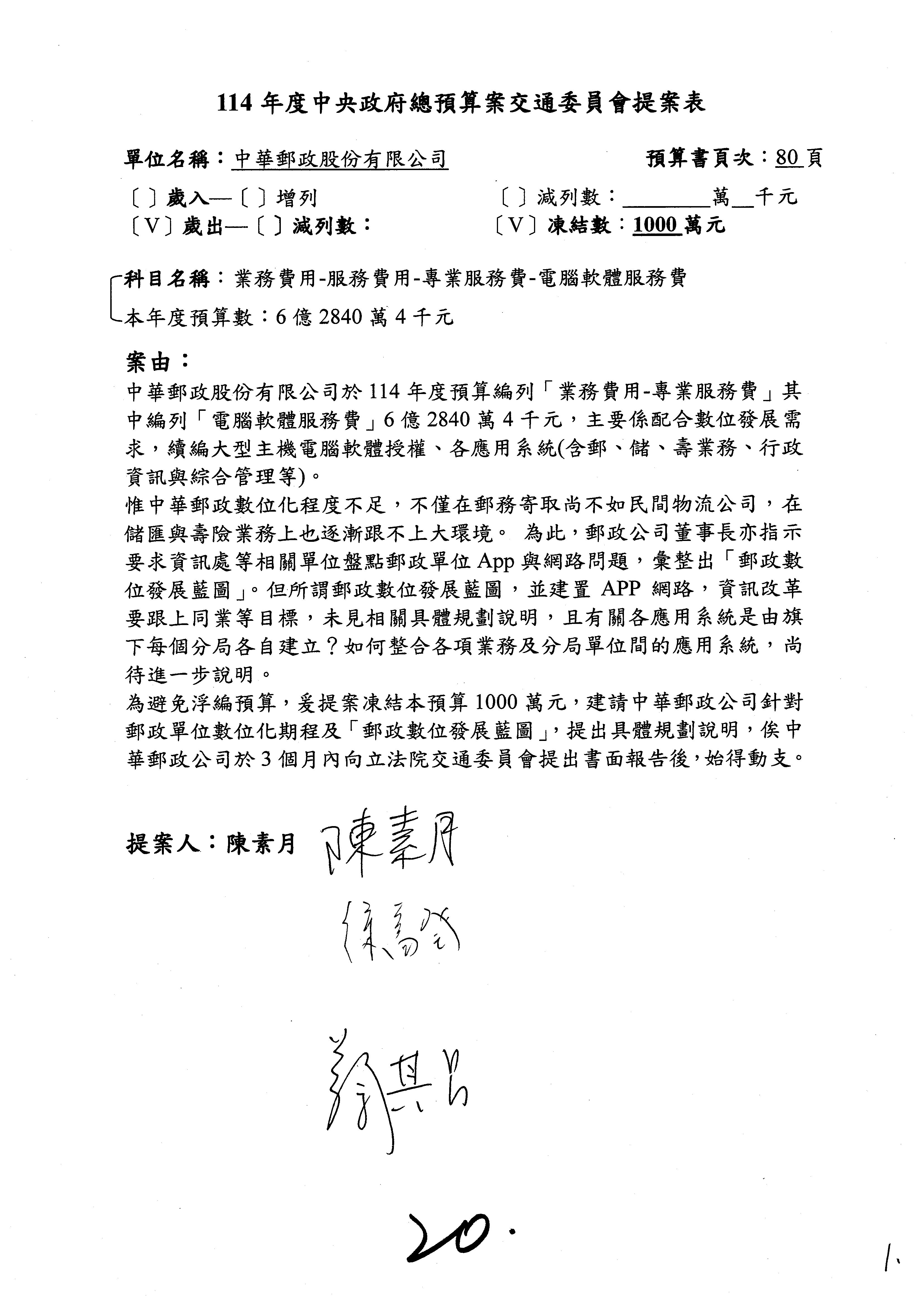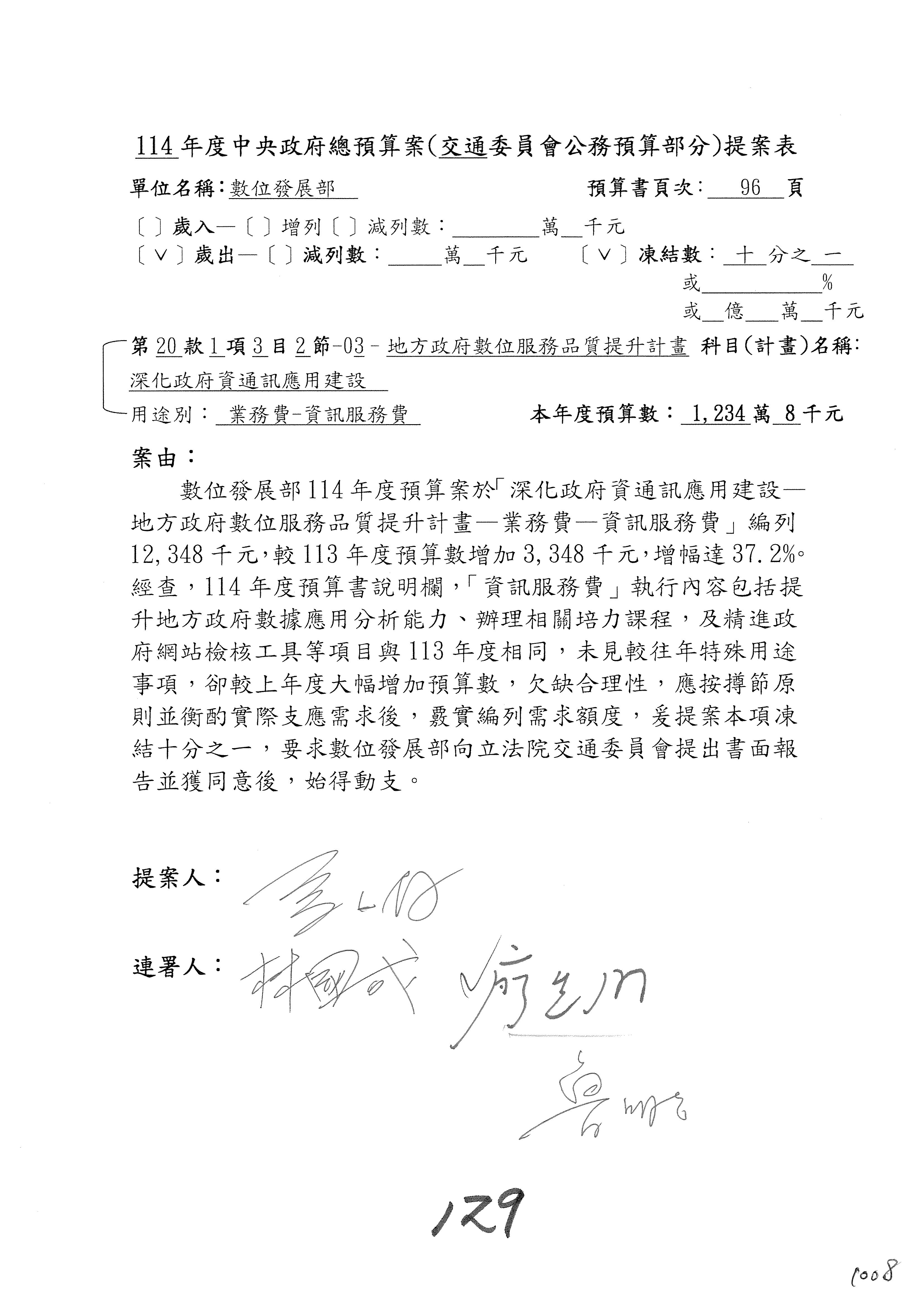 林委員國成:這個部分原本我想說增列1億,經過溝通他們所有的作法,我在這裡是有要求,數位部也原則性同意,三個月以內向立法院交通委員會提出書面報告,我也同意不增列,這點特別跟召集人說明跟報告。