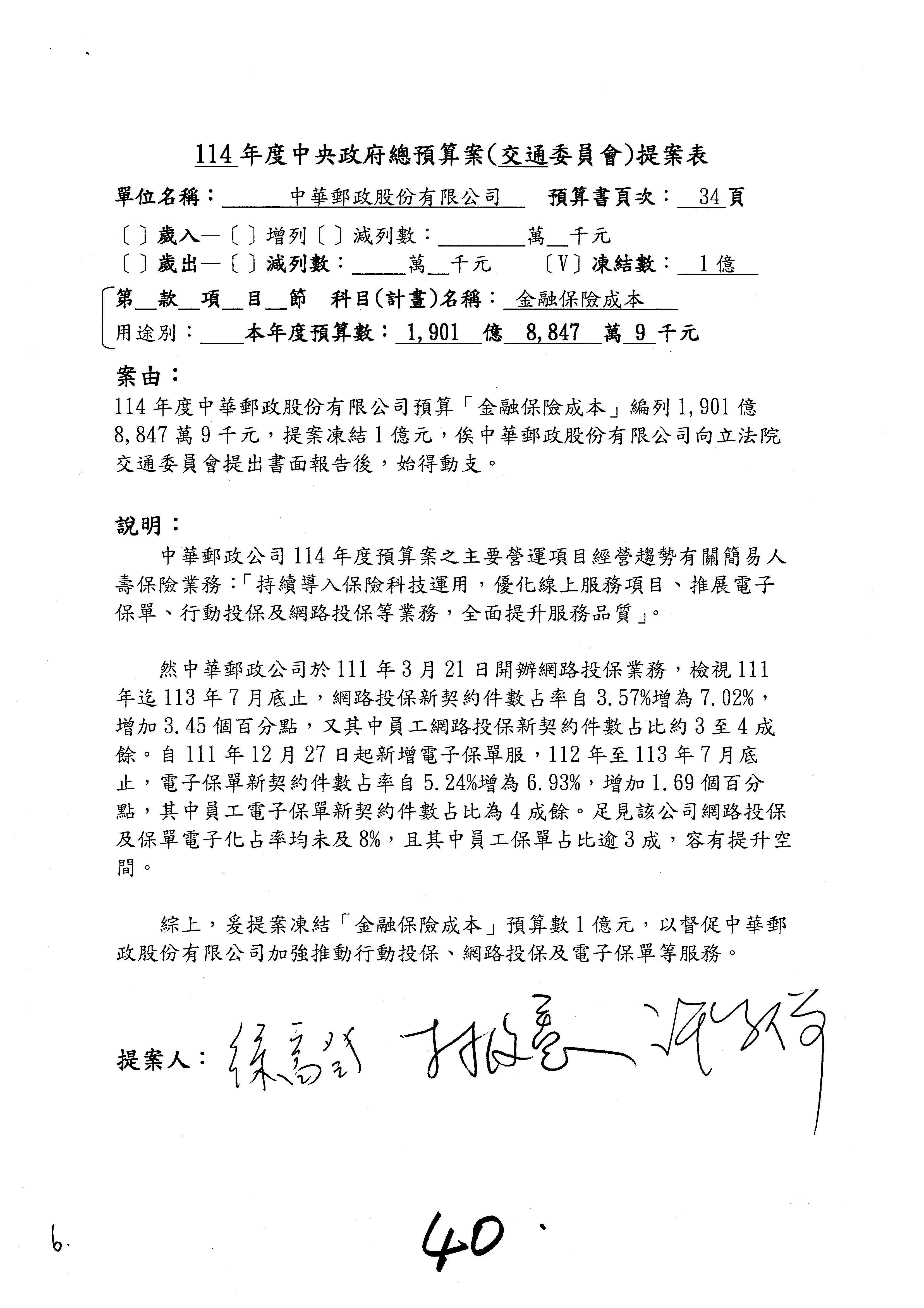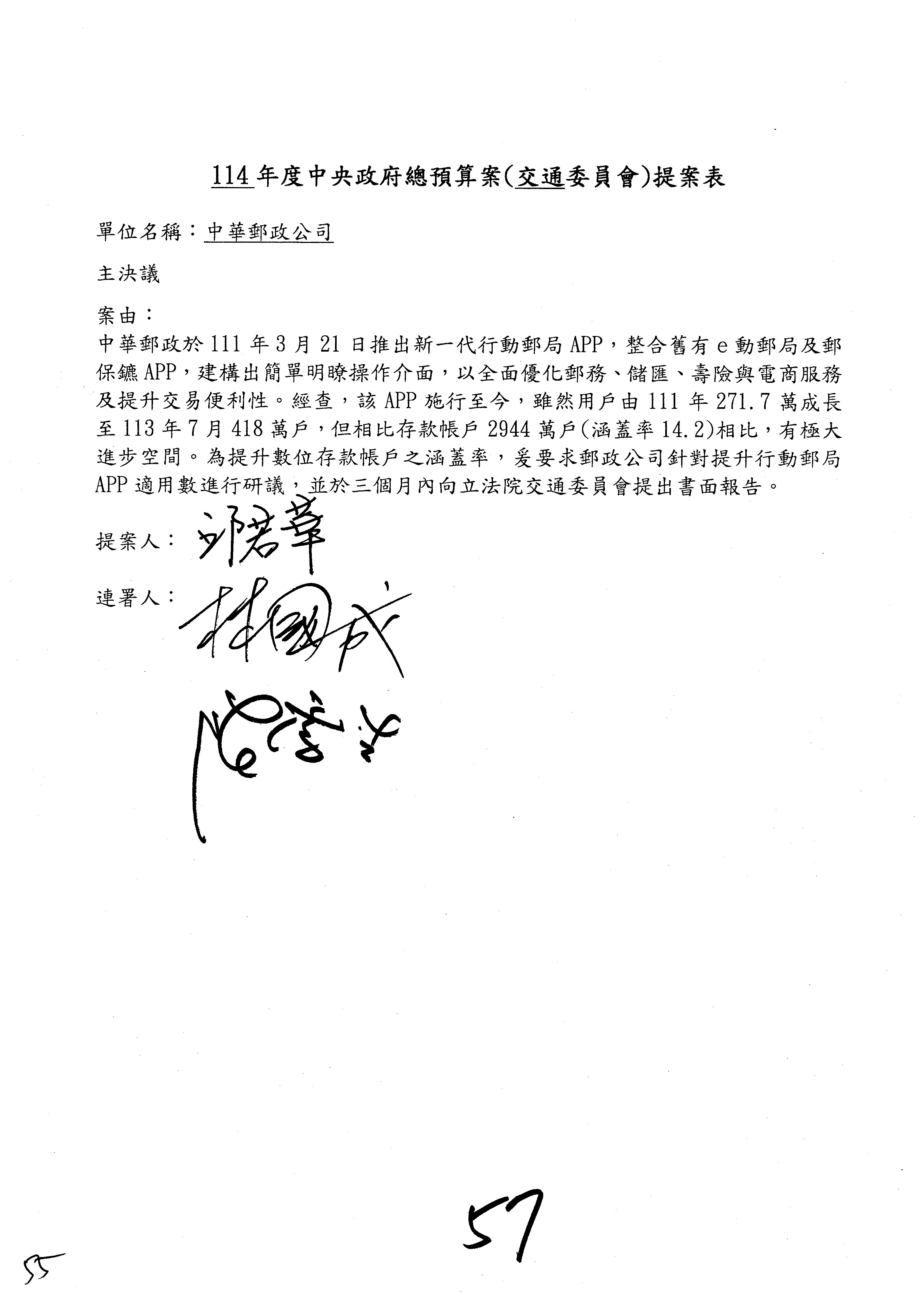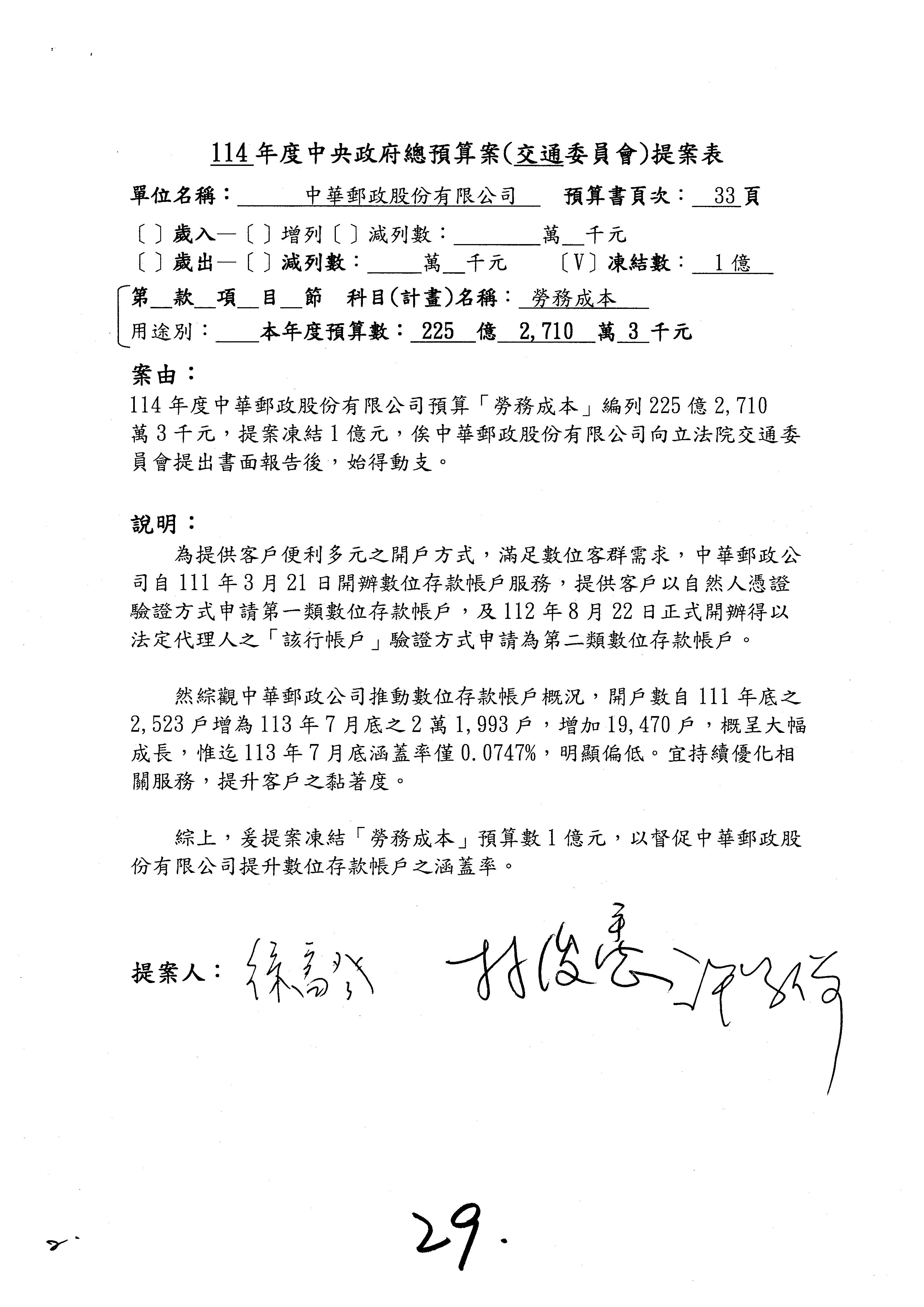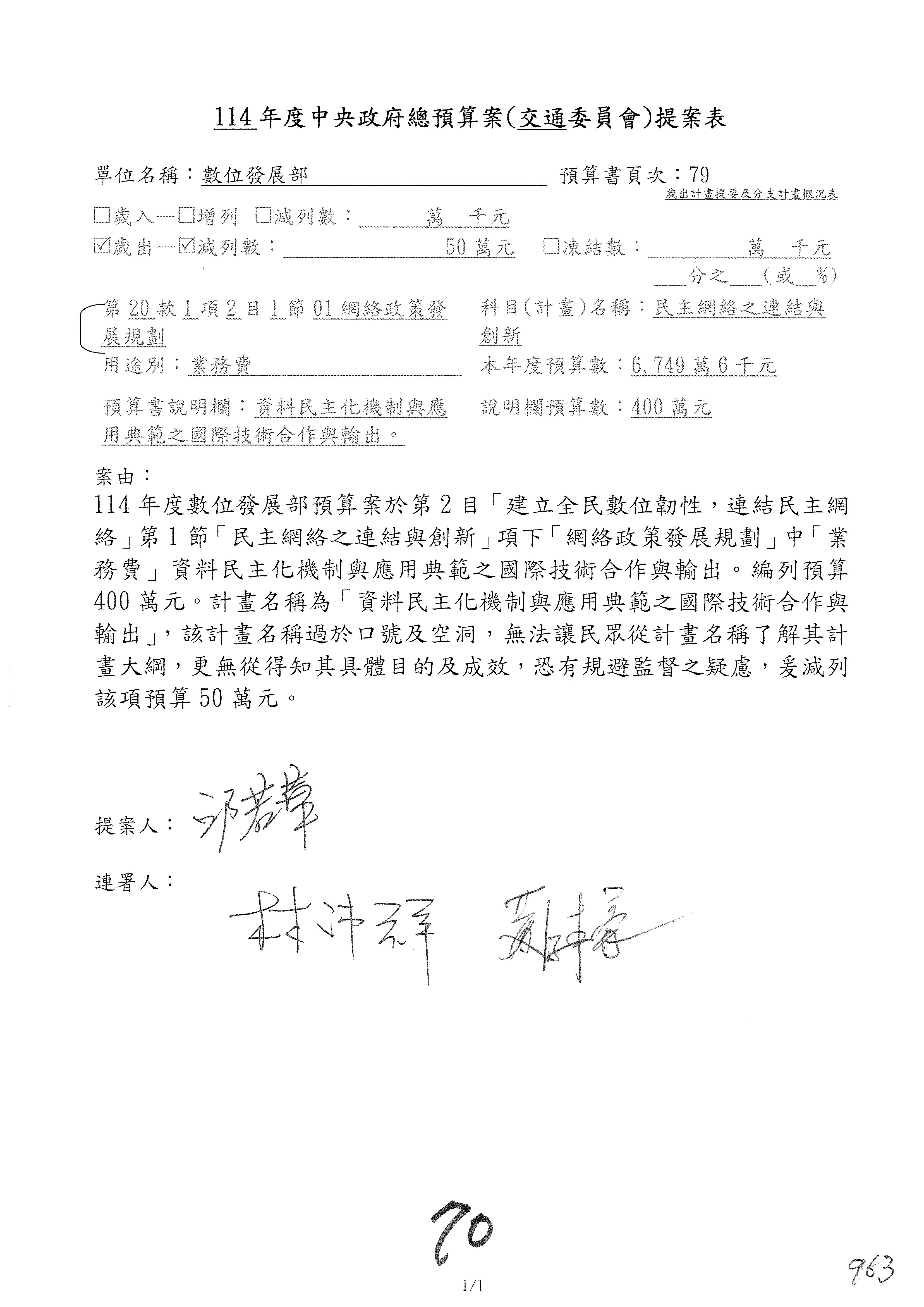 林委員國成:這個部分原本我想說增列1億,經過溝通他們所有的作法,我在這裡是有要求,數位部也原則性同意,三個月以內向立法院交通委員會提出書面報告,我也同意不增列,這點特別跟召集人說明跟報告。