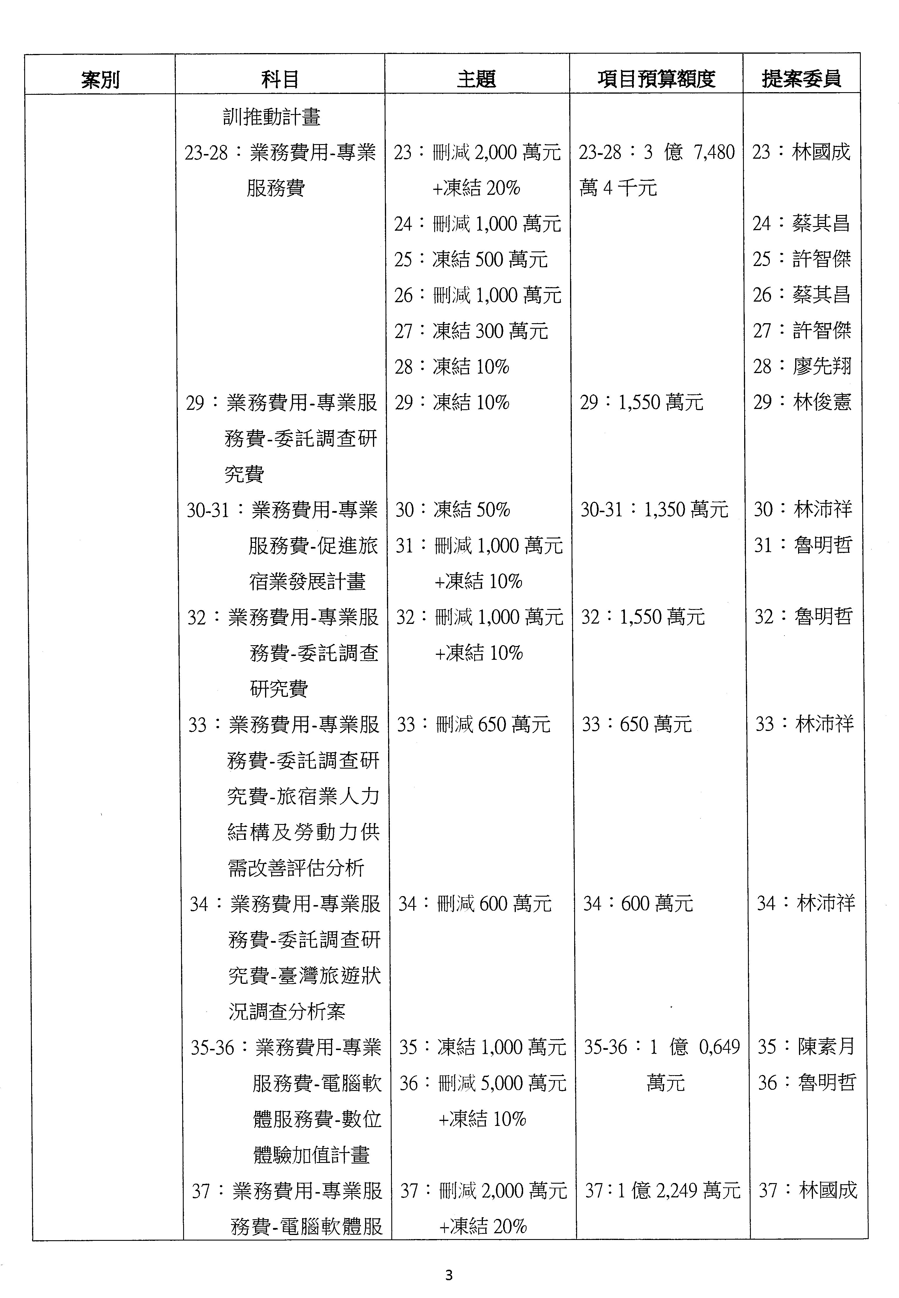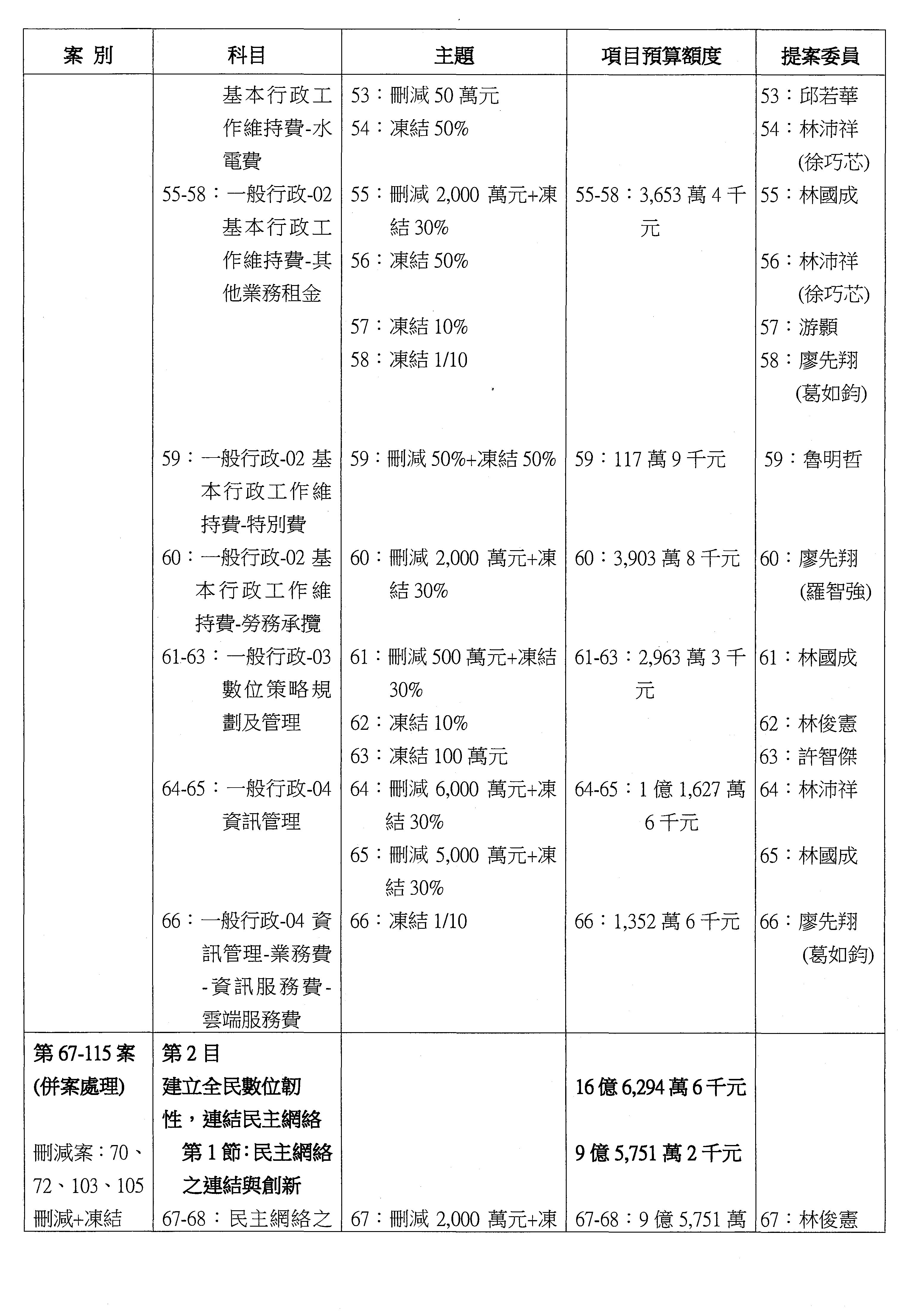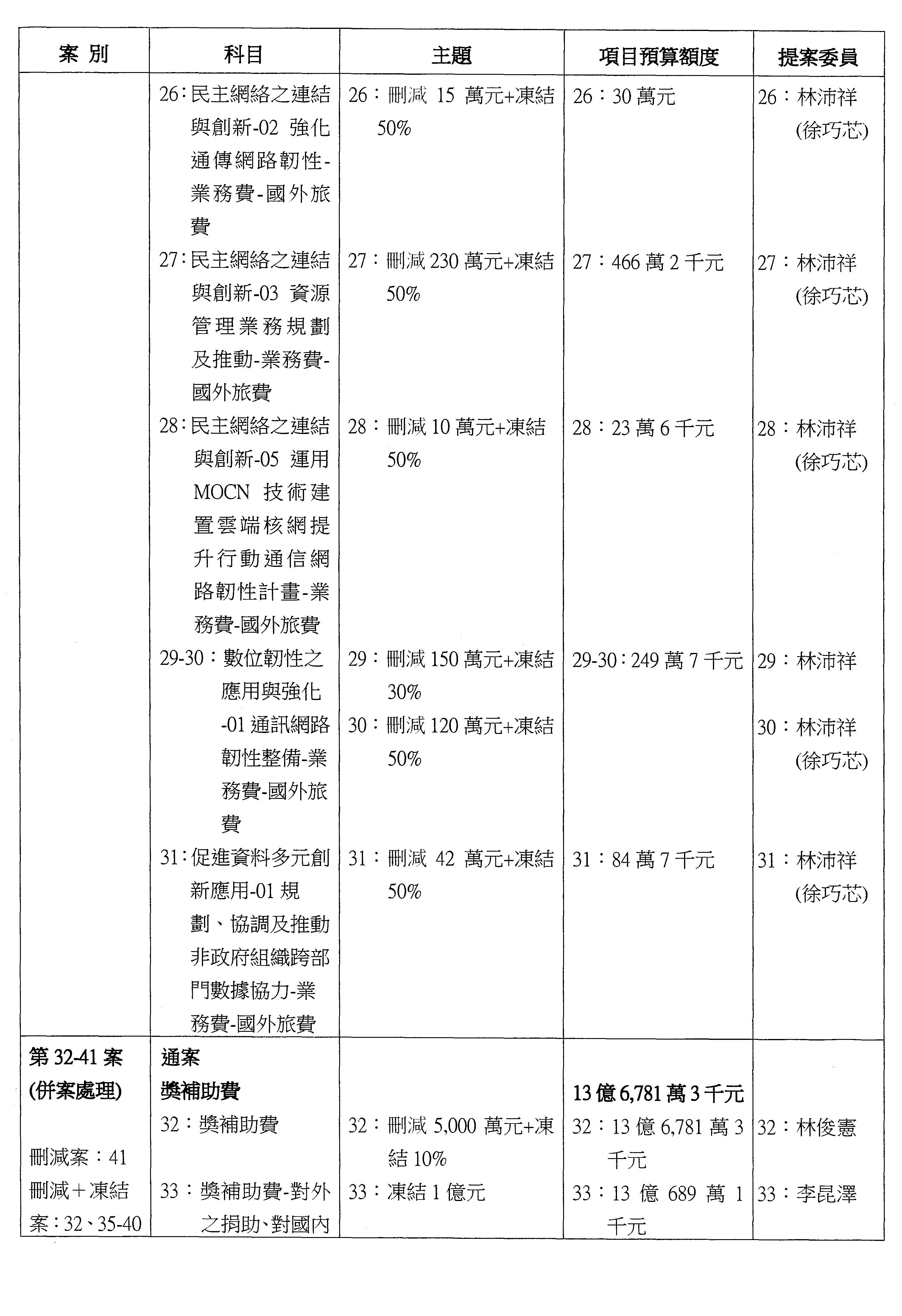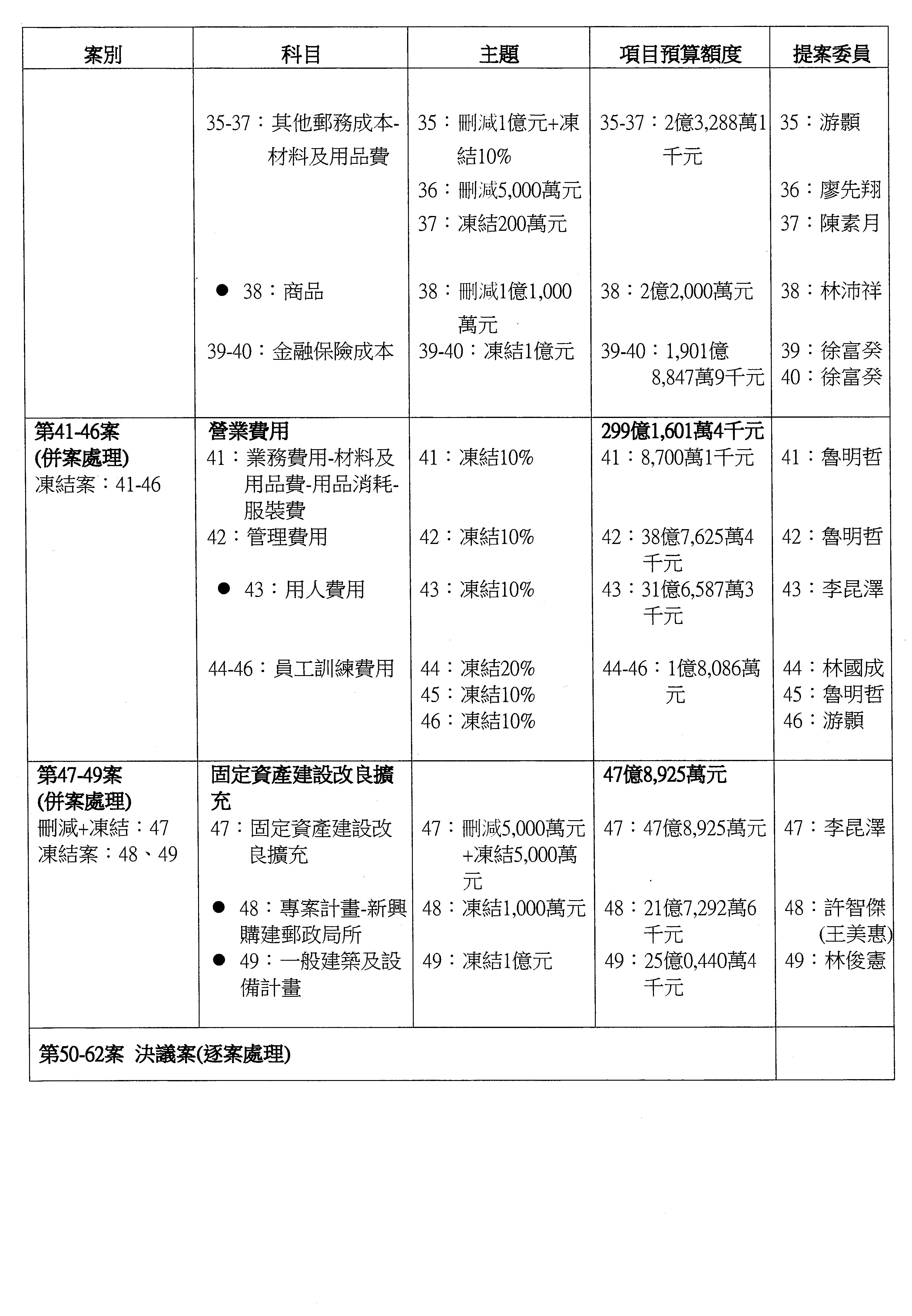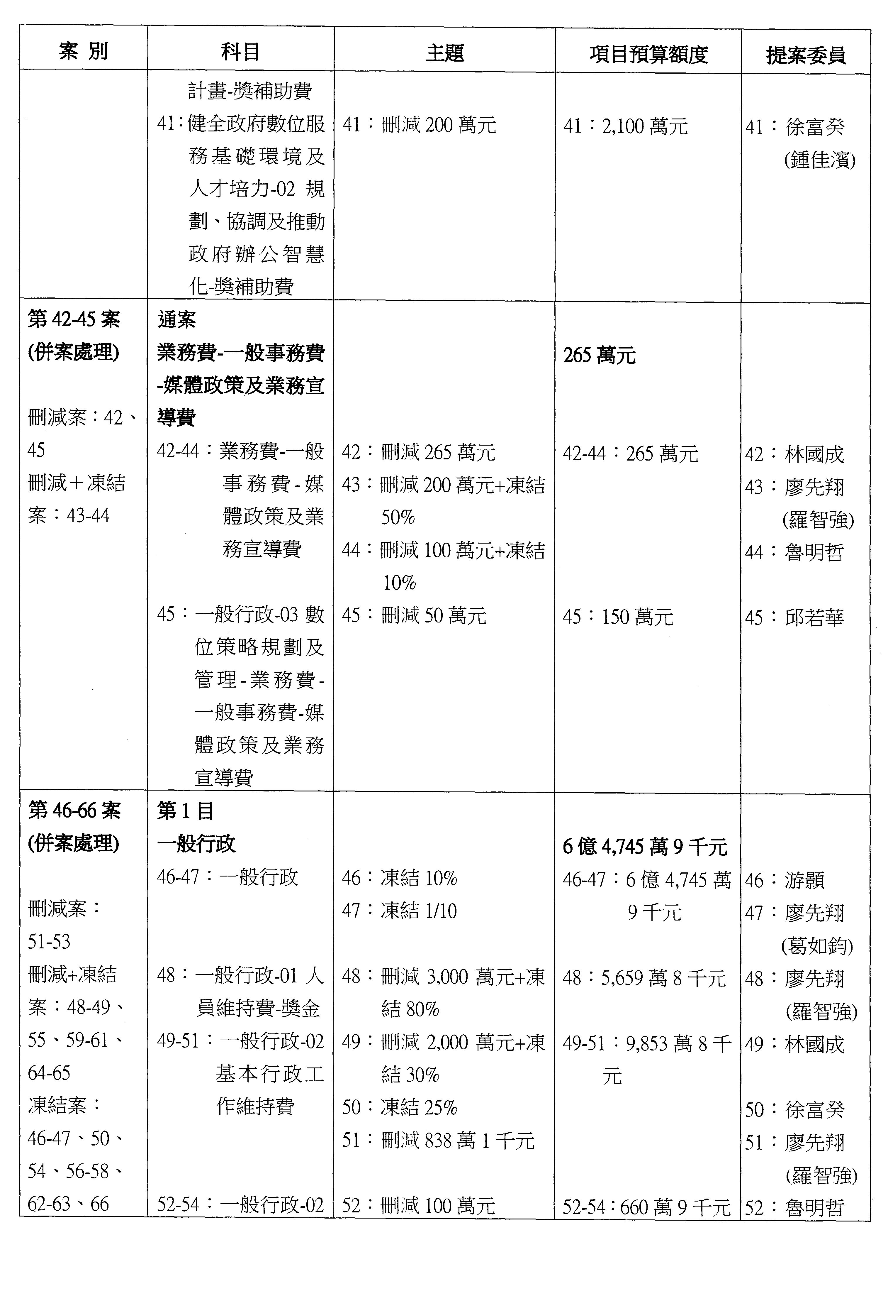 主席:好的。現在處理第16案到第48案的部分,當然,各位委員提出的相關議題,你們需要提出書面報告。業務費用四十四億五百三十六萬餘元,這個部分綜合所有委員的提案,金額從幾百萬元到兩億元不等,我們折衷一下啦!刪減5,000萬元,凍結10%,提供書面報告始得動支。各位有沒有其他意見?沒意見吧?