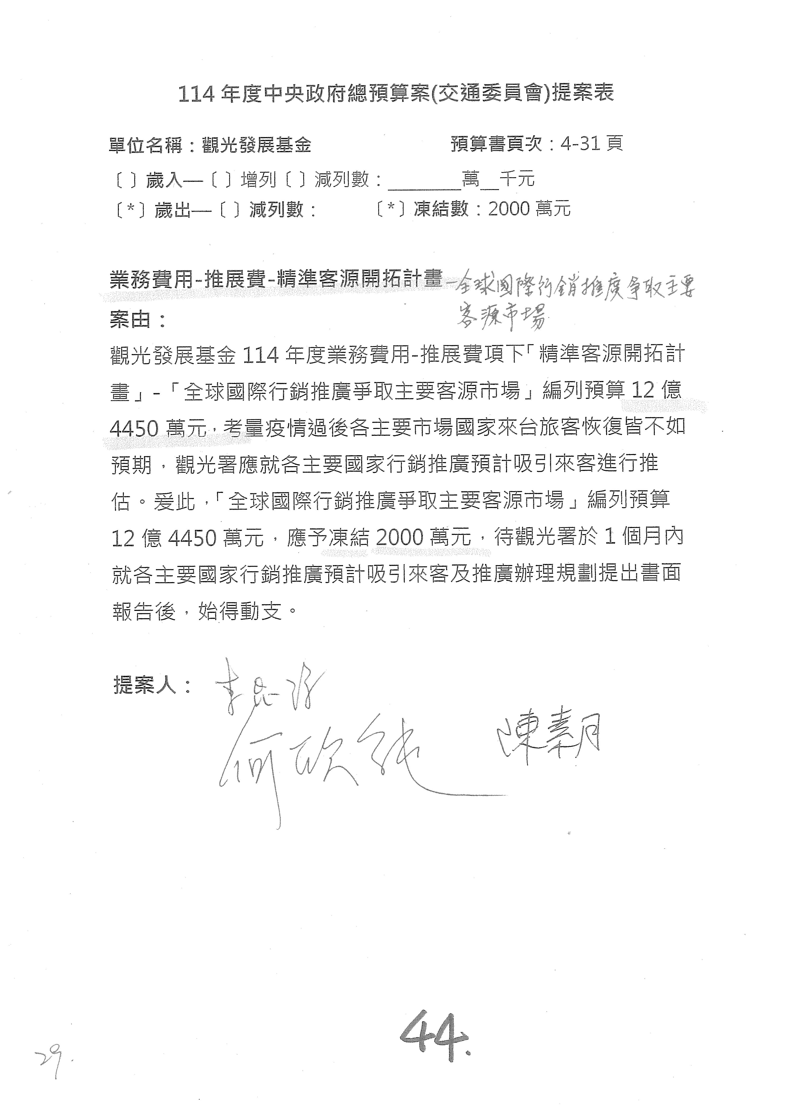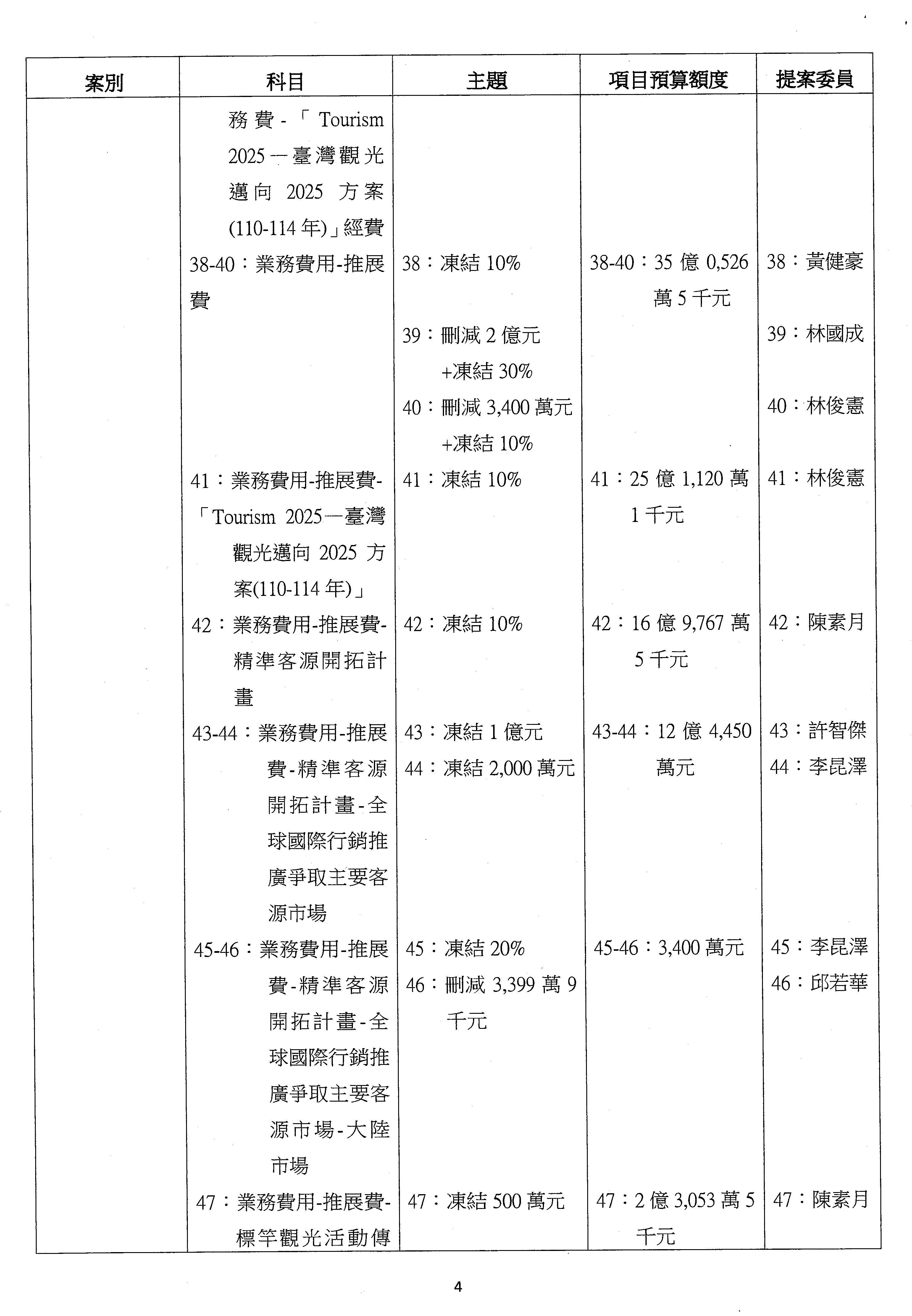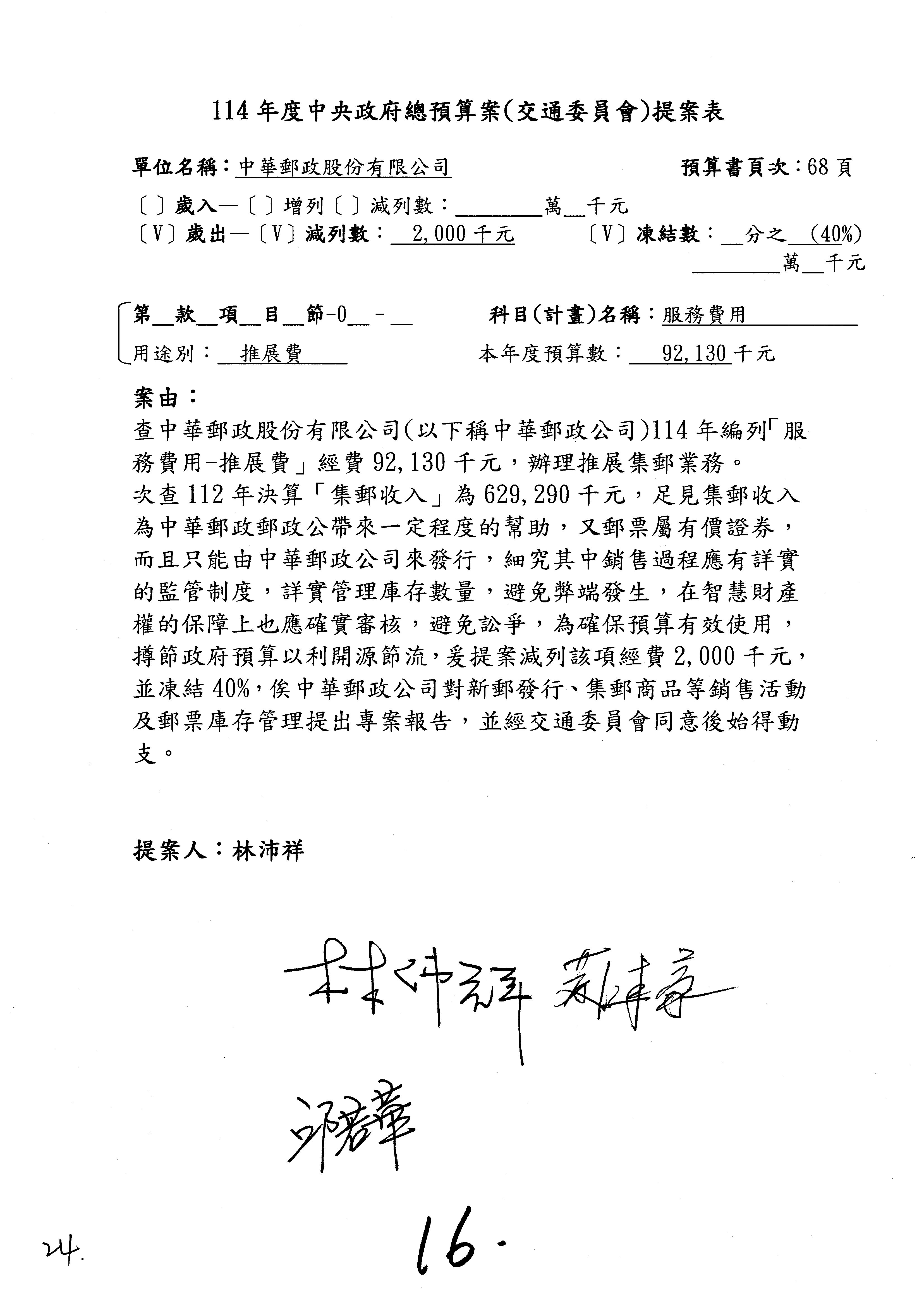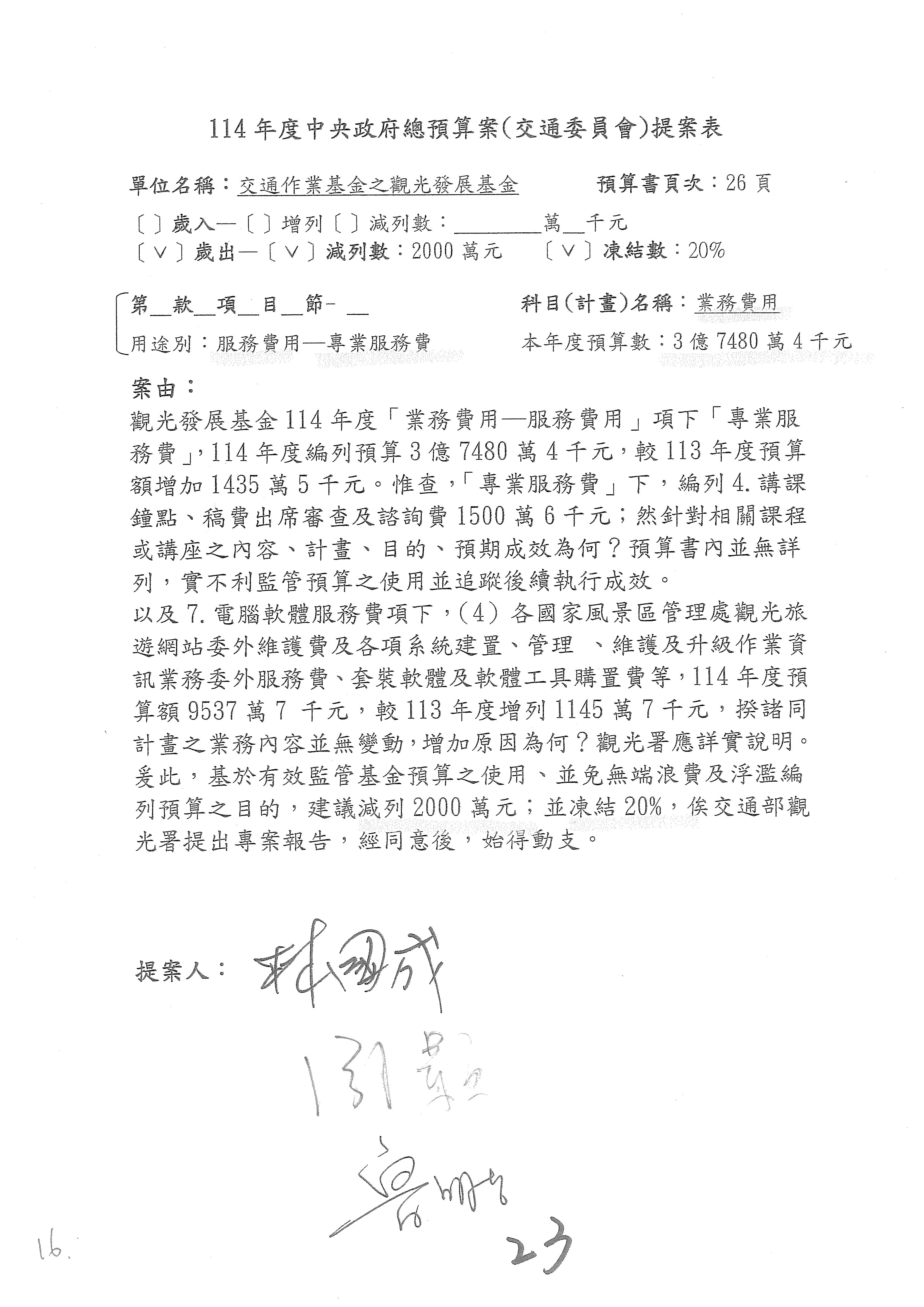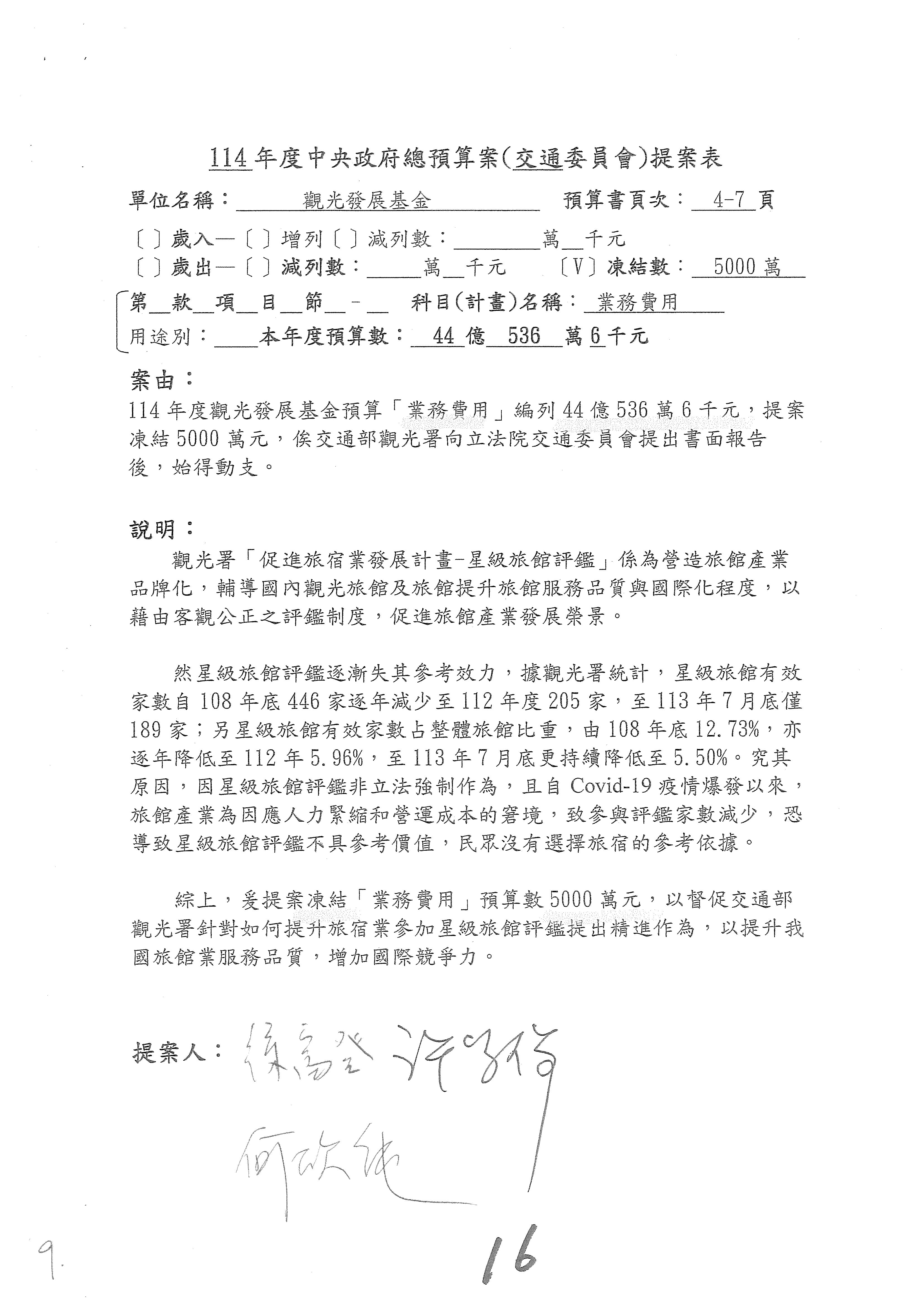 主席:好的。現在處理第16案到第48案的部分,當然,各位委員提出的相關議題,你們需要提出書面報告。業務費用四十四億五百三十六萬餘元,這個部分綜合所有委員的提案,金額從幾百萬元到兩億元不等,我們折衷一下啦!刪減5,000萬元,凍結10%,提供書面報告始得動支。各位有沒有其他意見?沒意見吧?