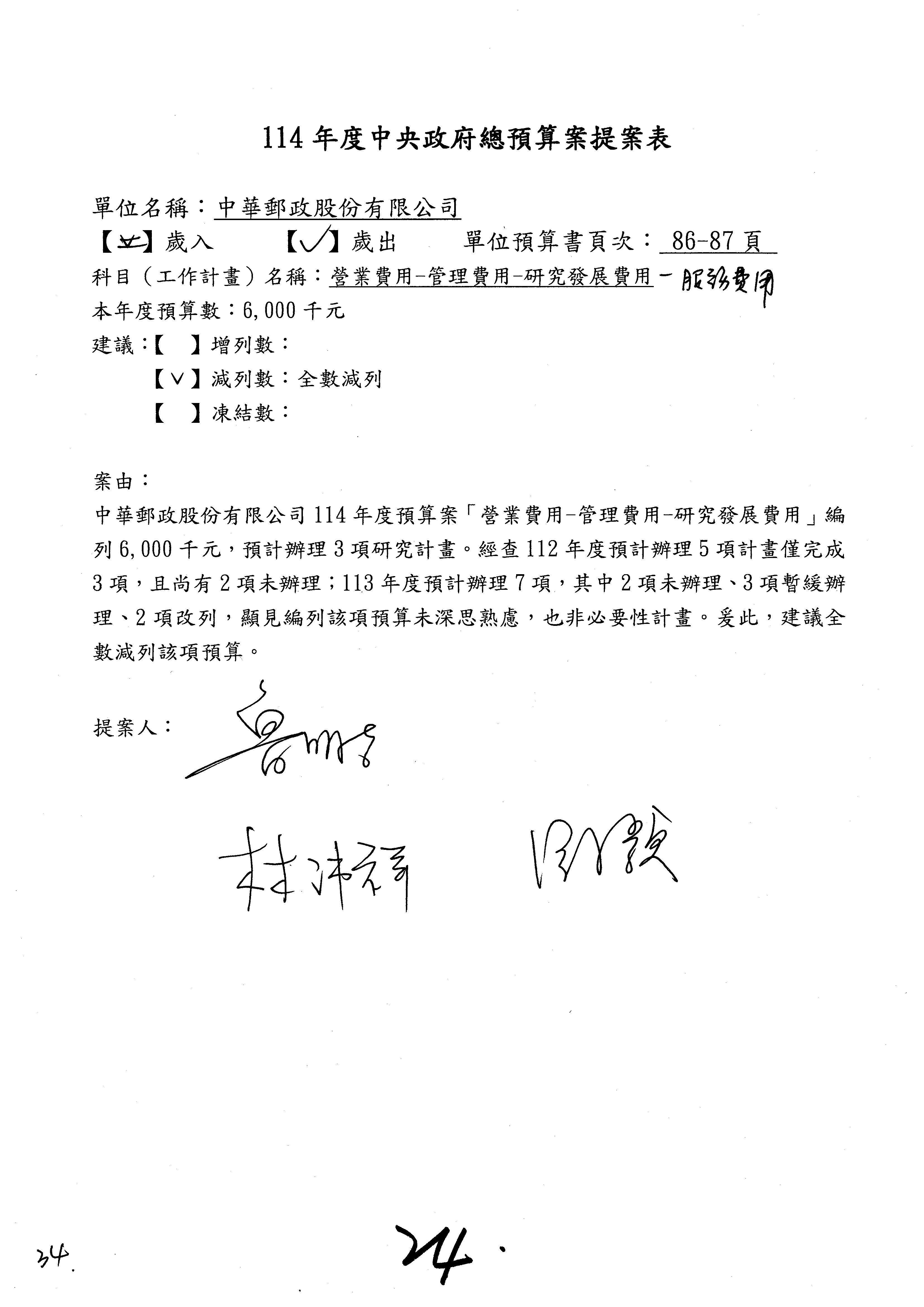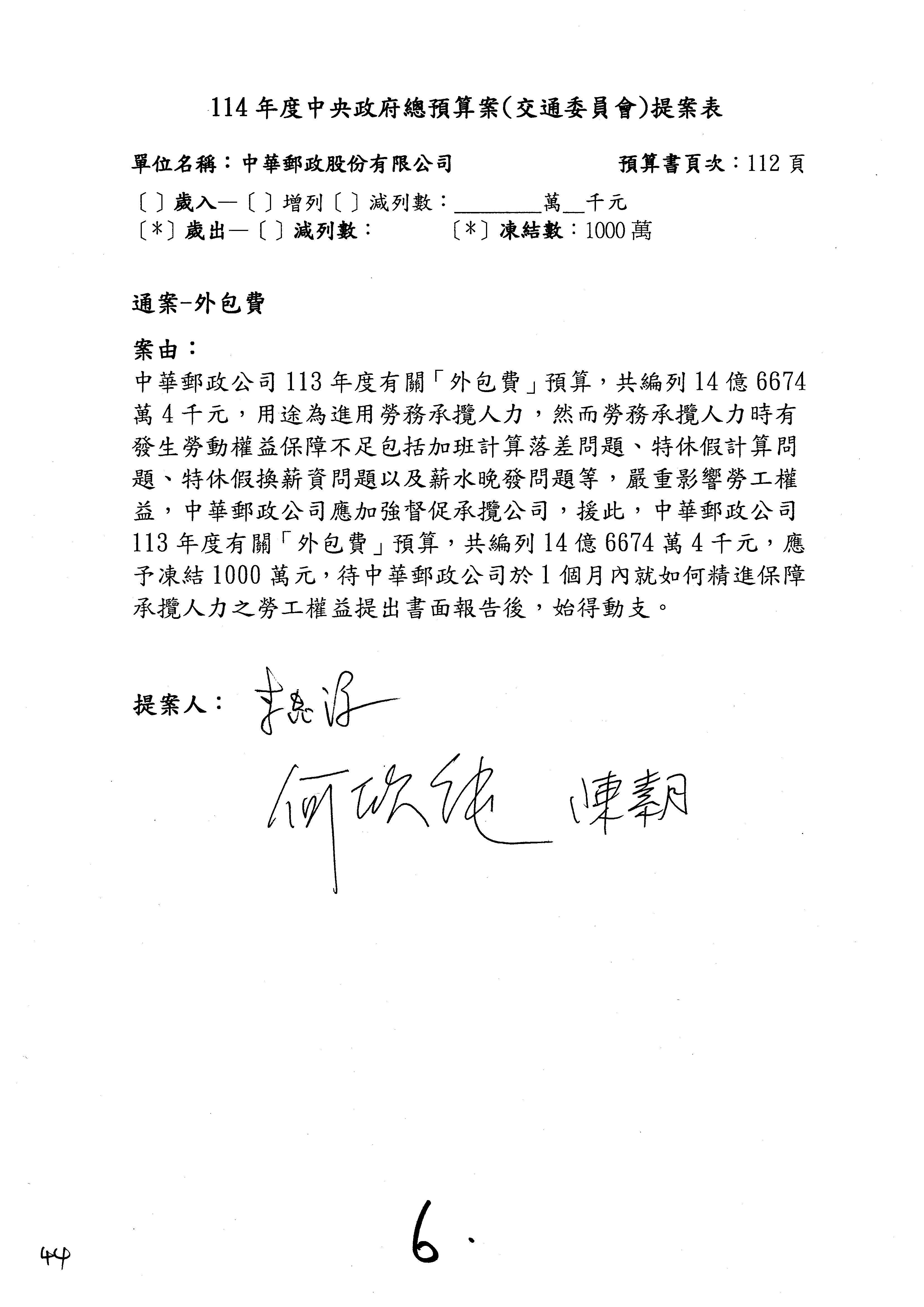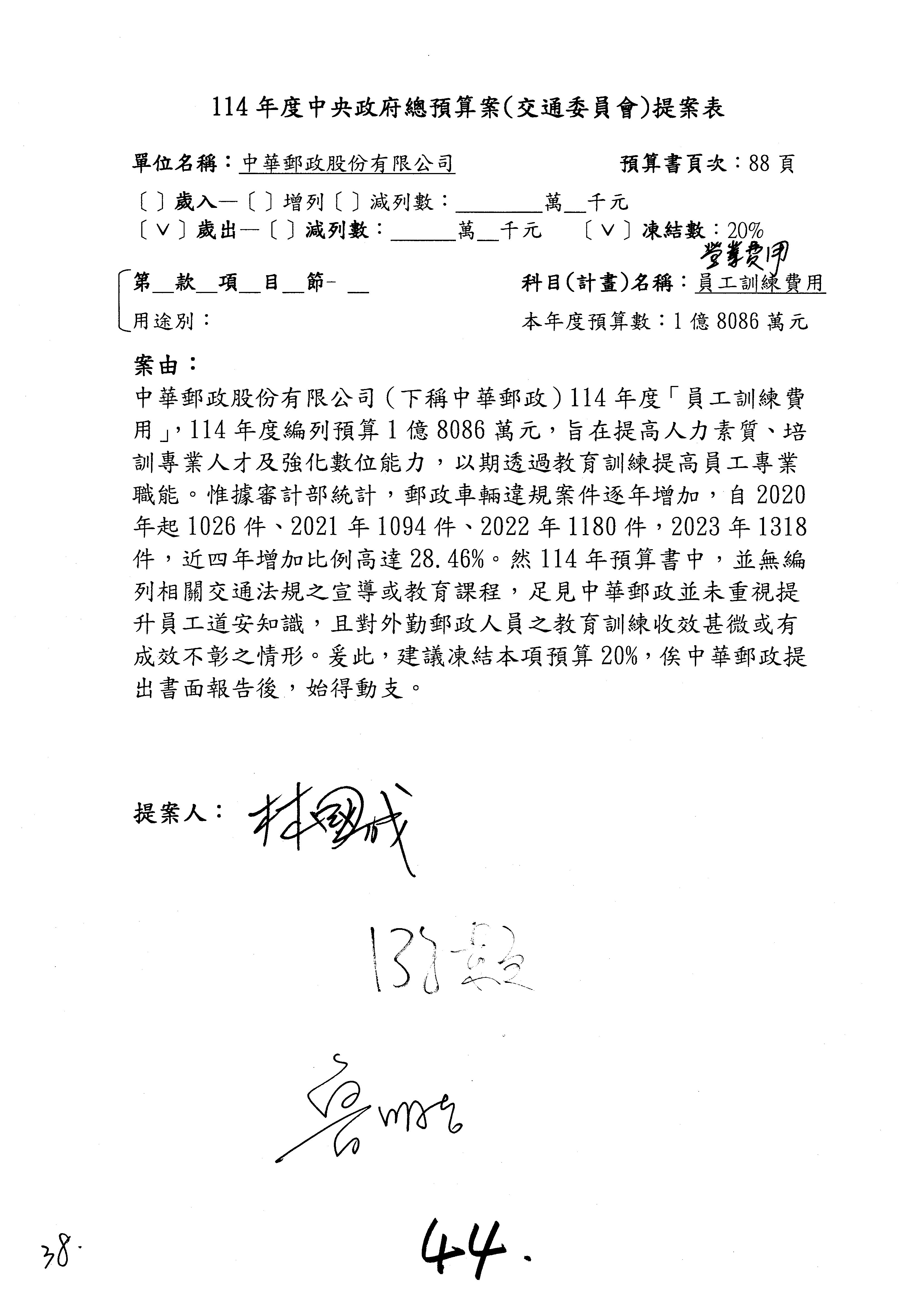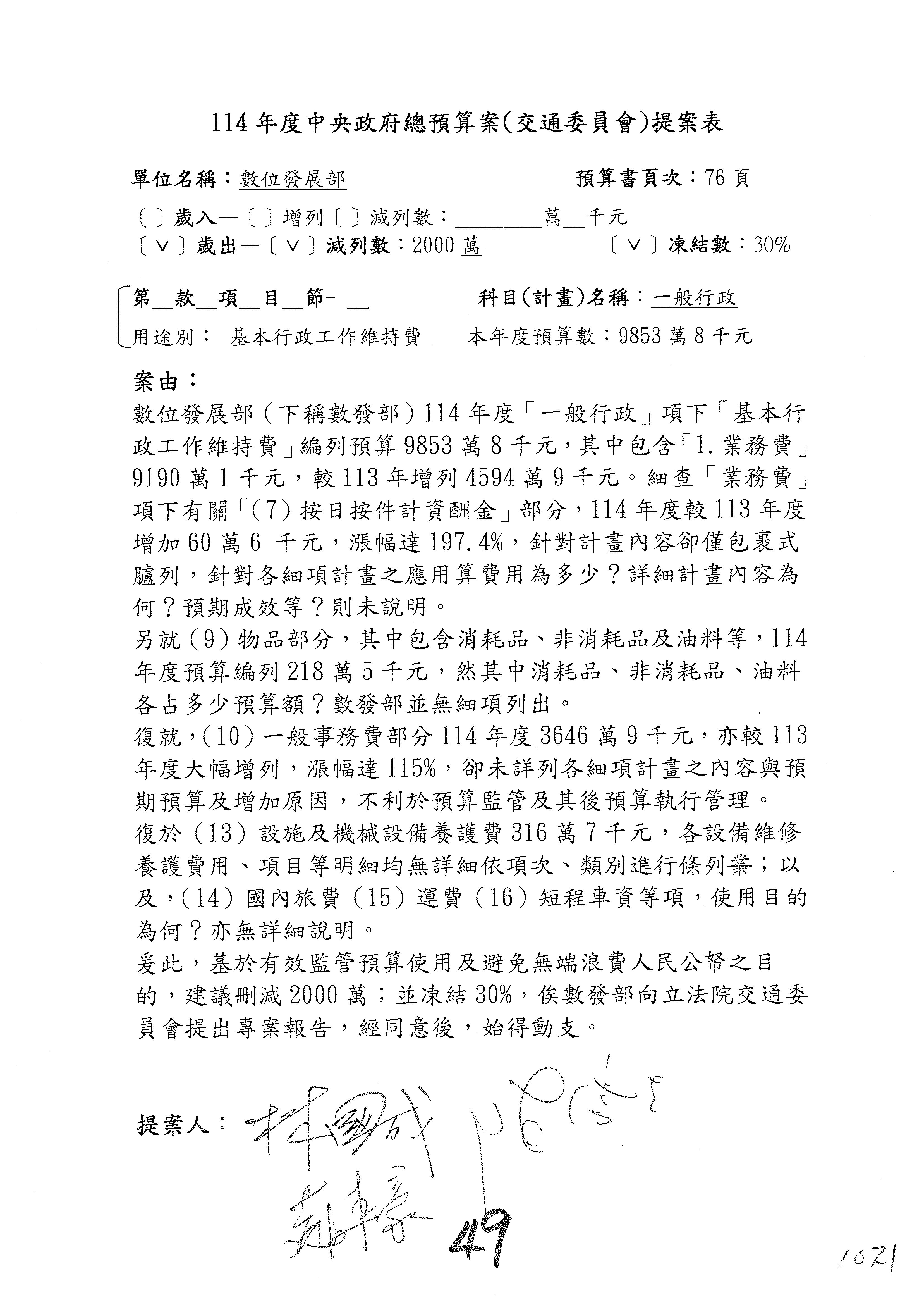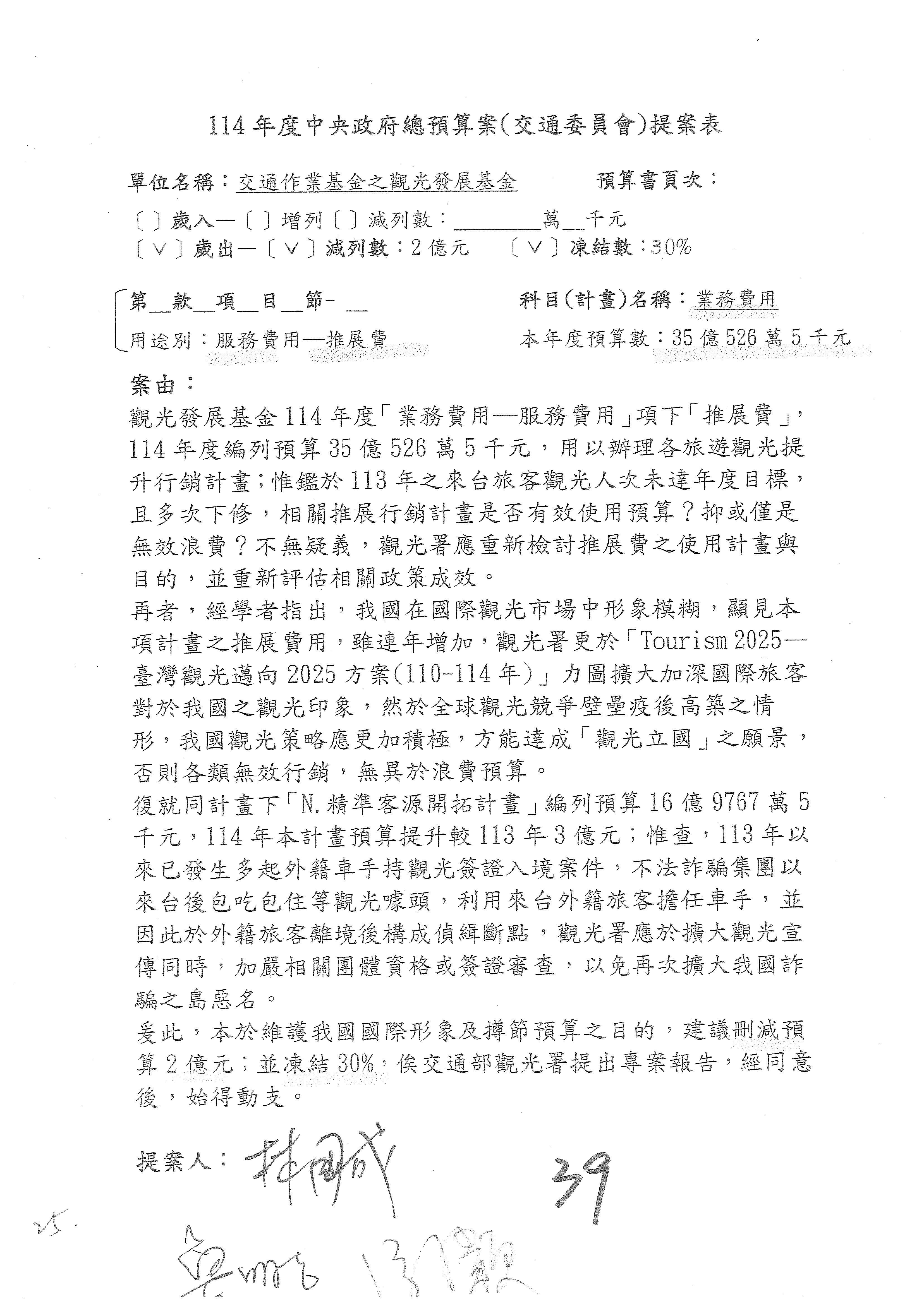 主席:好的。現在處理第16案到第48案的部分,當然,各位委員提出的相關議題,你們需要提出書面報告。業務費用四十四億五百三十六萬餘元,這個部分綜合所有委員的提案,金額從幾百萬元到兩億元不等,我們折衷一下啦!刪減5,000萬元,凍結10%,提供書面報告始得動支。各位有沒有其他意見?沒意見吧?