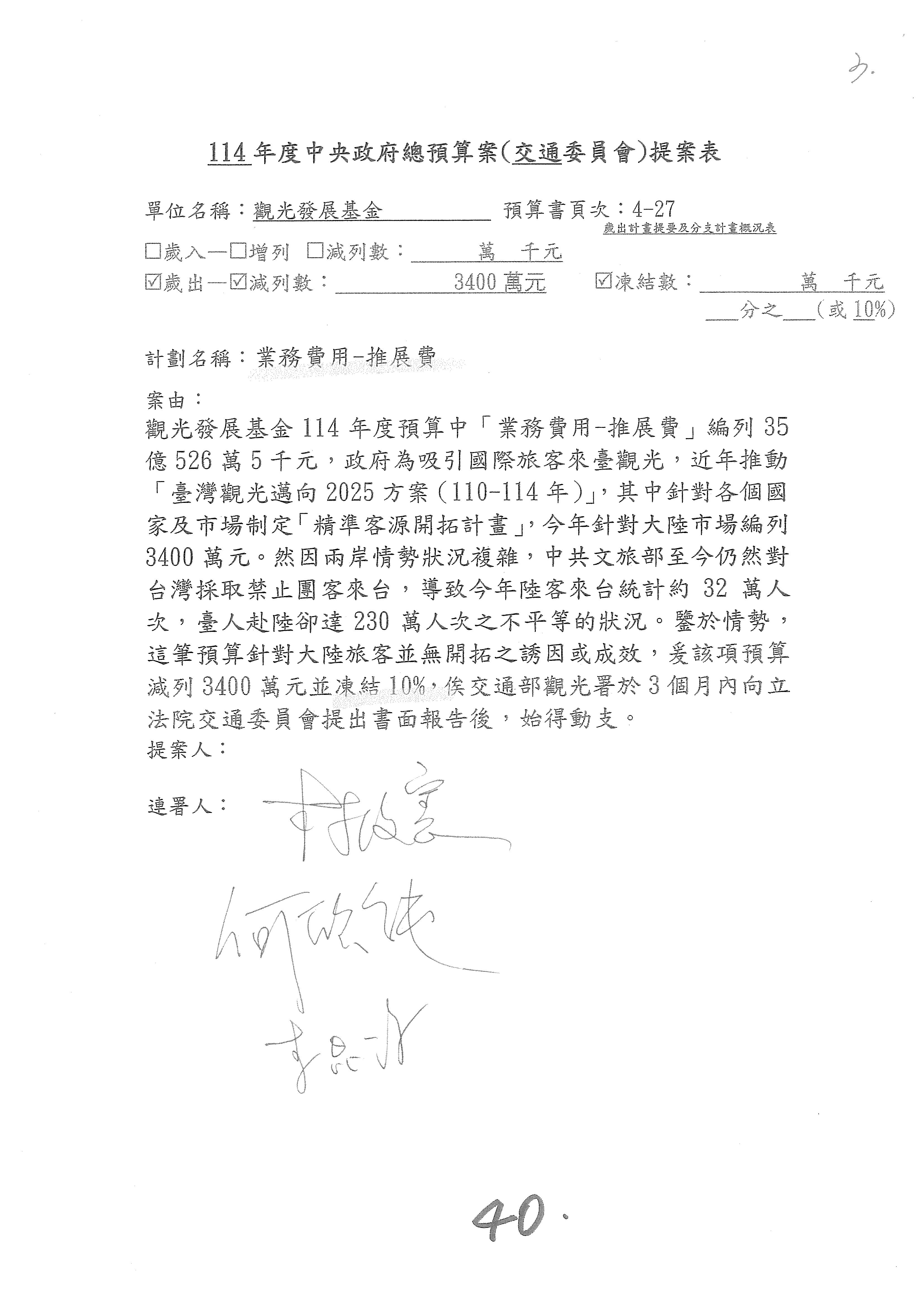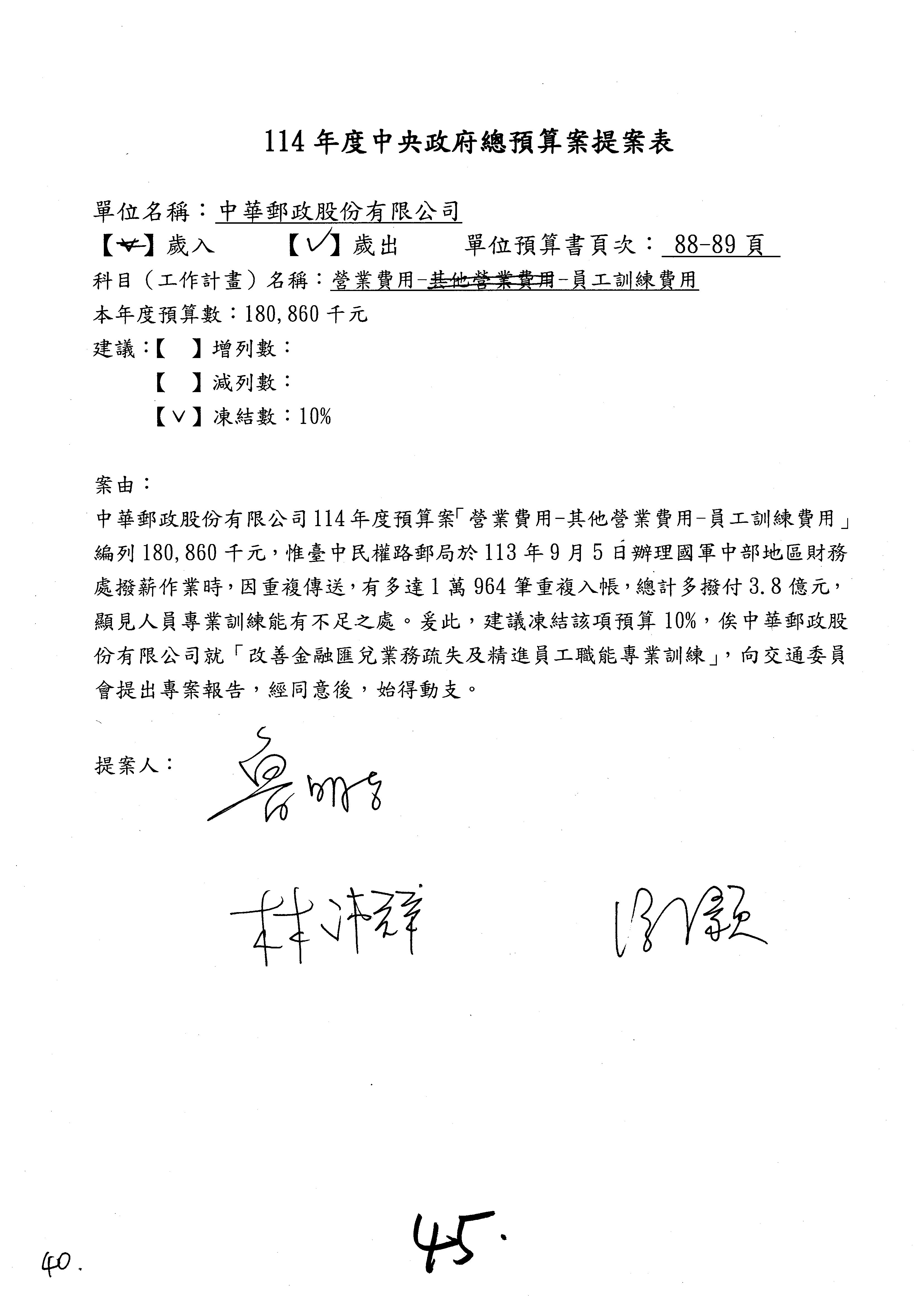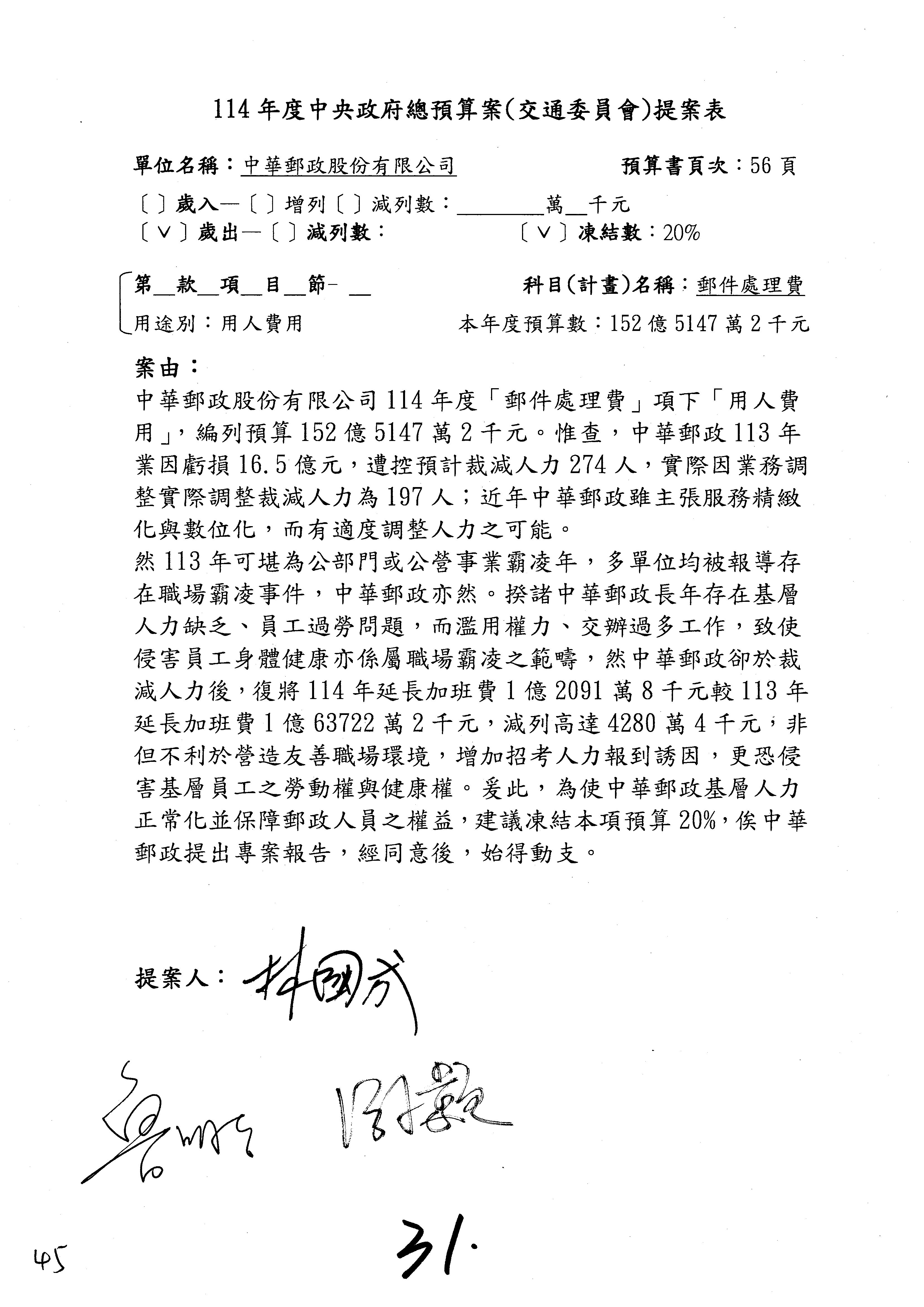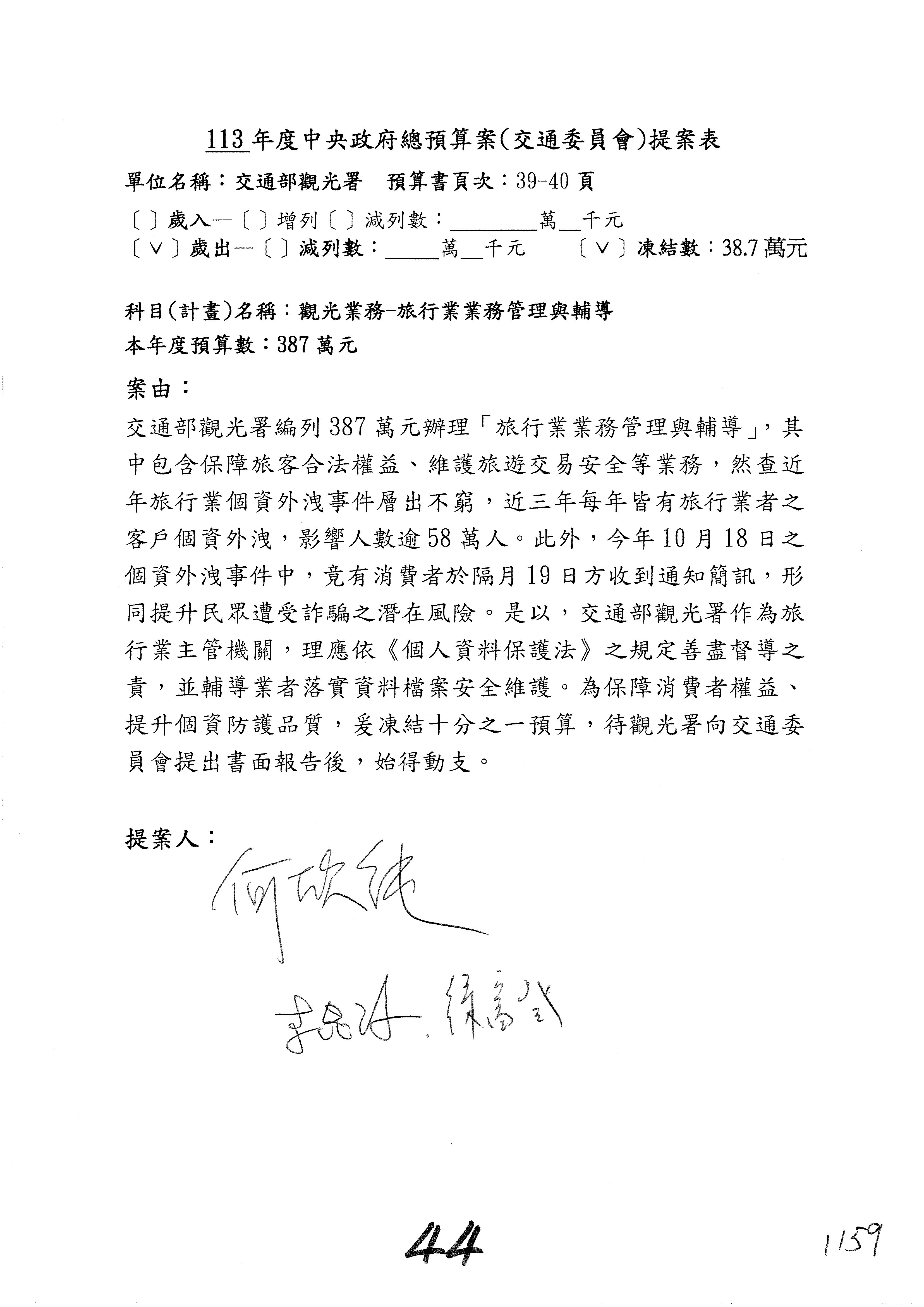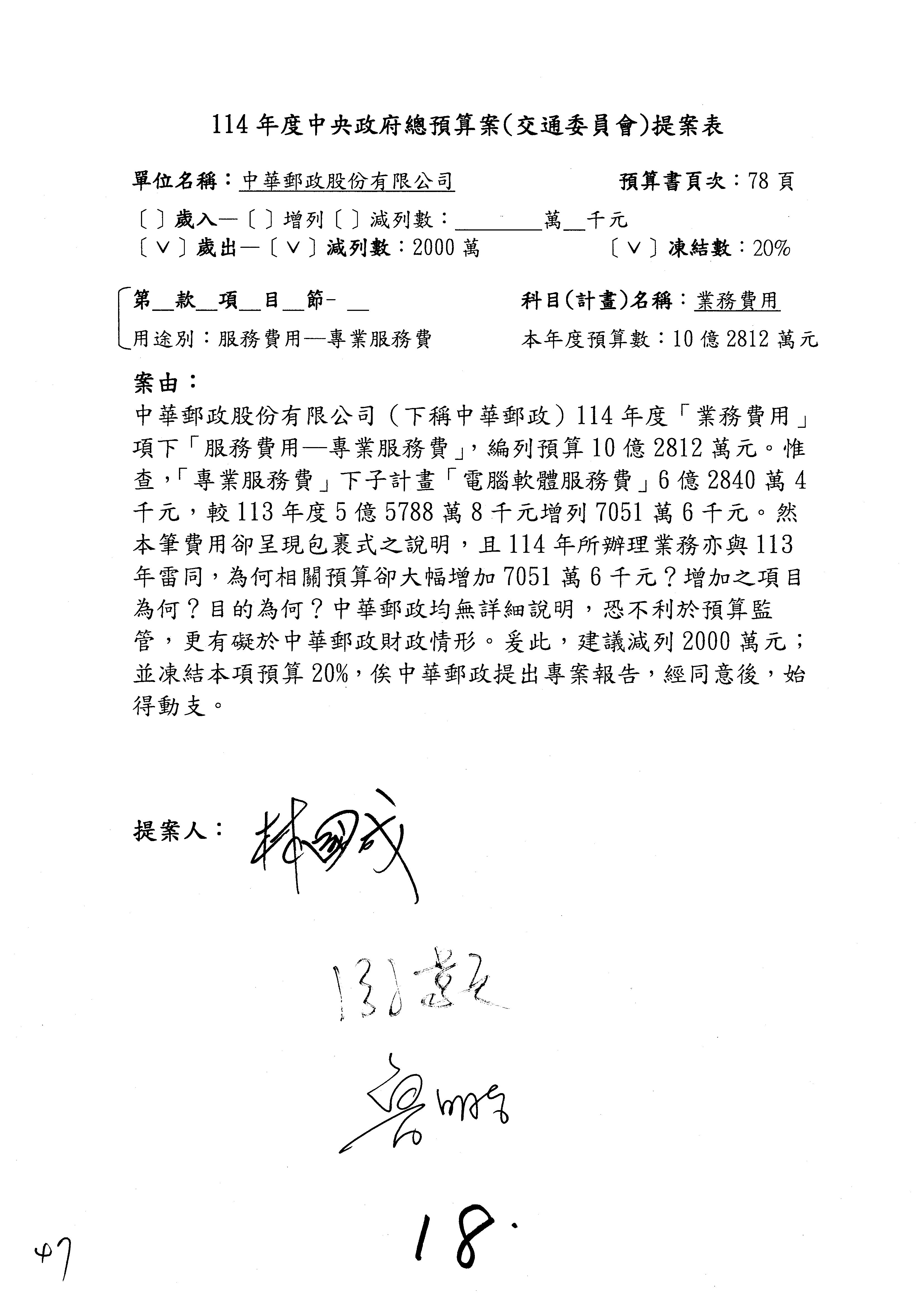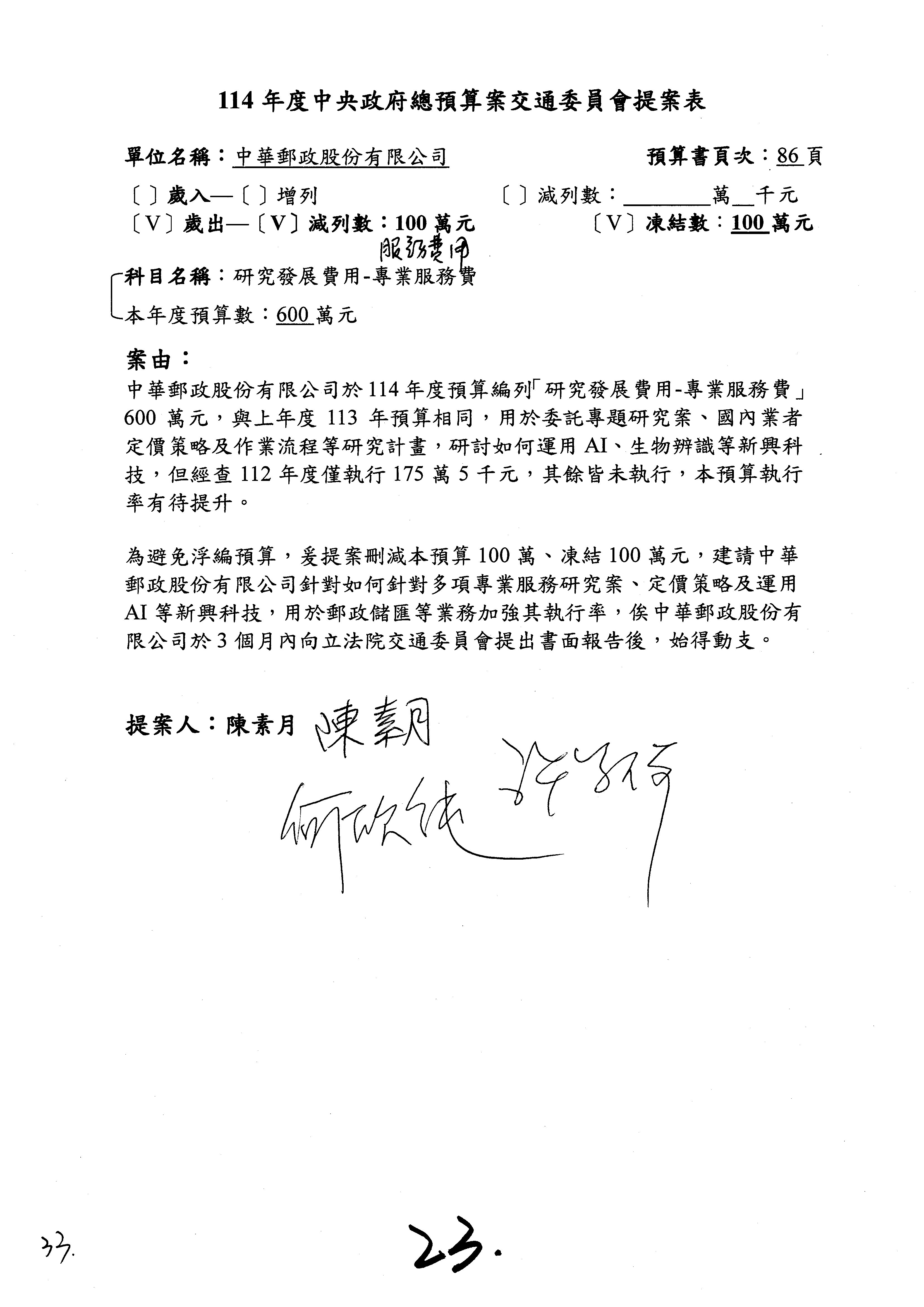 主席:好的。現在處理第16案到第48案的部分,當然,各位委員提出的相關議題,你們需要提出書面報告。業務費用四十四億五百三十六萬餘元,這個部分綜合所有委員的提案,金額從幾百萬元到兩億元不等,我們折衷一下啦!刪減5,000萬元,凍結10%,提供書面報告始得動支。各位有沒有其他意見?沒意見吧?