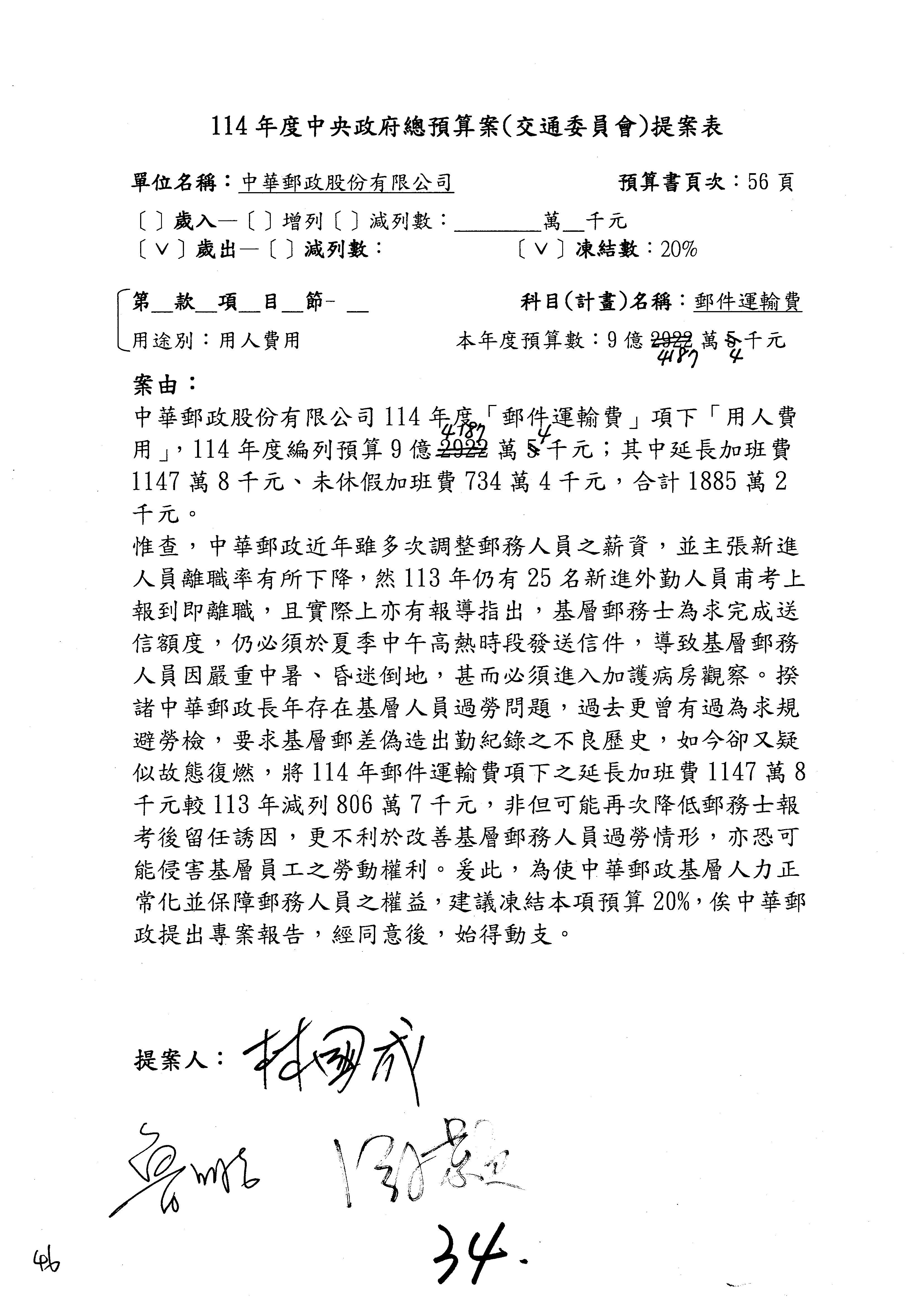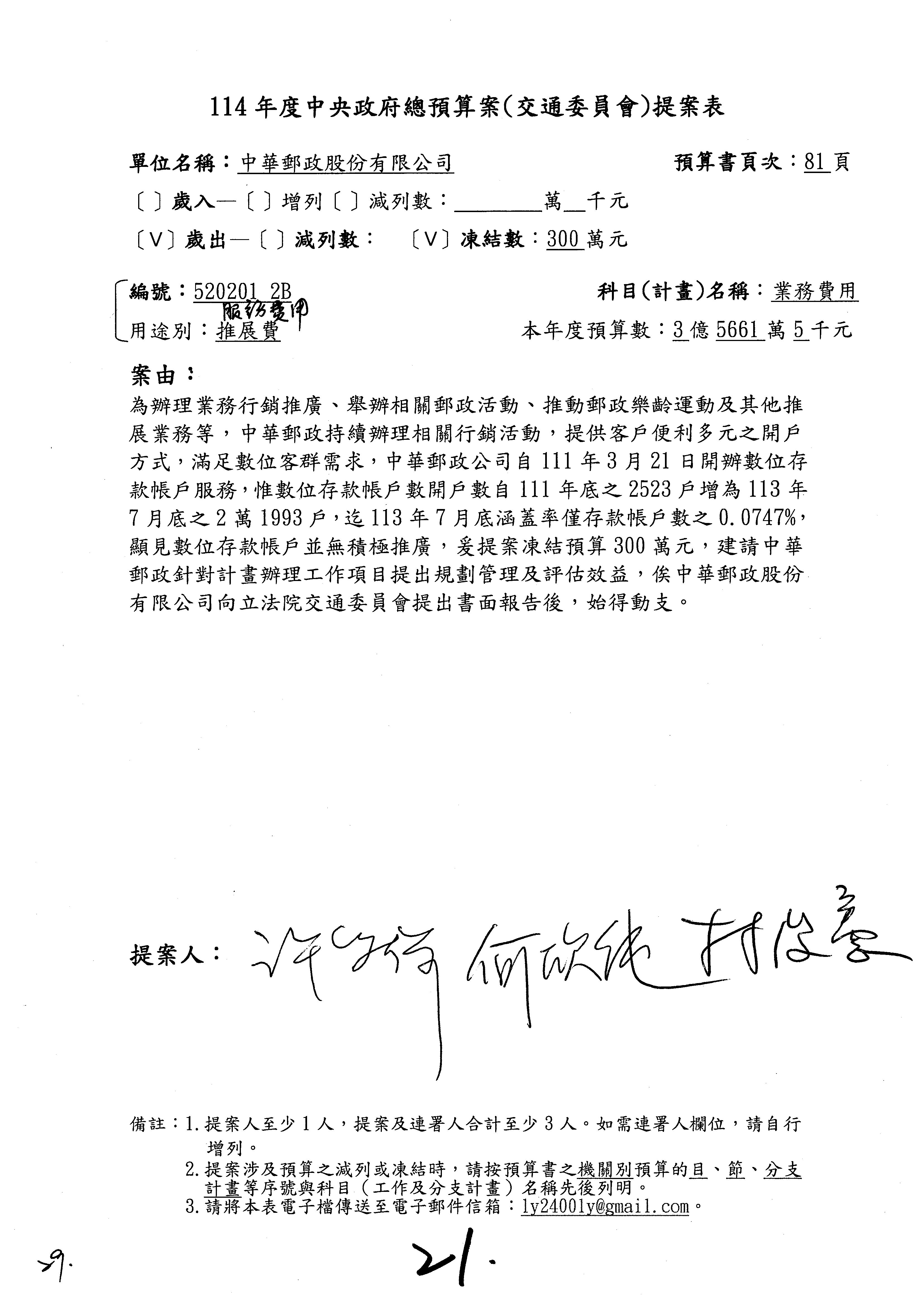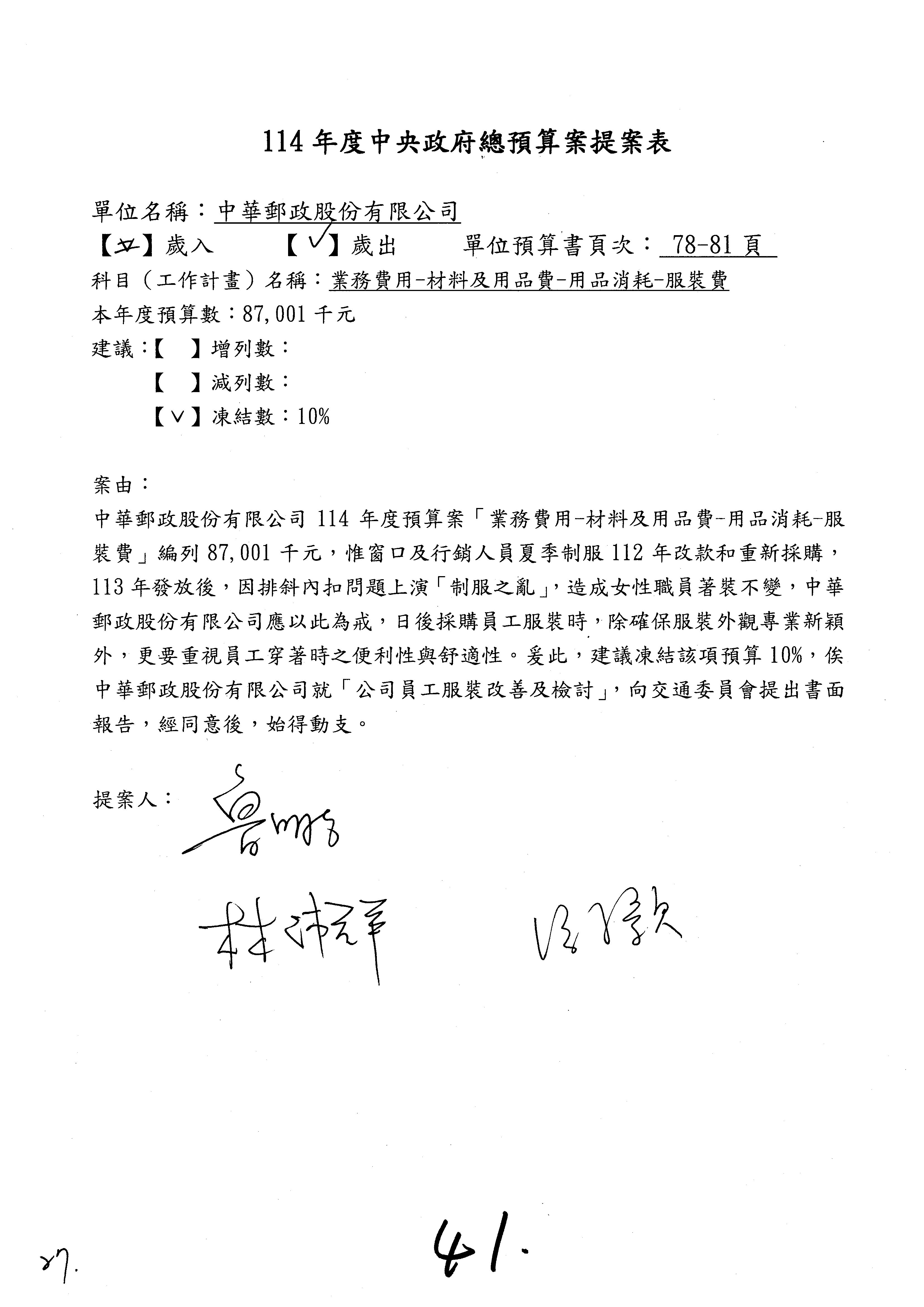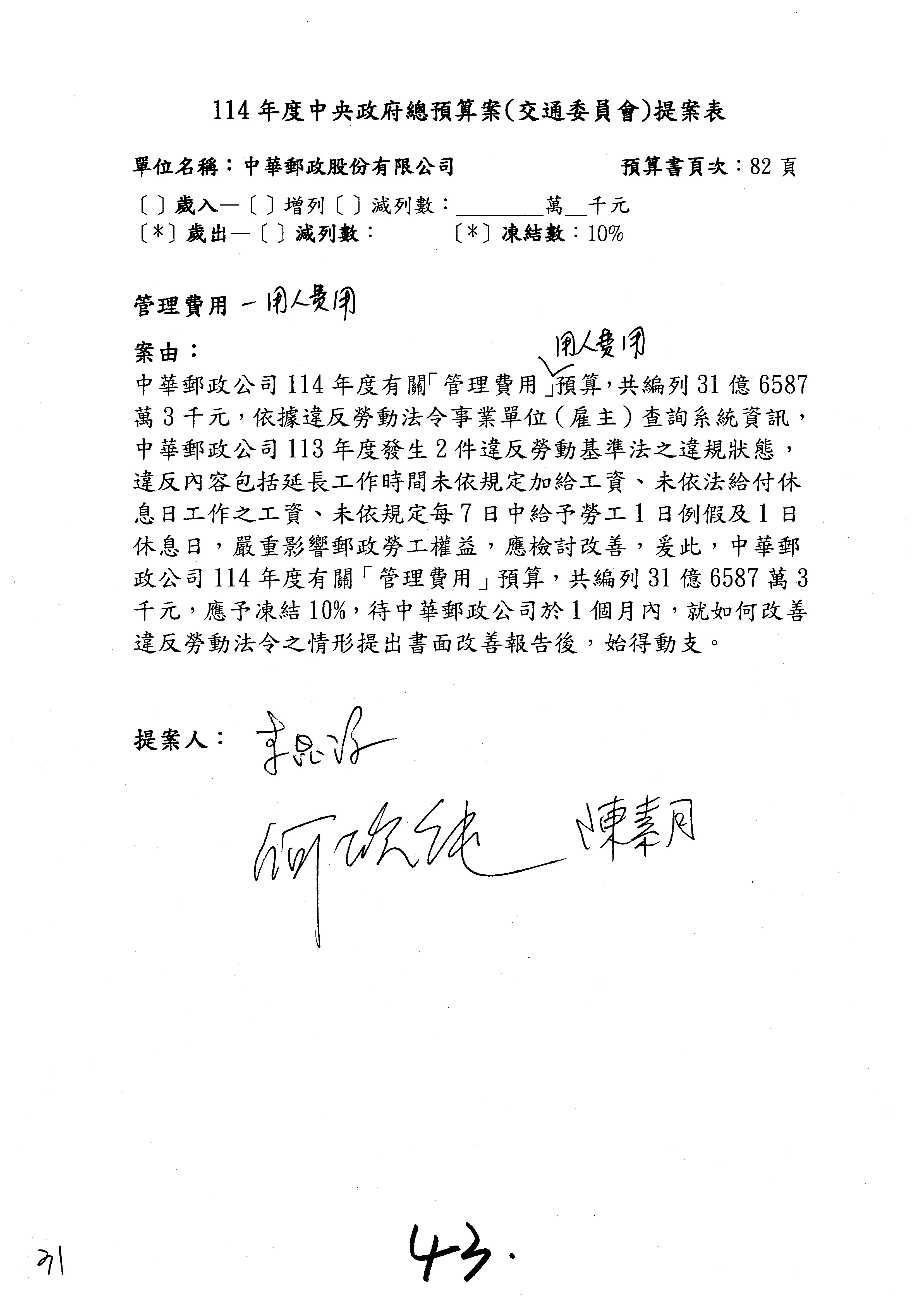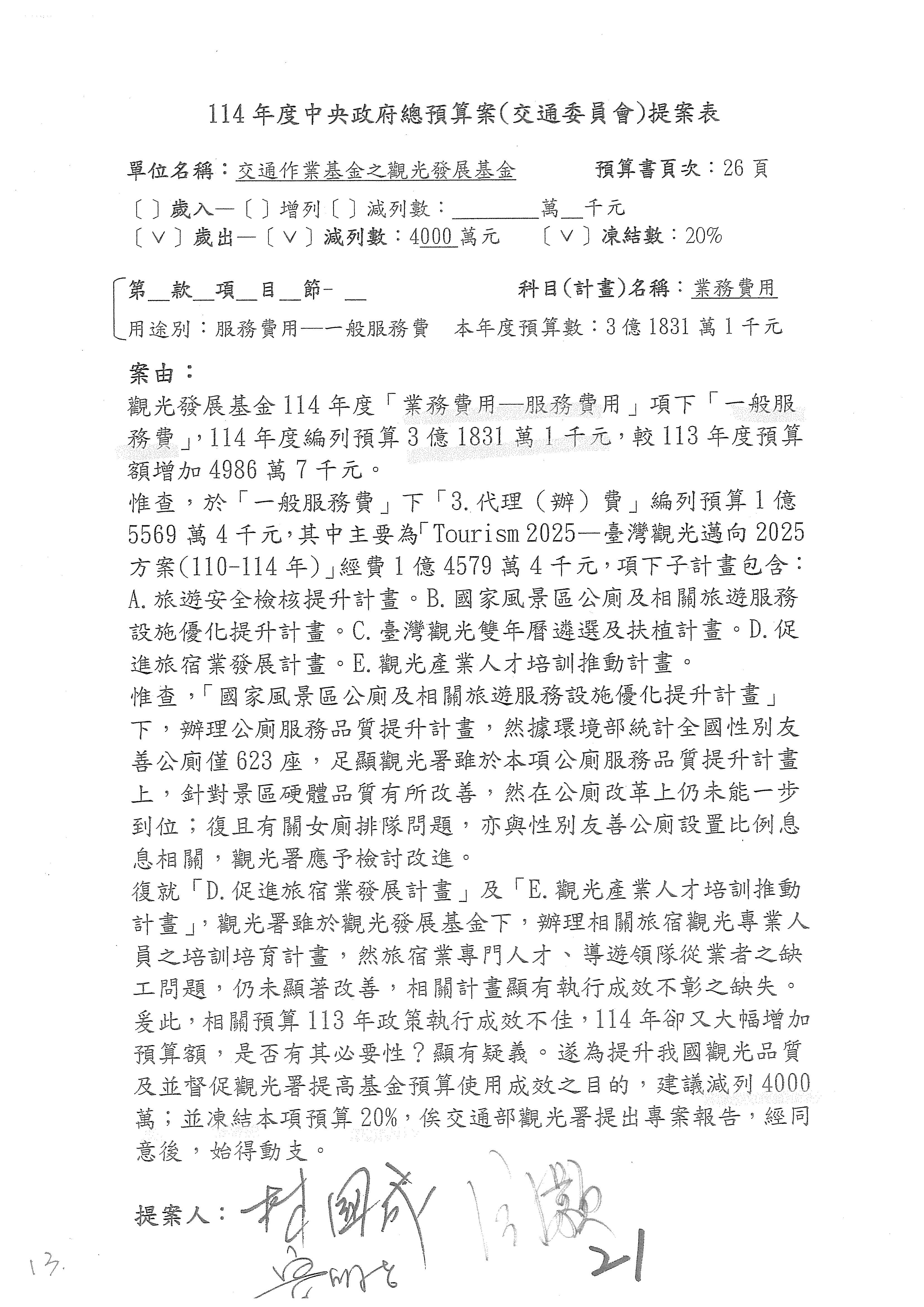主席:好的。現在處理第16案到第48案的部分,當然,各位委員提出的相關議題,你們需要提出書面報告。業務費用四十四億五百三十六萬餘元,這個部分綜合所有委員的提案,金額從幾百萬元到兩億元不等,我們折衷一下啦!刪減5,000萬元,凍結10%,提供書面報告始得動支。各位有沒有其他意見?沒意見吧?